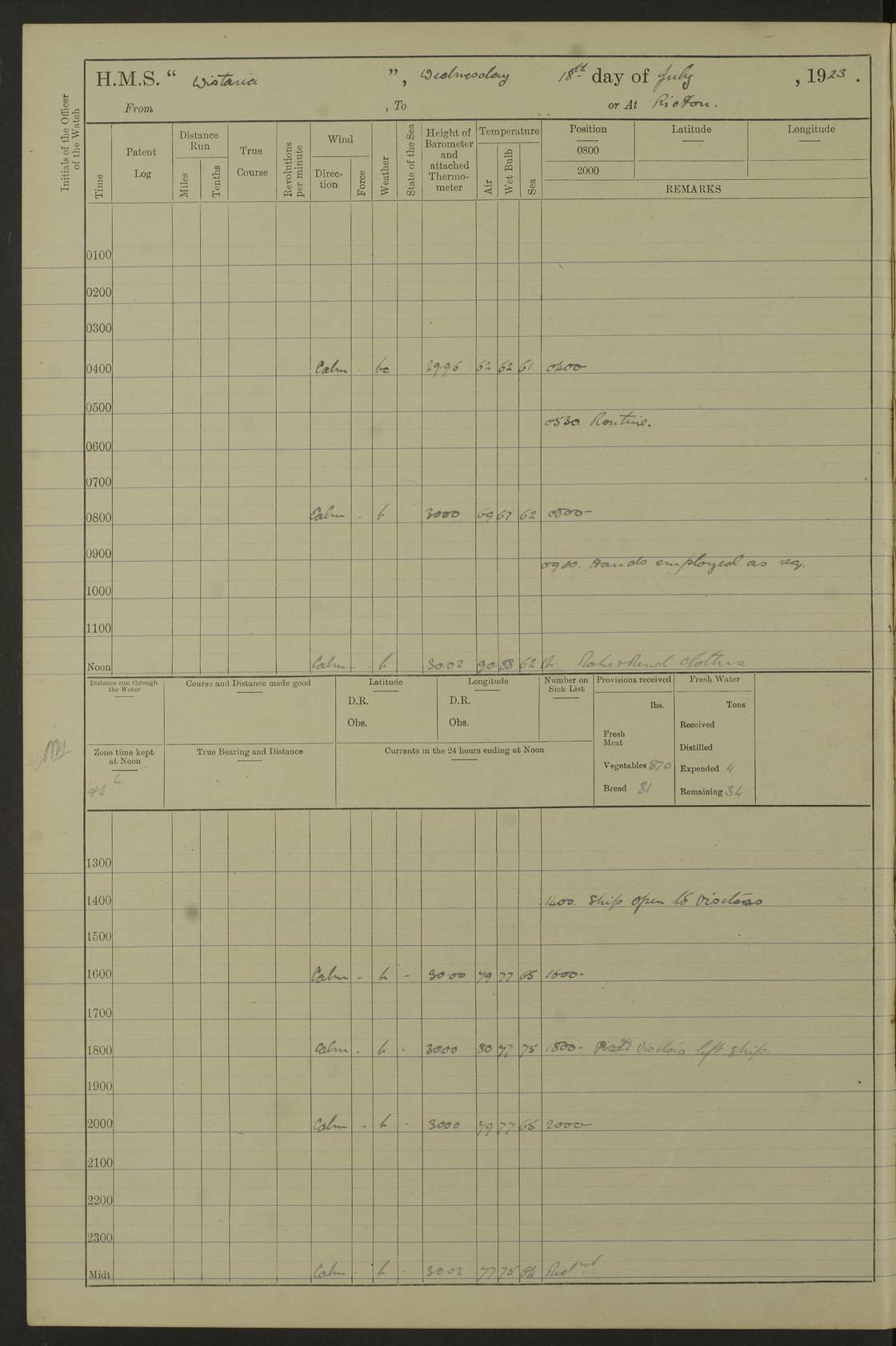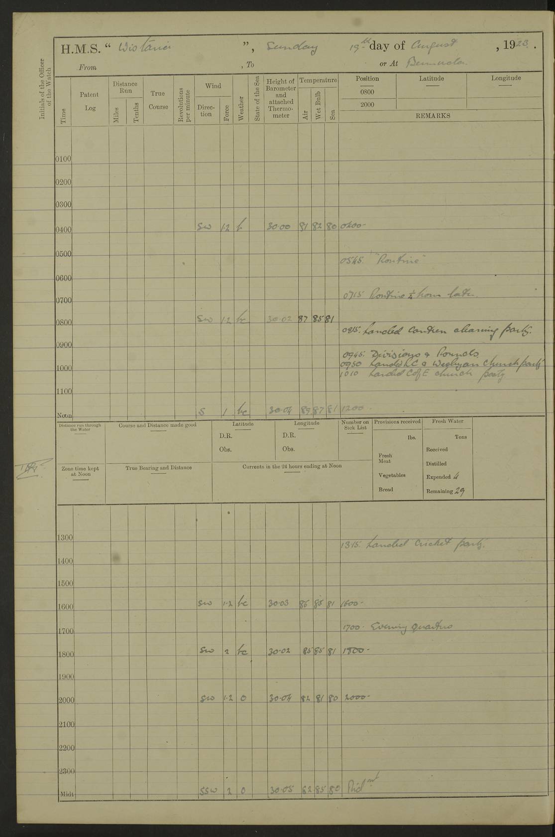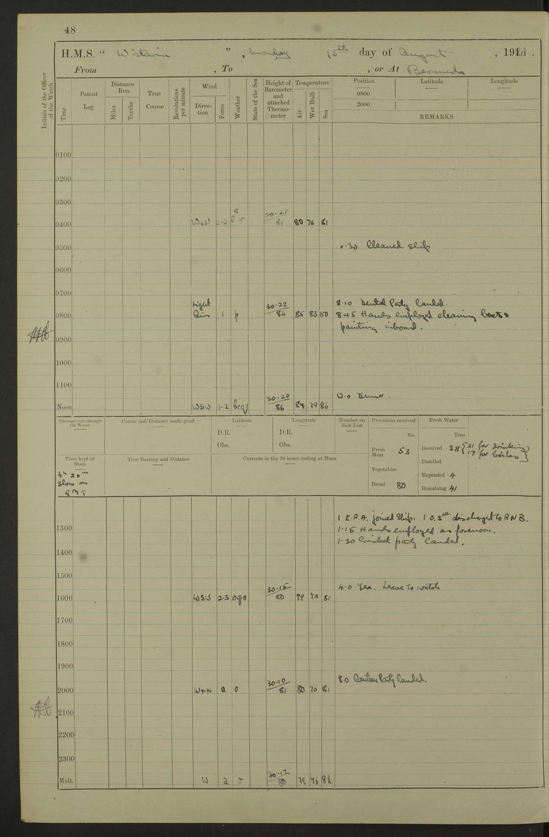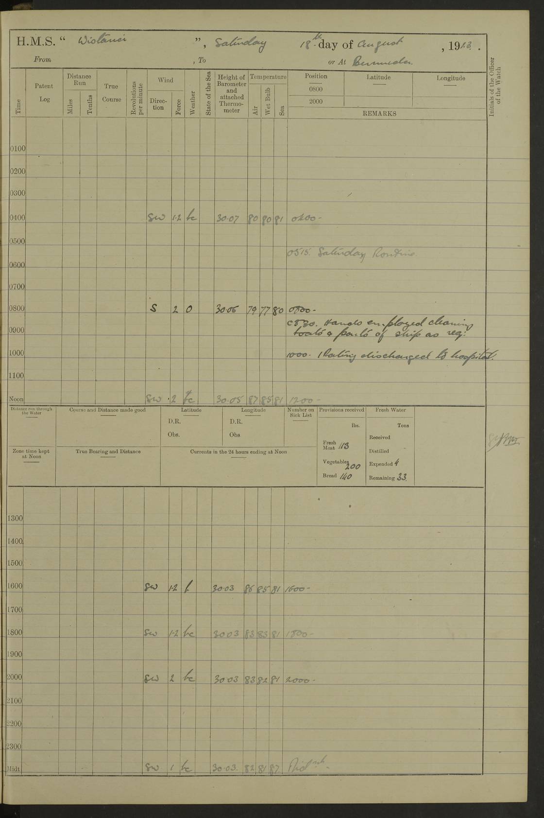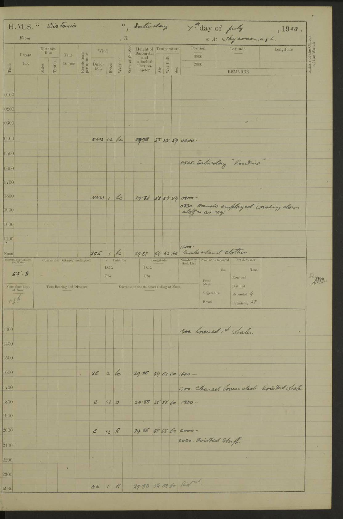 LOGS FOR JULY 1921 4f73ca38a2fc8ea903000a41: (https://s3.amazonaws.com:443/oldweather/ADM53-93262/0003_1.jpg) 1 July 1921 At Port Royal Lat 17.93, Long -76.83 8.15am: 1st whaler diving party. Clear up decks 9.30am: Ord. Seamen & boys muster bags. Remainder part of ship 1.45pm: Hands mustered for monthly payment 2.15pm: Diving party & side party employed. Rest part of ship 4f73ca38a2fc8ea903000a42: (https://s3.amazonaws.com:443/oldweather/ADM53-93262/0004_0.jpg) 2 July 1921 At Port Royal Lat 17.93, Long -76.83 8.15am: Cleaned ship 8.0pm: Concert party landed 8.45pm: Fire party landed 9.45pm: Fire party returned 10.40pm: Fire party landed 4f73ca39a2fc8ea903000a43: (https://s3.amazonaws.com:443/oldweather/ADM53-93262/0004_1.jpg) 3 July 1921 At Port Royal Lat 17.93, Long -76.83 6.30am: Cleaned ship 10.0am: Divisions Number on sick list: 2 4f73ca39a2fc8ea903000a44: (https://s3.amazonaws.com:443/oldweather/ADM53-93262/0005_0.jpg) 4 July 1921 At Port Royal Lat 17.93, Long -76.83 8.15am: Hands employed on boats & part of ship 2.0pm: Embarked 6” projectiles 10.30pm: Left harbour for Morant Cays. Course & speed as requisite 11.20pm: Dumped ammunition Number on sick list: 1 4f73ca39a2fc8ea903000a45: (https://s3.amazonaws.com:443/oldweather/ADM53-93262/0005_1.jpg) 5 July 1921 From Morant Cays-Port Royal to Port Royal-Morant Cays Lat 17.93, Long -76.83 6.20am: Sighted Morant Cays ahead 7.20am: Anchored and landed survey party am: Hands employed part of ship. Relief control parties exercised 10.40am: Weighed & proceeded 2.0pm: Hands employed chipping & painting boat deck & squaring off upper deck 3.10pm: Sighted Plum Point on Starboard bow 4.40pm: Stopped & manoeuvred as required for ship photograph to be taken 5.15pm: Secured alongside waling jetty. Leave to watch 4f73ca3aa2fc8ea903000a46: (https://s3.amazonaws.com:443/oldweather/ADM53-93262/0006_0.jpg) 6 July 1921 At Port Royal Lat 17.93, Long -76.83 9.25am: Hands employed parts of ship and six hands at small arm drill 2.0pm: Hands employed preparing ship for coaling 4.20pm: O.S. III Seabrook rejoined ship from hospital Number on sick list: 2 4f73ca3aa2fc8ea903000a47: (https://s3.amazonaws.com:443/oldweather/ADM53-93262/0006_1.jpg) 7 July 1921 At Port Royal Lat 17.93, Long -76.83 5.30am: Sanded decks 7.0am: Coaled ship with native labour 8.15am: Hands employed cleaning boats 11.20am: Finished coaling. Wash down & scrub upper deck Number on sick list: 4 4f73ca3aa2fc8ea903000a48: (https://s3.amazonaws.com:443/oldweather/ADM53-93262/0007_0.jpg) 8 July 1921 At Port Royal Lat 17.93, Long -76.83 8.15am: Hands employed cleaning paintwork & 3 hands about seine net 1.40pm: Starboard watch employed getting mine sweeping gear inboard 2.0pm: Port watch employed part of ship 3.0pm: Starboard watch employed part of ship 4.0pm: Tea. Ship put in quarantine 5.10pm: Surgeon McCallum left ship for military hospital Number on sick list: 1 [Surgeon McCallum: perhaps Surgeon Archie McCallum] 4f73ca3ba2fc8ea903000a49: (https://s3.amazonaws.com:443/oldweather/ADM53-93262/0007_1.jpg) 9 July 1921 At Port Royal Lat 17.93, Long -76.83 6.45am: Party left for isolation hospital to fumigate gear 11.50am: Air bedding 2.40pm: Bathing party landed 3.30pm: Bathing party returned 5.0pm: All hands vaccinated 4f73ca3ba2fc8ea903000a4a: (https://s3.amazonaws.com:443/oldweather/ADM53-93262/0008_0.jpg) 10 July 1921 At Port Royal Lat 17.93, Long -76.83 am: Parties sent to isolation hospital for fumigation 9.0am: Hands employed clearing mess decks & clearing up decks am: Parties sent for fumigation 1.0pm: All fumigation parties returned 5.15pm: Watch coaled picket boat Number on sick list: 1 4f73ca3ca2fc8ea903000a4b: (https://s3.amazonaws.com:443/oldweather/ADM53-93262/0008_1.jpg) 11 July 1921 From Port Royal to Bermuda and at Port Royal Lat 17.86, Long -76.63 8.15am: Furled forecastle awning 9.25am: Secured ship for sea 10.15am: Left Jetty 11.0am: Streamed patent log 11.01am: Plum Pt bearing N20E. Altered course S71E 3.15pm: Morant Pt bore N7W 3.30pm: Morant Pt bore N73W 6.45pm: Morant Pt bore S69W 9.35pm: Navassa Lt bearing S37E 10.32pm: Navassa Lt abeam 11.30pm: Navassa Lt bearing S24E True Bearing and Distance: Plum Pt Lt 294½°, 90 miles 4f73ca3ca2fc8ea903000a4c: (https://s3.amazonaws.com:443/oldweather/ADM53-93262/0009_0.jpg) 12 July 1921 From Port Royal to Bermuda Lat 20.18, Long -74.01 7.0am: Sighted Cuban mountains on Port bow 8.50am: Furled boat deck awning 9.35am: Exercised control parties, hands employed turning motor boats falls end for end, scarping & painting 2.0pm: Hands employed as forenoon 4.02pm: Sighted Great Inagua Lt Ho N48E 5.15pm: Course as required for re-charging telemotor system 5.38pm: Great Inagua Lt Ho abeam, 7 miles 6.30pm: N.W. Pt abeam, 1 mile True Bearing and Distance: Cape Maysi Lt Ho 299½°, 7¼ miles 4f73ca3ca2fc8ea903000a4d: (https://s3.amazonaws.com:443/oldweather/ADM53-93262/0009_1.jpg) 13 July 1921 From Port Royal to Bermuda Lat 23.13, Long -71.83 9.40am: Hands employed fitting new streaming light halliyards, scraping & cleaning part of ship 2.0pm: Hands employed scraping, painting & redleading parts of ship True Bearing and Distance: Gibbs Hill Lt Ho 034¼°, 672 miles 4f73ca3da2fc8ea903000a4e: (https://s3.amazonaws.com:443/oldweather/ADM53-93262/0010_0.jpg) 14 July 1921 From Port Royal to Bermuda Lat 25.91, Long -69.55 2.10am: Hauled in Patent log to clear it 2.15am: Log streamed 9.0am: Hauled in patent log 9.30am: Hands employed mustering bags & hammocks 2.0pm: Hands scrub hammocks 4.0pm: Evening Quarters. Exercised collision stations 5.0pm: Put clocks on 20 minutes True Bearing and Distance: Gibbs Hill Lt Ho 034°, 452 miles 4f73ca3da2fc8ea903000a4f: (https://s3.amazonaws.com:443/oldweather/ADM53-93262/0010_1.jpg) 15 July 1921 From Port Royal to Bermuda Lat 29.03, Long -67.18 9.40am: Exercised action stations. Fired one belt of ammunition from each pom pom 10.30am: Ord. Sea & boys to school. Pom Pom’s crews working about guns, remainders chip