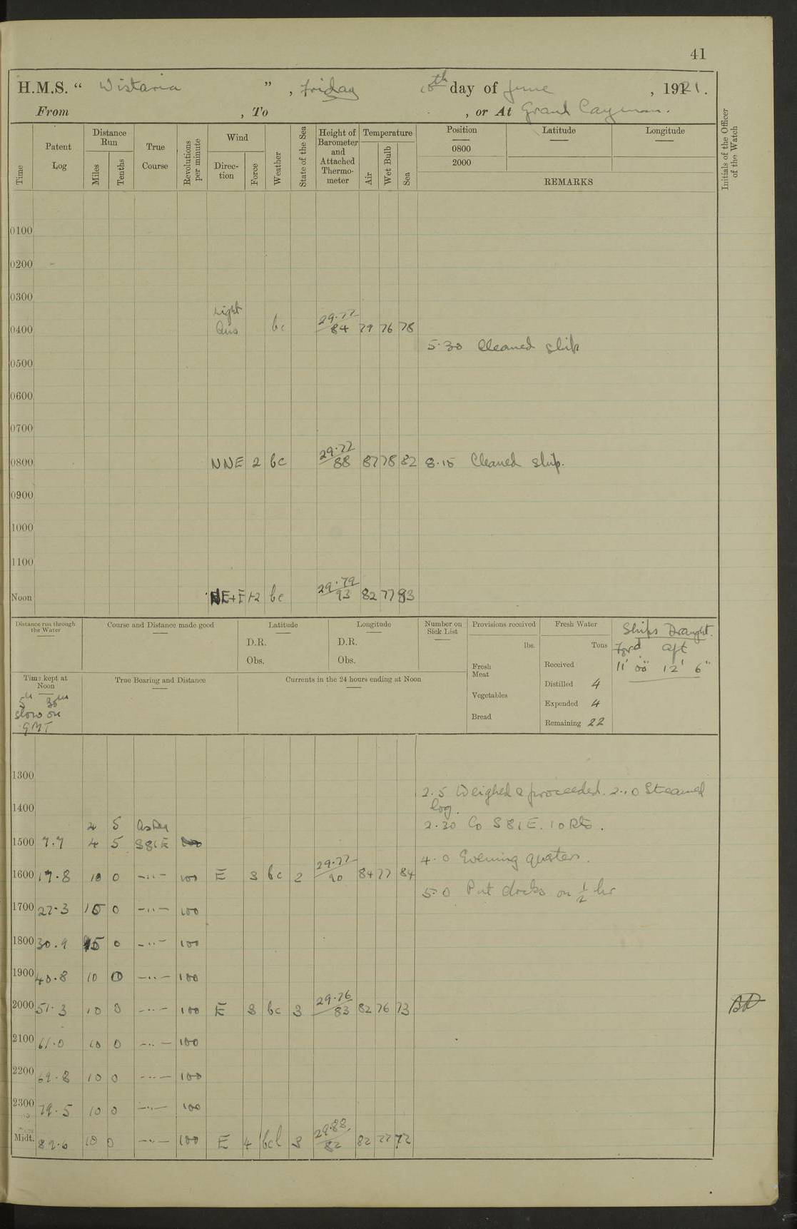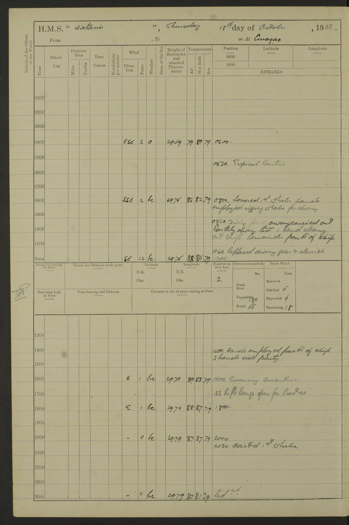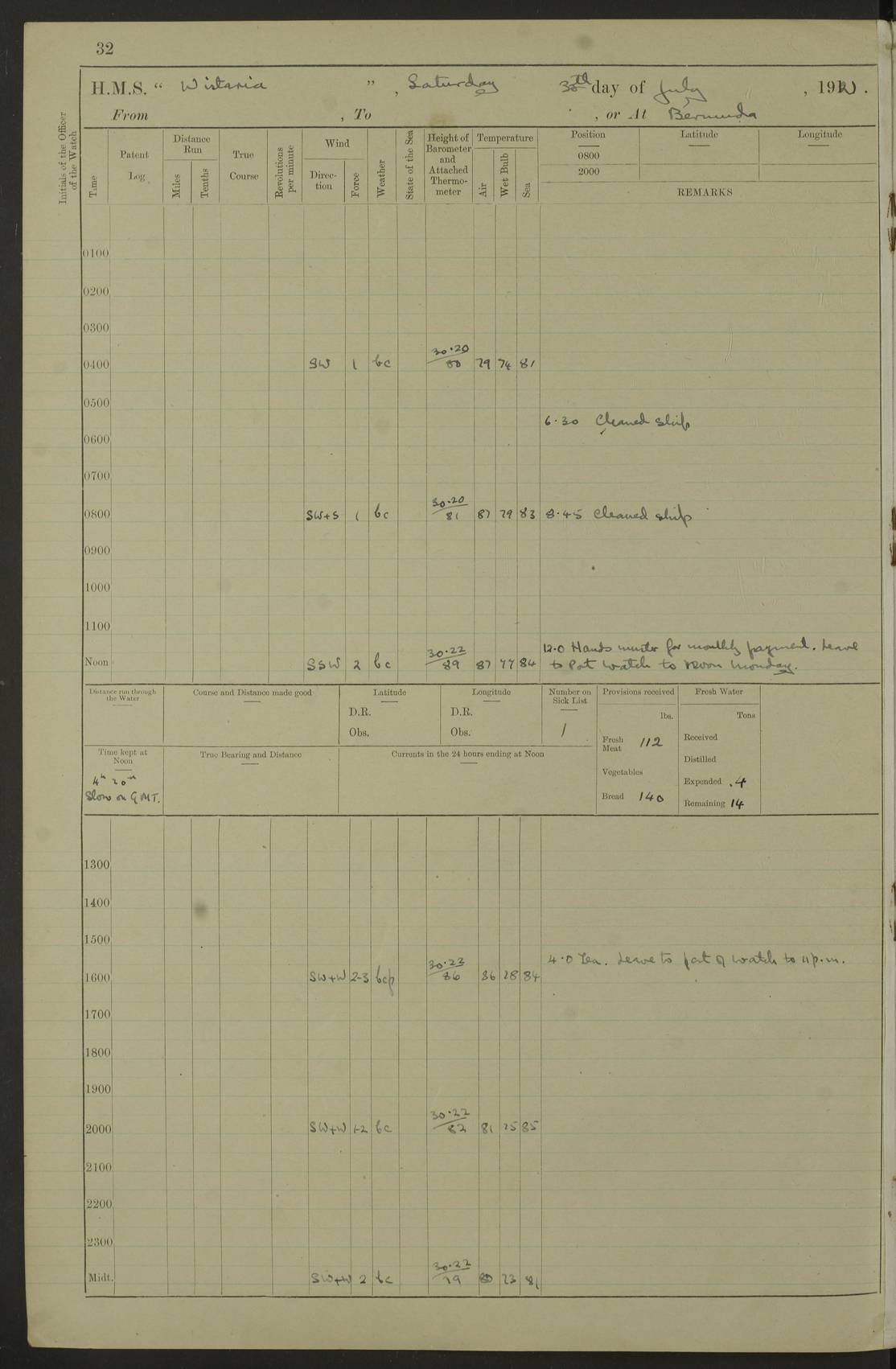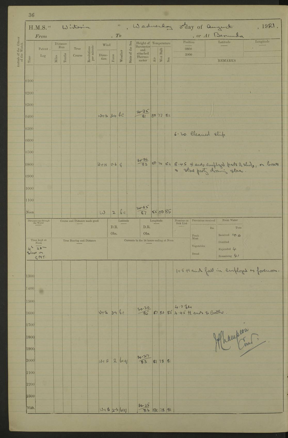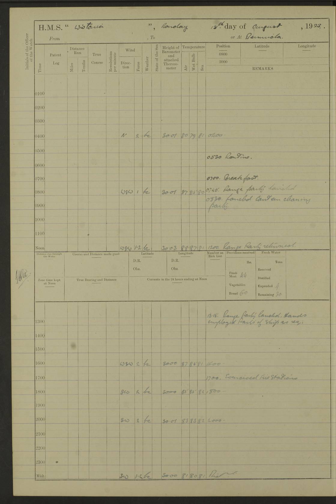 LOGS FOR JULY 1921 4f73ca38a2fc8ea903000a41: (https://s3.amazonaws.com:443/oldweather/ADM53-93262/0003_1.jpg) 1 July 1921 At Port Royal Lat 17.93, Long -76.83 8.15am: 1st whaler diving party. Clear up decks 9.30am: Ord. Seamen & boys muster bags. Remainder part of ship 1.45pm: Hands mustered for monthly payment 2.15pm: Diving party & side party employed. Rest part of ship 4f73ca38a2fc8ea903000a42: (https://s3.amazonaws.com:443/oldweather/ADM53-93262/0004_0.jpg) 2 July 1921 At Port Royal Lat 17.93, Long -76.83 8.15am: Cleaned ship 8.0pm: Concert party landed 8.45pm: Fire party landed 9.45pm: Fire party returned 10.40pm: Fire party landed 4f73ca39a2fc8ea903000a43: (https://s3.amazonaws.com:443/oldweather/ADM53-93262/0004_1.jpg) 3 July 1921 At Port Royal Lat 17.93, Long -76.83 6.30am: Cleaned ship 10.0am: Divisions Number on sick list: 2 4f73ca39a2fc8ea903000a44: (https://s3.amazonaws.com:443/oldweather/ADM53-93262/0005_0.jpg) 4 July 1921 At Port Royal Lat 17.93, Long -76.83 8.15am: Hands employed on boats & part of ship 2.0pm: Embarked 6” projectiles 10.30pm: Left harbour for Morant Cays. Course & speed as requisite 11.20pm: Dumped ammunition Number on sick list: 1 4f73ca39a2fc8ea903000a45: (https://s3.amazonaws.com:443/oldweather/ADM53-93262/0005_1.jpg) 5 July 1921 From Morant Cays-Port Royal to Port Royal-Morant Cays Lat 17.93, Long -76.83 6.20am: Sighted Morant Cays ahead 7.20am: Anchored and landed survey party am: Hands employed part of ship. Relief control parties exercised 10.40am: Weighed & proceeded 2.0pm: Hands employed chipping & painting boat deck & squaring off upper deck 3.10pm: Sighted Plum Point on Starboard bow 4.40pm: Stopped & manoeuvred as required for ship photograph to be taken 5.15pm: Secured alongside waling jetty. Leave to watch 4f73ca3aa2fc8ea903000a46: (https://s3.amazonaws.com:443/oldweather/ADM53-93262/0006_0.jpg) 6 July 1921 At Port Royal Lat 17.93, Long -76.83 9.25am: Hands employed parts of ship and six hands at small arm drill 2.0pm: Hands employed preparing ship for coaling 4.20pm: O.S. III Seabrook rejoined ship from hospital Number on sick list: 2 4f73ca3aa2fc8ea903000a47: (https://s3.amazonaws.com:443/oldweather/ADM53-93262/0006_1.jpg) 7 July 1921 At Port Royal Lat 17.93, Long -76.83 5.30am: Sanded decks 7.0am: Coaled ship with native labour 8.15am: Hands employed cleaning boats 11.20am: Finished coaling. Wash down & scrub upper deck Number on sick list: 4 4f73ca3aa2fc8ea903000a48: (https://s3.amazonaws.com:443/oldweather/ADM53-93262/0007_0.jpg) 8 July 1921 At Port Royal Lat 17.93, Long -76.83 8.15am: Hands employed cleaning paintwork & 3 hands about seine net 1.40pm: Starboard watch employed getting mine sweeping gear inboard 2.0pm: Port watch employed part of ship 3.0pm: Starboard watch employed part of ship 4.0pm: Tea. Ship put in quarantine 5.10pm: Surgeon McCallum left ship for military hospital Number on sick list: 1 [Surgeon McCallum: perhaps Surgeon Archie McCallum] 4f73ca3ba2fc8ea903000a49: (https://s3.amazonaws.com:443/oldweather/ADM53-93262/0007_1.jpg) 9 July 1921 At Port Royal Lat 17.93, Long -76.83 6.45am: Party left for isolation hospital to fumigate gear 11.50am: Air bedding 2.40pm: Bathing party landed 3.30pm: Bathing party returned 5.0pm: All hands vaccinated 4f73ca3ba2fc8ea903000a4a: (https://s3.amazonaws.com:443/oldweather/ADM53-93262/0008_0.jpg) 10 July 1921 At Port Royal Lat 17.93, Long -76.83 am: Parties sent to isolation hospital for fumigation 9.0am: Hands employed clearing mess decks & clearing up decks am: Parties sent for fumigation 1.0pm: All fumigation parties returned 5.15pm: Watch coaled picket boat Number on sick list: 1 4f73ca3ca2fc8ea903000a4b: (https://s3.amazonaws.com:443/oldweather/ADM53-93262/0008_1.jpg) 11 July 1921 From Port Royal to Bermuda and at Port Royal Lat 17.86, Long -76.63 8.15am: Furled forecastle awning 9.25am: Secured ship for sea 10.15am: Left Jetty 11.0am: Streamed patent log 11.01am: Plum Pt bearing N20E. Altered course S71E 3.15pm: Morant Pt bore N7W 3.30pm: Morant Pt bore N73W 6.45pm: Morant Pt bore S69W 9.35pm: Navassa Lt bearing S37E 10.32pm: Navassa Lt abeam 11.30pm: Navassa Lt bearing S24E True Bearing and Distance: Plum Pt Lt 294½°, 90 miles 4f73ca3ca2fc8ea903000a4c: (https://s3.amazonaws.com:443/oldweather/ADM53-93262/0009_0.jpg) 12 July 1921 From Port Royal to Bermuda Lat 20.18, Long -74.01 7.0am: Sighted Cuban mountains on Port bow 8.50am: Furled boat deck awning 9.35am: Exercised control parties, hands employed turning motor boats falls end for end, scarping & painting 2.0pm: Hands employed as forenoon 4.02pm: Sighted Great Inagua Lt Ho N48E 5.15pm: Course as required for re-charging telemotor system 5.38pm: Great Inagua Lt Ho abeam, 7 miles 6.30pm: N.W. Pt abeam, 1 mile True Bearing and Distance: Cape Maysi Lt Ho 299½°, 7¼ miles 4f73ca3ca2fc8ea903000a4d: (https://s3.amazonaws.com:443/oldweather/ADM53-93262/0009_1.jpg) 13 July 1921 From Port Royal to Bermuda Lat 23.13, Long -71.83 9.40am: Hands employed fitting new streaming light halliyards, scraping & cleaning part of ship 2.0pm: Hands employed scraping, painting & redleading parts of ship True Bearing and Distance: Gibbs Hill Lt Ho 034¼°, 672 miles 4f73ca3da2fc8ea903000a4e: (https://s3.amazonaws.com:443/oldweather/ADM53-93262/0010_0.jpg) 14 July 1921 From Port Royal to Bermuda Lat 25.91, Long -69.55 2.10am: Hauled in Patent log to clear it 2.15am: Log streamed 9.0am: Hauled in patent log 9.30am: Hands employed mustering bags & hammocks 2.0pm: Hands scrub hammocks 4.0pm: Evening Quarters. Exercised collision stations 5.0pm: Put clocks on 20 minutes True Bearing and Distance: Gibbs Hill Lt Ho 034°, 452 miles 4f73ca3da2fc8ea903000a4f: (https://s3.amazonaws.com:443/oldweather/ADM53-93262/0010_1.jpg) 15 July 1921 From Port Royal to Bermuda Lat 29.03, Long -67.18 9.40am: Exercised action stations. Fired one belt of ammunition from each pom pom 10.30am: Ord. Sea & boys to school. Pom Pom’s crews working about guns, remainders chip