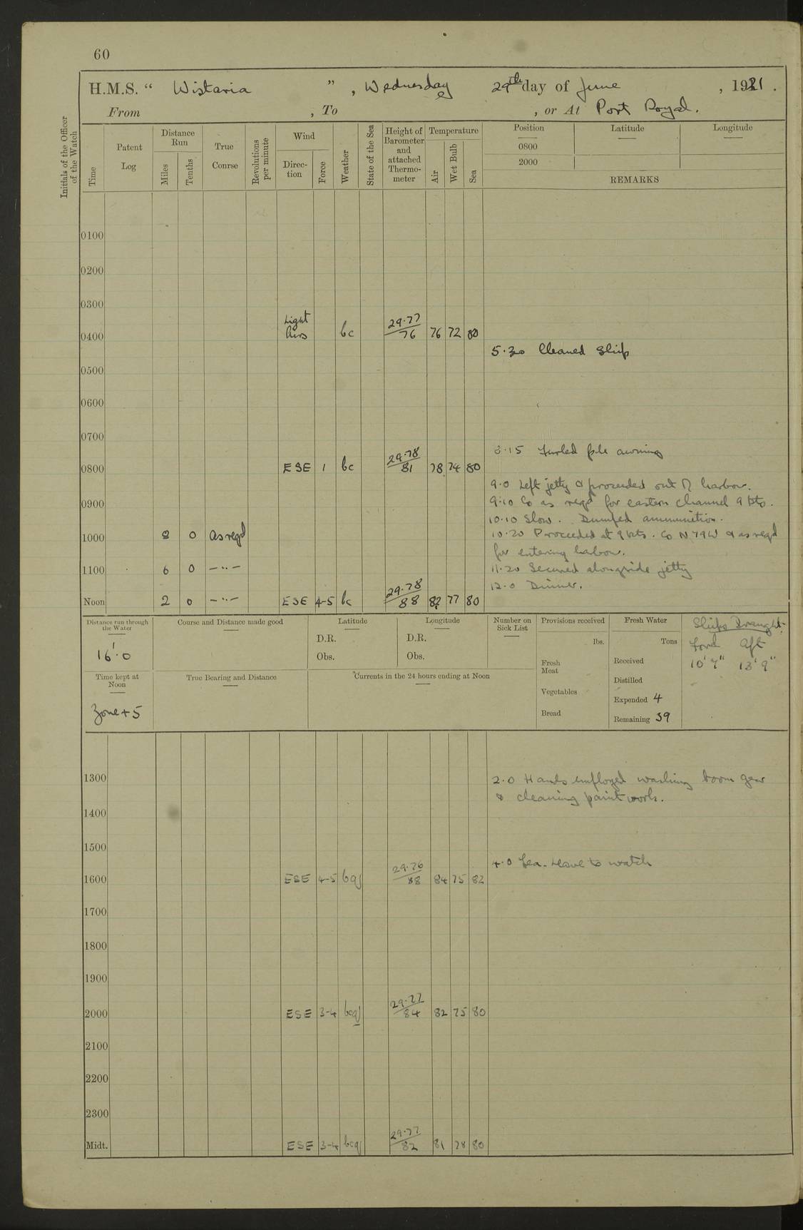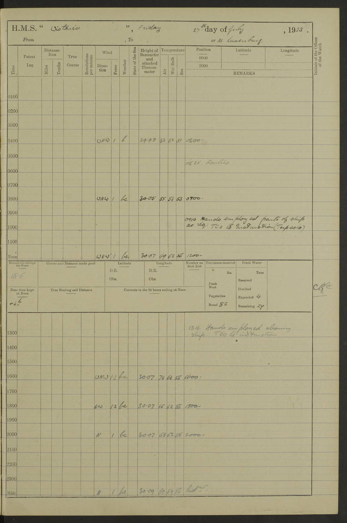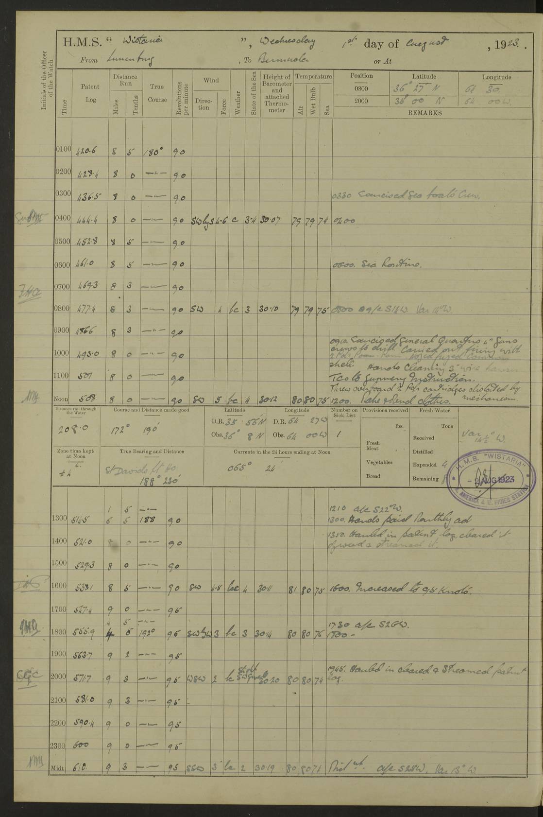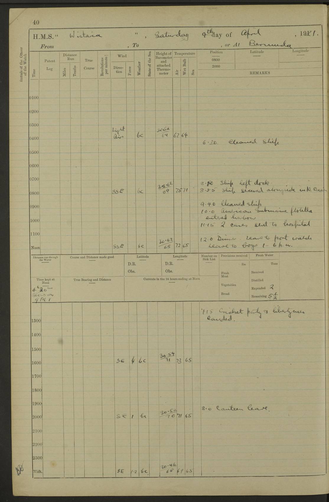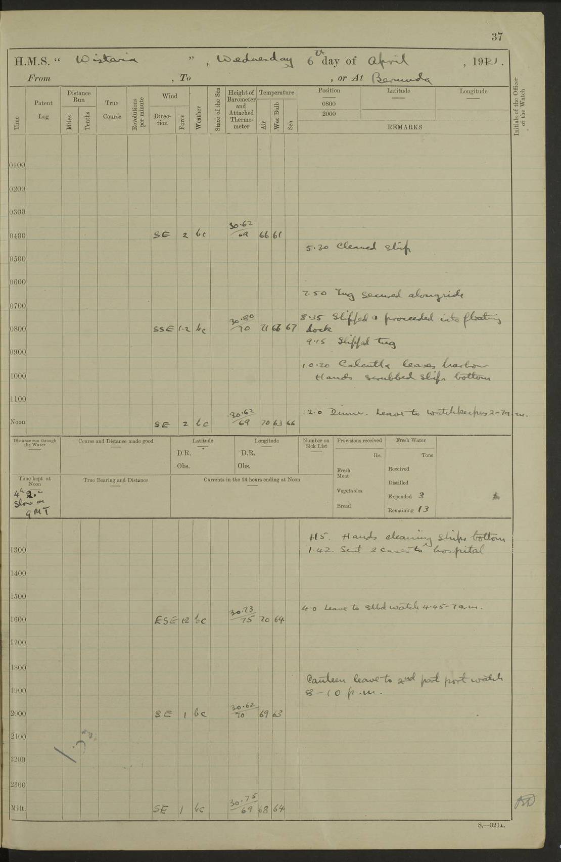 LOGS FOR JULY 1921 4f73ca38a2fc8ea903000a41: (https://s3.amazonaws.com:443/oldweather/ADM53-93262/0003_1.jpg) 1 July 1921 At Port Royal Lat 17.93, Long -76.83 8.15am: 1st whaler diving party. Clear up decks 9.30am: Ord. Seamen & boys muster bags. Remainder part of ship 1.45pm: Hands mustered for monthly payment 2.15pm: Diving party & side party employed. Rest part of ship 4f73ca38a2fc8ea903000a42: (https://s3.amazonaws.com:443/oldweather/ADM53-93262/0004_0.jpg) 2 July 1921 At Port Royal Lat 17.93, Long -76.83 8.15am: Cleaned ship 8.0pm: Concert party landed 8.45pm: Fire party landed 9.45pm: Fire party returned 10.40pm: Fire party landed 4f73ca39a2fc8ea903000a43: (https://s3.amazonaws.com:443/oldweather/ADM53-93262/0004_1.jpg) 3 July 1921 At Port Royal Lat 17.93, Long -76.83 6.30am: Cleaned ship 10.0am: Divisions Number on sick list: 2 4f73ca39a2fc8ea903000a44: (https://s3.amazonaws.com:443/oldweather/ADM53-93262/0005_0.jpg) 4 July 1921 At Port Royal Lat 17.93, Long -76.83 8.15am: Hands employed on boats & part of ship 2.0pm: Embarked 6” projectiles 10.30pm: Left harbour for Morant Cays. Course & speed as requisite 11.20pm: Dumped ammunition Number on sick list: 1 4f73ca39a2fc8ea903000a45: (https://s3.amazonaws.com:443/oldweather/ADM53-93262/0005_1.jpg) 5 July 1921 From Morant Cays-Port Royal to Port Royal-Morant Cays Lat 17.93, Long -76.83 6.20am: Sighted Morant Cays ahead 7.20am: Anchored and landed survey party am: Hands employed part of ship. Relief control parties exercised 10.40am: Weighed & proceeded 2.0pm: Hands employed chipping & painting boat deck & squaring off upper deck 3.10pm: Sighted Plum Point on Starboard bow 4.40pm: Stopped & manoeuvred as required for ship photograph to be taken 5.15pm: Secured alongside waling jetty. Leave to watch 4f73ca3aa2fc8ea903000a46: (https://s3.amazonaws.com:443/oldweather/ADM53-93262/0006_0.jpg) 6 July 1921 At Port Royal Lat 17.93, Long -76.83 9.25am: Hands employed parts of ship and six hands at small arm drill 2.0pm: Hands employed preparing ship for coaling 4.20pm: O.S. III Seabrook rejoined ship from hospital Number on sick list: 2 4f73ca3aa2fc8ea903000a47: (https://s3.amazonaws.com:443/oldweather/ADM53-93262/0006_1.jpg) 7 July 1921 At Port Royal Lat 17.93, Long -76.83 5.30am: Sanded decks 7.0am: Coaled ship with native labour 8.15am: Hands employed cleaning boats 11.20am: Finished coaling. Wash down & scrub upper deck Number on sick list: 4 4f73ca3aa2fc8ea903000a48: (https://s3.amazonaws.com:443/oldweather/ADM53-93262/0007_0.jpg) 8 July 1921 At Port Royal Lat 17.93, Long -76.83 8.15am: Hands employed cleaning paintwork & 3 hands about seine net 1.40pm: Starboard watch employed getting mine sweeping gear inboard 2.0pm: Port watch employed part of ship 3.0pm: Starboard watch employed part of ship 4.0pm: Tea. Ship put in quarantine 5.10pm: Surgeon McCallum left ship for military hospital Number on sick list: 1 [Surgeon McCallum: perhaps Surgeon Archie McCallum] 4f73ca3ba2fc8ea903000a49: (https://s3.amazonaws.com:443/oldweather/ADM53-93262/0007_1.jpg) 9 July 1921 At Port Royal Lat 17.93, Long -76.83 6.45am: Party left for isolation hospital to fumigate gear 11.50am: Air bedding 2.40pm: Bathing party landed 3.30pm: Bathing party returned 5.0pm: All hands vaccinated 4f73ca3ba2fc8ea903000a4a: (https://s3.amazonaws.com:443/oldweather/ADM53-93262/0008_0.jpg) 10 July 1921 At Port Royal Lat 17.93, Long -76.83 am: Parties sent to isolation hospital for fumigation 9.0am: Hands employed clearing mess decks & clearing up decks am: Parties sent for fumigation 1.0pm: All fumigation parties returned 5.15pm: Watch coaled picket boat Number on sick list: 1 4f73ca3ca2fc8ea903000a4b: (https://s3.amazonaws.com:443/oldweather/ADM53-93262/0008_1.jpg) 11 July 1921 From Port Royal to Bermuda and at Port Royal Lat 17.86, Long -76.63 8.15am: Furled forecastle awning 9.25am: Secured ship for sea 10.15am: Left Jetty 11.0am: Streamed patent log 11.01am: Plum Pt bearing N20E. Altered course S71E 3.15pm: Morant Pt bore N7W 3.30pm: Morant Pt bore N73W 6.45pm: Morant Pt bore S69W 9.35pm: Navassa Lt bearing S37E 10.32pm: Navassa Lt abeam 11.30pm: Navassa Lt bearing S24E True Bearing and Distance: Plum Pt Lt 294½°, 90 miles 4f73ca3ca2fc8ea903000a4c: (https://s3.amazonaws.com:443/oldweather/ADM53-93262/0009_0.jpg) 12 July 1921 From Port Royal to Bermuda Lat 20.18, Long -74.01 7.0am: Sighted Cuban mountains on Port bow 8.50am: Furled boat deck awning 9.35am: Exercised control parties, hands employed turning motor boats falls end for end, scarping & painting 2.0pm: Hands employed as forenoon 4.02pm: Sighted Great Inagua Lt Ho N48E 5.15pm: Course as required for re-charging telemotor system 5.38pm: Great Inagua Lt Ho abeam, 7 miles 6.30pm: N.W. Pt abeam, 1 mile True Bearing and Distance: Cape Maysi Lt Ho 299½°, 7¼ miles 4f73ca3ca2fc8ea903000a4d: (https://s3.amazonaws.com:443/oldweather/ADM53-93262/0009_1.jpg) 13 July 1921 From Port Royal to Bermuda Lat 23.13, Long -71.83 9.40am: Hands employed fitting new streaming light halliyards, scraping & cleaning part of ship 2.0pm: Hands employed scraping, painting & redleading parts of ship True Bearing and Distance: Gibbs Hill Lt Ho 034¼°, 672 miles 4f73ca3da2fc8ea903000a4e: (https://s3.amazonaws.com:443/oldweather/ADM53-93262/0010_0.jpg) 14 July 1921 From Port Royal to Bermuda Lat 25.91, Long -69.55 2.10am: Hauled in Patent log to clear it 2.15am: Log streamed 9.0am: Hauled in patent log 9.30am: Hands employed mustering bags & hammocks 2.0pm: Hands scrub hammocks 4.0pm: Evening Quarters. Exercised collision stations 5.0pm: Put clocks on 20 minutes True Bearing and Distance: Gibbs Hill Lt Ho 034°, 452 miles 4f73ca3da2fc8ea903000a4f: (https://s3.amazonaws.com:443/oldweather/ADM53-93262/0010_1.jpg) 15 July 1921 From Port Royal to Bermuda Lat 29.03, Long -67.18 9.40am: Exercised action stations. Fired one belt of ammunition from each pom pom 10.30am: Ord. Sea & boys to school. Pom Pom’s crews working about guns, remainders chip