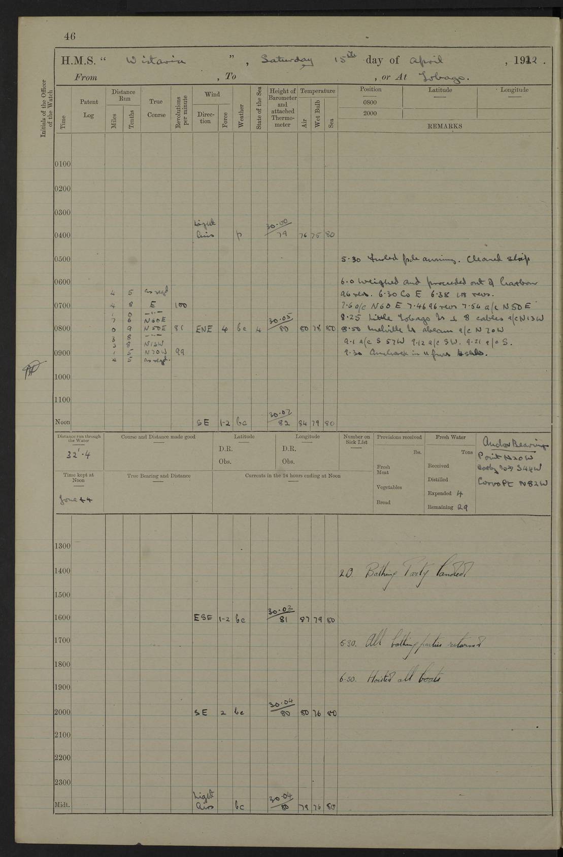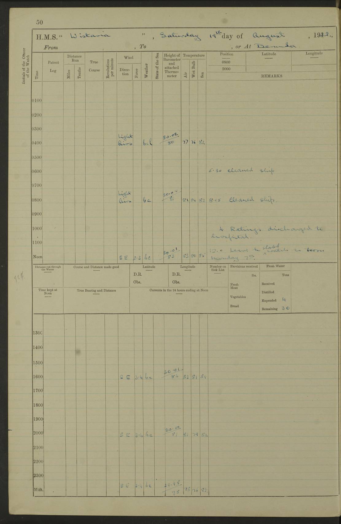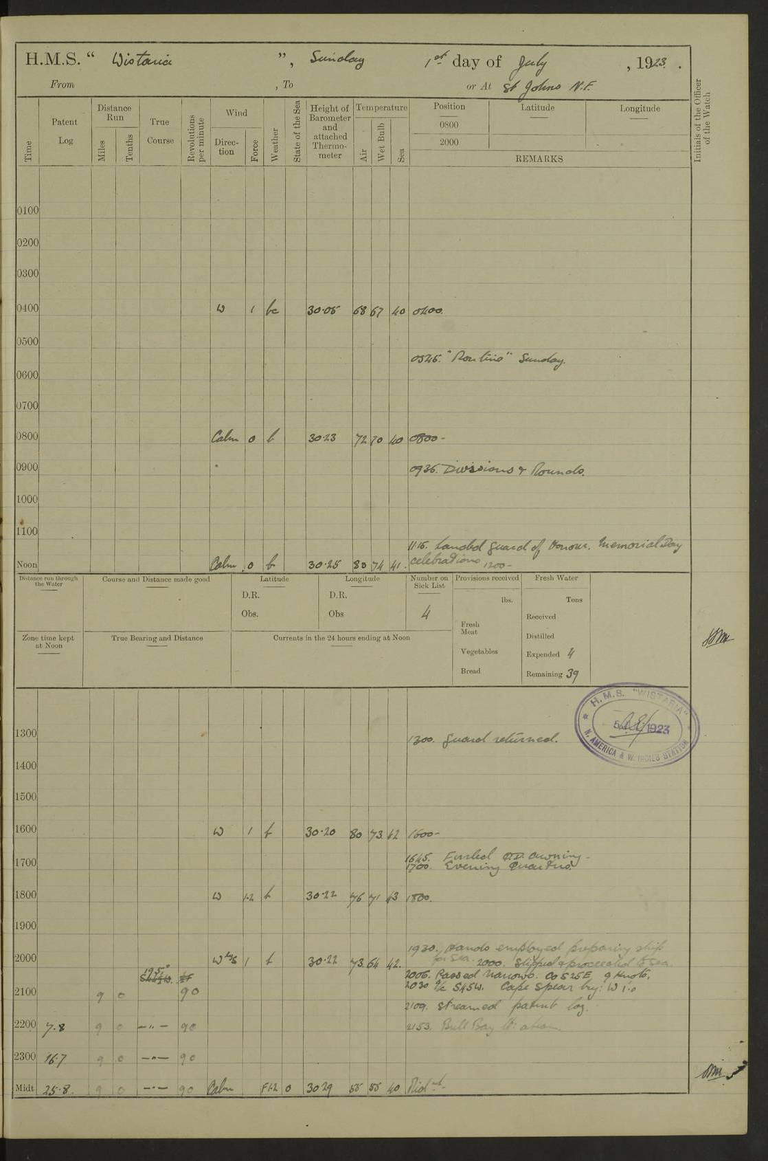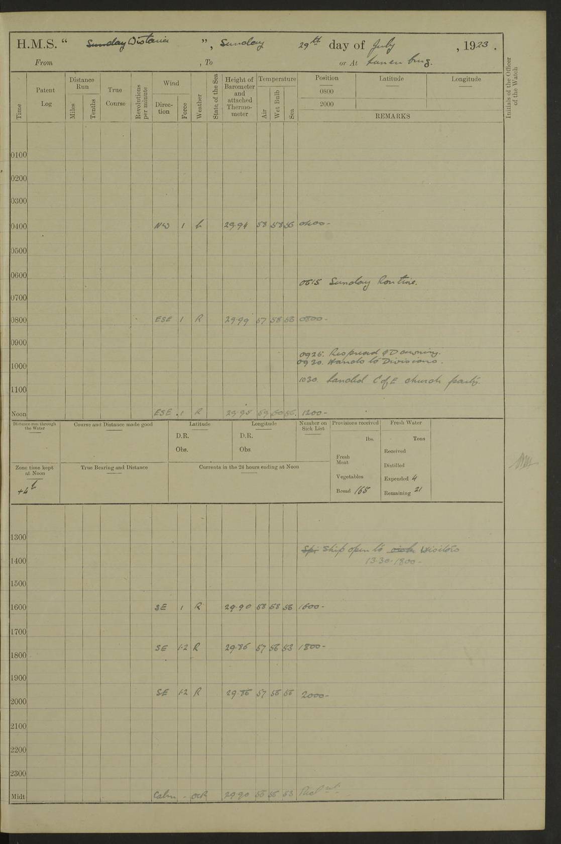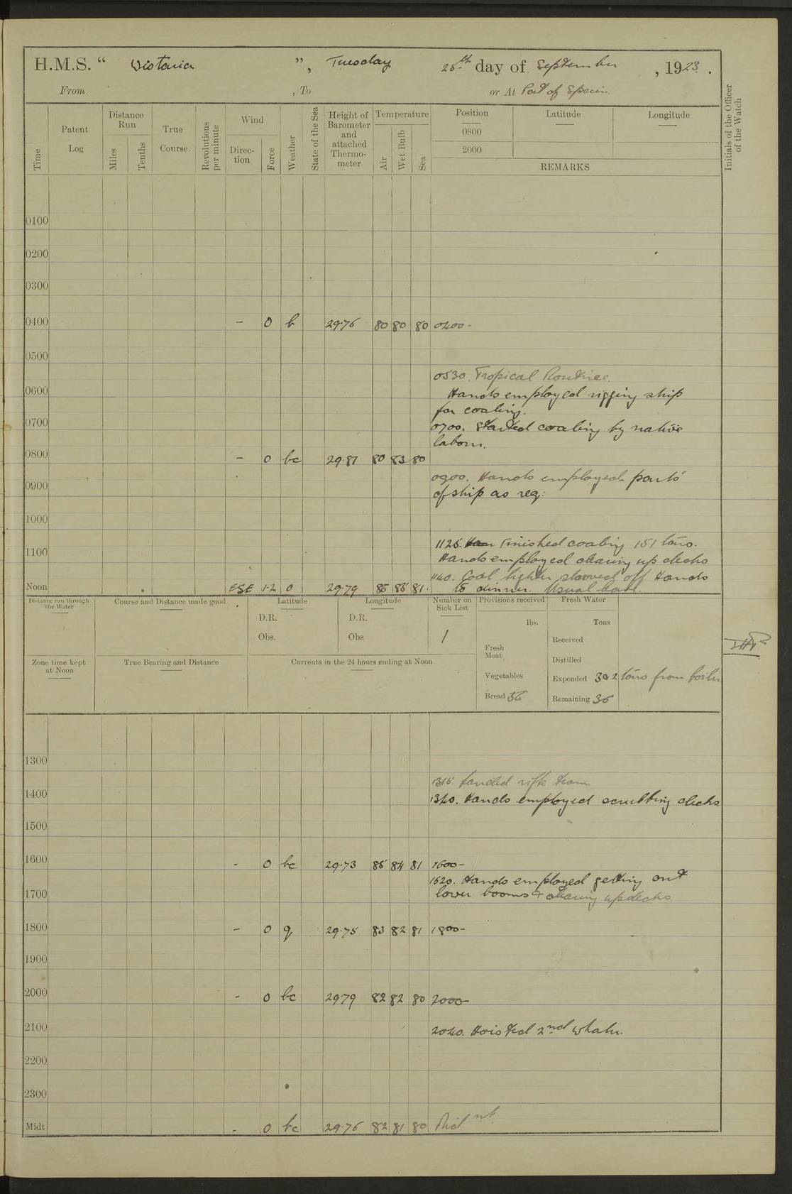 LOGS FOR JULY 1921 4f73ca38a2fc8ea903000a41: (https://s3.amazonaws.com:443/oldweather/ADM53-93262/0003_1.jpg) 1 July 1921 At Port Royal Lat 17.93, Long -76.83 8.15am: 1st whaler diving party. Clear up decks 9.30am: Ord. Seamen & boys muster bags. Remainder part of ship 1.45pm: Hands mustered for monthly payment 2.15pm: Diving party & side party employed. Rest part of ship 4f73ca38a2fc8ea903000a42: (https://s3.amazonaws.com:443/oldweather/ADM53-93262/0004_0.jpg) 2 July 1921 At Port Royal Lat 17.93, Long -76.83 8.15am: Cleaned ship 8.0pm: Concert party landed 8.45pm: Fire party landed 9.45pm: Fire party returned 10.40pm: Fire party landed 4f73ca39a2fc8ea903000a43: (https://s3.amazonaws.com:443/oldweather/ADM53-93262/0004_1.jpg) 3 July 1921 At Port Royal Lat 17.93, Long -76.83 6.30am: Cleaned ship 10.0am: Divisions Number on sick list: 2 4f73ca39a2fc8ea903000a44: (https://s3.amazonaws.com:443/oldweather/ADM53-93262/0005_0.jpg) 4 July 1921 At Port Royal Lat 17.93, Long -76.83 8.15am: Hands employed on boats & part of ship 2.0pm: Embarked 6” projectiles 10.30pm: Left harbour for Morant Cays. Course & speed as requisite 11.20pm: Dumped ammunition Number on sick list: 1 4f73ca39a2fc8ea903000a45: (https://s3.amazonaws.com:443/oldweather/ADM53-93262/0005_1.jpg) 5 July 1921 From Morant Cays-Port Royal to Port Royal-Morant Cays Lat 17.93, Long -76.83 6.20am: Sighted Morant Cays ahead 7.20am: Anchored and landed survey party am: Hands employed part of ship. Relief control parties exercised 10.40am: Weighed & proceeded 2.0pm: Hands employed chipping & painting boat deck & squaring off upper deck 3.10pm: Sighted Plum Point on Starboard bow 4.40pm: Stopped & manoeuvred as required for ship photograph to be taken 5.15pm: Secured alongside waling jetty. Leave to watch 4f73ca3aa2fc8ea903000a46: (https://s3.amazonaws.com:443/oldweather/ADM53-93262/0006_0.jpg) 6 July 1921 At Port Royal Lat 17.93, Long -76.83 9.25am: Hands employed parts of ship and six hands at small arm drill 2.0pm: Hands employed preparing ship for coaling 4.20pm: O.S. III Seabrook rejoined ship from hospital Number on sick list: 2 4f73ca3aa2fc8ea903000a47: (https://s3.amazonaws.com:443/oldweather/ADM53-93262/0006_1.jpg) 7 July 1921 At Port Royal Lat 17.93, Long -76.83 5.30am: Sanded decks 7.0am: Coaled ship with native labour 8.15am: Hands employed cleaning boats 11.20am: Finished coaling. Wash down & scrub upper deck Number on sick list: 4 4f73ca3aa2fc8ea903000a48: (https://s3.amazonaws.com:443/oldweather/ADM53-93262/0007_0.jpg) 8 July 1921 At Port Royal Lat 17.93, Long -76.83 8.15am: Hands employed cleaning paintwork & 3 hands about seine net 1.40pm: Starboard watch employed getting mine sweeping gear inboard 2.0pm: Port watch employed part of ship 3.0pm: Starboard watch employed part of ship 4.0pm: Tea. Ship put in quarantine 5.10pm: Surgeon McCallum left ship for military hospital Number on sick list: 1 [Surgeon McCallum: perhaps Surgeon Archie McCallum] 4f73ca3ba2fc8ea903000a49: (https://s3.amazonaws.com:443/oldweather/ADM53-93262/0007_1.jpg) 9 July 1921 At Port Royal Lat 17.93, Long -76.83 6.45am: Party left for isolation hospital to fumigate gear 11.50am: Air bedding 2.40pm: Bathing party landed 3.30pm: Bathing party returned 5.0pm: All hands vaccinated 4f73ca3ba2fc8ea903000a4a: (https://s3.amazonaws.com:443/oldweather/ADM53-93262/0008_0.jpg) 10 July 1921 At Port Royal Lat 17.93, Long -76.83 am: Parties sent to isolation hospital for fumigation 9.0am: Hands employed clearing mess decks & clearing up decks am: Parties sent for fumigation 1.0pm: All fumigation parties returned 5.15pm: Watch coaled picket boat Number on sick list: 1 4f73ca3ca2fc8ea903000a4b: (https://s3.amazonaws.com:443/oldweather/ADM53-93262/0008_1.jpg) 11 July 1921 From Port Royal to Bermuda and at Port Royal Lat 17.86, Long -76.63 8.15am: Furled forecastle awning 9.25am: Secured ship for sea 10.15am: Left Jetty 11.0am: Streamed patent log 11.01am: Plum Pt bearing N20E. Altered course S71E 3.15pm: Morant Pt bore N7W 3.30pm: Morant Pt bore N73W 6.45pm: Morant Pt bore S69W 9.35pm: Navassa Lt bearing S37E 10.32pm: Navassa Lt abeam 11.30pm: Navassa Lt bearing S24E True Bearing and Distance: Plum Pt Lt 294½°, 90 miles 4f73ca3ca2fc8ea903000a4c: (https://s3.amazonaws.com:443/oldweather/ADM53-93262/0009_0.jpg) 12 July 1921 From Port Royal to Bermuda Lat 20.18, Long -74.01 7.0am: Sighted Cuban mountains on Port bow 8.50am: Furled boat deck awning 9.35am: Exercised control parties, hands employed turning motor boats falls end for end, scarping & painting 2.0pm: Hands employed as forenoon 4.02pm: Sighted Great Inagua Lt Ho N48E 5.15pm: Course as required for re-charging telemotor system 5.38pm: Great Inagua Lt Ho abeam, 7 miles 6.30pm: N.W. Pt abeam, 1 mile True Bearing and Distance: Cape Maysi Lt Ho 299½°, 7¼ miles 4f73ca3ca2fc8ea903000a4d: (https://s3.amazonaws.com:443/oldweather/ADM53-93262/0009_1.jpg) 13 July 1921 From Port Royal to Bermuda Lat 23.13, Long -71.83 9.40am: Hands employed fitting new streaming light halliyards, scraping & cleaning part of ship 2.0pm: Hands employed scraping, painting & redleading parts of ship True Bearing and Distance: Gibbs Hill Lt Ho 034¼°, 672 miles 4f73ca3da2fc8ea903000a4e: (https://s3.amazonaws.com:443/oldweather/ADM53-93262/0010_0.jpg) 14 July 1921 From Port Royal to Bermuda Lat 25.91, Long -69.55 2.10am: Hauled in Patent log to clear it 2.15am: Log streamed 9.0am: Hauled in patent log 9.30am: Hands employed mustering bags & hammocks 2.0pm: Hands scrub hammocks 4.0pm: Evening Quarters. Exercised collision stations 5.0pm: Put clocks on 20 minutes True Bearing and Distance: Gibbs Hill Lt Ho 034°, 452 miles 4f73ca3da2fc8ea903000a4f: (https://s3.amazonaws.com:443/oldweather/ADM53-93262/0010_1.jpg) 15 July 1921 From Port Royal to Bermuda Lat 29.03, Long -67.18 9.40am: Exercised action stations. Fired one belt of ammunition from each pom pom 10.30am: Ord. Sea & boys to school. Pom Pom’s crews working about guns, remainders chip