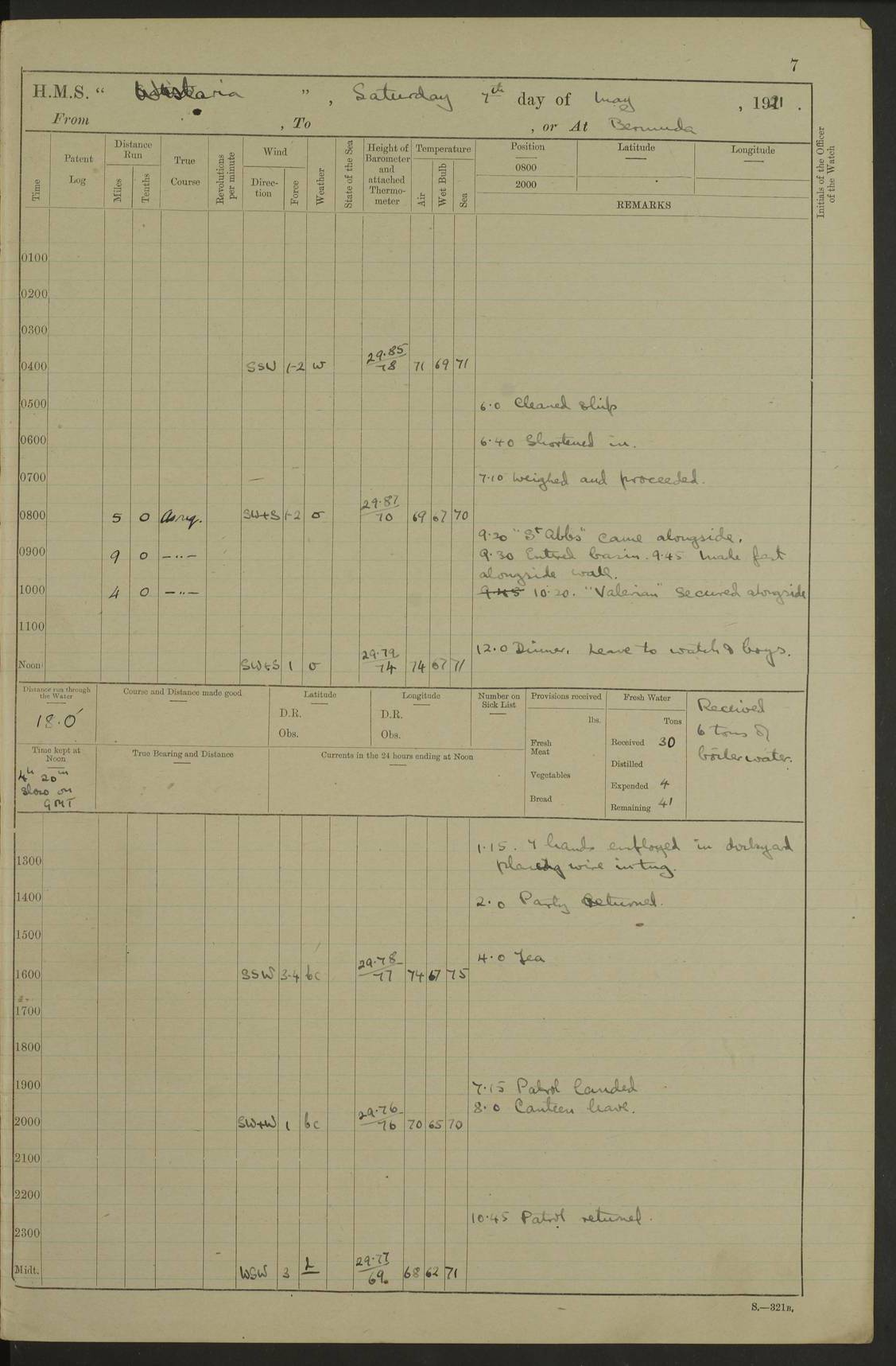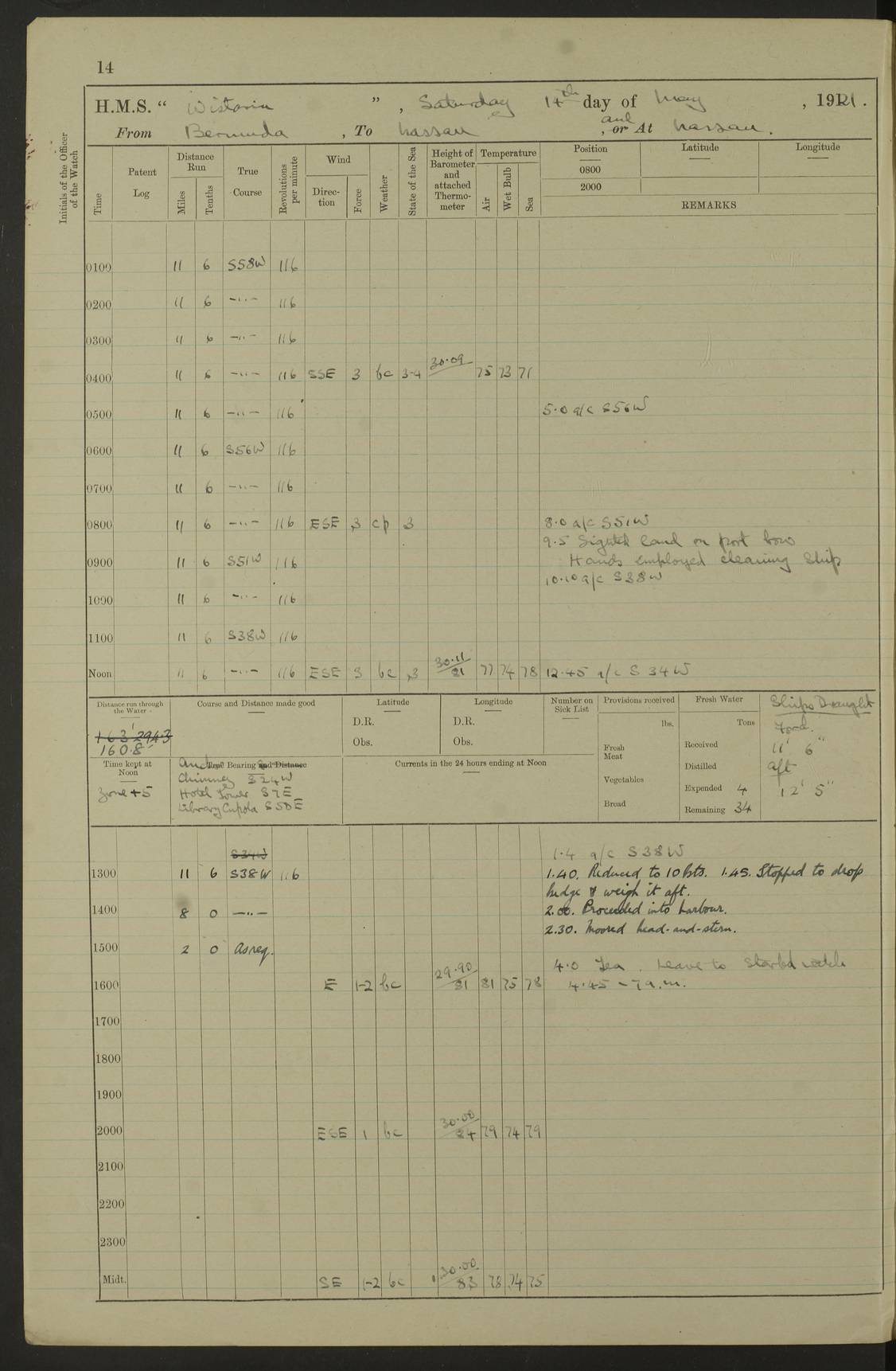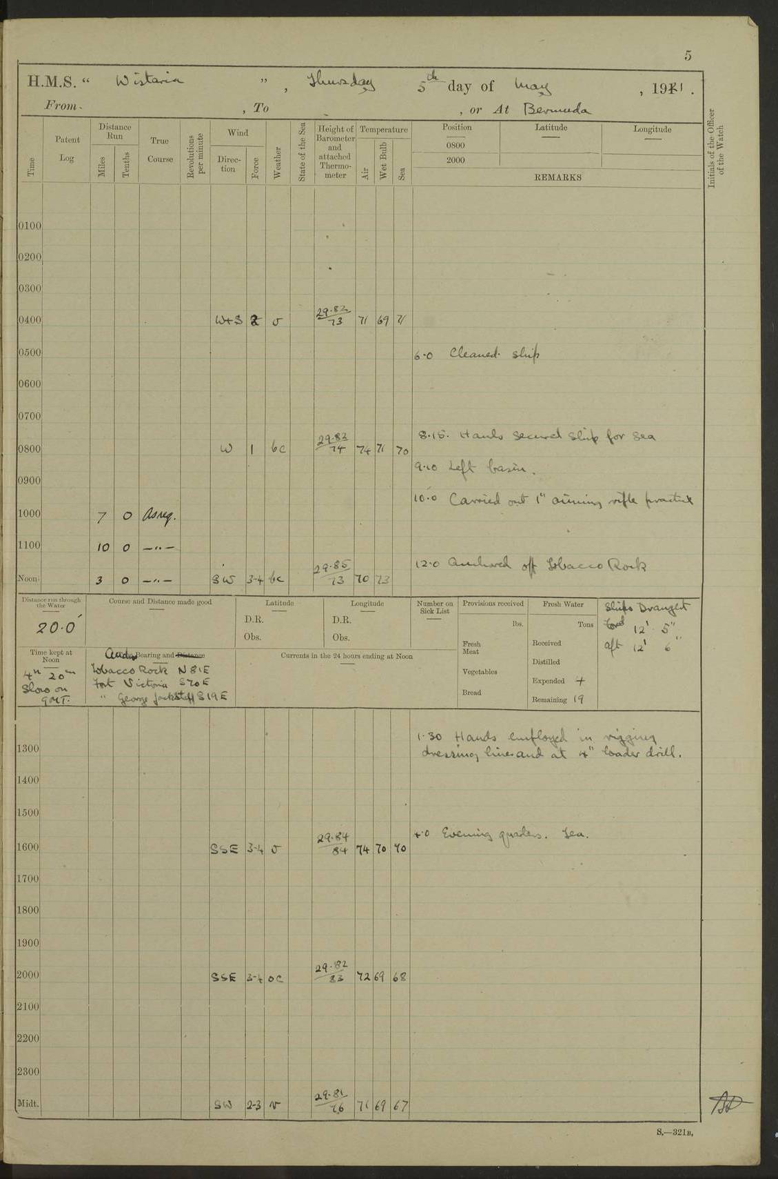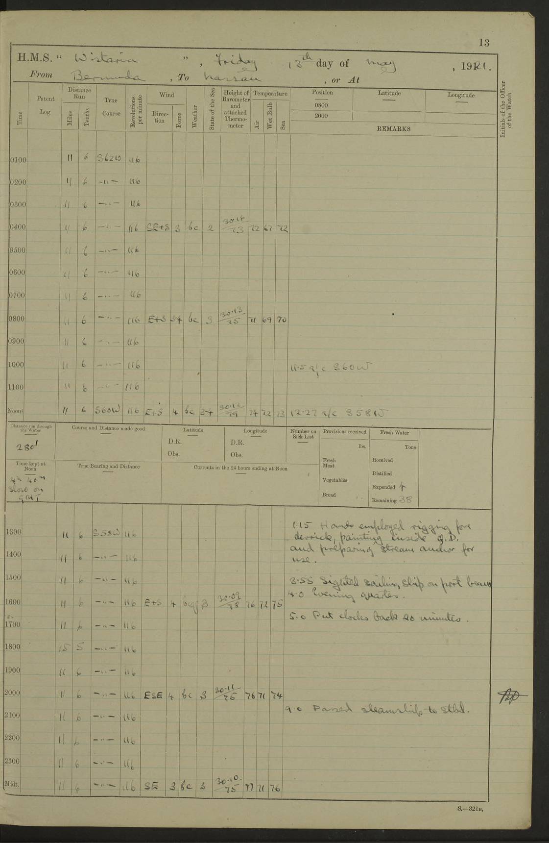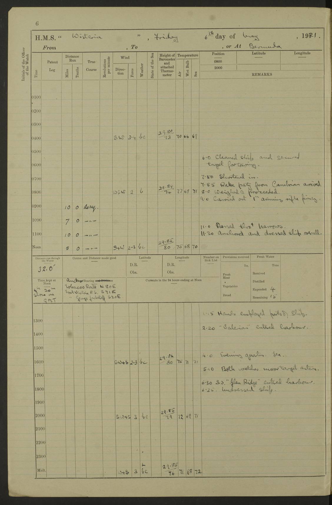 LOGS FOR MAY 1921 4f73ca1da2fc8ea9030009f9: (https://s3.amazonaws.com:443/oldweather/ADM53-93261/0003_1.jpg) 1 May 1921 At Bermuda Lat 32.32, Long -64.8 10.0am: Landed church parties 4f73ca1ea2fc8ea9030009fa: (https://s3.amazonaws.com:443/oldweather/ADM53-93261/0004_0.jpg) 2 May 1921 At Bermuda Lat 32.32, Long -64.8 7.50am: “Creole” came alongside 8.15am: Hands employed shifting ammunition & cleaning paintwork Crocker (Sto) returned from hospital. 4 ratings lent to “Malabar” returned [“Malabar”: perhaps HMS “Malabar”, a shore establishment in Bermuda between 1919 and 1951, and 1965 and 1995] 4f73ca1ea2fc8ea9030009fb: (https://s3.amazonaws.com:443/oldweather/ADM53-93261/0004_1.jpg) 3 May 1921 At Bermuda Lat 32.32, Long -64.8 8.10am: “Tamar” arrived in basin 8.15am: Hands employed furling Q.D. awning 8.30am: Range Party landed 4.0pm: Tea. Leave to watch. Leading Stoker Tillman discharged to hospital 4f73ca1ea2fc8ea9030009fc: (https://s3.amazonaws.com:443/oldweather/ADM53-93261/0005_0.jpg) 4 May 1921 At Bermuda Lat 32.32, Long -64.8 8.0am: Hands employed in dockyard Wright, A.B., returned from hospital Horide, Ord. S., discharged to hospital 1.15pm: Hands employed refitting gear 4f73ca1fa2fc8ea9030009fd: (https://s3.amazonaws.com:443/oldweather/ADM53-93261/0005_1.jpg) 5 May 1921 At Bermuda Lat 32.32, Long -64.8 8.15am: Hands secured ship for sea 9.10am: Left basin 10.0am: Carried out 1” aiming rifle practice noon: Anchored off Tobacco Rock Anchor Bearings: Tobacco Rock N81E, Fort Victoria S70E, Fort George jackstaff S19E 1.30pm: Hands employed in rigging dressing lines at 4” loader drill 4f73ca1fa2fc8ea9030009fe: (https://s3.amazonaws.com:443/oldweather/ADM53-93261/0006_0.jpg) 6 May 1921 At Bermuda Lat 32.32, Long -64.8 6.0am: Cleaned ship and secured target for towing 7.50am: Shortened in 7.55am: Rake party from “Cambrian” arrived 8.0am: Weighed & proceeded 9.0am: Carried out 1” aiming rifle firing 11.0am: Passed through narrows 11.30am: Anchored and dressed ship overall Anchor Bearings: Tobacco Rock N80E, Fort Victoria F. S. S71E, Fort George jackstaff S20E 1.15pm: Hands employed parts of ship 2.20pm: “Valerian” entered harbour 5.10pm: Both watches moor target astern 6.30pm: SS “Glen Ridge” entered harbour 6.35pm: Undressed ship [SS “Glen Ridge”: perhaps misspelt SS “Glenbridge” built 1911] 4f73ca20a2fc8ea9030009ff: (https://s3.amazonaws.com:443/oldweather/ADM53-93261/0006_1.jpg) 7 May 1921 At Bermuda Lat 32.32, Long -64.8 6.40am: Shortened in 7.10am: Weighed and proceeded 9.20am: “St Abbs” came alongside 9.30am: Entered basin 9.45am: Made fast alongside wall 1.15pm: 7 hands employed in dockyard placing wire in tug 2.0pm: Party returned 7.15pm: Patrol landed 4f73ca20a2fc8ea903000a00: (https://s3.amazonaws.com:443/oldweather/ADM53-93261/0007_0.jpg) 8 May 1921 At Bermuda Lat 32.32, Long -64.8 8.45am: Clear up decks for divisions 9.0am: R.C. Church party landed 10.0am: Divisions. Church of England party landed 4f73ca20a2fc8ea903000a01: (https://s3.amazonaws.com:443/oldweather/ADM53-93261/0007_1.jpg) 9 May 1921 At Bermuda Lat 32.32, Long -64.8 6.0am: Furled Q.D. awning & cleaned ship 8.30am: Left basin 9.0am: Proceeded to sea for 4” full calibre exercise 11.15am: Finished firing & returned to harbour 1.15pm: Anchored off dockyard 1.40pm: “Valerian” proceeded into basin 2.40pm: Proceeded into basin 3.15pm: Secured alongside wall 6.50pm: Shifted lighter from “Valerian” 7.25pm: Coal lighter secured alongside 4f73ca21a2fc8ea903000a02: (https://s3.amazonaws.com:443/oldweather/ADM53-93261/0008_0.jpg) 10 May 1921 At Bermuda Lat 32.32, Long -64.8 5.0am: Hands prepared to coal ship 5.40am: Coal ship 9.30am: Finished coaling. Hands cleaned ship 4f73ca21a2fc8ea903000a03: (https://s3.amazonaws.com:443/oldweather/ADM53-93261/0008_1.jpg) 11 May 1921 At Bermuda Lat 32.32, Long -64.8 8.15am: Hands employed clearing up ship & painting outside Captain’s cabin 1.15pm: Hands employed returning main derrick to store & securing ship for sea 2.15pm: Three rating returned from hospital 2.55pm: One leading seaman joined ship from “Constance” 4.30pm: Left basin 5.0pm: Course as required for ship channel. Speed 11 knots 5.59pm: Fairway buoy abeam. Course S15E 6.0pm: Streamed patent log 7.16pm: Gibbs Hill Lt abeam, 1¾ miles 4f73ca21a2fc8ea903000a04: (https://s3.amazonaws.com:443/oldweather/ADM53-93261/0009_0.jpg) 12 May 1921 From Bermuda to Nassau [No coordinates available] 7.30am: Log fouled by weed 7.40am: Cleared & streamed log 9.10am: Hands to divisions with night clothing 9.30am: Hands employed with parts of ship 11.25am: Hove in log on account of weed 5.0pm: Put clocks back 20 minutes 4f73ca22a2fc8ea903000a05: (https://s3.amazonaws.com:443/oldweather/ADM53-93261/0009_1.jpg) 13 May 1921 From Bermuda to Nassau [No coordinates available] 1.15pm: Hands employed rigging fore derrick, painting inside Q.D. and preparing stream anchor for use 3.55pm: Sighted sailing ship on port beam 5.0pm: Put clocks back 20 minutes 9.0pm: Passed steamship to Starboard 4f73ca22a2fc8ea903000a06: (https://s3.amazonaws.com:443/oldweather/ADM53-93261/0010_0.jpg) 14 May 1921 From Bermuda to Nassau and at Nassau Lat 20.57, Long -77.3 9.05am: Sighted land on Port bow. Hands employed cleaning ship 1.45pm: Stopped to drop kedge & weigh it up 2.0pm: Proceeded into harbour 2.30pm: Moored head-and-stern Anchor bearings: Chimney S24W, Hotel Tower S7E, Library Cupola S50E 4f73ca23a2fc8ea903000a07: (https://s3.amazonaws.com:443/oldweather/ADM53-93261/0010_1.jpg) 15 May 1921 At Nassau Lat 20.57, Long -77.3 6.15am: Cleaned ship 10.10am: Church 4f73ca23a2fc8ea903000a08: (https://s3.amazonaws.com:443/oldweather/ADM53-93261/0011_0.jpg) 16 May 1921 At Nassau Lat 20.57, Long -77.3 5.30am: Hands employed rigging stages for painting 8.15am: Hands cleaning & painting ship Lost by accident 1 paint brush 2.0pm: Hands employed as forenoon 5.0pm: Hands to bathe 4f73ca23a2fc8ea903000a09: (https://s3.a