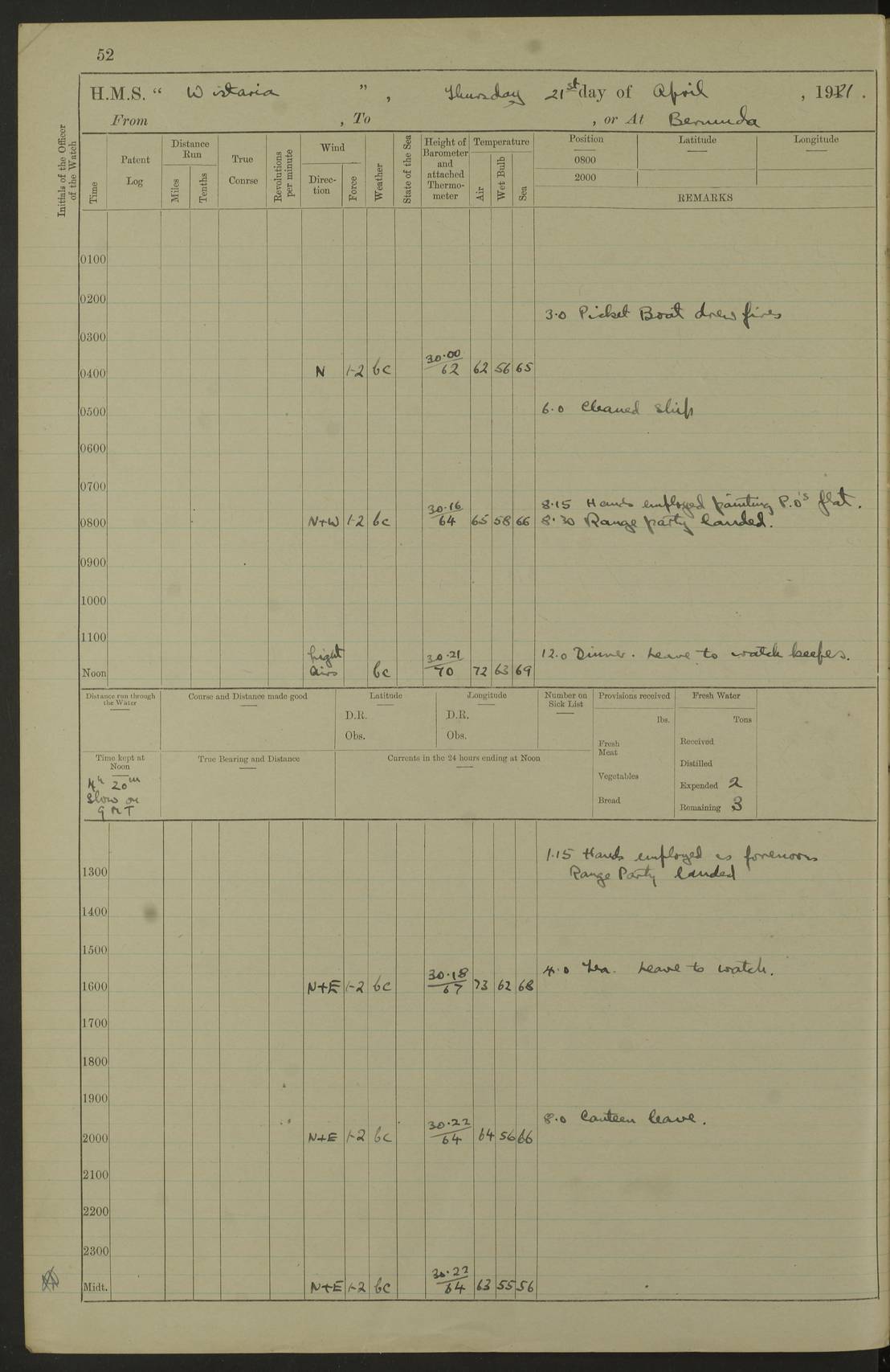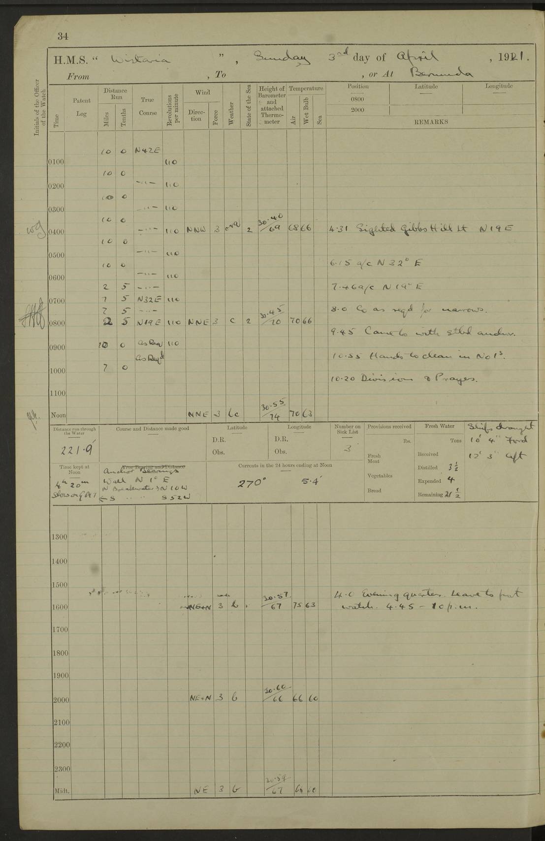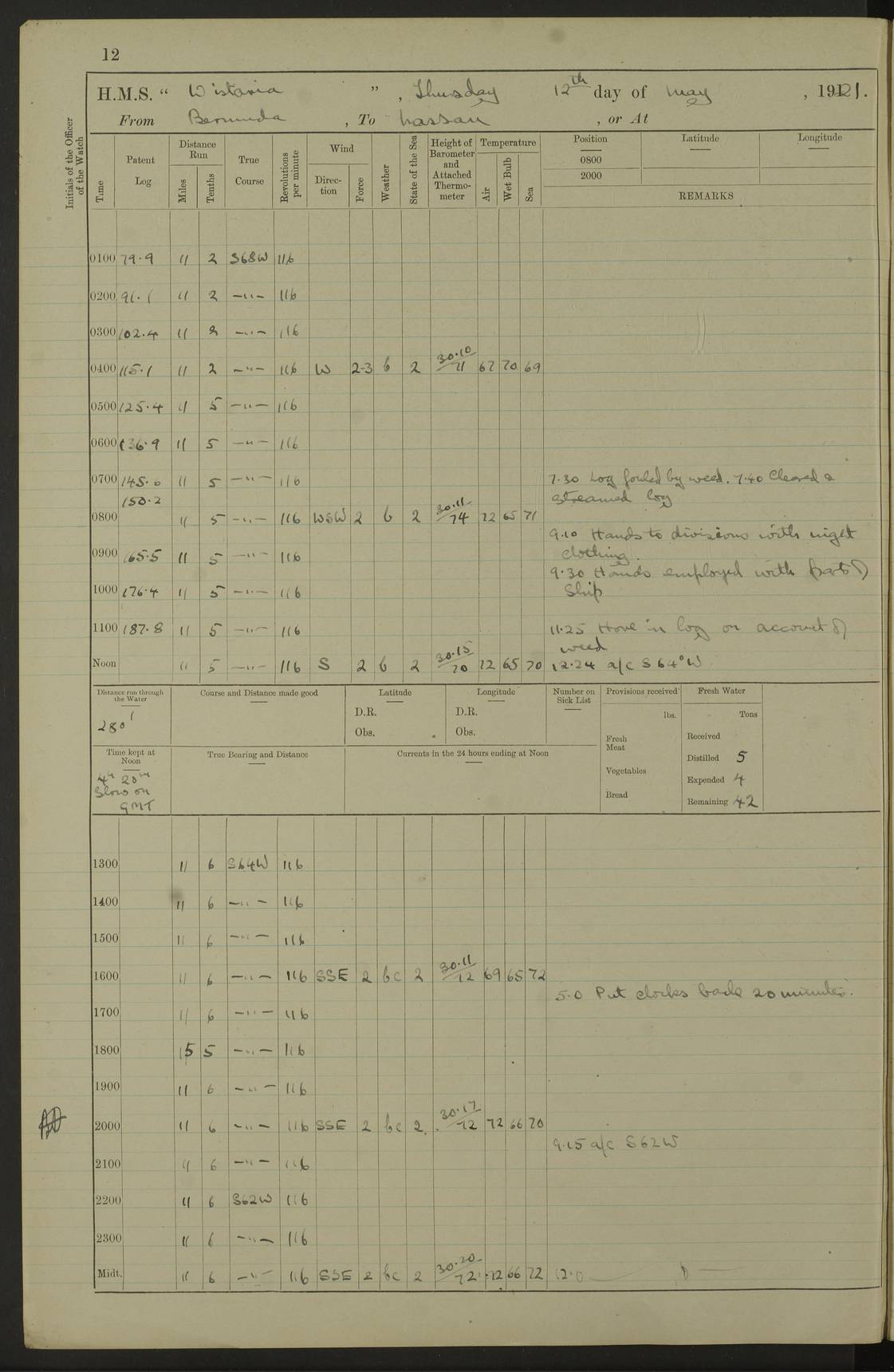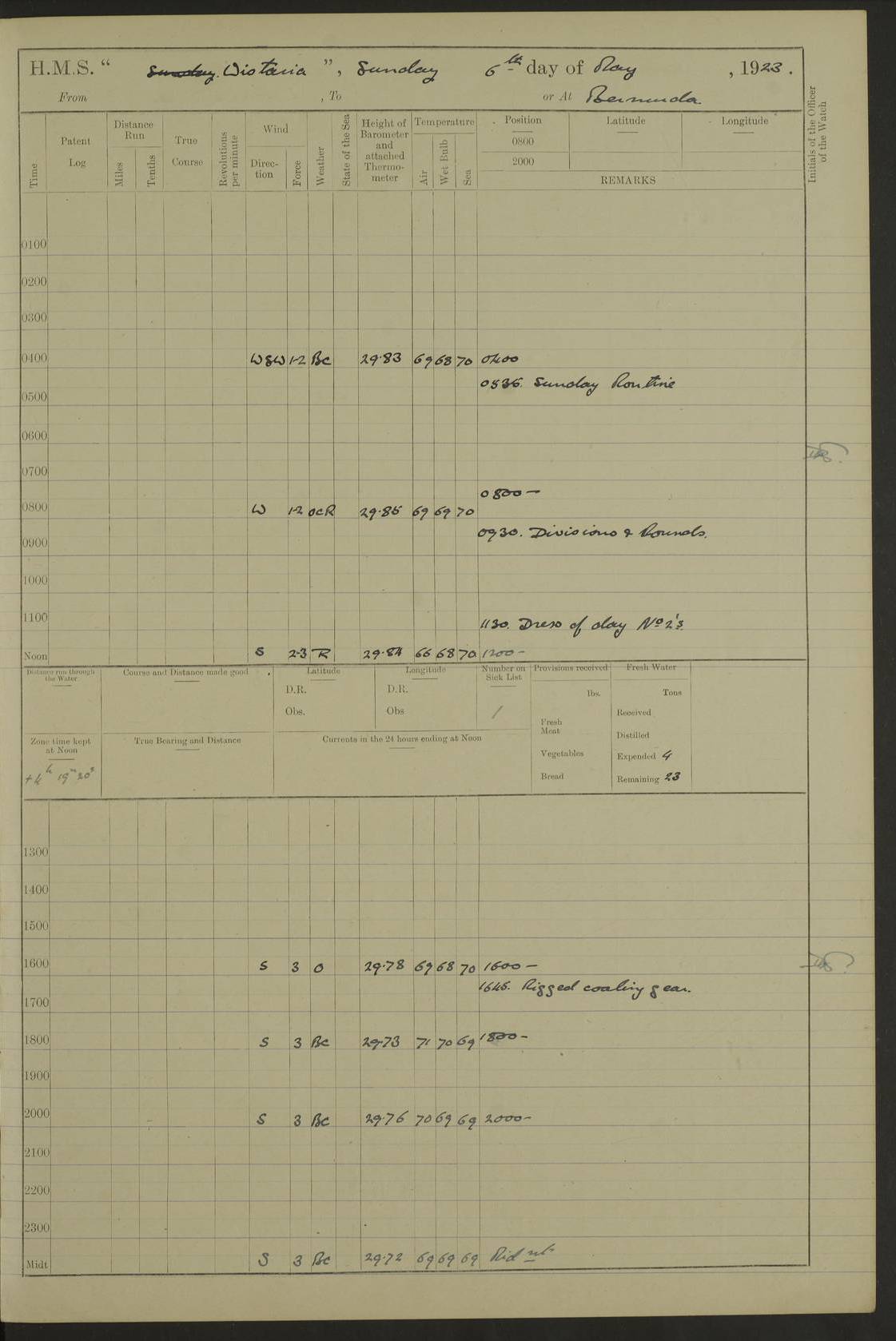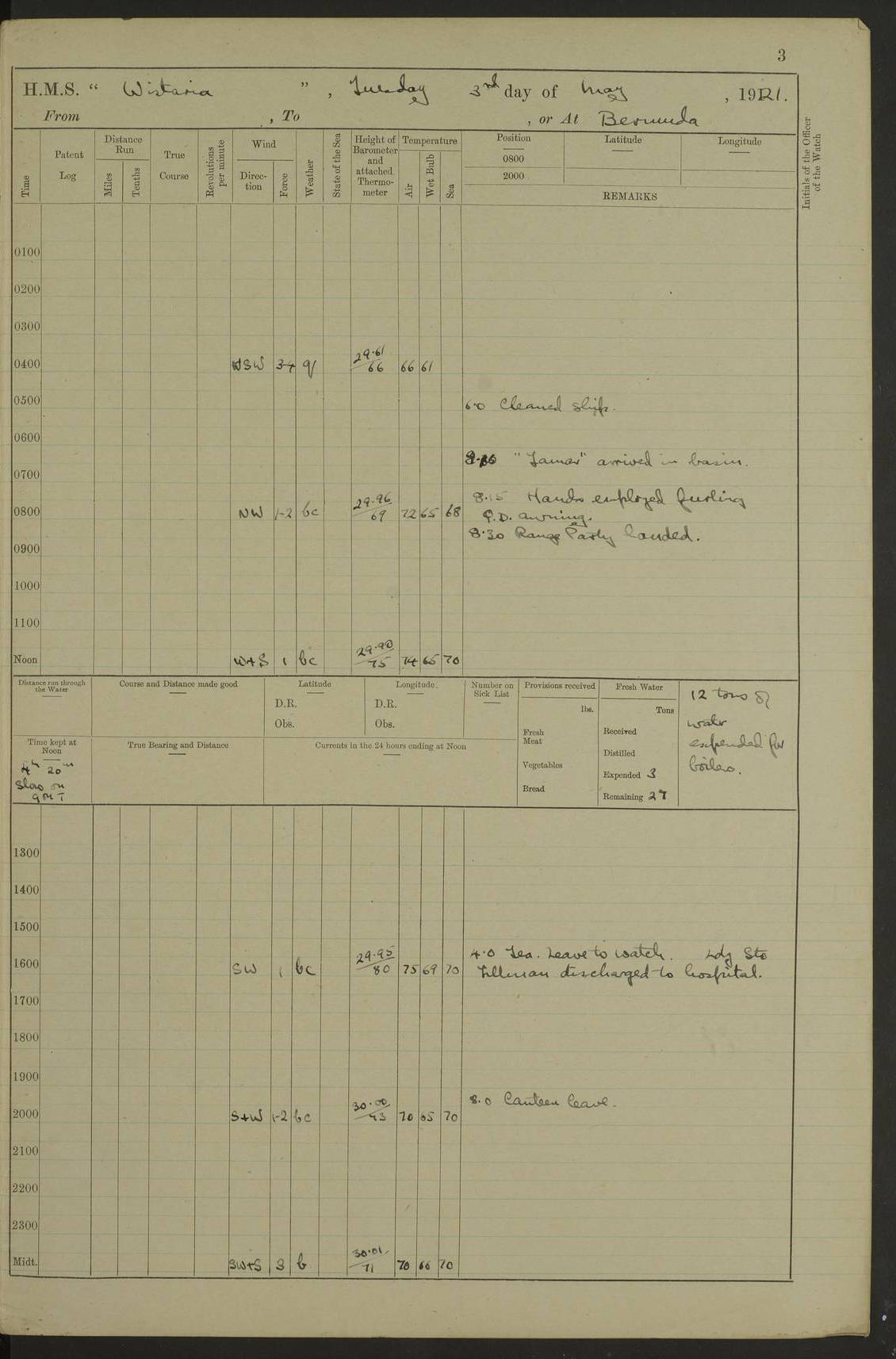 LOGS FOR MAY 1921 4f73ca1da2fc8ea9030009f9: (https://s3.amazonaws.com:443/oldweather/ADM53-93261/0003_1.jpg) 1 May 1921 At Bermuda Lat 32.32, Long -64.8 10.0am: Landed church parties 4f73ca1ea2fc8ea9030009fa: (https://s3.amazonaws.com:443/oldweather/ADM53-93261/0004_0.jpg) 2 May 1921 At Bermuda Lat 32.32, Long -64.8 7.50am: “Creole” came alongside 8.15am: Hands employed shifting ammunition & cleaning paintwork Crocker (Sto) returned from hospital. 4 ratings lent to “Malabar” returned [“Malabar”: perhaps HMS “Malabar”, a shore establishment in Bermuda between 1919 and 1951, and 1965 and 1995] 4f73ca1ea2fc8ea9030009fb: (https://s3.amazonaws.com:443/oldweather/ADM53-93261/0004_1.jpg) 3 May 1921 At Bermuda Lat 32.32, Long -64.8 8.10am: “Tamar” arrived in basin 8.15am: Hands employed furling Q.D. awning 8.30am: Range Party landed 4.0pm: Tea. Leave to watch. Leading Stoker Tillman discharged to hospital 4f73ca1ea2fc8ea9030009fc: (https://s3.amazonaws.com:443/oldweather/ADM53-93261/0005_0.jpg) 4 May 1921 At Bermuda Lat 32.32, Long -64.8 8.0am: Hands employed in dockyard Wright, A.B., returned from hospital Horide, Ord. S., discharged to hospital 1.15pm: Hands employed refitting gear 4f73ca1fa2fc8ea9030009fd: (https://s3.amazonaws.com:443/oldweather/ADM53-93261/0005_1.jpg) 5 May 1921 At Bermuda Lat 32.32, Long -64.8 8.15am: Hands secured ship for sea 9.10am: Left basin 10.0am: Carried out 1” aiming rifle practice noon: Anchored off Tobacco Rock Anchor Bearings: Tobacco Rock N81E, Fort Victoria S70E, Fort George jackstaff S19E 1.30pm: Hands employed in rigging dressing lines at 4” loader drill 4f73ca1fa2fc8ea9030009fe: (https://s3.amazonaws.com:443/oldweather/ADM53-93261/0006_0.jpg) 6 May 1921 At Bermuda Lat 32.32, Long -64.8 6.0am: Cleaned ship and secured target for towing 7.50am: Shortened in 7.55am: Rake party from “Cambrian” arrived 8.0am: Weighed & proceeded 9.0am: Carried out 1” aiming rifle firing 11.0am: Passed through narrows 11.30am: Anchored and dressed ship overall Anchor Bearings: Tobacco Rock N80E, Fort Victoria F. S. S71E, Fort George jackstaff S20E 1.15pm: Hands employed parts of ship 2.20pm: “Valerian” entered harbour 5.10pm: Both watches moor target astern 6.30pm: SS “Glen Ridge” entered harbour 6.35pm: Undressed ship [SS “Glen Ridge”: perhaps misspelt SS “Glenbridge” built 1911] 4f73ca20a2fc8ea9030009ff: (https://s3.amazonaws.com:443/oldweather/ADM53-93261/0006_1.jpg) 7 May 1921 At Bermuda Lat 32.32, Long -64.8 6.40am: Shortened in 7.10am: Weighed and proceeded 9.20am: “St Abbs” came alongside 9.30am: Entered basin 9.45am: Made fast alongside wall 1.15pm: 7 hands employed in dockyard placing wire in tug 2.0pm: Party returned 7.15pm: Patrol landed 4f73ca20a2fc8ea903000a00: (https://s3.amazonaws.com:443/oldweather/ADM53-93261/0007_0.jpg) 8 May 1921 At Bermuda Lat 32.32, Long -64.8 8.45am: Clear up decks for divisions 9.0am: R.C. Church party landed 10.0am: Divisions. Church of England party landed 4f73ca20a2fc8ea903000a01: (https://s3.amazonaws.com:443/oldweather/ADM53-93261/0007_1.jpg) 9 May 1921 At Bermuda Lat 32.32, Long -64.8 6.0am: Furled Q.D. awning & cleaned ship 8.30am: Left basin 9.0am: Proceeded to sea for 4” full calibre exercise 11.15am: Finished firing & returned to harbour 1.15pm: Anchored off dockyard 1.40pm: “Valerian” proceeded into basin 2.40pm: Proceeded into basin 3.15pm: Secured alongside wall 6.50pm: Shifted lighter from “Valerian” 7.25pm: Coal lighter secured alongside 4f73ca21a2fc8ea903000a02: (https://s3.amazonaws.com:443/oldweather/ADM53-93261/0008_0.jpg) 10 May 1921 At Bermuda Lat 32.32, Long -64.8 5.0am: Hands prepared to coal ship 5.40am: Coal ship 9.30am: Finished coaling. Hands cleaned ship 4f73ca21a2fc8ea903000a03: (https://s3.amazonaws.com:443/oldweather/ADM53-93261/0008_1.jpg) 11 May 1921 At Bermuda Lat 32.32, Long -64.8 8.15am: Hands employed clearing up ship & painting outside Captain’s cabin 1.15pm: Hands employed returning main derrick to store & securing ship for sea 2.15pm: Three rating returned from hospital 2.55pm: One leading seaman joined ship from “Constance” 4.30pm: Left basin 5.0pm: Course as required for ship channel. Speed 11 knots 5.59pm: Fairway buoy abeam. Course S15E 6.0pm: Streamed patent log 7.16pm: Gibbs Hill Lt abeam, 1¾ miles 4f73ca21a2fc8ea903000a04: (https://s3.amazonaws.com:443/oldweather/ADM53-93261/0009_0.jpg) 12 May 1921 From Bermuda to Nassau [No coordinates available] 7.30am: Log fouled by weed 7.40am: Cleared & streamed log 9.10am: Hands to divisions with night clothing 9.30am: Hands employed with parts of ship 11.25am: Hove in log on account of weed 5.0pm: Put clocks back 20 minutes 4f73ca22a2fc8ea903000a05: (https://s3.amazonaws.com:443/oldweather/ADM53-93261/0009_1.jpg) 13 May 1921 From Bermuda to Nassau [No coordinates available] 1.15pm: Hands employed rigging fore derrick, painting inside Q.D. and preparing stream anchor for use 3.55pm: Sighted sailing ship on port beam 5.0pm: Put clocks back 20 minutes 9.0pm: Passed steamship to Starboard 4f73ca22a2fc8ea903000a06: (https://s3.amazonaws.com:443/oldweather/ADM53-93261/0010_0.jpg) 14 May 1921 From Bermuda to Nassau and at Nassau Lat 20.57, Long -77.3 9.05am: Sighted land on Port bow. Hands employed cleaning ship 1.45pm: Stopped to drop kedge & weigh it up 2.0pm: Proceeded into harbour 2.30pm: Moored head-and-stern Anchor bearings: Chimney S24W, Hotel Tower S7E, Library Cupola S50E 4f73ca23a2fc8ea903000a07: (https://s3.amazonaws.com:443/oldweather/ADM53-93261/0010_1.jpg) 15 May 1921 At Nassau Lat 20.57, Long -77.3 6.15am: Cleaned ship 10.10am: Church 4f73ca23a2fc8ea903000a08: (https://s3.amazonaws.com:443/oldweather/ADM53-93261/0011_0.jpg) 16 May 1921 At Nassau Lat 20.57, Long -77.3 5.30am: Hands employed rigging stages for painting 8.15am: Hands cleaning & painting ship Lost by accident 1 paint brush 2.0pm: Hands employed as forenoon 5.0pm: Hands to bathe 4f73ca23a2fc8ea903000a09: (https://s3.a