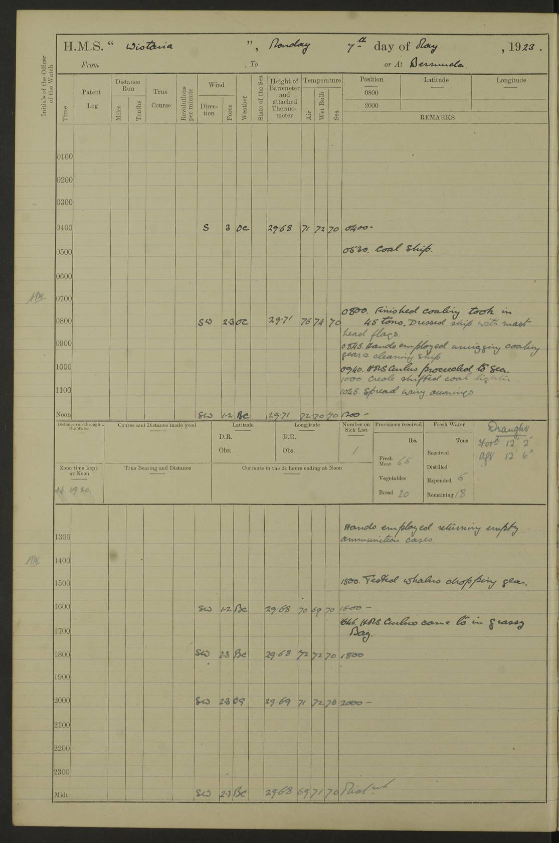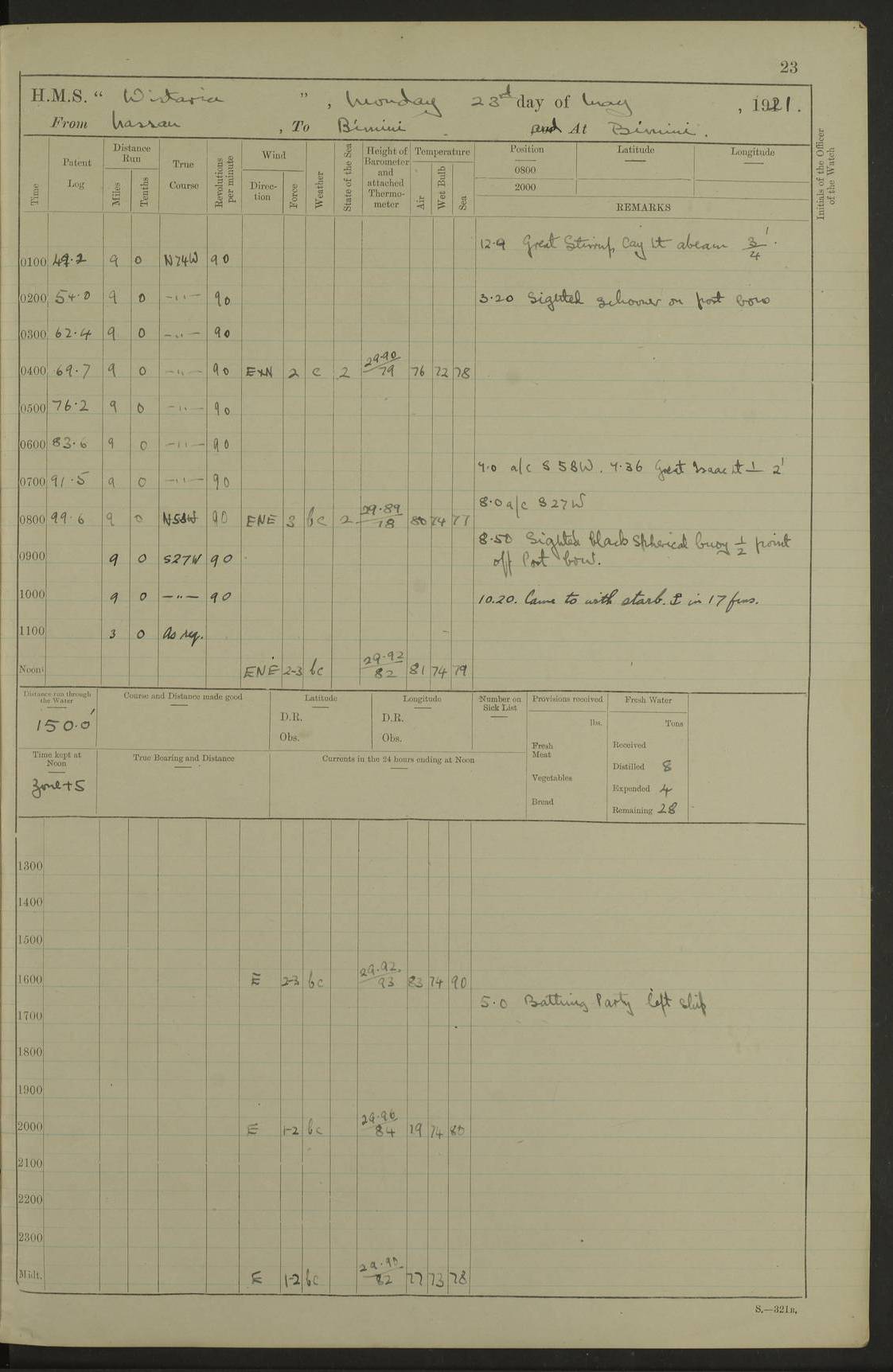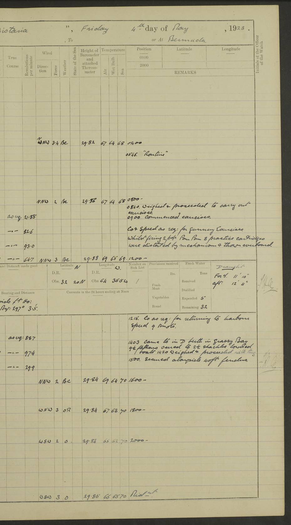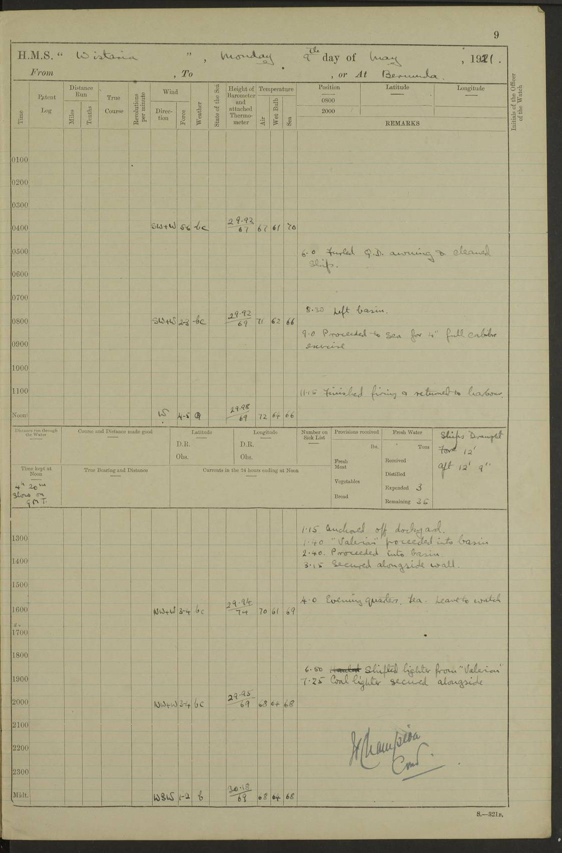 LOGS FOR MAY 1921 4f73ca1da2fc8ea9030009f9: (https://s3.amazonaws.com:443/oldweather/ADM53-93261/0003_1.jpg) 1 May 1921 At Bermuda Lat 32.32, Long -64.8 10.0am: Landed church parties 4f73ca1ea2fc8ea9030009fa: (https://s3.amazonaws.com:443/oldweather/ADM53-93261/0004_0.jpg) 2 May 1921 At Bermuda Lat 32.32, Long -64.8 7.50am: “Creole” came alongside 8.15am: Hands employed shifting ammunition & cleaning paintwork Crocker (Sto) returned from hospital. 4 ratings lent to “Malabar” returned [“Malabar”: perhaps HMS “Malabar”, a shore establishment in Bermuda between 1919 and 1951, and 1965 and 1995] 4f73ca1ea2fc8ea9030009fb: (https://s3.amazonaws.com:443/oldweather/ADM53-93261/0004_1.jpg) 3 May 1921 At Bermuda Lat 32.32, Long -64.8 8.10am: “Tamar” arrived in basin 8.15am: Hands employed furling Q.D. awning 8.30am: Range Party landed 4.0pm: Tea. Leave to watch. Leading Stoker Tillman discharged to hospital 4f73ca1ea2fc8ea9030009fc: (https://s3.amazonaws.com:443/oldweather/ADM53-93261/0005_0.jpg) 4 May 1921 At Bermuda Lat 32.32, Long -64.8 8.0am: Hands employed in dockyard Wright, A.B., returned from hospital Horide, Ord. S., discharged to hospital 1.15pm: Hands employed refitting gear 4f73ca1fa2fc8ea9030009fd: (https://s3.amazonaws.com:443/oldweather/ADM53-93261/0005_1.jpg) 5 May 1921 At Bermuda Lat 32.32, Long -64.8 8.15am: Hands secured ship for sea 9.10am: Left basin 10.0am: Carried out 1” aiming rifle practice noon: Anchored off Tobacco Rock Anchor Bearings: Tobacco Rock N81E, Fort Victoria S70E, Fort George jackstaff S19E 1.30pm: Hands employed in rigging dressing lines at 4” loader drill 4f73ca1fa2fc8ea9030009fe: (https://s3.amazonaws.com:443/oldweather/ADM53-93261/0006_0.jpg) 6 May 1921 At Bermuda Lat 32.32, Long -64.8 6.0am: Cleaned ship and secured target for towing 7.50am: Shortened in 7.55am: Rake party from “Cambrian” arrived 8.0am: Weighed & proceeded 9.0am: Carried out 1” aiming rifle firing 11.0am: Passed through narrows 11.30am: Anchored and dressed ship overall Anchor Bearings: Tobacco Rock N80E, Fort Victoria F. S. S71E, Fort George jackstaff S20E 1.15pm: Hands employed parts of ship 2.20pm: “Valerian” entered harbour 5.10pm: Both watches moor target astern 6.30pm: SS “Glen Ridge” entered harbour 6.35pm: Undressed ship [SS “Glen Ridge”: perhaps misspelt SS “Glenbridge” built 1911] 4f73ca20a2fc8ea9030009ff: (https://s3.amazonaws.com:443/oldweather/ADM53-93261/0006_1.jpg) 7 May 1921 At Bermuda Lat 32.32, Long -64.8 6.40am: Shortened in 7.10am: Weighed and proceeded 9.20am: “St Abbs” came alongside 9.30am: Entered basin 9.45am: Made fast alongside wall 1.15pm: 7 hands employed in dockyard placing wire in tug 2.0pm: Party returned 7.15pm: Patrol landed 4f73ca20a2fc8ea903000a00: (https://s3.amazonaws.com:443/oldweather/ADM53-93261/0007_0.jpg) 8 May 1921 At Bermuda Lat 32.32, Long -64.8 8.45am: Clear up decks for divisions 9.0am: R.C. Church party landed 10.0am: Divisions. Church of England party landed 4f73ca20a2fc8ea903000a01: (https://s3.amazonaws.com:443/oldweather/ADM53-93261/0007_1.jpg) 9 May 1921 At Bermuda Lat 32.32, Long -64.8 6.0am: Furled Q.D. awning & cleaned ship 8.30am: Left basin 9.0am: Proceeded to sea for 4” full calibre exercise 11.15am: Finished firing & returned to harbour 1.15pm: Anchored off dockyard 1.40pm: “Valerian” proceeded into basin 2.40pm: Proceeded into basin 3.15pm: Secured alongside wall 6.50pm: Shifted lighter from “Valerian” 7.25pm: Coal lighter secured alongside 4f73ca21a2fc8ea903000a02: (https://s3.amazonaws.com:443/oldweather/ADM53-93261/0008_0.jpg) 10 May 1921 At Bermuda Lat 32.32, Long -64.8 5.0am: Hands prepared to coal ship 5.40am: Coal ship 9.30am: Finished coaling. Hands cleaned ship 4f73ca21a2fc8ea903000a03: (https://s3.amazonaws.com:443/oldweather/ADM53-93261/0008_1.jpg) 11 May 1921 At Bermuda Lat 32.32, Long -64.8 8.15am: Hands employed clearing up ship & painting outside Captain’s cabin 1.15pm: Hands employed returning main derrick to store & securing ship for sea 2.15pm: Three rating returned from hospital 2.55pm: One leading seaman joined ship from “Constance” 4.30pm: Left basin 5.0pm: Course as required for ship channel. Speed 11 knots 5.59pm: Fairway buoy abeam. Course S15E 6.0pm: Streamed patent log 7.16pm: Gibbs Hill Lt abeam, 1¾ miles 4f73ca21a2fc8ea903000a04: (https://s3.amazonaws.com:443/oldweather/ADM53-93261/0009_0.jpg) 12 May 1921 From Bermuda to Nassau [No coordinates available] 7.30am: Log fouled by weed 7.40am: Cleared & streamed log 9.10am: Hands to divisions with night clothing 9.30am: Hands employed with parts of ship 11.25am: Hove in log on account of weed 5.0pm: Put clocks back 20 minutes 4f73ca22a2fc8ea903000a05: (https://s3.amazonaws.com:443/oldweather/ADM53-93261/0009_1.jpg) 13 May 1921 From Bermuda to Nassau [No coordinates available] 1.15pm: Hands employed rigging fore derrick, painting inside Q.D. and preparing stream anchor for use 3.55pm: Sighted sailing ship on port beam 5.0pm: Put clocks back 20 minutes 9.0pm: Passed steamship to Starboard 4f73ca22a2fc8ea903000a06: (https://s3.amazonaws.com:443/oldweather/ADM53-93261/0010_0.jpg) 14 May 1921 From Bermuda to Nassau and at Nassau Lat 20.57, Long -77.3 9.05am: Sighted land on Port bow. Hands employed cleaning ship 1.45pm: Stopped to drop kedge & weigh it up 2.0pm: Proceeded into harbour 2.30pm: Moored head-and-stern Anchor bearings: Chimney S24W, Hotel Tower S7E, Library Cupola S50E 4f73ca23a2fc8ea903000a07: (https://s3.amazonaws.com:443/oldweather/ADM53-93261/0010_1.jpg) 15 May 1921 At Nassau Lat 20.57, Long -77.3 6.15am: Cleaned ship 10.10am: Church 4f73ca23a2fc8ea903000a08: (https://s3.amazonaws.com:443/oldweather/ADM53-93261/0011_0.jpg) 16 May 1921 At Nassau Lat 20.57, Long -77.3 5.30am: Hands employed rigging stages for painting 8.15am: Hands cleaning & painting ship Lost by accident 1 paint brush 2.0pm: Hands employed as forenoon 5.0pm: Hands to bathe 4f73ca23a2fc8ea903000a09: (https://s3.a