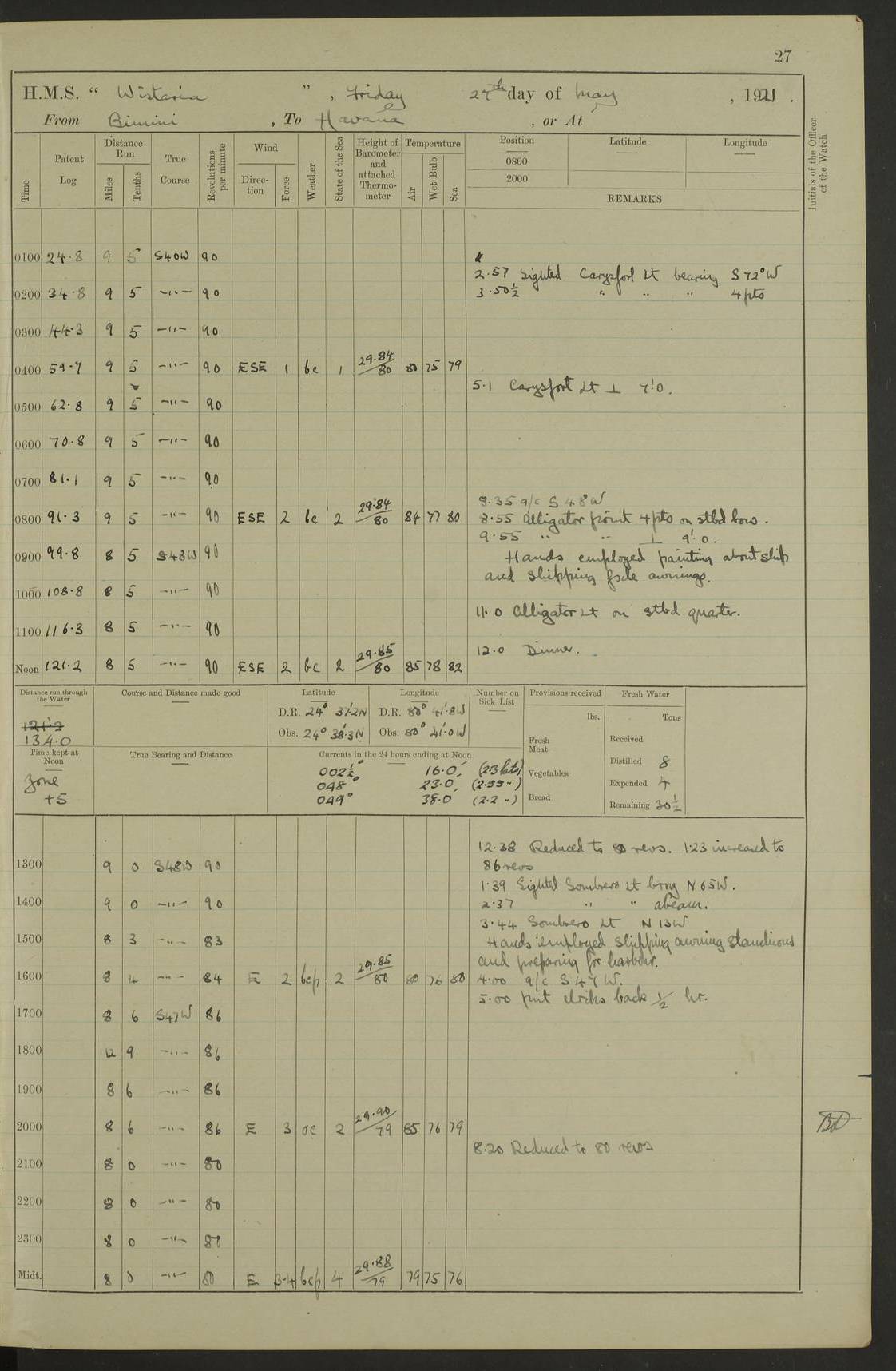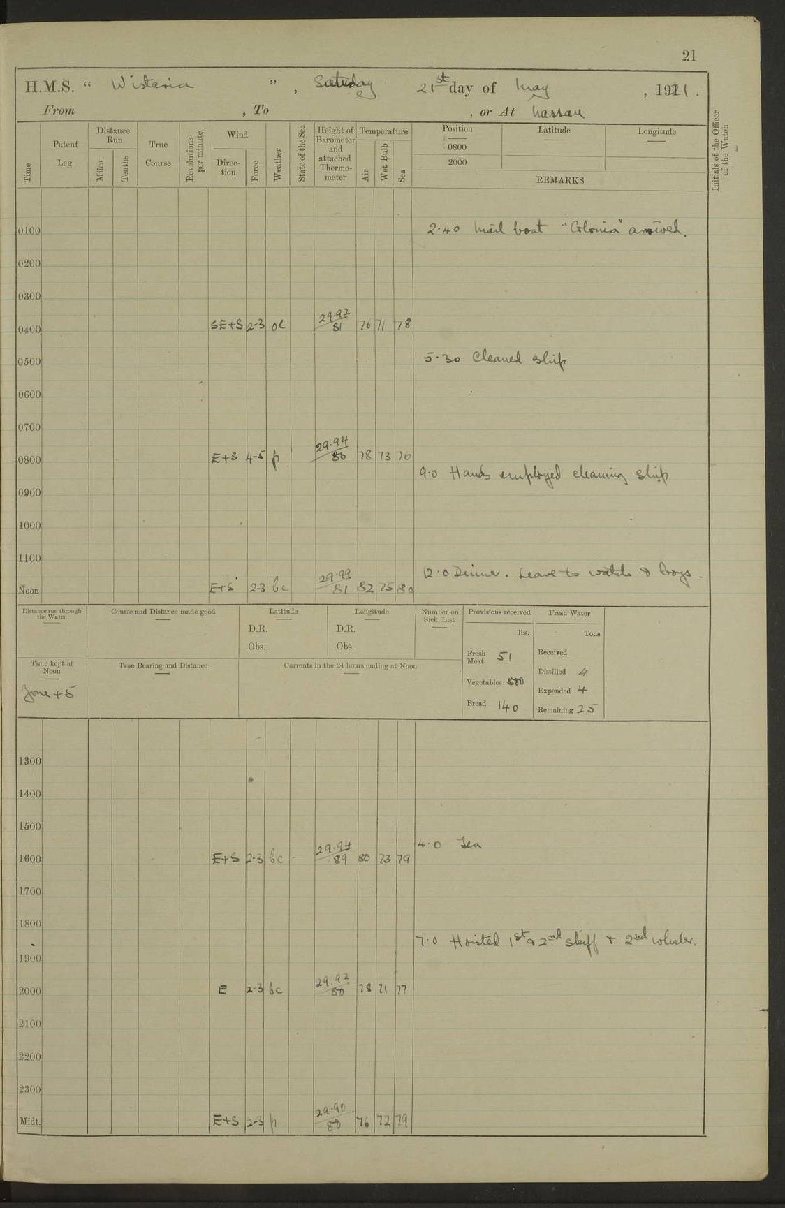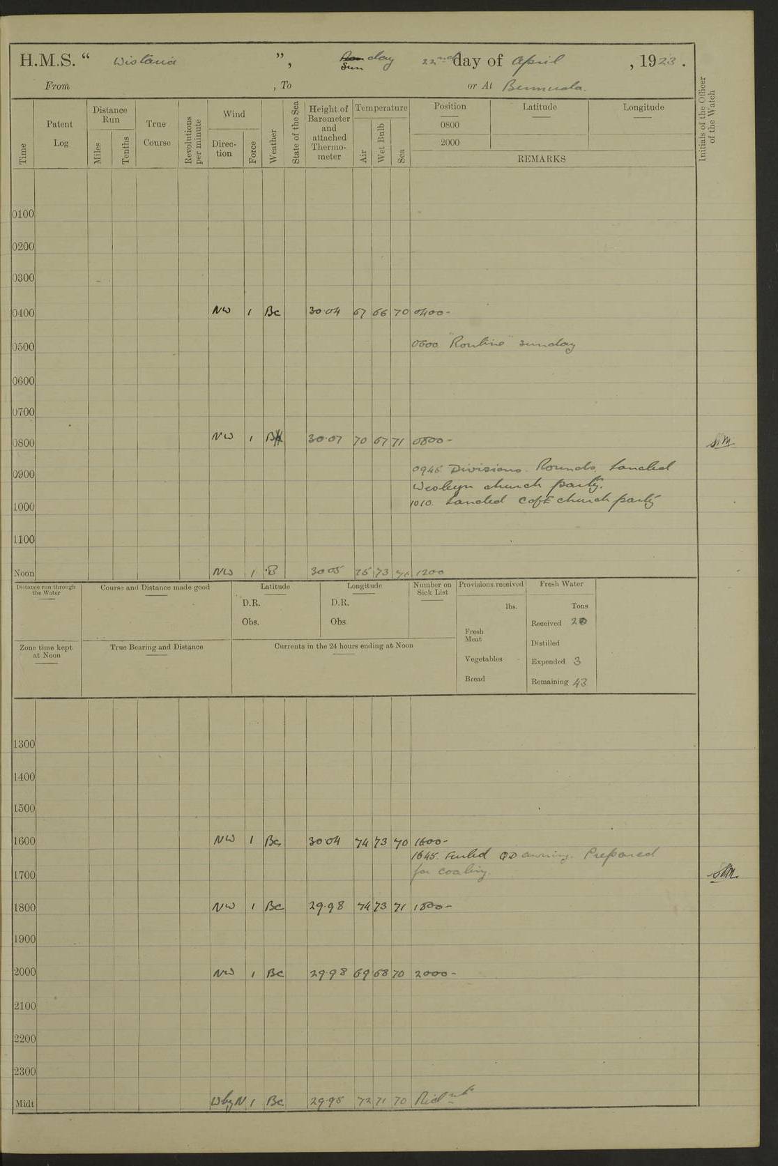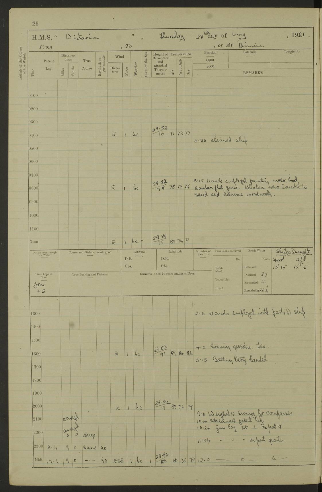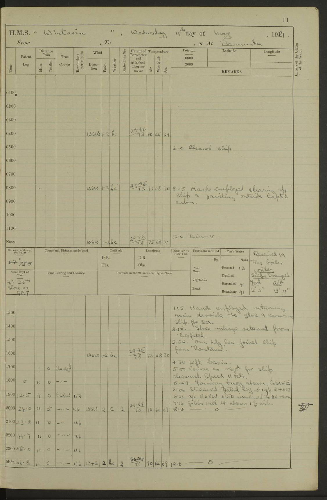 LOGS FOR MAY 1921 4f73ca1da2fc8ea9030009f9: (https://s3.amazonaws.com:443/oldweather/ADM53-93261/0003_1.jpg) 1 May 1921 At Bermuda Lat 32.32, Long -64.8 10.0am: Landed church parties 4f73ca1ea2fc8ea9030009fa: (https://s3.amazonaws.com:443/oldweather/ADM53-93261/0004_0.jpg) 2 May 1921 At Bermuda Lat 32.32, Long -64.8 7.50am: “Creole” came alongside 8.15am: Hands employed shifting ammunition & cleaning paintwork Crocker (Sto) returned from hospital. 4 ratings lent to “Malabar” returned [“Malabar”: perhaps HMS “Malabar”, a shore establishment in Bermuda between 1919 and 1951, and 1965 and 1995] 4f73ca1ea2fc8ea9030009fb: (https://s3.amazonaws.com:443/oldweather/ADM53-93261/0004_1.jpg) 3 May 1921 At Bermuda Lat 32.32, Long -64.8 8.10am: “Tamar” arrived in basin 8.15am: Hands employed furling Q.D. awning 8.30am: Range Party landed 4.0pm: Tea. Leave to watch. Leading Stoker Tillman discharged to hospital 4f73ca1ea2fc8ea9030009fc: (https://s3.amazonaws.com:443/oldweather/ADM53-93261/0005_0.jpg) 4 May 1921 At Bermuda Lat 32.32, Long -64.8 8.0am: Hands employed in dockyard Wright, A.B., returned from hospital Horide, Ord. S., discharged to hospital 1.15pm: Hands employed refitting gear 4f73ca1fa2fc8ea9030009fd: (https://s3.amazonaws.com:443/oldweather/ADM53-93261/0005_1.jpg) 5 May 1921 At Bermuda Lat 32.32, Long -64.8 8.15am: Hands secured ship for sea 9.10am: Left basin 10.0am: Carried out 1” aiming rifle practice noon: Anchored off Tobacco Rock Anchor Bearings: Tobacco Rock N81E, Fort Victoria S70E, Fort George jackstaff S19E 1.30pm: Hands employed in rigging dressing lines at 4” loader drill 4f73ca1fa2fc8ea9030009fe: (https://s3.amazonaws.com:443/oldweather/ADM53-93261/0006_0.jpg) 6 May 1921 At Bermuda Lat 32.32, Long -64.8 6.0am: Cleaned ship and secured target for towing 7.50am: Shortened in 7.55am: Rake party from “Cambrian” arrived 8.0am: Weighed & proceeded 9.0am: Carried out 1” aiming rifle firing 11.0am: Passed through narrows 11.30am: Anchored and dressed ship overall Anchor Bearings: Tobacco Rock N80E, Fort Victoria F. S. S71E, Fort George jackstaff S20E 1.15pm: Hands employed parts of ship 2.20pm: “Valerian” entered harbour 5.10pm: Both watches moor target astern 6.30pm: SS “Glen Ridge” entered harbour 6.35pm: Undressed ship [SS “Glen Ridge”: perhaps misspelt SS “Glenbridge” built 1911] 4f73ca20a2fc8ea9030009ff: (https://s3.amazonaws.com:443/oldweather/ADM53-93261/0006_1.jpg) 7 May 1921 At Bermuda Lat 32.32, Long -64.8 6.40am: Shortened in 7.10am: Weighed and proceeded 9.20am: “St Abbs” came alongside 9.30am: Entered basin 9.45am: Made fast alongside wall 1.15pm: 7 hands employed in dockyard placing wire in tug 2.0pm: Party returned 7.15pm: Patrol landed 4f73ca20a2fc8ea903000a00: (https://s3.amazonaws.com:443/oldweather/ADM53-93261/0007_0.jpg) 8 May 1921 At Bermuda Lat 32.32, Long -64.8 8.45am: Clear up decks for divisions 9.0am: R.C. Church party landed 10.0am: Divisions. Church of England party landed 4f73ca20a2fc8ea903000a01: (https://s3.amazonaws.com:443/oldweather/ADM53-93261/0007_1.jpg) 9 May 1921 At Bermuda Lat 32.32, Long -64.8 6.0am: Furled Q.D. awning & cleaned ship 8.30am: Left basin 9.0am: Proceeded to sea for 4” full calibre exercise 11.15am: Finished firing & returned to harbour 1.15pm: Anchored off dockyard 1.40pm: “Valerian” proceeded into basin 2.40pm: Proceeded into basin 3.15pm: Secured alongside wall 6.50pm: Shifted lighter from “Valerian” 7.25pm: Coal lighter secured alongside 4f73ca21a2fc8ea903000a02: (https://s3.amazonaws.com:443/oldweather/ADM53-93261/0008_0.jpg) 10 May 1921 At Bermuda Lat 32.32, Long -64.8 5.0am: Hands prepared to coal ship 5.40am: Coal ship 9.30am: Finished coaling. Hands cleaned ship 4f73ca21a2fc8ea903000a03: (https://s3.amazonaws.com:443/oldweather/ADM53-93261/0008_1.jpg) 11 May 1921 At Bermuda Lat 32.32, Long -64.8 8.15am: Hands employed clearing up ship & painting outside Captain’s cabin 1.15pm: Hands employed returning main derrick to store & securing ship for sea 2.15pm: Three rating returned from hospital 2.55pm: One leading seaman joined ship from “Constance” 4.30pm: Left basin 5.0pm: Course as required for ship channel. Speed 11 knots 5.59pm: Fairway buoy abeam. Course S15E 6.0pm: Streamed patent log 7.16pm: Gibbs Hill Lt abeam, 1¾ miles 4f73ca21a2fc8ea903000a04: (https://s3.amazonaws.com:443/oldweather/ADM53-93261/0009_0.jpg) 12 May 1921 From Bermuda to Nassau [No coordinates available] 7.30am: Log fouled by weed 7.40am: Cleared & streamed log 9.10am: Hands to divisions with night clothing 9.30am: Hands employed with parts of ship 11.25am: Hove in log on account of weed 5.0pm: Put clocks back 20 minutes 4f73ca22a2fc8ea903000a05: (https://s3.amazonaws.com:443/oldweather/ADM53-93261/0009_1.jpg) 13 May 1921 From Bermuda to Nassau [No coordinates available] 1.15pm: Hands employed rigging fore derrick, painting inside Q.D. and preparing stream anchor for use 3.55pm: Sighted sailing ship on port beam 5.0pm: Put clocks back 20 minutes 9.0pm: Passed steamship to Starboard 4f73ca22a2fc8ea903000a06: (https://s3.amazonaws.com:443/oldweather/ADM53-93261/0010_0.jpg) 14 May 1921 From Bermuda to Nassau and at Nassau Lat 20.57, Long -77.3 9.05am: Sighted land on Port bow. Hands employed cleaning ship 1.45pm: Stopped to drop kedge & weigh it up 2.0pm: Proceeded into harbour 2.30pm: Moored head-and-stern Anchor bearings: Chimney S24W, Hotel Tower S7E, Library Cupola S50E 4f73ca23a2fc8ea903000a07: (https://s3.amazonaws.com:443/oldweather/ADM53-93261/0010_1.jpg) 15 May 1921 At Nassau Lat 20.57, Long -77.3 6.15am: Cleaned ship 10.10am: Church 4f73ca23a2fc8ea903000a08: (https://s3.amazonaws.com:443/oldweather/ADM53-93261/0011_0.jpg) 16 May 1921 At Nassau Lat 20.57, Long -77.3 5.30am: Hands employed rigging stages for painting 8.15am: Hands cleaning & painting ship Lost by accident 1 paint brush 2.0pm: Hands employed as forenoon 5.0pm: Hands to bathe 4f73ca23a2fc8ea903000a09: (https://s3.a