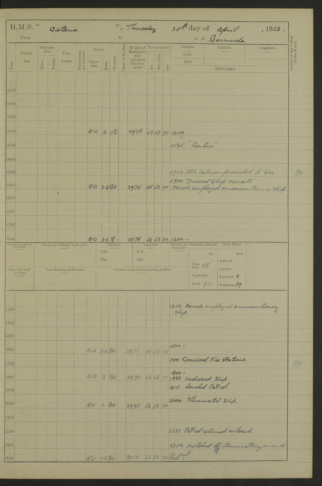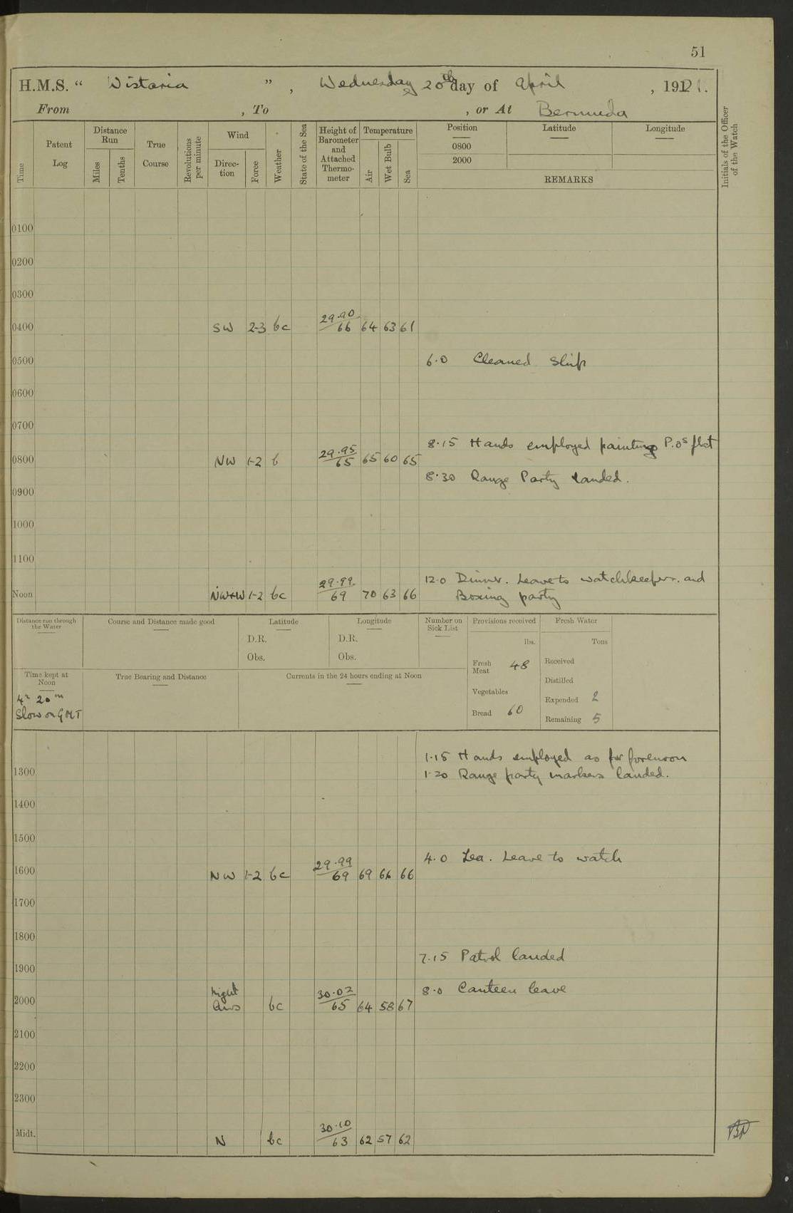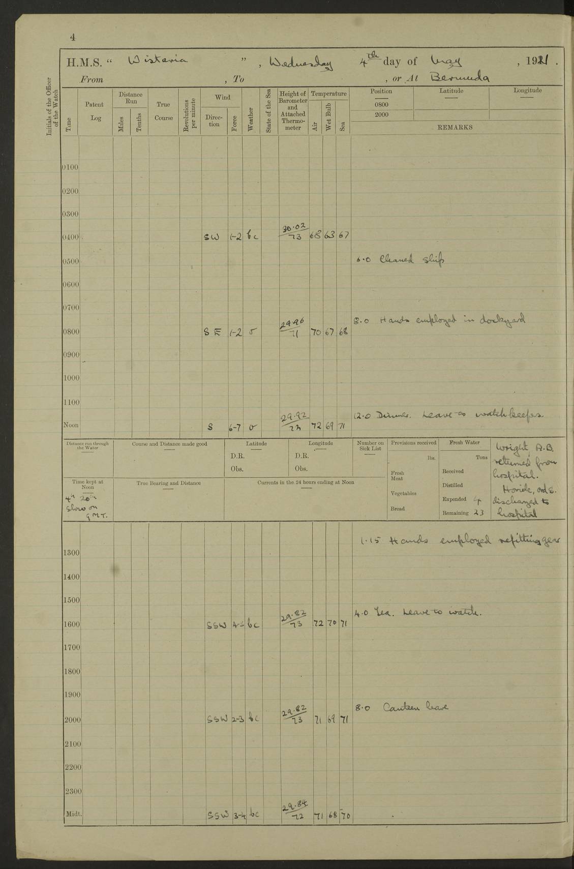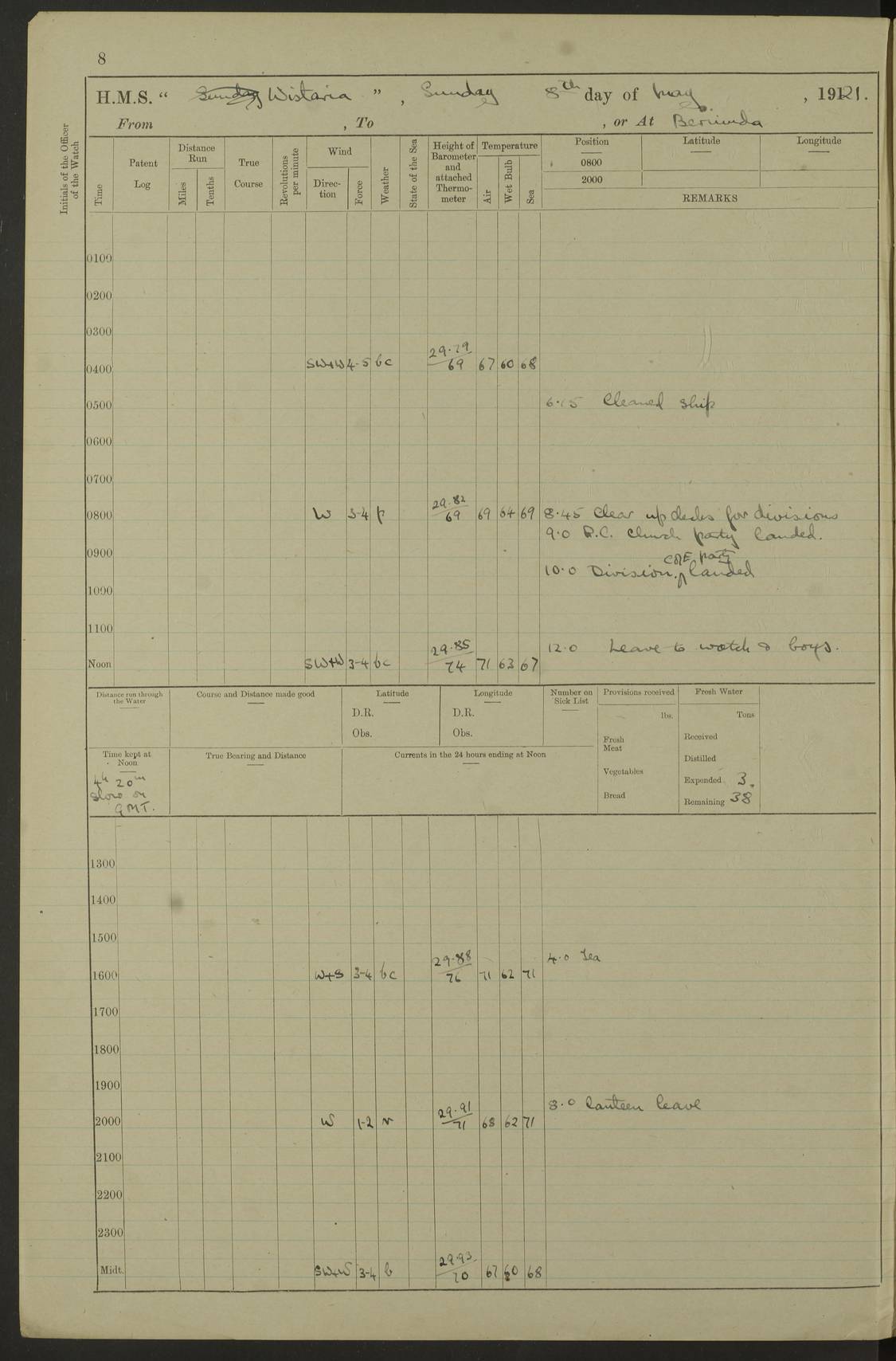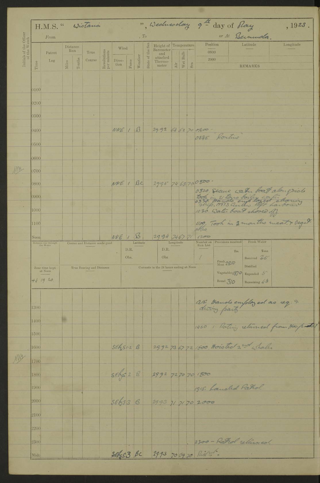 LOGS FOR MAY 1921 4f73ca1da2fc8ea9030009f9: (https://s3.amazonaws.com:443/oldweather/ADM53-93261/0003_1.jpg) 1 May 1921 At Bermuda Lat 32.32, Long -64.8 10.0am: Landed church parties 4f73ca1ea2fc8ea9030009fa: (https://s3.amazonaws.com:443/oldweather/ADM53-93261/0004_0.jpg) 2 May 1921 At Bermuda Lat 32.32, Long -64.8 7.50am: “Creole” came alongside 8.15am: Hands employed shifting ammunition & cleaning paintwork Crocker (Sto) returned from hospital. 4 ratings lent to “Malabar” returned [“Malabar”: perhaps HMS “Malabar”, a shore establishment in Bermuda between 1919 and 1951, and 1965 and 1995] 4f73ca1ea2fc8ea9030009fb: (https://s3.amazonaws.com:443/oldweather/ADM53-93261/0004_1.jpg) 3 May 1921 At Bermuda Lat 32.32, Long -64.8 8.10am: “Tamar” arrived in basin 8.15am: Hands employed furling Q.D. awning 8.30am: Range Party landed 4.0pm: Tea. Leave to watch. Leading Stoker Tillman discharged to hospital 4f73ca1ea2fc8ea9030009fc: (https://s3.amazonaws.com:443/oldweather/ADM53-93261/0005_0.jpg) 4 May 1921 At Bermuda Lat 32.32, Long -64.8 8.0am: Hands employed in dockyard Wright, A.B., returned from hospital Horide, Ord. S., discharged to hospital 1.15pm: Hands employed refitting gear 4f73ca1fa2fc8ea9030009fd: (https://s3.amazonaws.com:443/oldweather/ADM53-93261/0005_1.jpg) 5 May 1921 At Bermuda Lat 32.32, Long -64.8 8.15am: Hands secured ship for sea 9.10am: Left basin 10.0am: Carried out 1” aiming rifle practice noon: Anchored off Tobacco Rock Anchor Bearings: Tobacco Rock N81E, Fort Victoria S70E, Fort George jackstaff S19E 1.30pm: Hands employed in rigging dressing lines at 4” loader drill 4f73ca1fa2fc8ea9030009fe: (https://s3.amazonaws.com:443/oldweather/ADM53-93261/0006_0.jpg) 6 May 1921 At Bermuda Lat 32.32, Long -64.8 6.0am: Cleaned ship and secured target for towing 7.50am: Shortened in 7.55am: Rake party from “Cambrian” arrived 8.0am: Weighed & proceeded 9.0am: Carried out 1” aiming rifle firing 11.0am: Passed through narrows 11.30am: Anchored and dressed ship overall Anchor Bearings: Tobacco Rock N80E, Fort Victoria F. S. S71E, Fort George jackstaff S20E 1.15pm: Hands employed parts of ship 2.20pm: “Valerian” entered harbour 5.10pm: Both watches moor target astern 6.30pm: SS “Glen Ridge” entered harbour 6.35pm: Undressed ship [SS “Glen Ridge”: perhaps misspelt SS “Glenbridge” built 1911] 4f73ca20a2fc8ea9030009ff: (https://s3.amazonaws.com:443/oldweather/ADM53-93261/0006_1.jpg) 7 May 1921 At Bermuda Lat 32.32, Long -64.8 6.40am: Shortened in 7.10am: Weighed and proceeded 9.20am: “St Abbs” came alongside 9.30am: Entered basin 9.45am: Made fast alongside wall 1.15pm: 7 hands employed in dockyard placing wire in tug 2.0pm: Party returned 7.15pm: Patrol landed 4f73ca20a2fc8ea903000a00: (https://s3.amazonaws.com:443/oldweather/ADM53-93261/0007_0.jpg) 8 May 1921 At Bermuda Lat 32.32, Long -64.8 8.45am: Clear up decks for divisions 9.0am: R.C. Church party landed 10.0am: Divisions. Church of England party landed 4f73ca20a2fc8ea903000a01: (https://s3.amazonaws.com:443/oldweather/ADM53-93261/0007_1.jpg) 9 May 1921 At Bermuda Lat 32.32, Long -64.8 6.0am: Furled Q.D. awning & cleaned ship 8.30am: Left basin 9.0am: Proceeded to sea for 4” full calibre exercise 11.15am: Finished firing & returned to harbour 1.15pm: Anchored off dockyard 1.40pm: “Valerian” proceeded into basin 2.40pm: Proceeded into basin 3.15pm: Secured alongside wall 6.50pm: Shifted lighter from “Valerian” 7.25pm: Coal lighter secured alongside 4f73ca21a2fc8ea903000a02: (https://s3.amazonaws.com:443/oldweather/ADM53-93261/0008_0.jpg) 10 May 1921 At Bermuda Lat 32.32, Long -64.8 5.0am: Hands prepared to coal ship 5.40am: Coal ship 9.30am: Finished coaling. Hands cleaned ship 4f73ca21a2fc8ea903000a03: (https://s3.amazonaws.com:443/oldweather/ADM53-93261/0008_1.jpg) 11 May 1921 At Bermuda Lat 32.32, Long -64.8 8.15am: Hands employed clearing up ship & painting outside Captain’s cabin 1.15pm: Hands employed returning main derrick to store & securing ship for sea 2.15pm: Three rating returned from hospital 2.55pm: One leading seaman joined ship from “Constance” 4.30pm: Left basin 5.0pm: Course as required for ship channel. Speed 11 knots 5.59pm: Fairway buoy abeam. Course S15E 6.0pm: Streamed patent log 7.16pm: Gibbs Hill Lt abeam, 1¾ miles 4f73ca21a2fc8ea903000a04: (https://s3.amazonaws.com:443/oldweather/ADM53-93261/0009_0.jpg) 12 May 1921 From Bermuda to Nassau [No coordinates available] 7.30am: Log fouled by weed 7.40am: Cleared & streamed log 9.10am: Hands to divisions with night clothing 9.30am: Hands employed with parts of ship 11.25am: Hove in log on account of weed 5.0pm: Put clocks back 20 minutes 4f73ca22a2fc8ea903000a05: (https://s3.amazonaws.com:443/oldweather/ADM53-93261/0009_1.jpg) 13 May 1921 From Bermuda to Nassau [No coordinates available] 1.15pm: Hands employed rigging fore derrick, painting inside Q.D. and preparing stream anchor for use 3.55pm: Sighted sailing ship on port beam 5.0pm: Put clocks back 20 minutes 9.0pm: Passed steamship to Starboard 4f73ca22a2fc8ea903000a06: (https://s3.amazonaws.com:443/oldweather/ADM53-93261/0010_0.jpg) 14 May 1921 From Bermuda to Nassau and at Nassau Lat 20.57, Long -77.3 9.05am: Sighted land on Port bow. Hands employed cleaning ship 1.45pm: Stopped to drop kedge & weigh it up 2.0pm: Proceeded into harbour 2.30pm: Moored head-and-stern Anchor bearings: Chimney S24W, Hotel Tower S7E, Library Cupola S50E 4f73ca23a2fc8ea903000a07: (https://s3.amazonaws.com:443/oldweather/ADM53-93261/0010_1.jpg) 15 May 1921 At Nassau Lat 20.57, Long -77.3 6.15am: Cleaned ship 10.10am: Church 4f73ca23a2fc8ea903000a08: (https://s3.amazonaws.com:443/oldweather/ADM53-93261/0011_0.jpg) 16 May 1921 At Nassau Lat 20.57, Long -77.3 5.30am: Hands employed rigging stages for painting 8.15am: Hands cleaning & painting ship Lost by accident 1 paint brush 2.0pm: Hands employed as forenoon 5.0pm: Hands to bathe 4f73ca23a2fc8ea903000a09: (https://s3.a