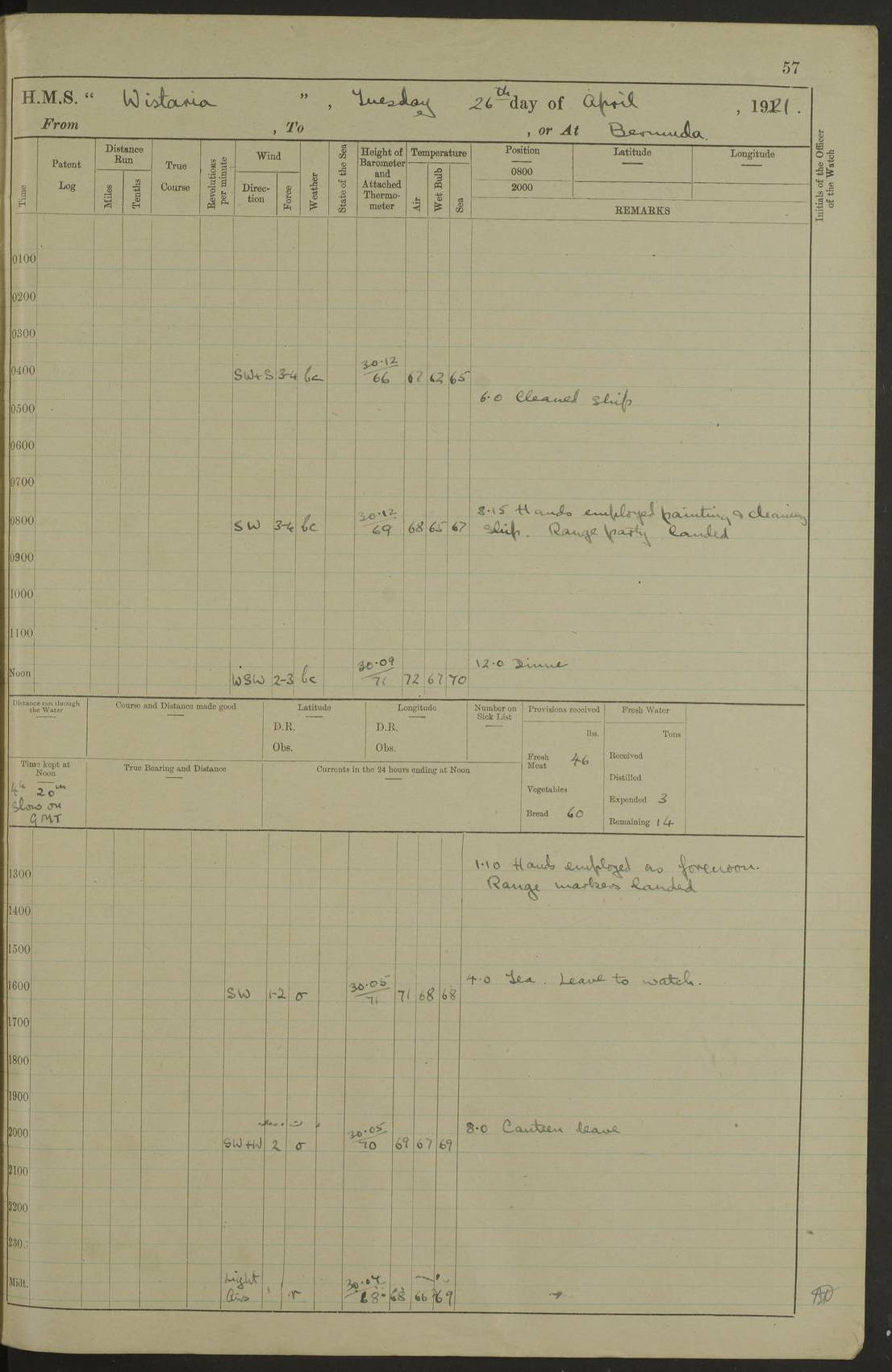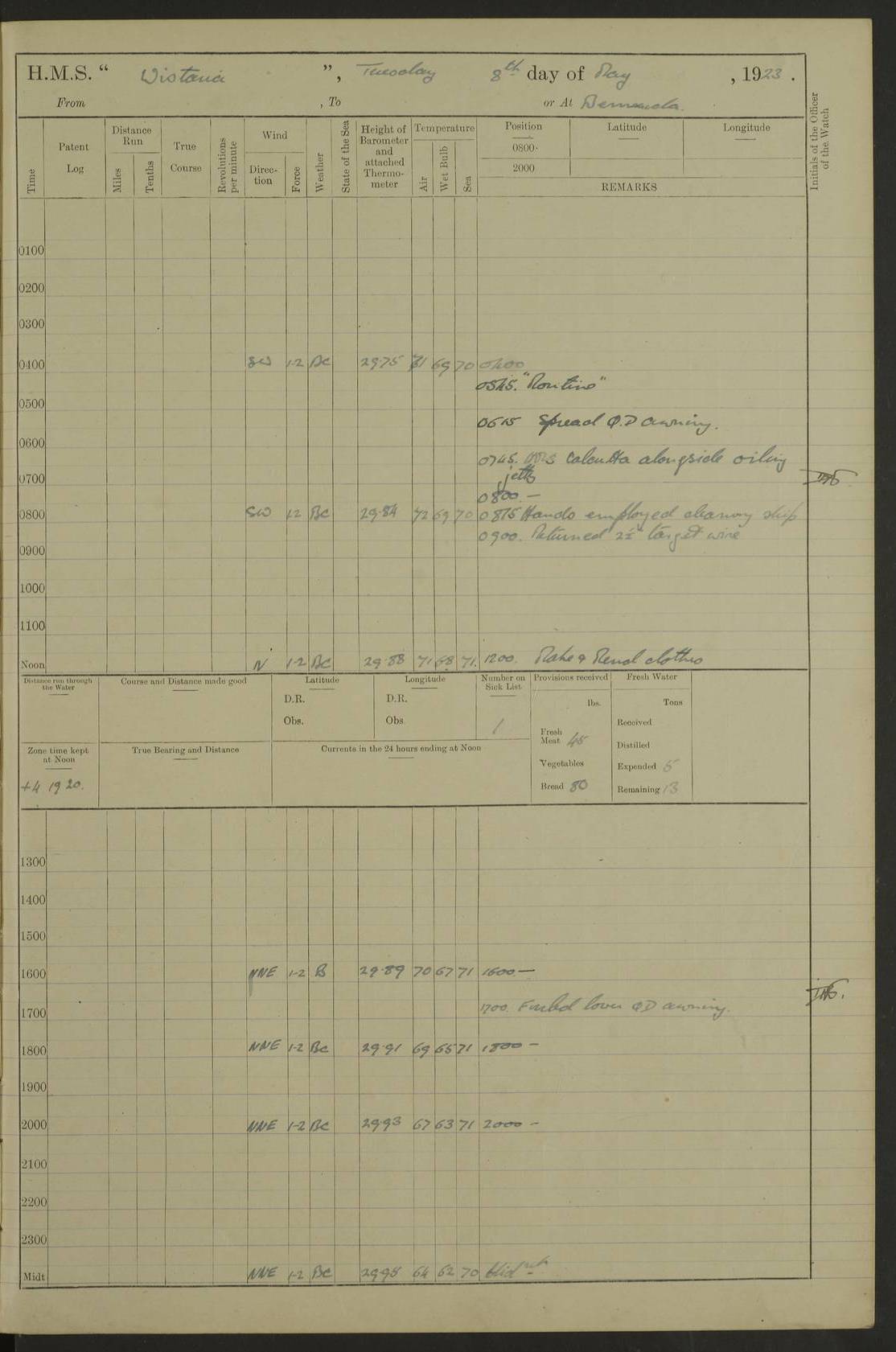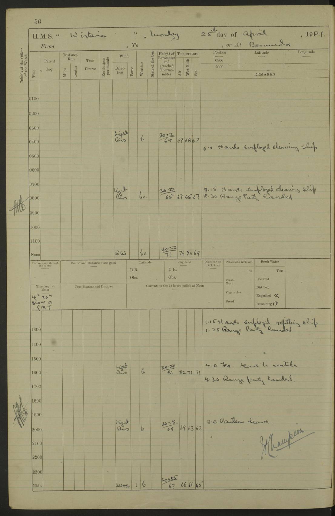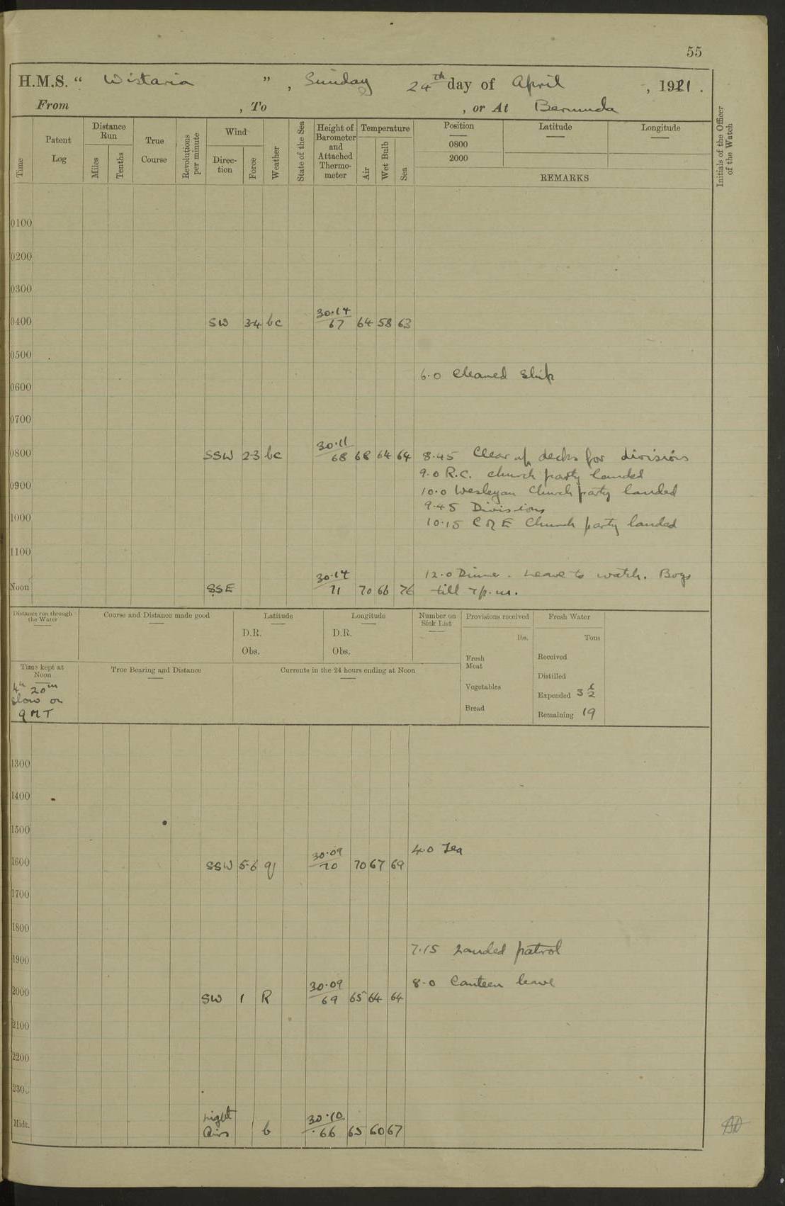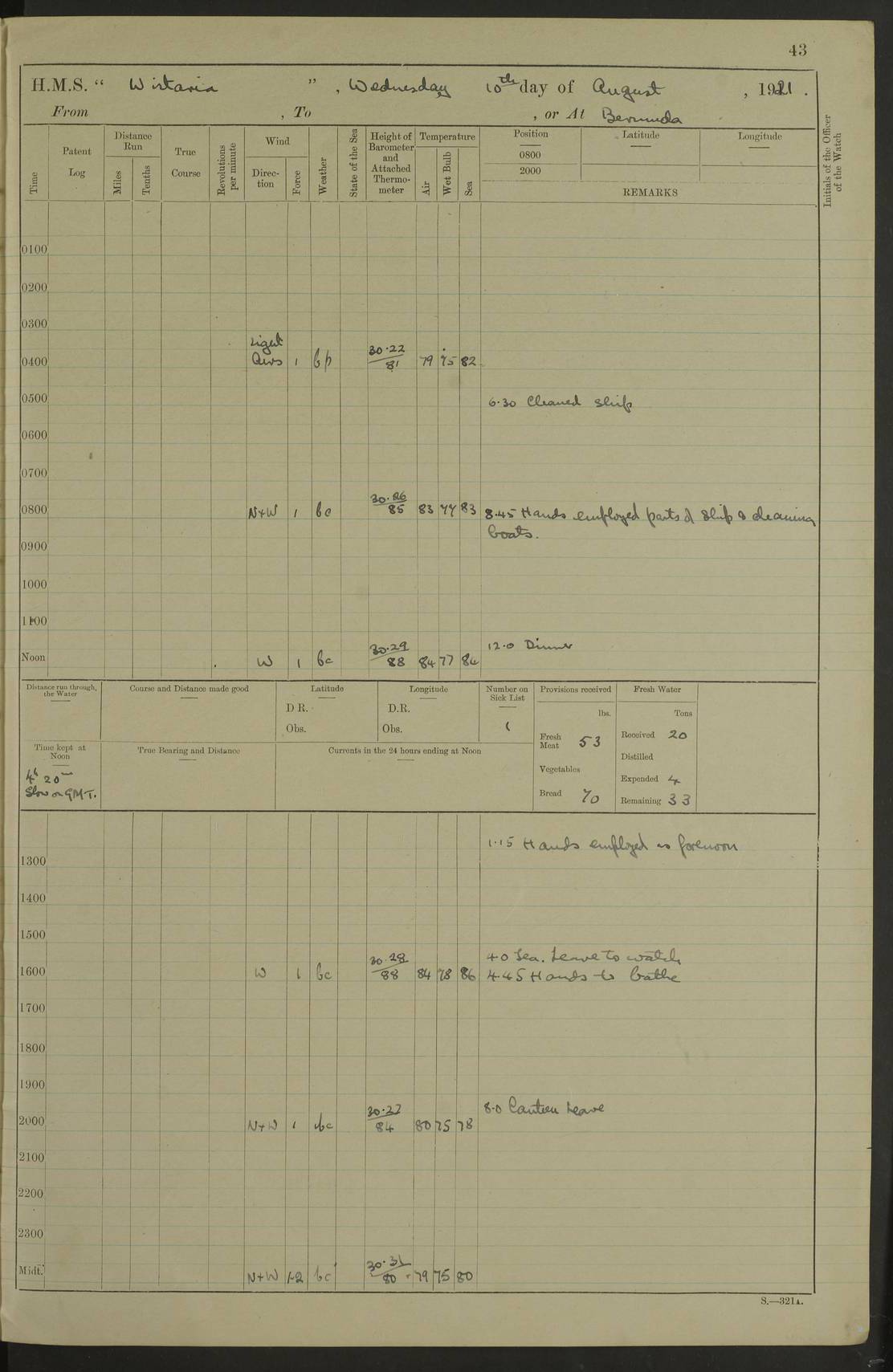 LOGS FOR MAY 1921 4f73ca1da2fc8ea9030009f9: (https://s3.amazonaws.com:443/oldweather/ADM53-93261/0003_1.jpg) 1 May 1921 At Bermuda Lat 32.32, Long -64.8 10.0am: Landed church parties 4f73ca1ea2fc8ea9030009fa: (https://s3.amazonaws.com:443/oldweather/ADM53-93261/0004_0.jpg) 2 May 1921 At Bermuda Lat 32.32, Long -64.8 7.50am: “Creole” came alongside 8.15am: Hands employed shifting ammunition & cleaning paintwork Crocker (Sto) returned from hospital. 4 ratings lent to “Malabar” returned [“Malabar”: perhaps HMS “Malabar”, a shore establishment in Bermuda between 1919 and 1951, and 1965 and 1995] 4f73ca1ea2fc8ea9030009fb: (https://s3.amazonaws.com:443/oldweather/ADM53-93261/0004_1.jpg) 3 May 1921 At Bermuda Lat 32.32, Long -64.8 8.10am: “Tamar” arrived in basin 8.15am: Hands employed furling Q.D. awning 8.30am: Range Party landed 4.0pm: Tea. Leave to watch. Leading Stoker Tillman discharged to hospital 4f73ca1ea2fc8ea9030009fc: (https://s3.amazonaws.com:443/oldweather/ADM53-93261/0005_0.jpg) 4 May 1921 At Bermuda Lat 32.32, Long -64.8 8.0am: Hands employed in dockyard Wright, A.B., returned from hospital Horide, Ord. S., discharged to hospital 1.15pm: Hands employed refitting gear 4f73ca1fa2fc8ea9030009fd: (https://s3.amazonaws.com:443/oldweather/ADM53-93261/0005_1.jpg) 5 May 1921 At Bermuda Lat 32.32, Long -64.8 8.15am: Hands secured ship for sea 9.10am: Left basin 10.0am: Carried out 1” aiming rifle practice noon: Anchored off Tobacco Rock Anchor Bearings: Tobacco Rock N81E, Fort Victoria S70E, Fort George jackstaff S19E 1.30pm: Hands employed in rigging dressing lines at 4” loader drill 4f73ca1fa2fc8ea9030009fe: (https://s3.amazonaws.com:443/oldweather/ADM53-93261/0006_0.jpg) 6 May 1921 At Bermuda Lat 32.32, Long -64.8 6.0am: Cleaned ship and secured target for towing 7.50am: Shortened in 7.55am: Rake party from “Cambrian” arrived 8.0am: Weighed & proceeded 9.0am: Carried out 1” aiming rifle firing 11.0am: Passed through narrows 11.30am: Anchored and dressed ship overall Anchor Bearings: Tobacco Rock N80E, Fort Victoria F. S. S71E, Fort George jackstaff S20E 1.15pm: Hands employed parts of ship 2.20pm: “Valerian” entered harbour 5.10pm: Both watches moor target astern 6.30pm: SS “Glen Ridge” entered harbour 6.35pm: Undressed ship [SS “Glen Ridge”: perhaps misspelt SS “Glenbridge” built 1911] 4f73ca20a2fc8ea9030009ff: (https://s3.amazonaws.com:443/oldweather/ADM53-93261/0006_1.jpg) 7 May 1921 At Bermuda Lat 32.32, Long -64.8 6.40am: Shortened in 7.10am: Weighed and proceeded 9.20am: “St Abbs” came alongside 9.30am: Entered basin 9.45am: Made fast alongside wall 1.15pm: 7 hands employed in dockyard placing wire in tug 2.0pm: Party returned 7.15pm: Patrol landed 4f73ca20a2fc8ea903000a00: (https://s3.amazonaws.com:443/oldweather/ADM53-93261/0007_0.jpg) 8 May 1921 At Bermuda Lat 32.32, Long -64.8 8.45am: Clear up decks for divisions 9.0am: R.C. Church party landed 10.0am: Divisions. Church of England party landed 4f73ca20a2fc8ea903000a01: (https://s3.amazonaws.com:443/oldweather/ADM53-93261/0007_1.jpg) 9 May 1921 At Bermuda Lat 32.32, Long -64.8 6.0am: Furled Q.D. awning & cleaned ship 8.30am: Left basin 9.0am: Proceeded to sea for 4” full calibre exercise 11.15am: Finished firing & returned to harbour 1.15pm: Anchored off dockyard 1.40pm: “Valerian” proceeded into basin 2.40pm: Proceeded into basin 3.15pm: Secured alongside wall 6.50pm: Shifted lighter from “Valerian” 7.25pm: Coal lighter secured alongside 4f73ca21a2fc8ea903000a02: (https://s3.amazonaws.com:443/oldweather/ADM53-93261/0008_0.jpg) 10 May 1921 At Bermuda Lat 32.32, Long -64.8 5.0am: Hands prepared to coal ship 5.40am: Coal ship 9.30am: Finished coaling. Hands cleaned ship 4f73ca21a2fc8ea903000a03: (https://s3.amazonaws.com:443/oldweather/ADM53-93261/0008_1.jpg) 11 May 1921 At Bermuda Lat 32.32, Long -64.8 8.15am: Hands employed clearing up ship & painting outside Captain’s cabin 1.15pm: Hands employed returning main derrick to store & securing ship for sea 2.15pm: Three rating returned from hospital 2.55pm: One leading seaman joined ship from “Constance” 4.30pm: Left basin 5.0pm: Course as required for ship channel. Speed 11 knots 5.59pm: Fairway buoy abeam. Course S15E 6.0pm: Streamed patent log 7.16pm: Gibbs Hill Lt abeam, 1¾ miles 4f73ca21a2fc8ea903000a04: (https://s3.amazonaws.com:443/oldweather/ADM53-93261/0009_0.jpg) 12 May 1921 From Bermuda to Nassau [No coordinates available] 7.30am: Log fouled by weed 7.40am: Cleared & streamed log 9.10am: Hands to divisions with night clothing 9.30am: Hands employed with parts of ship 11.25am: Hove in log on account of weed 5.0pm: Put clocks back 20 minutes 4f73ca22a2fc8ea903000a05: (https://s3.amazonaws.com:443/oldweather/ADM53-93261/0009_1.jpg) 13 May 1921 From Bermuda to Nassau [No coordinates available] 1.15pm: Hands employed rigging fore derrick, painting inside Q.D. and preparing stream anchor for use 3.55pm: Sighted sailing ship on port beam 5.0pm: Put clocks back 20 minutes 9.0pm: Passed steamship to Starboard 4f73ca22a2fc8ea903000a06: (https://s3.amazonaws.com:443/oldweather/ADM53-93261/0010_0.jpg) 14 May 1921 From Bermuda to Nassau and at Nassau Lat 20.57, Long -77.3 9.05am: Sighted land on Port bow. Hands employed cleaning ship 1.45pm: Stopped to drop kedge & weigh it up 2.0pm: Proceeded into harbour 2.30pm: Moored head-and-stern Anchor bearings: Chimney S24W, Hotel Tower S7E, Library Cupola S50E 4f73ca23a2fc8ea903000a07: (https://s3.amazonaws.com:443/oldweather/ADM53-93261/0010_1.jpg) 15 May 1921 At Nassau Lat 20.57, Long -77.3 6.15am: Cleaned ship 10.10am: Church 4f73ca23a2fc8ea903000a08: (https://s3.amazonaws.com:443/oldweather/ADM53-93261/0011_0.jpg) 16 May 1921 At Nassau Lat 20.57, Long -77.3 5.30am: Hands employed rigging stages for painting 8.15am: Hands cleaning & painting ship Lost by accident 1 paint brush 2.0pm: Hands employed as forenoon 5.0pm: Hands to bathe 4f73ca23a2fc8ea903000a09: (https://s3.a