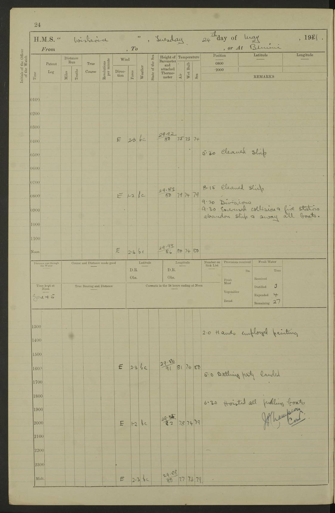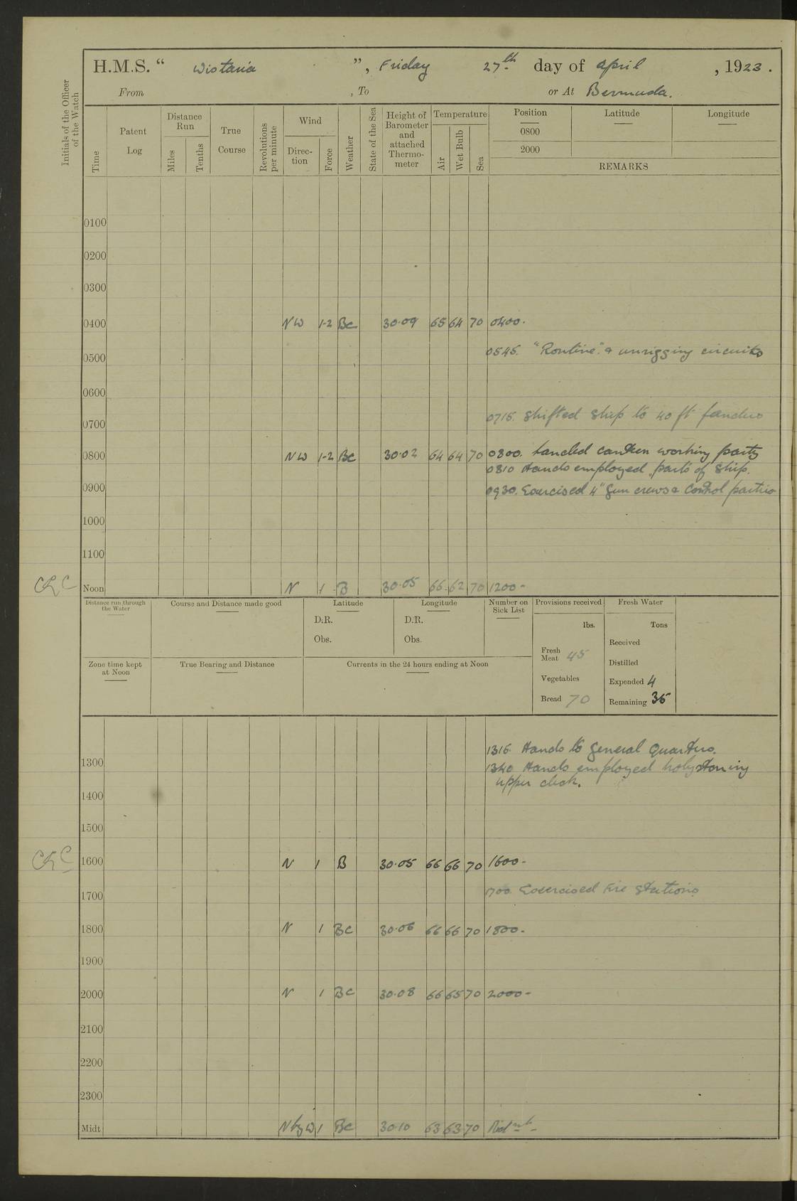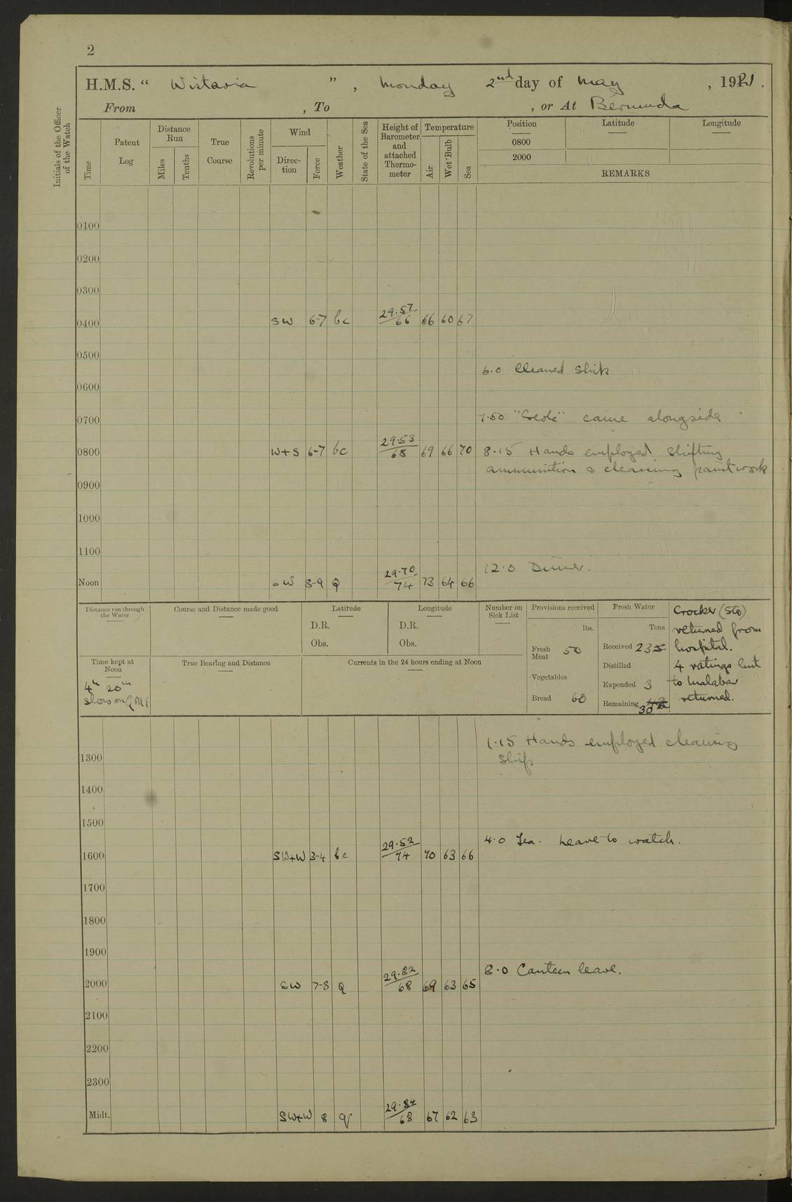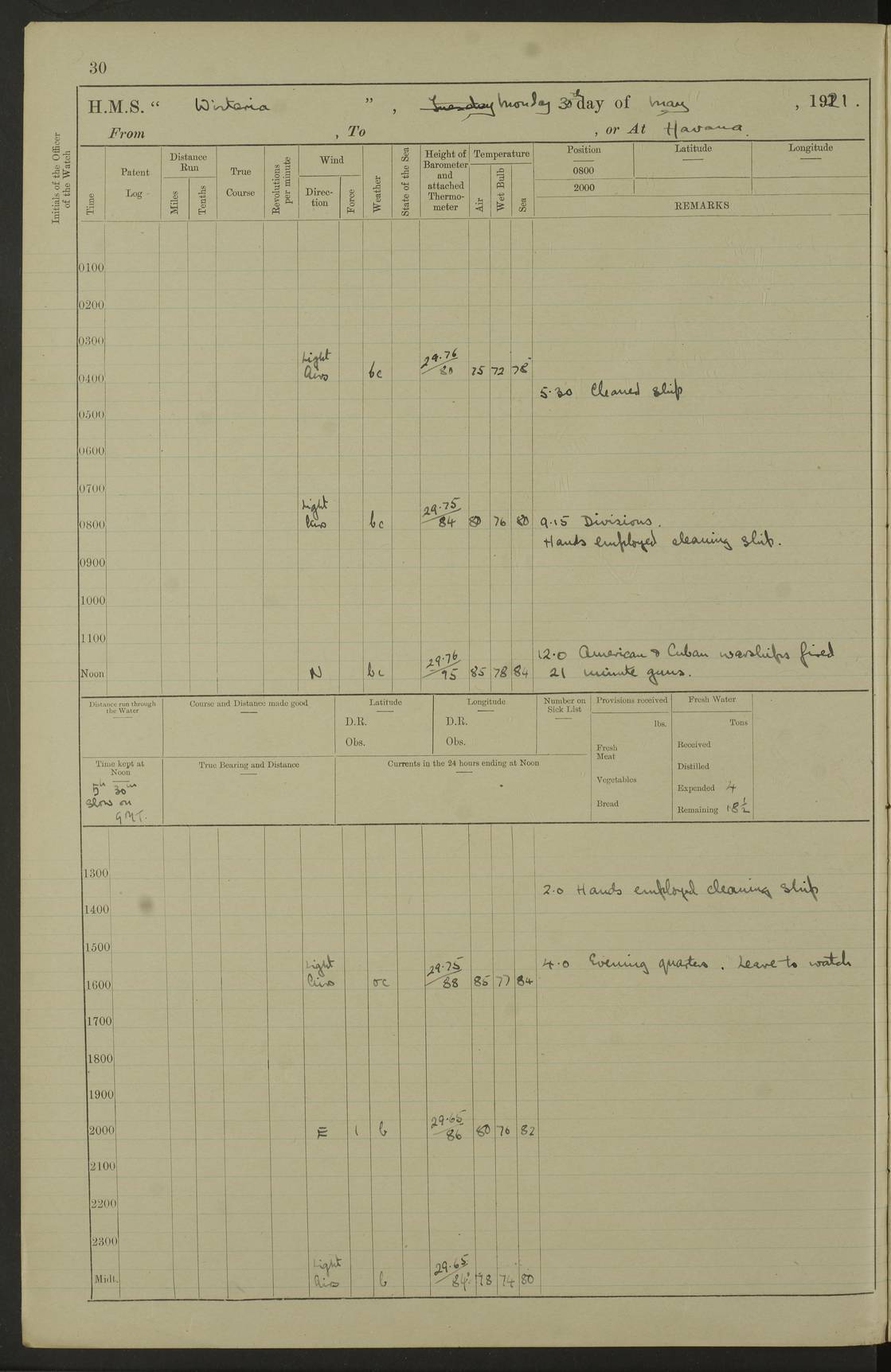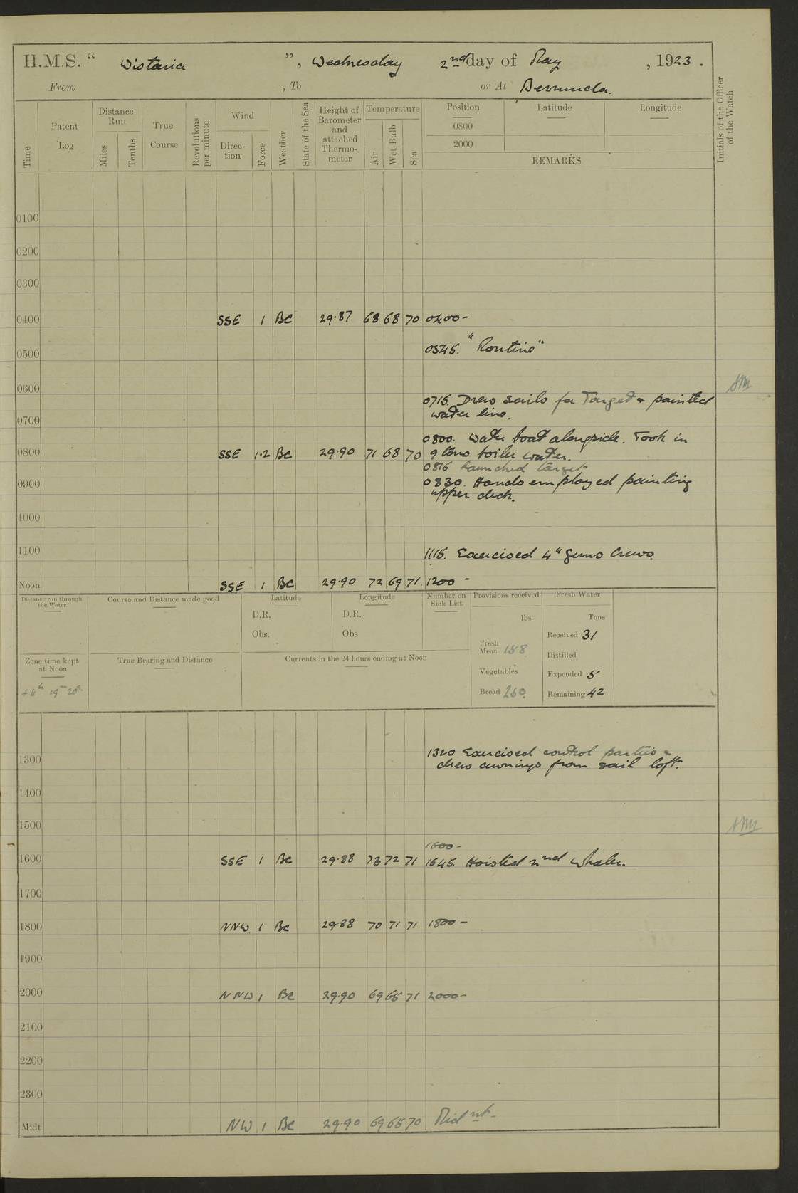 LOGS FOR MAY 1921 4f73ca1da2fc8ea9030009f9: (https://s3.amazonaws.com:443/oldweather/ADM53-93261/0003_1.jpg) 1 May 1921 At Bermuda Lat 32.32, Long -64.8 10.0am: Landed church parties 4f73ca1ea2fc8ea9030009fa: (https://s3.amazonaws.com:443/oldweather/ADM53-93261/0004_0.jpg) 2 May 1921 At Bermuda Lat 32.32, Long -64.8 7.50am: “Creole” came alongside 8.15am: Hands employed shifting ammunition & cleaning paintwork Crocker (Sto) returned from hospital. 4 ratings lent to “Malabar” returned [“Malabar”: perhaps HMS “Malabar”, a shore establishment in Bermuda between 1919 and 1951, and 1965 and 1995] 4f73ca1ea2fc8ea9030009fb: (https://s3.amazonaws.com:443/oldweather/ADM53-93261/0004_1.jpg) 3 May 1921 At Bermuda Lat 32.32, Long -64.8 8.10am: “Tamar” arrived in basin 8.15am: Hands employed furling Q.D. awning 8.30am: Range Party landed 4.0pm: Tea. Leave to watch. Leading Stoker Tillman discharged to hospital 4f73ca1ea2fc8ea9030009fc: (https://s3.amazonaws.com:443/oldweather/ADM53-93261/0005_0.jpg) 4 May 1921 At Bermuda Lat 32.32, Long -64.8 8.0am: Hands employed in dockyard Wright, A.B., returned from hospital Horide, Ord. S., discharged to hospital 1.15pm: Hands employed refitting gear 4f73ca1fa2fc8ea9030009fd: (https://s3.amazonaws.com:443/oldweather/ADM53-93261/0005_1.jpg) 5 May 1921 At Bermuda Lat 32.32, Long -64.8 8.15am: Hands secured ship for sea 9.10am: Left basin 10.0am: Carried out 1” aiming rifle practice noon: Anchored off Tobacco Rock Anchor Bearings: Tobacco Rock N81E, Fort Victoria S70E, Fort George jackstaff S19E 1.30pm: Hands employed in rigging dressing lines at 4” loader drill 4f73ca1fa2fc8ea9030009fe: (https://s3.amazonaws.com:443/oldweather/ADM53-93261/0006_0.jpg) 6 May 1921 At Bermuda Lat 32.32, Long -64.8 6.0am: Cleaned ship and secured target for towing 7.50am: Shortened in 7.55am: Rake party from “Cambrian” arrived 8.0am: Weighed & proceeded 9.0am: Carried out 1” aiming rifle firing 11.0am: Passed through narrows 11.30am: Anchored and dressed ship overall Anchor Bearings: Tobacco Rock N80E, Fort Victoria F. S. S71E, Fort George jackstaff S20E 1.15pm: Hands employed parts of ship 2.20pm: “Valerian” entered harbour 5.10pm: Both watches moor target astern 6.30pm: SS “Glen Ridge” entered harbour 6.35pm: Undressed ship [SS “Glen Ridge”: perhaps misspelt SS “Glenbridge” built 1911] 4f73ca20a2fc8ea9030009ff: (https://s3.amazonaws.com:443/oldweather/ADM53-93261/0006_1.jpg) 7 May 1921 At Bermuda Lat 32.32, Long -64.8 6.40am: Shortened in 7.10am: Weighed and proceeded 9.20am: “St Abbs” came alongside 9.30am: Entered basin 9.45am: Made fast alongside wall 1.15pm: 7 hands employed in dockyard placing wire in tug 2.0pm: Party returned 7.15pm: Patrol landed 4f73ca20a2fc8ea903000a00: (https://s3.amazonaws.com:443/oldweather/ADM53-93261/0007_0.jpg) 8 May 1921 At Bermuda Lat 32.32, Long -64.8 8.45am: Clear up decks for divisions 9.0am: R.C. Church party landed 10.0am: Divisions. Church of England party landed 4f73ca20a2fc8ea903000a01: (https://s3.amazonaws.com:443/oldweather/ADM53-93261/0007_1.jpg) 9 May 1921 At Bermuda Lat 32.32, Long -64.8 6.0am: Furled Q.D. awning & cleaned ship 8.30am: Left basin 9.0am: Proceeded to sea for 4” full calibre exercise 11.15am: Finished firing & returned to harbour 1.15pm: Anchored off dockyard 1.40pm: “Valerian” proceeded into basin 2.40pm: Proceeded into basin 3.15pm: Secured alongside wall 6.50pm: Shifted lighter from “Valerian” 7.25pm: Coal lighter secured alongside 4f73ca21a2fc8ea903000a02: (https://s3.amazonaws.com:443/oldweather/ADM53-93261/0008_0.jpg) 10 May 1921 At Bermuda Lat 32.32, Long -64.8 5.0am: Hands prepared to coal ship 5.40am: Coal ship 9.30am: Finished coaling. Hands cleaned ship 4f73ca21a2fc8ea903000a03: (https://s3.amazonaws.com:443/oldweather/ADM53-93261/0008_1.jpg) 11 May 1921 At Bermuda Lat 32.32, Long -64.8 8.15am: Hands employed clearing up ship & painting outside Captain’s cabin 1.15pm: Hands employed returning main derrick to store & securing ship for sea 2.15pm: Three rating returned from hospital 2.55pm: One leading seaman joined ship from “Constance” 4.30pm: Left basin 5.0pm: Course as required for ship channel. Speed 11 knots 5.59pm: Fairway buoy abeam. Course S15E 6.0pm: Streamed patent log 7.16pm: Gibbs Hill Lt abeam, 1¾ miles 4f73ca21a2fc8ea903000a04: (https://s3.amazonaws.com:443/oldweather/ADM53-93261/0009_0.jpg) 12 May 1921 From Bermuda to Nassau [No coordinates available] 7.30am: Log fouled by weed 7.40am: Cleared & streamed log 9.10am: Hands to divisions with night clothing 9.30am: Hands employed with parts of ship 11.25am: Hove in log on account of weed 5.0pm: Put clocks back 20 minutes 4f73ca22a2fc8ea903000a05: (https://s3.amazonaws.com:443/oldweather/ADM53-93261/0009_1.jpg) 13 May 1921 From Bermuda to Nassau [No coordinates available] 1.15pm: Hands employed rigging fore derrick, painting inside Q.D. and preparing stream anchor for use 3.55pm: Sighted sailing ship on port beam 5.0pm: Put clocks back 20 minutes 9.0pm: Passed steamship to Starboard 4f73ca22a2fc8ea903000a06: (https://s3.amazonaws.com:443/oldweather/ADM53-93261/0010_0.jpg) 14 May 1921 From Bermuda to Nassau and at Nassau Lat 20.57, Long -77.3 9.05am: Sighted land on Port bow. Hands employed cleaning ship 1.45pm: Stopped to drop kedge & weigh it up 2.0pm: Proceeded into harbour 2.30pm: Moored head-and-stern Anchor bearings: Chimney S24W, Hotel Tower S7E, Library Cupola S50E 4f73ca23a2fc8ea903000a07: (https://s3.amazonaws.com:443/oldweather/ADM53-93261/0010_1.jpg) 15 May 1921 At Nassau Lat 20.57, Long -77.3 6.15am: Cleaned ship 10.10am: Church 4f73ca23a2fc8ea903000a08: (https://s3.amazonaws.com:443/oldweather/ADM53-93261/0011_0.jpg) 16 May 1921 At Nassau Lat 20.57, Long -77.3 5.30am: Hands employed rigging stages for painting 8.15am: Hands cleaning & painting ship Lost by accident 1 paint brush 2.0pm: Hands employed as forenoon 5.0pm: Hands to bathe 4f73ca23a2fc8ea903000a09: (https://s3.a