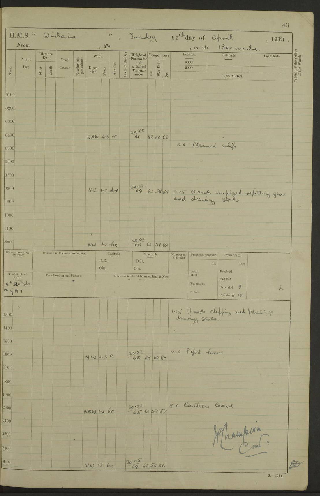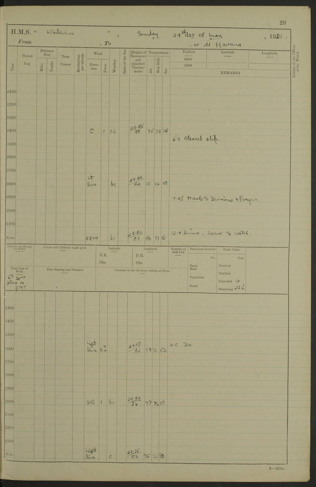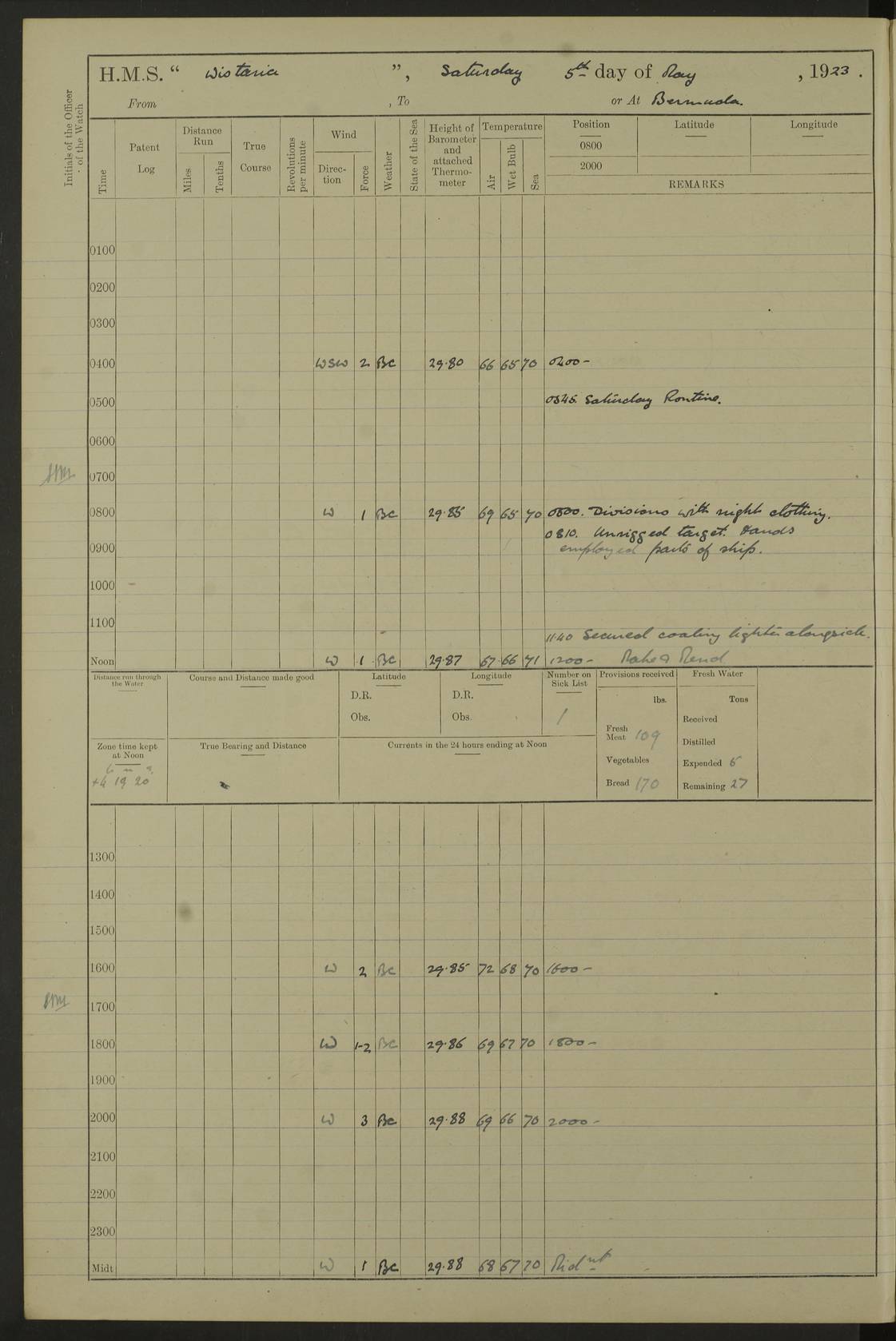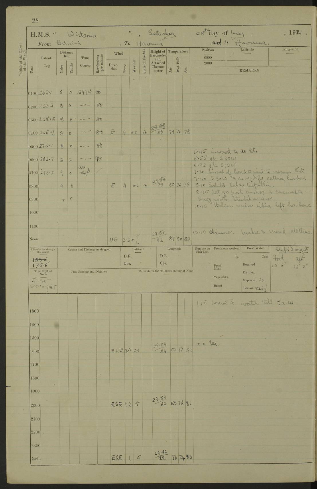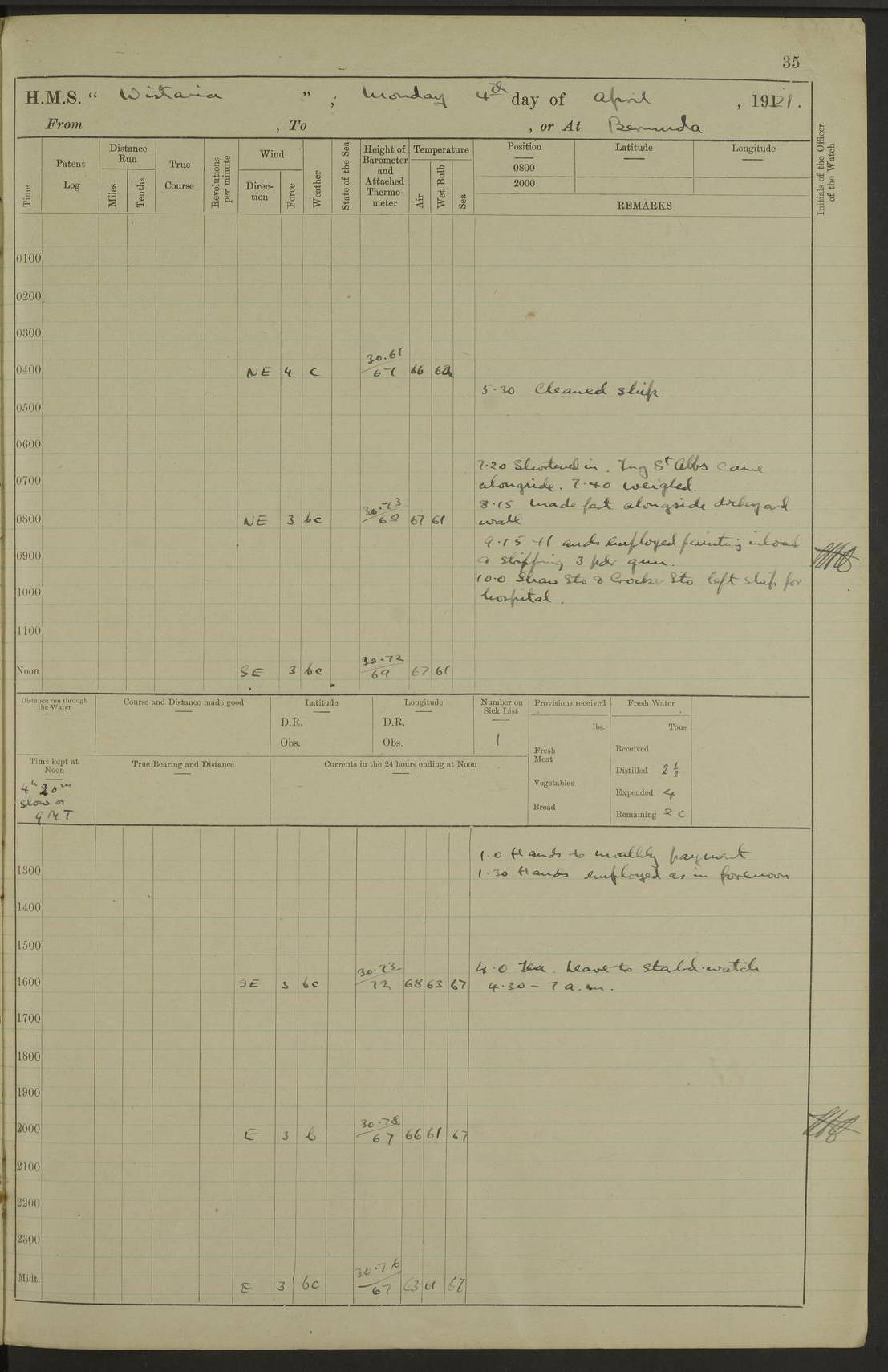 LOGS FOR MAY 1921 4f73ca1da2fc8ea9030009f9: (https://s3.amazonaws.com:443/oldweather/ADM53-93261/0003_1.jpg) 1 May 1921 At Bermuda Lat 32.32, Long -64.8 10.0am: Landed church parties 4f73ca1ea2fc8ea9030009fa: (https://s3.amazonaws.com:443/oldweather/ADM53-93261/0004_0.jpg) 2 May 1921 At Bermuda Lat 32.32, Long -64.8 7.50am: “Creole” came alongside 8.15am: Hands employed shifting ammunition & cleaning paintwork Crocker (Sto) returned from hospital. 4 ratings lent to “Malabar” returned [“Malabar”: perhaps HMS “Malabar”, a shore establishment in Bermuda between 1919 and 1951, and 1965 and 1995] 4f73ca1ea2fc8ea9030009fb: (https://s3.amazonaws.com:443/oldweather/ADM53-93261/0004_1.jpg) 3 May 1921 At Bermuda Lat 32.32, Long -64.8 8.10am: “Tamar” arrived in basin 8.15am: Hands employed furling Q.D. awning 8.30am: Range Party landed 4.0pm: Tea. Leave to watch. Leading Stoker Tillman discharged to hospital 4f73ca1ea2fc8ea9030009fc: (https://s3.amazonaws.com:443/oldweather/ADM53-93261/0005_0.jpg) 4 May 1921 At Bermuda Lat 32.32, Long -64.8 8.0am: Hands employed in dockyard Wright, A.B., returned from hospital Horide, Ord. S., discharged to hospital 1.15pm: Hands employed refitting gear 4f73ca1fa2fc8ea9030009fd: (https://s3.amazonaws.com:443/oldweather/ADM53-93261/0005_1.jpg) 5 May 1921 At Bermuda Lat 32.32, Long -64.8 8.15am: Hands secured ship for sea 9.10am: Left basin 10.0am: Carried out 1” aiming rifle practice noon: Anchored off Tobacco Rock Anchor Bearings: Tobacco Rock N81E, Fort Victoria S70E, Fort George jackstaff S19E 1.30pm: Hands employed in rigging dressing lines at 4” loader drill 4f73ca1fa2fc8ea9030009fe: (https://s3.amazonaws.com:443/oldweather/ADM53-93261/0006_0.jpg) 6 May 1921 At Bermuda Lat 32.32, Long -64.8 6.0am: Cleaned ship and secured target for towing 7.50am: Shortened in 7.55am: Rake party from “Cambrian” arrived 8.0am: Weighed & proceeded 9.0am: Carried out 1” aiming rifle firing 11.0am: Passed through narrows 11.30am: Anchored and dressed ship overall Anchor Bearings: Tobacco Rock N80E, Fort Victoria F. S. S71E, Fort George jackstaff S20E 1.15pm: Hands employed parts of ship 2.20pm: “Valerian” entered harbour 5.10pm: Both watches moor target astern 6.30pm: SS “Glen Ridge” entered harbour 6.35pm: Undressed ship [SS “Glen Ridge”: perhaps misspelt SS “Glenbridge” built 1911] 4f73ca20a2fc8ea9030009ff: (https://s3.amazonaws.com:443/oldweather/ADM53-93261/0006_1.jpg) 7 May 1921 At Bermuda Lat 32.32, Long -64.8 6.40am: Shortened in 7.10am: Weighed and proceeded 9.20am: “St Abbs” came alongside 9.30am: Entered basin 9.45am: Made fast alongside wall 1.15pm: 7 hands employed in dockyard placing wire in tug 2.0pm: Party returned 7.15pm: Patrol landed 4f73ca20a2fc8ea903000a00: (https://s3.amazonaws.com:443/oldweather/ADM53-93261/0007_0.jpg) 8 May 1921 At Bermuda Lat 32.32, Long -64.8 8.45am: Clear up decks for divisions 9.0am: R.C. Church party landed 10.0am: Divisions. Church of England party landed 4f73ca20a2fc8ea903000a01: (https://s3.amazonaws.com:443/oldweather/ADM53-93261/0007_1.jpg) 9 May 1921 At Bermuda Lat 32.32, Long -64.8 6.0am: Furled Q.D. awning & cleaned ship 8.30am: Left basin 9.0am: Proceeded to sea for 4” full calibre exercise 11.15am: Finished firing & returned to harbour 1.15pm: Anchored off dockyard 1.40pm: “Valerian” proceeded into basin 2.40pm: Proceeded into basin 3.15pm: Secured alongside wall 6.50pm: Shifted lighter from “Valerian” 7.25pm: Coal lighter secured alongside 4f73ca21a2fc8ea903000a02: (https://s3.amazonaws.com:443/oldweather/ADM53-93261/0008_0.jpg) 10 May 1921 At Bermuda Lat 32.32, Long -64.8 5.0am: Hands prepared to coal ship 5.40am: Coal ship 9.30am: Finished coaling. Hands cleaned ship 4f73ca21a2fc8ea903000a03: (https://s3.amazonaws.com:443/oldweather/ADM53-93261/0008_1.jpg) 11 May 1921 At Bermuda Lat 32.32, Long -64.8 8.15am: Hands employed clearing up ship & painting outside Captain’s cabin 1.15pm: Hands employed returning main derrick to store & securing ship for sea 2.15pm: Three rating returned from hospital 2.55pm: One leading seaman joined ship from “Constance” 4.30pm: Left basin 5.0pm: Course as required for ship channel. Speed 11 knots 5.59pm: Fairway buoy abeam. Course S15E 6.0pm: Streamed patent log 7.16pm: Gibbs Hill Lt abeam, 1¾ miles 4f73ca21a2fc8ea903000a04: (https://s3.amazonaws.com:443/oldweather/ADM53-93261/0009_0.jpg) 12 May 1921 From Bermuda to Nassau [No coordinates available] 7.30am: Log fouled by weed 7.40am: Cleared & streamed log 9.10am: Hands to divisions with night clothing 9.30am: Hands employed with parts of ship 11.25am: Hove in log on account of weed 5.0pm: Put clocks back 20 minutes 4f73ca22a2fc8ea903000a05: (https://s3.amazonaws.com:443/oldweather/ADM53-93261/0009_1.jpg) 13 May 1921 From Bermuda to Nassau [No coordinates available] 1.15pm: Hands employed rigging fore derrick, painting inside Q.D. and preparing stream anchor for use 3.55pm: Sighted sailing ship on port beam 5.0pm: Put clocks back 20 minutes 9.0pm: Passed steamship to Starboard 4f73ca22a2fc8ea903000a06: (https://s3.amazonaws.com:443/oldweather/ADM53-93261/0010_0.jpg) 14 May 1921 From Bermuda to Nassau and at Nassau Lat 20.57, Long -77.3 9.05am: Sighted land on Port bow. Hands employed cleaning ship 1.45pm: Stopped to drop kedge & weigh it up 2.0pm: Proceeded into harbour 2.30pm: Moored head-and-stern Anchor bearings: Chimney S24W, Hotel Tower S7E, Library Cupola S50E 4f73ca23a2fc8ea903000a07: (https://s3.amazonaws.com:443/oldweather/ADM53-93261/0010_1.jpg) 15 May 1921 At Nassau Lat 20.57, Long -77.3 6.15am: Cleaned ship 10.10am: Church 4f73ca23a2fc8ea903000a08: (https://s3.amazonaws.com:443/oldweather/ADM53-93261/0011_0.jpg) 16 May 1921 At Nassau Lat 20.57, Long -77.3 5.30am: Hands employed rigging stages for painting 8.15am: Hands cleaning & painting ship Lost by accident 1 paint brush 2.0pm: Hands employed as forenoon 5.0pm: Hands to bathe 4f73ca23a2fc8ea903000a09: (https://s3.a