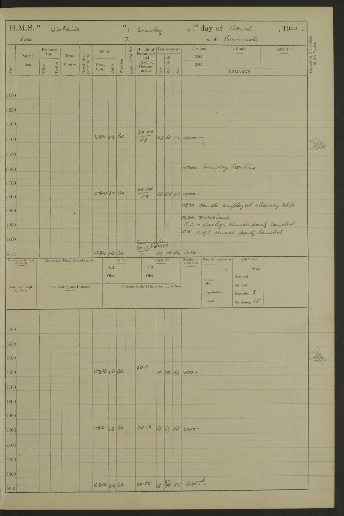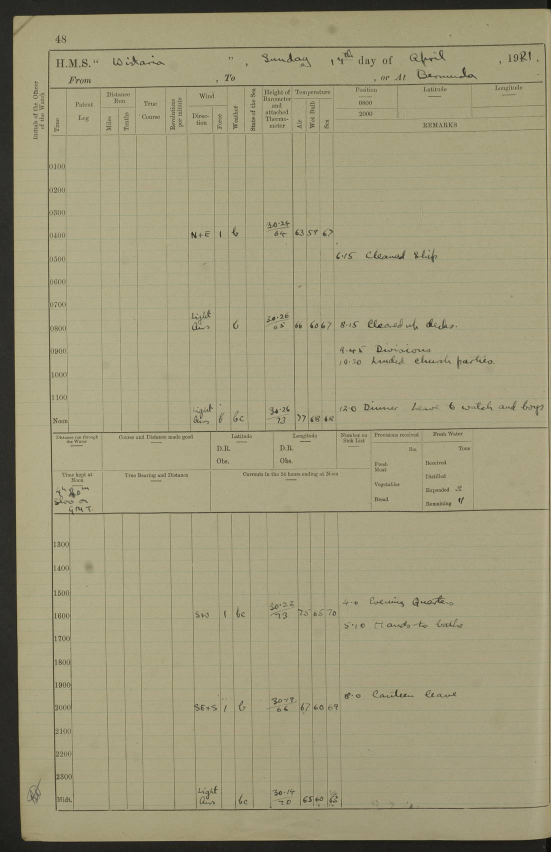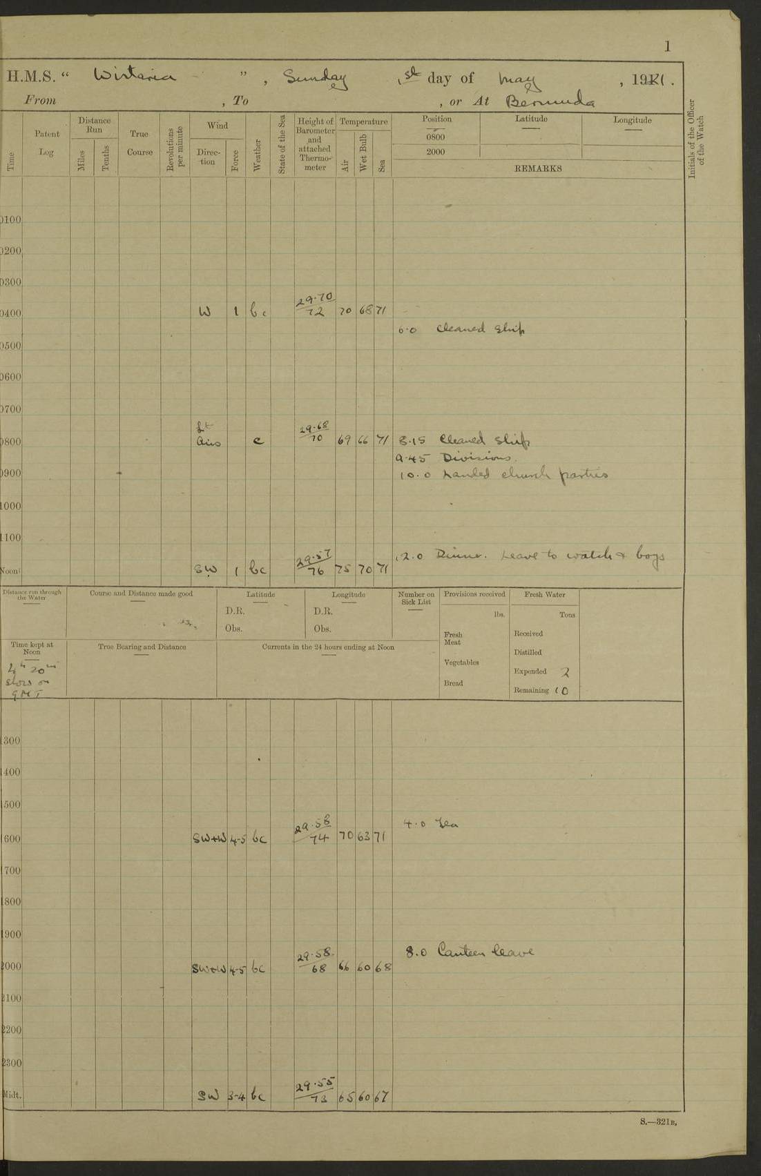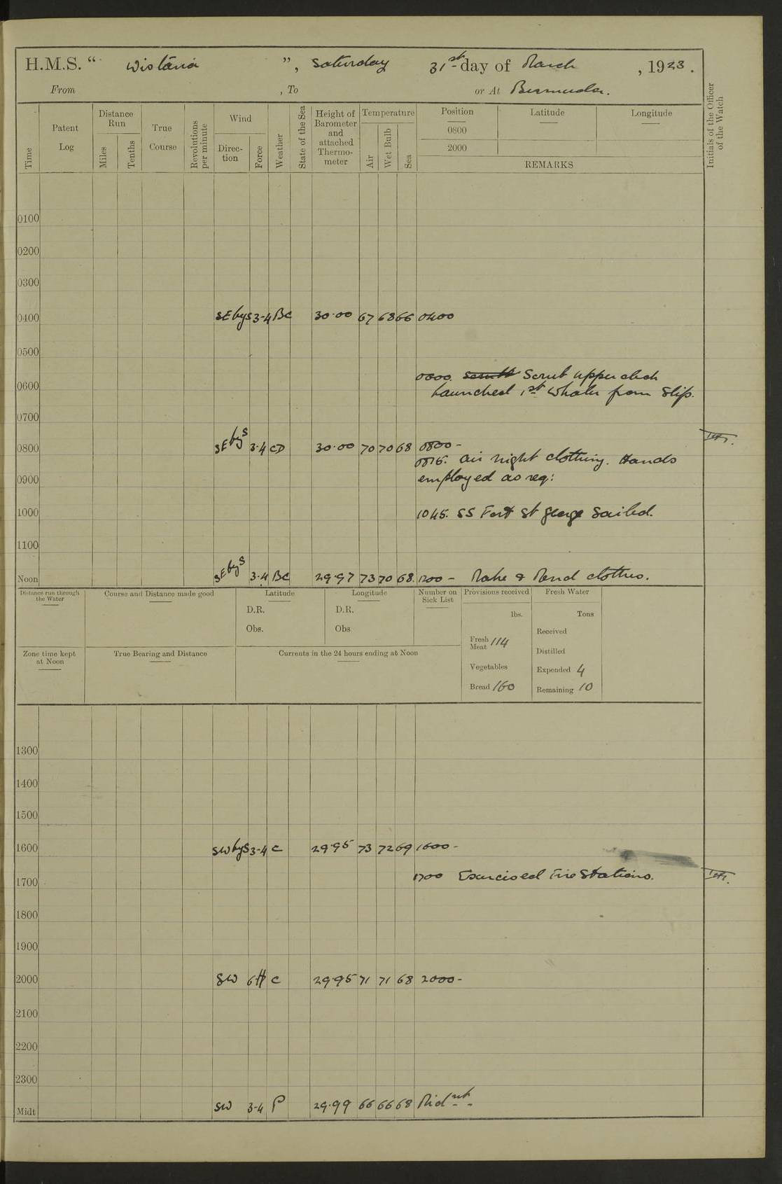 LOGS FOR MAY 1921 4f73ca1da2fc8ea9030009f9: (https://s3.amazonaws.com:443/oldweather/ADM53-93261/0003_1.jpg) 1 May 1921 At Bermuda Lat 32.32, Long -64.8 10.0am: Landed church parties 4f73ca1ea2fc8ea9030009fa: (https://s3.amazonaws.com:443/oldweather/ADM53-93261/0004_0.jpg) 2 May 1921 At Bermuda Lat 32.32, Long -64.8 7.50am: “Creole” came alongside 8.15am: Hands employed shifting ammunition & cleaning paintwork Crocker (Sto) returned from hospital. 4 ratings lent to “Malabar” returned [“Malabar”: perhaps HMS “Malabar”, a shore establishment in Bermuda between 1919 and 1951, and 1965 and 1995] 4f73ca1ea2fc8ea9030009fb: (https://s3.amazonaws.com:443/oldweather/ADM53-93261/0004_1.jpg) 3 May 1921 At Bermuda Lat 32.32, Long -64.8 8.10am: “Tamar” arrived in basin 8.15am: Hands employed furling Q.D. awning 8.30am: Range Party landed 4.0pm: Tea. Leave to watch. Leading Stoker Tillman discharged to hospital 4f73ca1ea2fc8ea9030009fc: (https://s3.amazonaws.com:443/oldweather/ADM53-93261/0005_0.jpg) 4 May 1921 At Bermuda Lat 32.32, Long -64.8 8.0am: Hands employed in dockyard Wright, A.B., returned from hospital Horide, Ord. S., discharged to hospital 1.15pm: Hands employed refitting gear 4f73ca1fa2fc8ea9030009fd: (https://s3.amazonaws.com:443/oldweather/ADM53-93261/0005_1.jpg) 5 May 1921 At Bermuda Lat 32.32, Long -64.8 8.15am: Hands secured ship for sea 9.10am: Left basin 10.0am: Carried out 1” aiming rifle practice noon: Anchored off Tobacco Rock Anchor Bearings: Tobacco Rock N81E, Fort Victoria S70E, Fort George jackstaff S19E 1.30pm: Hands employed in rigging dressing lines at 4” loader drill 4f73ca1fa2fc8ea9030009fe: (https://s3.amazonaws.com:443/oldweather/ADM53-93261/0006_0.jpg) 6 May 1921 At Bermuda Lat 32.32, Long -64.8 6.0am: Cleaned ship and secured target for towing 7.50am: Shortened in 7.55am: Rake party from “Cambrian” arrived 8.0am: Weighed & proceeded 9.0am: Carried out 1” aiming rifle firing 11.0am: Passed through narrows 11.30am: Anchored and dressed ship overall Anchor Bearings: Tobacco Rock N80E, Fort Victoria F. S. S71E, Fort George jackstaff S20E 1.15pm: Hands employed parts of ship 2.20pm: “Valerian” entered harbour 5.10pm: Both watches moor target astern 6.30pm: SS “Glen Ridge” entered harbour 6.35pm: Undressed ship [SS “Glen Ridge”: perhaps misspelt SS “Glenbridge” built 1911] 4f73ca20a2fc8ea9030009ff: (https://s3.amazonaws.com:443/oldweather/ADM53-93261/0006_1.jpg) 7 May 1921 At Bermuda Lat 32.32, Long -64.8 6.40am: Shortened in 7.10am: Weighed and proceeded 9.20am: “St Abbs” came alongside 9.30am: Entered basin 9.45am: Made fast alongside wall 1.15pm: 7 hands employed in dockyard placing wire in tug 2.0pm: Party returned 7.15pm: Patrol landed 4f73ca20a2fc8ea903000a00: (https://s3.amazonaws.com:443/oldweather/ADM53-93261/0007_0.jpg) 8 May 1921 At Bermuda Lat 32.32, Long -64.8 8.45am: Clear up decks for divisions 9.0am: R.C. Church party landed 10.0am: Divisions. Church of England party landed 4f73ca20a2fc8ea903000a01: (https://s3.amazonaws.com:443/oldweather/ADM53-93261/0007_1.jpg) 9 May 1921 At Bermuda Lat 32.32, Long -64.8 6.0am: Furled Q.D. awning & cleaned ship 8.30am: Left basin 9.0am: Proceeded to sea for 4” full calibre exercise 11.15am: Finished firing & returned to harbour 1.15pm: Anchored off dockyard 1.40pm: “Valerian” proceeded into basin 2.40pm: Proceeded into basin 3.15pm: Secured alongside wall 6.50pm: Shifted lighter from “Valerian” 7.25pm: Coal lighter secured alongside 4f73ca21a2fc8ea903000a02: (https://s3.amazonaws.com:443/oldweather/ADM53-93261/0008_0.jpg) 10 May 1921 At Bermuda Lat 32.32, Long -64.8 5.0am: Hands prepared to coal ship 5.40am: Coal ship 9.30am: Finished coaling. Hands cleaned ship 4f73ca21a2fc8ea903000a03: (https://s3.amazonaws.com:443/oldweather/ADM53-93261/0008_1.jpg) 11 May 1921 At Bermuda Lat 32.32, Long -64.8 8.15am: Hands employed clearing up ship & painting outside Captain’s cabin 1.15pm: Hands employed returning main derrick to store & securing ship for sea 2.15pm: Three rating returned from hospital 2.55pm: One leading seaman joined ship from “Constance” 4.30pm: Left basin 5.0pm: Course as required for ship channel. Speed 11 knots 5.59pm: Fairway buoy abeam. Course S15E 6.0pm: Streamed patent log 7.16pm: Gibbs Hill Lt abeam, 1¾ miles 4f73ca21a2fc8ea903000a04: (https://s3.amazonaws.com:443/oldweather/ADM53-93261/0009_0.jpg) 12 May 1921 From Bermuda to Nassau [No coordinates available] 7.30am: Log fouled by weed 7.40am: Cleared & streamed log 9.10am: Hands to divisions with night clothing 9.30am: Hands employed with parts of ship 11.25am: Hove in log on account of weed 5.0pm: Put clocks back 20 minutes 4f73ca22a2fc8ea903000a05: (https://s3.amazonaws.com:443/oldweather/ADM53-93261/0009_1.jpg) 13 May 1921 From Bermuda to Nassau [No coordinates available] 1.15pm: Hands employed rigging fore derrick, painting inside Q.D. and preparing stream anchor for use 3.55pm: Sighted sailing ship on port beam 5.0pm: Put clocks back 20 minutes 9.0pm: Passed steamship to Starboard 4f73ca22a2fc8ea903000a06: (https://s3.amazonaws.com:443/oldweather/ADM53-93261/0010_0.jpg) 14 May 1921 From Bermuda to Nassau and at Nassau Lat 20.57, Long -77.3 9.05am: Sighted land on Port bow. Hands employed cleaning ship 1.45pm: Stopped to drop kedge & weigh it up 2.0pm: Proceeded into harbour 2.30pm: Moored head-and-stern Anchor bearings: Chimney S24W, Hotel Tower S7E, Library Cupola S50E 4f73ca23a2fc8ea903000a07: (https://s3.amazonaws.com:443/oldweather/ADM53-93261/0010_1.jpg) 15 May 1921 At Nassau Lat 20.57, Long -77.3 6.15am: Cleaned ship 10.10am: Church 4f73ca23a2fc8ea903000a08: (https://s3.amazonaws.com:443/oldweather/ADM53-93261/0011_0.jpg) 16 May 1921 At Nassau Lat 20.57, Long -77.3 5.30am: Hands employed rigging stages for painting 8.15am: Hands cleaning & painting ship Lost by accident 1 paint brush 2.0pm: Hands employed as forenoon 5.0pm: Hands to bathe 4f73ca23a2fc8ea903000a09: (https://s3.a