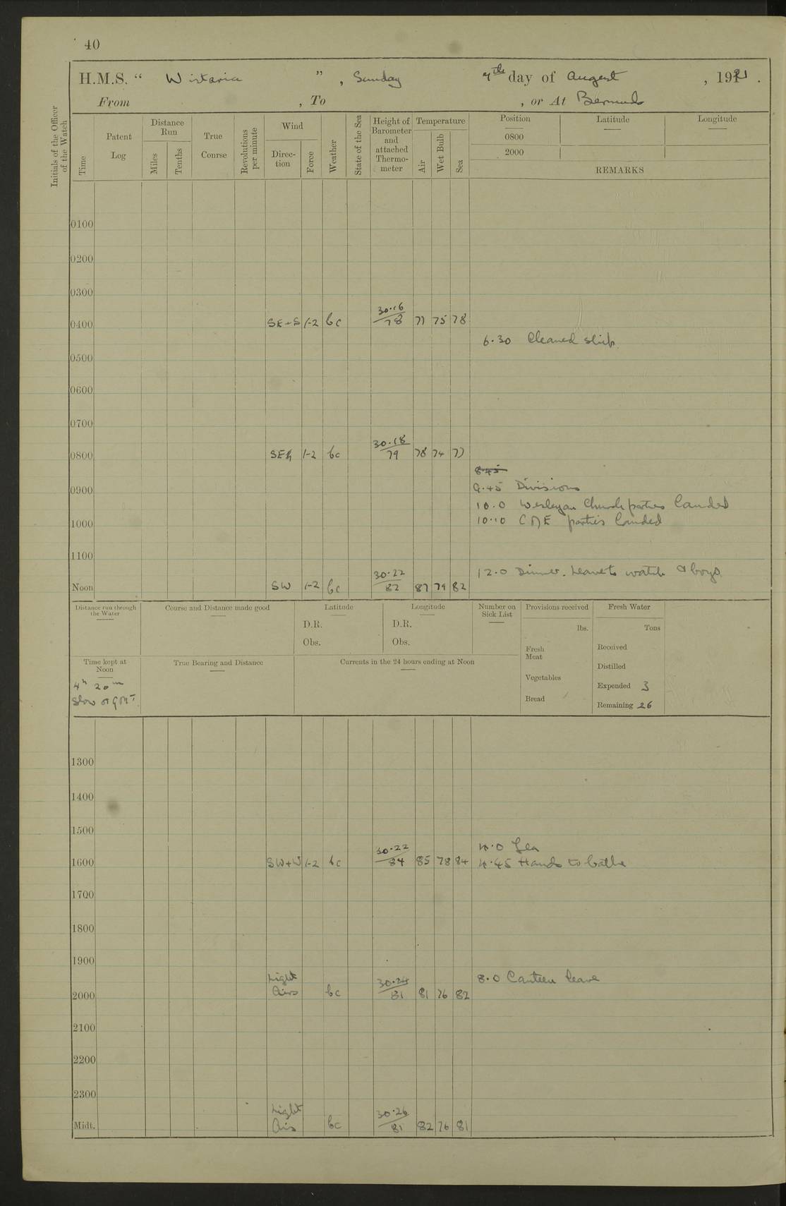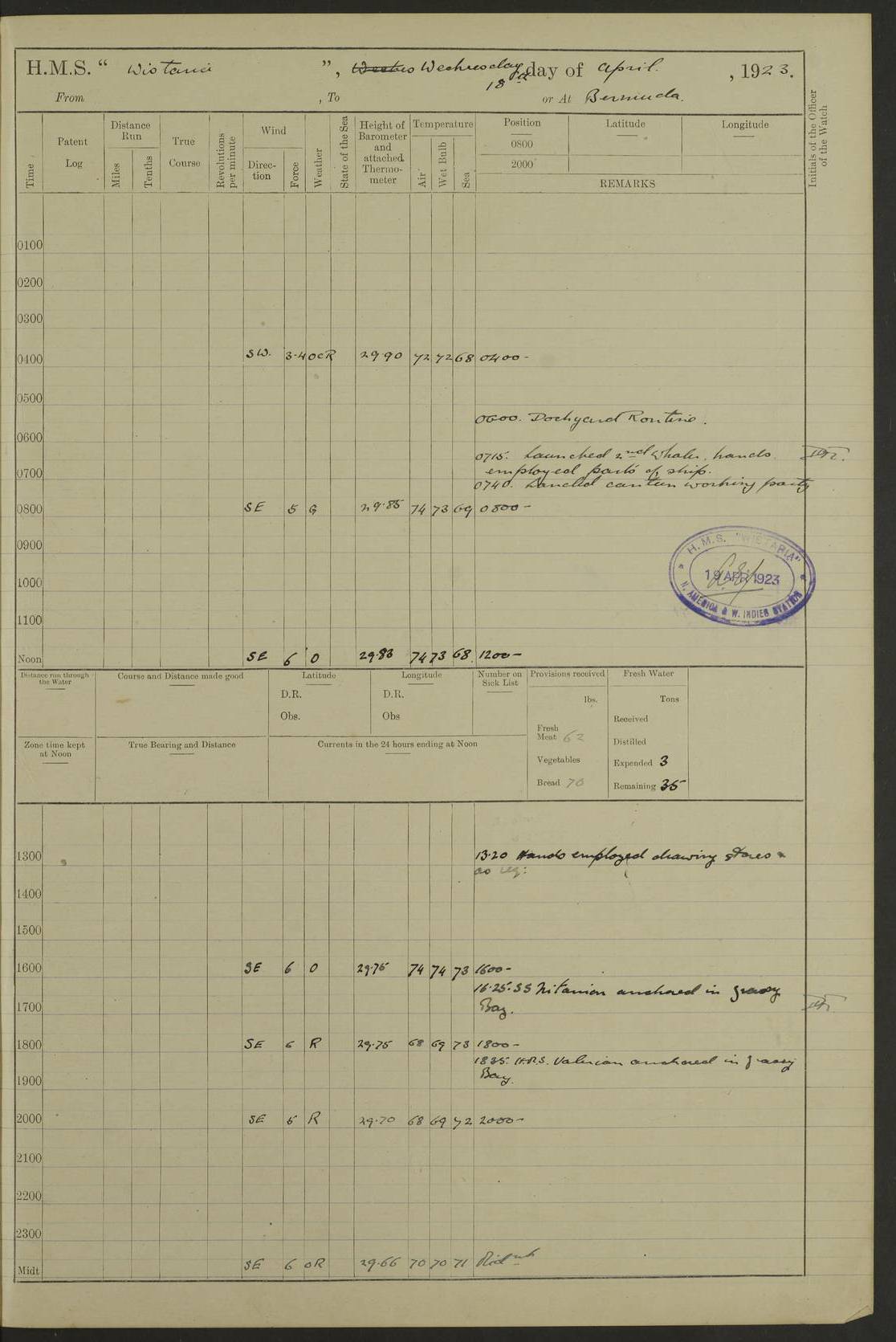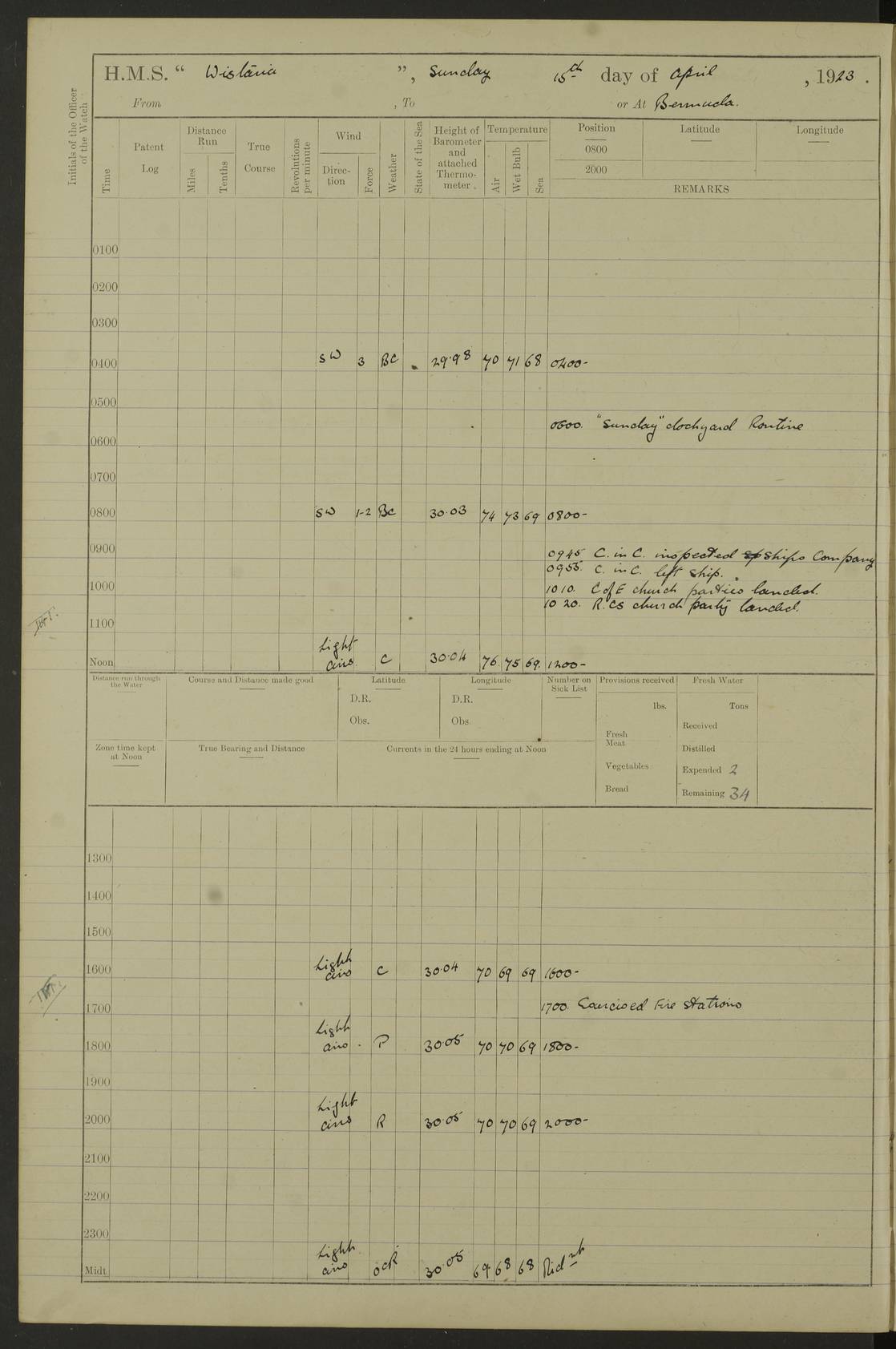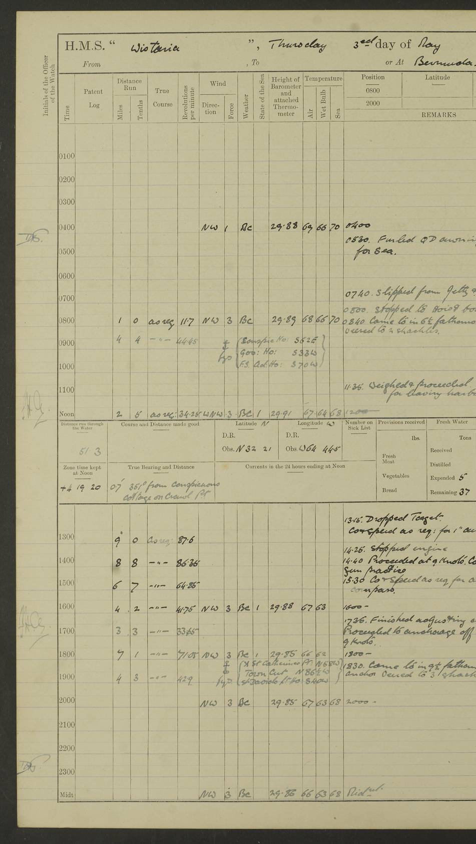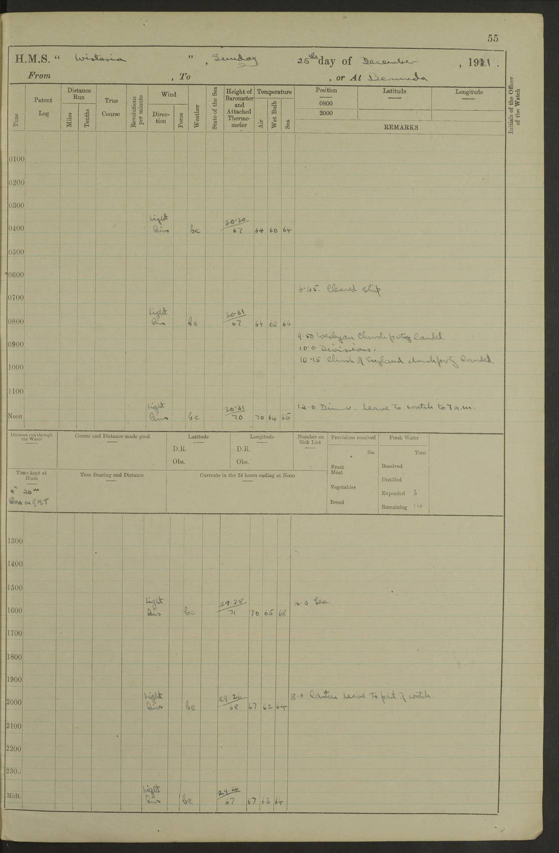 LOGS FOR MAY 1921 4f73ca1da2fc8ea9030009f9: (https://s3.amazonaws.com:443/oldweather/ADM53-93261/0003_1.jpg) 1 May 1921 At Bermuda Lat 32.32, Long -64.8 10.0am: Landed church parties 4f73ca1ea2fc8ea9030009fa: (https://s3.amazonaws.com:443/oldweather/ADM53-93261/0004_0.jpg) 2 May 1921 At Bermuda Lat 32.32, Long -64.8 7.50am: “Creole” came alongside 8.15am: Hands employed shifting ammunition & cleaning paintwork Crocker (Sto) returned from hospital. 4 ratings lent to “Malabar” returned [“Malabar”: perhaps HMS “Malabar”, a shore establishment in Bermuda between 1919 and 1951, and 1965 and 1995] 4f73ca1ea2fc8ea9030009fb: (https://s3.amazonaws.com:443/oldweather/ADM53-93261/0004_1.jpg) 3 May 1921 At Bermuda Lat 32.32, Long -64.8 8.10am: “Tamar” arrived in basin 8.15am: Hands employed furling Q.D. awning 8.30am: Range Party landed 4.0pm: Tea. Leave to watch. Leading Stoker Tillman discharged to hospital 4f73ca1ea2fc8ea9030009fc: (https://s3.amazonaws.com:443/oldweather/ADM53-93261/0005_0.jpg) 4 May 1921 At Bermuda Lat 32.32, Long -64.8 8.0am: Hands employed in dockyard Wright, A.B., returned from hospital Horide, Ord. S., discharged to hospital 1.15pm: Hands employed refitting gear 4f73ca1fa2fc8ea9030009fd: (https://s3.amazonaws.com:443/oldweather/ADM53-93261/0005_1.jpg) 5 May 1921 At Bermuda Lat 32.32, Long -64.8 8.15am: Hands secured ship for sea 9.10am: Left basin 10.0am: Carried out 1” aiming rifle practice noon: Anchored off Tobacco Rock Anchor Bearings: Tobacco Rock N81E, Fort Victoria S70E, Fort George jackstaff S19E 1.30pm: Hands employed in rigging dressing lines at 4” loader drill 4f73ca1fa2fc8ea9030009fe: (https://s3.amazonaws.com:443/oldweather/ADM53-93261/0006_0.jpg) 6 May 1921 At Bermuda Lat 32.32, Long -64.8 6.0am: Cleaned ship and secured target for towing 7.50am: Shortened in 7.55am: Rake party from “Cambrian” arrived 8.0am: Weighed & proceeded 9.0am: Carried out 1” aiming rifle firing 11.0am: Passed through narrows 11.30am: Anchored and dressed ship overall Anchor Bearings: Tobacco Rock N80E, Fort Victoria F. S. S71E, Fort George jackstaff S20E 1.15pm: Hands employed parts of ship 2.20pm: “Valerian” entered harbour 5.10pm: Both watches moor target astern 6.30pm: SS “Glen Ridge” entered harbour 6.35pm: Undressed ship [SS “Glen Ridge”: perhaps misspelt SS “Glenbridge” built 1911] 4f73ca20a2fc8ea9030009ff: (https://s3.amazonaws.com:443/oldweather/ADM53-93261/0006_1.jpg) 7 May 1921 At Bermuda Lat 32.32, Long -64.8 6.40am: Shortened in 7.10am: Weighed and proceeded 9.20am: “St Abbs” came alongside 9.30am: Entered basin 9.45am: Made fast alongside wall 1.15pm: 7 hands employed in dockyard placing wire in tug 2.0pm: Party returned 7.15pm: Patrol landed 4f73ca20a2fc8ea903000a00: (https://s3.amazonaws.com:443/oldweather/ADM53-93261/0007_0.jpg) 8 May 1921 At Bermuda Lat 32.32, Long -64.8 8.45am: Clear up decks for divisions 9.0am: R.C. Church party landed 10.0am: Divisions. Church of England party landed 4f73ca20a2fc8ea903000a01: (https://s3.amazonaws.com:443/oldweather/ADM53-93261/0007_1.jpg) 9 May 1921 At Bermuda Lat 32.32, Long -64.8 6.0am: Furled Q.D. awning & cleaned ship 8.30am: Left basin 9.0am: Proceeded to sea for 4” full calibre exercise 11.15am: Finished firing & returned to harbour 1.15pm: Anchored off dockyard 1.40pm: “Valerian” proceeded into basin 2.40pm: Proceeded into basin 3.15pm: Secured alongside wall 6.50pm: Shifted lighter from “Valerian” 7.25pm: Coal lighter secured alongside 4f73ca21a2fc8ea903000a02: (https://s3.amazonaws.com:443/oldweather/ADM53-93261/0008_0.jpg) 10 May 1921 At Bermuda Lat 32.32, Long -64.8 5.0am: Hands prepared to coal ship 5.40am: Coal ship 9.30am: Finished coaling. Hands cleaned ship 4f73ca21a2fc8ea903000a03: (https://s3.amazonaws.com:443/oldweather/ADM53-93261/0008_1.jpg) 11 May 1921 At Bermuda Lat 32.32, Long -64.8 8.15am: Hands employed clearing up ship & painting outside Captain’s cabin 1.15pm: Hands employed returning main derrick to store & securing ship for sea 2.15pm: Three rating returned from hospital 2.55pm: One leading seaman joined ship from “Constance” 4.30pm: Left basin 5.0pm: Course as required for ship channel. Speed 11 knots 5.59pm: Fairway buoy abeam. Course S15E 6.0pm: Streamed patent log 7.16pm: Gibbs Hill Lt abeam, 1¾ miles 4f73ca21a2fc8ea903000a04: (https://s3.amazonaws.com:443/oldweather/ADM53-93261/0009_0.jpg) 12 May 1921 From Bermuda to Nassau [No coordinates available] 7.30am: Log fouled by weed 7.40am: Cleared & streamed log 9.10am: Hands to divisions with night clothing 9.30am: Hands employed with parts of ship 11.25am: Hove in log on account of weed 5.0pm: Put clocks back 20 minutes 4f73ca22a2fc8ea903000a05: (https://s3.amazonaws.com:443/oldweather/ADM53-93261/0009_1.jpg) 13 May 1921 From Bermuda to Nassau [No coordinates available] 1.15pm: Hands employed rigging fore derrick, painting inside Q.D. and preparing stream anchor for use 3.55pm: Sighted sailing ship on port beam 5.0pm: Put clocks back 20 minutes 9.0pm: Passed steamship to Starboard 4f73ca22a2fc8ea903000a06: (https://s3.amazonaws.com:443/oldweather/ADM53-93261/0010_0.jpg) 14 May 1921 From Bermuda to Nassau and at Nassau Lat 20.57, Long -77.3 9.05am: Sighted land on Port bow. Hands employed cleaning ship 1.45pm: Stopped to drop kedge & weigh it up 2.0pm: Proceeded into harbour 2.30pm: Moored head-and-stern Anchor bearings: Chimney S24W, Hotel Tower S7E, Library Cupola S50E 4f73ca23a2fc8ea903000a07: (https://s3.amazonaws.com:443/oldweather/ADM53-93261/0010_1.jpg) 15 May 1921 At Nassau Lat 20.57, Long -77.3 6.15am: Cleaned ship 10.10am: Church 4f73ca23a2fc8ea903000a08: (https://s3.amazonaws.com:443/oldweather/ADM53-93261/0011_0.jpg) 16 May 1921 At Nassau Lat 20.57, Long -77.3 5.30am: Hands employed rigging stages for painting 8.15am: Hands cleaning & painting ship Lost by accident 1 paint brush 2.0pm: Hands employed as forenoon 5.0pm: Hands to bathe 4f73ca23a2fc8ea903000a09: (https://s3.a