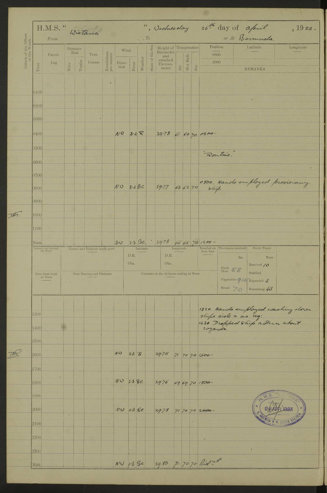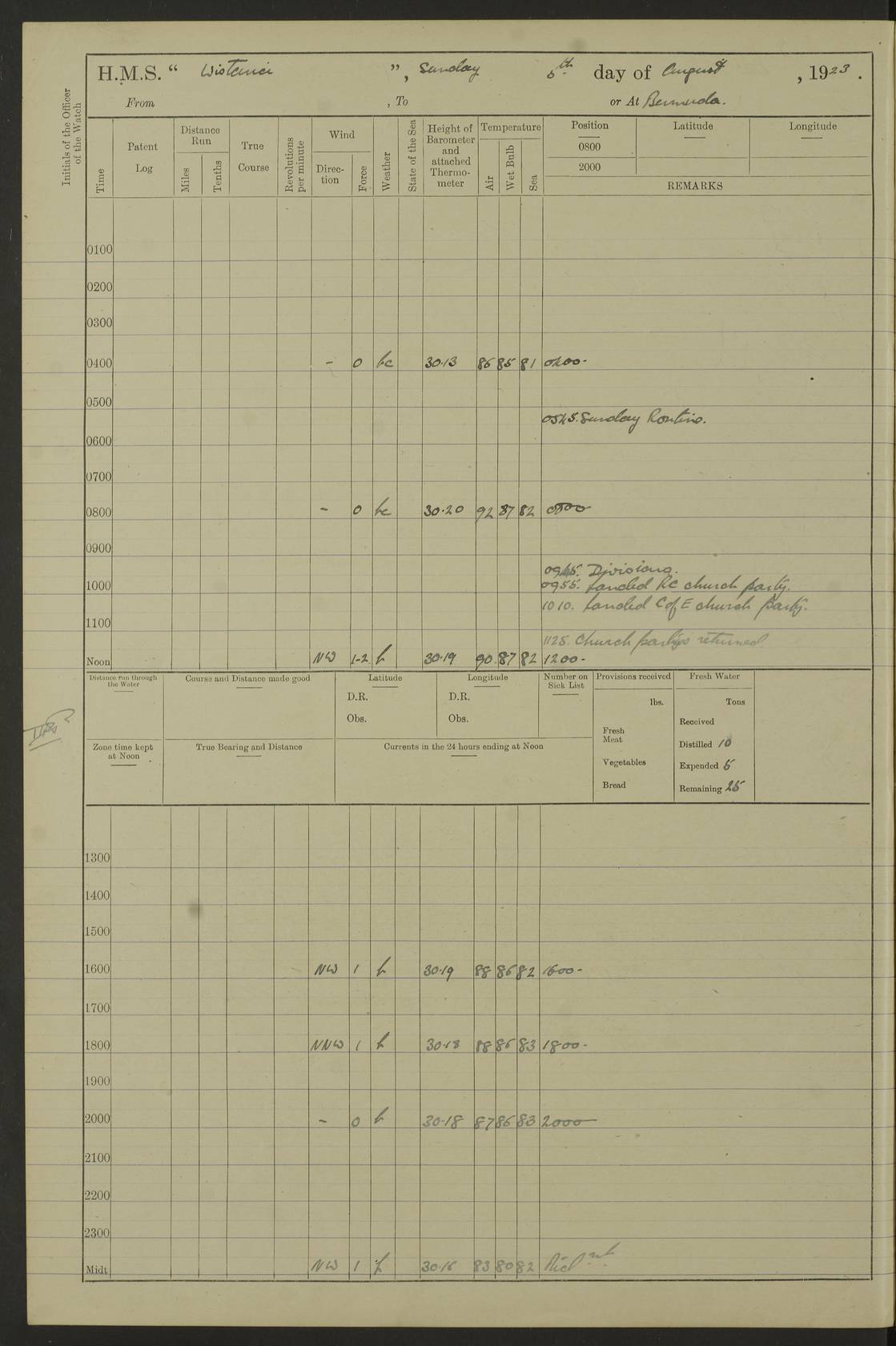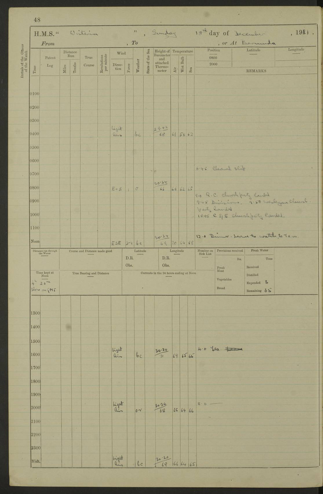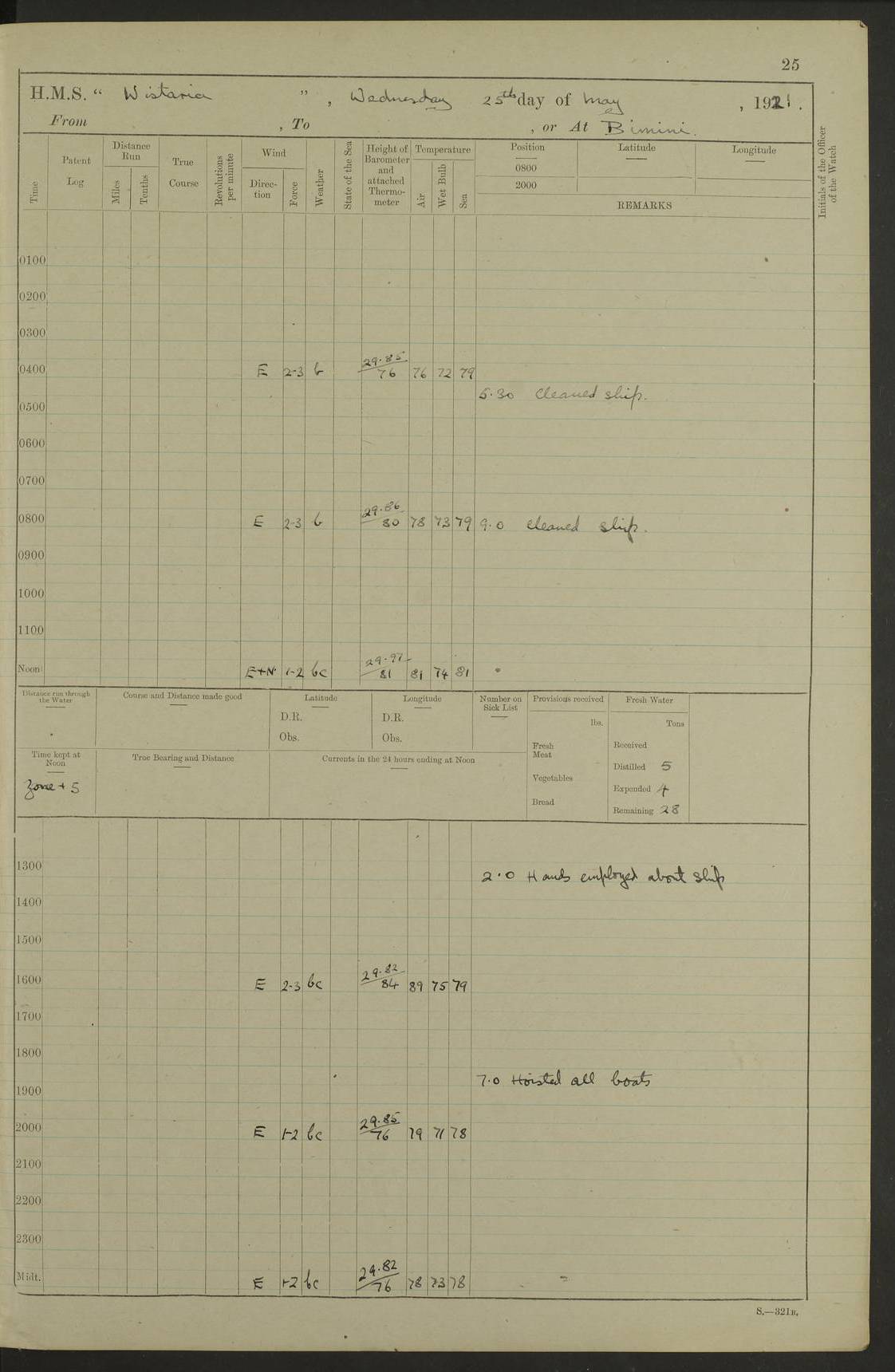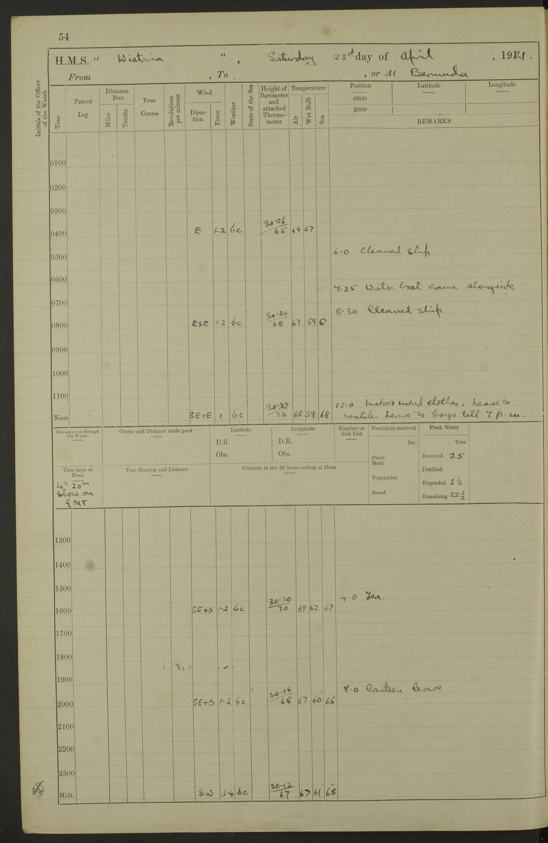 LOGS FOR MAY 1921 4f73ca1da2fc8ea9030009f9: (https://s3.amazonaws.com:443/oldweather/ADM53-93261/0003_1.jpg) 1 May 1921 At Bermuda Lat 32.32, Long -64.8 10.0am: Landed church parties 4f73ca1ea2fc8ea9030009fa: (https://s3.amazonaws.com:443/oldweather/ADM53-93261/0004_0.jpg) 2 May 1921 At Bermuda Lat 32.32, Long -64.8 7.50am: “Creole” came alongside 8.15am: Hands employed shifting ammunition & cleaning paintwork Crocker (Sto) returned from hospital. 4 ratings lent to “Malabar” returned [“Malabar”: perhaps HMS “Malabar”, a shore establishment in Bermuda between 1919 and 1951, and 1965 and 1995] 4f73ca1ea2fc8ea9030009fb: (https://s3.amazonaws.com:443/oldweather/ADM53-93261/0004_1.jpg) 3 May 1921 At Bermuda Lat 32.32, Long -64.8 8.10am: “Tamar” arrived in basin 8.15am: Hands employed furling Q.D. awning 8.30am: Range Party landed 4.0pm: Tea. Leave to watch. Leading Stoker Tillman discharged to hospital 4f73ca1ea2fc8ea9030009fc: (https://s3.amazonaws.com:443/oldweather/ADM53-93261/0005_0.jpg) 4 May 1921 At Bermuda Lat 32.32, Long -64.8 8.0am: Hands employed in dockyard Wright, A.B., returned from hospital Horide, Ord. S., discharged to hospital 1.15pm: Hands employed refitting gear 4f73ca1fa2fc8ea9030009fd: (https://s3.amazonaws.com:443/oldweather/ADM53-93261/0005_1.jpg) 5 May 1921 At Bermuda Lat 32.32, Long -64.8 8.15am: Hands secured ship for sea 9.10am: Left basin 10.0am: Carried out 1” aiming rifle practice noon: Anchored off Tobacco Rock Anchor Bearings: Tobacco Rock N81E, Fort Victoria S70E, Fort George jackstaff S19E 1.30pm: Hands employed in rigging dressing lines at 4” loader drill 4f73ca1fa2fc8ea9030009fe: (https://s3.amazonaws.com:443/oldweather/ADM53-93261/0006_0.jpg) 6 May 1921 At Bermuda Lat 32.32, Long -64.8 6.0am: Cleaned ship and secured target for towing 7.50am: Shortened in 7.55am: Rake party from “Cambrian” arrived 8.0am: Weighed & proceeded 9.0am: Carried out 1” aiming rifle firing 11.0am: Passed through narrows 11.30am: Anchored and dressed ship overall Anchor Bearings: Tobacco Rock N80E, Fort Victoria F. S. S71E, Fort George jackstaff S20E 1.15pm: Hands employed parts of ship 2.20pm: “Valerian” entered harbour 5.10pm: Both watches moor target astern 6.30pm: SS “Glen Ridge” entered harbour 6.35pm: Undressed ship [SS “Glen Ridge”: perhaps misspelt SS “Glenbridge” built 1911] 4f73ca20a2fc8ea9030009ff: (https://s3.amazonaws.com:443/oldweather/ADM53-93261/0006_1.jpg) 7 May 1921 At Bermuda Lat 32.32, Long -64.8 6.40am: Shortened in 7.10am: Weighed and proceeded 9.20am: “St Abbs” came alongside 9.30am: Entered basin 9.45am: Made fast alongside wall 1.15pm: 7 hands employed in dockyard placing wire in tug 2.0pm: Party returned 7.15pm: Patrol landed 4f73ca20a2fc8ea903000a00: (https://s3.amazonaws.com:443/oldweather/ADM53-93261/0007_0.jpg) 8 May 1921 At Bermuda Lat 32.32, Long -64.8 8.45am: Clear up decks for divisions 9.0am: R.C. Church party landed 10.0am: Divisions. Church of England party landed 4f73ca20a2fc8ea903000a01: (https://s3.amazonaws.com:443/oldweather/ADM53-93261/0007_1.jpg) 9 May 1921 At Bermuda Lat 32.32, Long -64.8 6.0am: Furled Q.D. awning & cleaned ship 8.30am: Left basin 9.0am: Proceeded to sea for 4” full calibre exercise 11.15am: Finished firing & returned to harbour 1.15pm: Anchored off dockyard 1.40pm: “Valerian” proceeded into basin 2.40pm: Proceeded into basin 3.15pm: Secured alongside wall 6.50pm: Shifted lighter from “Valerian” 7.25pm: Coal lighter secured alongside 4f73ca21a2fc8ea903000a02: (https://s3.amazonaws.com:443/oldweather/ADM53-93261/0008_0.jpg) 10 May 1921 At Bermuda Lat 32.32, Long -64.8 5.0am: Hands prepared to coal ship 5.40am: Coal ship 9.30am: Finished coaling. Hands cleaned ship 4f73ca21a2fc8ea903000a03: (https://s3.amazonaws.com:443/oldweather/ADM53-93261/0008_1.jpg) 11 May 1921 At Bermuda Lat 32.32, Long -64.8 8.15am: Hands employed clearing up ship & painting outside Captain’s cabin 1.15pm: Hands employed returning main derrick to store & securing ship for sea 2.15pm: Three rating returned from hospital 2.55pm: One leading seaman joined ship from “Constance” 4.30pm: Left basin 5.0pm: Course as required for ship channel. Speed 11 knots 5.59pm: Fairway buoy abeam. Course S15E 6.0pm: Streamed patent log 7.16pm: Gibbs Hill Lt abeam, 1¾ miles 4f73ca21a2fc8ea903000a04: (https://s3.amazonaws.com:443/oldweather/ADM53-93261/0009_0.jpg) 12 May 1921 From Bermuda to Nassau [No coordinates available] 7.30am: Log fouled by weed 7.40am: Cleared & streamed log 9.10am: Hands to divisions with night clothing 9.30am: Hands employed with parts of ship 11.25am: Hove in log on account of weed 5.0pm: Put clocks back 20 minutes 4f73ca22a2fc8ea903000a05: (https://s3.amazonaws.com:443/oldweather/ADM53-93261/0009_1.jpg) 13 May 1921 From Bermuda to Nassau [No coordinates available] 1.15pm: Hands employed rigging fore derrick, painting inside Q.D. and preparing stream anchor for use 3.55pm: Sighted sailing ship on port beam 5.0pm: Put clocks back 20 minutes 9.0pm: Passed steamship to Starboard 4f73ca22a2fc8ea903000a06: (https://s3.amazonaws.com:443/oldweather/ADM53-93261/0010_0.jpg) 14 May 1921 From Bermuda to Nassau and at Nassau Lat 20.57, Long -77.3 9.05am: Sighted land on Port bow. Hands employed cleaning ship 1.45pm: Stopped to drop kedge & weigh it up 2.0pm: Proceeded into harbour 2.30pm: Moored head-and-stern Anchor bearings: Chimney S24W, Hotel Tower S7E, Library Cupola S50E 4f73ca23a2fc8ea903000a07: (https://s3.amazonaws.com:443/oldweather/ADM53-93261/0010_1.jpg) 15 May 1921 At Nassau Lat 20.57, Long -77.3 6.15am: Cleaned ship 10.10am: Church 4f73ca23a2fc8ea903000a08: (https://s3.amazonaws.com:443/oldweather/ADM53-93261/0011_0.jpg) 16 May 1921 At Nassau Lat 20.57, Long -77.3 5.30am: Hands employed rigging stages for painting 8.15am: Hands cleaning & painting ship Lost by accident 1 paint brush 2.0pm: Hands employed as forenoon 5.0pm: Hands to bathe 4f73ca23a2fc8ea903000a09: (https://s3.a