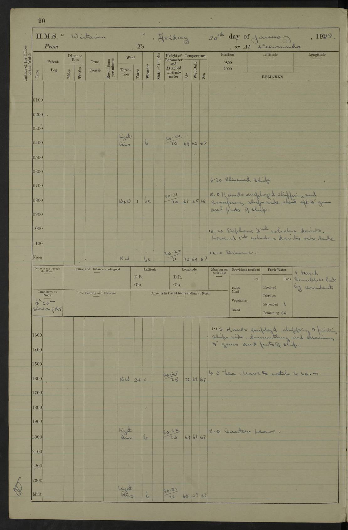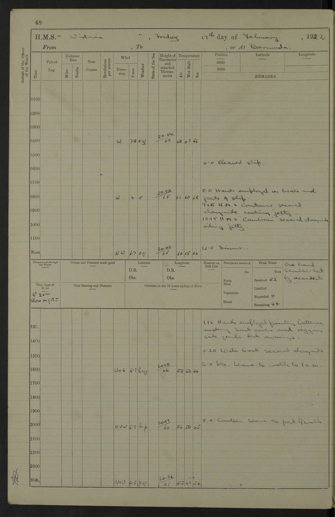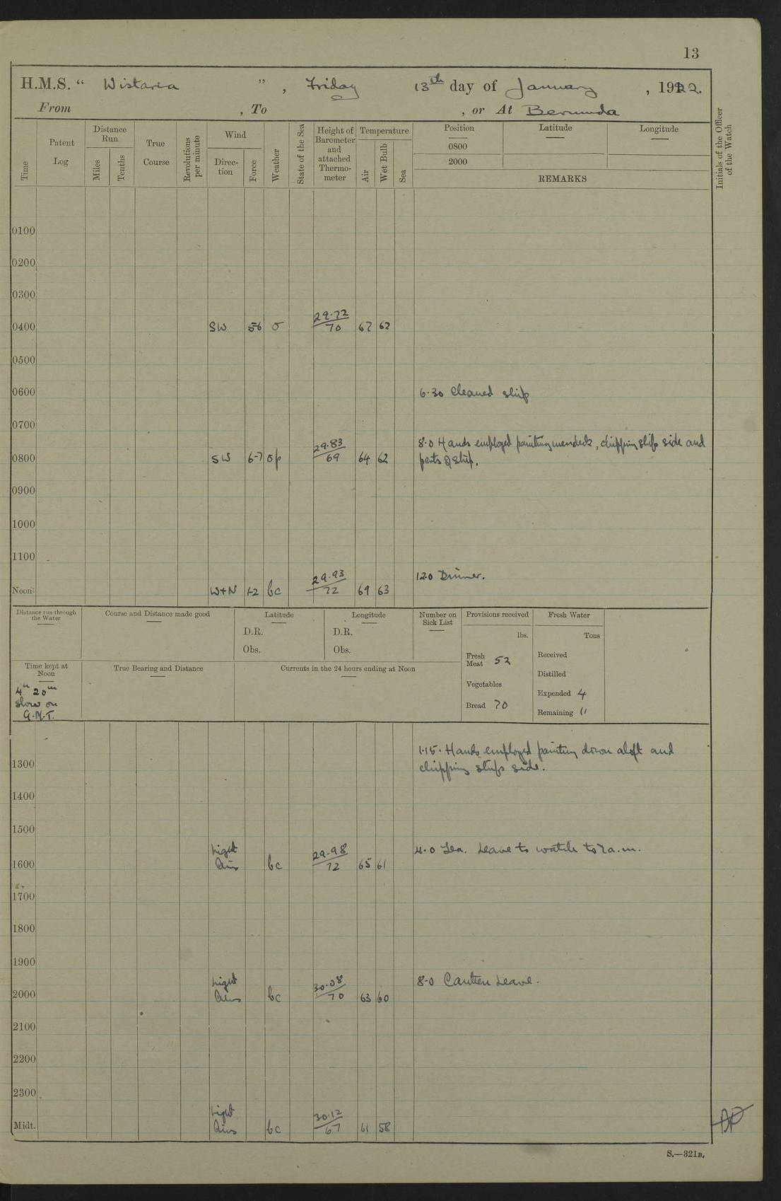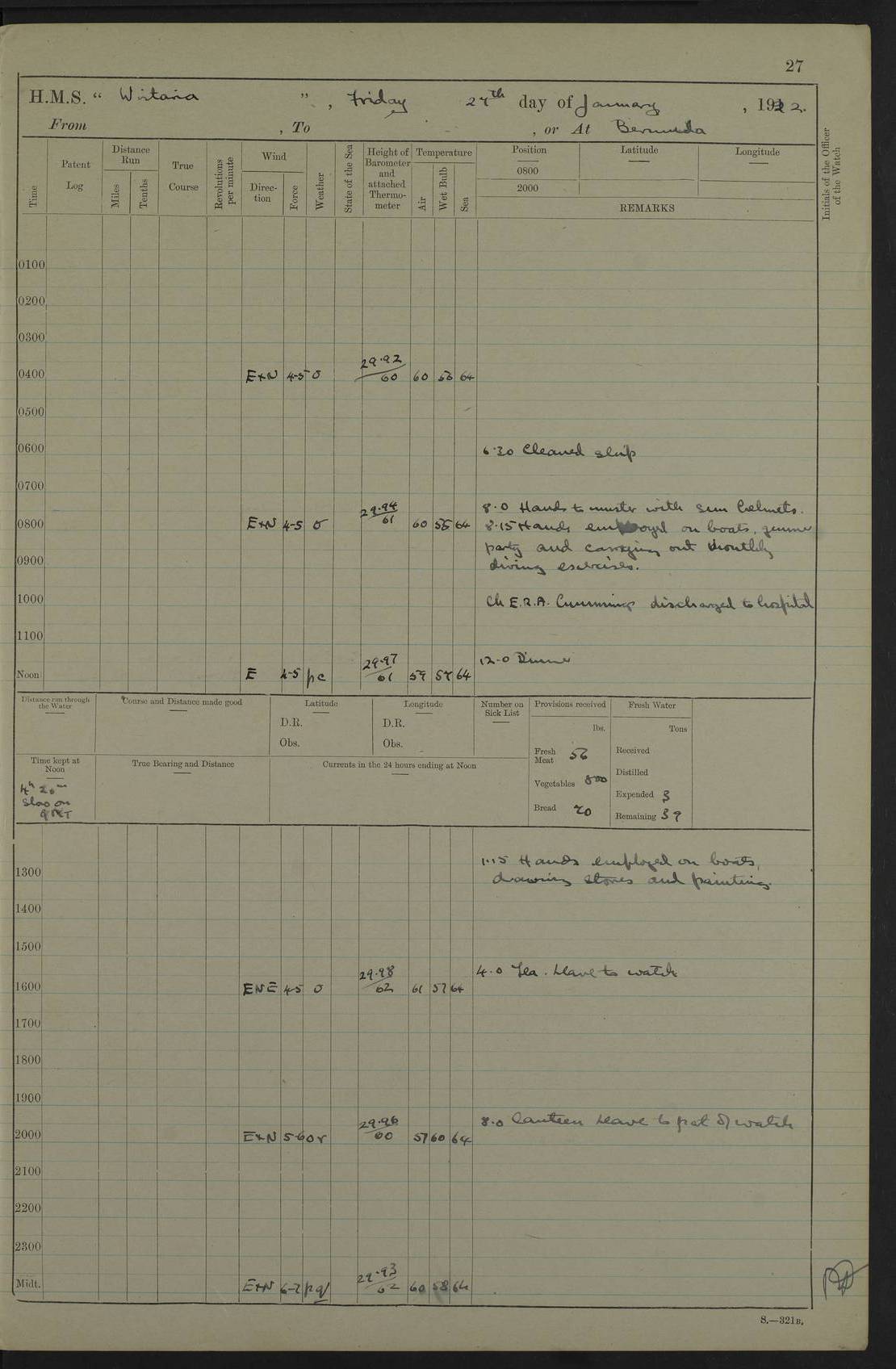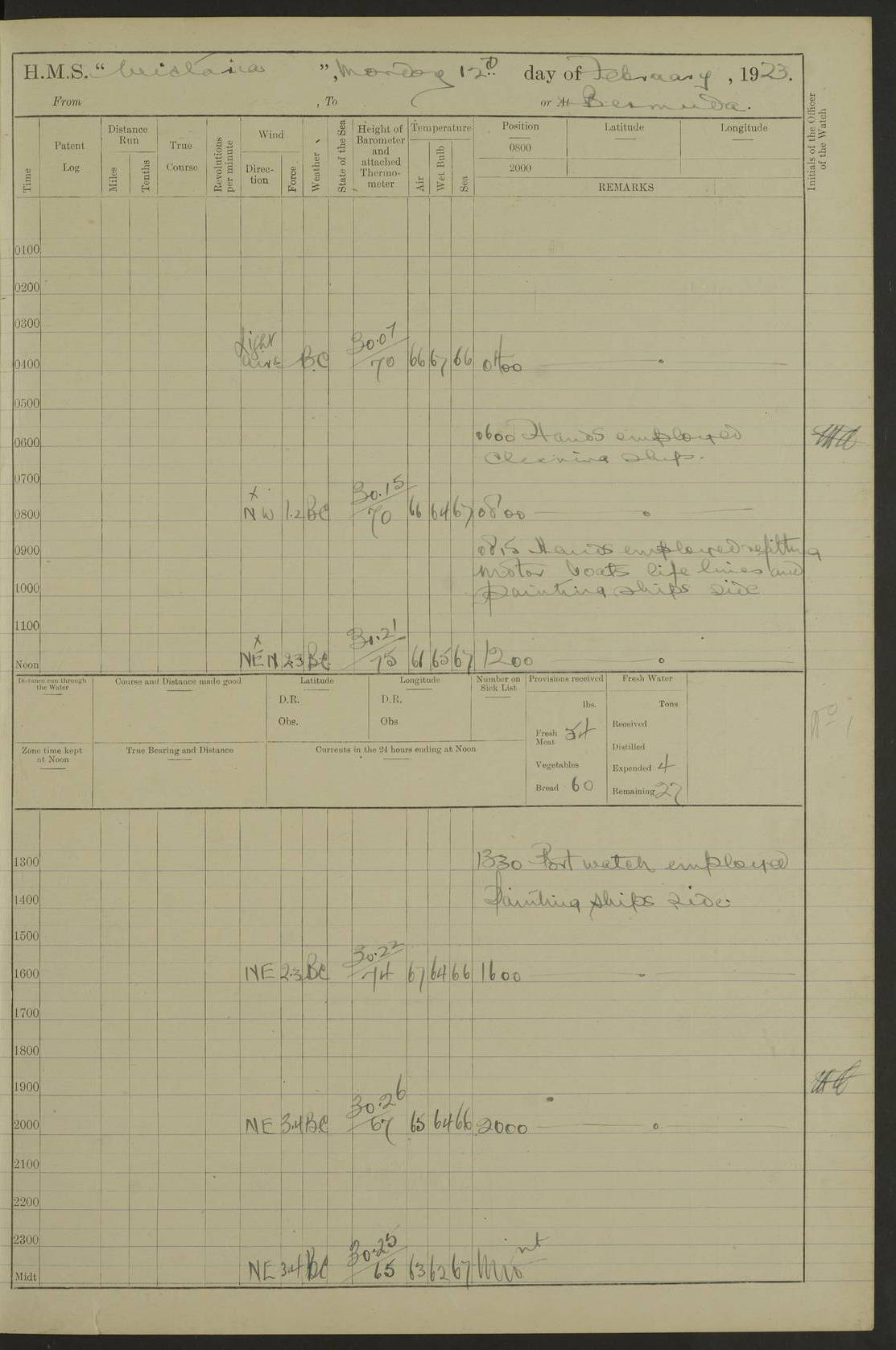 LOGS FOR JANUARY 1922 4f73ca8aa2fc8ea903000b1b: (https://s3.amazonaws.com:443/oldweather/ADM53-93265/0003_1.jpg) 1 January 1922 At Bermuda Lat 32.32, Long -64.8 6.45am: Cleaned ship 10.45am: Church of England Church Party landed 4f73ca8aa2fc8ea903000b1c: (https://s3.amazonaws.com:443/oldweather/ADM53-93265/0004_0.jpg) 2 January 1922 At Bermuda Lat 32.32, Long -64.8 8.45am: Hands employed in seamen’s mess deck & parts of ship 1.15pm: Hands employed as forenoon 4f73ca8aa2fc8ea903000b1d: (https://s3.amazonaws.com:443/oldweather/ADM53-93265/0004_1.jpg) 3 January 1922 At Bermuda Lat 32.32, Long -64.8 8.45am: Hands employed on ship’s side, seamen's mess deck, gunner party & parts of ship 1.15pm: Hands employed as forenoon pm: One Ldg Stoker discharged to RN Hospital 5.0pm: Read Warrant No 6 4f73ca8ba2fc8ea903000b1e: (https://s3.amazonaws.com:443/oldweather/ADM53-93265/0005_0.jpg) 4 January 1922 At Bermuda Lat 32.32, Long -64.8 8.45am: Hands employed painting mess deck & drawing provisions 1.15pm: Hands employed painting seamen's mess deck; on ship’s side; gunner party & parts of ship 4f73ca8ba2fc8ea903000b1f: (https://s3.amazonaws.com:443/oldweather/ADM53-93265/0005_1.jpg) 5 January 1922 At Bermuda Lat 32.32, Long -64.8 8.0am: Hands employed on ship’s side; painting mess decks; refitting boats falls am: 1 Ldg Stoker returned from hospital 4f73ca8ba2fc8ea903000b20: (https://s3.amazonaws.com:443/oldweather/ADM53-93265/0006_0.jpg) 6 January 1922 At Bermuda Lat 32.32, Long -64.8 8.0am: Hands employed painting mess decks, chipping and redleading ship’s side, refitting boats falls 9.0am: Range party landed 1.30pm: Hands employed as forenoon 4f73ca8ca2fc8ea903000b21: (https://s3.amazonaws.com:443/oldweather/ADM53-93265/0006_1.jpg) 7 January 1922 At Bermuda Lat 32.32, Long -64.8 8.0am: Hands employed painting mess decks; side party & parts of ship 8.50am: Ord Sea, boys and stokers training class landed for field training exercises 10.30am: Shifted ship to coaling jetty 11.40am: Secured alongside 4f73ca8ca2fc8ea903000b22: (https://s3.amazonaws.com:443/oldweather/ADM53-93265/0007_0.jpg) 8 January 1922 At Bermuda Lat 32.32, Long -64.8 9.45am: Hands mustered by open list 10.15am: Church of England Church Party landed 4f73ca8da2fc8ea903000b23: (https://s3.amazonaws.com:443/oldweather/ADM53-93265/0007_1.jpg) 9 January 1922 At Bermuda Lat 32.32, Long -64.8 8.0am: Prepared for docking ship 8.25am: Docking party landed. Tug “St Abbs” secured alongside 9.30am: Proceeded into dock 9.55am: Secured in dock 10.30am: Hands employed scrubbing ship’s bottom 1.15pm: Hands employed scrubbing ship’s bottom and painting mess decks pm: 1 Stoker and 1 A.B. discharged to hospital 4f73ca8da2fc8ea903000b24: (https://s3.amazonaws.com:443/oldweather/ADM53-93265/0008_0.jpg) 10 January 1922 At Bermuda Lat 32.32, Long -64.8 8.0am: Hands employed on ship’s side, painting mess decks and about 4” gun for’d 1.15pm: Hands employed as forenoon 4f73ca8da2fc8ea903000b25: (https://s3.amazonaws.com:443/oldweather/ADM53-93265/0008_1.jpg) 11 January 1922 At Bermuda Lat 32.32, Long -64.8 8.0am: Hands employed painting mess decks, chipping side and refitting falls & life belts am: One A.B. discharged to hospital 1.15pm: Hands employed lowering anchors and cables into dock & ranging cable pm: One A.B. joined ship from hospital 4f73ca8ea2fc8ea903000b26: (https://s3.amazonaws.com:443/oldweather/ADM53-93265/0009_0.jpg) 12 January 1922 At Bermuda Lat 32.32, Long -64.8 8.0am: Hands employed chipping ship’s side, painting mess deck & part of ship 5.0pm: Fire Quarters 4f73ca8ea2fc8ea903000b27: (https://s3.amazonaws.com:443/oldweather/ADM53-93265/0009_1.jpg) 13 January 1922 At Bermuda Lat 32.32, Long -64.8 8.0am: Hands employed painting mess deck, chipping ship’s side and parts of ship 1.15pm: Hands employed painting down aloft and chipping ship’s side 4f73ca8ea2fc8ea903000b28: (https://s3.amazonaws.com:443/oldweather/ADM53-93265/0010_0.jpg) 14 January 1922 At Bermuda Lat 32.32, Long -64.8 8.0am: Hands employed on ship’s side, painting down aloft; and on foremost 4” gun 4f73ca8fa2fc8ea903000b29: (https://s3.amazonaws.com:443/oldweather/ADM53-93265/0010_1.jpg) 15 January 1922 At Bermuda Lat 32.32, Long -64.8 10.20am: Church of England church party landed 4f73ca8fa2fc8ea903000b2a: (https://s3.amazonaws.com:443/oldweather/ADM53-93265/0011_0.jpg) 16 January 1922 At Bermuda Lat 32.32, Long -64.8 8.0am: Hands employed painting ship’s bottom 1.15pm: Hands employed painting ship’s bottom 5.0pm: Exercised Fire Quarters 4f73ca8fa2fc8ea903000b2b: (https://s3.amazonaws.com:443/oldweather/ADM53-93265/0011_1.jpg) 17 January 1922 At Bermuda Lat 32.32, Long -64.8 8.0am: Hands employed stowing cable in cable lockers from dock and painting ship’s bottom 1.15pm: Hands employed as forenoon 4f73ca90a2fc8ea903000b2c: (https://s3.amazonaws.com:443/oldweather/ADM53-93265/0012_0.jpg) 18 January 1922 At Bermuda Lat 32.32, Long -64.8 8.0am: Hands prepared to shift ship 9.45am: Left floating dock & secured alongside coaling wharf 10.30am: Hands employed washing down funnels & parts of ship 1.15pm: Hands employed washing funnels, shipping motor boats davits and parts of ship 4f73ca90a2fc8ea903000b2d: (https://s3.amazonaws.com:443/oldweather/ADM53-93265/0012_1.jpg) 19 January 1922 At Bermuda Lat 32.32, Long -64.8 8.0am: Hands employed chipping & painting ship’s side, stripping & cleaning 4” guns and parts of ship 8.15am: RFA “Plumleaf” left basin 9.15am: CH 14 left basin 10.35: Shifted from coaling wharf to 40 ft fender in North Basin 4f73ca91a2fc8ea903000b2e: (https://s3.amazonaws.com:443/oldweather/ADM53-93265/0013_0.jpg) 20 January 1922 At Bermuda Lat 32.32, Long -64.8 8.0am: Hands employed chipping and scraping ship’s side, about aft 4” gun and parts of ship 10.20am: Replace 2nd whaler davits. Lowered 1st whaler davits into deck 1 hand scrubber lost by accident 1.15pm: Hands employed chipping & painting ship’s side. Dismountin