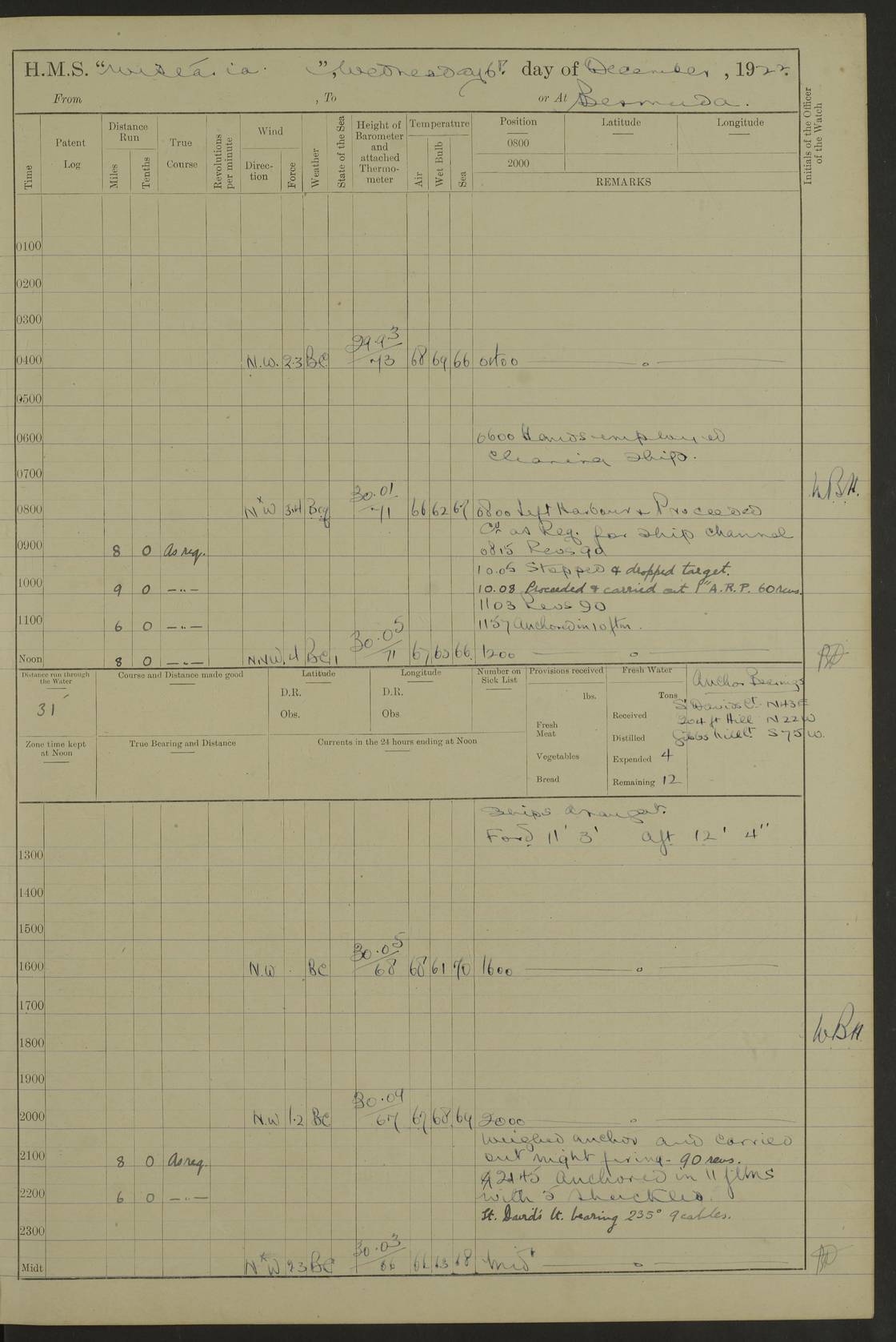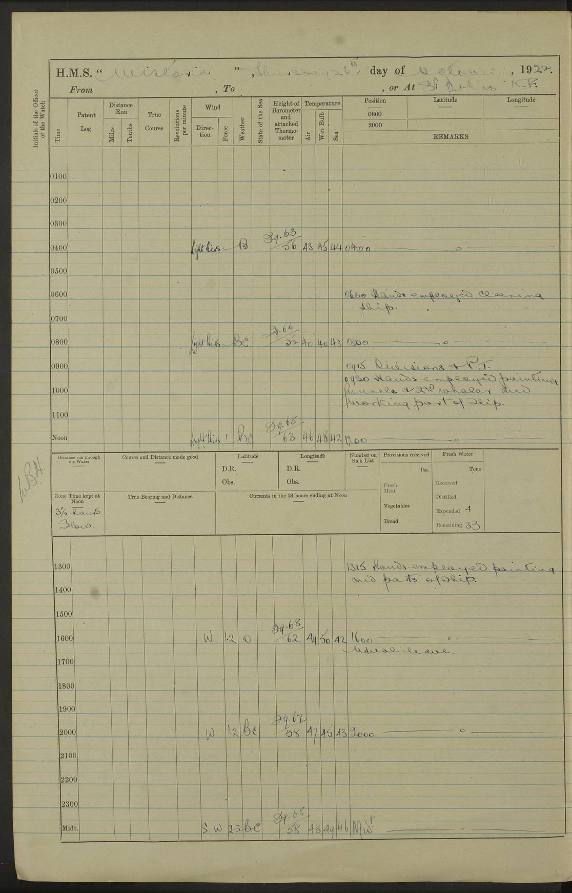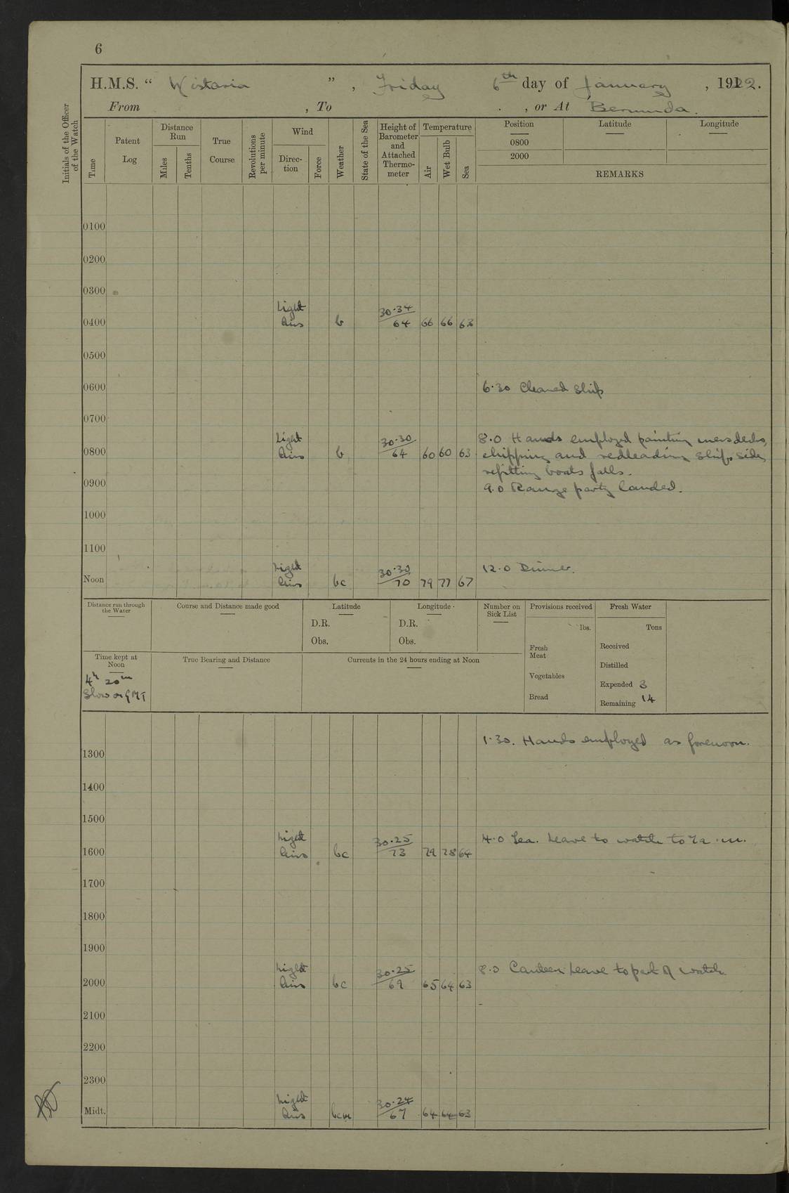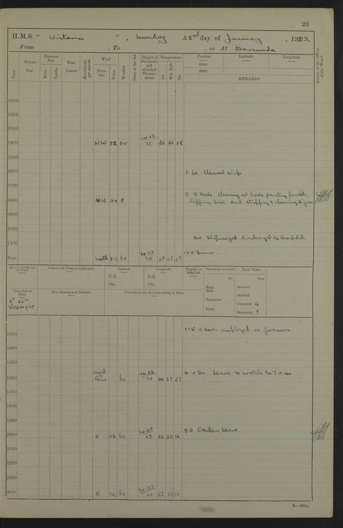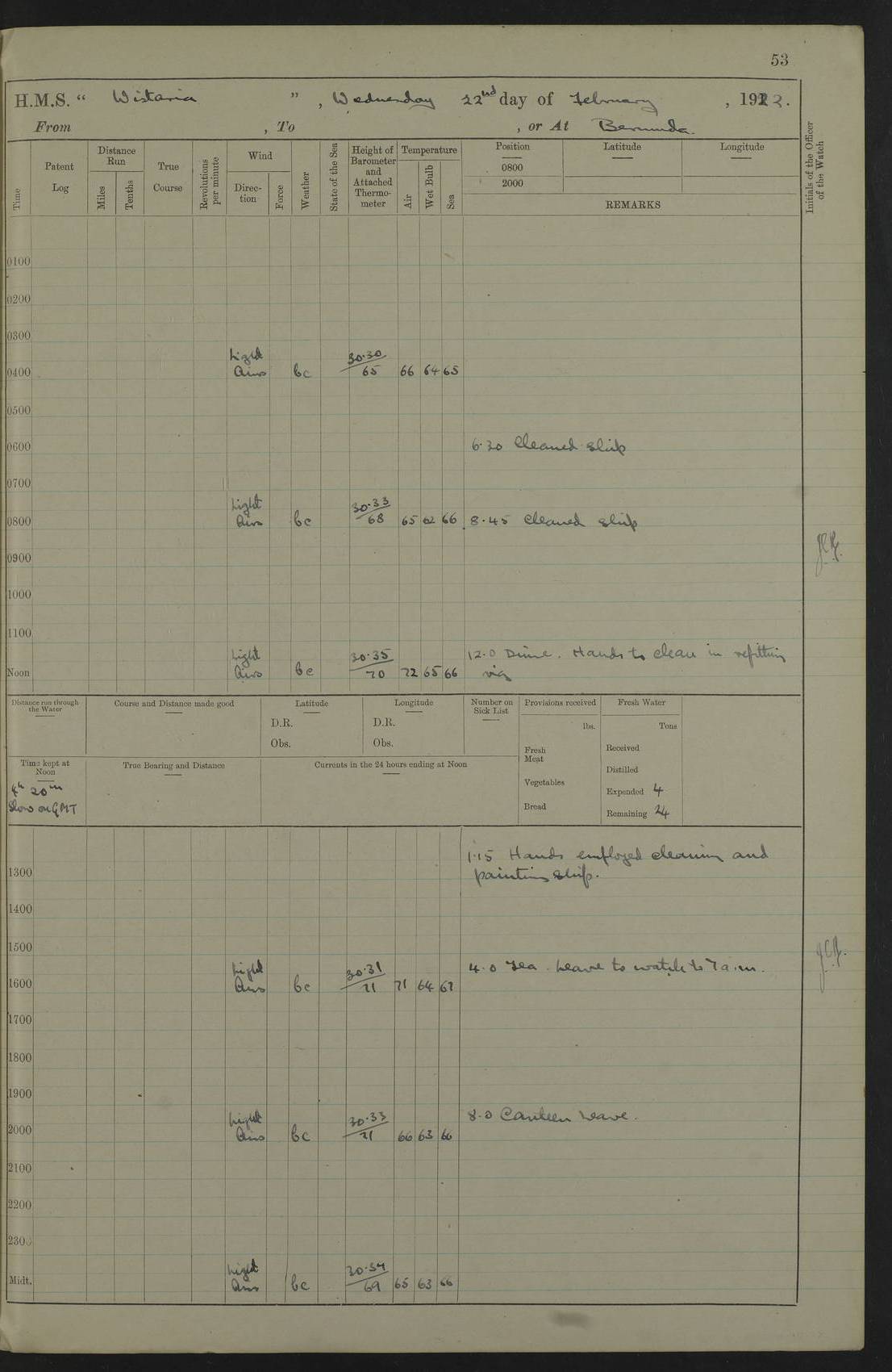 LOGS FOR JANUARY 1922 4f73ca8aa2fc8ea903000b1b: (https://s3.amazonaws.com:443/oldweather/ADM53-93265/0003_1.jpg) 1 January 1922 At Bermuda Lat 32.32, Long -64.8 6.45am: Cleaned ship 10.45am: Church of England Church Party landed 4f73ca8aa2fc8ea903000b1c: (https://s3.amazonaws.com:443/oldweather/ADM53-93265/0004_0.jpg) 2 January 1922 At Bermuda Lat 32.32, Long -64.8 8.45am: Hands employed in seamen’s mess deck & parts of ship 1.15pm: Hands employed as forenoon 4f73ca8aa2fc8ea903000b1d: (https://s3.amazonaws.com:443/oldweather/ADM53-93265/0004_1.jpg) 3 January 1922 At Bermuda Lat 32.32, Long -64.8 8.45am: Hands employed on ship’s side, seamen's mess deck, gunner party & parts of ship 1.15pm: Hands employed as forenoon pm: One Ldg Stoker discharged to RN Hospital 5.0pm: Read Warrant No 6 4f73ca8ba2fc8ea903000b1e: (https://s3.amazonaws.com:443/oldweather/ADM53-93265/0005_0.jpg) 4 January 1922 At Bermuda Lat 32.32, Long -64.8 8.45am: Hands employed painting mess deck & drawing provisions 1.15pm: Hands employed painting seamen's mess deck; on ship’s side; gunner party & parts of ship 4f73ca8ba2fc8ea903000b1f: (https://s3.amazonaws.com:443/oldweather/ADM53-93265/0005_1.jpg) 5 January 1922 At Bermuda Lat 32.32, Long -64.8 8.0am: Hands employed on ship’s side; painting mess decks; refitting boats falls am: 1 Ldg Stoker returned from hospital 4f73ca8ba2fc8ea903000b20: (https://s3.amazonaws.com:443/oldweather/ADM53-93265/0006_0.jpg) 6 January 1922 At Bermuda Lat 32.32, Long -64.8 8.0am: Hands employed painting mess decks, chipping and redleading ship’s side, refitting boats falls 9.0am: Range party landed 1.30pm: Hands employed as forenoon 4f73ca8ca2fc8ea903000b21: (https://s3.amazonaws.com:443/oldweather/ADM53-93265/0006_1.jpg) 7 January 1922 At Bermuda Lat 32.32, Long -64.8 8.0am: Hands employed painting mess decks; side party & parts of ship 8.50am: Ord Sea, boys and stokers training class landed for field training exercises 10.30am: Shifted ship to coaling jetty 11.40am: Secured alongside 4f73ca8ca2fc8ea903000b22: (https://s3.amazonaws.com:443/oldweather/ADM53-93265/0007_0.jpg) 8 January 1922 At Bermuda Lat 32.32, Long -64.8 9.45am: Hands mustered by open list 10.15am: Church of England Church Party landed 4f73ca8da2fc8ea903000b23: (https://s3.amazonaws.com:443/oldweather/ADM53-93265/0007_1.jpg) 9 January 1922 At Bermuda Lat 32.32, Long -64.8 8.0am: Prepared for docking ship 8.25am: Docking party landed. Tug “St Abbs” secured alongside 9.30am: Proceeded into dock 9.55am: Secured in dock 10.30am: Hands employed scrubbing ship’s bottom 1.15pm: Hands employed scrubbing ship’s bottom and painting mess decks pm: 1 Stoker and 1 A.B. discharged to hospital 4f73ca8da2fc8ea903000b24: (https://s3.amazonaws.com:443/oldweather/ADM53-93265/0008_0.jpg) 10 January 1922 At Bermuda Lat 32.32, Long -64.8 8.0am: Hands employed on ship’s side, painting mess decks and about 4” gun for’d 1.15pm: Hands employed as forenoon 4f73ca8da2fc8ea903000b25: (https://s3.amazonaws.com:443/oldweather/ADM53-93265/0008_1.jpg) 11 January 1922 At Bermuda Lat 32.32, Long -64.8 8.0am: Hands employed painting mess decks, chipping side and refitting falls & life belts am: One A.B. discharged to hospital 1.15pm: Hands employed lowering anchors and cables into dock & ranging cable pm: One A.B. joined ship from hospital 4f73ca8ea2fc8ea903000b26: (https://s3.amazonaws.com:443/oldweather/ADM53-93265/0009_0.jpg) 12 January 1922 At Bermuda Lat 32.32, Long -64.8 8.0am: Hands employed chipping ship’s side, painting mess deck & part of ship 5.0pm: Fire Quarters 4f73ca8ea2fc8ea903000b27: (https://s3.amazonaws.com:443/oldweather/ADM53-93265/0009_1.jpg) 13 January 1922 At Bermuda Lat 32.32, Long -64.8 8.0am: Hands employed painting mess deck, chipping ship’s side and parts of ship 1.15pm: Hands employed painting down aloft and chipping ship’s side 4f73ca8ea2fc8ea903000b28: (https://s3.amazonaws.com:443/oldweather/ADM53-93265/0010_0.jpg) 14 January 1922 At Bermuda Lat 32.32, Long -64.8 8.0am: Hands employed on ship’s side, painting down aloft; and on foremost 4” gun 4f73ca8fa2fc8ea903000b29: (https://s3.amazonaws.com:443/oldweather/ADM53-93265/0010_1.jpg) 15 January 1922 At Bermuda Lat 32.32, Long -64.8 10.20am: Church of England church party landed 4f73ca8fa2fc8ea903000b2a: (https://s3.amazonaws.com:443/oldweather/ADM53-93265/0011_0.jpg) 16 January 1922 At Bermuda Lat 32.32, Long -64.8 8.0am: Hands employed painting ship’s bottom 1.15pm: Hands employed painting ship’s bottom 5.0pm: Exercised Fire Quarters 4f73ca8fa2fc8ea903000b2b: (https://s3.amazonaws.com:443/oldweather/ADM53-93265/0011_1.jpg) 17 January 1922 At Bermuda Lat 32.32, Long -64.8 8.0am: Hands employed stowing cable in cable lockers from dock and painting ship’s bottom 1.15pm: Hands employed as forenoon 4f73ca90a2fc8ea903000b2c: (https://s3.amazonaws.com:443/oldweather/ADM53-93265/0012_0.jpg) 18 January 1922 At Bermuda Lat 32.32, Long -64.8 8.0am: Hands prepared to shift ship 9.45am: Left floating dock & secured alongside coaling wharf 10.30am: Hands employed washing down funnels & parts of ship 1.15pm: Hands employed washing funnels, shipping motor boats davits and parts of ship 4f73ca90a2fc8ea903000b2d: (https://s3.amazonaws.com:443/oldweather/ADM53-93265/0012_1.jpg) 19 January 1922 At Bermuda Lat 32.32, Long -64.8 8.0am: Hands employed chipping & painting ship’s side, stripping & cleaning 4” guns and parts of ship 8.15am: RFA “Plumleaf” left basin 9.15am: CH 14 left basin 10.35: Shifted from coaling wharf to 40 ft fender in North Basin 4f73ca91a2fc8ea903000b2e: (https://s3.amazonaws.com:443/oldweather/ADM53-93265/0013_0.jpg) 20 January 1922 At Bermuda Lat 32.32, Long -64.8 8.0am: Hands employed chipping and scraping ship’s side, about aft 4” gun and parts of ship 10.20am: Replace 2nd whaler davits. Lowered 1st whaler davits into deck 1 hand scrubber lost by accident 1.15pm: Hands employed chipping & painting ship’s side. Dismountin