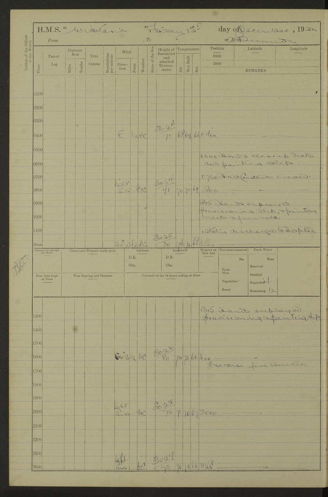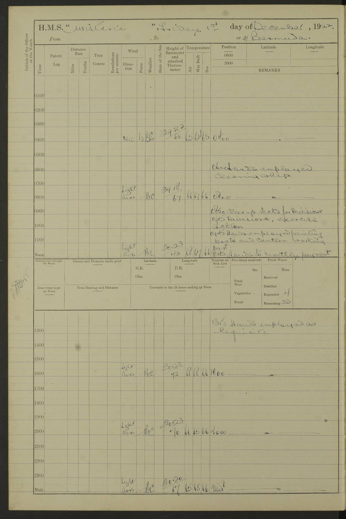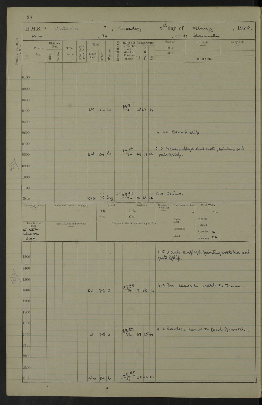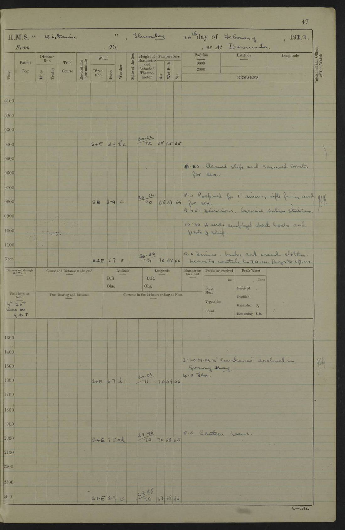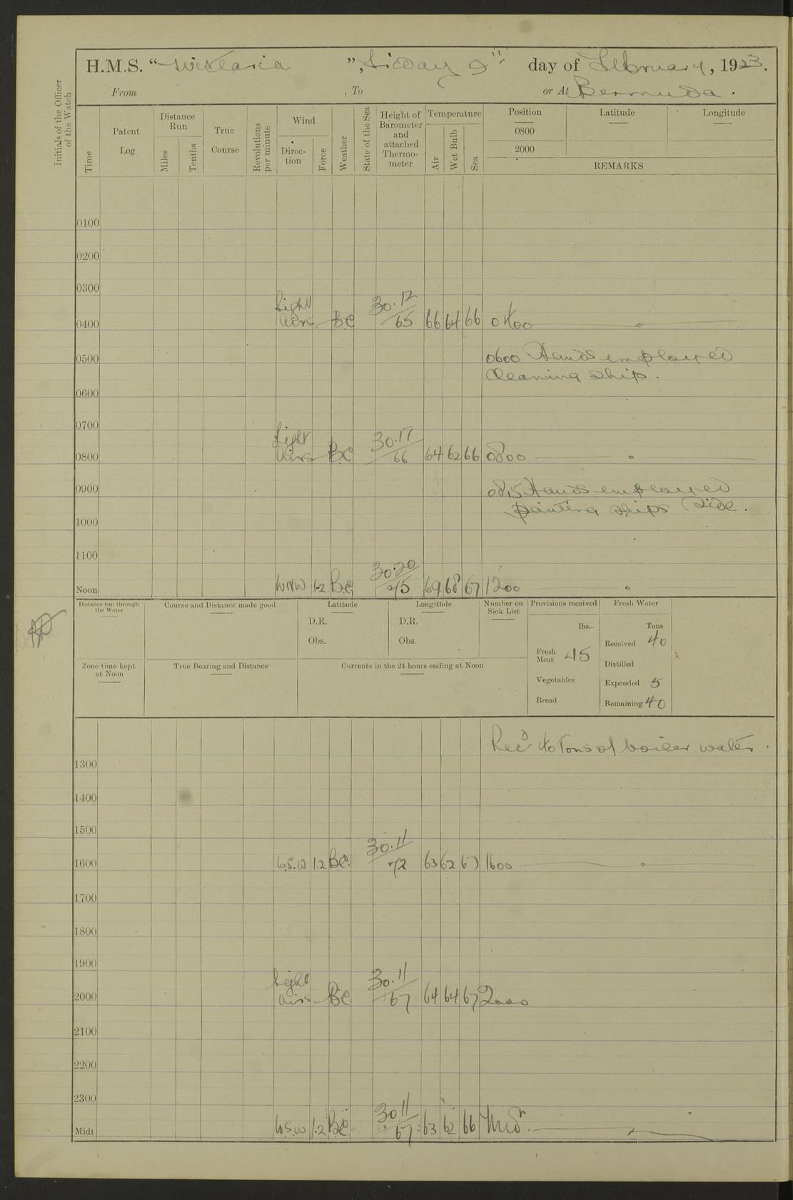 LOGS FOR JANUARY 1922 4f73ca8aa2fc8ea903000b1b: (https://s3.amazonaws.com:443/oldweather/ADM53-93265/0003_1.jpg) 1 January 1922 At Bermuda Lat 32.32, Long -64.8 6.45am: Cleaned ship 10.45am: Church of England Church Party landed 4f73ca8aa2fc8ea903000b1c: (https://s3.amazonaws.com:443/oldweather/ADM53-93265/0004_0.jpg) 2 January 1922 At Bermuda Lat 32.32, Long -64.8 8.45am: Hands employed in seamen’s mess deck & parts of ship 1.15pm: Hands employed as forenoon 4f73ca8aa2fc8ea903000b1d: (https://s3.amazonaws.com:443/oldweather/ADM53-93265/0004_1.jpg) 3 January 1922 At Bermuda Lat 32.32, Long -64.8 8.45am: Hands employed on ship’s side, seamen's mess deck, gunner party & parts of ship 1.15pm: Hands employed as forenoon pm: One Ldg Stoker discharged to RN Hospital 5.0pm: Read Warrant No 6 4f73ca8ba2fc8ea903000b1e: (https://s3.amazonaws.com:443/oldweather/ADM53-93265/0005_0.jpg) 4 January 1922 At Bermuda Lat 32.32, Long -64.8 8.45am: Hands employed painting mess deck & drawing provisions 1.15pm: Hands employed painting seamen's mess deck; on ship’s side; gunner party & parts of ship 4f73ca8ba2fc8ea903000b1f: (https://s3.amazonaws.com:443/oldweather/ADM53-93265/0005_1.jpg) 5 January 1922 At Bermuda Lat 32.32, Long -64.8 8.0am: Hands employed on ship’s side; painting mess decks; refitting boats falls am: 1 Ldg Stoker returned from hospital 4f73ca8ba2fc8ea903000b20: (https://s3.amazonaws.com:443/oldweather/ADM53-93265/0006_0.jpg) 6 January 1922 At Bermuda Lat 32.32, Long -64.8 8.0am: Hands employed painting mess decks, chipping and redleading ship’s side, refitting boats falls 9.0am: Range party landed 1.30pm: Hands employed as forenoon 4f73ca8ca2fc8ea903000b21: (https://s3.amazonaws.com:443/oldweather/ADM53-93265/0006_1.jpg) 7 January 1922 At Bermuda Lat 32.32, Long -64.8 8.0am: Hands employed painting mess decks; side party & parts of ship 8.50am: Ord Sea, boys and stokers training class landed for field training exercises 10.30am: Shifted ship to coaling jetty 11.40am: Secured alongside 4f73ca8ca2fc8ea903000b22: (https://s3.amazonaws.com:443/oldweather/ADM53-93265/0007_0.jpg) 8 January 1922 At Bermuda Lat 32.32, Long -64.8 9.45am: Hands mustered by open list 10.15am: Church of England Church Party landed 4f73ca8da2fc8ea903000b23: (https://s3.amazonaws.com:443/oldweather/ADM53-93265/0007_1.jpg) 9 January 1922 At Bermuda Lat 32.32, Long -64.8 8.0am: Prepared for docking ship 8.25am: Docking party landed. Tug “St Abbs” secured alongside 9.30am: Proceeded into dock 9.55am: Secured in dock 10.30am: Hands employed scrubbing ship’s bottom 1.15pm: Hands employed scrubbing ship’s bottom and painting mess decks pm: 1 Stoker and 1 A.B. discharged to hospital 4f73ca8da2fc8ea903000b24: (https://s3.amazonaws.com:443/oldweather/ADM53-93265/0008_0.jpg) 10 January 1922 At Bermuda Lat 32.32, Long -64.8 8.0am: Hands employed on ship’s side, painting mess decks and about 4” gun for’d 1.15pm: Hands employed as forenoon 4f73ca8da2fc8ea903000b25: (https://s3.amazonaws.com:443/oldweather/ADM53-93265/0008_1.jpg) 11 January 1922 At Bermuda Lat 32.32, Long -64.8 8.0am: Hands employed painting mess decks, chipping side and refitting falls & life belts am: One A.B. discharged to hospital 1.15pm: Hands employed lowering anchors and cables into dock & ranging cable pm: One A.B. joined ship from hospital 4f73ca8ea2fc8ea903000b26: (https://s3.amazonaws.com:443/oldweather/ADM53-93265/0009_0.jpg) 12 January 1922 At Bermuda Lat 32.32, Long -64.8 8.0am: Hands employed chipping ship’s side, painting mess deck & part of ship 5.0pm: Fire Quarters 4f73ca8ea2fc8ea903000b27: (https://s3.amazonaws.com:443/oldweather/ADM53-93265/0009_1.jpg) 13 January 1922 At Bermuda Lat 32.32, Long -64.8 8.0am: Hands employed painting mess deck, chipping ship’s side and parts of ship 1.15pm: Hands employed painting down aloft and chipping ship’s side 4f73ca8ea2fc8ea903000b28: (https://s3.amazonaws.com:443/oldweather/ADM53-93265/0010_0.jpg) 14 January 1922 At Bermuda Lat 32.32, Long -64.8 8.0am: Hands employed on ship’s side, painting down aloft; and on foremost 4” gun 4f73ca8fa2fc8ea903000b29: (https://s3.amazonaws.com:443/oldweather/ADM53-93265/0010_1.jpg) 15 January 1922 At Bermuda Lat 32.32, Long -64.8 10.20am: Church of England church party landed 4f73ca8fa2fc8ea903000b2a: (https://s3.amazonaws.com:443/oldweather/ADM53-93265/0011_0.jpg) 16 January 1922 At Bermuda Lat 32.32, Long -64.8 8.0am: Hands employed painting ship’s bottom 1.15pm: Hands employed painting ship’s bottom 5.0pm: Exercised Fire Quarters 4f73ca8fa2fc8ea903000b2b: (https://s3.amazonaws.com:443/oldweather/ADM53-93265/0011_1.jpg) 17 January 1922 At Bermuda Lat 32.32, Long -64.8 8.0am: Hands employed stowing cable in cable lockers from dock and painting ship’s bottom 1.15pm: Hands employed as forenoon 4f73ca90a2fc8ea903000b2c: (https://s3.amazonaws.com:443/oldweather/ADM53-93265/0012_0.jpg) 18 January 1922 At Bermuda Lat 32.32, Long -64.8 8.0am: Hands prepared to shift ship 9.45am: Left floating dock & secured alongside coaling wharf 10.30am: Hands employed washing down funnels & parts of ship 1.15pm: Hands employed washing funnels, shipping motor boats davits and parts of ship 4f73ca90a2fc8ea903000b2d: (https://s3.amazonaws.com:443/oldweather/ADM53-93265/0012_1.jpg) 19 January 1922 At Bermuda Lat 32.32, Long -64.8 8.0am: Hands employed chipping & painting ship’s side, stripping & cleaning 4” guns and parts of ship 8.15am: RFA “Plumleaf” left basin 9.15am: CH 14 left basin 10.35: Shifted from coaling wharf to 40 ft fender in North Basin 4f73ca91a2fc8ea903000b2e: (https://s3.amazonaws.com:443/oldweather/ADM53-93265/0013_0.jpg) 20 January 1922 At Bermuda Lat 32.32, Long -64.8 8.0am: Hands employed chipping and scraping ship’s side, about aft 4” gun and parts of ship 10.20am: Replace 2nd whaler davits. Lowered 1st whaler davits into deck 1 hand scrubber lost by accident 1.15pm: Hands employed chipping & painting ship’s side. Dismountin