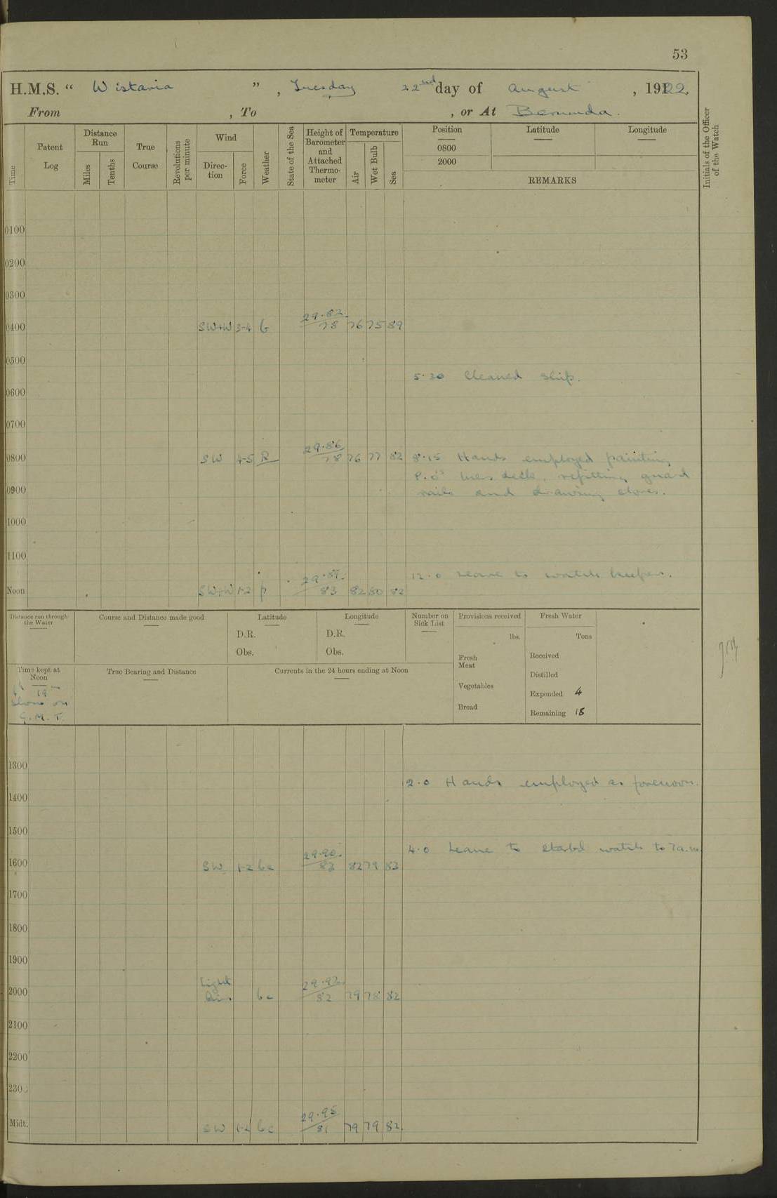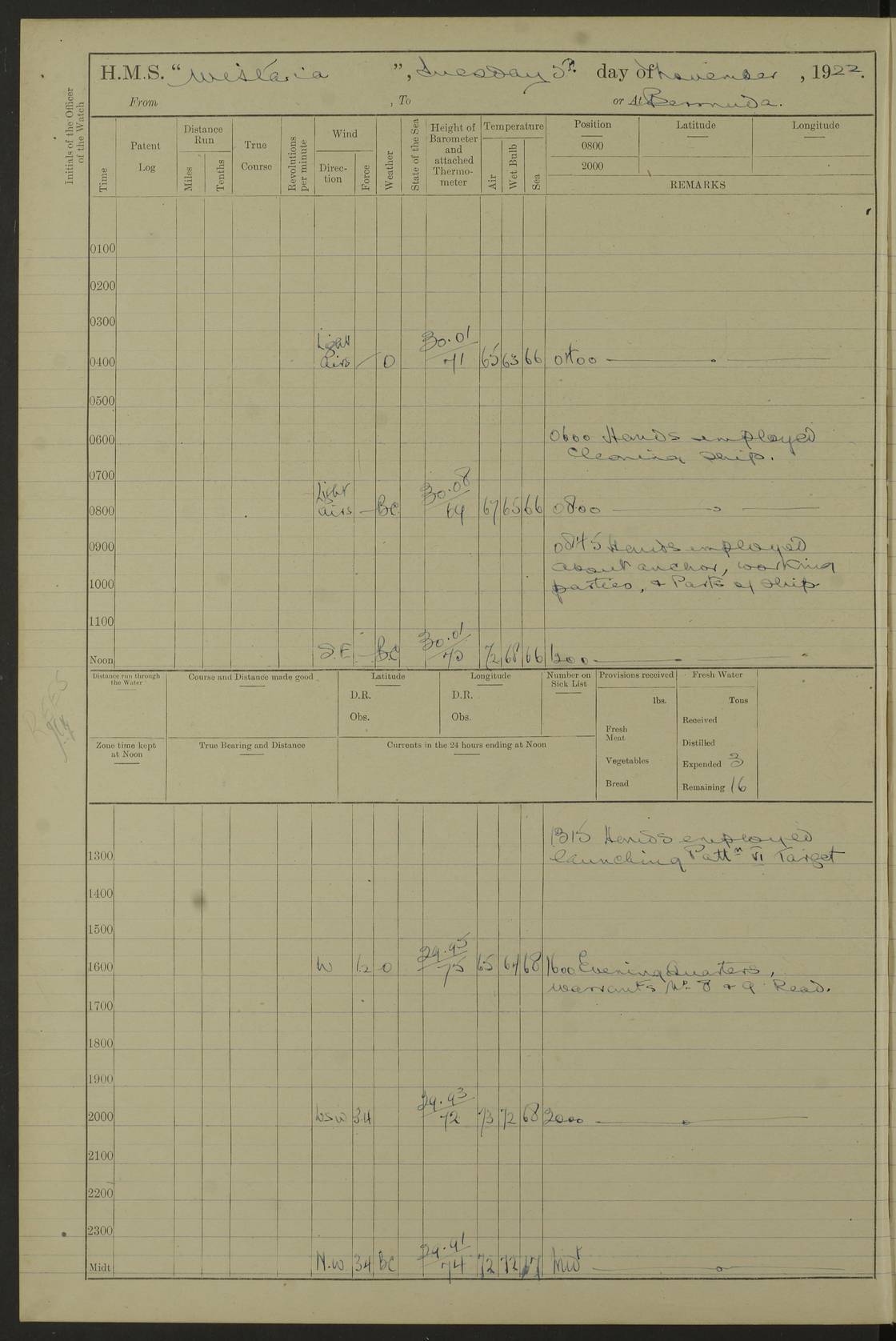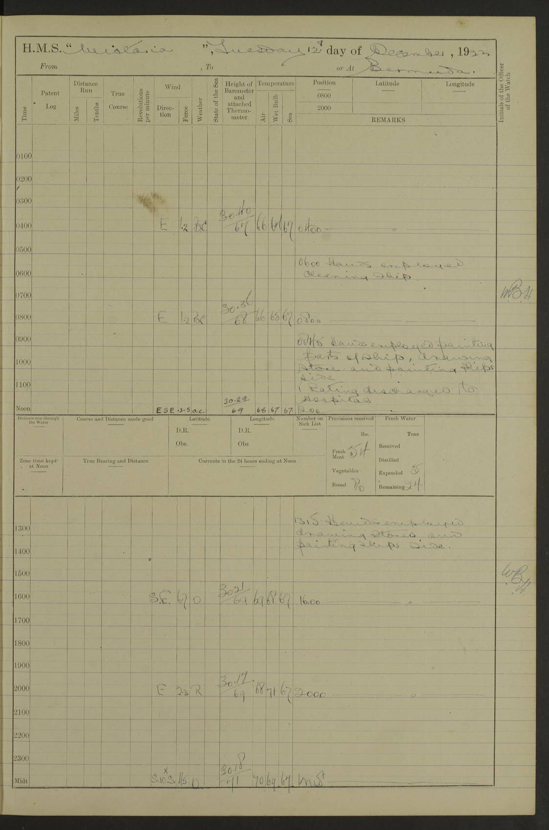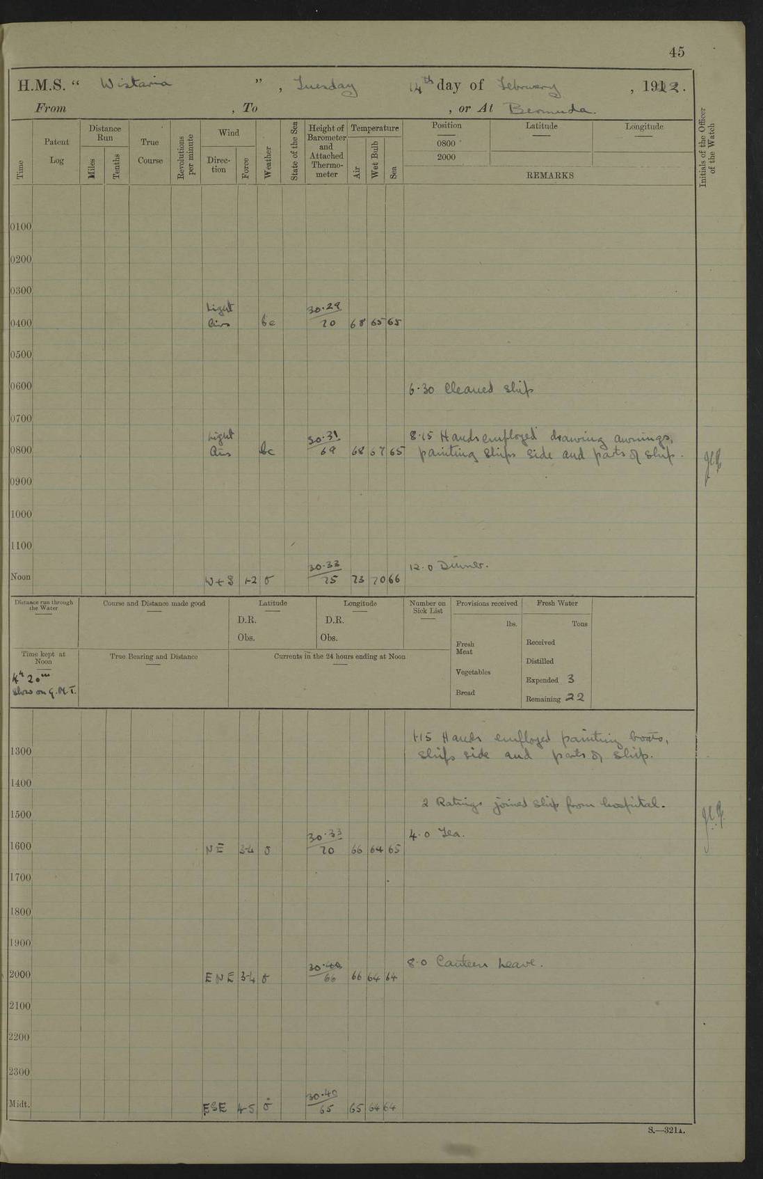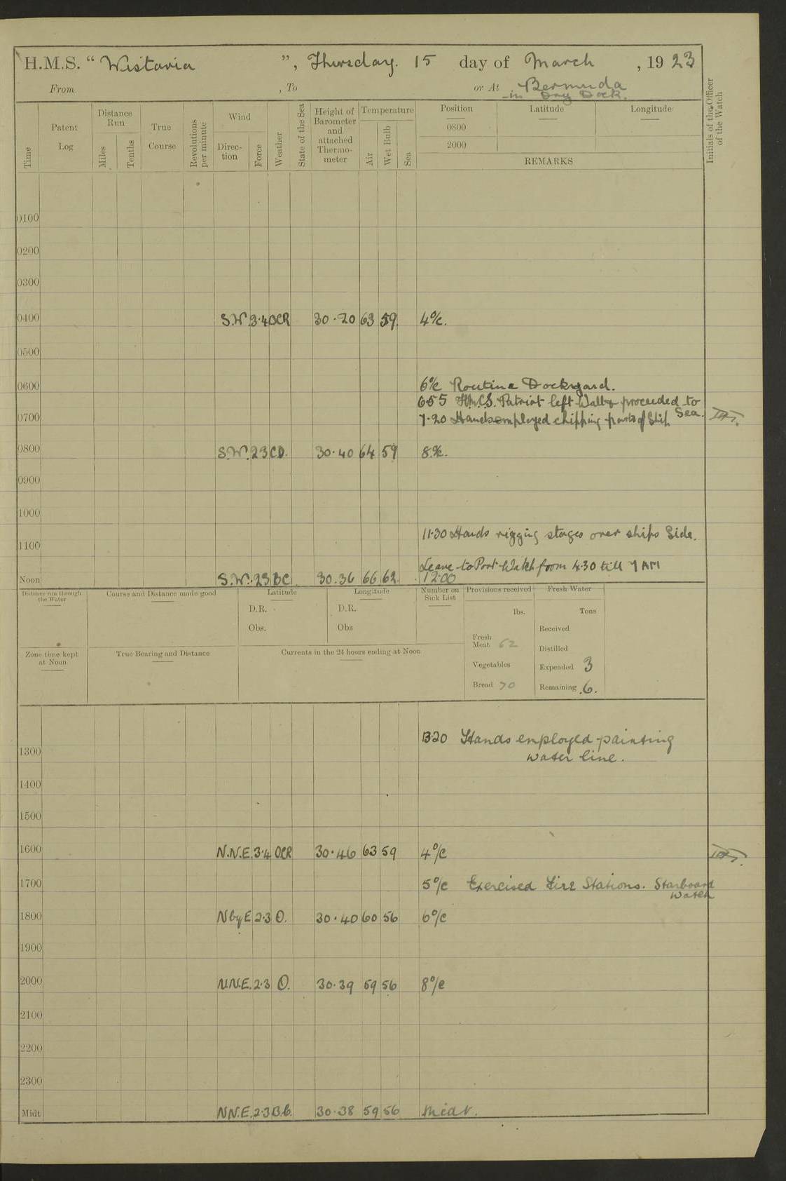 LOGS FOR JANUARY 1922 4f73ca8aa2fc8ea903000b1b: (https://s3.amazonaws.com:443/oldweather/ADM53-93265/0003_1.jpg) 1 January 1922 At Bermuda Lat 32.32, Long -64.8 6.45am: Cleaned ship 10.45am: Church of England Church Party landed 4f73ca8aa2fc8ea903000b1c: (https://s3.amazonaws.com:443/oldweather/ADM53-93265/0004_0.jpg) 2 January 1922 At Bermuda Lat 32.32, Long -64.8 8.45am: Hands employed in seamen’s mess deck & parts of ship 1.15pm: Hands employed as forenoon 4f73ca8aa2fc8ea903000b1d: (https://s3.amazonaws.com:443/oldweather/ADM53-93265/0004_1.jpg) 3 January 1922 At Bermuda Lat 32.32, Long -64.8 8.45am: Hands employed on ship’s side, seamen's mess deck, gunner party & parts of ship 1.15pm: Hands employed as forenoon pm: One Ldg Stoker discharged to RN Hospital 5.0pm: Read Warrant No 6 4f73ca8ba2fc8ea903000b1e: (https://s3.amazonaws.com:443/oldweather/ADM53-93265/0005_0.jpg) 4 January 1922 At Bermuda Lat 32.32, Long -64.8 8.45am: Hands employed painting mess deck & drawing provisions 1.15pm: Hands employed painting seamen's mess deck; on ship’s side; gunner party & parts of ship 4f73ca8ba2fc8ea903000b1f: (https://s3.amazonaws.com:443/oldweather/ADM53-93265/0005_1.jpg) 5 January 1922 At Bermuda Lat 32.32, Long -64.8 8.0am: Hands employed on ship’s side; painting mess decks; refitting boats falls am: 1 Ldg Stoker returned from hospital 4f73ca8ba2fc8ea903000b20: (https://s3.amazonaws.com:443/oldweather/ADM53-93265/0006_0.jpg) 6 January 1922 At Bermuda Lat 32.32, Long -64.8 8.0am: Hands employed painting mess decks, chipping and redleading ship’s side, refitting boats falls 9.0am: Range party landed 1.30pm: Hands employed as forenoon 4f73ca8ca2fc8ea903000b21: (https://s3.amazonaws.com:443/oldweather/ADM53-93265/0006_1.jpg) 7 January 1922 At Bermuda Lat 32.32, Long -64.8 8.0am: Hands employed painting mess decks; side party & parts of ship 8.50am: Ord Sea, boys and stokers training class landed for field training exercises 10.30am: Shifted ship to coaling jetty 11.40am: Secured alongside 4f73ca8ca2fc8ea903000b22: (https://s3.amazonaws.com:443/oldweather/ADM53-93265/0007_0.jpg) 8 January 1922 At Bermuda Lat 32.32, Long -64.8 9.45am: Hands mustered by open list 10.15am: Church of England Church Party landed 4f73ca8da2fc8ea903000b23: (https://s3.amazonaws.com:443/oldweather/ADM53-93265/0007_1.jpg) 9 January 1922 At Bermuda Lat 32.32, Long -64.8 8.0am: Prepared for docking ship 8.25am: Docking party landed. Tug “St Abbs” secured alongside 9.30am: Proceeded into dock 9.55am: Secured in dock 10.30am: Hands employed scrubbing ship’s bottom 1.15pm: Hands employed scrubbing ship’s bottom and painting mess decks pm: 1 Stoker and 1 A.B. discharged to hospital 4f73ca8da2fc8ea903000b24: (https://s3.amazonaws.com:443/oldweather/ADM53-93265/0008_0.jpg) 10 January 1922 At Bermuda Lat 32.32, Long -64.8 8.0am: Hands employed on ship’s side, painting mess decks and about 4” gun for’d 1.15pm: Hands employed as forenoon 4f73ca8da2fc8ea903000b25: (https://s3.amazonaws.com:443/oldweather/ADM53-93265/0008_1.jpg) 11 January 1922 At Bermuda Lat 32.32, Long -64.8 8.0am: Hands employed painting mess decks, chipping side and refitting falls & life belts am: One A.B. discharged to hospital 1.15pm: Hands employed lowering anchors and cables into dock & ranging cable pm: One A.B. joined ship from hospital 4f73ca8ea2fc8ea903000b26: (https://s3.amazonaws.com:443/oldweather/ADM53-93265/0009_0.jpg) 12 January 1922 At Bermuda Lat 32.32, Long -64.8 8.0am: Hands employed chipping ship’s side, painting mess deck & part of ship 5.0pm: Fire Quarters 4f73ca8ea2fc8ea903000b27: (https://s3.amazonaws.com:443/oldweather/ADM53-93265/0009_1.jpg) 13 January 1922 At Bermuda Lat 32.32, Long -64.8 8.0am: Hands employed painting mess deck, chipping ship’s side and parts of ship 1.15pm: Hands employed painting down aloft and chipping ship’s side 4f73ca8ea2fc8ea903000b28: (https://s3.amazonaws.com:443/oldweather/ADM53-93265/0010_0.jpg) 14 January 1922 At Bermuda Lat 32.32, Long -64.8 8.0am: Hands employed on ship’s side, painting down aloft; and on foremost 4” gun 4f73ca8fa2fc8ea903000b29: (https://s3.amazonaws.com:443/oldweather/ADM53-93265/0010_1.jpg) 15 January 1922 At Bermuda Lat 32.32, Long -64.8 10.20am: Church of England church party landed 4f73ca8fa2fc8ea903000b2a: (https://s3.amazonaws.com:443/oldweather/ADM53-93265/0011_0.jpg) 16 January 1922 At Bermuda Lat 32.32, Long -64.8 8.0am: Hands employed painting ship’s bottom 1.15pm: Hands employed painting ship’s bottom 5.0pm: Exercised Fire Quarters 4f73ca8fa2fc8ea903000b2b: (https://s3.amazonaws.com:443/oldweather/ADM53-93265/0011_1.jpg) 17 January 1922 At Bermuda Lat 32.32, Long -64.8 8.0am: Hands employed stowing cable in cable lockers from dock and painting ship’s bottom 1.15pm: Hands employed as forenoon 4f73ca90a2fc8ea903000b2c: (https://s3.amazonaws.com:443/oldweather/ADM53-93265/0012_0.jpg) 18 January 1922 At Bermuda Lat 32.32, Long -64.8 8.0am: Hands prepared to shift ship 9.45am: Left floating dock & secured alongside coaling wharf 10.30am: Hands employed washing down funnels & parts of ship 1.15pm: Hands employed washing funnels, shipping motor boats davits and parts of ship 4f73ca90a2fc8ea903000b2d: (https://s3.amazonaws.com:443/oldweather/ADM53-93265/0012_1.jpg) 19 January 1922 At Bermuda Lat 32.32, Long -64.8 8.0am: Hands employed chipping & painting ship’s side, stripping & cleaning 4” guns and parts of ship 8.15am: RFA “Plumleaf” left basin 9.15am: CH 14 left basin 10.35: Shifted from coaling wharf to 40 ft fender in North Basin 4f73ca91a2fc8ea903000b2e: (https://s3.amazonaws.com:443/oldweather/ADM53-93265/0013_0.jpg) 20 January 1922 At Bermuda Lat 32.32, Long -64.8 8.0am: Hands employed chipping and scraping ship’s side, about aft 4” gun and parts of ship 10.20am: Replace 2nd whaler davits. Lowered 1st whaler davits into deck 1 hand scrubber lost by accident 1.15pm: Hands employed chipping & painting ship’s side. Dismountin