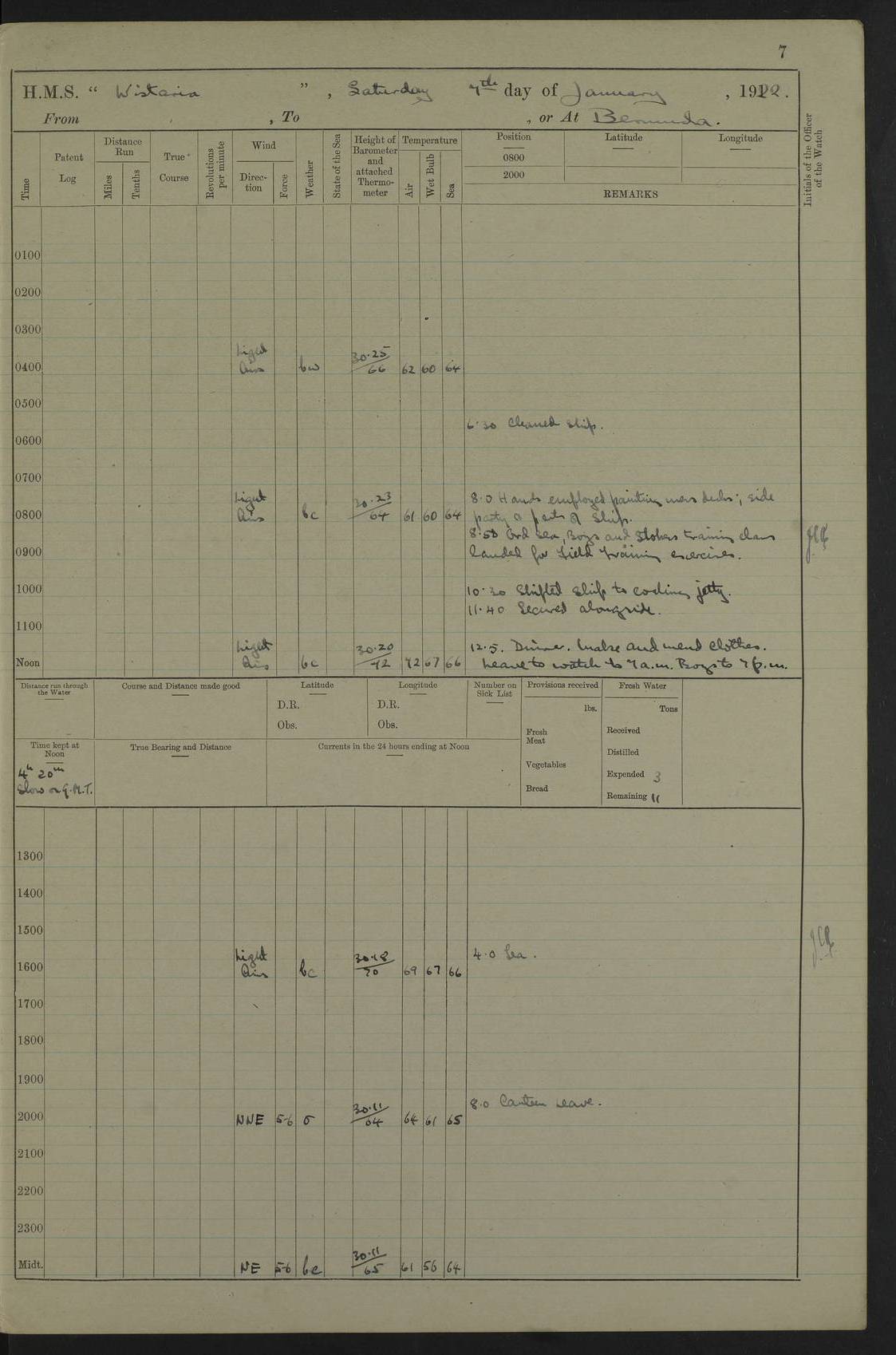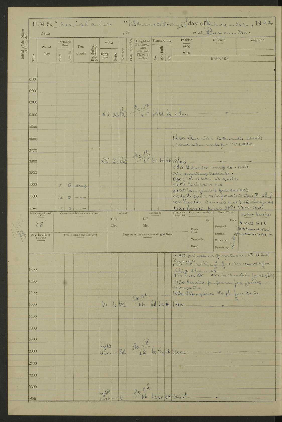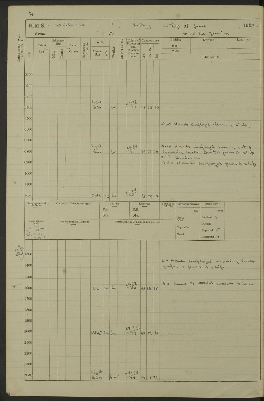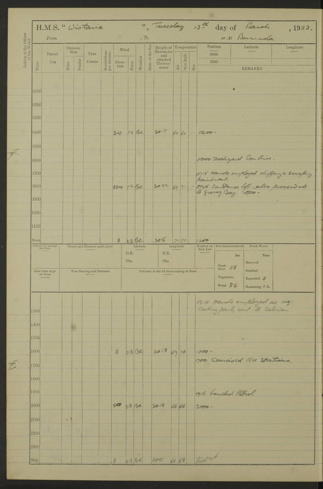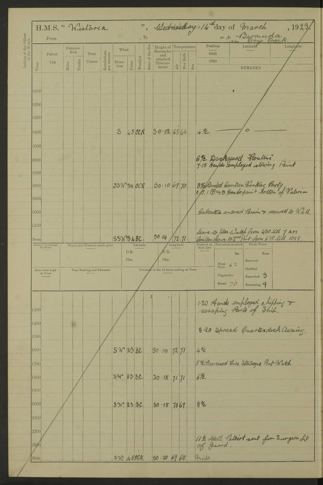 LOGS FOR JANUARY 1922 4f73ca8aa2fc8ea903000b1b: (https://s3.amazonaws.com:443/oldweather/ADM53-93265/0003_1.jpg) 1 January 1922 At Bermuda Lat 32.32, Long -64.8 6.45am: Cleaned ship 10.45am: Church of England Church Party landed 4f73ca8aa2fc8ea903000b1c: (https://s3.amazonaws.com:443/oldweather/ADM53-93265/0004_0.jpg) 2 January 1922 At Bermuda Lat 32.32, Long -64.8 8.45am: Hands employed in seamen’s mess deck & parts of ship 1.15pm: Hands employed as forenoon 4f73ca8aa2fc8ea903000b1d: (https://s3.amazonaws.com:443/oldweather/ADM53-93265/0004_1.jpg) 3 January 1922 At Bermuda Lat 32.32, Long -64.8 8.45am: Hands employed on ship’s side, seamen's mess deck, gunner party & parts of ship 1.15pm: Hands employed as forenoon pm: One Ldg Stoker discharged to RN Hospital 5.0pm: Read Warrant No 6 4f73ca8ba2fc8ea903000b1e: (https://s3.amazonaws.com:443/oldweather/ADM53-93265/0005_0.jpg) 4 January 1922 At Bermuda Lat 32.32, Long -64.8 8.45am: Hands employed painting mess deck & drawing provisions 1.15pm: Hands employed painting seamen's mess deck; on ship’s side; gunner party & parts of ship 4f73ca8ba2fc8ea903000b1f: (https://s3.amazonaws.com:443/oldweather/ADM53-93265/0005_1.jpg) 5 January 1922 At Bermuda Lat 32.32, Long -64.8 8.0am: Hands employed on ship’s side; painting mess decks; refitting boats falls am: 1 Ldg Stoker returned from hospital 4f73ca8ba2fc8ea903000b20: (https://s3.amazonaws.com:443/oldweather/ADM53-93265/0006_0.jpg) 6 January 1922 At Bermuda Lat 32.32, Long -64.8 8.0am: Hands employed painting mess decks, chipping and redleading ship’s side, refitting boats falls 9.0am: Range party landed 1.30pm: Hands employed as forenoon 4f73ca8ca2fc8ea903000b21: (https://s3.amazonaws.com:443/oldweather/ADM53-93265/0006_1.jpg) 7 January 1922 At Bermuda Lat 32.32, Long -64.8 8.0am: Hands employed painting mess decks; side party & parts of ship 8.50am: Ord Sea, boys and stokers training class landed for field training exercises 10.30am: Shifted ship to coaling jetty 11.40am: Secured alongside 4f73ca8ca2fc8ea903000b22: (https://s3.amazonaws.com:443/oldweather/ADM53-93265/0007_0.jpg) 8 January 1922 At Bermuda Lat 32.32, Long -64.8 9.45am: Hands mustered by open list 10.15am: Church of England Church Party landed 4f73ca8da2fc8ea903000b23: (https://s3.amazonaws.com:443/oldweather/ADM53-93265/0007_1.jpg) 9 January 1922 At Bermuda Lat 32.32, Long -64.8 8.0am: Prepared for docking ship 8.25am: Docking party landed. Tug “St Abbs” secured alongside 9.30am: Proceeded into dock 9.55am: Secured in dock 10.30am: Hands employed scrubbing ship’s bottom 1.15pm: Hands employed scrubbing ship’s bottom and painting mess decks pm: 1 Stoker and 1 A.B. discharged to hospital 4f73ca8da2fc8ea903000b24: (https://s3.amazonaws.com:443/oldweather/ADM53-93265/0008_0.jpg) 10 January 1922 At Bermuda Lat 32.32, Long -64.8 8.0am: Hands employed on ship’s side, painting mess decks and about 4” gun for’d 1.15pm: Hands employed as forenoon 4f73ca8da2fc8ea903000b25: (https://s3.amazonaws.com:443/oldweather/ADM53-93265/0008_1.jpg) 11 January 1922 At Bermuda Lat 32.32, Long -64.8 8.0am: Hands employed painting mess decks, chipping side and refitting falls & life belts am: One A.B. discharged to hospital 1.15pm: Hands employed lowering anchors and cables into dock & ranging cable pm: One A.B. joined ship from hospital 4f73ca8ea2fc8ea903000b26: (https://s3.amazonaws.com:443/oldweather/ADM53-93265/0009_0.jpg) 12 January 1922 At Bermuda Lat 32.32, Long -64.8 8.0am: Hands employed chipping ship’s side, painting mess deck & part of ship 5.0pm: Fire Quarters 4f73ca8ea2fc8ea903000b27: (https://s3.amazonaws.com:443/oldweather/ADM53-93265/0009_1.jpg) 13 January 1922 At Bermuda Lat 32.32, Long -64.8 8.0am: Hands employed painting mess deck, chipping ship’s side and parts of ship 1.15pm: Hands employed painting down aloft and chipping ship’s side 4f73ca8ea2fc8ea903000b28: (https://s3.amazonaws.com:443/oldweather/ADM53-93265/0010_0.jpg) 14 January 1922 At Bermuda Lat 32.32, Long -64.8 8.0am: Hands employed on ship’s side, painting down aloft; and on foremost 4” gun 4f73ca8fa2fc8ea903000b29: (https://s3.amazonaws.com:443/oldweather/ADM53-93265/0010_1.jpg) 15 January 1922 At Bermuda Lat 32.32, Long -64.8 10.20am: Church of England church party landed 4f73ca8fa2fc8ea903000b2a: (https://s3.amazonaws.com:443/oldweather/ADM53-93265/0011_0.jpg) 16 January 1922 At Bermuda Lat 32.32, Long -64.8 8.0am: Hands employed painting ship’s bottom 1.15pm: Hands employed painting ship’s bottom 5.0pm: Exercised Fire Quarters 4f73ca8fa2fc8ea903000b2b: (https://s3.amazonaws.com:443/oldweather/ADM53-93265/0011_1.jpg) 17 January 1922 At Bermuda Lat 32.32, Long -64.8 8.0am: Hands employed stowing cable in cable lockers from dock and painting ship’s bottom 1.15pm: Hands employed as forenoon 4f73ca90a2fc8ea903000b2c: (https://s3.amazonaws.com:443/oldweather/ADM53-93265/0012_0.jpg) 18 January 1922 At Bermuda Lat 32.32, Long -64.8 8.0am: Hands prepared to shift ship 9.45am: Left floating dock & secured alongside coaling wharf 10.30am: Hands employed washing down funnels & parts of ship 1.15pm: Hands employed washing funnels, shipping motor boats davits and parts of ship 4f73ca90a2fc8ea903000b2d: (https://s3.amazonaws.com:443/oldweather/ADM53-93265/0012_1.jpg) 19 January 1922 At Bermuda Lat 32.32, Long -64.8 8.0am: Hands employed chipping & painting ship’s side, stripping & cleaning 4” guns and parts of ship 8.15am: RFA “Plumleaf” left basin 9.15am: CH 14 left basin 10.35: Shifted from coaling wharf to 40 ft fender in North Basin 4f73ca91a2fc8ea903000b2e: (https://s3.amazonaws.com:443/oldweather/ADM53-93265/0013_0.jpg) 20 January 1922 At Bermuda Lat 32.32, Long -64.8 8.0am: Hands employed chipping and scraping ship’s side, about aft 4” gun and parts of ship 10.20am: Replace 2nd whaler davits. Lowered 1st whaler davits into deck 1 hand scrubber lost by accident 1.15pm: Hands employed chipping & painting ship’s side. Dismountin