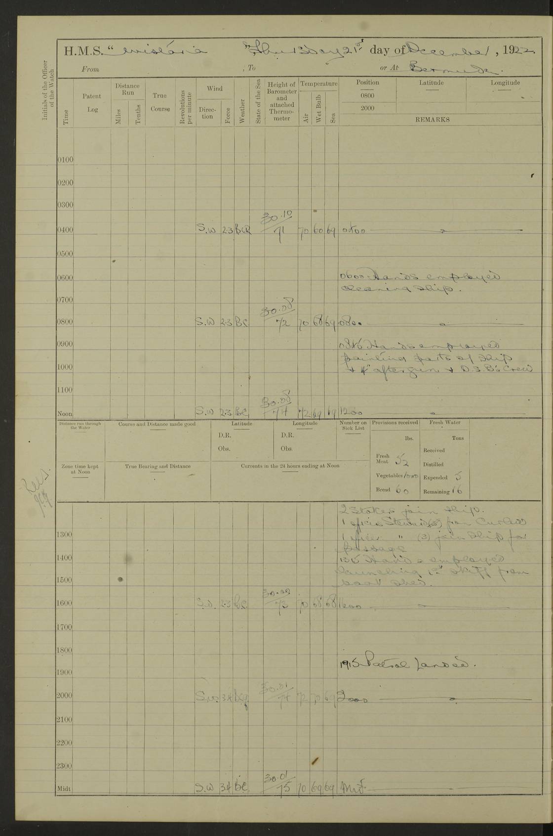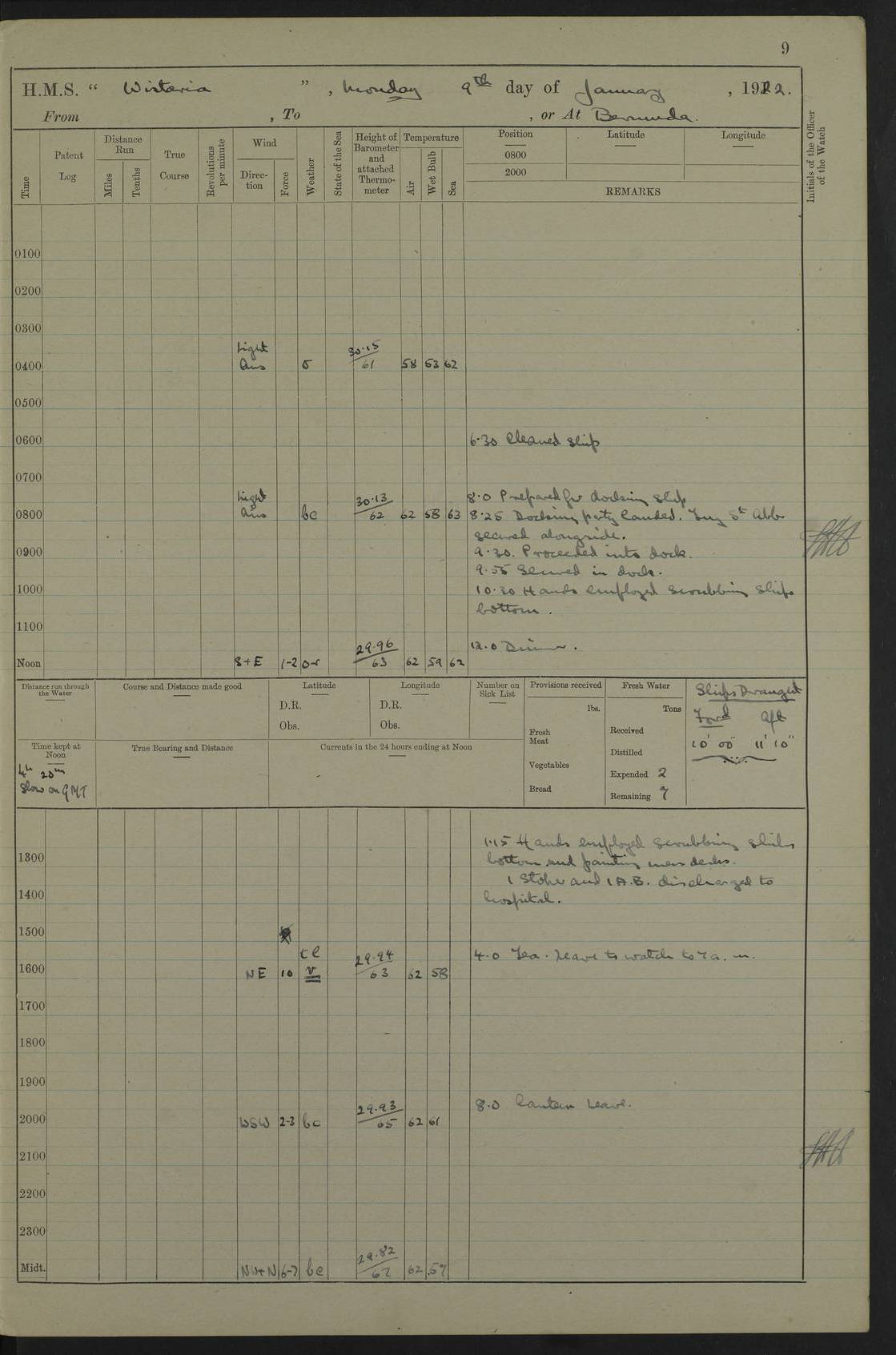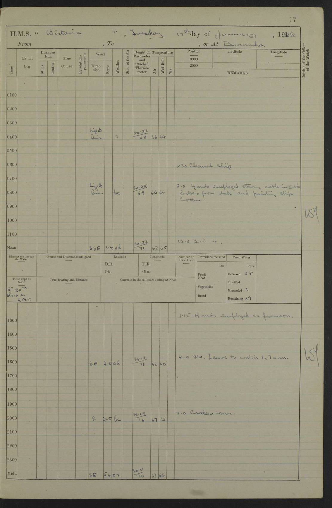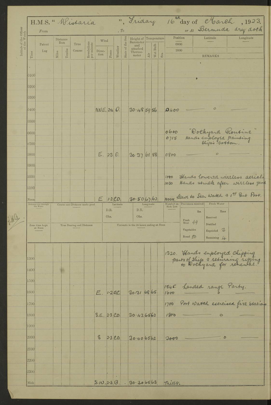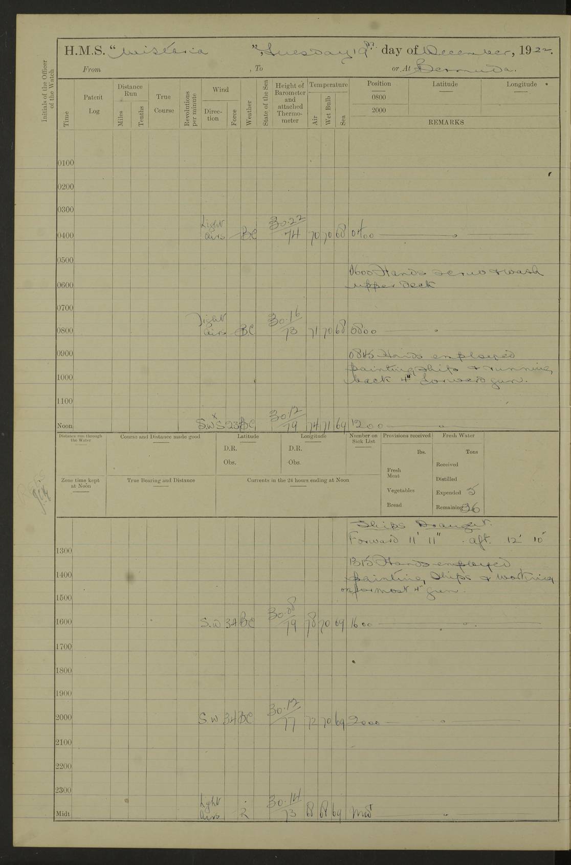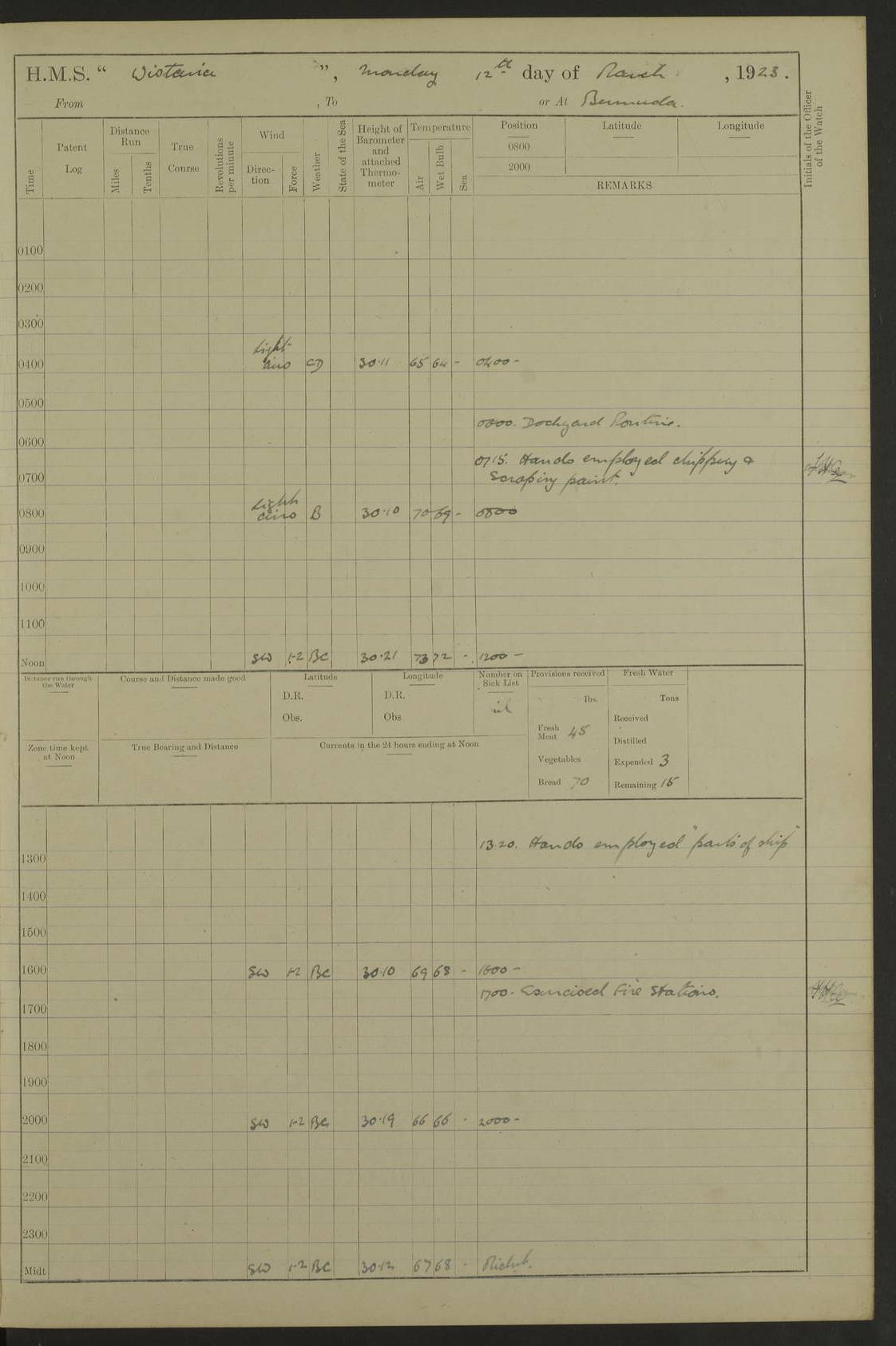 LOGS FOR JANUARY 1922 4f73ca8aa2fc8ea903000b1b: (https://s3.amazonaws.com:443/oldweather/ADM53-93265/0003_1.jpg) 1 January 1922 At Bermuda Lat 32.32, Long -64.8 6.45am: Cleaned ship 10.45am: Church of England Church Party landed 4f73ca8aa2fc8ea903000b1c: (https://s3.amazonaws.com:443/oldweather/ADM53-93265/0004_0.jpg) 2 January 1922 At Bermuda Lat 32.32, Long -64.8 8.45am: Hands employed in seamen’s mess deck & parts of ship 1.15pm: Hands employed as forenoon 4f73ca8aa2fc8ea903000b1d: (https://s3.amazonaws.com:443/oldweather/ADM53-93265/0004_1.jpg) 3 January 1922 At Bermuda Lat 32.32, Long -64.8 8.45am: Hands employed on ship’s side, seamen's mess deck, gunner party & parts of ship 1.15pm: Hands employed as forenoon pm: One Ldg Stoker discharged to RN Hospital 5.0pm: Read Warrant No 6 4f73ca8ba2fc8ea903000b1e: (https://s3.amazonaws.com:443/oldweather/ADM53-93265/0005_0.jpg) 4 January 1922 At Bermuda Lat 32.32, Long -64.8 8.45am: Hands employed painting mess deck & drawing provisions 1.15pm: Hands employed painting seamen's mess deck; on ship’s side; gunner party & parts of ship 4f73ca8ba2fc8ea903000b1f: (https://s3.amazonaws.com:443/oldweather/ADM53-93265/0005_1.jpg) 5 January 1922 At Bermuda Lat 32.32, Long -64.8 8.0am: Hands employed on ship’s side; painting mess decks; refitting boats falls am: 1 Ldg Stoker returned from hospital 4f73ca8ba2fc8ea903000b20: (https://s3.amazonaws.com:443/oldweather/ADM53-93265/0006_0.jpg) 6 January 1922 At Bermuda Lat 32.32, Long -64.8 8.0am: Hands employed painting mess decks, chipping and redleading ship’s side, refitting boats falls 9.0am: Range party landed 1.30pm: Hands employed as forenoon 4f73ca8ca2fc8ea903000b21: (https://s3.amazonaws.com:443/oldweather/ADM53-93265/0006_1.jpg) 7 January 1922 At Bermuda Lat 32.32, Long -64.8 8.0am: Hands employed painting mess decks; side party & parts of ship 8.50am: Ord Sea, boys and stokers training class landed for field training exercises 10.30am: Shifted ship to coaling jetty 11.40am: Secured alongside 4f73ca8ca2fc8ea903000b22: (https://s3.amazonaws.com:443/oldweather/ADM53-93265/0007_0.jpg) 8 January 1922 At Bermuda Lat 32.32, Long -64.8 9.45am: Hands mustered by open list 10.15am: Church of England Church Party landed 4f73ca8da2fc8ea903000b23: (https://s3.amazonaws.com:443/oldweather/ADM53-93265/0007_1.jpg) 9 January 1922 At Bermuda Lat 32.32, Long -64.8 8.0am: Prepared for docking ship 8.25am: Docking party landed. Tug “St Abbs” secured alongside 9.30am: Proceeded into dock 9.55am: Secured in dock 10.30am: Hands employed scrubbing ship’s bottom 1.15pm: Hands employed scrubbing ship’s bottom and painting mess decks pm: 1 Stoker and 1 A.B. discharged to hospital 4f73ca8da2fc8ea903000b24: (https://s3.amazonaws.com:443/oldweather/ADM53-93265/0008_0.jpg) 10 January 1922 At Bermuda Lat 32.32, Long -64.8 8.0am: Hands employed on ship’s side, painting mess decks and about 4” gun for’d 1.15pm: Hands employed as forenoon 4f73ca8da2fc8ea903000b25: (https://s3.amazonaws.com:443/oldweather/ADM53-93265/0008_1.jpg) 11 January 1922 At Bermuda Lat 32.32, Long -64.8 8.0am: Hands employed painting mess decks, chipping side and refitting falls & life belts am: One A.B. discharged to hospital 1.15pm: Hands employed lowering anchors and cables into dock & ranging cable pm: One A.B. joined ship from hospital 4f73ca8ea2fc8ea903000b26: (https://s3.amazonaws.com:443/oldweather/ADM53-93265/0009_0.jpg) 12 January 1922 At Bermuda Lat 32.32, Long -64.8 8.0am: Hands employed chipping ship’s side, painting mess deck & part of ship 5.0pm: Fire Quarters 4f73ca8ea2fc8ea903000b27: (https://s3.amazonaws.com:443/oldweather/ADM53-93265/0009_1.jpg) 13 January 1922 At Bermuda Lat 32.32, Long -64.8 8.0am: Hands employed painting mess deck, chipping ship’s side and parts of ship 1.15pm: Hands employed painting down aloft and chipping ship’s side 4f73ca8ea2fc8ea903000b28: (https://s3.amazonaws.com:443/oldweather/ADM53-93265/0010_0.jpg) 14 January 1922 At Bermuda Lat 32.32, Long -64.8 8.0am: Hands employed on ship’s side, painting down aloft; and on foremost 4” gun 4f73ca8fa2fc8ea903000b29: (https://s3.amazonaws.com:443/oldweather/ADM53-93265/0010_1.jpg) 15 January 1922 At Bermuda Lat 32.32, Long -64.8 10.20am: Church of England church party landed 4f73ca8fa2fc8ea903000b2a: (https://s3.amazonaws.com:443/oldweather/ADM53-93265/0011_0.jpg) 16 January 1922 At Bermuda Lat 32.32, Long -64.8 8.0am: Hands employed painting ship’s bottom 1.15pm: Hands employed painting ship’s bottom 5.0pm: Exercised Fire Quarters 4f73ca8fa2fc8ea903000b2b: (https://s3.amazonaws.com:443/oldweather/ADM53-93265/0011_1.jpg) 17 January 1922 At Bermuda Lat 32.32, Long -64.8 8.0am: Hands employed stowing cable in cable lockers from dock and painting ship’s bottom 1.15pm: Hands employed as forenoon 4f73ca90a2fc8ea903000b2c: (https://s3.amazonaws.com:443/oldweather/ADM53-93265/0012_0.jpg) 18 January 1922 At Bermuda Lat 32.32, Long -64.8 8.0am: Hands prepared to shift ship 9.45am: Left floating dock & secured alongside coaling wharf 10.30am: Hands employed washing down funnels & parts of ship 1.15pm: Hands employed washing funnels, shipping motor boats davits and parts of ship 4f73ca90a2fc8ea903000b2d: (https://s3.amazonaws.com:443/oldweather/ADM53-93265/0012_1.jpg) 19 January 1922 At Bermuda Lat 32.32, Long -64.8 8.0am: Hands employed chipping & painting ship’s side, stripping & cleaning 4” guns and parts of ship 8.15am: RFA “Plumleaf” left basin 9.15am: CH 14 left basin 10.35: Shifted from coaling wharf to 40 ft fender in North Basin 4f73ca91a2fc8ea903000b2e: (https://s3.amazonaws.com:443/oldweather/ADM53-93265/0013_0.jpg) 20 January 1922 At Bermuda Lat 32.32, Long -64.8 8.0am: Hands employed chipping and scraping ship’s side, about aft 4” gun and parts of ship 10.20am: Replace 2nd whaler davits. Lowered 1st whaler davits into deck 1 hand scrubber lost by accident 1.15pm: Hands employed chipping & painting ship’s side. Dismountin