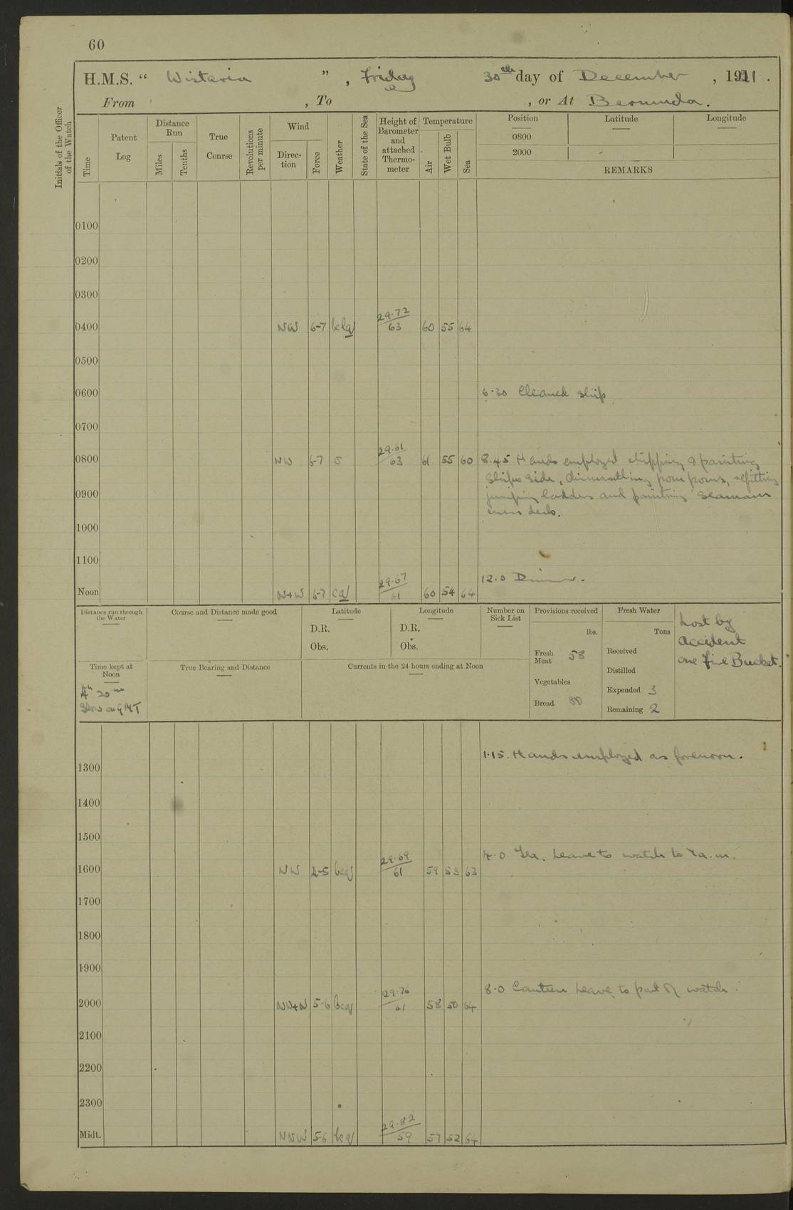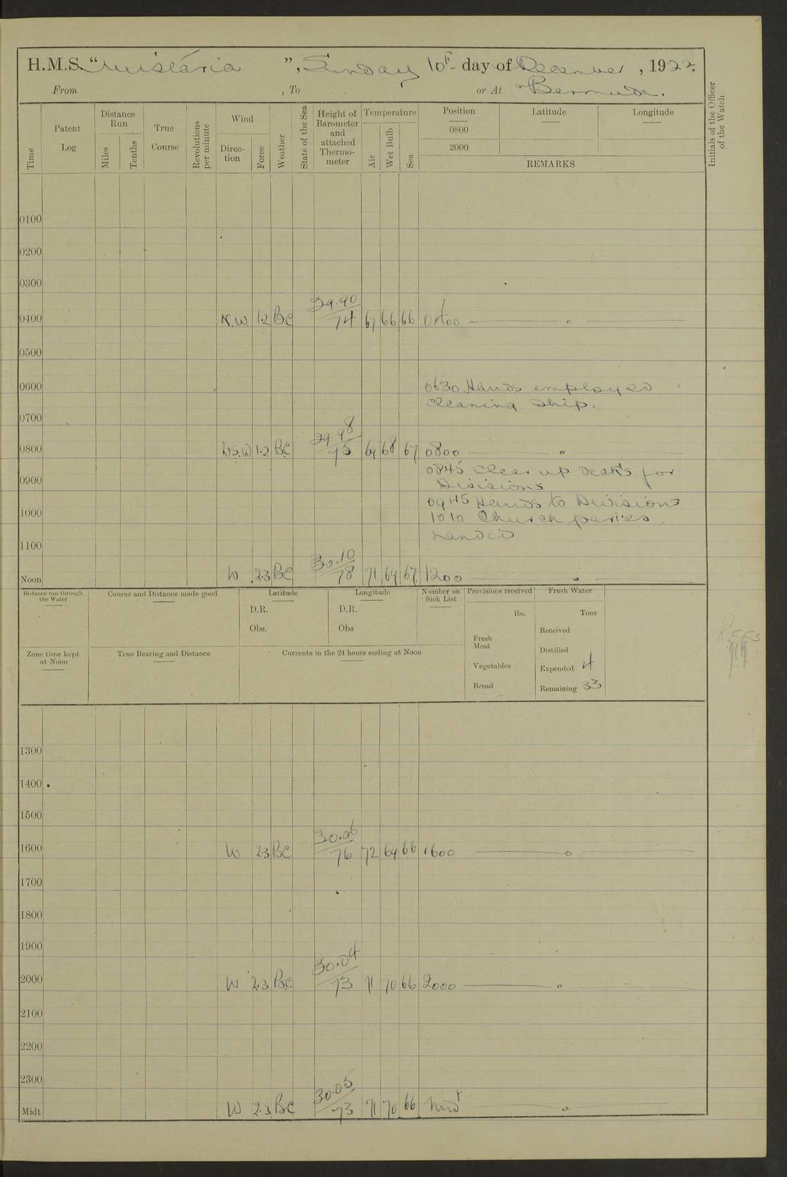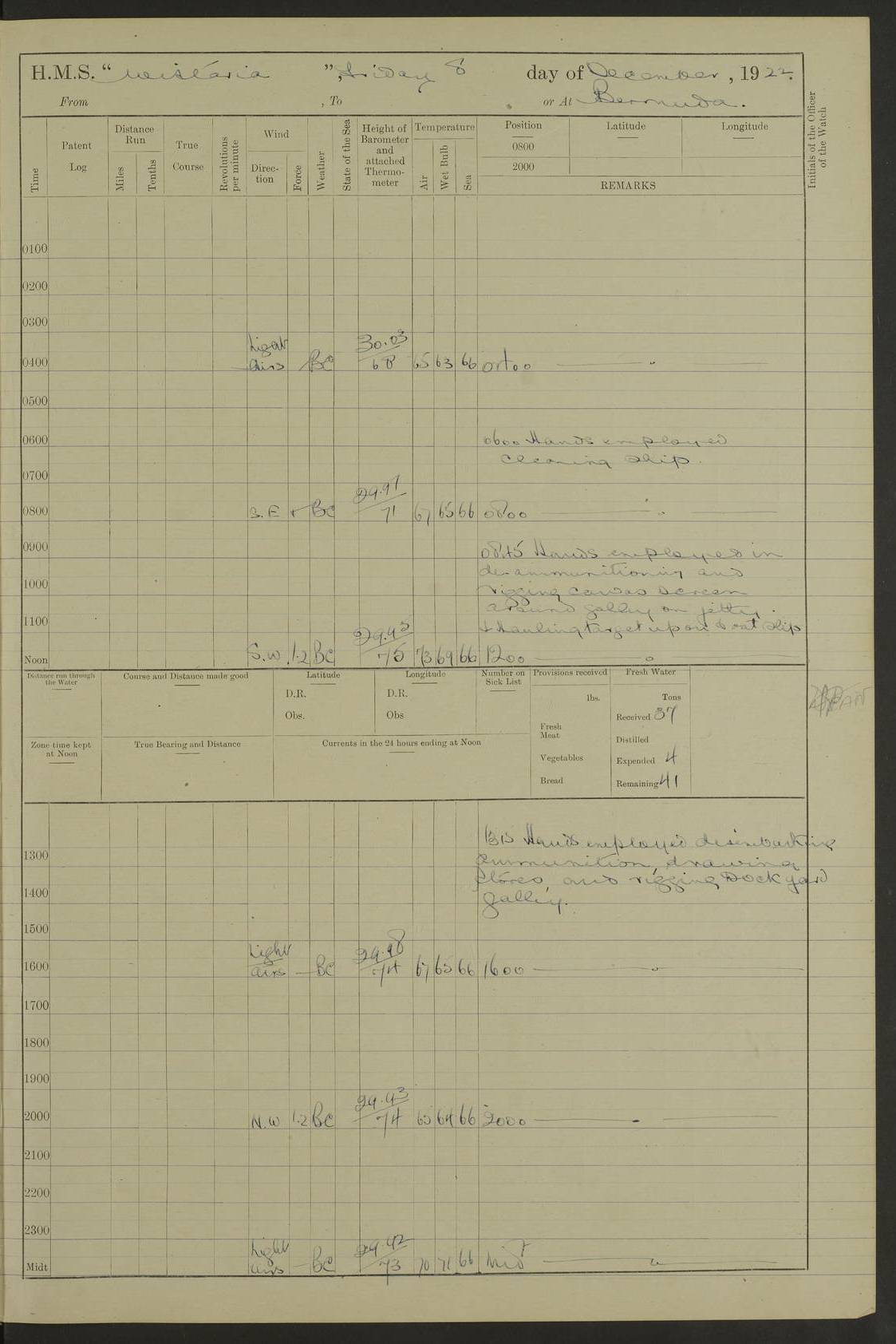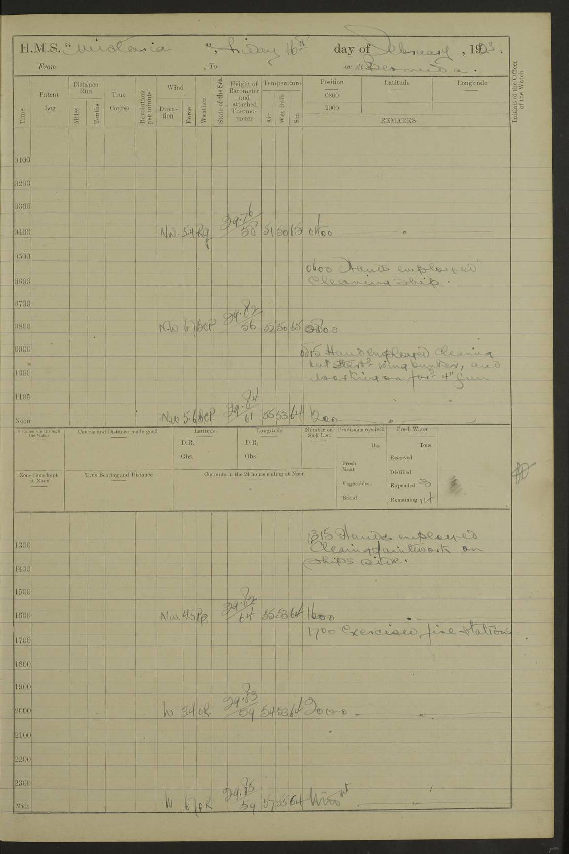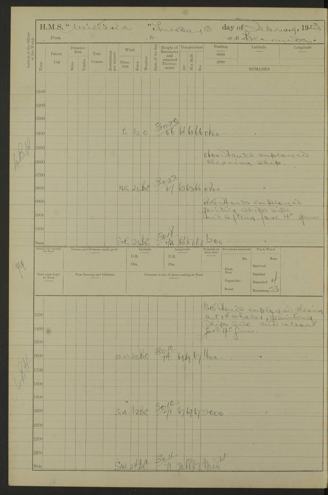 LOGS FOR JANUARY 1922 4f73ca8aa2fc8ea903000b1b: (https://s3.amazonaws.com:443/oldweather/ADM53-93265/0003_1.jpg) 1 January 1922 At Bermuda Lat 32.32, Long -64.8 6.45am: Cleaned ship 10.45am: Church of England Church Party landed 4f73ca8aa2fc8ea903000b1c: (https://s3.amazonaws.com:443/oldweather/ADM53-93265/0004_0.jpg) 2 January 1922 At Bermuda Lat 32.32, Long -64.8 8.45am: Hands employed in seamen’s mess deck & parts of ship 1.15pm: Hands employed as forenoon 4f73ca8aa2fc8ea903000b1d: (https://s3.amazonaws.com:443/oldweather/ADM53-93265/0004_1.jpg) 3 January 1922 At Bermuda Lat 32.32, Long -64.8 8.45am: Hands employed on ship’s side, seamen's mess deck, gunner party & parts of ship 1.15pm: Hands employed as forenoon pm: One Ldg Stoker discharged to RN Hospital 5.0pm: Read Warrant No 6 4f73ca8ba2fc8ea903000b1e: (https://s3.amazonaws.com:443/oldweather/ADM53-93265/0005_0.jpg) 4 January 1922 At Bermuda Lat 32.32, Long -64.8 8.45am: Hands employed painting mess deck & drawing provisions 1.15pm: Hands employed painting seamen's mess deck; on ship’s side; gunner party & parts of ship 4f73ca8ba2fc8ea903000b1f: (https://s3.amazonaws.com:443/oldweather/ADM53-93265/0005_1.jpg) 5 January 1922 At Bermuda Lat 32.32, Long -64.8 8.0am: Hands employed on ship’s side; painting mess decks; refitting boats falls am: 1 Ldg Stoker returned from hospital 4f73ca8ba2fc8ea903000b20: (https://s3.amazonaws.com:443/oldweather/ADM53-93265/0006_0.jpg) 6 January 1922 At Bermuda Lat 32.32, Long -64.8 8.0am: Hands employed painting mess decks, chipping and redleading ship’s side, refitting boats falls 9.0am: Range party landed 1.30pm: Hands employed as forenoon 4f73ca8ca2fc8ea903000b21: (https://s3.amazonaws.com:443/oldweather/ADM53-93265/0006_1.jpg) 7 January 1922 At Bermuda Lat 32.32, Long -64.8 8.0am: Hands employed painting mess decks; side party & parts of ship 8.50am: Ord Sea, boys and stokers training class landed for field training exercises 10.30am: Shifted ship to coaling jetty 11.40am: Secured alongside 4f73ca8ca2fc8ea903000b22: (https://s3.amazonaws.com:443/oldweather/ADM53-93265/0007_0.jpg) 8 January 1922 At Bermuda Lat 32.32, Long -64.8 9.45am: Hands mustered by open list 10.15am: Church of England Church Party landed 4f73ca8da2fc8ea903000b23: (https://s3.amazonaws.com:443/oldweather/ADM53-93265/0007_1.jpg) 9 January 1922 At Bermuda Lat 32.32, Long -64.8 8.0am: Prepared for docking ship 8.25am: Docking party landed. Tug “St Abbs” secured alongside 9.30am: Proceeded into dock 9.55am: Secured in dock 10.30am: Hands employed scrubbing ship’s bottom 1.15pm: Hands employed scrubbing ship’s bottom and painting mess decks pm: 1 Stoker and 1 A.B. discharged to hospital 4f73ca8da2fc8ea903000b24: (https://s3.amazonaws.com:443/oldweather/ADM53-93265/0008_0.jpg) 10 January 1922 At Bermuda Lat 32.32, Long -64.8 8.0am: Hands employed on ship’s side, painting mess decks and about 4” gun for’d 1.15pm: Hands employed as forenoon 4f73ca8da2fc8ea903000b25: (https://s3.amazonaws.com:443/oldweather/ADM53-93265/0008_1.jpg) 11 January 1922 At Bermuda Lat 32.32, Long -64.8 8.0am: Hands employed painting mess decks, chipping side and refitting falls & life belts am: One A.B. discharged to hospital 1.15pm: Hands employed lowering anchors and cables into dock & ranging cable pm: One A.B. joined ship from hospital 4f73ca8ea2fc8ea903000b26: (https://s3.amazonaws.com:443/oldweather/ADM53-93265/0009_0.jpg) 12 January 1922 At Bermuda Lat 32.32, Long -64.8 8.0am: Hands employed chipping ship’s side, painting mess deck & part of ship 5.0pm: Fire Quarters 4f73ca8ea2fc8ea903000b27: (https://s3.amazonaws.com:443/oldweather/ADM53-93265/0009_1.jpg) 13 January 1922 At Bermuda Lat 32.32, Long -64.8 8.0am: Hands employed painting mess deck, chipping ship’s side and parts of ship 1.15pm: Hands employed painting down aloft and chipping ship’s side 4f73ca8ea2fc8ea903000b28: (https://s3.amazonaws.com:443/oldweather/ADM53-93265/0010_0.jpg) 14 January 1922 At Bermuda Lat 32.32, Long -64.8 8.0am: Hands employed on ship’s side, painting down aloft; and on foremost 4” gun 4f73ca8fa2fc8ea903000b29: (https://s3.amazonaws.com:443/oldweather/ADM53-93265/0010_1.jpg) 15 January 1922 At Bermuda Lat 32.32, Long -64.8 10.20am: Church of England church party landed 4f73ca8fa2fc8ea903000b2a: (https://s3.amazonaws.com:443/oldweather/ADM53-93265/0011_0.jpg) 16 January 1922 At Bermuda Lat 32.32, Long -64.8 8.0am: Hands employed painting ship’s bottom 1.15pm: Hands employed painting ship’s bottom 5.0pm: Exercised Fire Quarters 4f73ca8fa2fc8ea903000b2b: (https://s3.amazonaws.com:443/oldweather/ADM53-93265/0011_1.jpg) 17 January 1922 At Bermuda Lat 32.32, Long -64.8 8.0am: Hands employed stowing cable in cable lockers from dock and painting ship’s bottom 1.15pm: Hands employed as forenoon 4f73ca90a2fc8ea903000b2c: (https://s3.amazonaws.com:443/oldweather/ADM53-93265/0012_0.jpg) 18 January 1922 At Bermuda Lat 32.32, Long -64.8 8.0am: Hands prepared to shift ship 9.45am: Left floating dock & secured alongside coaling wharf 10.30am: Hands employed washing down funnels & parts of ship 1.15pm: Hands employed washing funnels, shipping motor boats davits and parts of ship 4f73ca90a2fc8ea903000b2d: (https://s3.amazonaws.com:443/oldweather/ADM53-93265/0012_1.jpg) 19 January 1922 At Bermuda Lat 32.32, Long -64.8 8.0am: Hands employed chipping & painting ship’s side, stripping & cleaning 4” guns and parts of ship 8.15am: RFA “Plumleaf” left basin 9.15am: CH 14 left basin 10.35: Shifted from coaling wharf to 40 ft fender in North Basin 4f73ca91a2fc8ea903000b2e: (https://s3.amazonaws.com:443/oldweather/ADM53-93265/0013_0.jpg) 20 January 1922 At Bermuda Lat 32.32, Long -64.8 8.0am: Hands employed chipping and scraping ship’s side, about aft 4” gun and parts of ship 10.20am: Replace 2nd whaler davits. Lowered 1st whaler davits into deck 1 hand scrubber lost by accident 1.15pm: Hands employed chipping & painting ship’s side. Dismountin