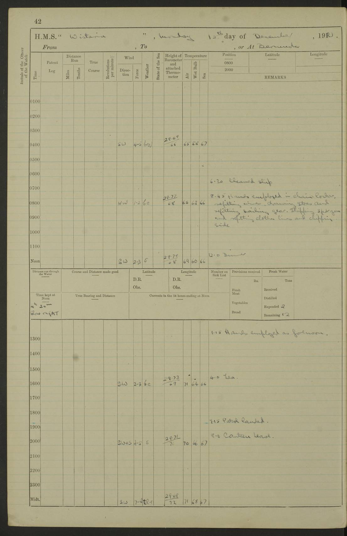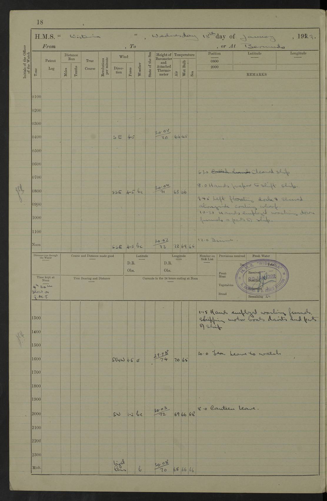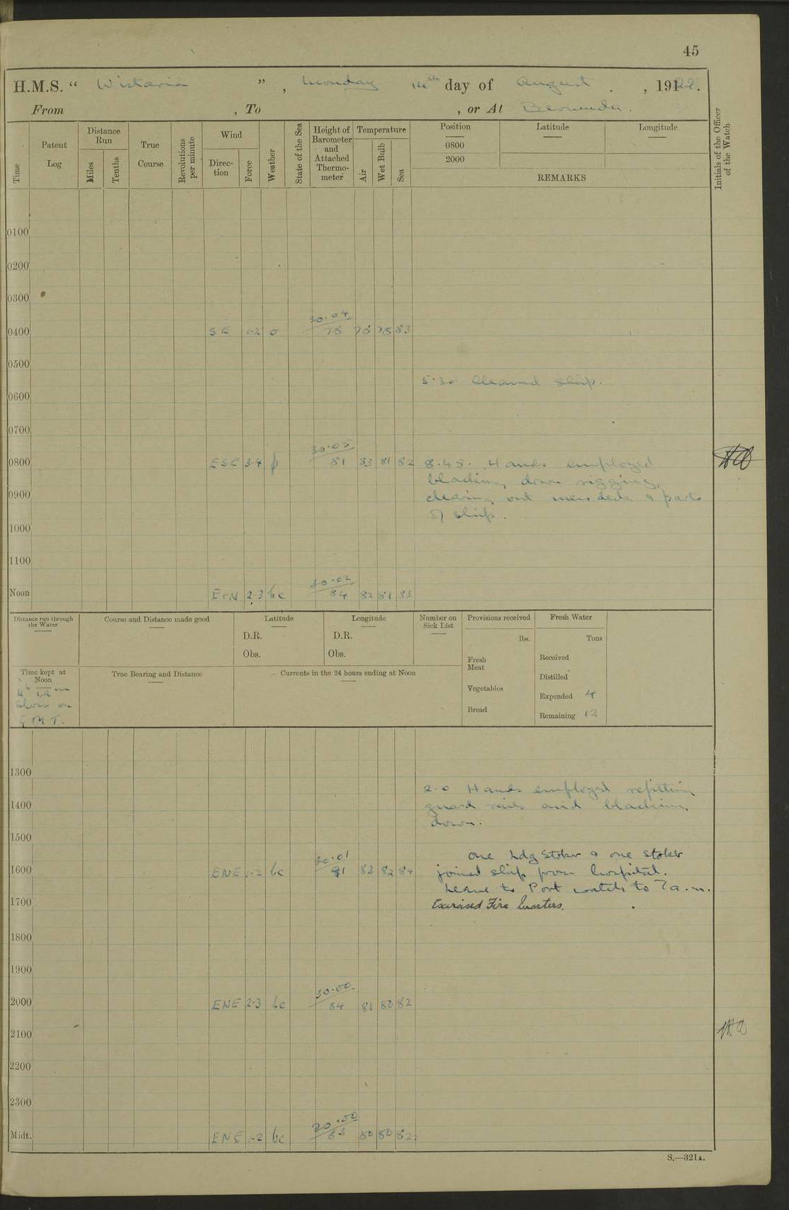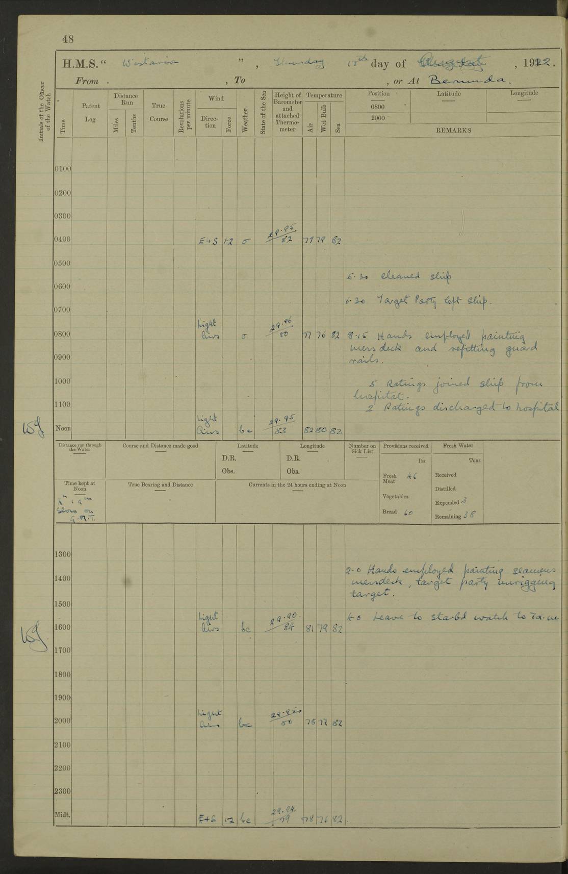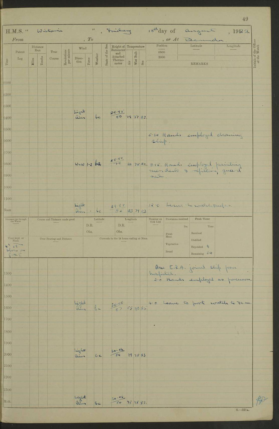 LOGS FOR JANUARY 1922 4f73ca8aa2fc8ea903000b1b: (https://s3.amazonaws.com:443/oldweather/ADM53-93265/0003_1.jpg) 1 January 1922 At Bermuda Lat 32.32, Long -64.8 6.45am: Cleaned ship 10.45am: Church of England Church Party landed 4f73ca8aa2fc8ea903000b1c: (https://s3.amazonaws.com:443/oldweather/ADM53-93265/0004_0.jpg) 2 January 1922 At Bermuda Lat 32.32, Long -64.8 8.45am: Hands employed in seamen’s mess deck & parts of ship 1.15pm: Hands employed as forenoon 4f73ca8aa2fc8ea903000b1d: (https://s3.amazonaws.com:443/oldweather/ADM53-93265/0004_1.jpg) 3 January 1922 At Bermuda Lat 32.32, Long -64.8 8.45am: Hands employed on ship’s side, seamen's mess deck, gunner party & parts of ship 1.15pm: Hands employed as forenoon pm: One Ldg Stoker discharged to RN Hospital 5.0pm: Read Warrant No 6 4f73ca8ba2fc8ea903000b1e: (https://s3.amazonaws.com:443/oldweather/ADM53-93265/0005_0.jpg) 4 January 1922 At Bermuda Lat 32.32, Long -64.8 8.45am: Hands employed painting mess deck & drawing provisions 1.15pm: Hands employed painting seamen's mess deck; on ship’s side; gunner party & parts of ship 4f73ca8ba2fc8ea903000b1f: (https://s3.amazonaws.com:443/oldweather/ADM53-93265/0005_1.jpg) 5 January 1922 At Bermuda Lat 32.32, Long -64.8 8.0am: Hands employed on ship’s side; painting mess decks; refitting boats falls am: 1 Ldg Stoker returned from hospital 4f73ca8ba2fc8ea903000b20: (https://s3.amazonaws.com:443/oldweather/ADM53-93265/0006_0.jpg) 6 January 1922 At Bermuda Lat 32.32, Long -64.8 8.0am: Hands employed painting mess decks, chipping and redleading ship’s side, refitting boats falls 9.0am: Range party landed 1.30pm: Hands employed as forenoon 4f73ca8ca2fc8ea903000b21: (https://s3.amazonaws.com:443/oldweather/ADM53-93265/0006_1.jpg) 7 January 1922 At Bermuda Lat 32.32, Long -64.8 8.0am: Hands employed painting mess decks; side party & parts of ship 8.50am: Ord Sea, boys and stokers training class landed for field training exercises 10.30am: Shifted ship to coaling jetty 11.40am: Secured alongside 4f73ca8ca2fc8ea903000b22: (https://s3.amazonaws.com:443/oldweather/ADM53-93265/0007_0.jpg) 8 January 1922 At Bermuda Lat 32.32, Long -64.8 9.45am: Hands mustered by open list 10.15am: Church of England Church Party landed 4f73ca8da2fc8ea903000b23: (https://s3.amazonaws.com:443/oldweather/ADM53-93265/0007_1.jpg) 9 January 1922 At Bermuda Lat 32.32, Long -64.8 8.0am: Prepared for docking ship 8.25am: Docking party landed. Tug “St Abbs” secured alongside 9.30am: Proceeded into dock 9.55am: Secured in dock 10.30am: Hands employed scrubbing ship’s bottom 1.15pm: Hands employed scrubbing ship’s bottom and painting mess decks pm: 1 Stoker and 1 A.B. discharged to hospital 4f73ca8da2fc8ea903000b24: (https://s3.amazonaws.com:443/oldweather/ADM53-93265/0008_0.jpg) 10 January 1922 At Bermuda Lat 32.32, Long -64.8 8.0am: Hands employed on ship’s side, painting mess decks and about 4” gun for’d 1.15pm: Hands employed as forenoon 4f73ca8da2fc8ea903000b25: (https://s3.amazonaws.com:443/oldweather/ADM53-93265/0008_1.jpg) 11 January 1922 At Bermuda Lat 32.32, Long -64.8 8.0am: Hands employed painting mess decks, chipping side and refitting falls & life belts am: One A.B. discharged to hospital 1.15pm: Hands employed lowering anchors and cables into dock & ranging cable pm: One A.B. joined ship from hospital 4f73ca8ea2fc8ea903000b26: (https://s3.amazonaws.com:443/oldweather/ADM53-93265/0009_0.jpg) 12 January 1922 At Bermuda Lat 32.32, Long -64.8 8.0am: Hands employed chipping ship’s side, painting mess deck & part of ship 5.0pm: Fire Quarters 4f73ca8ea2fc8ea903000b27: (https://s3.amazonaws.com:443/oldweather/ADM53-93265/0009_1.jpg) 13 January 1922 At Bermuda Lat 32.32, Long -64.8 8.0am: Hands employed painting mess deck, chipping ship’s side and parts of ship 1.15pm: Hands employed painting down aloft and chipping ship’s side 4f73ca8ea2fc8ea903000b28: (https://s3.amazonaws.com:443/oldweather/ADM53-93265/0010_0.jpg) 14 January 1922 At Bermuda Lat 32.32, Long -64.8 8.0am: Hands employed on ship’s side, painting down aloft; and on foremost 4” gun 4f73ca8fa2fc8ea903000b29: (https://s3.amazonaws.com:443/oldweather/ADM53-93265/0010_1.jpg) 15 January 1922 At Bermuda Lat 32.32, Long -64.8 10.20am: Church of England church party landed 4f73ca8fa2fc8ea903000b2a: (https://s3.amazonaws.com:443/oldweather/ADM53-93265/0011_0.jpg) 16 January 1922 At Bermuda Lat 32.32, Long -64.8 8.0am: Hands employed painting ship’s bottom 1.15pm: Hands employed painting ship’s bottom 5.0pm: Exercised Fire Quarters 4f73ca8fa2fc8ea903000b2b: (https://s3.amazonaws.com:443/oldweather/ADM53-93265/0011_1.jpg) 17 January 1922 At Bermuda Lat 32.32, Long -64.8 8.0am: Hands employed stowing cable in cable lockers from dock and painting ship’s bottom 1.15pm: Hands employed as forenoon 4f73ca90a2fc8ea903000b2c: (https://s3.amazonaws.com:443/oldweather/ADM53-93265/0012_0.jpg) 18 January 1922 At Bermuda Lat 32.32, Long -64.8 8.0am: Hands prepared to shift ship 9.45am: Left floating dock & secured alongside coaling wharf 10.30am: Hands employed washing down funnels & parts of ship 1.15pm: Hands employed washing funnels, shipping motor boats davits and parts of ship 4f73ca90a2fc8ea903000b2d: (https://s3.amazonaws.com:443/oldweather/ADM53-93265/0012_1.jpg) 19 January 1922 At Bermuda Lat 32.32, Long -64.8 8.0am: Hands employed chipping & painting ship’s side, stripping & cleaning 4” guns and parts of ship 8.15am: RFA “Plumleaf” left basin 9.15am: CH 14 left basin 10.35: Shifted from coaling wharf to 40 ft fender in North Basin 4f73ca91a2fc8ea903000b2e: (https://s3.amazonaws.com:443/oldweather/ADM53-93265/0013_0.jpg) 20 January 1922 At Bermuda Lat 32.32, Long -64.8 8.0am: Hands employed chipping and scraping ship’s side, about aft 4” gun and parts of ship 10.20am: Replace 2nd whaler davits. Lowered 1st whaler davits into deck 1 hand scrubber lost by accident 1.15pm: Hands employed chipping & painting ship’s side. Dismountin