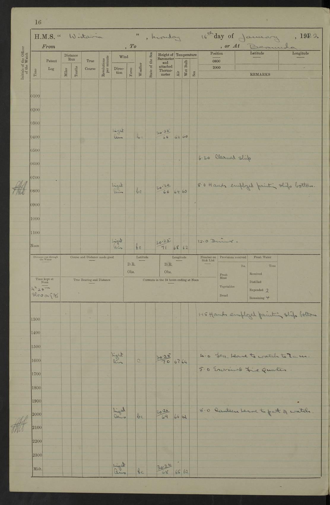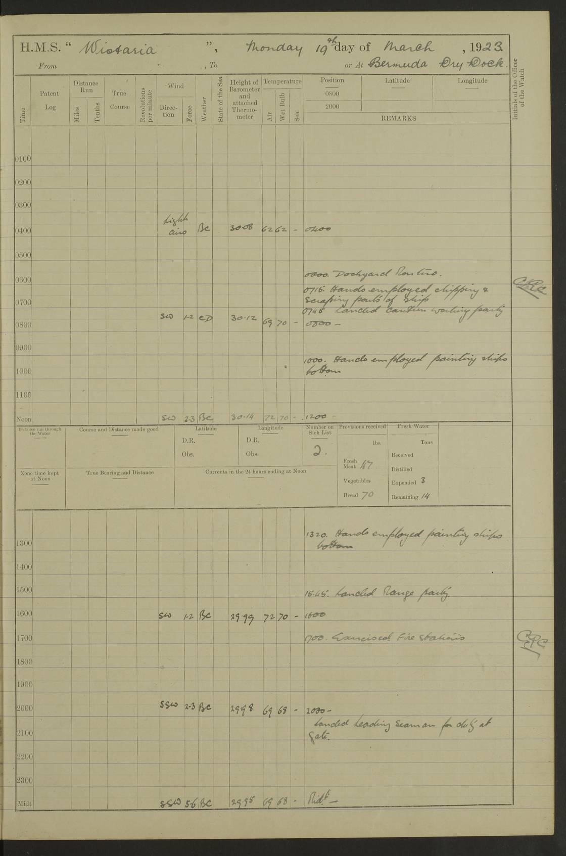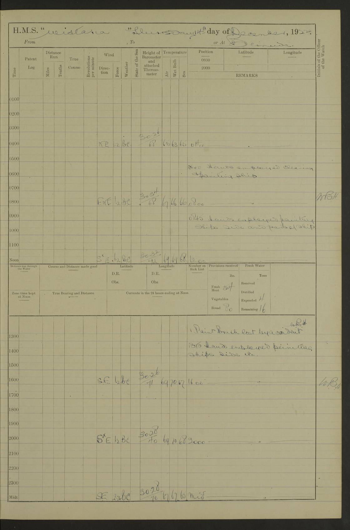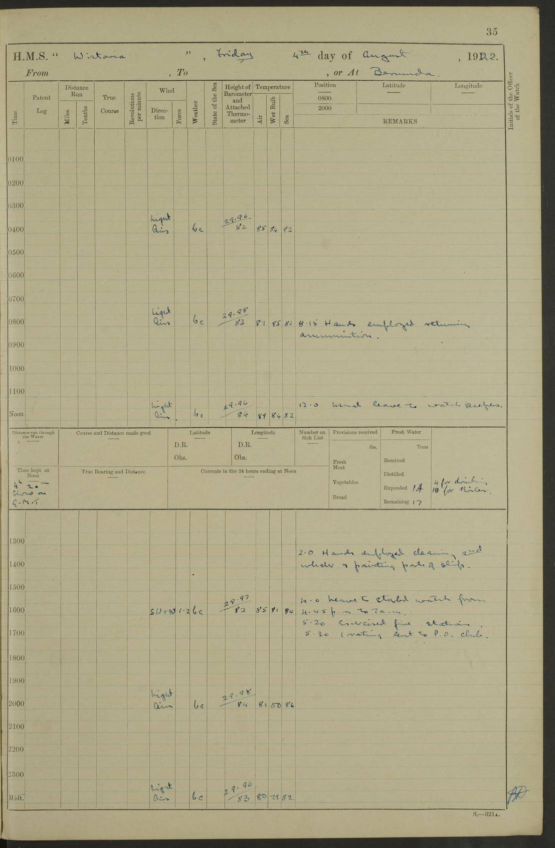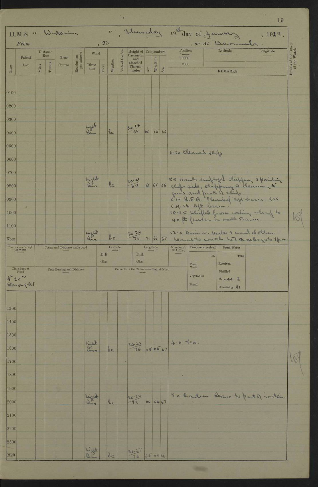 LOGS FOR JANUARY 1922 4f73ca8aa2fc8ea903000b1b: (https://s3.amazonaws.com:443/oldweather/ADM53-93265/0003_1.jpg) 1 January 1922 At Bermuda Lat 32.32, Long -64.8 6.45am: Cleaned ship 10.45am: Church of England Church Party landed 4f73ca8aa2fc8ea903000b1c: (https://s3.amazonaws.com:443/oldweather/ADM53-93265/0004_0.jpg) 2 January 1922 At Bermuda Lat 32.32, Long -64.8 8.45am: Hands employed in seamen’s mess deck & parts of ship 1.15pm: Hands employed as forenoon 4f73ca8aa2fc8ea903000b1d: (https://s3.amazonaws.com:443/oldweather/ADM53-93265/0004_1.jpg) 3 January 1922 At Bermuda Lat 32.32, Long -64.8 8.45am: Hands employed on ship’s side, seamen's mess deck, gunner party & parts of ship 1.15pm: Hands employed as forenoon pm: One Ldg Stoker discharged to RN Hospital 5.0pm: Read Warrant No 6 4f73ca8ba2fc8ea903000b1e: (https://s3.amazonaws.com:443/oldweather/ADM53-93265/0005_0.jpg) 4 January 1922 At Bermuda Lat 32.32, Long -64.8 8.45am: Hands employed painting mess deck & drawing provisions 1.15pm: Hands employed painting seamen's mess deck; on ship’s side; gunner party & parts of ship 4f73ca8ba2fc8ea903000b1f: (https://s3.amazonaws.com:443/oldweather/ADM53-93265/0005_1.jpg) 5 January 1922 At Bermuda Lat 32.32, Long -64.8 8.0am: Hands employed on ship’s side; painting mess decks; refitting boats falls am: 1 Ldg Stoker returned from hospital 4f73ca8ba2fc8ea903000b20: (https://s3.amazonaws.com:443/oldweather/ADM53-93265/0006_0.jpg) 6 January 1922 At Bermuda Lat 32.32, Long -64.8 8.0am: Hands employed painting mess decks, chipping and redleading ship’s side, refitting boats falls 9.0am: Range party landed 1.30pm: Hands employed as forenoon 4f73ca8ca2fc8ea903000b21: (https://s3.amazonaws.com:443/oldweather/ADM53-93265/0006_1.jpg) 7 January 1922 At Bermuda Lat 32.32, Long -64.8 8.0am: Hands employed painting mess decks; side party & parts of ship 8.50am: Ord Sea, boys and stokers training class landed for field training exercises 10.30am: Shifted ship to coaling jetty 11.40am: Secured alongside 4f73ca8ca2fc8ea903000b22: (https://s3.amazonaws.com:443/oldweather/ADM53-93265/0007_0.jpg) 8 January 1922 At Bermuda Lat 32.32, Long -64.8 9.45am: Hands mustered by open list 10.15am: Church of England Church Party landed 4f73ca8da2fc8ea903000b23: (https://s3.amazonaws.com:443/oldweather/ADM53-93265/0007_1.jpg) 9 January 1922 At Bermuda Lat 32.32, Long -64.8 8.0am: Prepared for docking ship 8.25am: Docking party landed. Tug “St Abbs” secured alongside 9.30am: Proceeded into dock 9.55am: Secured in dock 10.30am: Hands employed scrubbing ship’s bottom 1.15pm: Hands employed scrubbing ship’s bottom and painting mess decks pm: 1 Stoker and 1 A.B. discharged to hospital 4f73ca8da2fc8ea903000b24: (https://s3.amazonaws.com:443/oldweather/ADM53-93265/0008_0.jpg) 10 January 1922 At Bermuda Lat 32.32, Long -64.8 8.0am: Hands employed on ship’s side, painting mess decks and about 4” gun for’d 1.15pm: Hands employed as forenoon 4f73ca8da2fc8ea903000b25: (https://s3.amazonaws.com:443/oldweather/ADM53-93265/0008_1.jpg) 11 January 1922 At Bermuda Lat 32.32, Long -64.8 8.0am: Hands employed painting mess decks, chipping side and refitting falls & life belts am: One A.B. discharged to hospital 1.15pm: Hands employed lowering anchors and cables into dock & ranging cable pm: One A.B. joined ship from hospital 4f73ca8ea2fc8ea903000b26: (https://s3.amazonaws.com:443/oldweather/ADM53-93265/0009_0.jpg) 12 January 1922 At Bermuda Lat 32.32, Long -64.8 8.0am: Hands employed chipping ship’s side, painting mess deck & part of ship 5.0pm: Fire Quarters 4f73ca8ea2fc8ea903000b27: (https://s3.amazonaws.com:443/oldweather/ADM53-93265/0009_1.jpg) 13 January 1922 At Bermuda Lat 32.32, Long -64.8 8.0am: Hands employed painting mess deck, chipping ship’s side and parts of ship 1.15pm: Hands employed painting down aloft and chipping ship’s side 4f73ca8ea2fc8ea903000b28: (https://s3.amazonaws.com:443/oldweather/ADM53-93265/0010_0.jpg) 14 January 1922 At Bermuda Lat 32.32, Long -64.8 8.0am: Hands employed on ship’s side, painting down aloft; and on foremost 4” gun 4f73ca8fa2fc8ea903000b29: (https://s3.amazonaws.com:443/oldweather/ADM53-93265/0010_1.jpg) 15 January 1922 At Bermuda Lat 32.32, Long -64.8 10.20am: Church of England church party landed 4f73ca8fa2fc8ea903000b2a: (https://s3.amazonaws.com:443/oldweather/ADM53-93265/0011_0.jpg) 16 January 1922 At Bermuda Lat 32.32, Long -64.8 8.0am: Hands employed painting ship’s bottom 1.15pm: Hands employed painting ship’s bottom 5.0pm: Exercised Fire Quarters 4f73ca8fa2fc8ea903000b2b: (https://s3.amazonaws.com:443/oldweather/ADM53-93265/0011_1.jpg) 17 January 1922 At Bermuda Lat 32.32, Long -64.8 8.0am: Hands employed stowing cable in cable lockers from dock and painting ship’s bottom 1.15pm: Hands employed as forenoon 4f73ca90a2fc8ea903000b2c: (https://s3.amazonaws.com:443/oldweather/ADM53-93265/0012_0.jpg) 18 January 1922 At Bermuda Lat 32.32, Long -64.8 8.0am: Hands prepared to shift ship 9.45am: Left floating dock & secured alongside coaling wharf 10.30am: Hands employed washing down funnels & parts of ship 1.15pm: Hands employed washing funnels, shipping motor boats davits and parts of ship 4f73ca90a2fc8ea903000b2d: (https://s3.amazonaws.com:443/oldweather/ADM53-93265/0012_1.jpg) 19 January 1922 At Bermuda Lat 32.32, Long -64.8 8.0am: Hands employed chipping & painting ship’s side, stripping & cleaning 4” guns and parts of ship 8.15am: RFA “Plumleaf” left basin 9.15am: CH 14 left basin 10.35: Shifted from coaling wharf to 40 ft fender in North Basin 4f73ca91a2fc8ea903000b2e: (https://s3.amazonaws.com:443/oldweather/ADM53-93265/0013_0.jpg) 20 January 1922 At Bermuda Lat 32.32, Long -64.8 8.0am: Hands employed chipping and scraping ship’s side, about aft 4” gun and parts of ship 10.20am: Replace 2nd whaler davits. Lowered 1st whaler davits into deck 1 hand scrubber lost by accident 1.15pm: Hands employed chipping & painting ship’s side. Dismountin