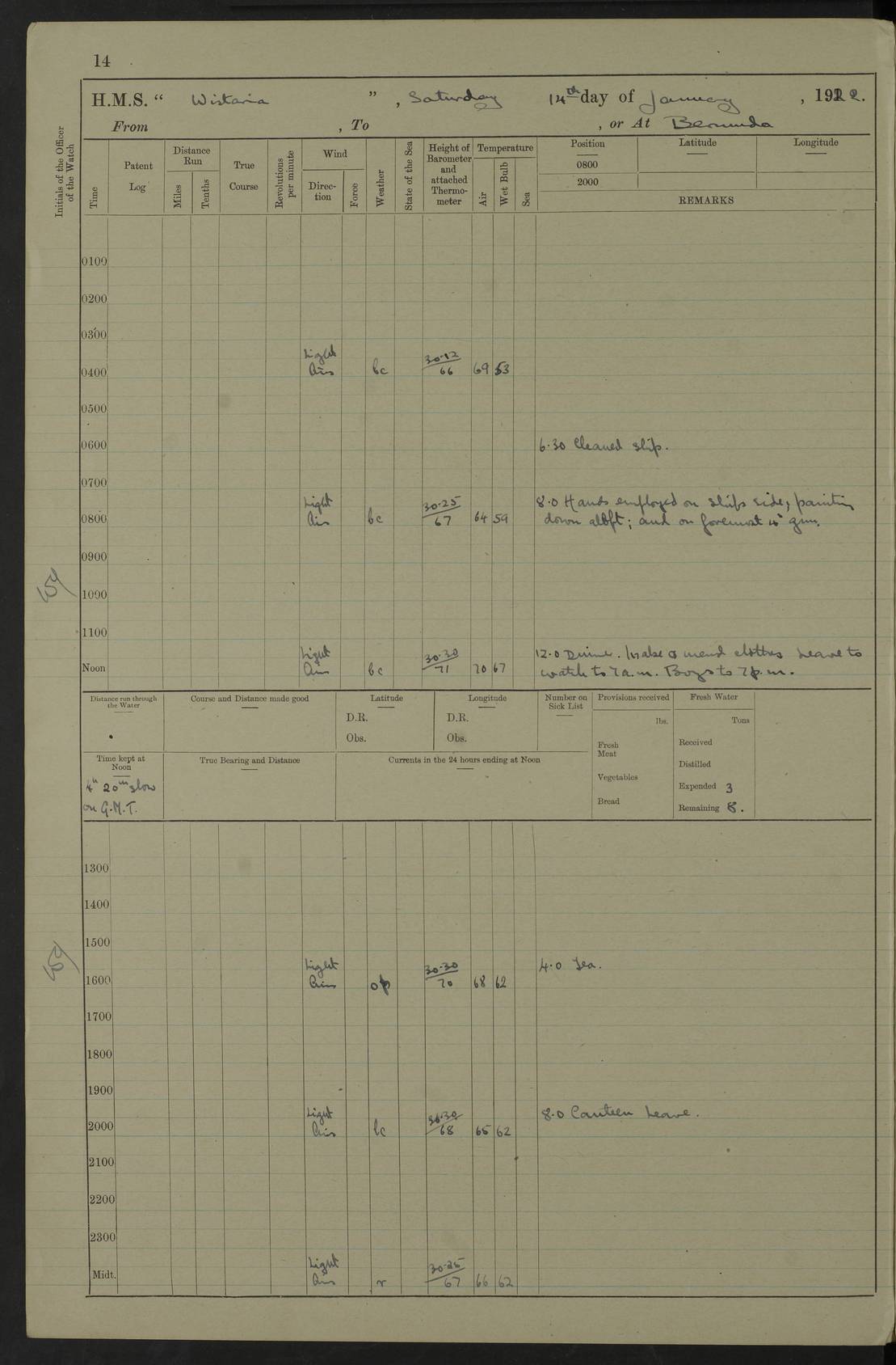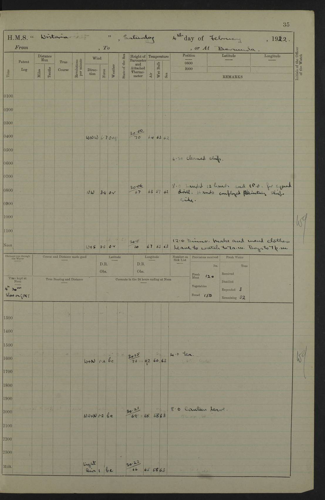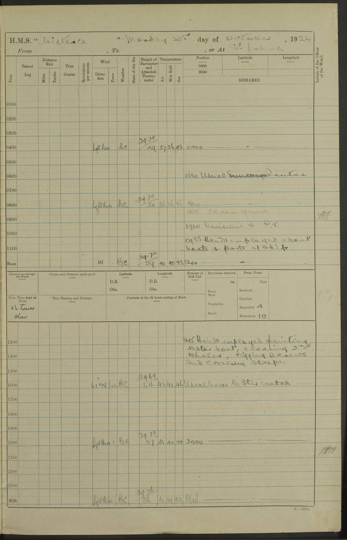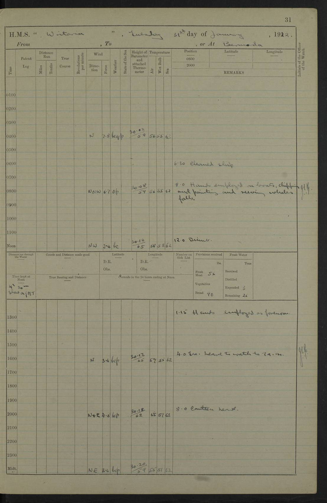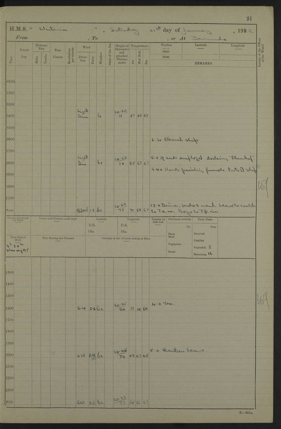 LOGS FOR JANUARY 1922 4f73ca8aa2fc8ea903000b1b: (https://s3.amazonaws.com:443/oldweather/ADM53-93265/0003_1.jpg) 1 January 1922 At Bermuda Lat 32.32, Long -64.8 6.45am: Cleaned ship 10.45am: Church of England Church Party landed 4f73ca8aa2fc8ea903000b1c: (https://s3.amazonaws.com:443/oldweather/ADM53-93265/0004_0.jpg) 2 January 1922 At Bermuda Lat 32.32, Long -64.8 8.45am: Hands employed in seamen’s mess deck & parts of ship 1.15pm: Hands employed as forenoon 4f73ca8aa2fc8ea903000b1d: (https://s3.amazonaws.com:443/oldweather/ADM53-93265/0004_1.jpg) 3 January 1922 At Bermuda Lat 32.32, Long -64.8 8.45am: Hands employed on ship’s side, seamen's mess deck, gunner party & parts of ship 1.15pm: Hands employed as forenoon pm: One Ldg Stoker discharged to RN Hospital 5.0pm: Read Warrant No 6 4f73ca8ba2fc8ea903000b1e: (https://s3.amazonaws.com:443/oldweather/ADM53-93265/0005_0.jpg) 4 January 1922 At Bermuda Lat 32.32, Long -64.8 8.45am: Hands employed painting mess deck & drawing provisions 1.15pm: Hands employed painting seamen's mess deck; on ship’s side; gunner party & parts of ship 4f73ca8ba2fc8ea903000b1f: (https://s3.amazonaws.com:443/oldweather/ADM53-93265/0005_1.jpg) 5 January 1922 At Bermuda Lat 32.32, Long -64.8 8.0am: Hands employed on ship’s side; painting mess decks; refitting boats falls am: 1 Ldg Stoker returned from hospital 4f73ca8ba2fc8ea903000b20: (https://s3.amazonaws.com:443/oldweather/ADM53-93265/0006_0.jpg) 6 January 1922 At Bermuda Lat 32.32, Long -64.8 8.0am: Hands employed painting mess decks, chipping and redleading ship’s side, refitting boats falls 9.0am: Range party landed 1.30pm: Hands employed as forenoon 4f73ca8ca2fc8ea903000b21: (https://s3.amazonaws.com:443/oldweather/ADM53-93265/0006_1.jpg) 7 January 1922 At Bermuda Lat 32.32, Long -64.8 8.0am: Hands employed painting mess decks; side party & parts of ship 8.50am: Ord Sea, boys and stokers training class landed for field training exercises 10.30am: Shifted ship to coaling jetty 11.40am: Secured alongside 4f73ca8ca2fc8ea903000b22: (https://s3.amazonaws.com:443/oldweather/ADM53-93265/0007_0.jpg) 8 January 1922 At Bermuda Lat 32.32, Long -64.8 9.45am: Hands mustered by open list 10.15am: Church of England Church Party landed 4f73ca8da2fc8ea903000b23: (https://s3.amazonaws.com:443/oldweather/ADM53-93265/0007_1.jpg) 9 January 1922 At Bermuda Lat 32.32, Long -64.8 8.0am: Prepared for docking ship 8.25am: Docking party landed. Tug “St Abbs” secured alongside 9.30am: Proceeded into dock 9.55am: Secured in dock 10.30am: Hands employed scrubbing ship’s bottom 1.15pm: Hands employed scrubbing ship’s bottom and painting mess decks pm: 1 Stoker and 1 A.B. discharged to hospital 4f73ca8da2fc8ea903000b24: (https://s3.amazonaws.com:443/oldweather/ADM53-93265/0008_0.jpg) 10 January 1922 At Bermuda Lat 32.32, Long -64.8 8.0am: Hands employed on ship’s side, painting mess decks and about 4” gun for’d 1.15pm: Hands employed as forenoon 4f73ca8da2fc8ea903000b25: (https://s3.amazonaws.com:443/oldweather/ADM53-93265/0008_1.jpg) 11 January 1922 At Bermuda Lat 32.32, Long -64.8 8.0am: Hands employed painting mess decks, chipping side and refitting falls & life belts am: One A.B. discharged to hospital 1.15pm: Hands employed lowering anchors and cables into dock & ranging cable pm: One A.B. joined ship from hospital 4f73ca8ea2fc8ea903000b26: (https://s3.amazonaws.com:443/oldweather/ADM53-93265/0009_0.jpg) 12 January 1922 At Bermuda Lat 32.32, Long -64.8 8.0am: Hands employed chipping ship’s side, painting mess deck & part of ship 5.0pm: Fire Quarters 4f73ca8ea2fc8ea903000b27: (https://s3.amazonaws.com:443/oldweather/ADM53-93265/0009_1.jpg) 13 January 1922 At Bermuda Lat 32.32, Long -64.8 8.0am: Hands employed painting mess deck, chipping ship’s side and parts of ship 1.15pm: Hands employed painting down aloft and chipping ship’s side 4f73ca8ea2fc8ea903000b28: (https://s3.amazonaws.com:443/oldweather/ADM53-93265/0010_0.jpg) 14 January 1922 At Bermuda Lat 32.32, Long -64.8 8.0am: Hands employed on ship’s side, painting down aloft; and on foremost 4” gun 4f73ca8fa2fc8ea903000b29: (https://s3.amazonaws.com:443/oldweather/ADM53-93265/0010_1.jpg) 15 January 1922 At Bermuda Lat 32.32, Long -64.8 10.20am: Church of England church party landed 4f73ca8fa2fc8ea903000b2a: (https://s3.amazonaws.com:443/oldweather/ADM53-93265/0011_0.jpg) 16 January 1922 At Bermuda Lat 32.32, Long -64.8 8.0am: Hands employed painting ship’s bottom 1.15pm: Hands employed painting ship’s bottom 5.0pm: Exercised Fire Quarters 4f73ca8fa2fc8ea903000b2b: (https://s3.amazonaws.com:443/oldweather/ADM53-93265/0011_1.jpg) 17 January 1922 At Bermuda Lat 32.32, Long -64.8 8.0am: Hands employed stowing cable in cable lockers from dock and painting ship’s bottom 1.15pm: Hands employed as forenoon 4f73ca90a2fc8ea903000b2c: (https://s3.amazonaws.com:443/oldweather/ADM53-93265/0012_0.jpg) 18 January 1922 At Bermuda Lat 32.32, Long -64.8 8.0am: Hands prepared to shift ship 9.45am: Left floating dock & secured alongside coaling wharf 10.30am: Hands employed washing down funnels & parts of ship 1.15pm: Hands employed washing funnels, shipping motor boats davits and parts of ship 4f73ca90a2fc8ea903000b2d: (https://s3.amazonaws.com:443/oldweather/ADM53-93265/0012_1.jpg) 19 January 1922 At Bermuda Lat 32.32, Long -64.8 8.0am: Hands employed chipping & painting ship’s side, stripping & cleaning 4” guns and parts of ship 8.15am: RFA “Plumleaf” left basin 9.15am: CH 14 left basin 10.35: Shifted from coaling wharf to 40 ft fender in North Basin 4f73ca91a2fc8ea903000b2e: (https://s3.amazonaws.com:443/oldweather/ADM53-93265/0013_0.jpg) 20 January 1922 At Bermuda Lat 32.32, Long -64.8 8.0am: Hands employed chipping and scraping ship’s side, about aft 4” gun and parts of ship 10.20am: Replace 2nd whaler davits. Lowered 1st whaler davits into deck 1 hand scrubber lost by accident 1.15pm: Hands employed chipping & painting ship’s side. Dismountin