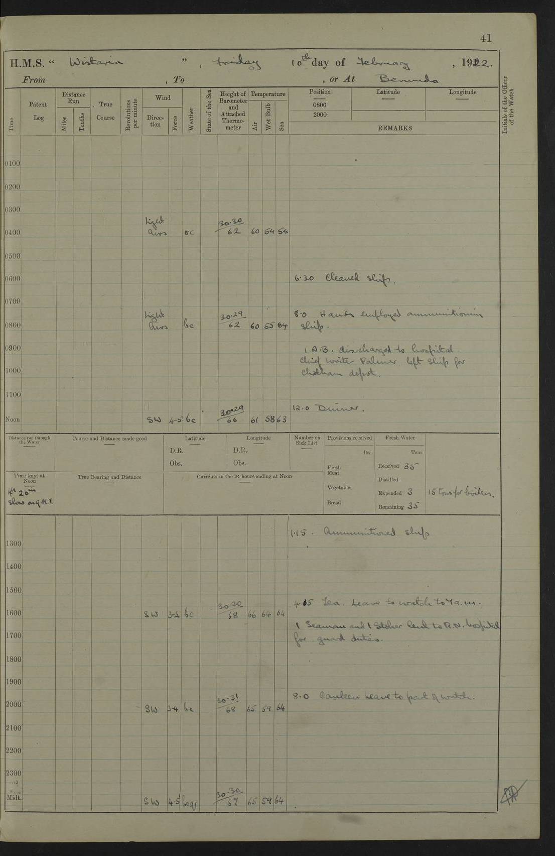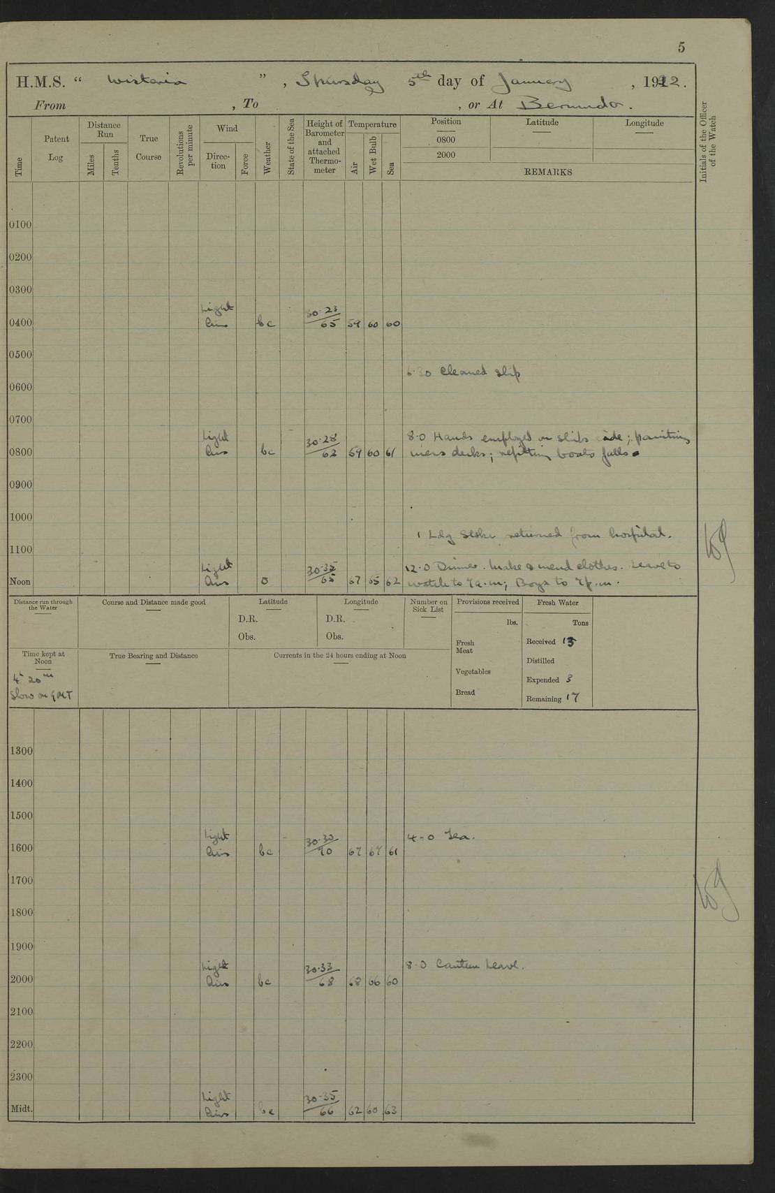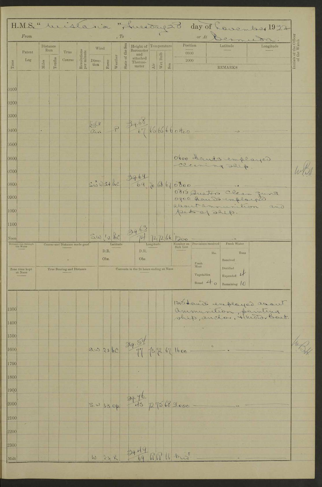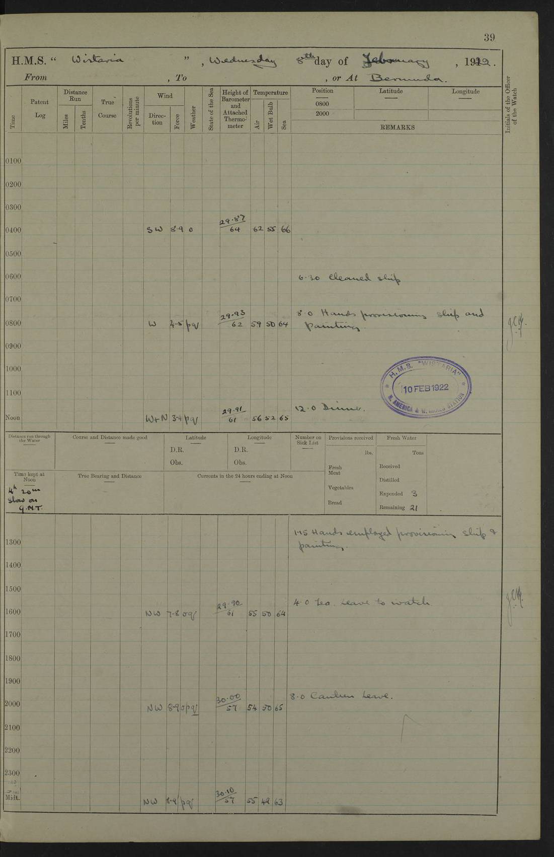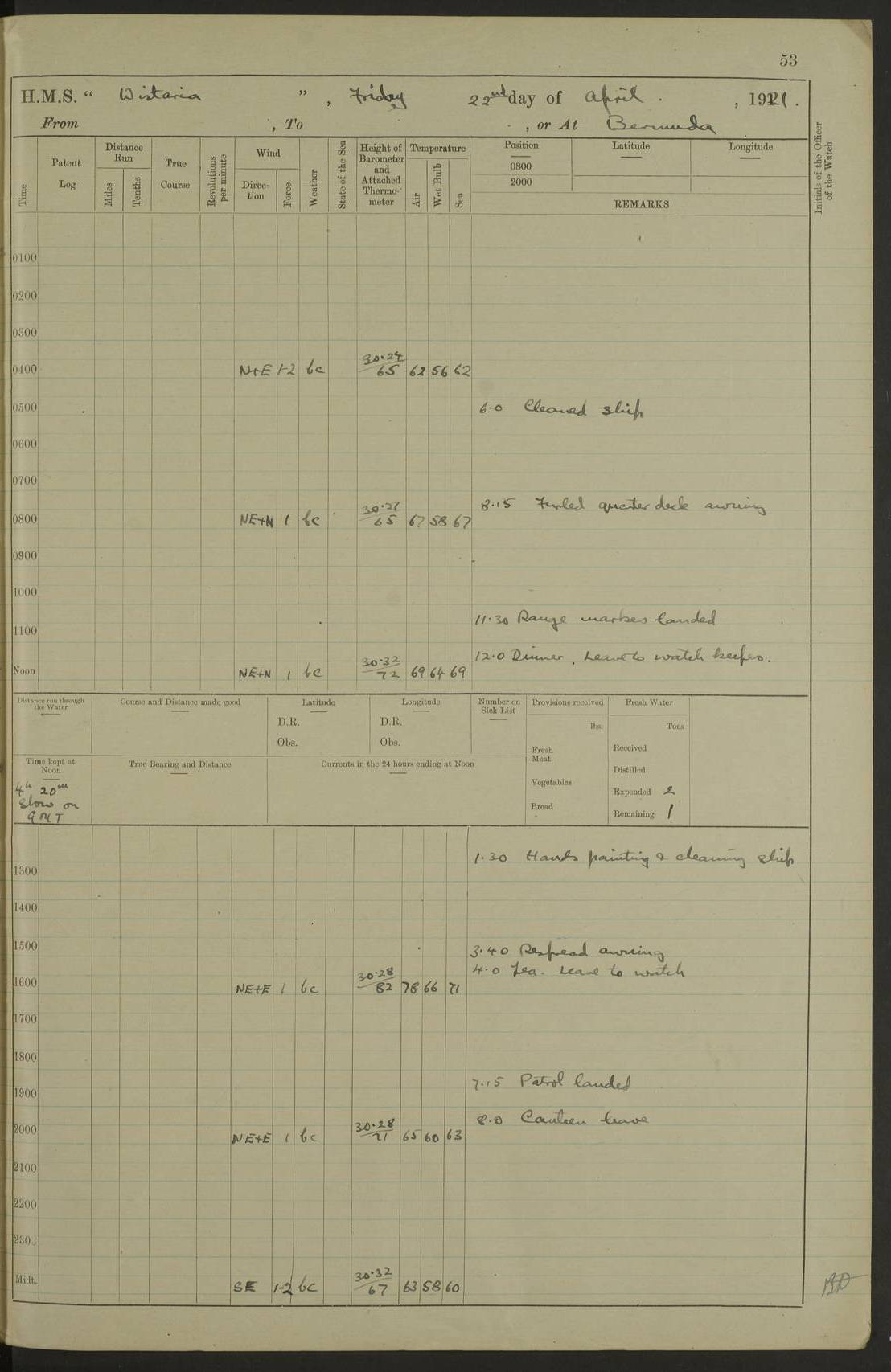 LOGS FOR JANUARY 1922 4f73ca8aa2fc8ea903000b1b: (https://s3.amazonaws.com:443/oldweather/ADM53-93265/0003_1.jpg) 1 January 1922 At Bermuda Lat 32.32, Long -64.8 6.45am: Cleaned ship 10.45am: Church of England Church Party landed 4f73ca8aa2fc8ea903000b1c: (https://s3.amazonaws.com:443/oldweather/ADM53-93265/0004_0.jpg) 2 January 1922 At Bermuda Lat 32.32, Long -64.8 8.45am: Hands employed in seamen’s mess deck & parts of ship 1.15pm: Hands employed as forenoon 4f73ca8aa2fc8ea903000b1d: (https://s3.amazonaws.com:443/oldweather/ADM53-93265/0004_1.jpg) 3 January 1922 At Bermuda Lat 32.32, Long -64.8 8.45am: Hands employed on ship’s side, seamen's mess deck, gunner party & parts of ship 1.15pm: Hands employed as forenoon pm: One Ldg Stoker discharged to RN Hospital 5.0pm: Read Warrant No 6 4f73ca8ba2fc8ea903000b1e: (https://s3.amazonaws.com:443/oldweather/ADM53-93265/0005_0.jpg) 4 January 1922 At Bermuda Lat 32.32, Long -64.8 8.45am: Hands employed painting mess deck & drawing provisions 1.15pm: Hands employed painting seamen's mess deck; on ship’s side; gunner party & parts of ship 4f73ca8ba2fc8ea903000b1f: (https://s3.amazonaws.com:443/oldweather/ADM53-93265/0005_1.jpg) 5 January 1922 At Bermuda Lat 32.32, Long -64.8 8.0am: Hands employed on ship’s side; painting mess decks; refitting boats falls am: 1 Ldg Stoker returned from hospital 4f73ca8ba2fc8ea903000b20: (https://s3.amazonaws.com:443/oldweather/ADM53-93265/0006_0.jpg) 6 January 1922 At Bermuda Lat 32.32, Long -64.8 8.0am: Hands employed painting mess decks, chipping and redleading ship’s side, refitting boats falls 9.0am: Range party landed 1.30pm: Hands employed as forenoon 4f73ca8ca2fc8ea903000b21: (https://s3.amazonaws.com:443/oldweather/ADM53-93265/0006_1.jpg) 7 January 1922 At Bermuda Lat 32.32, Long -64.8 8.0am: Hands employed painting mess decks; side party & parts of ship 8.50am: Ord Sea, boys and stokers training class landed for field training exercises 10.30am: Shifted ship to coaling jetty 11.40am: Secured alongside 4f73ca8ca2fc8ea903000b22: (https://s3.amazonaws.com:443/oldweather/ADM53-93265/0007_0.jpg) 8 January 1922 At Bermuda Lat 32.32, Long -64.8 9.45am: Hands mustered by open list 10.15am: Church of England Church Party landed 4f73ca8da2fc8ea903000b23: (https://s3.amazonaws.com:443/oldweather/ADM53-93265/0007_1.jpg) 9 January 1922 At Bermuda Lat 32.32, Long -64.8 8.0am: Prepared for docking ship 8.25am: Docking party landed. Tug “St Abbs” secured alongside 9.30am: Proceeded into dock 9.55am: Secured in dock 10.30am: Hands employed scrubbing ship’s bottom 1.15pm: Hands employed scrubbing ship’s bottom and painting mess decks pm: 1 Stoker and 1 A.B. discharged to hospital 4f73ca8da2fc8ea903000b24: (https://s3.amazonaws.com:443/oldweather/ADM53-93265/0008_0.jpg) 10 January 1922 At Bermuda Lat 32.32, Long -64.8 8.0am: Hands employed on ship’s side, painting mess decks and about 4” gun for’d 1.15pm: Hands employed as forenoon 4f73ca8da2fc8ea903000b25: (https://s3.amazonaws.com:443/oldweather/ADM53-93265/0008_1.jpg) 11 January 1922 At Bermuda Lat 32.32, Long -64.8 8.0am: Hands employed painting mess decks, chipping side and refitting falls & life belts am: One A.B. discharged to hospital 1.15pm: Hands employed lowering anchors and cables into dock & ranging cable pm: One A.B. joined ship from hospital 4f73ca8ea2fc8ea903000b26: (https://s3.amazonaws.com:443/oldweather/ADM53-93265/0009_0.jpg) 12 January 1922 At Bermuda Lat 32.32, Long -64.8 8.0am: Hands employed chipping ship’s side, painting mess deck & part of ship 5.0pm: Fire Quarters 4f73ca8ea2fc8ea903000b27: (https://s3.amazonaws.com:443/oldweather/ADM53-93265/0009_1.jpg) 13 January 1922 At Bermuda Lat 32.32, Long -64.8 8.0am: Hands employed painting mess deck, chipping ship’s side and parts of ship 1.15pm: Hands employed painting down aloft and chipping ship’s side 4f73ca8ea2fc8ea903000b28: (https://s3.amazonaws.com:443/oldweather/ADM53-93265/0010_0.jpg) 14 January 1922 At Bermuda Lat 32.32, Long -64.8 8.0am: Hands employed on ship’s side, painting down aloft; and on foremost 4” gun 4f73ca8fa2fc8ea903000b29: (https://s3.amazonaws.com:443/oldweather/ADM53-93265/0010_1.jpg) 15 January 1922 At Bermuda Lat 32.32, Long -64.8 10.20am: Church of England church party landed 4f73ca8fa2fc8ea903000b2a: (https://s3.amazonaws.com:443/oldweather/ADM53-93265/0011_0.jpg) 16 January 1922 At Bermuda Lat 32.32, Long -64.8 8.0am: Hands employed painting ship’s bottom 1.15pm: Hands employed painting ship’s bottom 5.0pm: Exercised Fire Quarters 4f73ca8fa2fc8ea903000b2b: (https://s3.amazonaws.com:443/oldweather/ADM53-93265/0011_1.jpg) 17 January 1922 At Bermuda Lat 32.32, Long -64.8 8.0am: Hands employed stowing cable in cable lockers from dock and painting ship’s bottom 1.15pm: Hands employed as forenoon 4f73ca90a2fc8ea903000b2c: (https://s3.amazonaws.com:443/oldweather/ADM53-93265/0012_0.jpg) 18 January 1922 At Bermuda Lat 32.32, Long -64.8 8.0am: Hands prepared to shift ship 9.45am: Left floating dock & secured alongside coaling wharf 10.30am: Hands employed washing down funnels & parts of ship 1.15pm: Hands employed washing funnels, shipping motor boats davits and parts of ship 4f73ca90a2fc8ea903000b2d: (https://s3.amazonaws.com:443/oldweather/ADM53-93265/0012_1.jpg) 19 January 1922 At Bermuda Lat 32.32, Long -64.8 8.0am: Hands employed chipping & painting ship’s side, stripping & cleaning 4” guns and parts of ship 8.15am: RFA “Plumleaf” left basin 9.15am: CH 14 left basin 10.35: Shifted from coaling wharf to 40 ft fender in North Basin 4f73ca91a2fc8ea903000b2e: (https://s3.amazonaws.com:443/oldweather/ADM53-93265/0013_0.jpg) 20 January 1922 At Bermuda Lat 32.32, Long -64.8 8.0am: Hands employed chipping and scraping ship’s side, about aft 4” gun and parts of ship 10.20am: Replace 2nd whaler davits. Lowered 1st whaler davits into deck 1 hand scrubber lost by accident 1.15pm: Hands employed chipping & painting ship’s side. Dismountin