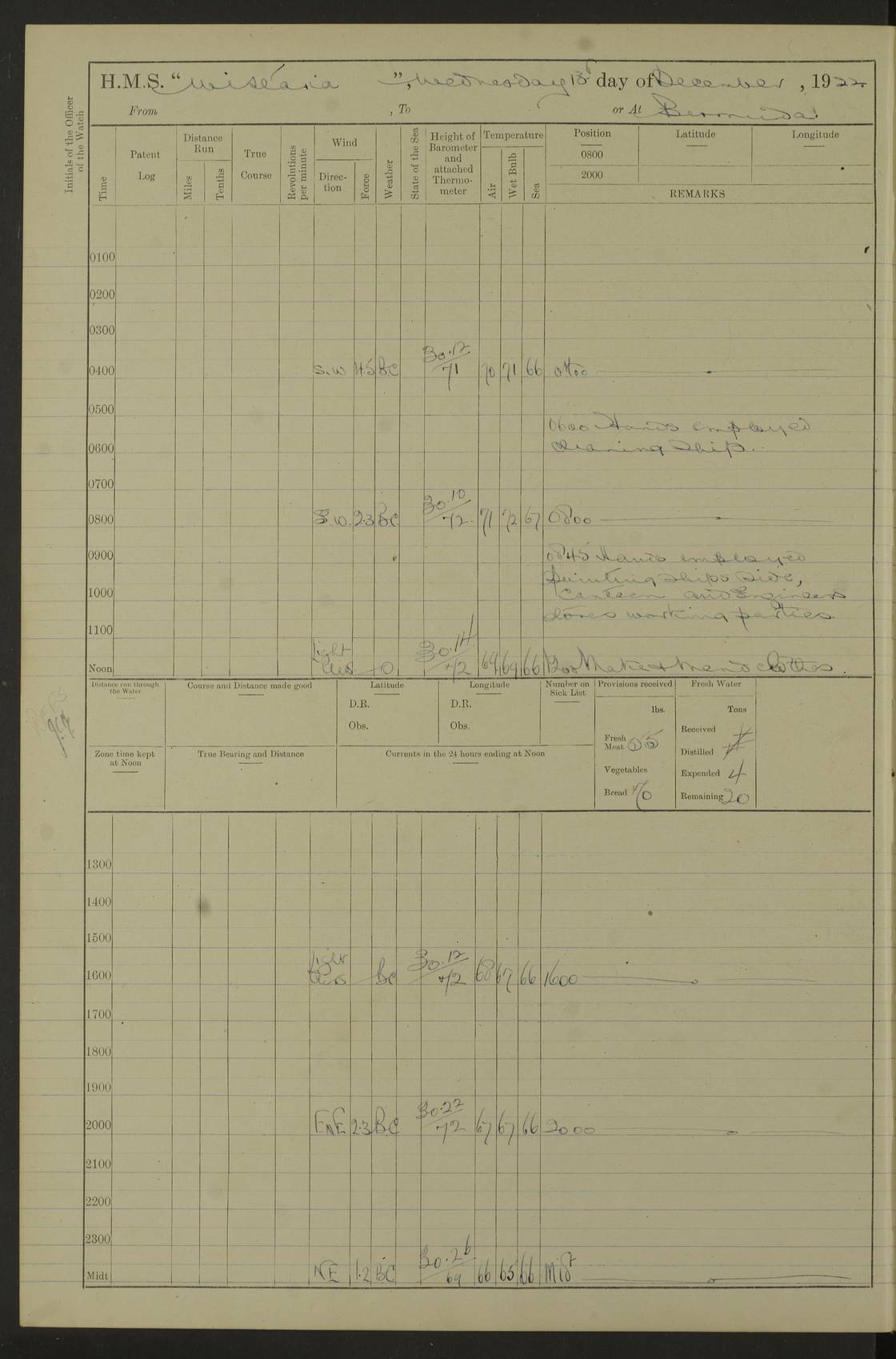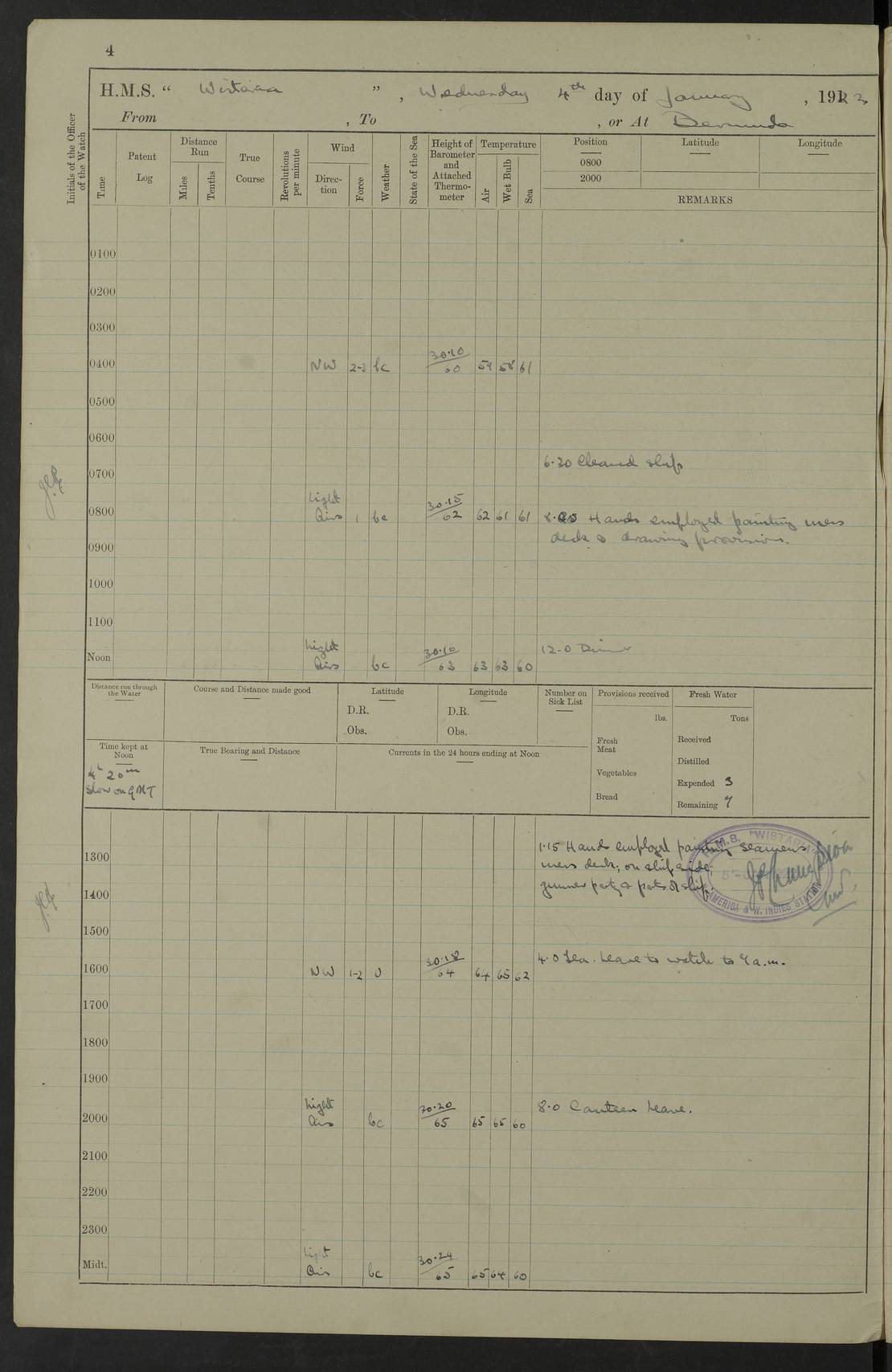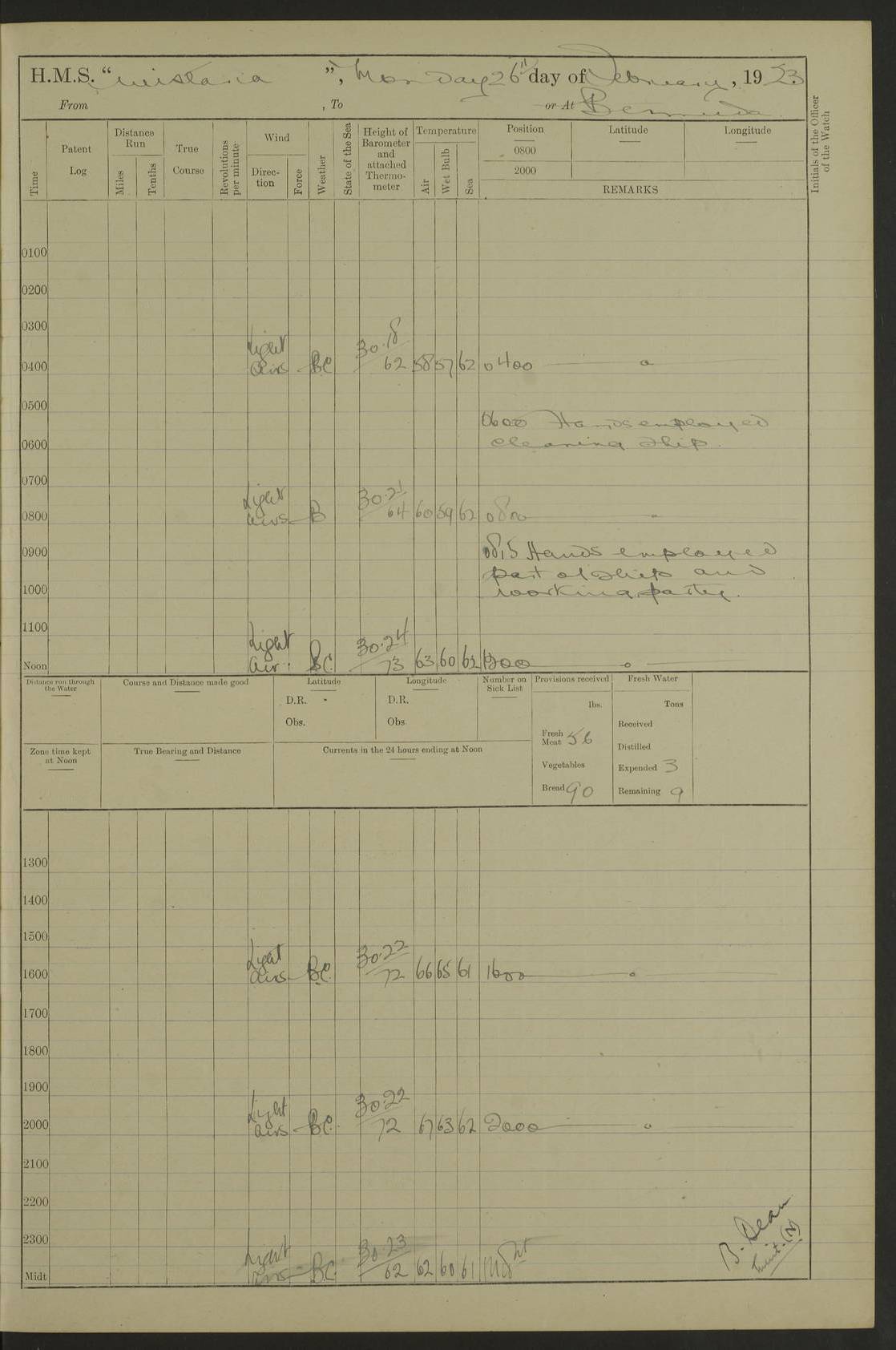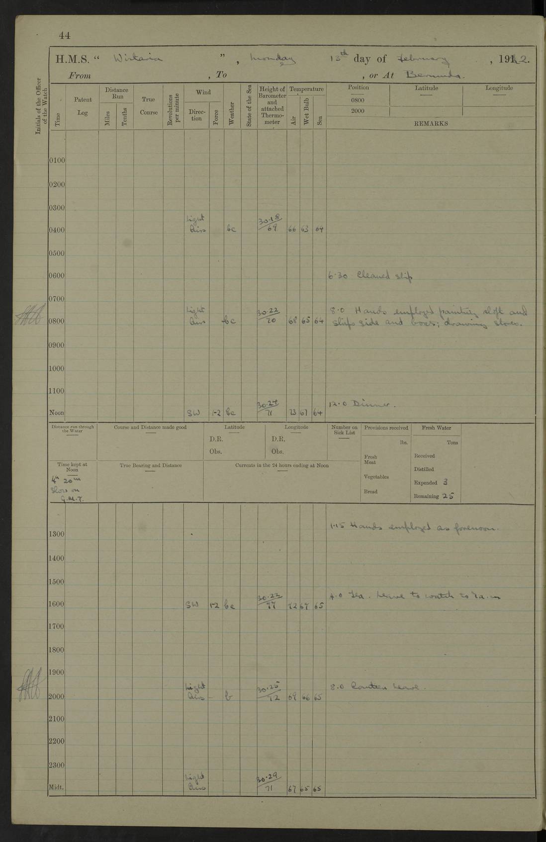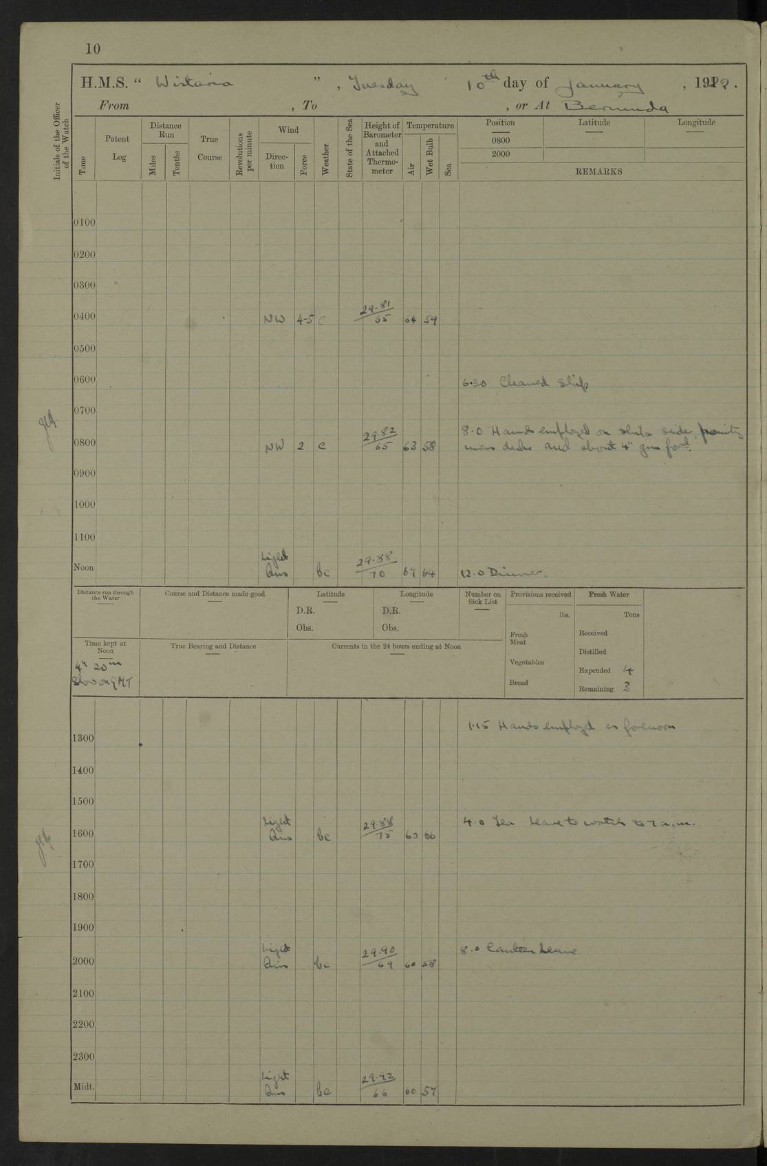 LOGS FOR JANUARY 1922 4f73ca8aa2fc8ea903000b1b: (https://s3.amazonaws.com:443/oldweather/ADM53-93265/0003_1.jpg) 1 January 1922 At Bermuda Lat 32.32, Long -64.8 6.45am: Cleaned ship 10.45am: Church of England Church Party landed 4f73ca8aa2fc8ea903000b1c: (https://s3.amazonaws.com:443/oldweather/ADM53-93265/0004_0.jpg) 2 January 1922 At Bermuda Lat 32.32, Long -64.8 8.45am: Hands employed in seamen’s mess deck & parts of ship 1.15pm: Hands employed as forenoon 4f73ca8aa2fc8ea903000b1d: (https://s3.amazonaws.com:443/oldweather/ADM53-93265/0004_1.jpg) 3 January 1922 At Bermuda Lat 32.32, Long -64.8 8.45am: Hands employed on ship’s side, seamen's mess deck, gunner party & parts of ship 1.15pm: Hands employed as forenoon pm: One Ldg Stoker discharged to RN Hospital 5.0pm: Read Warrant No 6 4f73ca8ba2fc8ea903000b1e: (https://s3.amazonaws.com:443/oldweather/ADM53-93265/0005_0.jpg) 4 January 1922 At Bermuda Lat 32.32, Long -64.8 8.45am: Hands employed painting mess deck & drawing provisions 1.15pm: Hands employed painting seamen's mess deck; on ship’s side; gunner party & parts of ship 4f73ca8ba2fc8ea903000b1f: (https://s3.amazonaws.com:443/oldweather/ADM53-93265/0005_1.jpg) 5 January 1922 At Bermuda Lat 32.32, Long -64.8 8.0am: Hands employed on ship’s side; painting mess decks; refitting boats falls am: 1 Ldg Stoker returned from hospital 4f73ca8ba2fc8ea903000b20: (https://s3.amazonaws.com:443/oldweather/ADM53-93265/0006_0.jpg) 6 January 1922 At Bermuda Lat 32.32, Long -64.8 8.0am: Hands employed painting mess decks, chipping and redleading ship’s side, refitting boats falls 9.0am: Range party landed 1.30pm: Hands employed as forenoon 4f73ca8ca2fc8ea903000b21: (https://s3.amazonaws.com:443/oldweather/ADM53-93265/0006_1.jpg) 7 January 1922 At Bermuda Lat 32.32, Long -64.8 8.0am: Hands employed painting mess decks; side party & parts of ship 8.50am: Ord Sea, boys and stokers training class landed for field training exercises 10.30am: Shifted ship to coaling jetty 11.40am: Secured alongside 4f73ca8ca2fc8ea903000b22: (https://s3.amazonaws.com:443/oldweather/ADM53-93265/0007_0.jpg) 8 January 1922 At Bermuda Lat 32.32, Long -64.8 9.45am: Hands mustered by open list 10.15am: Church of England Church Party landed 4f73ca8da2fc8ea903000b23: (https://s3.amazonaws.com:443/oldweather/ADM53-93265/0007_1.jpg) 9 January 1922 At Bermuda Lat 32.32, Long -64.8 8.0am: Prepared for docking ship 8.25am: Docking party landed. Tug “St Abbs” secured alongside 9.30am: Proceeded into dock 9.55am: Secured in dock 10.30am: Hands employed scrubbing ship’s bottom 1.15pm: Hands employed scrubbing ship’s bottom and painting mess decks pm: 1 Stoker and 1 A.B. discharged to hospital 4f73ca8da2fc8ea903000b24: (https://s3.amazonaws.com:443/oldweather/ADM53-93265/0008_0.jpg) 10 January 1922 At Bermuda Lat 32.32, Long -64.8 8.0am: Hands employed on ship’s side, painting mess decks and about 4” gun for’d 1.15pm: Hands employed as forenoon 4f73ca8da2fc8ea903000b25: (https://s3.amazonaws.com:443/oldweather/ADM53-93265/0008_1.jpg) 11 January 1922 At Bermuda Lat 32.32, Long -64.8 8.0am: Hands employed painting mess decks, chipping side and refitting falls & life belts am: One A.B. discharged to hospital 1.15pm: Hands employed lowering anchors and cables into dock & ranging cable pm: One A.B. joined ship from hospital 4f73ca8ea2fc8ea903000b26: (https://s3.amazonaws.com:443/oldweather/ADM53-93265/0009_0.jpg) 12 January 1922 At Bermuda Lat 32.32, Long -64.8 8.0am: Hands employed chipping ship’s side, painting mess deck & part of ship 5.0pm: Fire Quarters 4f73ca8ea2fc8ea903000b27: (https://s3.amazonaws.com:443/oldweather/ADM53-93265/0009_1.jpg) 13 January 1922 At Bermuda Lat 32.32, Long -64.8 8.0am: Hands employed painting mess deck, chipping ship’s side and parts of ship 1.15pm: Hands employed painting down aloft and chipping ship’s side 4f73ca8ea2fc8ea903000b28: (https://s3.amazonaws.com:443/oldweather/ADM53-93265/0010_0.jpg) 14 January 1922 At Bermuda Lat 32.32, Long -64.8 8.0am: Hands employed on ship’s side, painting down aloft; and on foremost 4” gun 4f73ca8fa2fc8ea903000b29: (https://s3.amazonaws.com:443/oldweather/ADM53-93265/0010_1.jpg) 15 January 1922 At Bermuda Lat 32.32, Long -64.8 10.20am: Church of England church party landed 4f73ca8fa2fc8ea903000b2a: (https://s3.amazonaws.com:443/oldweather/ADM53-93265/0011_0.jpg) 16 January 1922 At Bermuda Lat 32.32, Long -64.8 8.0am: Hands employed painting ship’s bottom 1.15pm: Hands employed painting ship’s bottom 5.0pm: Exercised Fire Quarters 4f73ca8fa2fc8ea903000b2b: (https://s3.amazonaws.com:443/oldweather/ADM53-93265/0011_1.jpg) 17 January 1922 At Bermuda Lat 32.32, Long -64.8 8.0am: Hands employed stowing cable in cable lockers from dock and painting ship’s bottom 1.15pm: Hands employed as forenoon 4f73ca90a2fc8ea903000b2c: (https://s3.amazonaws.com:443/oldweather/ADM53-93265/0012_0.jpg) 18 January 1922 At Bermuda Lat 32.32, Long -64.8 8.0am: Hands prepared to shift ship 9.45am: Left floating dock & secured alongside coaling wharf 10.30am: Hands employed washing down funnels & parts of ship 1.15pm: Hands employed washing funnels, shipping motor boats davits and parts of ship 4f73ca90a2fc8ea903000b2d: (https://s3.amazonaws.com:443/oldweather/ADM53-93265/0012_1.jpg) 19 January 1922 At Bermuda Lat 32.32, Long -64.8 8.0am: Hands employed chipping & painting ship’s side, stripping & cleaning 4” guns and parts of ship 8.15am: RFA “Plumleaf” left basin 9.15am: CH 14 left basin 10.35: Shifted from coaling wharf to 40 ft fender in North Basin 4f73ca91a2fc8ea903000b2e: (https://s3.amazonaws.com:443/oldweather/ADM53-93265/0013_0.jpg) 20 January 1922 At Bermuda Lat 32.32, Long -64.8 8.0am: Hands employed chipping and scraping ship’s side, about aft 4” gun and parts of ship 10.20am: Replace 2nd whaler davits. Lowered 1st whaler davits into deck 1 hand scrubber lost by accident 1.15pm: Hands employed chipping & painting ship’s side. Dismountin