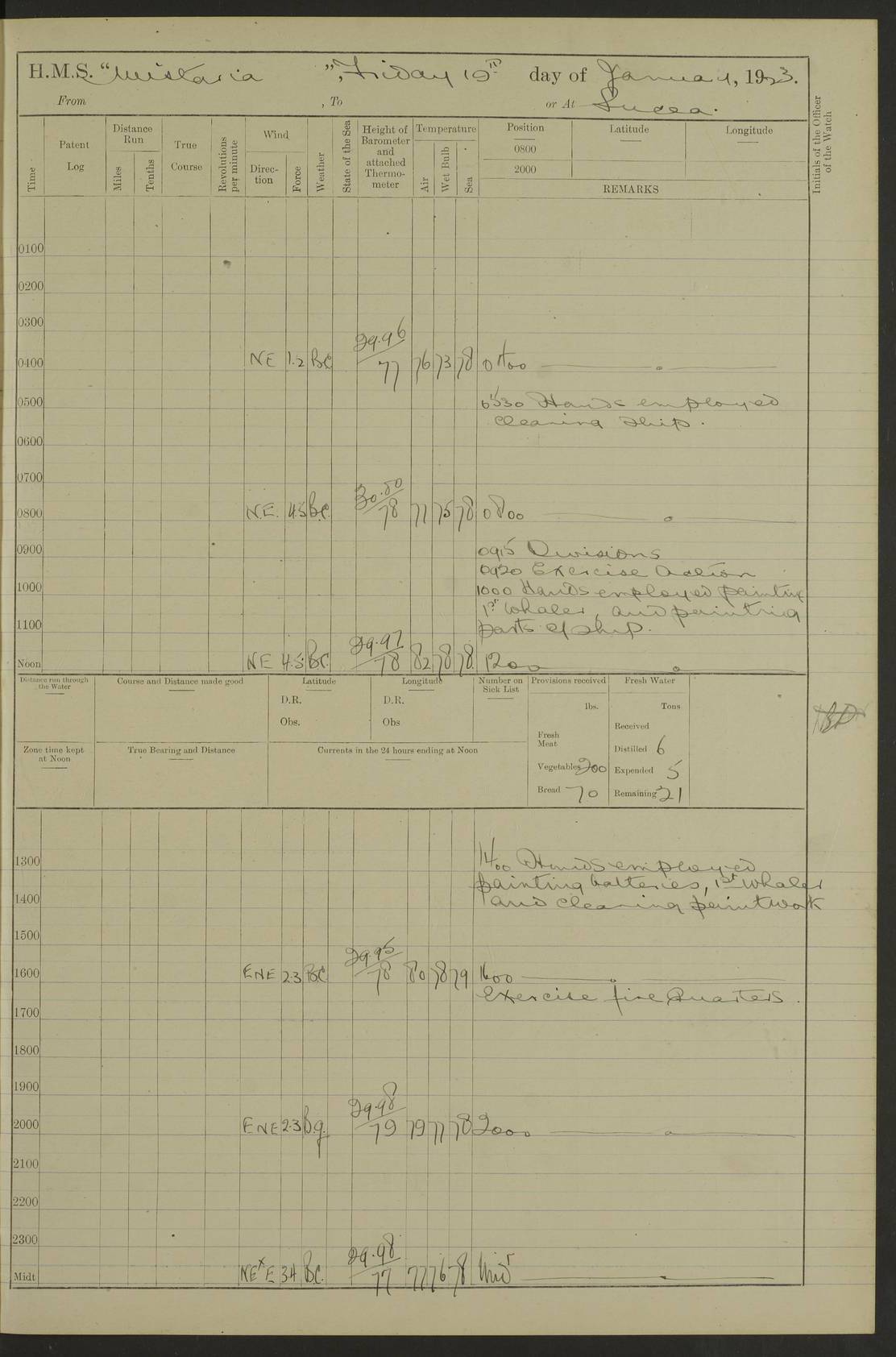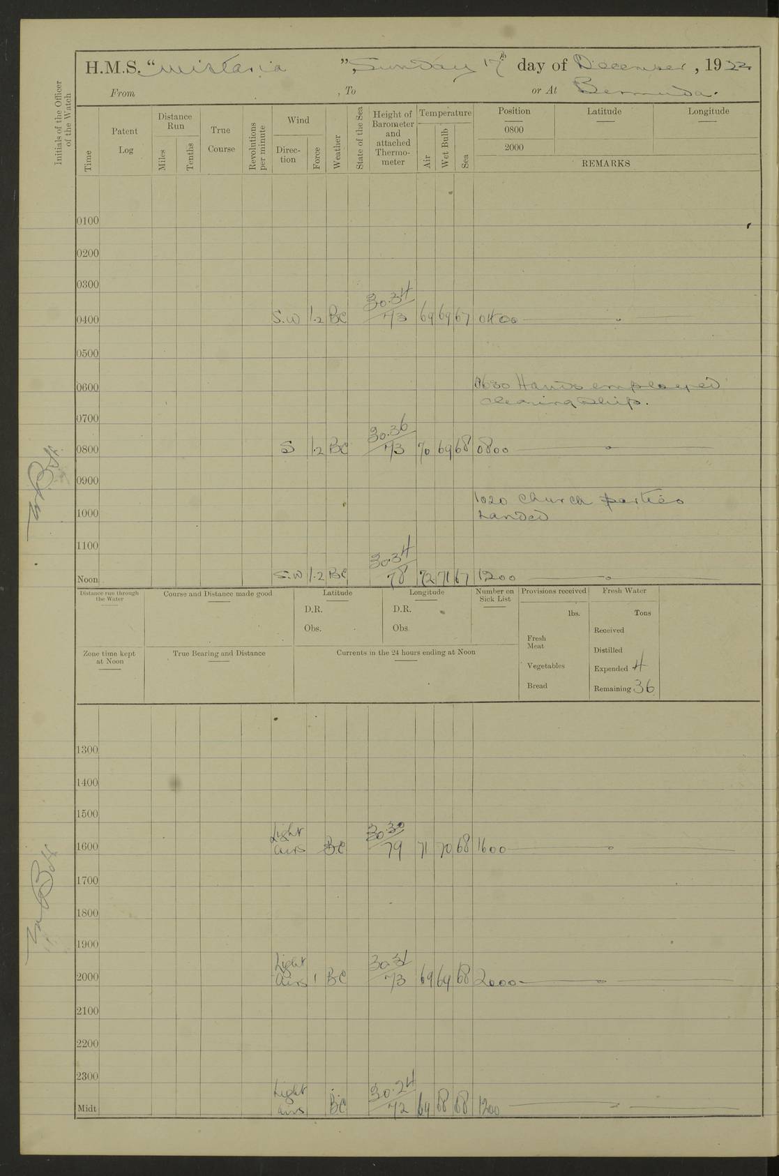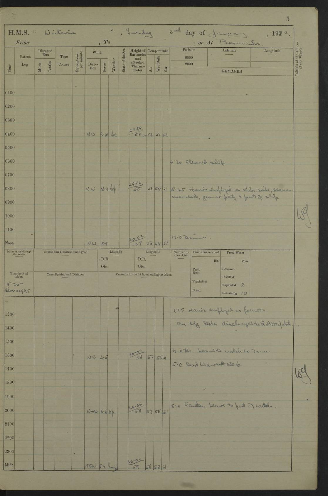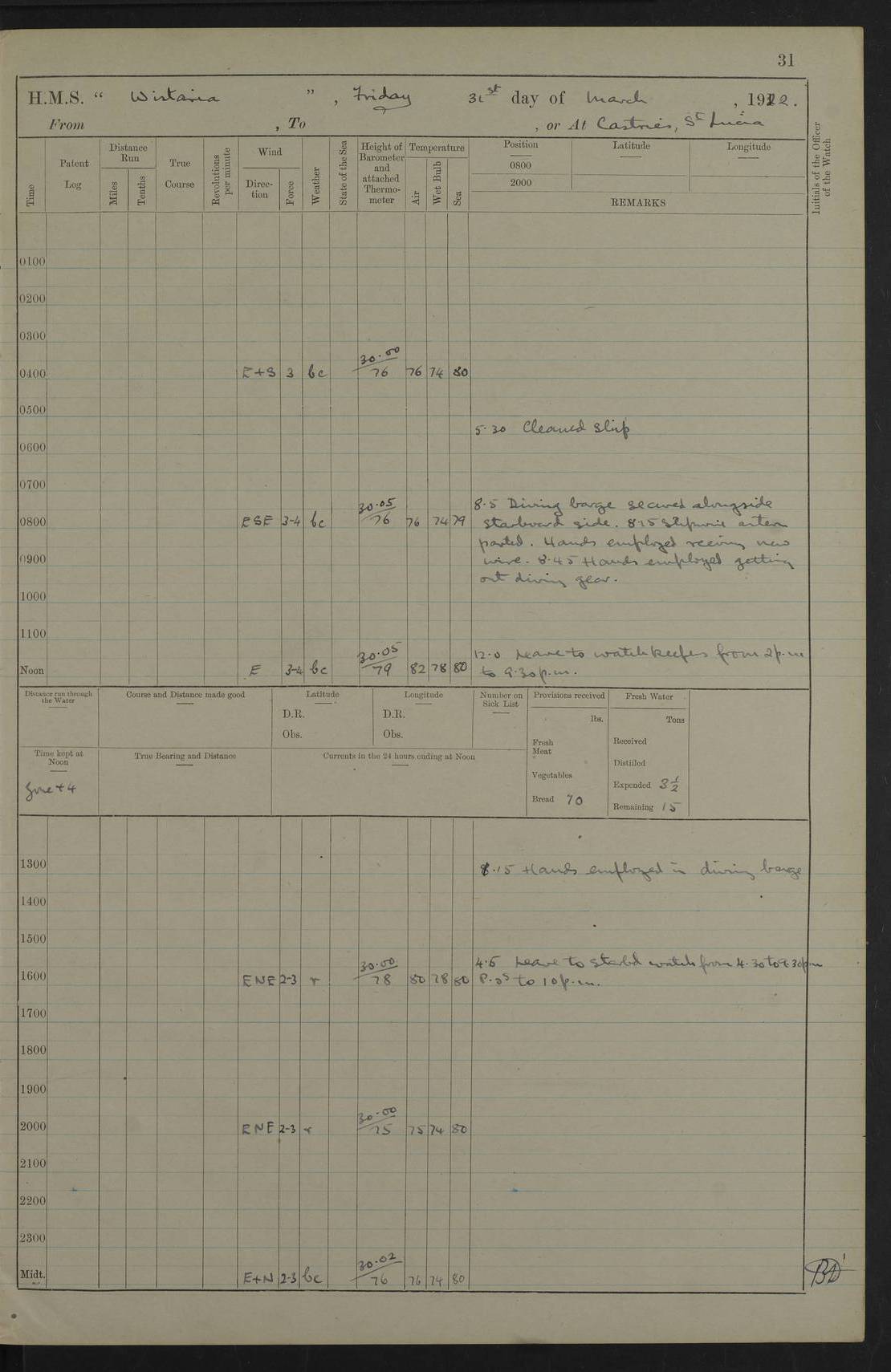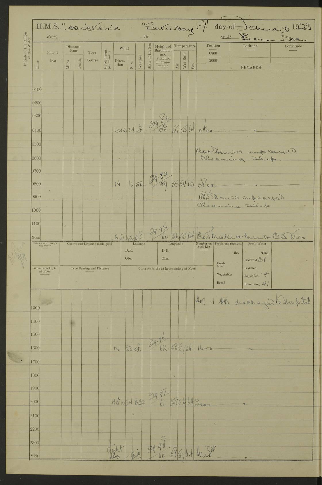LOGS FOR JANUARY 1922 4f73ca8aa2fc8ea903000b1b: (https://s3.amazonaws.com:443/oldweather/ADM53-93265/0003_1.jpg) 1 January 1922 At Bermuda Lat 32.32, Long -64.8 6.45am: Cleaned ship 10.45am: Church of England Church Party landed 4f73ca8aa2fc8ea903000b1c: (https://s3.amazonaws.com:443/oldweather/ADM53-93265/0004_0.jpg) 2 January 1922 At Bermuda Lat 32.32, Long -64.8 8.45am: Hands employed in seamen’s mess deck & parts of ship 1.15pm: Hands employed as forenoon 4f73ca8aa2fc8ea903000b1d: (https://s3.amazonaws.com:443/oldweather/ADM53-93265/0004_1.jpg) 3 January 1922 At Bermuda Lat 32.32, Long -64.8 8.45am: Hands employed on ship’s side, seamen's mess deck, gunner party & parts of ship 1.15pm: Hands employed as forenoon pm: One Ldg Stoker discharged to RN Hospital 5.0pm: Read Warrant No 6 4f73ca8ba2fc8ea903000b1e: (https://s3.amazonaws.com:443/oldweather/ADM53-93265/0005_0.jpg) 4 January 1922 At Bermuda Lat 32.32, Long -64.8 8.45am: Hands employed painting mess deck & drawing provisions 1.15pm: Hands employed painting seamen's mess deck; on ship’s side; gunner party & parts of ship 4f73ca8ba2fc8ea903000b1f: (https://s3.amazonaws.com:443/oldweather/ADM53-93265/0005_1.jpg) 5 January 1922 At Bermuda Lat 32.32, Long -64.8 8.0am: Hands employed on ship’s side; painting mess decks; refitting boats falls am: 1 Ldg Stoker returned from hospital 4f73ca8ba2fc8ea903000b20: (https://s3.amazonaws.com:443/oldweather/ADM53-93265/0006_0.jpg) 6 January 1922 At Bermuda Lat 32.32, Long -64.8 8.0am: Hands employed painting mess decks, chipping and redleading ship’s side, refitting boats falls 9.0am: Range party landed 1.30pm: Hands employed as forenoon 4f73ca8ca2fc8ea903000b21: (https://s3.amazonaws.com:443/oldweather/ADM53-93265/0006_1.jpg) 7 January 1922 At Bermuda Lat 32.32, Long -64.8 8.0am: Hands employed painting mess decks; side party & parts of ship 8.50am: Ord Sea, boys and stokers training class landed for field training exercises 10.30am: Shifted ship to coaling jetty 11.40am: Secured alongside 4f73ca8ca2fc8ea903000b22: (https://s3.amazonaws.com:443/oldweather/ADM53-93265/0007_0.jpg) 8 January 1922 At Bermuda Lat 32.32, Long -64.8 9.45am: Hands mustered by open list 10.15am: Church of England Church Party landed 4f73ca8da2fc8ea903000b23: (https://s3.amazonaws.com:443/oldweather/ADM53-93265/0007_1.jpg) 9 January 1922 At Bermuda Lat 32.32, Long -64.8 8.0am: Prepared for docking ship 8.25am: Docking party landed. Tug “St Abbs” secured alongside 9.30am: Proceeded into dock 9.55am: Secured in dock 10.30am: Hands employed scrubbing ship’s bottom 1.15pm: Hands employed scrubbing ship’s bottom and painting mess decks pm: 1 Stoker and 1 A.B. discharged to hospital 4f73ca8da2fc8ea903000b24: (https://s3.amazonaws.com:443/oldweather/ADM53-93265/0008_0.jpg) 10 January 1922 At Bermuda Lat 32.32, Long -64.8 8.0am: Hands employed on ship’s side, painting mess decks and about 4” gun for’d 1.15pm: Hands employed as forenoon 4f73ca8da2fc8ea903000b25: (https://s3.amazonaws.com:443/oldweather/ADM53-93265/0008_1.jpg) 11 January 1922 At Bermuda Lat 32.32, Long -64.8 8.0am: Hands employed painting mess decks, chipping side and refitting falls & life belts am: One A.B. discharged to hospital 1.15pm: Hands employed lowering anchors and cables into dock & ranging cable pm: One A.B. joined ship from hospital 4f73ca8ea2fc8ea903000b26: (https://s3.amazonaws.com:443/oldweather/ADM53-93265/0009_0.jpg) 12 January 1922 At Bermuda Lat 32.32, Long -64.8 8.0am: Hands employed chipping ship’s side, painting mess deck & part of ship 5.0pm: Fire Quarters 4f73ca8ea2fc8ea903000b27: (https://s3.amazonaws.com:443/oldweather/ADM53-93265/0009_1.jpg) 13 January 1922 At Bermuda Lat 32.32, Long -64.8 8.0am: Hands employed painting mess deck, chipping ship’s side and parts of ship 1.15pm: Hands employed painting down aloft and chipping ship’s side 4f73ca8ea2fc8ea903000b28: (https://s3.amazonaws.com:443/oldweather/ADM53-93265/0010_0.jpg) 14 January 1922 At Bermuda Lat 32.32, Long -64.8 8.0am: Hands employed on ship’s side, painting down aloft; and on foremost 4” gun 4f73ca8fa2fc8ea903000b29: (https://s3.amazonaws.com:443/oldweather/ADM53-93265/0010_1.jpg) 15 January 1922 At Bermuda Lat 32.32, Long -64.8 10.20am: Church of England church party landed 4f73ca8fa2fc8ea903000b2a: (https://s3.amazonaws.com:443/oldweather/ADM53-93265/0011_0.jpg) 16 January 1922 At Bermuda Lat 32.32, Long -64.8 8.0am: Hands employed painting ship’s bottom 1.15pm: Hands employed painting ship’s bottom 5.0pm: Exercised Fire Quarters 4f73ca8fa2fc8ea903000b2b: (https://s3.amazonaws.com:443/oldweather/ADM53-93265/0011_1.jpg) 17 January 1922 At Bermuda Lat 32.32, Long -64.8 8.0am: Hands employed stowing cable in cable lockers from dock and painting ship’s bottom 1.15pm: Hands employed as forenoon 4f73ca90a2fc8ea903000b2c: (https://s3.amazonaws.com:443/oldweather/ADM53-93265/0012_0.jpg) 18 January 1922 At Bermuda Lat 32.32, Long -64.8 8.0am: Hands prepared to shift ship 9.45am: Left floating dock & secured alongside coaling wharf 10.30am: Hands employed washing down funnels & parts of ship 1.15pm: Hands employed washing funnels, shipping motor boats davits and parts of ship 4f73ca90a2fc8ea903000b2d: (https://s3.amazonaws.com:443/oldweather/ADM53-93265/0012_1.jpg) 19 January 1922 At Bermuda Lat 32.32, Long -64.8 8.0am: Hands employed chipping & painting ship’s side, stripping & cleaning 4” guns and parts of ship 8.15am: RFA “Plumleaf” left basin 9.15am: CH 14 left basin 10.35: Shifted from coaling wharf to 40 ft fender in North Basin 4f73ca91a2fc8ea903000b2e: (https://s3.amazonaws.com:443/oldweather/ADM53-93265/0013_0.jpg) 20 January 1922 At Bermuda Lat 32.32, Long -64.8 8.0am: Hands employed chipping and scraping ship’s side, about aft 4” gun and parts of ship 10.20am: Replace 2nd whaler davits. Lowered 1st whaler davits into deck 1 hand scrubber lost by accident 1.15pm: Hands employed chipping & painting ship’s side. Dismountin