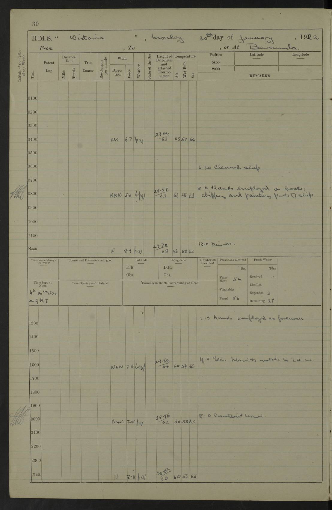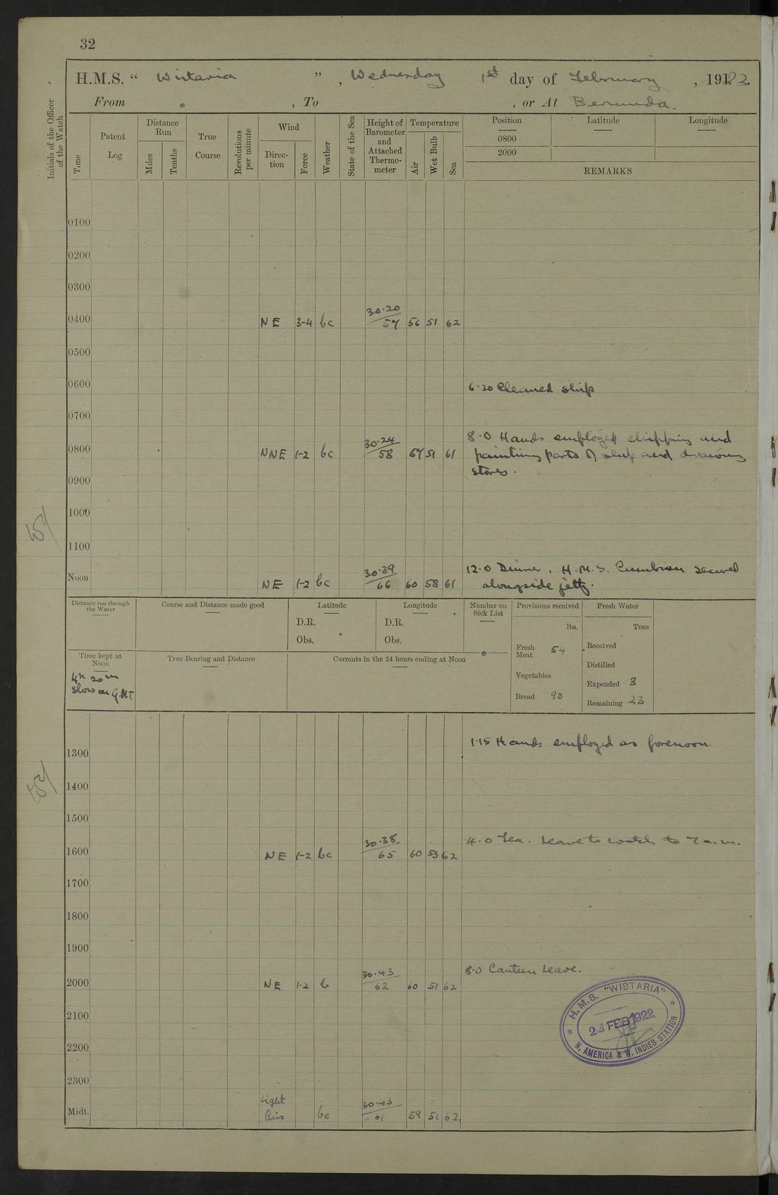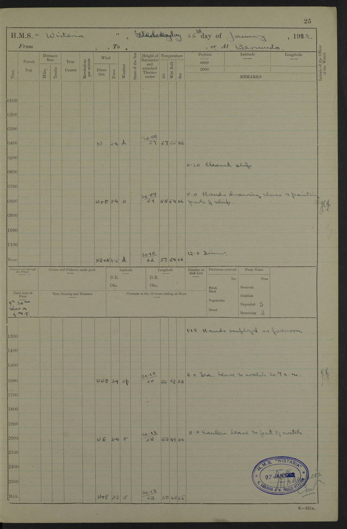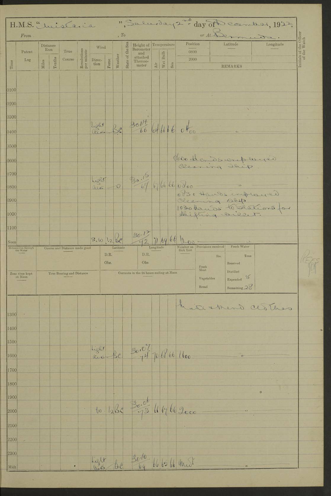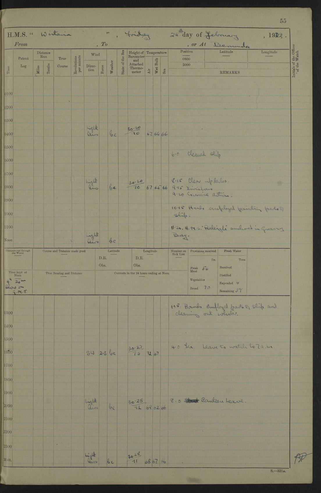 LOGS FOR JANUARY 1922 4f73ca8aa2fc8ea903000b1b: (https://s3.amazonaws.com:443/oldweather/ADM53-93265/0003_1.jpg) 1 January 1922 At Bermuda Lat 32.32, Long -64.8 6.45am: Cleaned ship 10.45am: Church of England Church Party landed 4f73ca8aa2fc8ea903000b1c: (https://s3.amazonaws.com:443/oldweather/ADM53-93265/0004_0.jpg) 2 January 1922 At Bermuda Lat 32.32, Long -64.8 8.45am: Hands employed in seamen’s mess deck & parts of ship 1.15pm: Hands employed as forenoon 4f73ca8aa2fc8ea903000b1d: (https://s3.amazonaws.com:443/oldweather/ADM53-93265/0004_1.jpg) 3 January 1922 At Bermuda Lat 32.32, Long -64.8 8.45am: Hands employed on ship’s side, seamen's mess deck, gunner party & parts of ship 1.15pm: Hands employed as forenoon pm: One Ldg Stoker discharged to RN Hospital 5.0pm: Read Warrant No 6 4f73ca8ba2fc8ea903000b1e: (https://s3.amazonaws.com:443/oldweather/ADM53-93265/0005_0.jpg) 4 January 1922 At Bermuda Lat 32.32, Long -64.8 8.45am: Hands employed painting mess deck & drawing provisions 1.15pm: Hands employed painting seamen's mess deck; on ship’s side; gunner party & parts of ship 4f73ca8ba2fc8ea903000b1f: (https://s3.amazonaws.com:443/oldweather/ADM53-93265/0005_1.jpg) 5 January 1922 At Bermuda Lat 32.32, Long -64.8 8.0am: Hands employed on ship’s side; painting mess decks; refitting boats falls am: 1 Ldg Stoker returned from hospital 4f73ca8ba2fc8ea903000b20: (https://s3.amazonaws.com:443/oldweather/ADM53-93265/0006_0.jpg) 6 January 1922 At Bermuda Lat 32.32, Long -64.8 8.0am: Hands employed painting mess decks, chipping and redleading ship’s side, refitting boats falls 9.0am: Range party landed 1.30pm: Hands employed as forenoon 4f73ca8ca2fc8ea903000b21: (https://s3.amazonaws.com:443/oldweather/ADM53-93265/0006_1.jpg) 7 January 1922 At Bermuda Lat 32.32, Long -64.8 8.0am: Hands employed painting mess decks; side party & parts of ship 8.50am: Ord Sea, boys and stokers training class landed for field training exercises 10.30am: Shifted ship to coaling jetty 11.40am: Secured alongside 4f73ca8ca2fc8ea903000b22: (https://s3.amazonaws.com:443/oldweather/ADM53-93265/0007_0.jpg) 8 January 1922 At Bermuda Lat 32.32, Long -64.8 9.45am: Hands mustered by open list 10.15am: Church of England Church Party landed 4f73ca8da2fc8ea903000b23: (https://s3.amazonaws.com:443/oldweather/ADM53-93265/0007_1.jpg) 9 January 1922 At Bermuda Lat 32.32, Long -64.8 8.0am: Prepared for docking ship 8.25am: Docking party landed. Tug “St Abbs” secured alongside 9.30am: Proceeded into dock 9.55am: Secured in dock 10.30am: Hands employed scrubbing ship’s bottom 1.15pm: Hands employed scrubbing ship’s bottom and painting mess decks pm: 1 Stoker and 1 A.B. discharged to hospital 4f73ca8da2fc8ea903000b24: (https://s3.amazonaws.com:443/oldweather/ADM53-93265/0008_0.jpg) 10 January 1922 At Bermuda Lat 32.32, Long -64.8 8.0am: Hands employed on ship’s side, painting mess decks and about 4” gun for’d 1.15pm: Hands employed as forenoon 4f73ca8da2fc8ea903000b25: (https://s3.amazonaws.com:443/oldweather/ADM53-93265/0008_1.jpg) 11 January 1922 At Bermuda Lat 32.32, Long -64.8 8.0am: Hands employed painting mess decks, chipping side and refitting falls & life belts am: One A.B. discharged to hospital 1.15pm: Hands employed lowering anchors and cables into dock & ranging cable pm: One A.B. joined ship from hospital 4f73ca8ea2fc8ea903000b26: (https://s3.amazonaws.com:443/oldweather/ADM53-93265/0009_0.jpg) 12 January 1922 At Bermuda Lat 32.32, Long -64.8 8.0am: Hands employed chipping ship’s side, painting mess deck & part of ship 5.0pm: Fire Quarters 4f73ca8ea2fc8ea903000b27: (https://s3.amazonaws.com:443/oldweather/ADM53-93265/0009_1.jpg) 13 January 1922 At Bermuda Lat 32.32, Long -64.8 8.0am: Hands employed painting mess deck, chipping ship’s side and parts of ship 1.15pm: Hands employed painting down aloft and chipping ship’s side 4f73ca8ea2fc8ea903000b28: (https://s3.amazonaws.com:443/oldweather/ADM53-93265/0010_0.jpg) 14 January 1922 At Bermuda Lat 32.32, Long -64.8 8.0am: Hands employed on ship’s side, painting down aloft; and on foremost 4” gun 4f73ca8fa2fc8ea903000b29: (https://s3.amazonaws.com:443/oldweather/ADM53-93265/0010_1.jpg) 15 January 1922 At Bermuda Lat 32.32, Long -64.8 10.20am: Church of England church party landed 4f73ca8fa2fc8ea903000b2a: (https://s3.amazonaws.com:443/oldweather/ADM53-93265/0011_0.jpg) 16 January 1922 At Bermuda Lat 32.32, Long -64.8 8.0am: Hands employed painting ship’s bottom 1.15pm: Hands employed painting ship’s bottom 5.0pm: Exercised Fire Quarters 4f73ca8fa2fc8ea903000b2b: (https://s3.amazonaws.com:443/oldweather/ADM53-93265/0011_1.jpg) 17 January 1922 At Bermuda Lat 32.32, Long -64.8 8.0am: Hands employed stowing cable in cable lockers from dock and painting ship’s bottom 1.15pm: Hands employed as forenoon 4f73ca90a2fc8ea903000b2c: (https://s3.amazonaws.com:443/oldweather/ADM53-93265/0012_0.jpg) 18 January 1922 At Bermuda Lat 32.32, Long -64.8 8.0am: Hands prepared to shift ship 9.45am: Left floating dock & secured alongside coaling wharf 10.30am: Hands employed washing down funnels & parts of ship 1.15pm: Hands employed washing funnels, shipping motor boats davits and parts of ship 4f73ca90a2fc8ea903000b2d: (https://s3.amazonaws.com:443/oldweather/ADM53-93265/0012_1.jpg) 19 January 1922 At Bermuda Lat 32.32, Long -64.8 8.0am: Hands employed chipping & painting ship’s side, stripping & cleaning 4” guns and parts of ship 8.15am: RFA “Plumleaf” left basin 9.15am: CH 14 left basin 10.35: Shifted from coaling wharf to 40 ft fender in North Basin 4f73ca91a2fc8ea903000b2e: (https://s3.amazonaws.com:443/oldweather/ADM53-93265/0013_0.jpg) 20 January 1922 At Bermuda Lat 32.32, Long -64.8 8.0am: Hands employed chipping and scraping ship’s side, about aft 4” gun and parts of ship 10.20am: Replace 2nd whaler davits. Lowered 1st whaler davits into deck 1 hand scrubber lost by accident 1.15pm: Hands employed chipping & painting ship’s side. Dismountin
