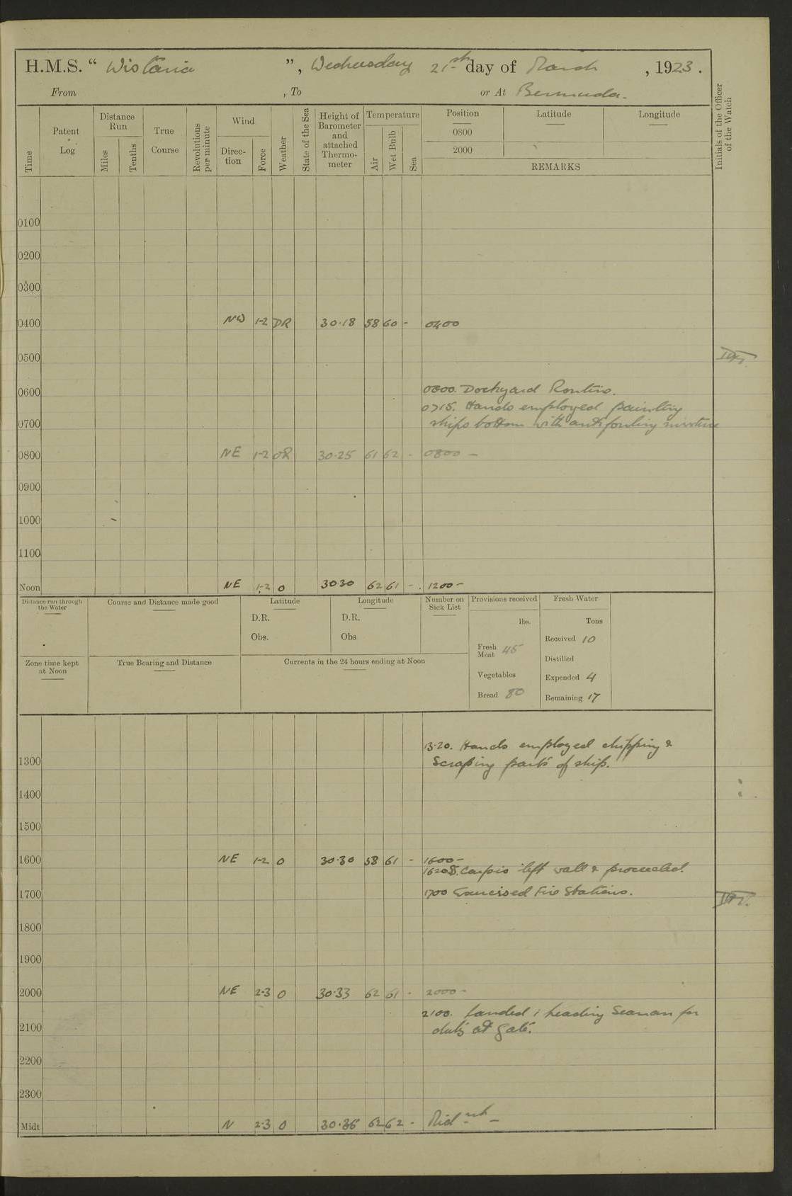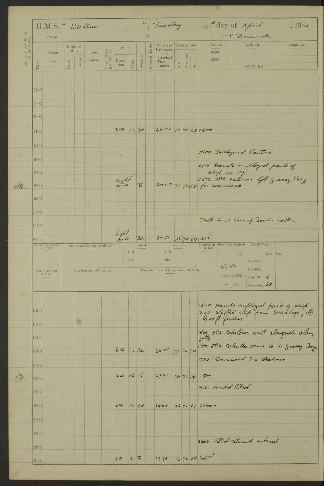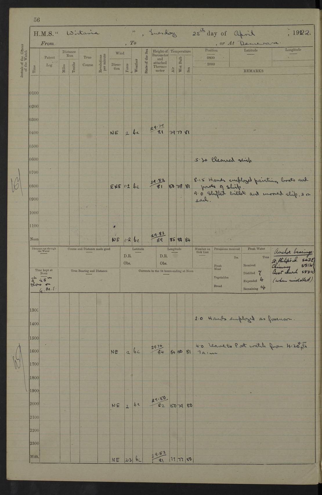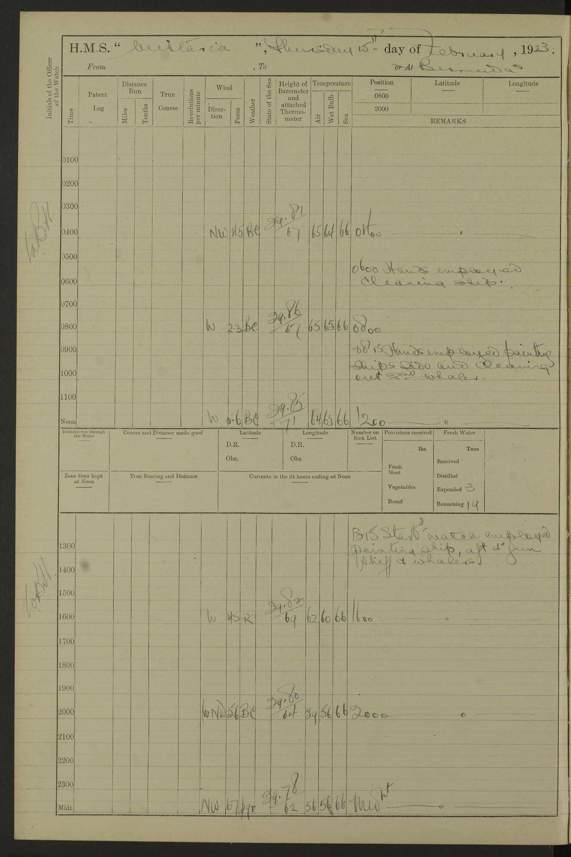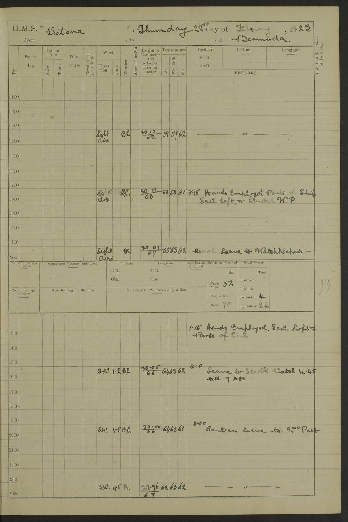 LOGS FOR JANUARY 1922 4f73ca8aa2fc8ea903000b1b: (https://s3.amazonaws.com:443/oldweather/ADM53-93265/0003_1.jpg) 1 January 1922 At Bermuda Lat 32.32, Long -64.8 6.45am: Cleaned ship 10.45am: Church of England Church Party landed 4f73ca8aa2fc8ea903000b1c: (https://s3.amazonaws.com:443/oldweather/ADM53-93265/0004_0.jpg) 2 January 1922 At Bermuda Lat 32.32, Long -64.8 8.45am: Hands employed in seamen’s mess deck & parts of ship 1.15pm: Hands employed as forenoon 4f73ca8aa2fc8ea903000b1d: (https://s3.amazonaws.com:443/oldweather/ADM53-93265/0004_1.jpg) 3 January 1922 At Bermuda Lat 32.32, Long -64.8 8.45am: Hands employed on ship’s side, seamen's mess deck, gunner party & parts of ship 1.15pm: Hands employed as forenoon pm: One Ldg Stoker discharged to RN Hospital 5.0pm: Read Warrant No 6 4f73ca8ba2fc8ea903000b1e: (https://s3.amazonaws.com:443/oldweather/ADM53-93265/0005_0.jpg) 4 January 1922 At Bermuda Lat 32.32, Long -64.8 8.45am: Hands employed painting mess deck & drawing provisions 1.15pm: Hands employed painting seamen's mess deck; on ship’s side; gunner party & parts of ship 4f73ca8ba2fc8ea903000b1f: (https://s3.amazonaws.com:443/oldweather/ADM53-93265/0005_1.jpg) 5 January 1922 At Bermuda Lat 32.32, Long -64.8 8.0am: Hands employed on ship’s side; painting mess decks; refitting boats falls am: 1 Ldg Stoker returned from hospital 4f73ca8ba2fc8ea903000b20: (https://s3.amazonaws.com:443/oldweather/ADM53-93265/0006_0.jpg) 6 January 1922 At Bermuda Lat 32.32, Long -64.8 8.0am: Hands employed painting mess decks, chipping and redleading ship’s side, refitting boats falls 9.0am: Range party landed 1.30pm: Hands employed as forenoon 4f73ca8ca2fc8ea903000b21: (https://s3.amazonaws.com:443/oldweather/ADM53-93265/0006_1.jpg) 7 January 1922 At Bermuda Lat 32.32, Long -64.8 8.0am: Hands employed painting mess decks; side party & parts of ship 8.50am: Ord Sea, boys and stokers training class landed for field training exercises 10.30am: Shifted ship to coaling jetty 11.40am: Secured alongside 4f73ca8ca2fc8ea903000b22: (https://s3.amazonaws.com:443/oldweather/ADM53-93265/0007_0.jpg) 8 January 1922 At Bermuda Lat 32.32, Long -64.8 9.45am: Hands mustered by open list 10.15am: Church of England Church Party landed 4f73ca8da2fc8ea903000b23: (https://s3.amazonaws.com:443/oldweather/ADM53-93265/0007_1.jpg) 9 January 1922 At Bermuda Lat 32.32, Long -64.8 8.0am: Prepared for docking ship 8.25am: Docking party landed. Tug “St Abbs” secured alongside 9.30am: Proceeded into dock 9.55am: Secured in dock 10.30am: Hands employed scrubbing ship’s bottom 1.15pm: Hands employed scrubbing ship’s bottom and painting mess decks pm: 1 Stoker and 1 A.B. discharged to hospital 4f73ca8da2fc8ea903000b24: (https://s3.amazonaws.com:443/oldweather/ADM53-93265/0008_0.jpg) 10 January 1922 At Bermuda Lat 32.32, Long -64.8 8.0am: Hands employed on ship’s side, painting mess decks and about 4” gun for’d 1.15pm: Hands employed as forenoon 4f73ca8da2fc8ea903000b25: (https://s3.amazonaws.com:443/oldweather/ADM53-93265/0008_1.jpg) 11 January 1922 At Bermuda Lat 32.32, Long -64.8 8.0am: Hands employed painting mess decks, chipping side and refitting falls & life belts am: One A.B. discharged to hospital 1.15pm: Hands employed lowering anchors and cables into dock & ranging cable pm: One A.B. joined ship from hospital 4f73ca8ea2fc8ea903000b26: (https://s3.amazonaws.com:443/oldweather/ADM53-93265/0009_0.jpg) 12 January 1922 At Bermuda Lat 32.32, Long -64.8 8.0am: Hands employed chipping ship’s side, painting mess deck & part of ship 5.0pm: Fire Quarters 4f73ca8ea2fc8ea903000b27: (https://s3.amazonaws.com:443/oldweather/ADM53-93265/0009_1.jpg) 13 January 1922 At Bermuda Lat 32.32, Long -64.8 8.0am: Hands employed painting mess deck, chipping ship’s side and parts of ship 1.15pm: Hands employed painting down aloft and chipping ship’s side 4f73ca8ea2fc8ea903000b28: (https://s3.amazonaws.com:443/oldweather/ADM53-93265/0010_0.jpg) 14 January 1922 At Bermuda Lat 32.32, Long -64.8 8.0am: Hands employed on ship’s side, painting down aloft; and on foremost 4” gun 4f73ca8fa2fc8ea903000b29: (https://s3.amazonaws.com:443/oldweather/ADM53-93265/0010_1.jpg) 15 January 1922 At Bermuda Lat 32.32, Long -64.8 10.20am: Church of England church party landed 4f73ca8fa2fc8ea903000b2a: (https://s3.amazonaws.com:443/oldweather/ADM53-93265/0011_0.jpg) 16 January 1922 At Bermuda Lat 32.32, Long -64.8 8.0am: Hands employed painting ship’s bottom 1.15pm: Hands employed painting ship’s bottom 5.0pm: Exercised Fire Quarters 4f73ca8fa2fc8ea903000b2b: (https://s3.amazonaws.com:443/oldweather/ADM53-93265/0011_1.jpg) 17 January 1922 At Bermuda Lat 32.32, Long -64.8 8.0am: Hands employed stowing cable in cable lockers from dock and painting ship’s bottom 1.15pm: Hands employed as forenoon 4f73ca90a2fc8ea903000b2c: (https://s3.amazonaws.com:443/oldweather/ADM53-93265/0012_0.jpg) 18 January 1922 At Bermuda Lat 32.32, Long -64.8 8.0am: Hands prepared to shift ship 9.45am: Left floating dock & secured alongside coaling wharf 10.30am: Hands employed washing down funnels & parts of ship 1.15pm: Hands employed washing funnels, shipping motor boats davits and parts of ship 4f73ca90a2fc8ea903000b2d: (https://s3.amazonaws.com:443/oldweather/ADM53-93265/0012_1.jpg) 19 January 1922 At Bermuda Lat 32.32, Long -64.8 8.0am: Hands employed chipping & painting ship’s side, stripping & cleaning 4” guns and parts of ship 8.15am: RFA “Plumleaf” left basin 9.15am: CH 14 left basin 10.35: Shifted from coaling wharf to 40 ft fender in North Basin 4f73ca91a2fc8ea903000b2e: (https://s3.amazonaws.com:443/oldweather/ADM53-93265/0013_0.jpg) 20 January 1922 At Bermuda Lat 32.32, Long -64.8 8.0am: Hands employed chipping and scraping ship’s side, about aft 4” gun and parts of ship 10.20am: Replace 2nd whaler davits. Lowered 1st whaler davits into deck 1 hand scrubber lost by accident 1.15pm: Hands employed chipping & painting ship’s side. Dismountin