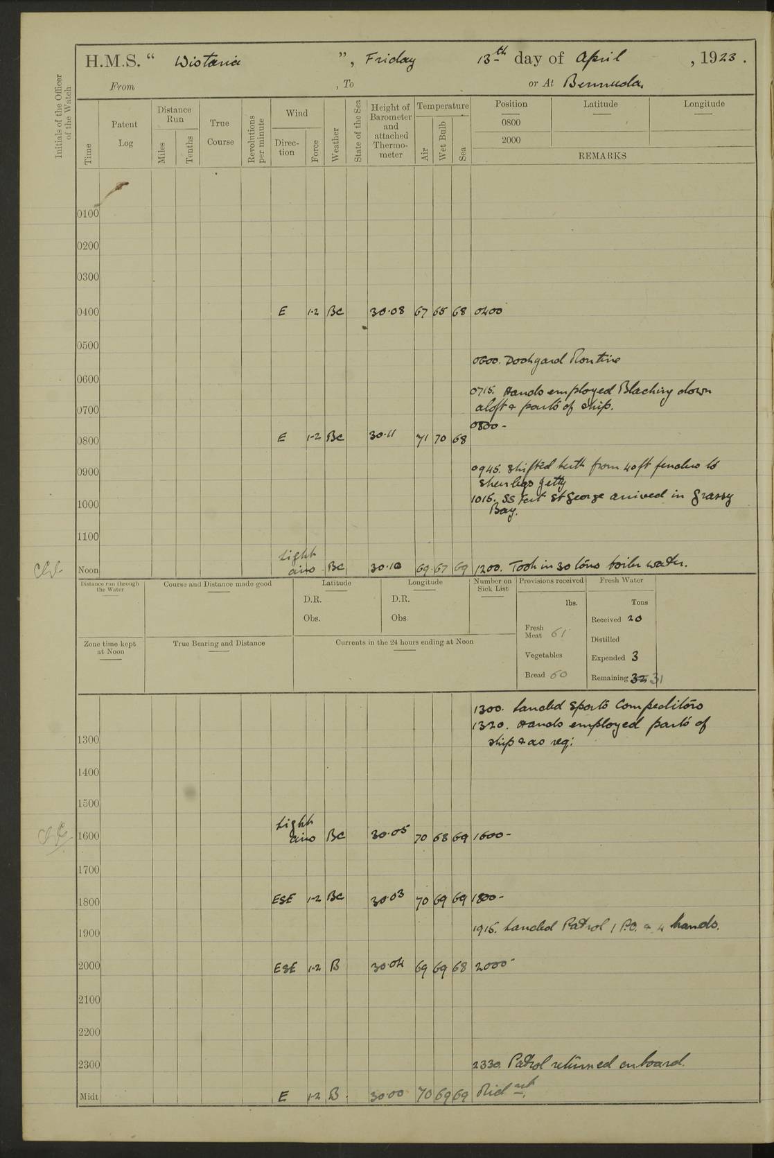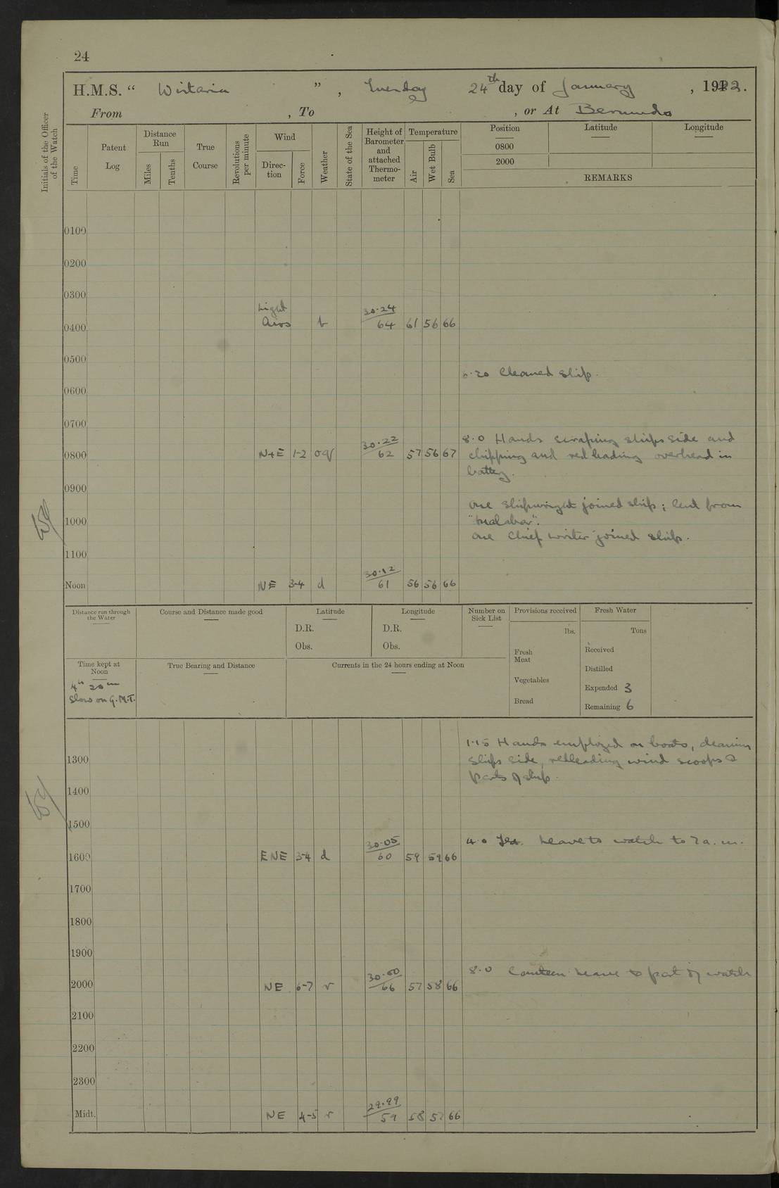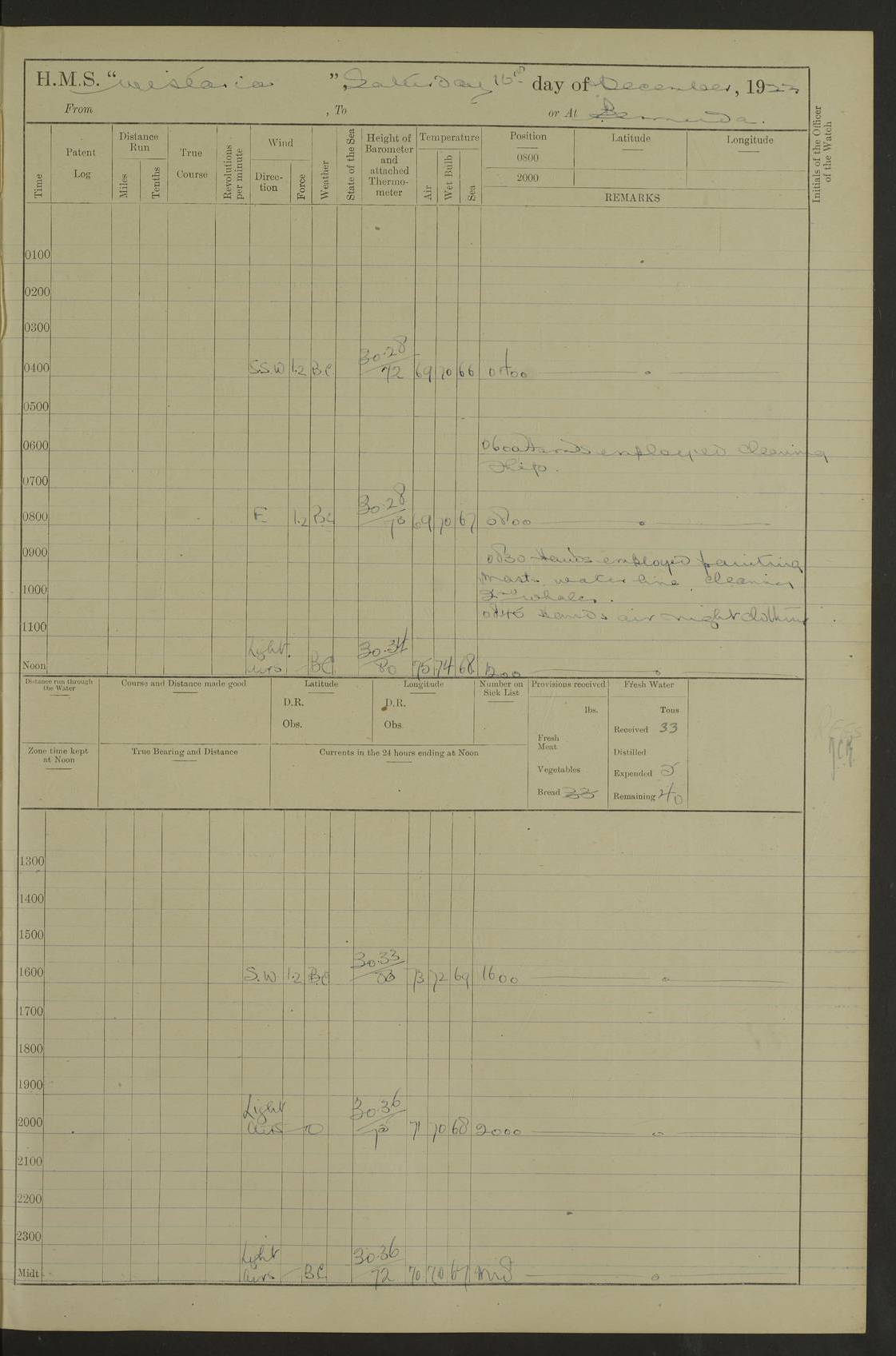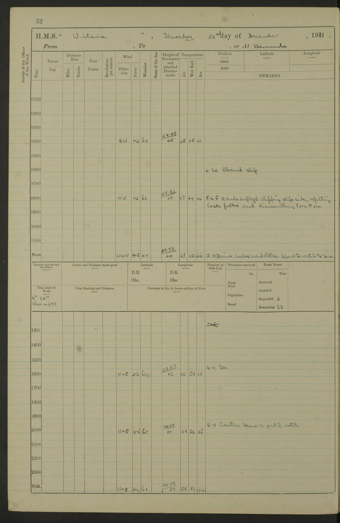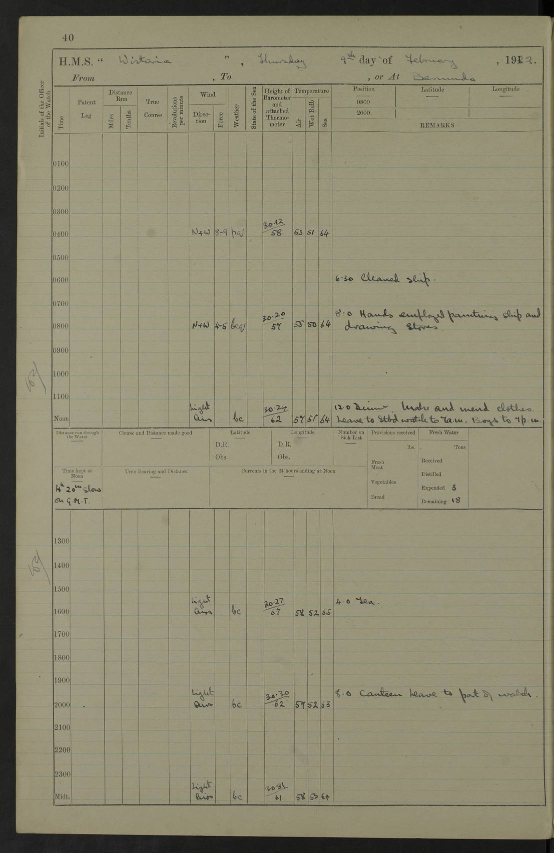 LOGS FOR JANUARY 1922 4f73ca8aa2fc8ea903000b1b: (https://s3.amazonaws.com:443/oldweather/ADM53-93265/0003_1.jpg) 1 January 1922 At Bermuda Lat 32.32, Long -64.8 6.45am: Cleaned ship 10.45am: Church of England Church Party landed 4f73ca8aa2fc8ea903000b1c: (https://s3.amazonaws.com:443/oldweather/ADM53-93265/0004_0.jpg) 2 January 1922 At Bermuda Lat 32.32, Long -64.8 8.45am: Hands employed in seamen’s mess deck & parts of ship 1.15pm: Hands employed as forenoon 4f73ca8aa2fc8ea903000b1d: (https://s3.amazonaws.com:443/oldweather/ADM53-93265/0004_1.jpg) 3 January 1922 At Bermuda Lat 32.32, Long -64.8 8.45am: Hands employed on ship’s side, seamen's mess deck, gunner party & parts of ship 1.15pm: Hands employed as forenoon pm: One Ldg Stoker discharged to RN Hospital 5.0pm: Read Warrant No 6 4f73ca8ba2fc8ea903000b1e: (https://s3.amazonaws.com:443/oldweather/ADM53-93265/0005_0.jpg) 4 January 1922 At Bermuda Lat 32.32, Long -64.8 8.45am: Hands employed painting mess deck & drawing provisions 1.15pm: Hands employed painting seamen's mess deck; on ship’s side; gunner party & parts of ship 4f73ca8ba2fc8ea903000b1f: (https://s3.amazonaws.com:443/oldweather/ADM53-93265/0005_1.jpg) 5 January 1922 At Bermuda Lat 32.32, Long -64.8 8.0am: Hands employed on ship’s side; painting mess decks; refitting boats falls am: 1 Ldg Stoker returned from hospital 4f73ca8ba2fc8ea903000b20: (https://s3.amazonaws.com:443/oldweather/ADM53-93265/0006_0.jpg) 6 January 1922 At Bermuda Lat 32.32, Long -64.8 8.0am: Hands employed painting mess decks, chipping and redleading ship’s side, refitting boats falls 9.0am: Range party landed 1.30pm: Hands employed as forenoon 4f73ca8ca2fc8ea903000b21: (https://s3.amazonaws.com:443/oldweather/ADM53-93265/0006_1.jpg) 7 January 1922 At Bermuda Lat 32.32, Long -64.8 8.0am: Hands employed painting mess decks; side party & parts of ship 8.50am: Ord Sea, boys and stokers training class landed for field training exercises 10.30am: Shifted ship to coaling jetty 11.40am: Secured alongside 4f73ca8ca2fc8ea903000b22: (https://s3.amazonaws.com:443/oldweather/ADM53-93265/0007_0.jpg) 8 January 1922 At Bermuda Lat 32.32, Long -64.8 9.45am: Hands mustered by open list 10.15am: Church of England Church Party landed 4f73ca8da2fc8ea903000b23: (https://s3.amazonaws.com:443/oldweather/ADM53-93265/0007_1.jpg) 9 January 1922 At Bermuda Lat 32.32, Long -64.8 8.0am: Prepared for docking ship 8.25am: Docking party landed. Tug “St Abbs” secured alongside 9.30am: Proceeded into dock 9.55am: Secured in dock 10.30am: Hands employed scrubbing ship’s bottom 1.15pm: Hands employed scrubbing ship’s bottom and painting mess decks pm: 1 Stoker and 1 A.B. discharged to hospital 4f73ca8da2fc8ea903000b24: (https://s3.amazonaws.com:443/oldweather/ADM53-93265/0008_0.jpg) 10 January 1922 At Bermuda Lat 32.32, Long -64.8 8.0am: Hands employed on ship’s side, painting mess decks and about 4” gun for’d 1.15pm: Hands employed as forenoon 4f73ca8da2fc8ea903000b25: (https://s3.amazonaws.com:443/oldweather/ADM53-93265/0008_1.jpg) 11 January 1922 At Bermuda Lat 32.32, Long -64.8 8.0am: Hands employed painting mess decks, chipping side and refitting falls & life belts am: One A.B. discharged to hospital 1.15pm: Hands employed lowering anchors and cables into dock & ranging cable pm: One A.B. joined ship from hospital 4f73ca8ea2fc8ea903000b26: (https://s3.amazonaws.com:443/oldweather/ADM53-93265/0009_0.jpg) 12 January 1922 At Bermuda Lat 32.32, Long -64.8 8.0am: Hands employed chipping ship’s side, painting mess deck & part of ship 5.0pm: Fire Quarters 4f73ca8ea2fc8ea903000b27: (https://s3.amazonaws.com:443/oldweather/ADM53-93265/0009_1.jpg) 13 January 1922 At Bermuda Lat 32.32, Long -64.8 8.0am: Hands employed painting mess deck, chipping ship’s side and parts of ship 1.15pm: Hands employed painting down aloft and chipping ship’s side 4f73ca8ea2fc8ea903000b28: (https://s3.amazonaws.com:443/oldweather/ADM53-93265/0010_0.jpg) 14 January 1922 At Bermuda Lat 32.32, Long -64.8 8.0am: Hands employed on ship’s side, painting down aloft; and on foremost 4” gun 4f73ca8fa2fc8ea903000b29: (https://s3.amazonaws.com:443/oldweather/ADM53-93265/0010_1.jpg) 15 January 1922 At Bermuda Lat 32.32, Long -64.8 10.20am: Church of England church party landed 4f73ca8fa2fc8ea903000b2a: (https://s3.amazonaws.com:443/oldweather/ADM53-93265/0011_0.jpg) 16 January 1922 At Bermuda Lat 32.32, Long -64.8 8.0am: Hands employed painting ship’s bottom 1.15pm: Hands employed painting ship’s bottom 5.0pm: Exercised Fire Quarters 4f73ca8fa2fc8ea903000b2b: (https://s3.amazonaws.com:443/oldweather/ADM53-93265/0011_1.jpg) 17 January 1922 At Bermuda Lat 32.32, Long -64.8 8.0am: Hands employed stowing cable in cable lockers from dock and painting ship’s bottom 1.15pm: Hands employed as forenoon 4f73ca90a2fc8ea903000b2c: (https://s3.amazonaws.com:443/oldweather/ADM53-93265/0012_0.jpg) 18 January 1922 At Bermuda Lat 32.32, Long -64.8 8.0am: Hands prepared to shift ship 9.45am: Left floating dock & secured alongside coaling wharf 10.30am: Hands employed washing down funnels & parts of ship 1.15pm: Hands employed washing funnels, shipping motor boats davits and parts of ship 4f73ca90a2fc8ea903000b2d: (https://s3.amazonaws.com:443/oldweather/ADM53-93265/0012_1.jpg) 19 January 1922 At Bermuda Lat 32.32, Long -64.8 8.0am: Hands employed chipping & painting ship’s side, stripping & cleaning 4” guns and parts of ship 8.15am: RFA “Plumleaf” left basin 9.15am: CH 14 left basin 10.35: Shifted from coaling wharf to 40 ft fender in North Basin 4f73ca91a2fc8ea903000b2e: (https://s3.amazonaws.com:443/oldweather/ADM53-93265/0013_0.jpg) 20 January 1922 At Bermuda Lat 32.32, Long -64.8 8.0am: Hands employed chipping and scraping ship’s side, about aft 4” gun and parts of ship 10.20am: Replace 2nd whaler davits. Lowered 1st whaler davits into deck 1 hand scrubber lost by accident 1.15pm: Hands employed chipping & painting ship’s side. Dismountin