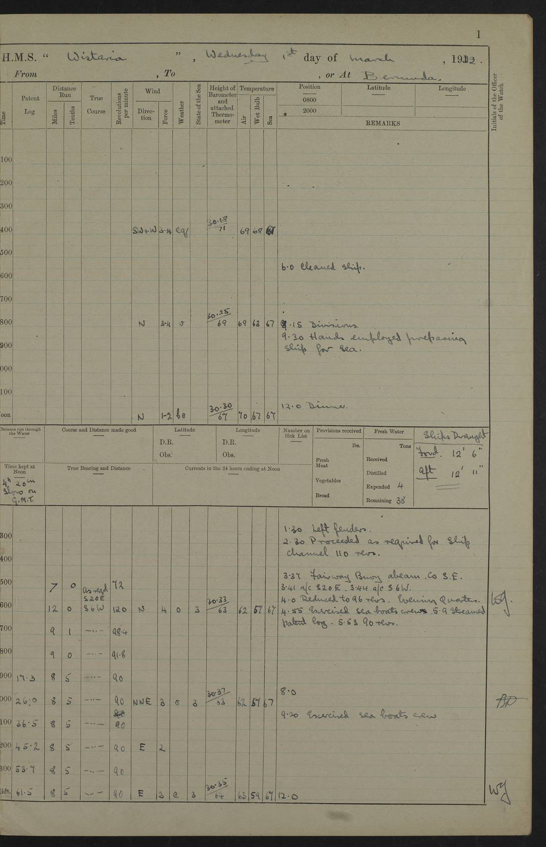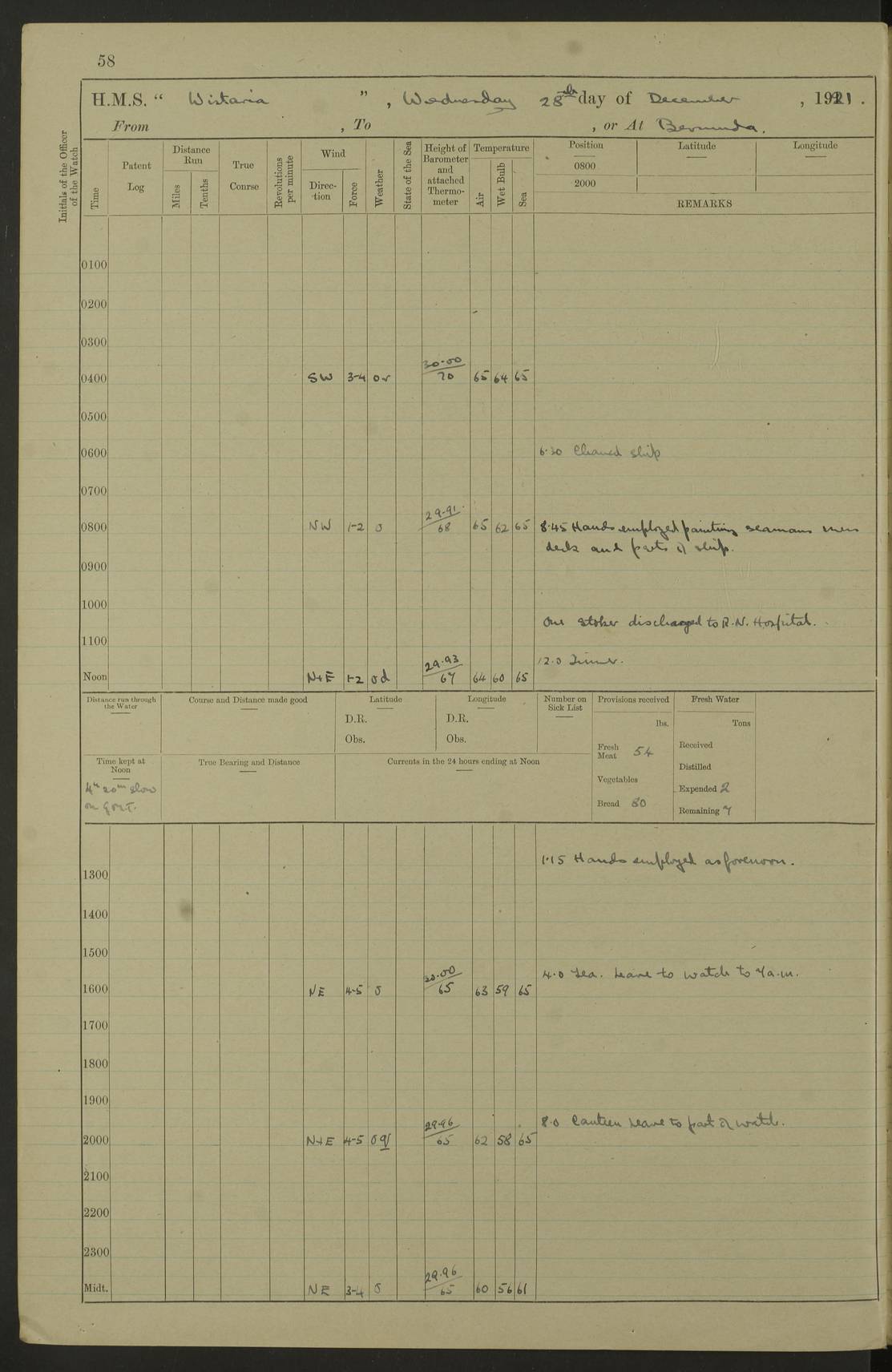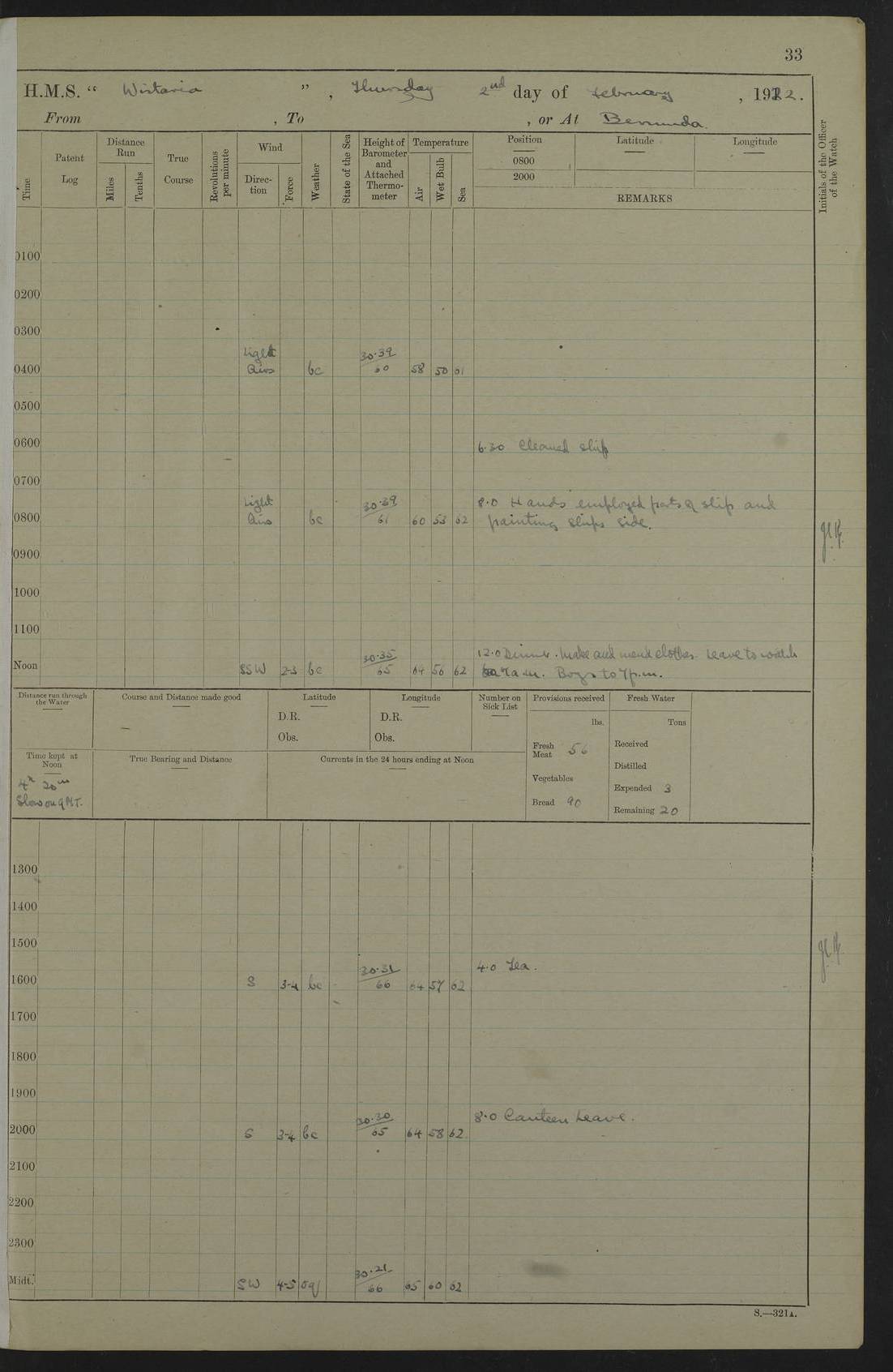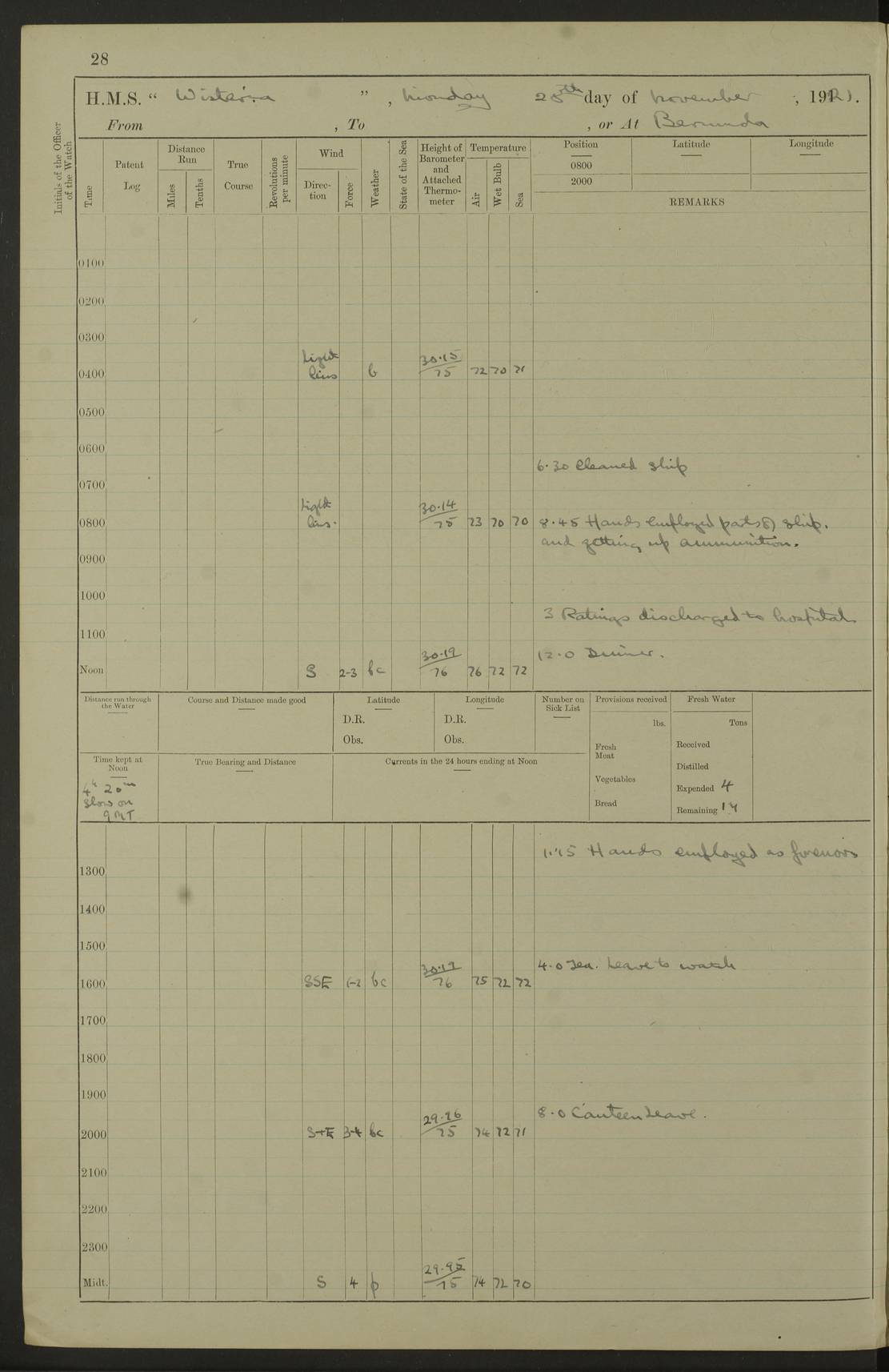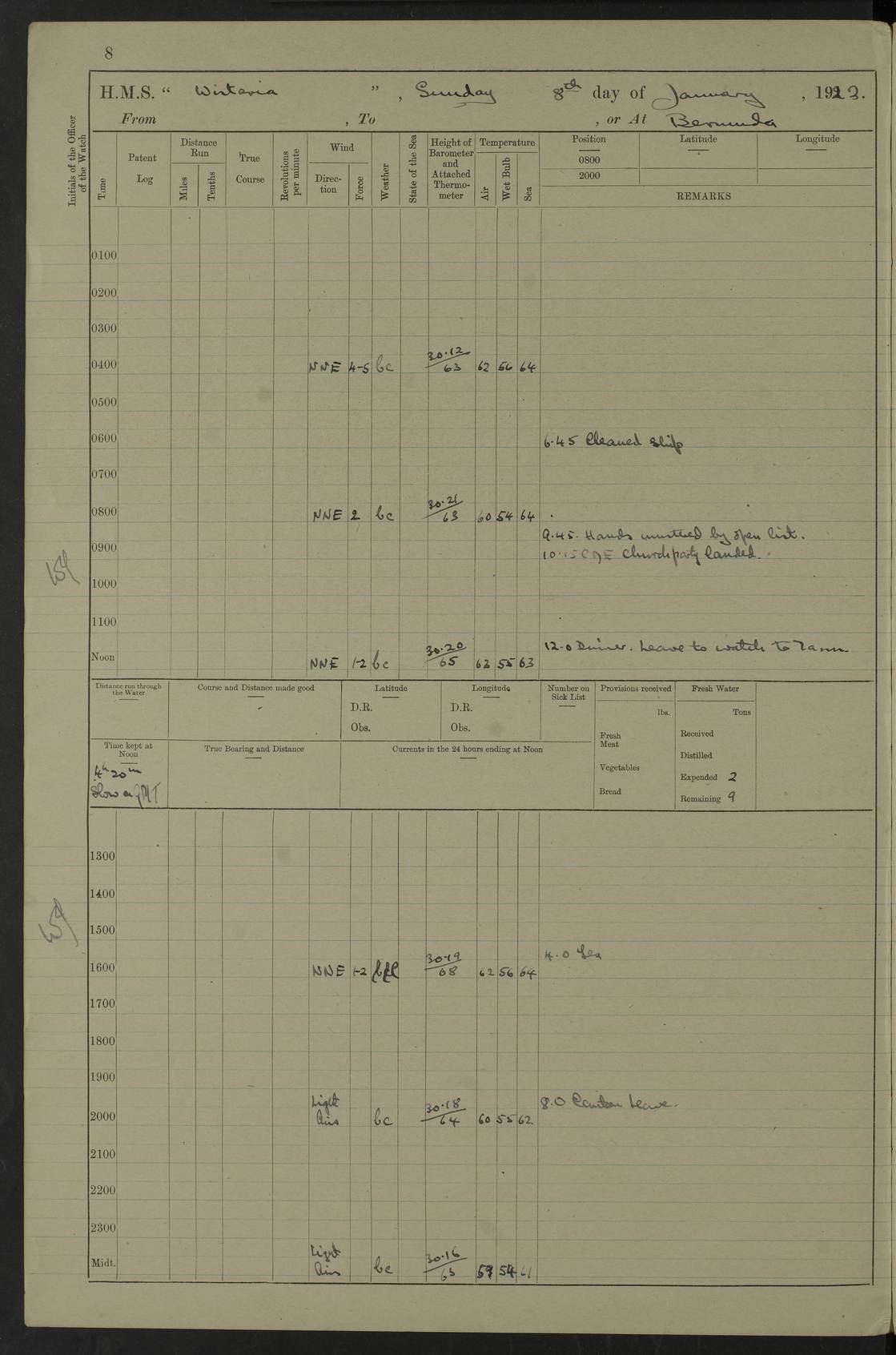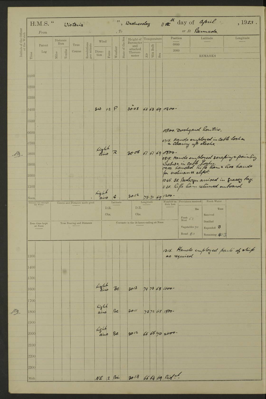 LOGS FOR JANUARY 1922 4f73ca8aa2fc8ea903000b1b: (https://s3.amazonaws.com:443/oldweather/ADM53-93265/0003_1.jpg) 1 January 1922 At Bermuda Lat 32.32, Long -64.8 6.45am: Cleaned ship 10.45am: Church of England Church Party landed 4f73ca8aa2fc8ea903000b1c: (https://s3.amazonaws.com:443/oldweather/ADM53-93265/0004_0.jpg) 2 January 1922 At Bermuda Lat 32.32, Long -64.8 8.45am: Hands employed in seamen’s mess deck & parts of ship 1.15pm: Hands employed as forenoon 4f73ca8aa2fc8ea903000b1d: (https://s3.amazonaws.com:443/oldweather/ADM53-93265/0004_1.jpg) 3 January 1922 At Bermuda Lat 32.32, Long -64.8 8.45am: Hands employed on ship’s side, seamen's mess deck, gunner party & parts of ship 1.15pm: Hands employed as forenoon pm: One Ldg Stoker discharged to RN Hospital 5.0pm: Read Warrant No 6 4f73ca8ba2fc8ea903000b1e: (https://s3.amazonaws.com:443/oldweather/ADM53-93265/0005_0.jpg) 4 January 1922 At Bermuda Lat 32.32, Long -64.8 8.45am: Hands employed painting mess deck & drawing provisions 1.15pm: Hands employed painting seamen's mess deck; on ship’s side; gunner party & parts of ship 4f73ca8ba2fc8ea903000b1f: (https://s3.amazonaws.com:443/oldweather/ADM53-93265/0005_1.jpg) 5 January 1922 At Bermuda Lat 32.32, Long -64.8 8.0am: Hands employed on ship’s side; painting mess decks; refitting boats falls am: 1 Ldg Stoker returned from hospital 4f73ca8ba2fc8ea903000b20: (https://s3.amazonaws.com:443/oldweather/ADM53-93265/0006_0.jpg) 6 January 1922 At Bermuda Lat 32.32, Long -64.8 8.0am: Hands employed painting mess decks, chipping and redleading ship’s side, refitting boats falls 9.0am: Range party landed 1.30pm: Hands employed as forenoon 4f73ca8ca2fc8ea903000b21: (https://s3.amazonaws.com:443/oldweather/ADM53-93265/0006_1.jpg) 7 January 1922 At Bermuda Lat 32.32, Long -64.8 8.0am: Hands employed painting mess decks; side party & parts of ship 8.50am: Ord Sea, boys and stokers training class landed for field training exercises 10.30am: Shifted ship to coaling jetty 11.40am: Secured alongside 4f73ca8ca2fc8ea903000b22: (https://s3.amazonaws.com:443/oldweather/ADM53-93265/0007_0.jpg) 8 January 1922 At Bermuda Lat 32.32, Long -64.8 9.45am: Hands mustered by open list 10.15am: Church of England Church Party landed 4f73ca8da2fc8ea903000b23: (https://s3.amazonaws.com:443/oldweather/ADM53-93265/0007_1.jpg) 9 January 1922 At Bermuda Lat 32.32, Long -64.8 8.0am: Prepared for docking ship 8.25am: Docking party landed. Tug “St Abbs” secured alongside 9.30am: Proceeded into dock 9.55am: Secured in dock 10.30am: Hands employed scrubbing ship’s bottom 1.15pm: Hands employed scrubbing ship’s bottom and painting mess decks pm: 1 Stoker and 1 A.B. discharged to hospital 4f73ca8da2fc8ea903000b24: (https://s3.amazonaws.com:443/oldweather/ADM53-93265/0008_0.jpg) 10 January 1922 At Bermuda Lat 32.32, Long -64.8 8.0am: Hands employed on ship’s side, painting mess decks and about 4” gun for’d 1.15pm: Hands employed as forenoon 4f73ca8da2fc8ea903000b25: (https://s3.amazonaws.com:443/oldweather/ADM53-93265/0008_1.jpg) 11 January 1922 At Bermuda Lat 32.32, Long -64.8 8.0am: Hands employed painting mess decks, chipping side and refitting falls & life belts am: One A.B. discharged to hospital 1.15pm: Hands employed lowering anchors and cables into dock & ranging cable pm: One A.B. joined ship from hospital 4f73ca8ea2fc8ea903000b26: (https://s3.amazonaws.com:443/oldweather/ADM53-93265/0009_0.jpg) 12 January 1922 At Bermuda Lat 32.32, Long -64.8 8.0am: Hands employed chipping ship’s side, painting mess deck & part of ship 5.0pm: Fire Quarters 4f73ca8ea2fc8ea903000b27: (https://s3.amazonaws.com:443/oldweather/ADM53-93265/0009_1.jpg) 13 January 1922 At Bermuda Lat 32.32, Long -64.8 8.0am: Hands employed painting mess deck, chipping ship’s side and parts of ship 1.15pm: Hands employed painting down aloft and chipping ship’s side 4f73ca8ea2fc8ea903000b28: (https://s3.amazonaws.com:443/oldweather/ADM53-93265/0010_0.jpg) 14 January 1922 At Bermuda Lat 32.32, Long -64.8 8.0am: Hands employed on ship’s side, painting down aloft; and on foremost 4” gun 4f73ca8fa2fc8ea903000b29: (https://s3.amazonaws.com:443/oldweather/ADM53-93265/0010_1.jpg) 15 January 1922 At Bermuda Lat 32.32, Long -64.8 10.20am: Church of England church party landed 4f73ca8fa2fc8ea903000b2a: (https://s3.amazonaws.com:443/oldweather/ADM53-93265/0011_0.jpg) 16 January 1922 At Bermuda Lat 32.32, Long -64.8 8.0am: Hands employed painting ship’s bottom 1.15pm: Hands employed painting ship’s bottom 5.0pm: Exercised Fire Quarters 4f73ca8fa2fc8ea903000b2b: (https://s3.amazonaws.com:443/oldweather/ADM53-93265/0011_1.jpg) 17 January 1922 At Bermuda Lat 32.32, Long -64.8 8.0am: Hands employed stowing cable in cable lockers from dock and painting ship’s bottom 1.15pm: Hands employed as forenoon 4f73ca90a2fc8ea903000b2c: (https://s3.amazonaws.com:443/oldweather/ADM53-93265/0012_0.jpg) 18 January 1922 At Bermuda Lat 32.32, Long -64.8 8.0am: Hands prepared to shift ship 9.45am: Left floating dock & secured alongside coaling wharf 10.30am: Hands employed washing down funnels & parts of ship 1.15pm: Hands employed washing funnels, shipping motor boats davits and parts of ship 4f73ca90a2fc8ea903000b2d: (https://s3.amazonaws.com:443/oldweather/ADM53-93265/0012_1.jpg) 19 January 1922 At Bermuda Lat 32.32, Long -64.8 8.0am: Hands employed chipping & painting ship’s side, stripping & cleaning 4” guns and parts of ship 8.15am: RFA “Plumleaf” left basin 9.15am: CH 14 left basin 10.35: Shifted from coaling wharf to 40 ft fender in North Basin 4f73ca91a2fc8ea903000b2e: (https://s3.amazonaws.com:443/oldweather/ADM53-93265/0013_0.jpg) 20 January 1922 At Bermuda Lat 32.32, Long -64.8 8.0am: Hands employed chipping and scraping ship’s side, about aft 4” gun and parts of ship 10.20am: Replace 2nd whaler davits. Lowered 1st whaler davits into deck 1 hand scrubber lost by accident 1.15pm: Hands employed chipping & painting ship’s side. Dismountin