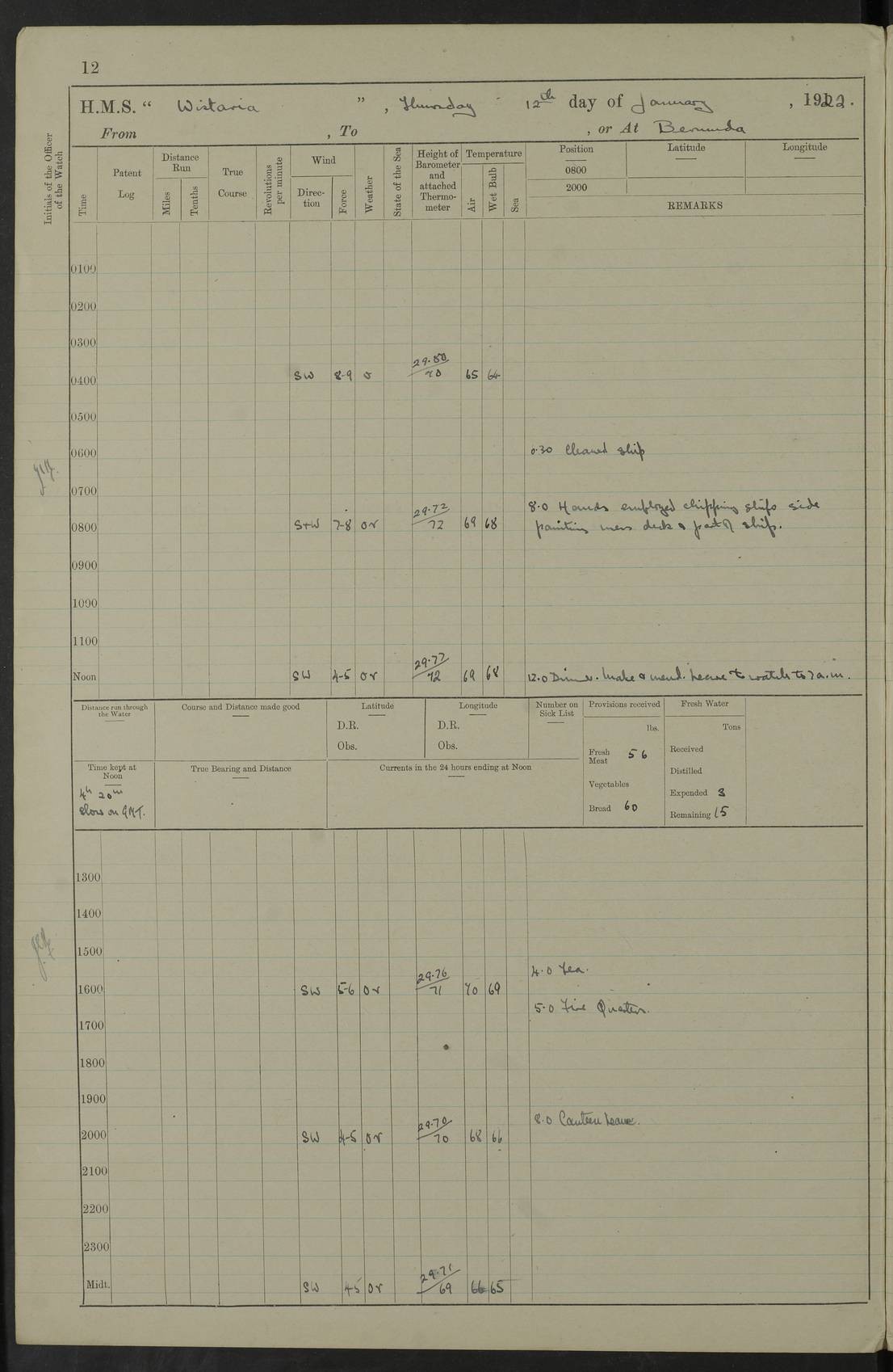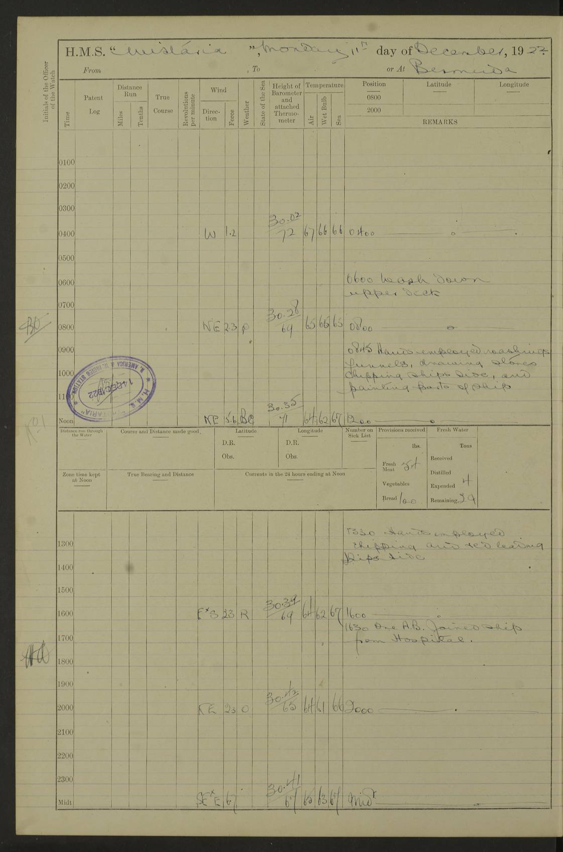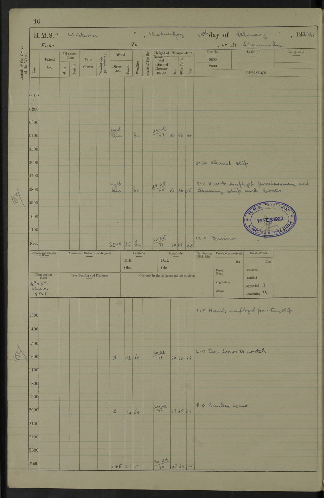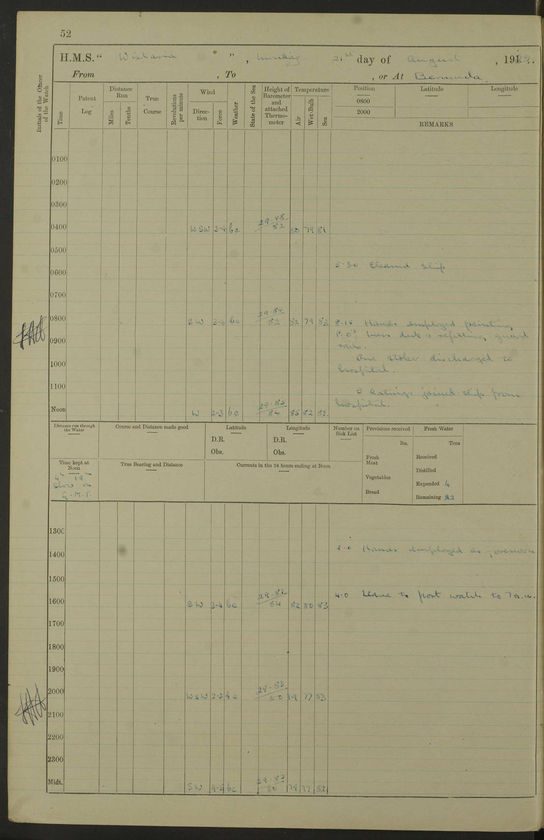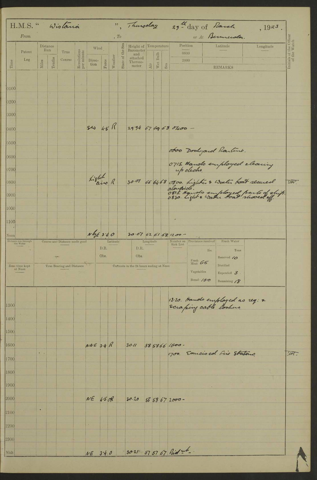 LOGS FOR JANUARY 1922 4f73ca8aa2fc8ea903000b1b: (https://s3.amazonaws.com:443/oldweather/ADM53-93265/0003_1.jpg) 1 January 1922 At Bermuda Lat 32.32, Long -64.8 6.45am: Cleaned ship 10.45am: Church of England Church Party landed 4f73ca8aa2fc8ea903000b1c: (https://s3.amazonaws.com:443/oldweather/ADM53-93265/0004_0.jpg) 2 January 1922 At Bermuda Lat 32.32, Long -64.8 8.45am: Hands employed in seamen’s mess deck & parts of ship 1.15pm: Hands employed as forenoon 4f73ca8aa2fc8ea903000b1d: (https://s3.amazonaws.com:443/oldweather/ADM53-93265/0004_1.jpg) 3 January 1922 At Bermuda Lat 32.32, Long -64.8 8.45am: Hands employed on ship’s side, seamen's mess deck, gunner party & parts of ship 1.15pm: Hands employed as forenoon pm: One Ldg Stoker discharged to RN Hospital 5.0pm: Read Warrant No 6 4f73ca8ba2fc8ea903000b1e: (https://s3.amazonaws.com:443/oldweather/ADM53-93265/0005_0.jpg) 4 January 1922 At Bermuda Lat 32.32, Long -64.8 8.45am: Hands employed painting mess deck & drawing provisions 1.15pm: Hands employed painting seamen's mess deck; on ship’s side; gunner party & parts of ship 4f73ca8ba2fc8ea903000b1f: (https://s3.amazonaws.com:443/oldweather/ADM53-93265/0005_1.jpg) 5 January 1922 At Bermuda Lat 32.32, Long -64.8 8.0am: Hands employed on ship’s side; painting mess decks; refitting boats falls am: 1 Ldg Stoker returned from hospital 4f73ca8ba2fc8ea903000b20: (https://s3.amazonaws.com:443/oldweather/ADM53-93265/0006_0.jpg) 6 January 1922 At Bermuda Lat 32.32, Long -64.8 8.0am: Hands employed painting mess decks, chipping and redleading ship’s side, refitting boats falls 9.0am: Range party landed 1.30pm: Hands employed as forenoon 4f73ca8ca2fc8ea903000b21: (https://s3.amazonaws.com:443/oldweather/ADM53-93265/0006_1.jpg) 7 January 1922 At Bermuda Lat 32.32, Long -64.8 8.0am: Hands employed painting mess decks; side party & parts of ship 8.50am: Ord Sea, boys and stokers training class landed for field training exercises 10.30am: Shifted ship to coaling jetty 11.40am: Secured alongside 4f73ca8ca2fc8ea903000b22: (https://s3.amazonaws.com:443/oldweather/ADM53-93265/0007_0.jpg) 8 January 1922 At Bermuda Lat 32.32, Long -64.8 9.45am: Hands mustered by open list 10.15am: Church of England Church Party landed 4f73ca8da2fc8ea903000b23: (https://s3.amazonaws.com:443/oldweather/ADM53-93265/0007_1.jpg) 9 January 1922 At Bermuda Lat 32.32, Long -64.8 8.0am: Prepared for docking ship 8.25am: Docking party landed. Tug “St Abbs” secured alongside 9.30am: Proceeded into dock 9.55am: Secured in dock 10.30am: Hands employed scrubbing ship’s bottom 1.15pm: Hands employed scrubbing ship’s bottom and painting mess decks pm: 1 Stoker and 1 A.B. discharged to hospital 4f73ca8da2fc8ea903000b24: (https://s3.amazonaws.com:443/oldweather/ADM53-93265/0008_0.jpg) 10 January 1922 At Bermuda Lat 32.32, Long -64.8 8.0am: Hands employed on ship’s side, painting mess decks and about 4” gun for’d 1.15pm: Hands employed as forenoon 4f73ca8da2fc8ea903000b25: (https://s3.amazonaws.com:443/oldweather/ADM53-93265/0008_1.jpg) 11 January 1922 At Bermuda Lat 32.32, Long -64.8 8.0am: Hands employed painting mess decks, chipping side and refitting falls & life belts am: One A.B. discharged to hospital 1.15pm: Hands employed lowering anchors and cables into dock & ranging cable pm: One A.B. joined ship from hospital 4f73ca8ea2fc8ea903000b26: (https://s3.amazonaws.com:443/oldweather/ADM53-93265/0009_0.jpg) 12 January 1922 At Bermuda Lat 32.32, Long -64.8 8.0am: Hands employed chipping ship’s side, painting mess deck & part of ship 5.0pm: Fire Quarters 4f73ca8ea2fc8ea903000b27: (https://s3.amazonaws.com:443/oldweather/ADM53-93265/0009_1.jpg) 13 January 1922 At Bermuda Lat 32.32, Long -64.8 8.0am: Hands employed painting mess deck, chipping ship’s side and parts of ship 1.15pm: Hands employed painting down aloft and chipping ship’s side 4f73ca8ea2fc8ea903000b28: (https://s3.amazonaws.com:443/oldweather/ADM53-93265/0010_0.jpg) 14 January 1922 At Bermuda Lat 32.32, Long -64.8 8.0am: Hands employed on ship’s side, painting down aloft; and on foremost 4” gun 4f73ca8fa2fc8ea903000b29: (https://s3.amazonaws.com:443/oldweather/ADM53-93265/0010_1.jpg) 15 January 1922 At Bermuda Lat 32.32, Long -64.8 10.20am: Church of England church party landed 4f73ca8fa2fc8ea903000b2a: (https://s3.amazonaws.com:443/oldweather/ADM53-93265/0011_0.jpg) 16 January 1922 At Bermuda Lat 32.32, Long -64.8 8.0am: Hands employed painting ship’s bottom 1.15pm: Hands employed painting ship’s bottom 5.0pm: Exercised Fire Quarters 4f73ca8fa2fc8ea903000b2b: (https://s3.amazonaws.com:443/oldweather/ADM53-93265/0011_1.jpg) 17 January 1922 At Bermuda Lat 32.32, Long -64.8 8.0am: Hands employed stowing cable in cable lockers from dock and painting ship’s bottom 1.15pm: Hands employed as forenoon 4f73ca90a2fc8ea903000b2c: (https://s3.amazonaws.com:443/oldweather/ADM53-93265/0012_0.jpg) 18 January 1922 At Bermuda Lat 32.32, Long -64.8 8.0am: Hands prepared to shift ship 9.45am: Left floating dock & secured alongside coaling wharf 10.30am: Hands employed washing down funnels & parts of ship 1.15pm: Hands employed washing funnels, shipping motor boats davits and parts of ship 4f73ca90a2fc8ea903000b2d: (https://s3.amazonaws.com:443/oldweather/ADM53-93265/0012_1.jpg) 19 January 1922 At Bermuda Lat 32.32, Long -64.8 8.0am: Hands employed chipping & painting ship’s side, stripping & cleaning 4” guns and parts of ship 8.15am: RFA “Plumleaf” left basin 9.15am: CH 14 left basin 10.35: Shifted from coaling wharf to 40 ft fender in North Basin 4f73ca91a2fc8ea903000b2e: (https://s3.amazonaws.com:443/oldweather/ADM53-93265/0013_0.jpg) 20 January 1922 At Bermuda Lat 32.32, Long -64.8 8.0am: Hands employed chipping and scraping ship’s side, about aft 4” gun and parts of ship 10.20am: Replace 2nd whaler davits. Lowered 1st whaler davits into deck 1 hand scrubber lost by accident 1.15pm: Hands employed chipping & painting ship’s side. Dismountin