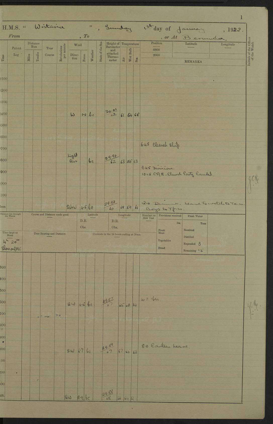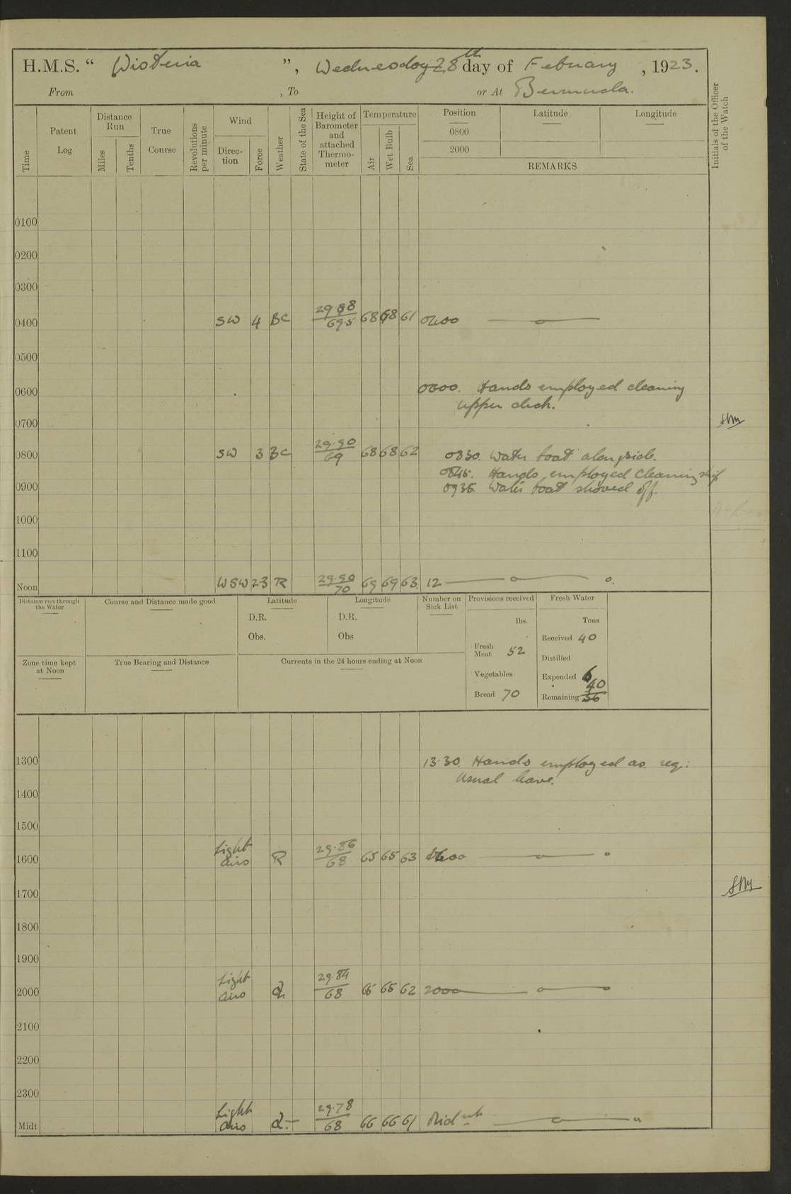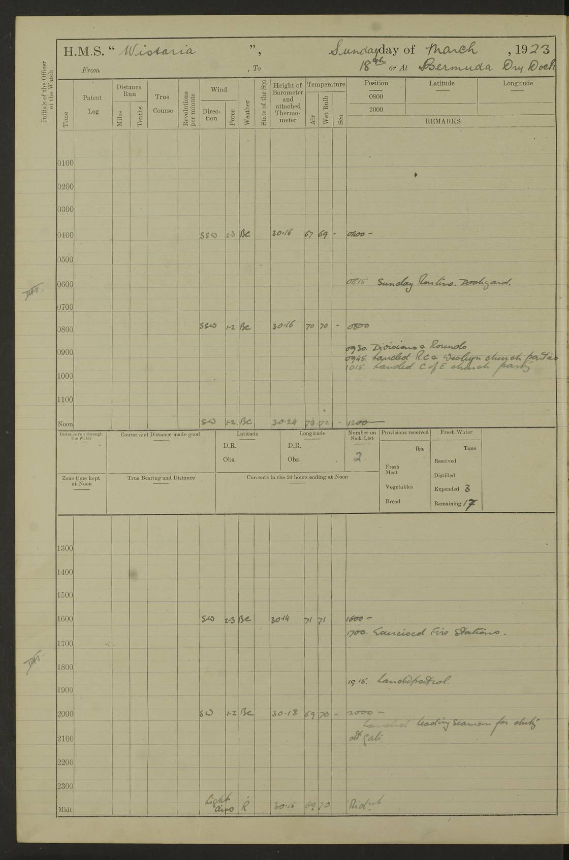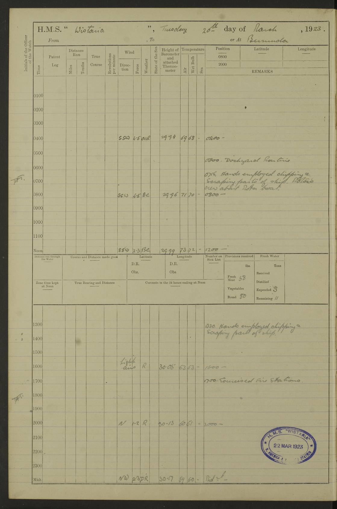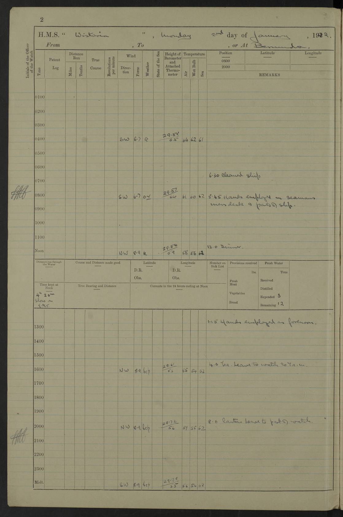 LOGS FOR JANUARY 1922 4f73ca8aa2fc8ea903000b1b: (https://s3.amazonaws.com:443/oldweather/ADM53-93265/0003_1.jpg) 1 January 1922 At Bermuda Lat 32.32, Long -64.8 6.45am: Cleaned ship 10.45am: Church of England Church Party landed 4f73ca8aa2fc8ea903000b1c: (https://s3.amazonaws.com:443/oldweather/ADM53-93265/0004_0.jpg) 2 January 1922 At Bermuda Lat 32.32, Long -64.8 8.45am: Hands employed in seamen’s mess deck & parts of ship 1.15pm: Hands employed as forenoon 4f73ca8aa2fc8ea903000b1d: (https://s3.amazonaws.com:443/oldweather/ADM53-93265/0004_1.jpg) 3 January 1922 At Bermuda Lat 32.32, Long -64.8 8.45am: Hands employed on ship’s side, seamen's mess deck, gunner party & parts of ship 1.15pm: Hands employed as forenoon pm: One Ldg Stoker discharged to RN Hospital 5.0pm: Read Warrant No 6 4f73ca8ba2fc8ea903000b1e: (https://s3.amazonaws.com:443/oldweather/ADM53-93265/0005_0.jpg) 4 January 1922 At Bermuda Lat 32.32, Long -64.8 8.45am: Hands employed painting mess deck & drawing provisions 1.15pm: Hands employed painting seamen's mess deck; on ship’s side; gunner party & parts of ship 4f73ca8ba2fc8ea903000b1f: (https://s3.amazonaws.com:443/oldweather/ADM53-93265/0005_1.jpg) 5 January 1922 At Bermuda Lat 32.32, Long -64.8 8.0am: Hands employed on ship’s side; painting mess decks; refitting boats falls am: 1 Ldg Stoker returned from hospital 4f73ca8ba2fc8ea903000b20: (https://s3.amazonaws.com:443/oldweather/ADM53-93265/0006_0.jpg) 6 January 1922 At Bermuda Lat 32.32, Long -64.8 8.0am: Hands employed painting mess decks, chipping and redleading ship’s side, refitting boats falls 9.0am: Range party landed 1.30pm: Hands employed as forenoon 4f73ca8ca2fc8ea903000b21: (https://s3.amazonaws.com:443/oldweather/ADM53-93265/0006_1.jpg) 7 January 1922 At Bermuda Lat 32.32, Long -64.8 8.0am: Hands employed painting mess decks; side party & parts of ship 8.50am: Ord Sea, boys and stokers training class landed for field training exercises 10.30am: Shifted ship to coaling jetty 11.40am: Secured alongside 4f73ca8ca2fc8ea903000b22: (https://s3.amazonaws.com:443/oldweather/ADM53-93265/0007_0.jpg) 8 January 1922 At Bermuda Lat 32.32, Long -64.8 9.45am: Hands mustered by open list 10.15am: Church of England Church Party landed 4f73ca8da2fc8ea903000b23: (https://s3.amazonaws.com:443/oldweather/ADM53-93265/0007_1.jpg) 9 January 1922 At Bermuda Lat 32.32, Long -64.8 8.0am: Prepared for docking ship 8.25am: Docking party landed. Tug “St Abbs” secured alongside 9.30am: Proceeded into dock 9.55am: Secured in dock 10.30am: Hands employed scrubbing ship’s bottom 1.15pm: Hands employed scrubbing ship’s bottom and painting mess decks pm: 1 Stoker and 1 A.B. discharged to hospital 4f73ca8da2fc8ea903000b24: (https://s3.amazonaws.com:443/oldweather/ADM53-93265/0008_0.jpg) 10 January 1922 At Bermuda Lat 32.32, Long -64.8 8.0am: Hands employed on ship’s side, painting mess decks and about 4” gun for’d 1.15pm: Hands employed as forenoon 4f73ca8da2fc8ea903000b25: (https://s3.amazonaws.com:443/oldweather/ADM53-93265/0008_1.jpg) 11 January 1922 At Bermuda Lat 32.32, Long -64.8 8.0am: Hands employed painting mess decks, chipping side and refitting falls & life belts am: One A.B. discharged to hospital 1.15pm: Hands employed lowering anchors and cables into dock & ranging cable pm: One A.B. joined ship from hospital 4f73ca8ea2fc8ea903000b26: (https://s3.amazonaws.com:443/oldweather/ADM53-93265/0009_0.jpg) 12 January 1922 At Bermuda Lat 32.32, Long -64.8 8.0am: Hands employed chipping ship’s side, painting mess deck & part of ship 5.0pm: Fire Quarters 4f73ca8ea2fc8ea903000b27: (https://s3.amazonaws.com:443/oldweather/ADM53-93265/0009_1.jpg) 13 January 1922 At Bermuda Lat 32.32, Long -64.8 8.0am: Hands employed painting mess deck, chipping ship’s side and parts of ship 1.15pm: Hands employed painting down aloft and chipping ship’s side 4f73ca8ea2fc8ea903000b28: (https://s3.amazonaws.com:443/oldweather/ADM53-93265/0010_0.jpg) 14 January 1922 At Bermuda Lat 32.32, Long -64.8 8.0am: Hands employed on ship’s side, painting down aloft; and on foremost 4” gun 4f73ca8fa2fc8ea903000b29: (https://s3.amazonaws.com:443/oldweather/ADM53-93265/0010_1.jpg) 15 January 1922 At Bermuda Lat 32.32, Long -64.8 10.20am: Church of England church party landed 4f73ca8fa2fc8ea903000b2a: (https://s3.amazonaws.com:443/oldweather/ADM53-93265/0011_0.jpg) 16 January 1922 At Bermuda Lat 32.32, Long -64.8 8.0am: Hands employed painting ship’s bottom 1.15pm: Hands employed painting ship’s bottom 5.0pm: Exercised Fire Quarters 4f73ca8fa2fc8ea903000b2b: (https://s3.amazonaws.com:443/oldweather/ADM53-93265/0011_1.jpg) 17 January 1922 At Bermuda Lat 32.32, Long -64.8 8.0am: Hands employed stowing cable in cable lockers from dock and painting ship’s bottom 1.15pm: Hands employed as forenoon 4f73ca90a2fc8ea903000b2c: (https://s3.amazonaws.com:443/oldweather/ADM53-93265/0012_0.jpg) 18 January 1922 At Bermuda Lat 32.32, Long -64.8 8.0am: Hands prepared to shift ship 9.45am: Left floating dock & secured alongside coaling wharf 10.30am: Hands employed washing down funnels & parts of ship 1.15pm: Hands employed washing funnels, shipping motor boats davits and parts of ship 4f73ca90a2fc8ea903000b2d: (https://s3.amazonaws.com:443/oldweather/ADM53-93265/0012_1.jpg) 19 January 1922 At Bermuda Lat 32.32, Long -64.8 8.0am: Hands employed chipping & painting ship’s side, stripping & cleaning 4” guns and parts of ship 8.15am: RFA “Plumleaf” left basin 9.15am: CH 14 left basin 10.35: Shifted from coaling wharf to 40 ft fender in North Basin 4f73ca91a2fc8ea903000b2e: (https://s3.amazonaws.com:443/oldweather/ADM53-93265/0013_0.jpg) 20 January 1922 At Bermuda Lat 32.32, Long -64.8 8.0am: Hands employed chipping and scraping ship’s side, about aft 4” gun and parts of ship 10.20am: Replace 2nd whaler davits. Lowered 1st whaler davits into deck 1 hand scrubber lost by accident 1.15pm: Hands employed chipping & painting ship’s side. Dismountin