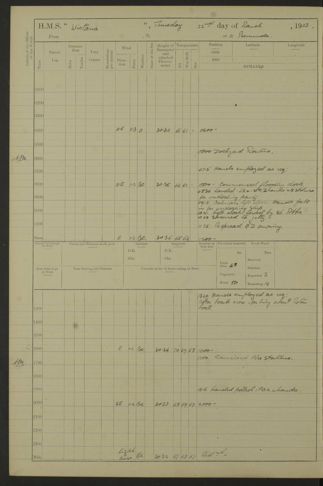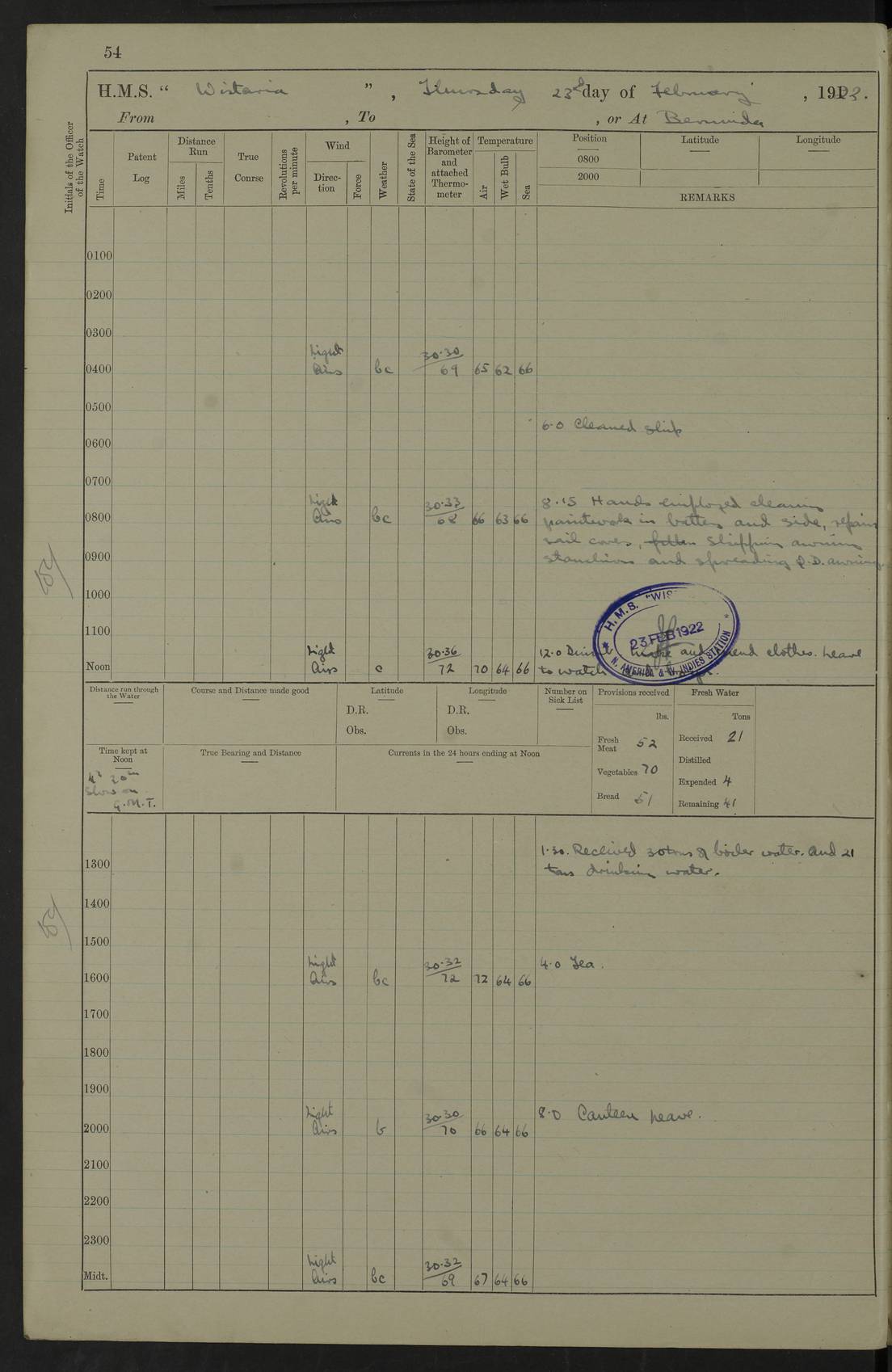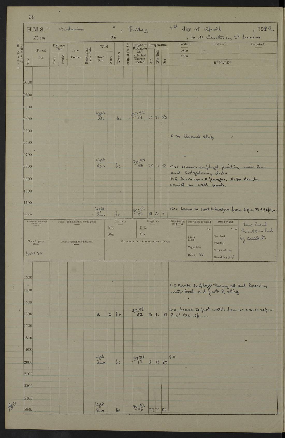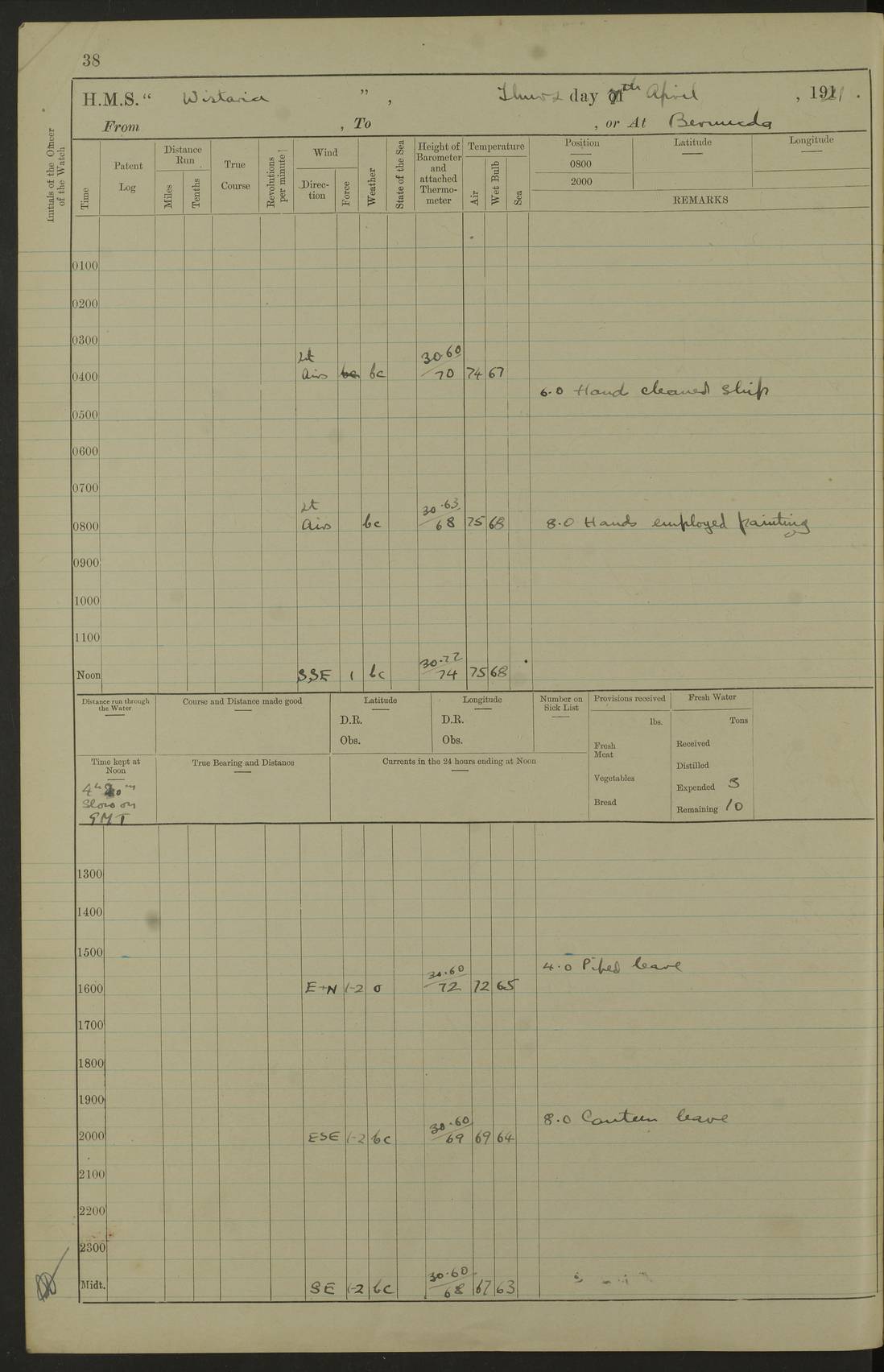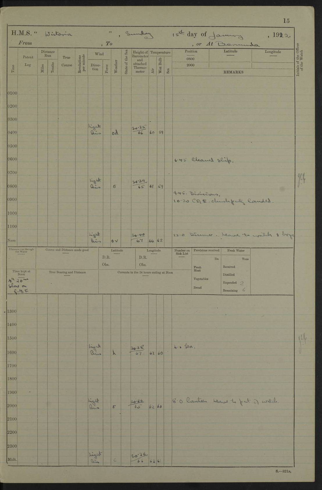 LOGS FOR JANUARY 1922 4f73ca8aa2fc8ea903000b1b: (https://s3.amazonaws.com:443/oldweather/ADM53-93265/0003_1.jpg) 1 January 1922 At Bermuda Lat 32.32, Long -64.8 6.45am: Cleaned ship 10.45am: Church of England Church Party landed 4f73ca8aa2fc8ea903000b1c: (https://s3.amazonaws.com:443/oldweather/ADM53-93265/0004_0.jpg) 2 January 1922 At Bermuda Lat 32.32, Long -64.8 8.45am: Hands employed in seamen’s mess deck & parts of ship 1.15pm: Hands employed as forenoon 4f73ca8aa2fc8ea903000b1d: (https://s3.amazonaws.com:443/oldweather/ADM53-93265/0004_1.jpg) 3 January 1922 At Bermuda Lat 32.32, Long -64.8 8.45am: Hands employed on ship’s side, seamen's mess deck, gunner party & parts of ship 1.15pm: Hands employed as forenoon pm: One Ldg Stoker discharged to RN Hospital 5.0pm: Read Warrant No 6 4f73ca8ba2fc8ea903000b1e: (https://s3.amazonaws.com:443/oldweather/ADM53-93265/0005_0.jpg) 4 January 1922 At Bermuda Lat 32.32, Long -64.8 8.45am: Hands employed painting mess deck & drawing provisions 1.15pm: Hands employed painting seamen's mess deck; on ship’s side; gunner party & parts of ship 4f73ca8ba2fc8ea903000b1f: (https://s3.amazonaws.com:443/oldweather/ADM53-93265/0005_1.jpg) 5 January 1922 At Bermuda Lat 32.32, Long -64.8 8.0am: Hands employed on ship’s side; painting mess decks; refitting boats falls am: 1 Ldg Stoker returned from hospital 4f73ca8ba2fc8ea903000b20: (https://s3.amazonaws.com:443/oldweather/ADM53-93265/0006_0.jpg) 6 January 1922 At Bermuda Lat 32.32, Long -64.8 8.0am: Hands employed painting mess decks, chipping and redleading ship’s side, refitting boats falls 9.0am: Range party landed 1.30pm: Hands employed as forenoon 4f73ca8ca2fc8ea903000b21: (https://s3.amazonaws.com:443/oldweather/ADM53-93265/0006_1.jpg) 7 January 1922 At Bermuda Lat 32.32, Long -64.8 8.0am: Hands employed painting mess decks; side party & parts of ship 8.50am: Ord Sea, boys and stokers training class landed for field training exercises 10.30am: Shifted ship to coaling jetty 11.40am: Secured alongside 4f73ca8ca2fc8ea903000b22: (https://s3.amazonaws.com:443/oldweather/ADM53-93265/0007_0.jpg) 8 January 1922 At Bermuda Lat 32.32, Long -64.8 9.45am: Hands mustered by open list 10.15am: Church of England Church Party landed 4f73ca8da2fc8ea903000b23: (https://s3.amazonaws.com:443/oldweather/ADM53-93265/0007_1.jpg) 9 January 1922 At Bermuda Lat 32.32, Long -64.8 8.0am: Prepared for docking ship 8.25am: Docking party landed. Tug “St Abbs” secured alongside 9.30am: Proceeded into dock 9.55am: Secured in dock 10.30am: Hands employed scrubbing ship’s bottom 1.15pm: Hands employed scrubbing ship’s bottom and painting mess decks pm: 1 Stoker and 1 A.B. discharged to hospital 4f73ca8da2fc8ea903000b24: (https://s3.amazonaws.com:443/oldweather/ADM53-93265/0008_0.jpg) 10 January 1922 At Bermuda Lat 32.32, Long -64.8 8.0am: Hands employed on ship’s side, painting mess decks and about 4” gun for’d 1.15pm: Hands employed as forenoon 4f73ca8da2fc8ea903000b25: (https://s3.amazonaws.com:443/oldweather/ADM53-93265/0008_1.jpg) 11 January 1922 At Bermuda Lat 32.32, Long -64.8 8.0am: Hands employed painting mess decks, chipping side and refitting falls & life belts am: One A.B. discharged to hospital 1.15pm: Hands employed lowering anchors and cables into dock & ranging cable pm: One A.B. joined ship from hospital 4f73ca8ea2fc8ea903000b26: (https://s3.amazonaws.com:443/oldweather/ADM53-93265/0009_0.jpg) 12 January 1922 At Bermuda Lat 32.32, Long -64.8 8.0am: Hands employed chipping ship’s side, painting mess deck & part of ship 5.0pm: Fire Quarters 4f73ca8ea2fc8ea903000b27: (https://s3.amazonaws.com:443/oldweather/ADM53-93265/0009_1.jpg) 13 January 1922 At Bermuda Lat 32.32, Long -64.8 8.0am: Hands employed painting mess deck, chipping ship’s side and parts of ship 1.15pm: Hands employed painting down aloft and chipping ship’s side 4f73ca8ea2fc8ea903000b28: (https://s3.amazonaws.com:443/oldweather/ADM53-93265/0010_0.jpg) 14 January 1922 At Bermuda Lat 32.32, Long -64.8 8.0am: Hands employed on ship’s side, painting down aloft; and on foremost 4” gun 4f73ca8fa2fc8ea903000b29: (https://s3.amazonaws.com:443/oldweather/ADM53-93265/0010_1.jpg) 15 January 1922 At Bermuda Lat 32.32, Long -64.8 10.20am: Church of England church party landed 4f73ca8fa2fc8ea903000b2a: (https://s3.amazonaws.com:443/oldweather/ADM53-93265/0011_0.jpg) 16 January 1922 At Bermuda Lat 32.32, Long -64.8 8.0am: Hands employed painting ship’s bottom 1.15pm: Hands employed painting ship’s bottom 5.0pm: Exercised Fire Quarters 4f73ca8fa2fc8ea903000b2b: (https://s3.amazonaws.com:443/oldweather/ADM53-93265/0011_1.jpg) 17 January 1922 At Bermuda Lat 32.32, Long -64.8 8.0am: Hands employed stowing cable in cable lockers from dock and painting ship’s bottom 1.15pm: Hands employed as forenoon 4f73ca90a2fc8ea903000b2c: (https://s3.amazonaws.com:443/oldweather/ADM53-93265/0012_0.jpg) 18 January 1922 At Bermuda Lat 32.32, Long -64.8 8.0am: Hands prepared to shift ship 9.45am: Left floating dock & secured alongside coaling wharf 10.30am: Hands employed washing down funnels & parts of ship 1.15pm: Hands employed washing funnels, shipping motor boats davits and parts of ship 4f73ca90a2fc8ea903000b2d: (https://s3.amazonaws.com:443/oldweather/ADM53-93265/0012_1.jpg) 19 January 1922 At Bermuda Lat 32.32, Long -64.8 8.0am: Hands employed chipping & painting ship’s side, stripping & cleaning 4” guns and parts of ship 8.15am: RFA “Plumleaf” left basin 9.15am: CH 14 left basin 10.35: Shifted from coaling wharf to 40 ft fender in North Basin 4f73ca91a2fc8ea903000b2e: (https://s3.amazonaws.com:443/oldweather/ADM53-93265/0013_0.jpg) 20 January 1922 At Bermuda Lat 32.32, Long -64.8 8.0am: Hands employed chipping and scraping ship’s side, about aft 4” gun and parts of ship 10.20am: Replace 2nd whaler davits. Lowered 1st whaler davits into deck 1 hand scrubber lost by accident 1.15pm: Hands employed chipping & painting ship’s side. Dismountin