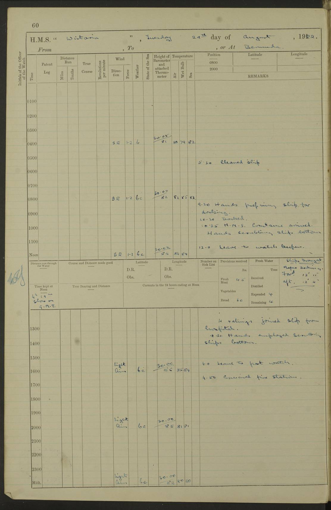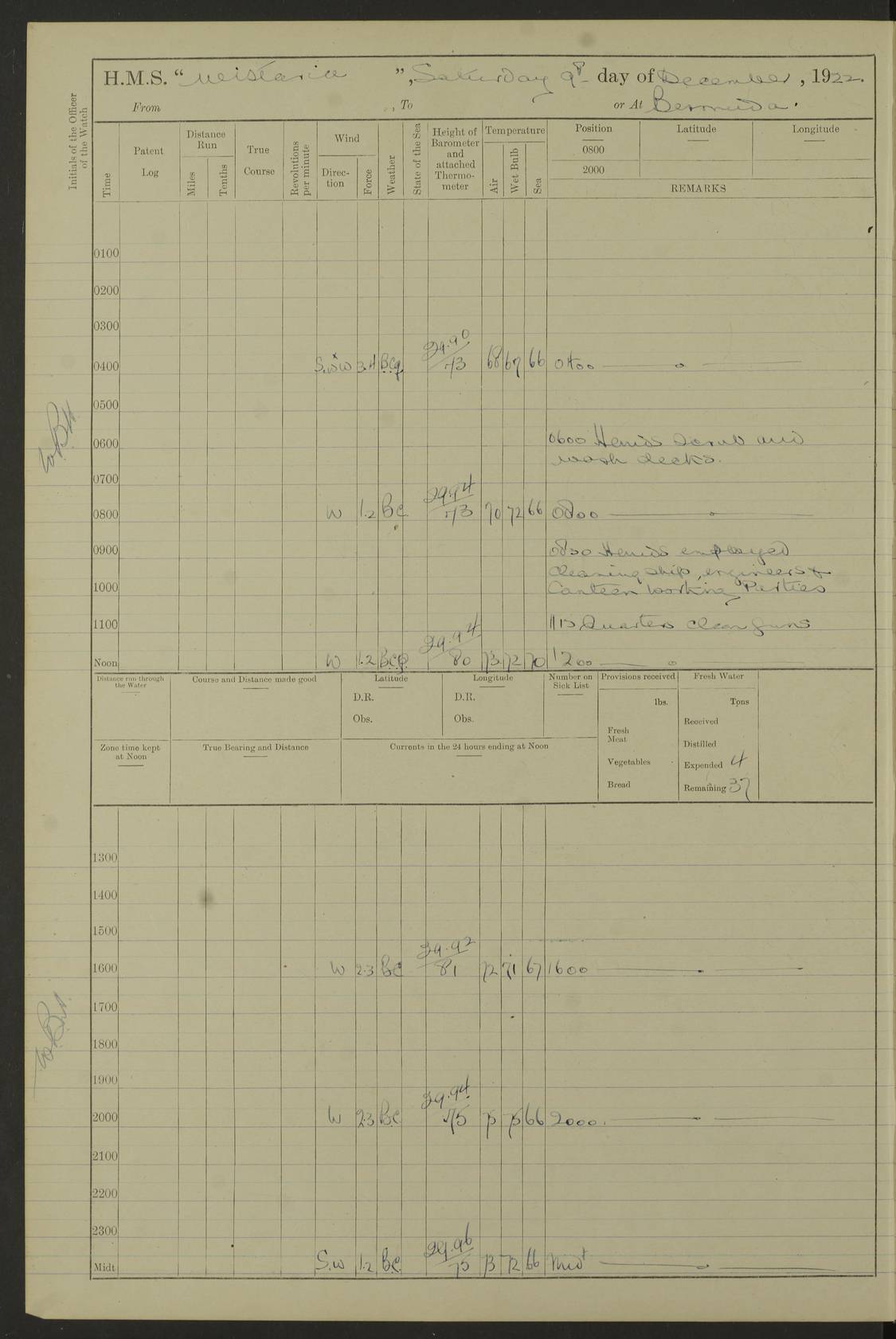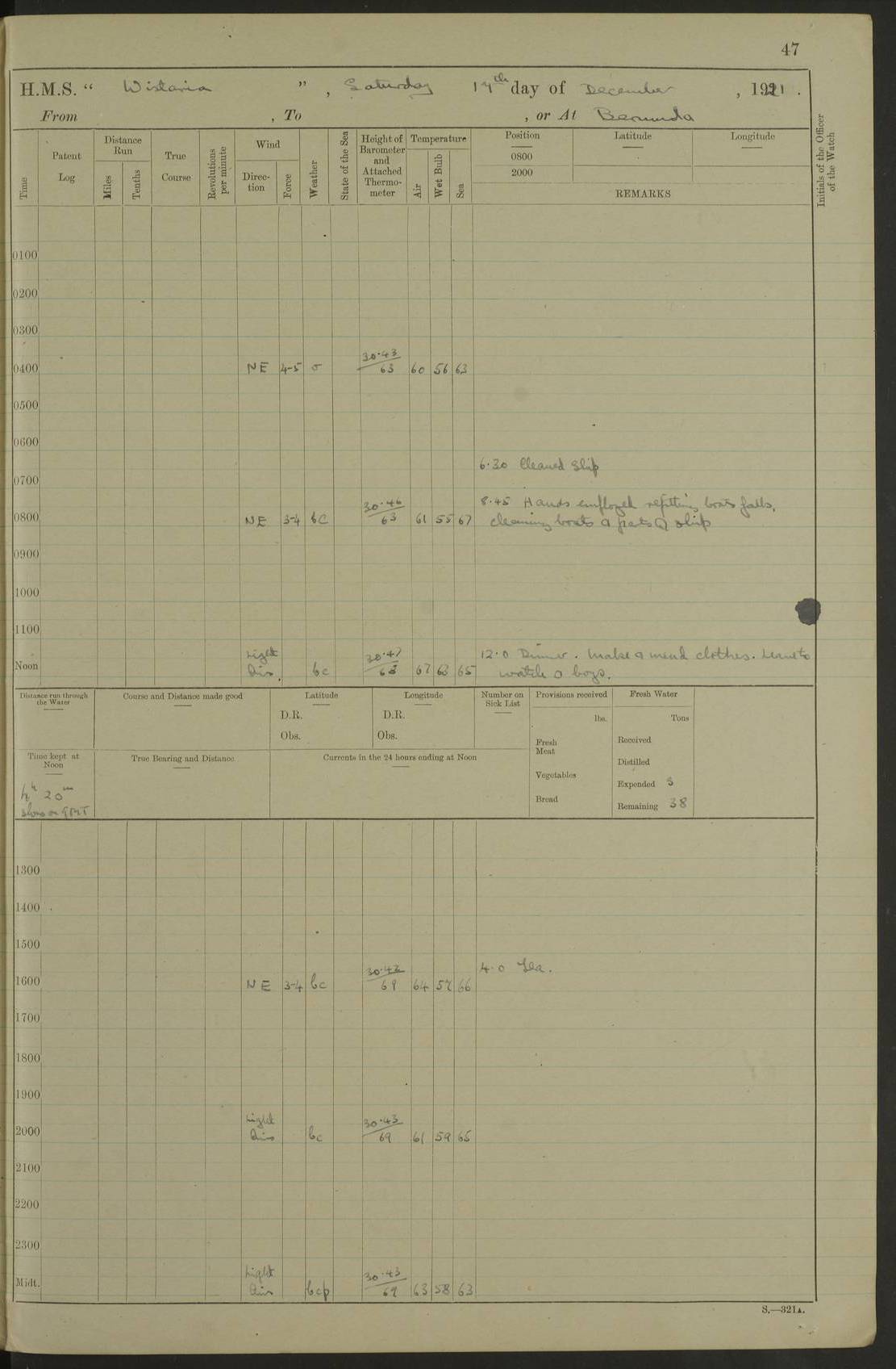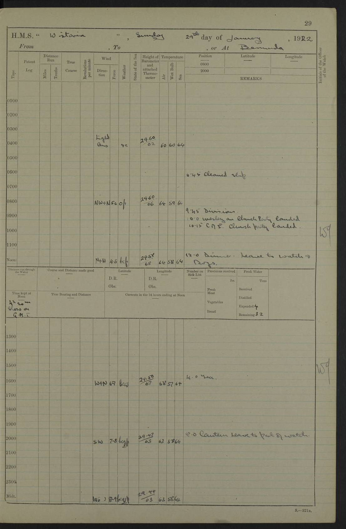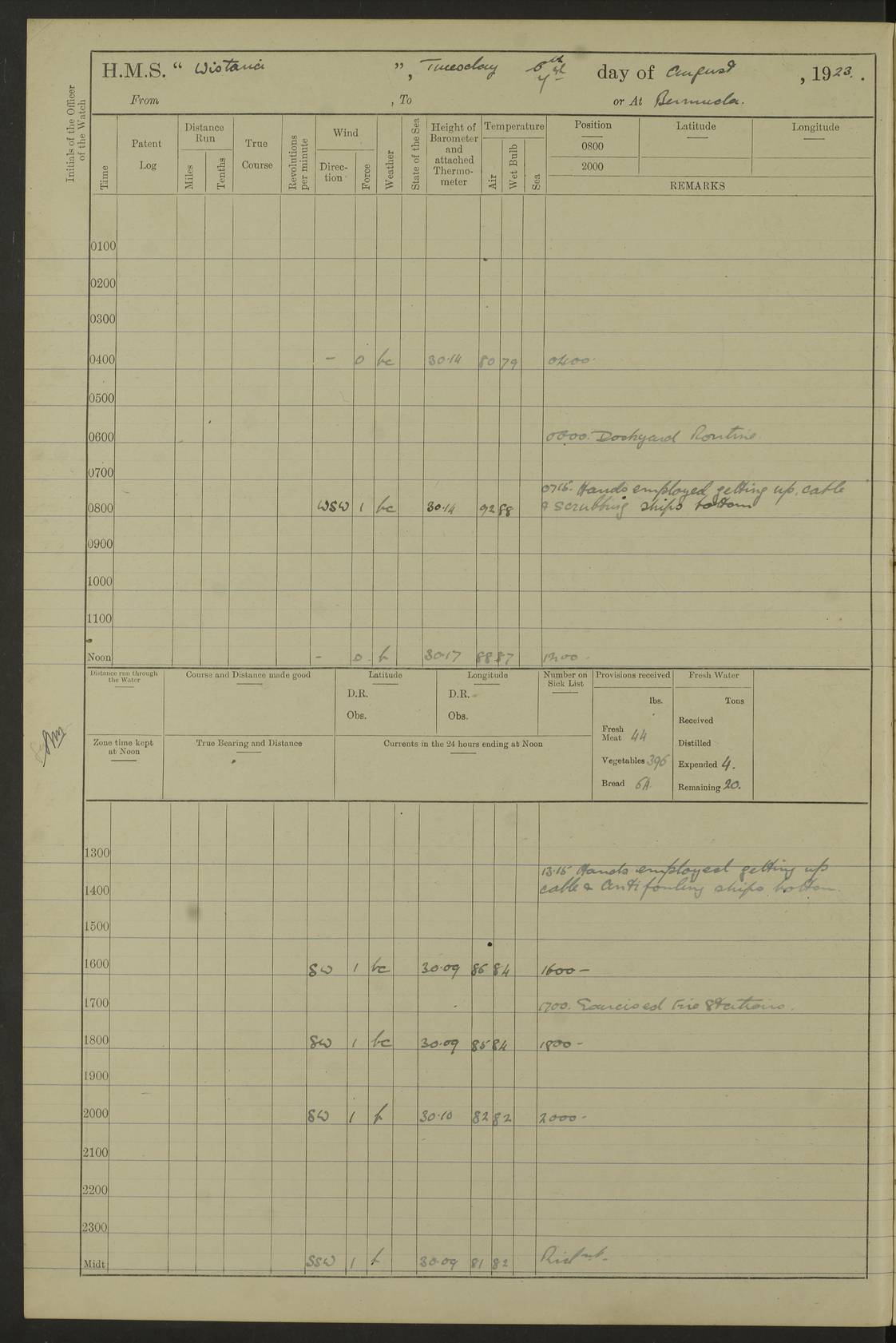 LOGS FOR JANUARY 1922 4f73ca8aa2fc8ea903000b1b: (https://s3.amazonaws.com:443/oldweather/ADM53-93265/0003_1.jpg) 1 January 1922 At Bermuda Lat 32.32, Long -64.8 6.45am: Cleaned ship 10.45am: Church of England Church Party landed 4f73ca8aa2fc8ea903000b1c: (https://s3.amazonaws.com:443/oldweather/ADM53-93265/0004_0.jpg) 2 January 1922 At Bermuda Lat 32.32, Long -64.8 8.45am: Hands employed in seamen’s mess deck & parts of ship 1.15pm: Hands employed as forenoon 4f73ca8aa2fc8ea903000b1d: (https://s3.amazonaws.com:443/oldweather/ADM53-93265/0004_1.jpg) 3 January 1922 At Bermuda Lat 32.32, Long -64.8 8.45am: Hands employed on ship’s side, seamen's mess deck, gunner party & parts of ship 1.15pm: Hands employed as forenoon pm: One Ldg Stoker discharged to RN Hospital 5.0pm: Read Warrant No 6 4f73ca8ba2fc8ea903000b1e: (https://s3.amazonaws.com:443/oldweather/ADM53-93265/0005_0.jpg) 4 January 1922 At Bermuda Lat 32.32, Long -64.8 8.45am: Hands employed painting mess deck & drawing provisions 1.15pm: Hands employed painting seamen's mess deck; on ship’s side; gunner party & parts of ship 4f73ca8ba2fc8ea903000b1f: (https://s3.amazonaws.com:443/oldweather/ADM53-93265/0005_1.jpg) 5 January 1922 At Bermuda Lat 32.32, Long -64.8 8.0am: Hands employed on ship’s side; painting mess decks; refitting boats falls am: 1 Ldg Stoker returned from hospital 4f73ca8ba2fc8ea903000b20: (https://s3.amazonaws.com:443/oldweather/ADM53-93265/0006_0.jpg) 6 January 1922 At Bermuda Lat 32.32, Long -64.8 8.0am: Hands employed painting mess decks, chipping and redleading ship’s side, refitting boats falls 9.0am: Range party landed 1.30pm: Hands employed as forenoon 4f73ca8ca2fc8ea903000b21: (https://s3.amazonaws.com:443/oldweather/ADM53-93265/0006_1.jpg) 7 January 1922 At Bermuda Lat 32.32, Long -64.8 8.0am: Hands employed painting mess decks; side party & parts of ship 8.50am: Ord Sea, boys and stokers training class landed for field training exercises 10.30am: Shifted ship to coaling jetty 11.40am: Secured alongside 4f73ca8ca2fc8ea903000b22: (https://s3.amazonaws.com:443/oldweather/ADM53-93265/0007_0.jpg) 8 January 1922 At Bermuda Lat 32.32, Long -64.8 9.45am: Hands mustered by open list 10.15am: Church of England Church Party landed 4f73ca8da2fc8ea903000b23: (https://s3.amazonaws.com:443/oldweather/ADM53-93265/0007_1.jpg) 9 January 1922 At Bermuda Lat 32.32, Long -64.8 8.0am: Prepared for docking ship 8.25am: Docking party landed. Tug “St Abbs” secured alongside 9.30am: Proceeded into dock 9.55am: Secured in dock 10.30am: Hands employed scrubbing ship’s bottom 1.15pm: Hands employed scrubbing ship’s bottom and painting mess decks pm: 1 Stoker and 1 A.B. discharged to hospital 4f73ca8da2fc8ea903000b24: (https://s3.amazonaws.com:443/oldweather/ADM53-93265/0008_0.jpg) 10 January 1922 At Bermuda Lat 32.32, Long -64.8 8.0am: Hands employed on ship’s side, painting mess decks and about 4” gun for’d 1.15pm: Hands employed as forenoon 4f73ca8da2fc8ea903000b25: (https://s3.amazonaws.com:443/oldweather/ADM53-93265/0008_1.jpg) 11 January 1922 At Bermuda Lat 32.32, Long -64.8 8.0am: Hands employed painting mess decks, chipping side and refitting falls & life belts am: One A.B. discharged to hospital 1.15pm: Hands employed lowering anchors and cables into dock & ranging cable pm: One A.B. joined ship from hospital 4f73ca8ea2fc8ea903000b26: (https://s3.amazonaws.com:443/oldweather/ADM53-93265/0009_0.jpg) 12 January 1922 At Bermuda Lat 32.32, Long -64.8 8.0am: Hands employed chipping ship’s side, painting mess deck & part of ship 5.0pm: Fire Quarters 4f73ca8ea2fc8ea903000b27: (https://s3.amazonaws.com:443/oldweather/ADM53-93265/0009_1.jpg) 13 January 1922 At Bermuda Lat 32.32, Long -64.8 8.0am: Hands employed painting mess deck, chipping ship’s side and parts of ship 1.15pm: Hands employed painting down aloft and chipping ship’s side 4f73ca8ea2fc8ea903000b28: (https://s3.amazonaws.com:443/oldweather/ADM53-93265/0010_0.jpg) 14 January 1922 At Bermuda Lat 32.32, Long -64.8 8.0am: Hands employed on ship’s side, painting down aloft; and on foremost 4” gun 4f73ca8fa2fc8ea903000b29: (https://s3.amazonaws.com:443/oldweather/ADM53-93265/0010_1.jpg) 15 January 1922 At Bermuda Lat 32.32, Long -64.8 10.20am: Church of England church party landed 4f73ca8fa2fc8ea903000b2a: (https://s3.amazonaws.com:443/oldweather/ADM53-93265/0011_0.jpg) 16 January 1922 At Bermuda Lat 32.32, Long -64.8 8.0am: Hands employed painting ship’s bottom 1.15pm: Hands employed painting ship’s bottom 5.0pm: Exercised Fire Quarters 4f73ca8fa2fc8ea903000b2b: (https://s3.amazonaws.com:443/oldweather/ADM53-93265/0011_1.jpg) 17 January 1922 At Bermuda Lat 32.32, Long -64.8 8.0am: Hands employed stowing cable in cable lockers from dock and painting ship’s bottom 1.15pm: Hands employed as forenoon 4f73ca90a2fc8ea903000b2c: (https://s3.amazonaws.com:443/oldweather/ADM53-93265/0012_0.jpg) 18 January 1922 At Bermuda Lat 32.32, Long -64.8 8.0am: Hands prepared to shift ship 9.45am: Left floating dock & secured alongside coaling wharf 10.30am: Hands employed washing down funnels & parts of ship 1.15pm: Hands employed washing funnels, shipping motor boats davits and parts of ship 4f73ca90a2fc8ea903000b2d: (https://s3.amazonaws.com:443/oldweather/ADM53-93265/0012_1.jpg) 19 January 1922 At Bermuda Lat 32.32, Long -64.8 8.0am: Hands employed chipping & painting ship’s side, stripping & cleaning 4” guns and parts of ship 8.15am: RFA “Plumleaf” left basin 9.15am: CH 14 left basin 10.35: Shifted from coaling wharf to 40 ft fender in North Basin 4f73ca91a2fc8ea903000b2e: (https://s3.amazonaws.com:443/oldweather/ADM53-93265/0013_0.jpg) 20 January 1922 At Bermuda Lat 32.32, Long -64.8 8.0am: Hands employed chipping and scraping ship’s side, about aft 4” gun and parts of ship 10.20am: Replace 2nd whaler davits. Lowered 1st whaler davits into deck 1 hand scrubber lost by accident 1.15pm: Hands employed chipping & painting ship’s side. Dismountin