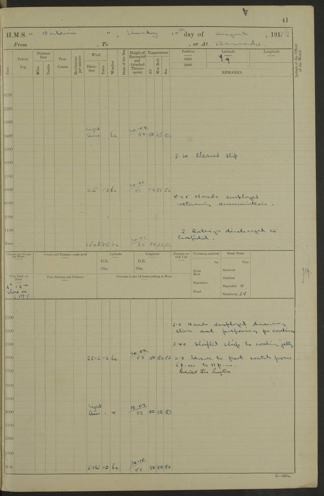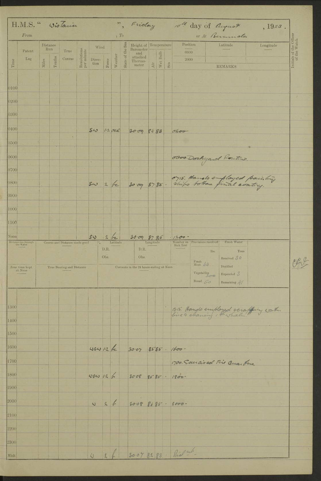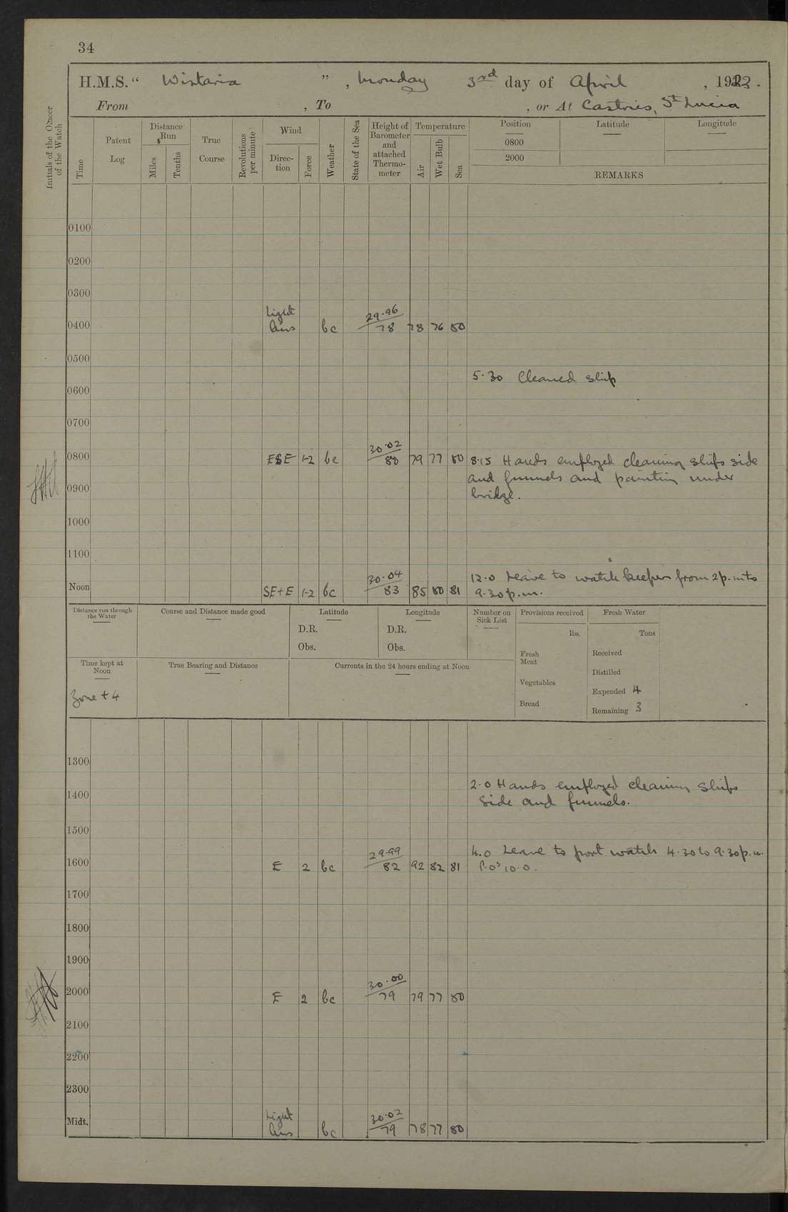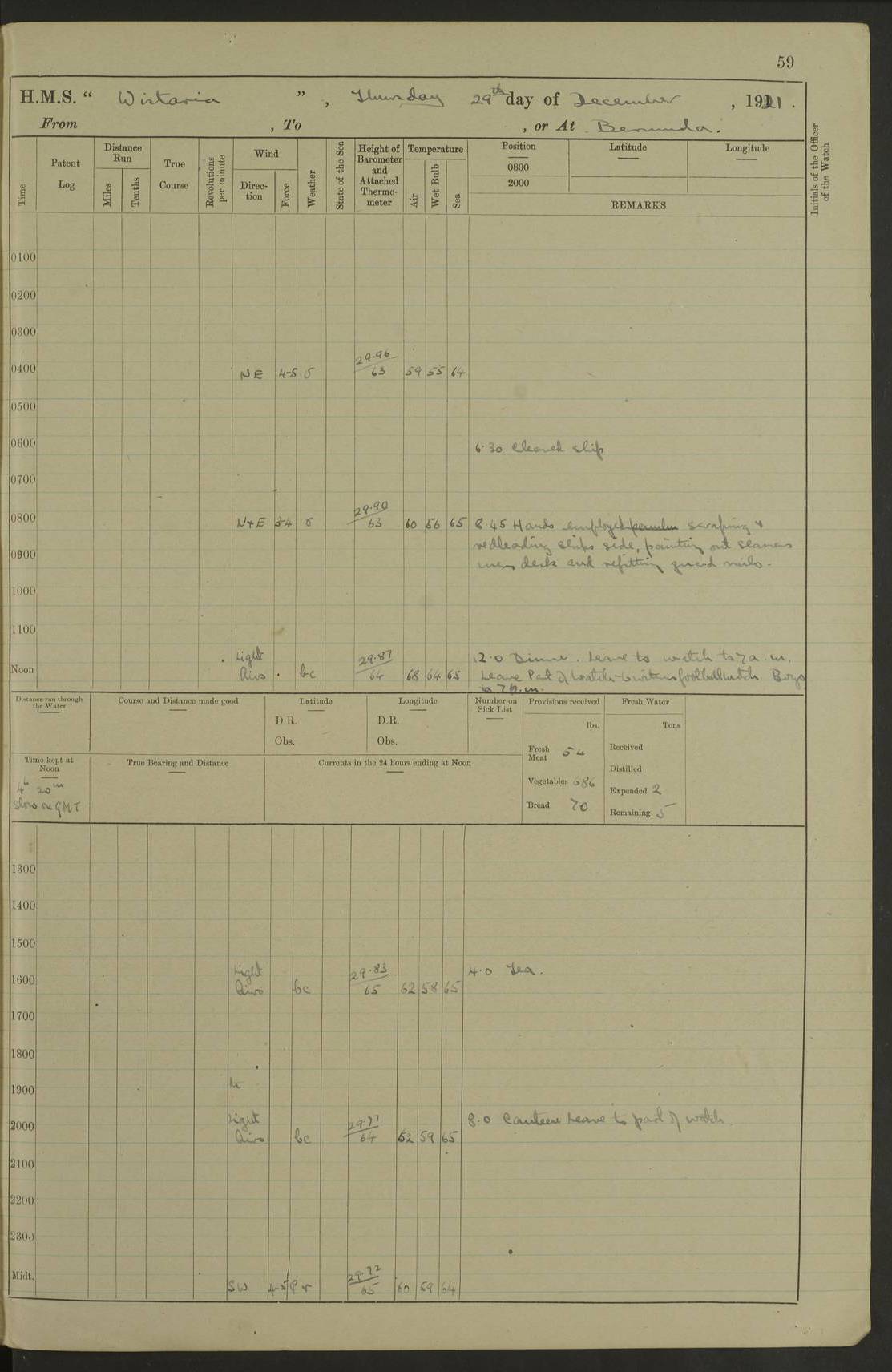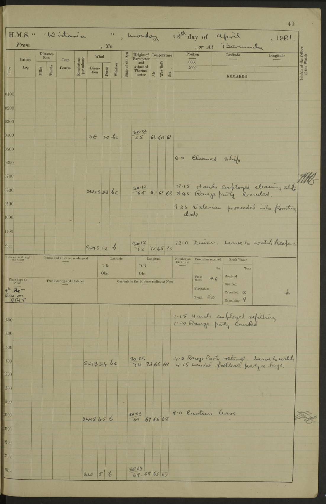 LOGS FOR JANUARY 1922 4f73ca8aa2fc8ea903000b1b: (https://s3.amazonaws.com:443/oldweather/ADM53-93265/0003_1.jpg) 1 January 1922 At Bermuda Lat 32.32, Long -64.8 6.45am: Cleaned ship 10.45am: Church of England Church Party landed 4f73ca8aa2fc8ea903000b1c: (https://s3.amazonaws.com:443/oldweather/ADM53-93265/0004_0.jpg) 2 January 1922 At Bermuda Lat 32.32, Long -64.8 8.45am: Hands employed in seamen’s mess deck & parts of ship 1.15pm: Hands employed as forenoon 4f73ca8aa2fc8ea903000b1d: (https://s3.amazonaws.com:443/oldweather/ADM53-93265/0004_1.jpg) 3 January 1922 At Bermuda Lat 32.32, Long -64.8 8.45am: Hands employed on ship’s side, seamen's mess deck, gunner party & parts of ship 1.15pm: Hands employed as forenoon pm: One Ldg Stoker discharged to RN Hospital 5.0pm: Read Warrant No 6 4f73ca8ba2fc8ea903000b1e: (https://s3.amazonaws.com:443/oldweather/ADM53-93265/0005_0.jpg) 4 January 1922 At Bermuda Lat 32.32, Long -64.8 8.45am: Hands employed painting mess deck & drawing provisions 1.15pm: Hands employed painting seamen's mess deck; on ship’s side; gunner party & parts of ship 4f73ca8ba2fc8ea903000b1f: (https://s3.amazonaws.com:443/oldweather/ADM53-93265/0005_1.jpg) 5 January 1922 At Bermuda Lat 32.32, Long -64.8 8.0am: Hands employed on ship’s side; painting mess decks; refitting boats falls am: 1 Ldg Stoker returned from hospital 4f73ca8ba2fc8ea903000b20: (https://s3.amazonaws.com:443/oldweather/ADM53-93265/0006_0.jpg) 6 January 1922 At Bermuda Lat 32.32, Long -64.8 8.0am: Hands employed painting mess decks, chipping and redleading ship’s side, refitting boats falls 9.0am: Range party landed 1.30pm: Hands employed as forenoon 4f73ca8ca2fc8ea903000b21: (https://s3.amazonaws.com:443/oldweather/ADM53-93265/0006_1.jpg) 7 January 1922 At Bermuda Lat 32.32, Long -64.8 8.0am: Hands employed painting mess decks; side party & parts of ship 8.50am: Ord Sea, boys and stokers training class landed for field training exercises 10.30am: Shifted ship to coaling jetty 11.40am: Secured alongside 4f73ca8ca2fc8ea903000b22: (https://s3.amazonaws.com:443/oldweather/ADM53-93265/0007_0.jpg) 8 January 1922 At Bermuda Lat 32.32, Long -64.8 9.45am: Hands mustered by open list 10.15am: Church of England Church Party landed 4f73ca8da2fc8ea903000b23: (https://s3.amazonaws.com:443/oldweather/ADM53-93265/0007_1.jpg) 9 January 1922 At Bermuda Lat 32.32, Long -64.8 8.0am: Prepared for docking ship 8.25am: Docking party landed. Tug “St Abbs” secured alongside 9.30am: Proceeded into dock 9.55am: Secured in dock 10.30am: Hands employed scrubbing ship’s bottom 1.15pm: Hands employed scrubbing ship’s bottom and painting mess decks pm: 1 Stoker and 1 A.B. discharged to hospital 4f73ca8da2fc8ea903000b24: (https://s3.amazonaws.com:443/oldweather/ADM53-93265/0008_0.jpg) 10 January 1922 At Bermuda Lat 32.32, Long -64.8 8.0am: Hands employed on ship’s side, painting mess decks and about 4” gun for’d 1.15pm: Hands employed as forenoon 4f73ca8da2fc8ea903000b25: (https://s3.amazonaws.com:443/oldweather/ADM53-93265/0008_1.jpg) 11 January 1922 At Bermuda Lat 32.32, Long -64.8 8.0am: Hands employed painting mess decks, chipping side and refitting falls & life belts am: One A.B. discharged to hospital 1.15pm: Hands employed lowering anchors and cables into dock & ranging cable pm: One A.B. joined ship from hospital 4f73ca8ea2fc8ea903000b26: (https://s3.amazonaws.com:443/oldweather/ADM53-93265/0009_0.jpg) 12 January 1922 At Bermuda Lat 32.32, Long -64.8 8.0am: Hands employed chipping ship’s side, painting mess deck & part of ship 5.0pm: Fire Quarters 4f73ca8ea2fc8ea903000b27: (https://s3.amazonaws.com:443/oldweather/ADM53-93265/0009_1.jpg) 13 January 1922 At Bermuda Lat 32.32, Long -64.8 8.0am: Hands employed painting mess deck, chipping ship’s side and parts of ship 1.15pm: Hands employed painting down aloft and chipping ship’s side 4f73ca8ea2fc8ea903000b28: (https://s3.amazonaws.com:443/oldweather/ADM53-93265/0010_0.jpg) 14 January 1922 At Bermuda Lat 32.32, Long -64.8 8.0am: Hands employed on ship’s side, painting down aloft; and on foremost 4” gun 4f73ca8fa2fc8ea903000b29: (https://s3.amazonaws.com:443/oldweather/ADM53-93265/0010_1.jpg) 15 January 1922 At Bermuda Lat 32.32, Long -64.8 10.20am: Church of England church party landed 4f73ca8fa2fc8ea903000b2a: (https://s3.amazonaws.com:443/oldweather/ADM53-93265/0011_0.jpg) 16 January 1922 At Bermuda Lat 32.32, Long -64.8 8.0am: Hands employed painting ship’s bottom 1.15pm: Hands employed painting ship’s bottom 5.0pm: Exercised Fire Quarters 4f73ca8fa2fc8ea903000b2b: (https://s3.amazonaws.com:443/oldweather/ADM53-93265/0011_1.jpg) 17 January 1922 At Bermuda Lat 32.32, Long -64.8 8.0am: Hands employed stowing cable in cable lockers from dock and painting ship’s bottom 1.15pm: Hands employed as forenoon 4f73ca90a2fc8ea903000b2c: (https://s3.amazonaws.com:443/oldweather/ADM53-93265/0012_0.jpg) 18 January 1922 At Bermuda Lat 32.32, Long -64.8 8.0am: Hands prepared to shift ship 9.45am: Left floating dock & secured alongside coaling wharf 10.30am: Hands employed washing down funnels & parts of ship 1.15pm: Hands employed washing funnels, shipping motor boats davits and parts of ship 4f73ca90a2fc8ea903000b2d: (https://s3.amazonaws.com:443/oldweather/ADM53-93265/0012_1.jpg) 19 January 1922 At Bermuda Lat 32.32, Long -64.8 8.0am: Hands employed chipping & painting ship’s side, stripping & cleaning 4” guns and parts of ship 8.15am: RFA “Plumleaf” left basin 9.15am: CH 14 left basin 10.35: Shifted from coaling wharf to 40 ft fender in North Basin 4f73ca91a2fc8ea903000b2e: (https://s3.amazonaws.com:443/oldweather/ADM53-93265/0013_0.jpg) 20 January 1922 At Bermuda Lat 32.32, Long -64.8 8.0am: Hands employed chipping and scraping ship’s side, about aft 4” gun and parts of ship 10.20am: Replace 2nd whaler davits. Lowered 1st whaler davits into deck 1 hand scrubber lost by accident 1.15pm: Hands employed chipping & painting ship’s side. Dismountin