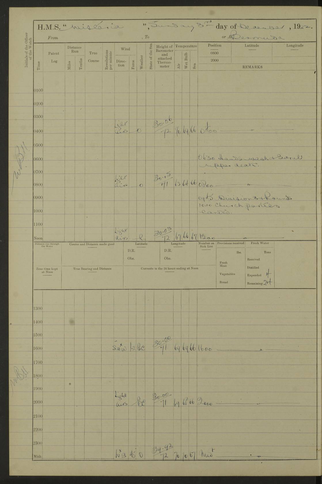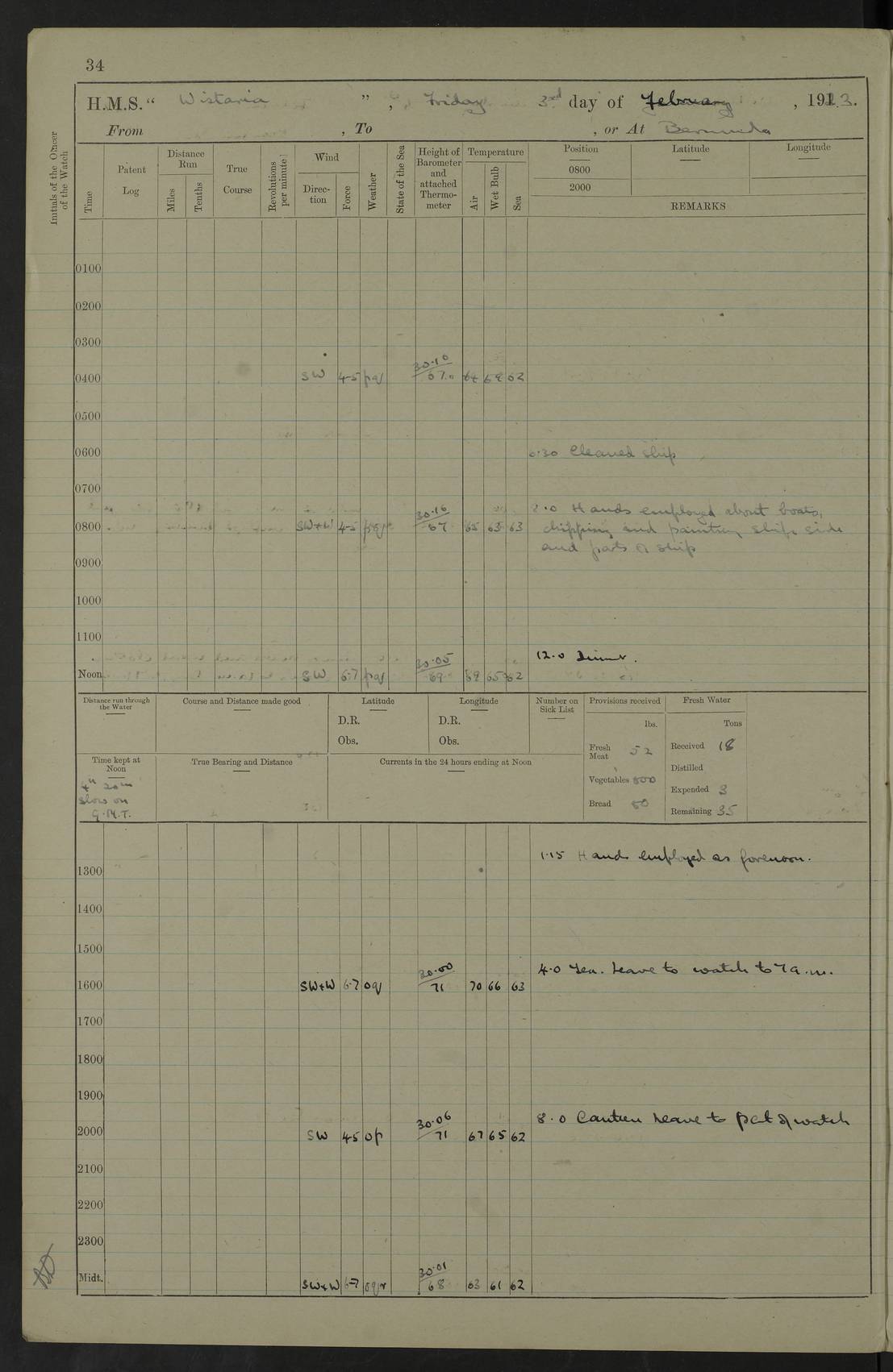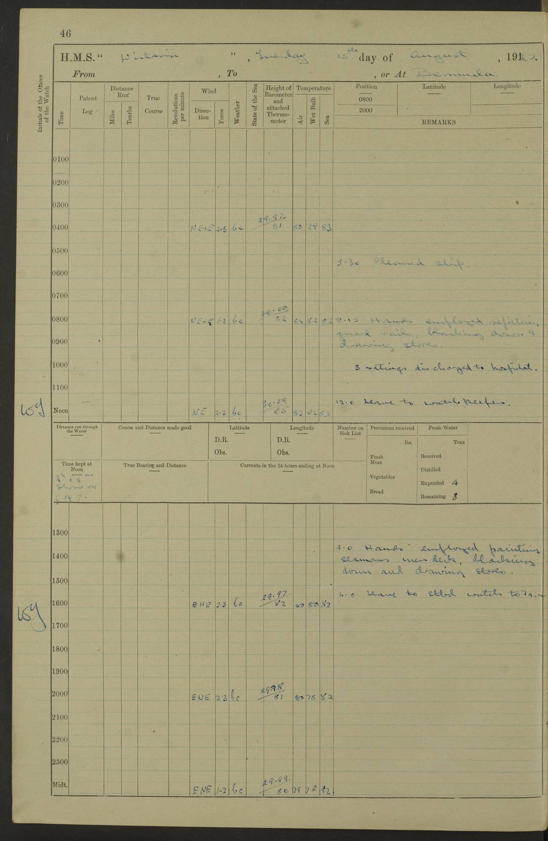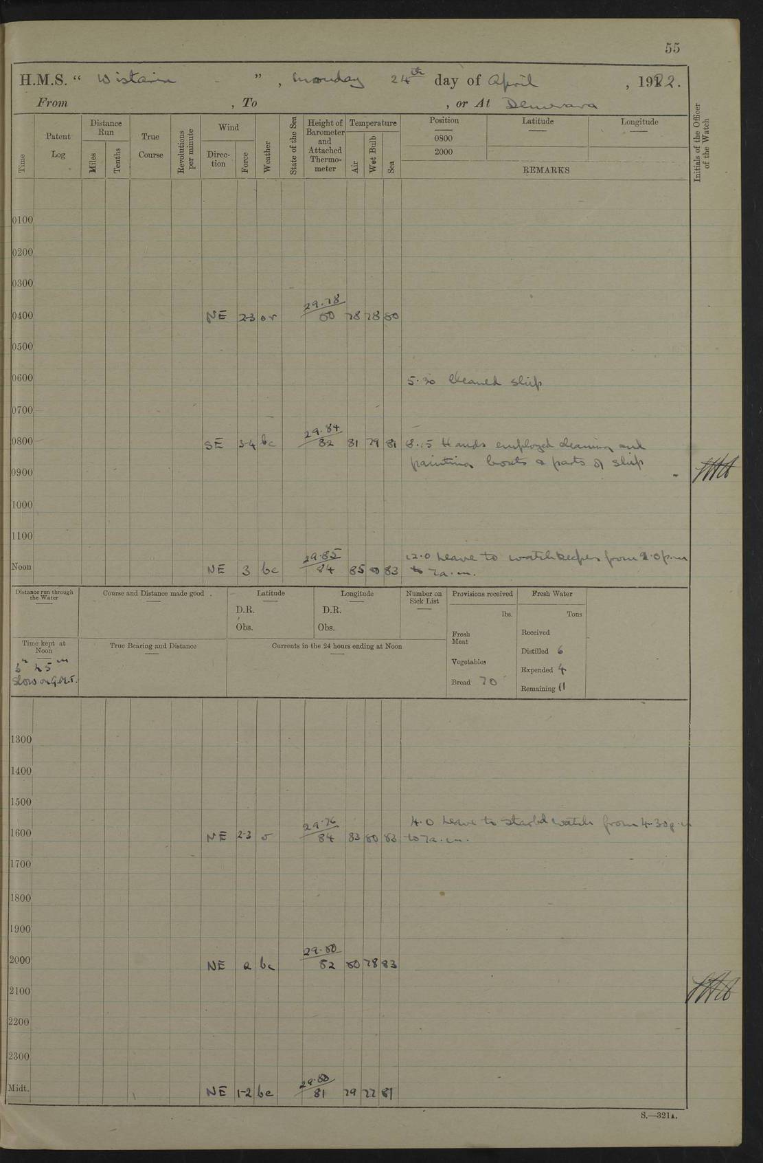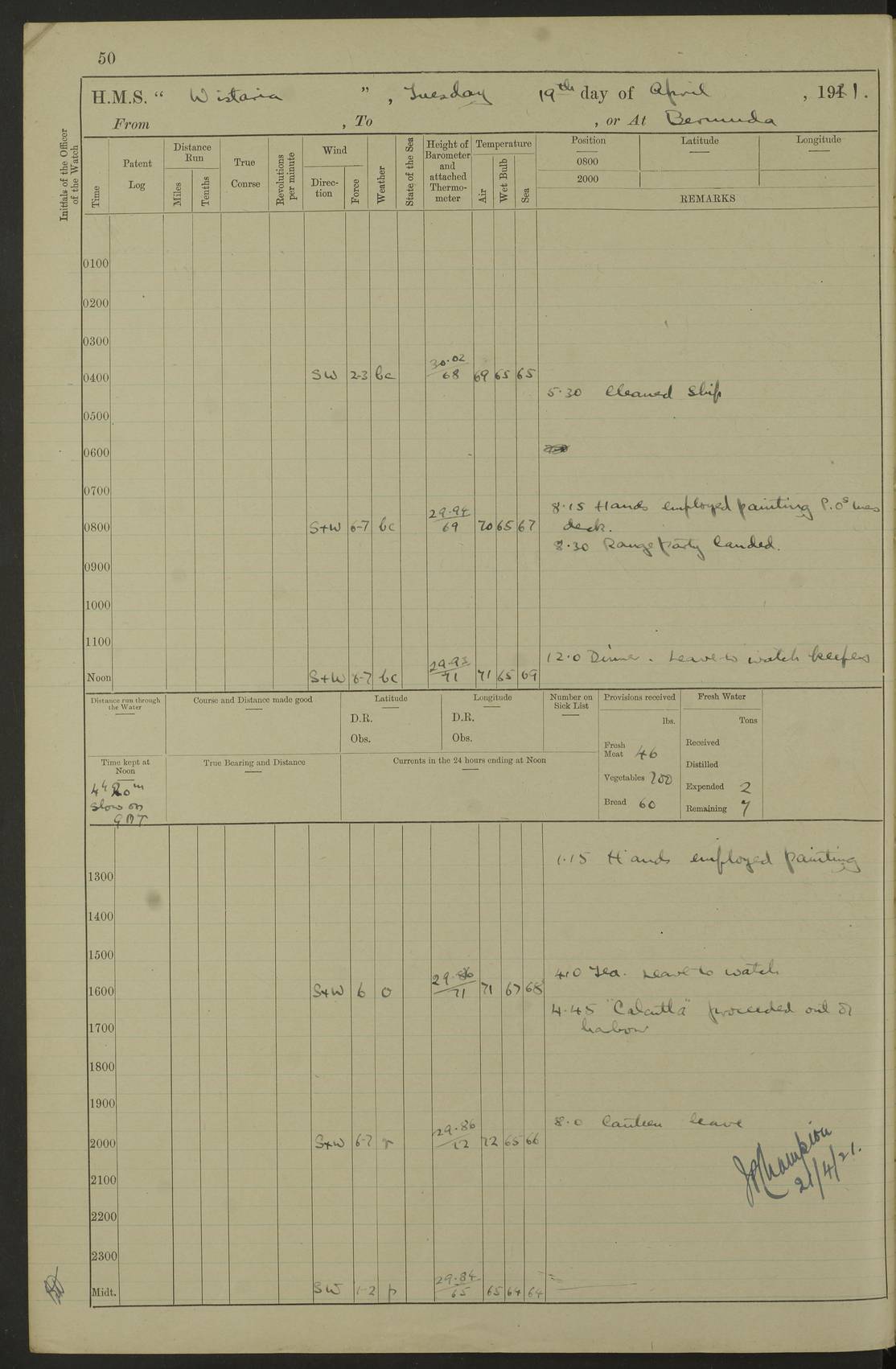 LOGS FOR JANUARY 1922 4f73ca8aa2fc8ea903000b1b: (https://s3.amazonaws.com:443/oldweather/ADM53-93265/0003_1.jpg) 1 January 1922 At Bermuda Lat 32.32, Long -64.8 6.45am: Cleaned ship 10.45am: Church of England Church Party landed 4f73ca8aa2fc8ea903000b1c: (https://s3.amazonaws.com:443/oldweather/ADM53-93265/0004_0.jpg) 2 January 1922 At Bermuda Lat 32.32, Long -64.8 8.45am: Hands employed in seamen’s mess deck & parts of ship 1.15pm: Hands employed as forenoon 4f73ca8aa2fc8ea903000b1d: (https://s3.amazonaws.com:443/oldweather/ADM53-93265/0004_1.jpg) 3 January 1922 At Bermuda Lat 32.32, Long -64.8 8.45am: Hands employed on ship’s side, seamen's mess deck, gunner party & parts of ship 1.15pm: Hands employed as forenoon pm: One Ldg Stoker discharged to RN Hospital 5.0pm: Read Warrant No 6 4f73ca8ba2fc8ea903000b1e: (https://s3.amazonaws.com:443/oldweather/ADM53-93265/0005_0.jpg) 4 January 1922 At Bermuda Lat 32.32, Long -64.8 8.45am: Hands employed painting mess deck & drawing provisions 1.15pm: Hands employed painting seamen's mess deck; on ship’s side; gunner party & parts of ship 4f73ca8ba2fc8ea903000b1f: (https://s3.amazonaws.com:443/oldweather/ADM53-93265/0005_1.jpg) 5 January 1922 At Bermuda Lat 32.32, Long -64.8 8.0am: Hands employed on ship’s side; painting mess decks; refitting boats falls am: 1 Ldg Stoker returned from hospital 4f73ca8ba2fc8ea903000b20: (https://s3.amazonaws.com:443/oldweather/ADM53-93265/0006_0.jpg) 6 January 1922 At Bermuda Lat 32.32, Long -64.8 8.0am: Hands employed painting mess decks, chipping and redleading ship’s side, refitting boats falls 9.0am: Range party landed 1.30pm: Hands employed as forenoon 4f73ca8ca2fc8ea903000b21: (https://s3.amazonaws.com:443/oldweather/ADM53-93265/0006_1.jpg) 7 January 1922 At Bermuda Lat 32.32, Long -64.8 8.0am: Hands employed painting mess decks; side party & parts of ship 8.50am: Ord Sea, boys and stokers training class landed for field training exercises 10.30am: Shifted ship to coaling jetty 11.40am: Secured alongside 4f73ca8ca2fc8ea903000b22: (https://s3.amazonaws.com:443/oldweather/ADM53-93265/0007_0.jpg) 8 January 1922 At Bermuda Lat 32.32, Long -64.8 9.45am: Hands mustered by open list 10.15am: Church of England Church Party landed 4f73ca8da2fc8ea903000b23: (https://s3.amazonaws.com:443/oldweather/ADM53-93265/0007_1.jpg) 9 January 1922 At Bermuda Lat 32.32, Long -64.8 8.0am: Prepared for docking ship 8.25am: Docking party landed. Tug “St Abbs” secured alongside 9.30am: Proceeded into dock 9.55am: Secured in dock 10.30am: Hands employed scrubbing ship’s bottom 1.15pm: Hands employed scrubbing ship’s bottom and painting mess decks pm: 1 Stoker and 1 A.B. discharged to hospital 4f73ca8da2fc8ea903000b24: (https://s3.amazonaws.com:443/oldweather/ADM53-93265/0008_0.jpg) 10 January 1922 At Bermuda Lat 32.32, Long -64.8 8.0am: Hands employed on ship’s side, painting mess decks and about 4” gun for’d 1.15pm: Hands employed as forenoon 4f73ca8da2fc8ea903000b25: (https://s3.amazonaws.com:443/oldweather/ADM53-93265/0008_1.jpg) 11 January 1922 At Bermuda Lat 32.32, Long -64.8 8.0am: Hands employed painting mess decks, chipping side and refitting falls & life belts am: One A.B. discharged to hospital 1.15pm: Hands employed lowering anchors and cables into dock & ranging cable pm: One A.B. joined ship from hospital 4f73ca8ea2fc8ea903000b26: (https://s3.amazonaws.com:443/oldweather/ADM53-93265/0009_0.jpg) 12 January 1922 At Bermuda Lat 32.32, Long -64.8 8.0am: Hands employed chipping ship’s side, painting mess deck & part of ship 5.0pm: Fire Quarters 4f73ca8ea2fc8ea903000b27: (https://s3.amazonaws.com:443/oldweather/ADM53-93265/0009_1.jpg) 13 January 1922 At Bermuda Lat 32.32, Long -64.8 8.0am: Hands employed painting mess deck, chipping ship’s side and parts of ship 1.15pm: Hands employed painting down aloft and chipping ship’s side 4f73ca8ea2fc8ea903000b28: (https://s3.amazonaws.com:443/oldweather/ADM53-93265/0010_0.jpg) 14 January 1922 At Bermuda Lat 32.32, Long -64.8 8.0am: Hands employed on ship’s side, painting down aloft; and on foremost 4” gun 4f73ca8fa2fc8ea903000b29: (https://s3.amazonaws.com:443/oldweather/ADM53-93265/0010_1.jpg) 15 January 1922 At Bermuda Lat 32.32, Long -64.8 10.20am: Church of England church party landed 4f73ca8fa2fc8ea903000b2a: (https://s3.amazonaws.com:443/oldweather/ADM53-93265/0011_0.jpg) 16 January 1922 At Bermuda Lat 32.32, Long -64.8 8.0am: Hands employed painting ship’s bottom 1.15pm: Hands employed painting ship’s bottom 5.0pm: Exercised Fire Quarters 4f73ca8fa2fc8ea903000b2b: (https://s3.amazonaws.com:443/oldweather/ADM53-93265/0011_1.jpg) 17 January 1922 At Bermuda Lat 32.32, Long -64.8 8.0am: Hands employed stowing cable in cable lockers from dock and painting ship’s bottom 1.15pm: Hands employed as forenoon 4f73ca90a2fc8ea903000b2c: (https://s3.amazonaws.com:443/oldweather/ADM53-93265/0012_0.jpg) 18 January 1922 At Bermuda Lat 32.32, Long -64.8 8.0am: Hands prepared to shift ship 9.45am: Left floating dock & secured alongside coaling wharf 10.30am: Hands employed washing down funnels & parts of ship 1.15pm: Hands employed washing funnels, shipping motor boats davits and parts of ship 4f73ca90a2fc8ea903000b2d: (https://s3.amazonaws.com:443/oldweather/ADM53-93265/0012_1.jpg) 19 January 1922 At Bermuda Lat 32.32, Long -64.8 8.0am: Hands employed chipping & painting ship’s side, stripping & cleaning 4” guns and parts of ship 8.15am: RFA “Plumleaf” left basin 9.15am: CH 14 left basin 10.35: Shifted from coaling wharf to 40 ft fender in North Basin 4f73ca91a2fc8ea903000b2e: (https://s3.amazonaws.com:443/oldweather/ADM53-93265/0013_0.jpg) 20 January 1922 At Bermuda Lat 32.32, Long -64.8 8.0am: Hands employed chipping and scraping ship’s side, about aft 4” gun and parts of ship 10.20am: Replace 2nd whaler davits. Lowered 1st whaler davits into deck 1 hand scrubber lost by accident 1.15pm: Hands employed chipping & painting ship’s side. Dismountin