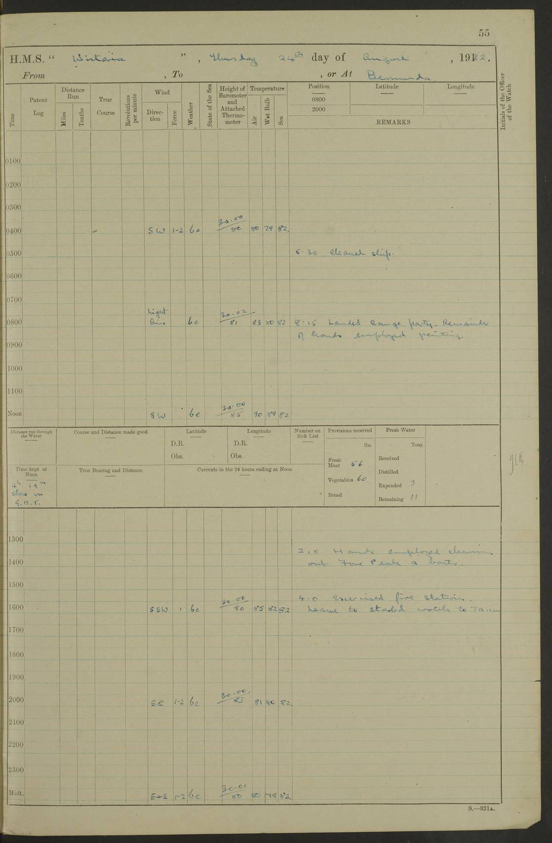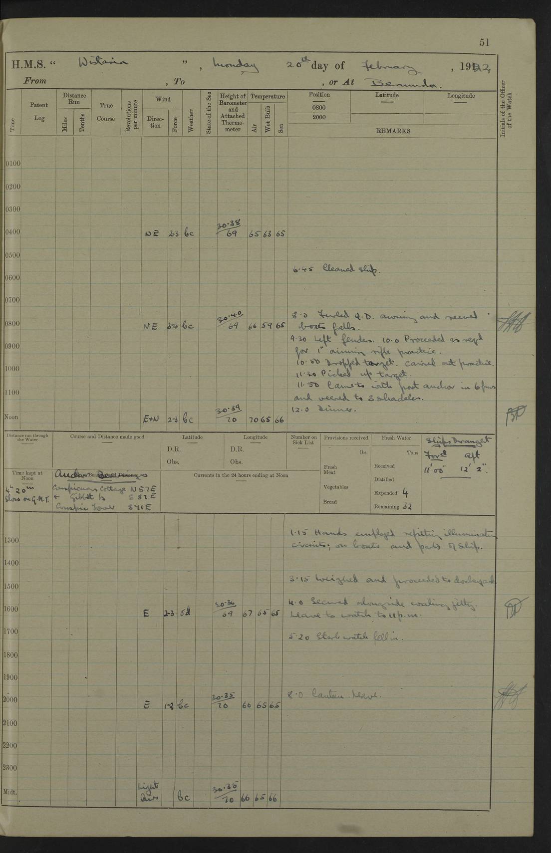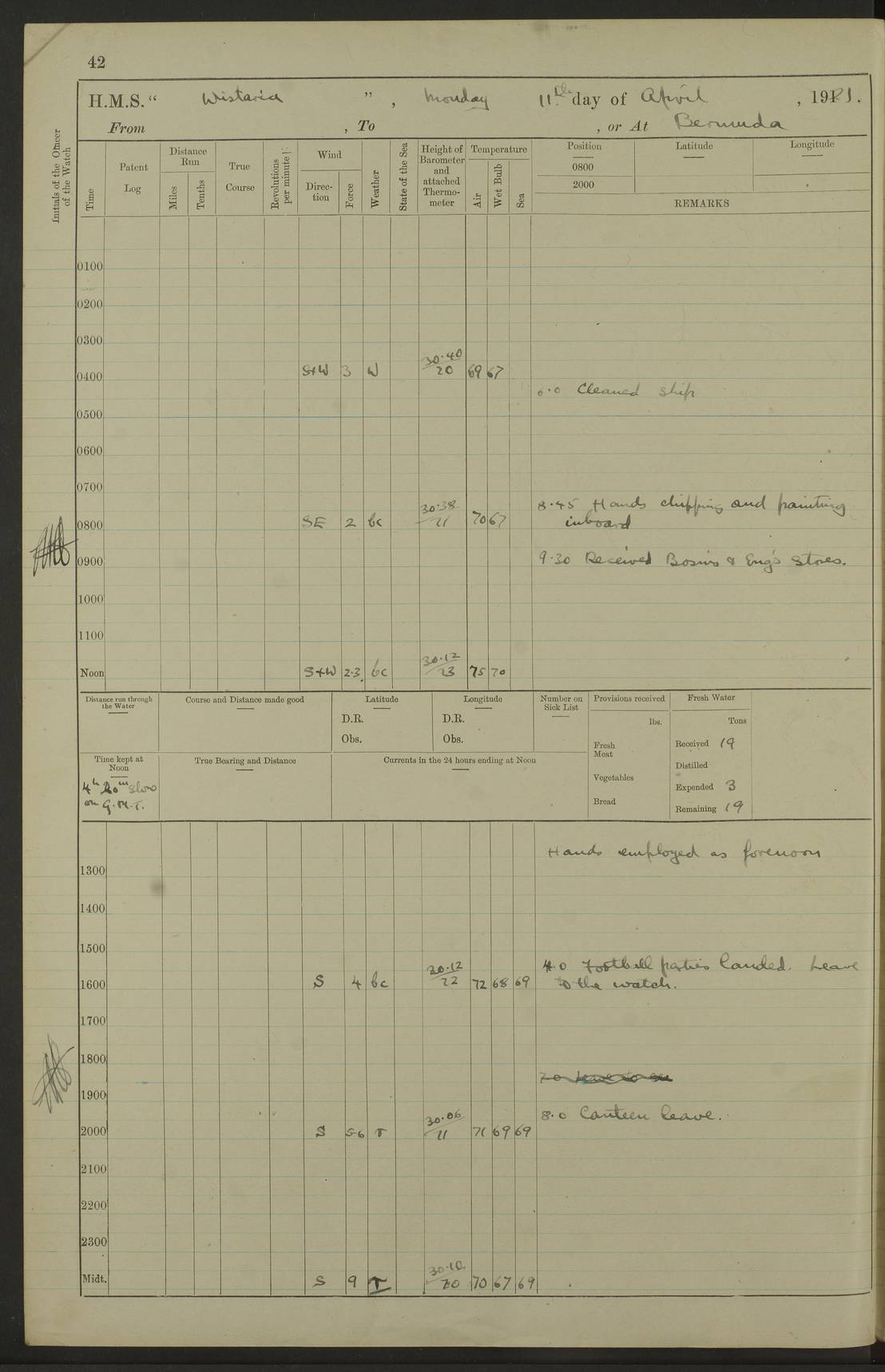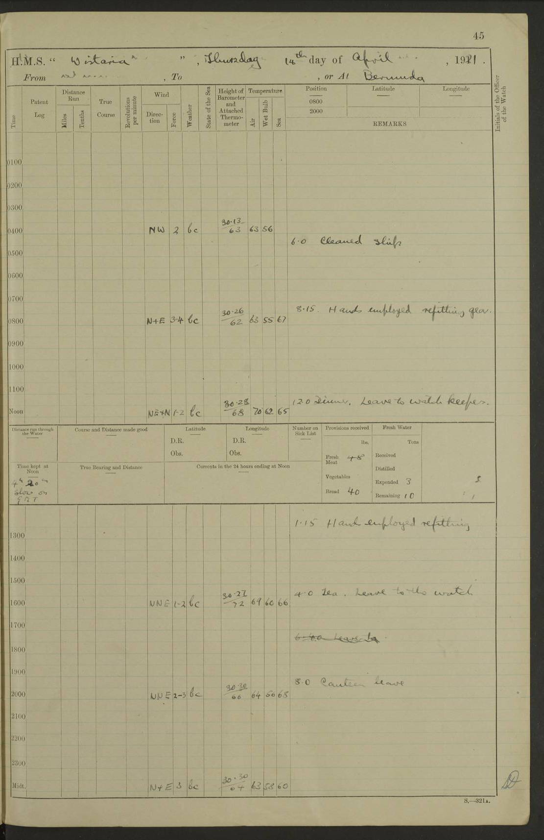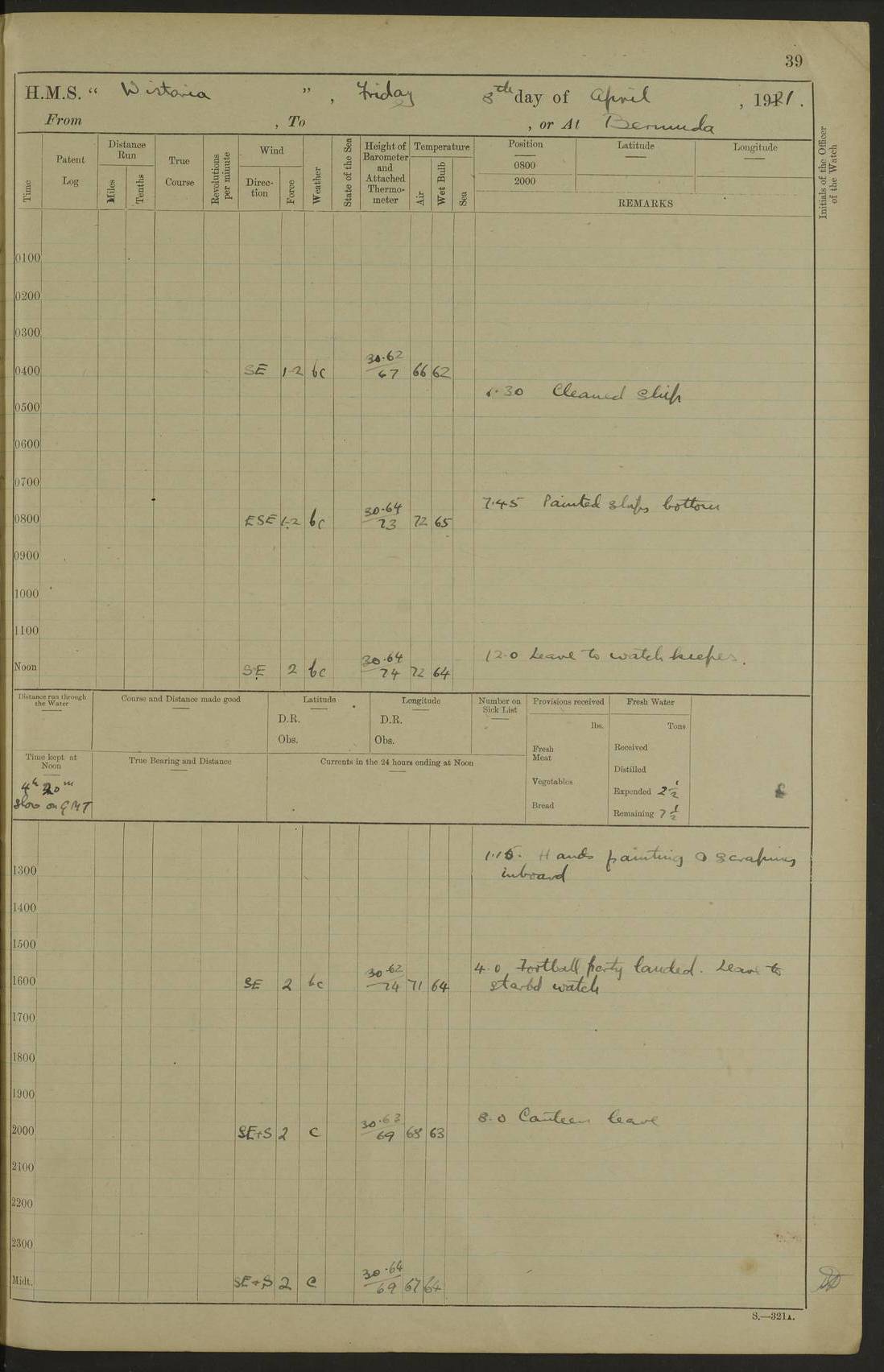 LOGS FOR JANUARY 1922 4f73ca8aa2fc8ea903000b1b: (https://s3.amazonaws.com:443/oldweather/ADM53-93265/0003_1.jpg) 1 January 1922 At Bermuda Lat 32.32, Long -64.8 6.45am: Cleaned ship 10.45am: Church of England Church Party landed 4f73ca8aa2fc8ea903000b1c: (https://s3.amazonaws.com:443/oldweather/ADM53-93265/0004_0.jpg) 2 January 1922 At Bermuda Lat 32.32, Long -64.8 8.45am: Hands employed in seamen’s mess deck & parts of ship 1.15pm: Hands employed as forenoon 4f73ca8aa2fc8ea903000b1d: (https://s3.amazonaws.com:443/oldweather/ADM53-93265/0004_1.jpg) 3 January 1922 At Bermuda Lat 32.32, Long -64.8 8.45am: Hands employed on ship’s side, seamen's mess deck, gunner party & parts of ship 1.15pm: Hands employed as forenoon pm: One Ldg Stoker discharged to RN Hospital 5.0pm: Read Warrant No 6 4f73ca8ba2fc8ea903000b1e: (https://s3.amazonaws.com:443/oldweather/ADM53-93265/0005_0.jpg) 4 January 1922 At Bermuda Lat 32.32, Long -64.8 8.45am: Hands employed painting mess deck & drawing provisions 1.15pm: Hands employed painting seamen's mess deck; on ship’s side; gunner party & parts of ship 4f73ca8ba2fc8ea903000b1f: (https://s3.amazonaws.com:443/oldweather/ADM53-93265/0005_1.jpg) 5 January 1922 At Bermuda Lat 32.32, Long -64.8 8.0am: Hands employed on ship’s side; painting mess decks; refitting boats falls am: 1 Ldg Stoker returned from hospital 4f73ca8ba2fc8ea903000b20: (https://s3.amazonaws.com:443/oldweather/ADM53-93265/0006_0.jpg) 6 January 1922 At Bermuda Lat 32.32, Long -64.8 8.0am: Hands employed painting mess decks, chipping and redleading ship’s side, refitting boats falls 9.0am: Range party landed 1.30pm: Hands employed as forenoon 4f73ca8ca2fc8ea903000b21: (https://s3.amazonaws.com:443/oldweather/ADM53-93265/0006_1.jpg) 7 January 1922 At Bermuda Lat 32.32, Long -64.8 8.0am: Hands employed painting mess decks; side party & parts of ship 8.50am: Ord Sea, boys and stokers training class landed for field training exercises 10.30am: Shifted ship to coaling jetty 11.40am: Secured alongside 4f73ca8ca2fc8ea903000b22: (https://s3.amazonaws.com:443/oldweather/ADM53-93265/0007_0.jpg) 8 January 1922 At Bermuda Lat 32.32, Long -64.8 9.45am: Hands mustered by open list 10.15am: Church of England Church Party landed 4f73ca8da2fc8ea903000b23: (https://s3.amazonaws.com:443/oldweather/ADM53-93265/0007_1.jpg) 9 January 1922 At Bermuda Lat 32.32, Long -64.8 8.0am: Prepared for docking ship 8.25am: Docking party landed. Tug “St Abbs” secured alongside 9.30am: Proceeded into dock 9.55am: Secured in dock 10.30am: Hands employed scrubbing ship’s bottom 1.15pm: Hands employed scrubbing ship’s bottom and painting mess decks pm: 1 Stoker and 1 A.B. discharged to hospital 4f73ca8da2fc8ea903000b24: (https://s3.amazonaws.com:443/oldweather/ADM53-93265/0008_0.jpg) 10 January 1922 At Bermuda Lat 32.32, Long -64.8 8.0am: Hands employed on ship’s side, painting mess decks and about 4” gun for’d 1.15pm: Hands employed as forenoon 4f73ca8da2fc8ea903000b25: (https://s3.amazonaws.com:443/oldweather/ADM53-93265/0008_1.jpg) 11 January 1922 At Bermuda Lat 32.32, Long -64.8 8.0am: Hands employed painting mess decks, chipping side and refitting falls & life belts am: One A.B. discharged to hospital 1.15pm: Hands employed lowering anchors and cables into dock & ranging cable pm: One A.B. joined ship from hospital 4f73ca8ea2fc8ea903000b26: (https://s3.amazonaws.com:443/oldweather/ADM53-93265/0009_0.jpg) 12 January 1922 At Bermuda Lat 32.32, Long -64.8 8.0am: Hands employed chipping ship’s side, painting mess deck & part of ship 5.0pm: Fire Quarters 4f73ca8ea2fc8ea903000b27: (https://s3.amazonaws.com:443/oldweather/ADM53-93265/0009_1.jpg) 13 January 1922 At Bermuda Lat 32.32, Long -64.8 8.0am: Hands employed painting mess deck, chipping ship’s side and parts of ship 1.15pm: Hands employed painting down aloft and chipping ship’s side 4f73ca8ea2fc8ea903000b28: (https://s3.amazonaws.com:443/oldweather/ADM53-93265/0010_0.jpg) 14 January 1922 At Bermuda Lat 32.32, Long -64.8 8.0am: Hands employed on ship’s side, painting down aloft; and on foremost 4” gun 4f73ca8fa2fc8ea903000b29: (https://s3.amazonaws.com:443/oldweather/ADM53-93265/0010_1.jpg) 15 January 1922 At Bermuda Lat 32.32, Long -64.8 10.20am: Church of England church party landed 4f73ca8fa2fc8ea903000b2a: (https://s3.amazonaws.com:443/oldweather/ADM53-93265/0011_0.jpg) 16 January 1922 At Bermuda Lat 32.32, Long -64.8 8.0am: Hands employed painting ship’s bottom 1.15pm: Hands employed painting ship’s bottom 5.0pm: Exercised Fire Quarters 4f73ca8fa2fc8ea903000b2b: (https://s3.amazonaws.com:443/oldweather/ADM53-93265/0011_1.jpg) 17 January 1922 At Bermuda Lat 32.32, Long -64.8 8.0am: Hands employed stowing cable in cable lockers from dock and painting ship’s bottom 1.15pm: Hands employed as forenoon 4f73ca90a2fc8ea903000b2c: (https://s3.amazonaws.com:443/oldweather/ADM53-93265/0012_0.jpg) 18 January 1922 At Bermuda Lat 32.32, Long -64.8 8.0am: Hands prepared to shift ship 9.45am: Left floating dock & secured alongside coaling wharf 10.30am: Hands employed washing down funnels & parts of ship 1.15pm: Hands employed washing funnels, shipping motor boats davits and parts of ship 4f73ca90a2fc8ea903000b2d: (https://s3.amazonaws.com:443/oldweather/ADM53-93265/0012_1.jpg) 19 January 1922 At Bermuda Lat 32.32, Long -64.8 8.0am: Hands employed chipping & painting ship’s side, stripping & cleaning 4” guns and parts of ship 8.15am: RFA “Plumleaf” left basin 9.15am: CH 14 left basin 10.35: Shifted from coaling wharf to 40 ft fender in North Basin 4f73ca91a2fc8ea903000b2e: (https://s3.amazonaws.com:443/oldweather/ADM53-93265/0013_0.jpg) 20 January 1922 At Bermuda Lat 32.32, Long -64.8 8.0am: Hands employed chipping and scraping ship’s side, about aft 4” gun and parts of ship 10.20am: Replace 2nd whaler davits. Lowered 1st whaler davits into deck 1 hand scrubber lost by accident 1.15pm: Hands employed chipping & painting ship’s side. Dismountin