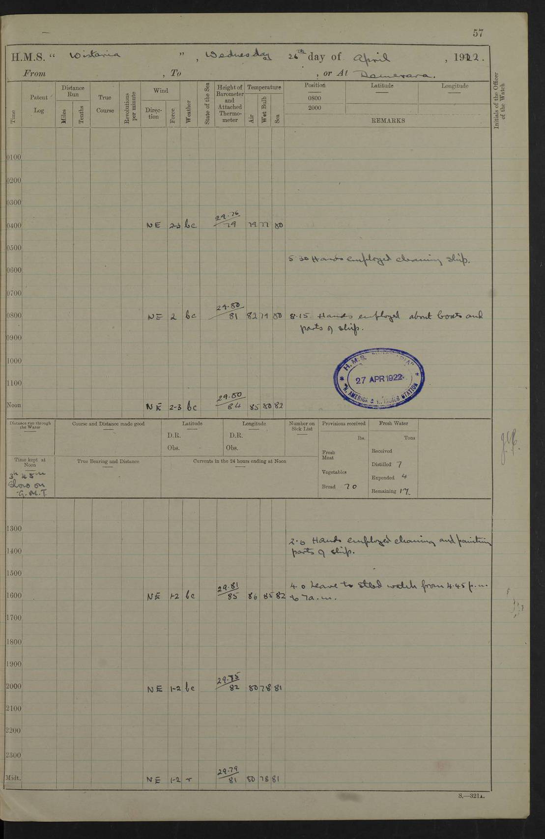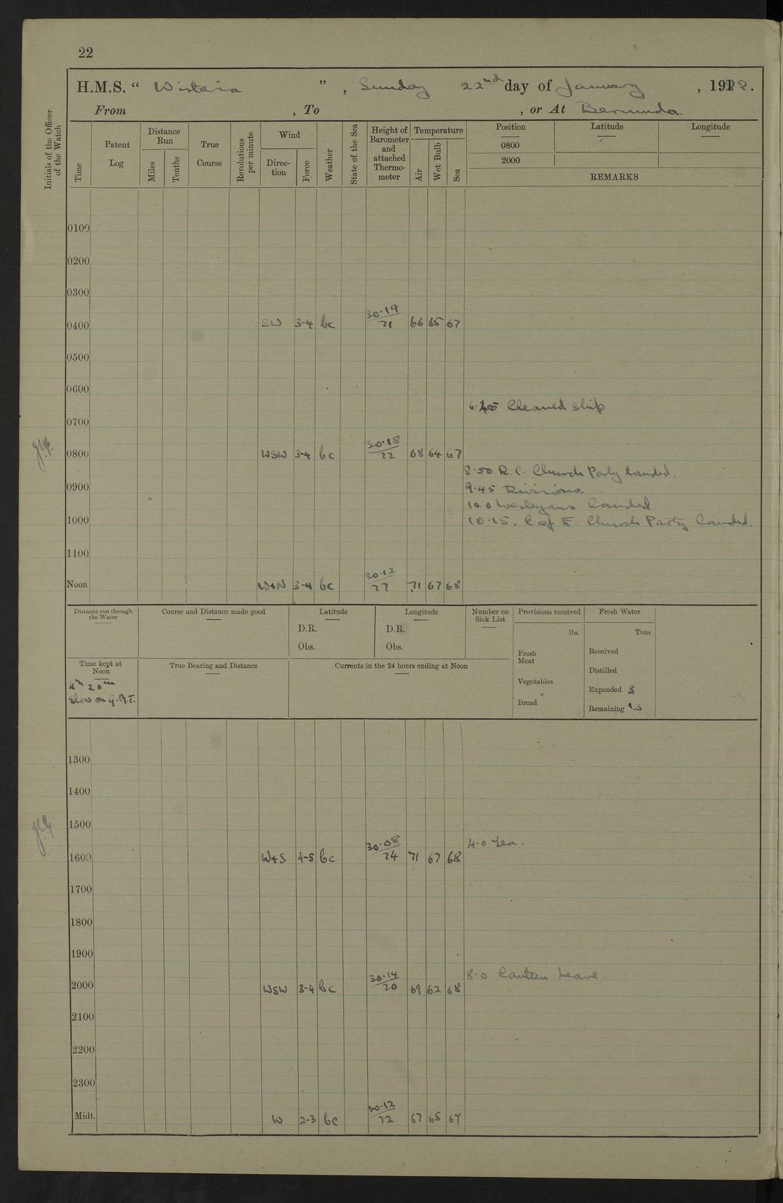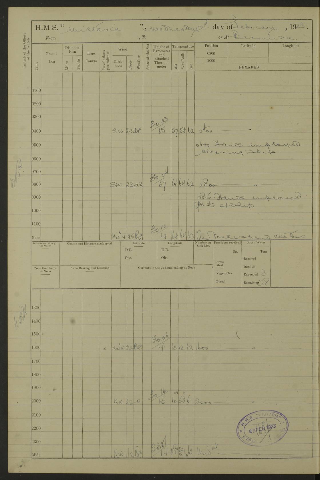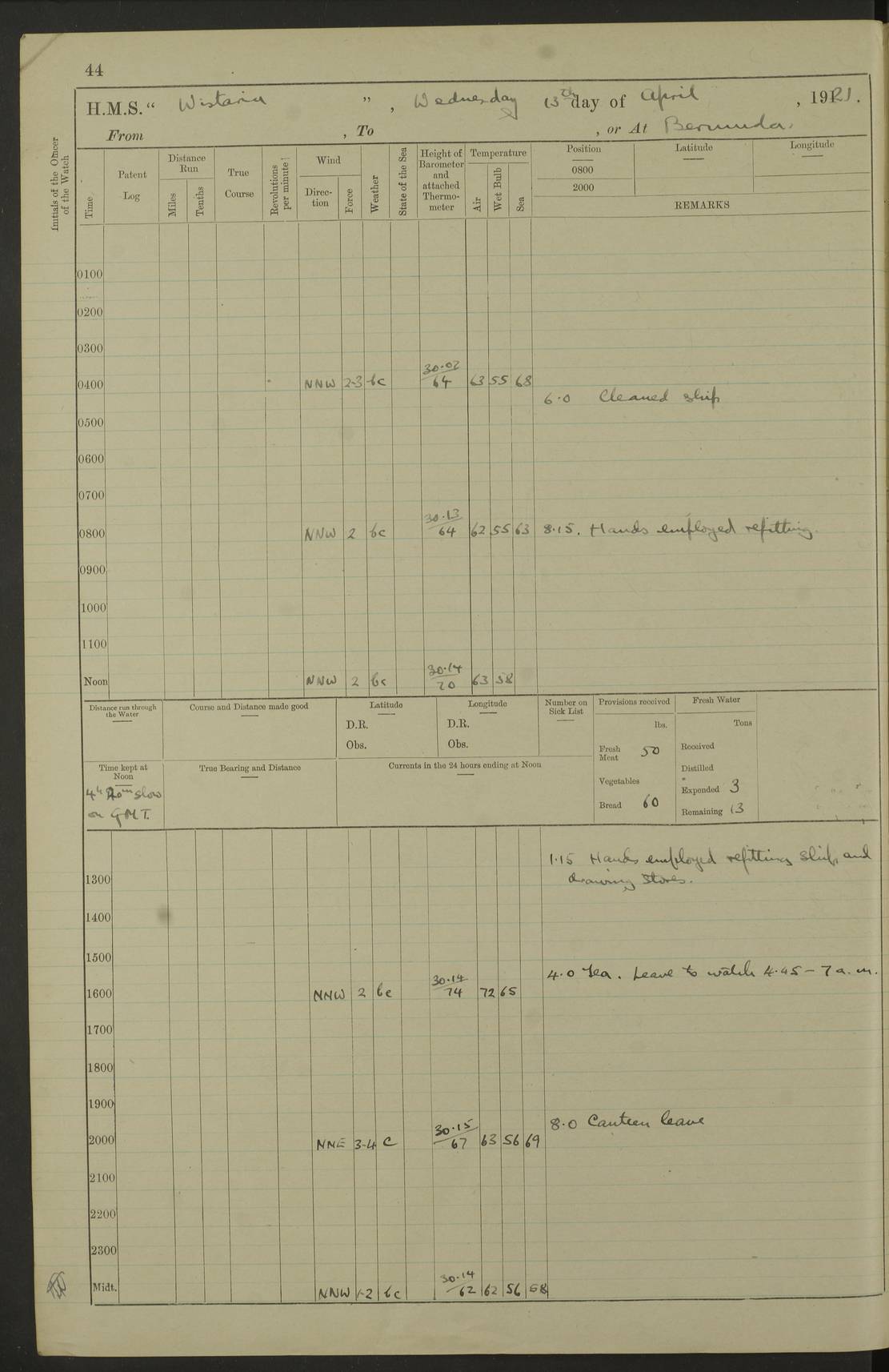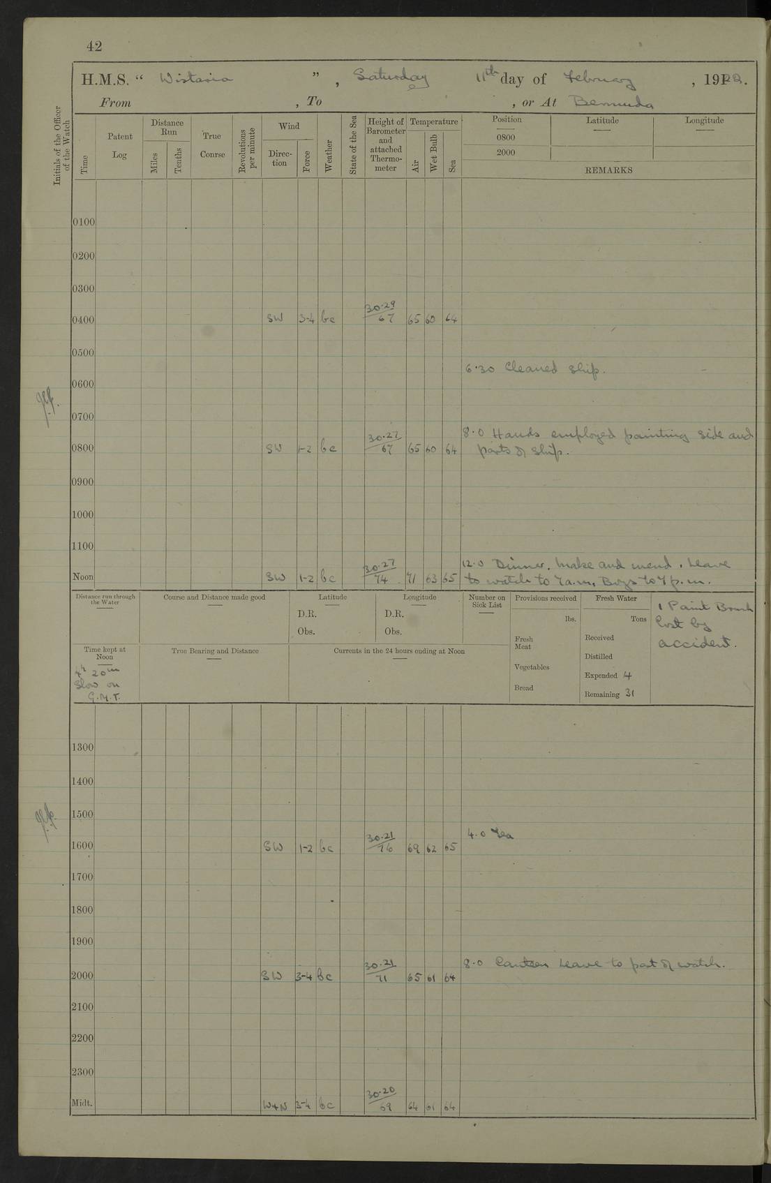 LOGS FOR JANUARY 1922 4f73ca8aa2fc8ea903000b1b: (https://s3.amazonaws.com:443/oldweather/ADM53-93265/0003_1.jpg) 1 January 1922 At Bermuda Lat 32.32, Long -64.8 6.45am: Cleaned ship 10.45am: Church of England Church Party landed 4f73ca8aa2fc8ea903000b1c: (https://s3.amazonaws.com:443/oldweather/ADM53-93265/0004_0.jpg) 2 January 1922 At Bermuda Lat 32.32, Long -64.8 8.45am: Hands employed in seamen’s mess deck & parts of ship 1.15pm: Hands employed as forenoon 4f73ca8aa2fc8ea903000b1d: (https://s3.amazonaws.com:443/oldweather/ADM53-93265/0004_1.jpg) 3 January 1922 At Bermuda Lat 32.32, Long -64.8 8.45am: Hands employed on ship’s side, seamen's mess deck, gunner party & parts of ship 1.15pm: Hands employed as forenoon pm: One Ldg Stoker discharged to RN Hospital 5.0pm: Read Warrant No 6 4f73ca8ba2fc8ea903000b1e: (https://s3.amazonaws.com:443/oldweather/ADM53-93265/0005_0.jpg) 4 January 1922 At Bermuda Lat 32.32, Long -64.8 8.45am: Hands employed painting mess deck & drawing provisions 1.15pm: Hands employed painting seamen's mess deck; on ship’s side; gunner party & parts of ship 4f73ca8ba2fc8ea903000b1f: (https://s3.amazonaws.com:443/oldweather/ADM53-93265/0005_1.jpg) 5 January 1922 At Bermuda Lat 32.32, Long -64.8 8.0am: Hands employed on ship’s side; painting mess decks; refitting boats falls am: 1 Ldg Stoker returned from hospital 4f73ca8ba2fc8ea903000b20: (https://s3.amazonaws.com:443/oldweather/ADM53-93265/0006_0.jpg) 6 January 1922 At Bermuda Lat 32.32, Long -64.8 8.0am: Hands employed painting mess decks, chipping and redleading ship’s side, refitting boats falls 9.0am: Range party landed 1.30pm: Hands employed as forenoon 4f73ca8ca2fc8ea903000b21: (https://s3.amazonaws.com:443/oldweather/ADM53-93265/0006_1.jpg) 7 January 1922 At Bermuda Lat 32.32, Long -64.8 8.0am: Hands employed painting mess decks; side party & parts of ship 8.50am: Ord Sea, boys and stokers training class landed for field training exercises 10.30am: Shifted ship to coaling jetty 11.40am: Secured alongside 4f73ca8ca2fc8ea903000b22: (https://s3.amazonaws.com:443/oldweather/ADM53-93265/0007_0.jpg) 8 January 1922 At Bermuda Lat 32.32, Long -64.8 9.45am: Hands mustered by open list 10.15am: Church of England Church Party landed 4f73ca8da2fc8ea903000b23: (https://s3.amazonaws.com:443/oldweather/ADM53-93265/0007_1.jpg) 9 January 1922 At Bermuda Lat 32.32, Long -64.8 8.0am: Prepared for docking ship 8.25am: Docking party landed. Tug “St Abbs” secured alongside 9.30am: Proceeded into dock 9.55am: Secured in dock 10.30am: Hands employed scrubbing ship’s bottom 1.15pm: Hands employed scrubbing ship’s bottom and painting mess decks pm: 1 Stoker and 1 A.B. discharged to hospital 4f73ca8da2fc8ea903000b24: (https://s3.amazonaws.com:443/oldweather/ADM53-93265/0008_0.jpg) 10 January 1922 At Bermuda Lat 32.32, Long -64.8 8.0am: Hands employed on ship’s side, painting mess decks and about 4” gun for’d 1.15pm: Hands employed as forenoon 4f73ca8da2fc8ea903000b25: (https://s3.amazonaws.com:443/oldweather/ADM53-93265/0008_1.jpg) 11 January 1922 At Bermuda Lat 32.32, Long -64.8 8.0am: Hands employed painting mess decks, chipping side and refitting falls & life belts am: One A.B. discharged to hospital 1.15pm: Hands employed lowering anchors and cables into dock & ranging cable pm: One A.B. joined ship from hospital 4f73ca8ea2fc8ea903000b26: (https://s3.amazonaws.com:443/oldweather/ADM53-93265/0009_0.jpg) 12 January 1922 At Bermuda Lat 32.32, Long -64.8 8.0am: Hands employed chipping ship’s side, painting mess deck & part of ship 5.0pm: Fire Quarters 4f73ca8ea2fc8ea903000b27: (https://s3.amazonaws.com:443/oldweather/ADM53-93265/0009_1.jpg) 13 January 1922 At Bermuda Lat 32.32, Long -64.8 8.0am: Hands employed painting mess deck, chipping ship’s side and parts of ship 1.15pm: Hands employed painting down aloft and chipping ship’s side 4f73ca8ea2fc8ea903000b28: (https://s3.amazonaws.com:443/oldweather/ADM53-93265/0010_0.jpg) 14 January 1922 At Bermuda Lat 32.32, Long -64.8 8.0am: Hands employed on ship’s side, painting down aloft; and on foremost 4” gun 4f73ca8fa2fc8ea903000b29: (https://s3.amazonaws.com:443/oldweather/ADM53-93265/0010_1.jpg) 15 January 1922 At Bermuda Lat 32.32, Long -64.8 10.20am: Church of England church party landed 4f73ca8fa2fc8ea903000b2a: (https://s3.amazonaws.com:443/oldweather/ADM53-93265/0011_0.jpg) 16 January 1922 At Bermuda Lat 32.32, Long -64.8 8.0am: Hands employed painting ship’s bottom 1.15pm: Hands employed painting ship’s bottom 5.0pm: Exercised Fire Quarters 4f73ca8fa2fc8ea903000b2b: (https://s3.amazonaws.com:443/oldweather/ADM53-93265/0011_1.jpg) 17 January 1922 At Bermuda Lat 32.32, Long -64.8 8.0am: Hands employed stowing cable in cable lockers from dock and painting ship’s bottom 1.15pm: Hands employed as forenoon 4f73ca90a2fc8ea903000b2c: (https://s3.amazonaws.com:443/oldweather/ADM53-93265/0012_0.jpg) 18 January 1922 At Bermuda Lat 32.32, Long -64.8 8.0am: Hands prepared to shift ship 9.45am: Left floating dock & secured alongside coaling wharf 10.30am: Hands employed washing down funnels & parts of ship 1.15pm: Hands employed washing funnels, shipping motor boats davits and parts of ship 4f73ca90a2fc8ea903000b2d: (https://s3.amazonaws.com:443/oldweather/ADM53-93265/0012_1.jpg) 19 January 1922 At Bermuda Lat 32.32, Long -64.8 8.0am: Hands employed chipping & painting ship’s side, stripping & cleaning 4” guns and parts of ship 8.15am: RFA “Plumleaf” left basin 9.15am: CH 14 left basin 10.35: Shifted from coaling wharf to 40 ft fender in North Basin 4f73ca91a2fc8ea903000b2e: (https://s3.amazonaws.com:443/oldweather/ADM53-93265/0013_0.jpg) 20 January 1922 At Bermuda Lat 32.32, Long -64.8 8.0am: Hands employed chipping and scraping ship’s side, about aft 4” gun and parts of ship 10.20am: Replace 2nd whaler davits. Lowered 1st whaler davits into deck 1 hand scrubber lost by accident 1.15pm: Hands employed chipping & painting ship’s side. Dismountin