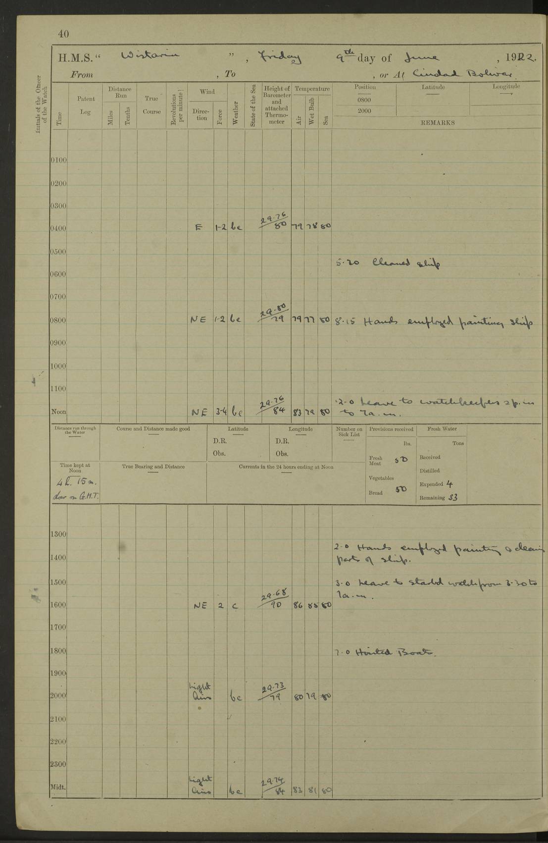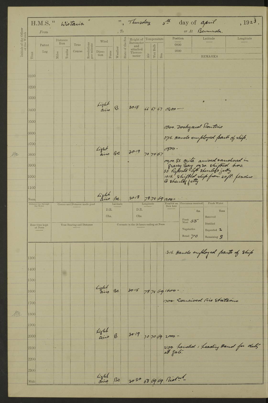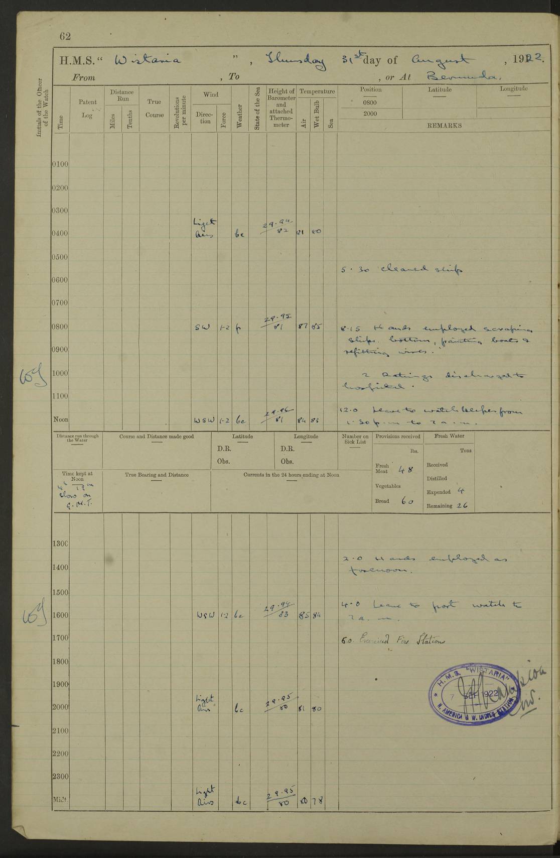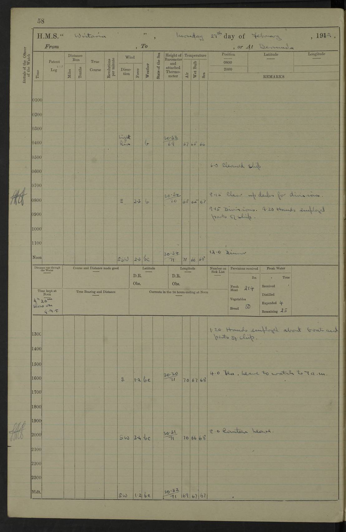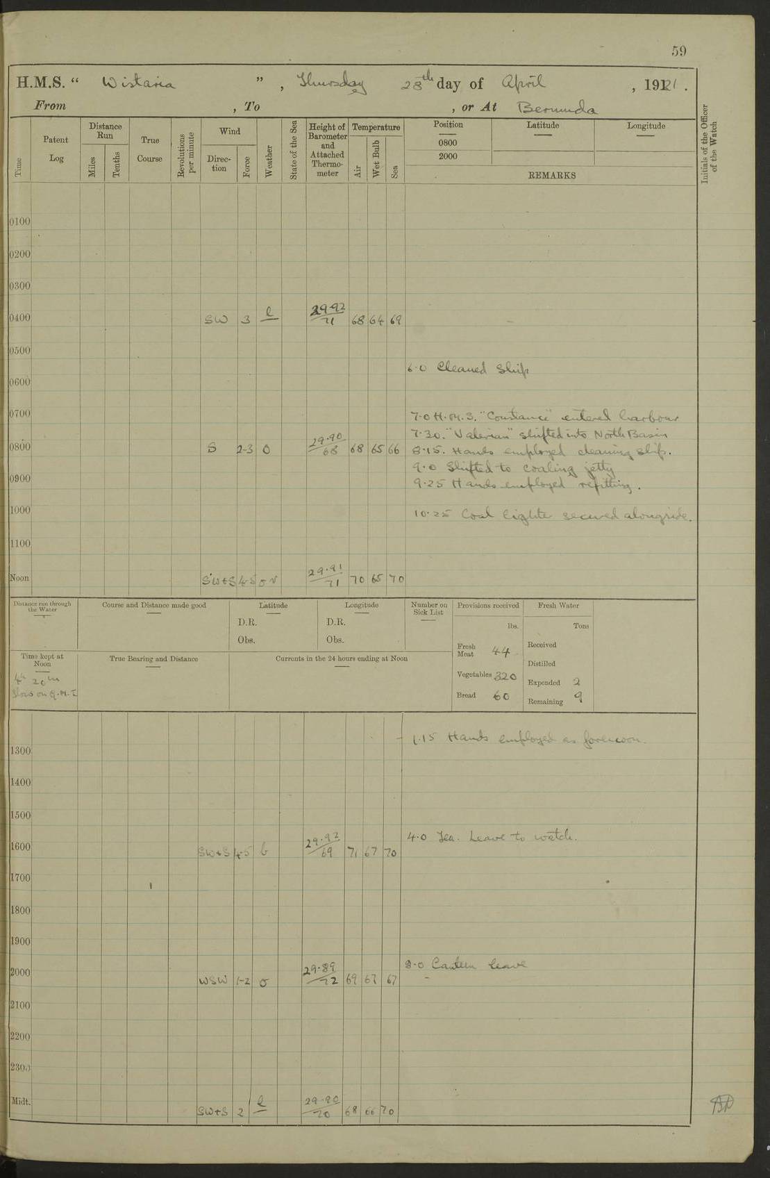 LOGS FOR JANUARY 1922 4f73ca8aa2fc8ea903000b1b: (https://s3.amazonaws.com:443/oldweather/ADM53-93265/0003_1.jpg) 1 January 1922 At Bermuda Lat 32.32, Long -64.8 6.45am: Cleaned ship 10.45am: Church of England Church Party landed 4f73ca8aa2fc8ea903000b1c: (https://s3.amazonaws.com:443/oldweather/ADM53-93265/0004_0.jpg) 2 January 1922 At Bermuda Lat 32.32, Long -64.8 8.45am: Hands employed in seamen’s mess deck & parts of ship 1.15pm: Hands employed as forenoon 4f73ca8aa2fc8ea903000b1d: (https://s3.amazonaws.com:443/oldweather/ADM53-93265/0004_1.jpg) 3 January 1922 At Bermuda Lat 32.32, Long -64.8 8.45am: Hands employed on ship’s side, seamen's mess deck, gunner party & parts of ship 1.15pm: Hands employed as forenoon pm: One Ldg Stoker discharged to RN Hospital 5.0pm: Read Warrant No 6 4f73ca8ba2fc8ea903000b1e: (https://s3.amazonaws.com:443/oldweather/ADM53-93265/0005_0.jpg) 4 January 1922 At Bermuda Lat 32.32, Long -64.8 8.45am: Hands employed painting mess deck & drawing provisions 1.15pm: Hands employed painting seamen's mess deck; on ship’s side; gunner party & parts of ship 4f73ca8ba2fc8ea903000b1f: (https://s3.amazonaws.com:443/oldweather/ADM53-93265/0005_1.jpg) 5 January 1922 At Bermuda Lat 32.32, Long -64.8 8.0am: Hands employed on ship’s side; painting mess decks; refitting boats falls am: 1 Ldg Stoker returned from hospital 4f73ca8ba2fc8ea903000b20: (https://s3.amazonaws.com:443/oldweather/ADM53-93265/0006_0.jpg) 6 January 1922 At Bermuda Lat 32.32, Long -64.8 8.0am: Hands employed painting mess decks, chipping and redleading ship’s side, refitting boats falls 9.0am: Range party landed 1.30pm: Hands employed as forenoon 4f73ca8ca2fc8ea903000b21: (https://s3.amazonaws.com:443/oldweather/ADM53-93265/0006_1.jpg) 7 January 1922 At Bermuda Lat 32.32, Long -64.8 8.0am: Hands employed painting mess decks; side party & parts of ship 8.50am: Ord Sea, boys and stokers training class landed for field training exercises 10.30am: Shifted ship to coaling jetty 11.40am: Secured alongside 4f73ca8ca2fc8ea903000b22: (https://s3.amazonaws.com:443/oldweather/ADM53-93265/0007_0.jpg) 8 January 1922 At Bermuda Lat 32.32, Long -64.8 9.45am: Hands mustered by open list 10.15am: Church of England Church Party landed 4f73ca8da2fc8ea903000b23: (https://s3.amazonaws.com:443/oldweather/ADM53-93265/0007_1.jpg) 9 January 1922 At Bermuda Lat 32.32, Long -64.8 8.0am: Prepared for docking ship 8.25am: Docking party landed. Tug “St Abbs” secured alongside 9.30am: Proceeded into dock 9.55am: Secured in dock 10.30am: Hands employed scrubbing ship’s bottom 1.15pm: Hands employed scrubbing ship’s bottom and painting mess decks pm: 1 Stoker and 1 A.B. discharged to hospital 4f73ca8da2fc8ea903000b24: (https://s3.amazonaws.com:443/oldweather/ADM53-93265/0008_0.jpg) 10 January 1922 At Bermuda Lat 32.32, Long -64.8 8.0am: Hands employed on ship’s side, painting mess decks and about 4” gun for’d 1.15pm: Hands employed as forenoon 4f73ca8da2fc8ea903000b25: (https://s3.amazonaws.com:443/oldweather/ADM53-93265/0008_1.jpg) 11 January 1922 At Bermuda Lat 32.32, Long -64.8 8.0am: Hands employed painting mess decks, chipping side and refitting falls & life belts am: One A.B. discharged to hospital 1.15pm: Hands employed lowering anchors and cables into dock & ranging cable pm: One A.B. joined ship from hospital 4f73ca8ea2fc8ea903000b26: (https://s3.amazonaws.com:443/oldweather/ADM53-93265/0009_0.jpg) 12 January 1922 At Bermuda Lat 32.32, Long -64.8 8.0am: Hands employed chipping ship’s side, painting mess deck & part of ship 5.0pm: Fire Quarters 4f73ca8ea2fc8ea903000b27: (https://s3.amazonaws.com:443/oldweather/ADM53-93265/0009_1.jpg) 13 January 1922 At Bermuda Lat 32.32, Long -64.8 8.0am: Hands employed painting mess deck, chipping ship’s side and parts of ship 1.15pm: Hands employed painting down aloft and chipping ship’s side 4f73ca8ea2fc8ea903000b28: (https://s3.amazonaws.com:443/oldweather/ADM53-93265/0010_0.jpg) 14 January 1922 At Bermuda Lat 32.32, Long -64.8 8.0am: Hands employed on ship’s side, painting down aloft; and on foremost 4” gun 4f73ca8fa2fc8ea903000b29: (https://s3.amazonaws.com:443/oldweather/ADM53-93265/0010_1.jpg) 15 January 1922 At Bermuda Lat 32.32, Long -64.8 10.20am: Church of England church party landed 4f73ca8fa2fc8ea903000b2a: (https://s3.amazonaws.com:443/oldweather/ADM53-93265/0011_0.jpg) 16 January 1922 At Bermuda Lat 32.32, Long -64.8 8.0am: Hands employed painting ship’s bottom 1.15pm: Hands employed painting ship’s bottom 5.0pm: Exercised Fire Quarters 4f73ca8fa2fc8ea903000b2b: (https://s3.amazonaws.com:443/oldweather/ADM53-93265/0011_1.jpg) 17 January 1922 At Bermuda Lat 32.32, Long -64.8 8.0am: Hands employed stowing cable in cable lockers from dock and painting ship’s bottom 1.15pm: Hands employed as forenoon 4f73ca90a2fc8ea903000b2c: (https://s3.amazonaws.com:443/oldweather/ADM53-93265/0012_0.jpg) 18 January 1922 At Bermuda Lat 32.32, Long -64.8 8.0am: Hands prepared to shift ship 9.45am: Left floating dock & secured alongside coaling wharf 10.30am: Hands employed washing down funnels & parts of ship 1.15pm: Hands employed washing funnels, shipping motor boats davits and parts of ship 4f73ca90a2fc8ea903000b2d: (https://s3.amazonaws.com:443/oldweather/ADM53-93265/0012_1.jpg) 19 January 1922 At Bermuda Lat 32.32, Long -64.8 8.0am: Hands employed chipping & painting ship’s side, stripping & cleaning 4” guns and parts of ship 8.15am: RFA “Plumleaf” left basin 9.15am: CH 14 left basin 10.35: Shifted from coaling wharf to 40 ft fender in North Basin 4f73ca91a2fc8ea903000b2e: (https://s3.amazonaws.com:443/oldweather/ADM53-93265/0013_0.jpg) 20 January 1922 At Bermuda Lat 32.32, Long -64.8 8.0am: Hands employed chipping and scraping ship’s side, about aft 4” gun and parts of ship 10.20am: Replace 2nd whaler davits. Lowered 1st whaler davits into deck 1 hand scrubber lost by accident 1.15pm: Hands employed chipping & painting ship’s side. Dismountin
