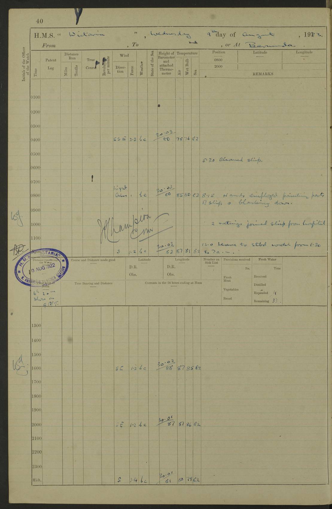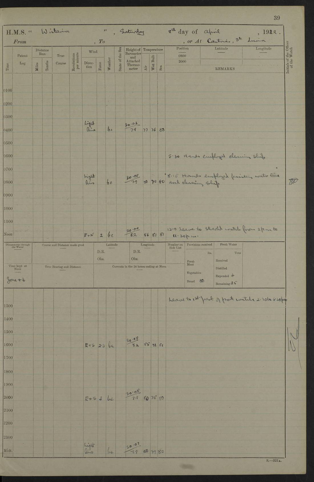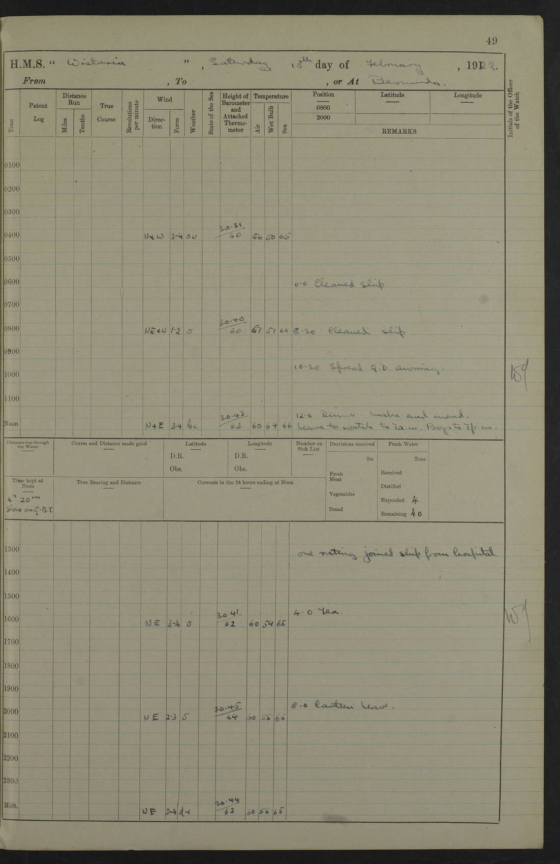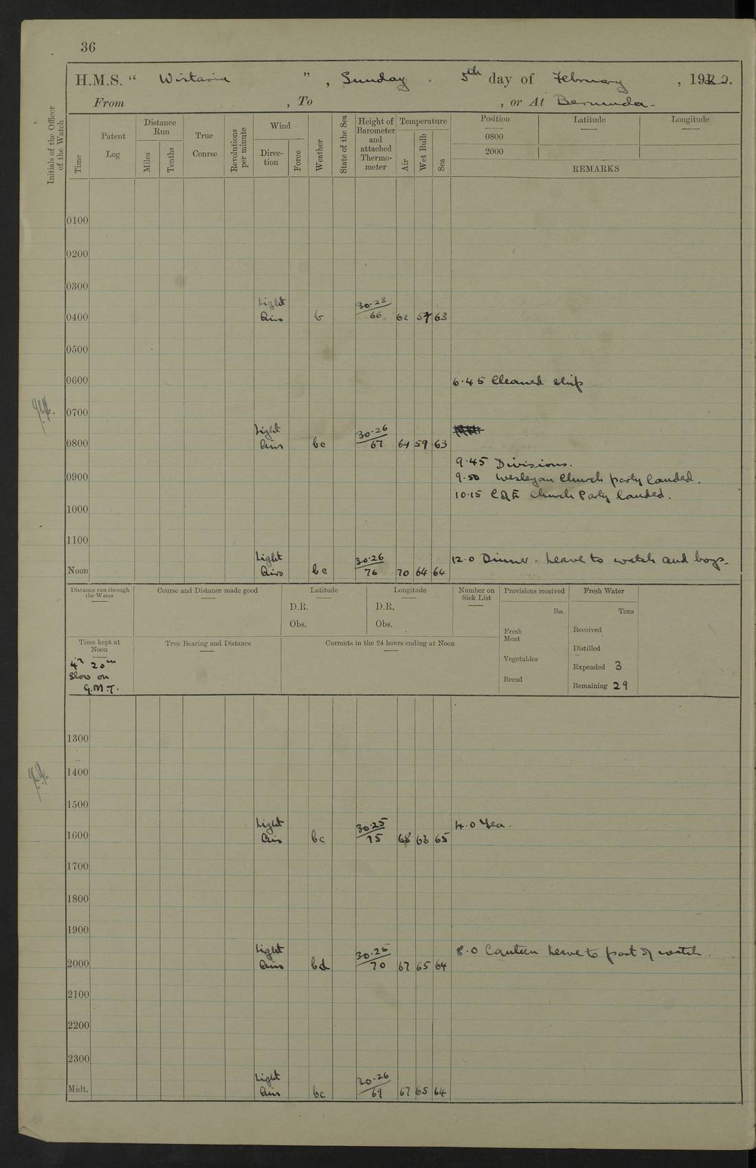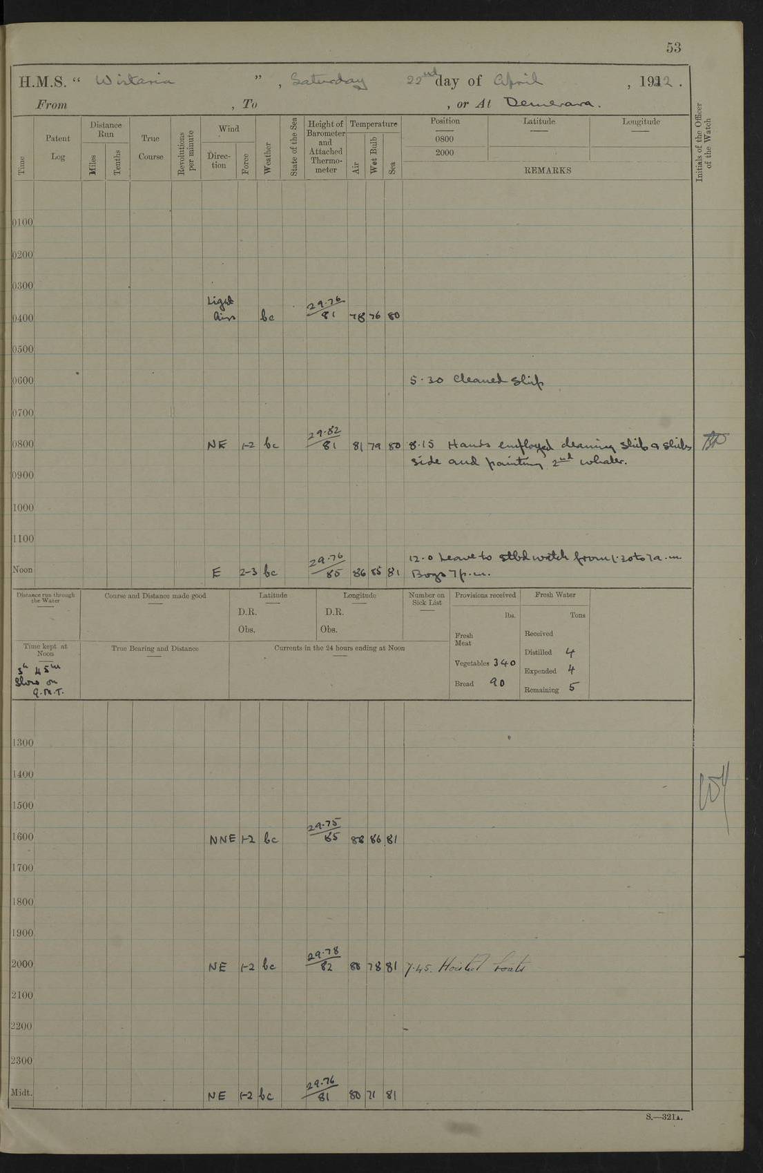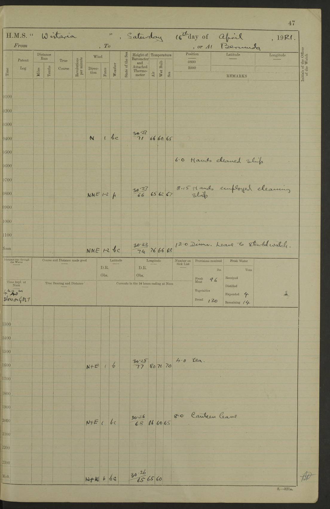 LOGS FOR JANUARY 1922 4f73ca8aa2fc8ea903000b1b: (https://s3.amazonaws.com:443/oldweather/ADM53-93265/0003_1.jpg) 1 January 1922 At Bermuda Lat 32.32, Long -64.8 6.45am: Cleaned ship 10.45am: Church of England Church Party landed 4f73ca8aa2fc8ea903000b1c: (https://s3.amazonaws.com:443/oldweather/ADM53-93265/0004_0.jpg) 2 January 1922 At Bermuda Lat 32.32, Long -64.8 8.45am: Hands employed in seamen’s mess deck & parts of ship 1.15pm: Hands employed as forenoon 4f73ca8aa2fc8ea903000b1d: (https://s3.amazonaws.com:443/oldweather/ADM53-93265/0004_1.jpg) 3 January 1922 At Bermuda Lat 32.32, Long -64.8 8.45am: Hands employed on ship’s side, seamen's mess deck, gunner party & parts of ship 1.15pm: Hands employed as forenoon pm: One Ldg Stoker discharged to RN Hospital 5.0pm: Read Warrant No 6 4f73ca8ba2fc8ea903000b1e: (https://s3.amazonaws.com:443/oldweather/ADM53-93265/0005_0.jpg) 4 January 1922 At Bermuda Lat 32.32, Long -64.8 8.45am: Hands employed painting mess deck & drawing provisions 1.15pm: Hands employed painting seamen's mess deck; on ship’s side; gunner party & parts of ship 4f73ca8ba2fc8ea903000b1f: (https://s3.amazonaws.com:443/oldweather/ADM53-93265/0005_1.jpg) 5 January 1922 At Bermuda Lat 32.32, Long -64.8 8.0am: Hands employed on ship’s side; painting mess decks; refitting boats falls am: 1 Ldg Stoker returned from hospital 4f73ca8ba2fc8ea903000b20: (https://s3.amazonaws.com:443/oldweather/ADM53-93265/0006_0.jpg) 6 January 1922 At Bermuda Lat 32.32, Long -64.8 8.0am: Hands employed painting mess decks, chipping and redleading ship’s side, refitting boats falls 9.0am: Range party landed 1.30pm: Hands employed as forenoon 4f73ca8ca2fc8ea903000b21: (https://s3.amazonaws.com:443/oldweather/ADM53-93265/0006_1.jpg) 7 January 1922 At Bermuda Lat 32.32, Long -64.8 8.0am: Hands employed painting mess decks; side party & parts of ship 8.50am: Ord Sea, boys and stokers training class landed for field training exercises 10.30am: Shifted ship to coaling jetty 11.40am: Secured alongside 4f73ca8ca2fc8ea903000b22: (https://s3.amazonaws.com:443/oldweather/ADM53-93265/0007_0.jpg) 8 January 1922 At Bermuda Lat 32.32, Long -64.8 9.45am: Hands mustered by open list 10.15am: Church of England Church Party landed 4f73ca8da2fc8ea903000b23: (https://s3.amazonaws.com:443/oldweather/ADM53-93265/0007_1.jpg) 9 January 1922 At Bermuda Lat 32.32, Long -64.8 8.0am: Prepared for docking ship 8.25am: Docking party landed. Tug “St Abbs” secured alongside 9.30am: Proceeded into dock 9.55am: Secured in dock 10.30am: Hands employed scrubbing ship’s bottom 1.15pm: Hands employed scrubbing ship’s bottom and painting mess decks pm: 1 Stoker and 1 A.B. discharged to hospital 4f73ca8da2fc8ea903000b24: (https://s3.amazonaws.com:443/oldweather/ADM53-93265/0008_0.jpg) 10 January 1922 At Bermuda Lat 32.32, Long -64.8 8.0am: Hands employed on ship’s side, painting mess decks and about 4” gun for’d 1.15pm: Hands employed as forenoon 4f73ca8da2fc8ea903000b25: (https://s3.amazonaws.com:443/oldweather/ADM53-93265/0008_1.jpg) 11 January 1922 At Bermuda Lat 32.32, Long -64.8 8.0am: Hands employed painting mess decks, chipping side and refitting falls & life belts am: One A.B. discharged to hospital 1.15pm: Hands employed lowering anchors and cables into dock & ranging cable pm: One A.B. joined ship from hospital 4f73ca8ea2fc8ea903000b26: (https://s3.amazonaws.com:443/oldweather/ADM53-93265/0009_0.jpg) 12 January 1922 At Bermuda Lat 32.32, Long -64.8 8.0am: Hands employed chipping ship’s side, painting mess deck & part of ship 5.0pm: Fire Quarters 4f73ca8ea2fc8ea903000b27: (https://s3.amazonaws.com:443/oldweather/ADM53-93265/0009_1.jpg) 13 January 1922 At Bermuda Lat 32.32, Long -64.8 8.0am: Hands employed painting mess deck, chipping ship’s side and parts of ship 1.15pm: Hands employed painting down aloft and chipping ship’s side 4f73ca8ea2fc8ea903000b28: (https://s3.amazonaws.com:443/oldweather/ADM53-93265/0010_0.jpg) 14 January 1922 At Bermuda Lat 32.32, Long -64.8 8.0am: Hands employed on ship’s side, painting down aloft; and on foremost 4” gun 4f73ca8fa2fc8ea903000b29: (https://s3.amazonaws.com:443/oldweather/ADM53-93265/0010_1.jpg) 15 January 1922 At Bermuda Lat 32.32, Long -64.8 10.20am: Church of England church party landed 4f73ca8fa2fc8ea903000b2a: (https://s3.amazonaws.com:443/oldweather/ADM53-93265/0011_0.jpg) 16 January 1922 At Bermuda Lat 32.32, Long -64.8 8.0am: Hands employed painting ship’s bottom 1.15pm: Hands employed painting ship’s bottom 5.0pm: Exercised Fire Quarters 4f73ca8fa2fc8ea903000b2b: (https://s3.amazonaws.com:443/oldweather/ADM53-93265/0011_1.jpg) 17 January 1922 At Bermuda Lat 32.32, Long -64.8 8.0am: Hands employed stowing cable in cable lockers from dock and painting ship’s bottom 1.15pm: Hands employed as forenoon 4f73ca90a2fc8ea903000b2c: (https://s3.amazonaws.com:443/oldweather/ADM53-93265/0012_0.jpg) 18 January 1922 At Bermuda Lat 32.32, Long -64.8 8.0am: Hands prepared to shift ship 9.45am: Left floating dock & secured alongside coaling wharf 10.30am: Hands employed washing down funnels & parts of ship 1.15pm: Hands employed washing funnels, shipping motor boats davits and parts of ship 4f73ca90a2fc8ea903000b2d: (https://s3.amazonaws.com:443/oldweather/ADM53-93265/0012_1.jpg) 19 January 1922 At Bermuda Lat 32.32, Long -64.8 8.0am: Hands employed chipping & painting ship’s side, stripping & cleaning 4” guns and parts of ship 8.15am: RFA “Plumleaf” left basin 9.15am: CH 14 left basin 10.35: Shifted from coaling wharf to 40 ft fender in North Basin 4f73ca91a2fc8ea903000b2e: (https://s3.amazonaws.com:443/oldweather/ADM53-93265/0013_0.jpg) 20 January 1922 At Bermuda Lat 32.32, Long -64.8 8.0am: Hands employed chipping and scraping ship’s side, about aft 4” gun and parts of ship 10.20am: Replace 2nd whaler davits. Lowered 1st whaler davits into deck 1 hand scrubber lost by accident 1.15pm: Hands employed chipping & painting ship’s side. Dismountin