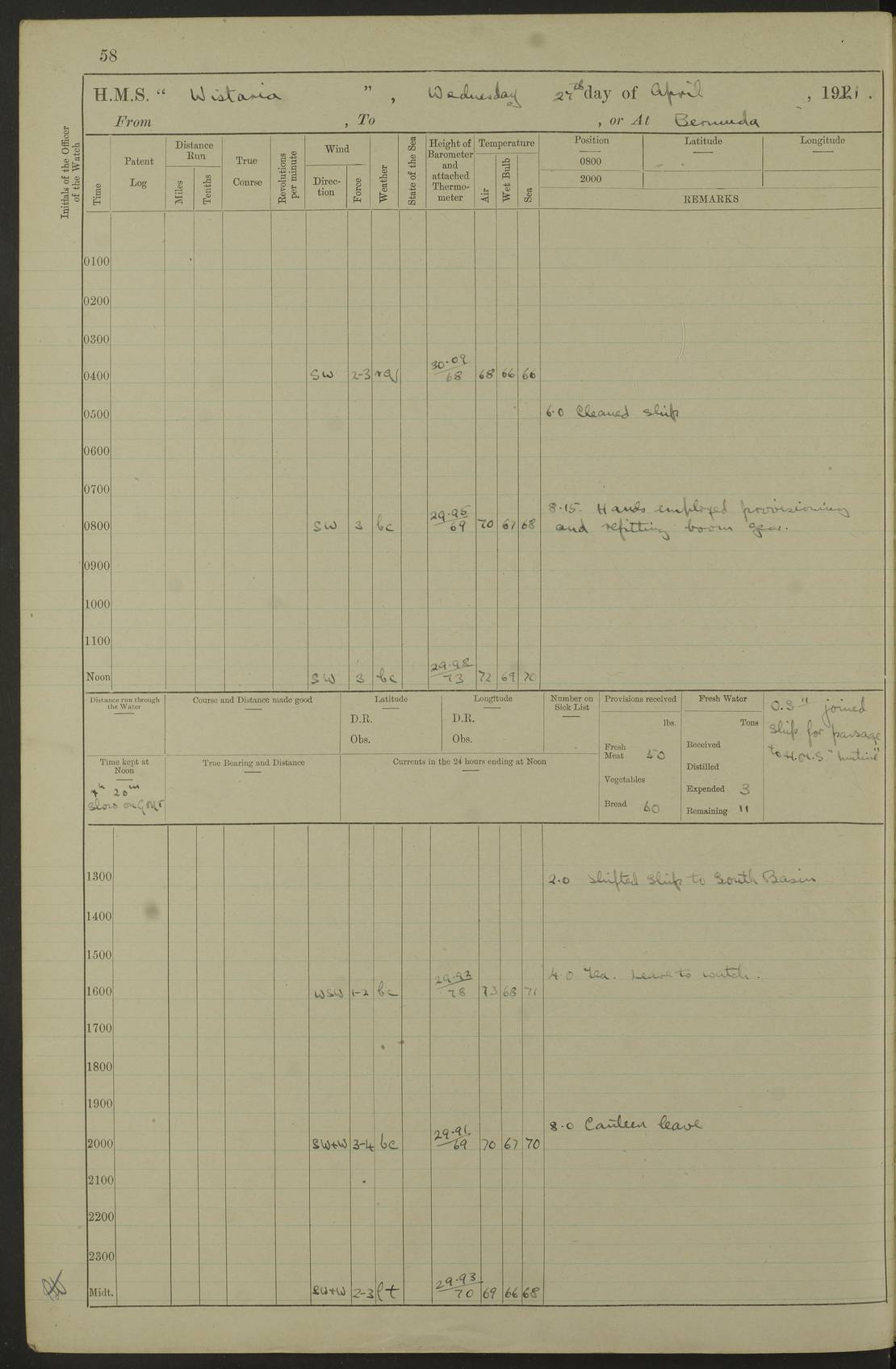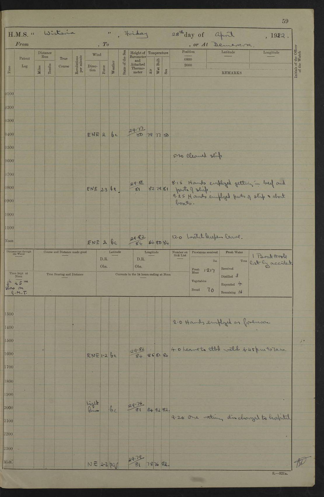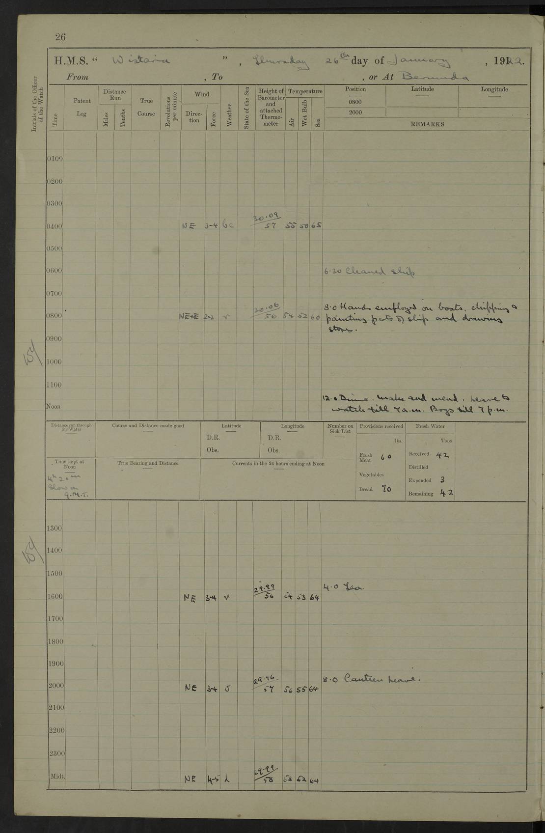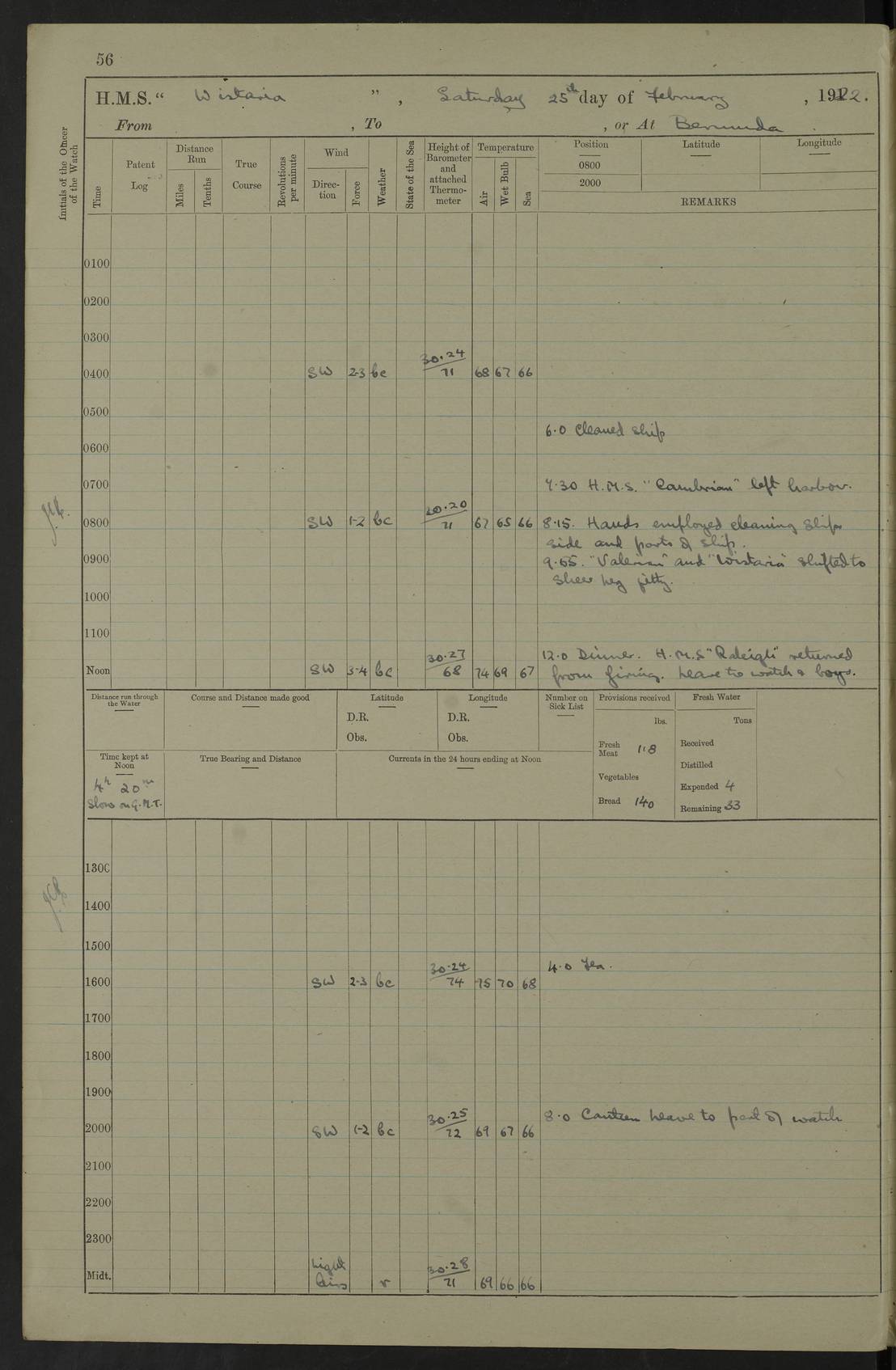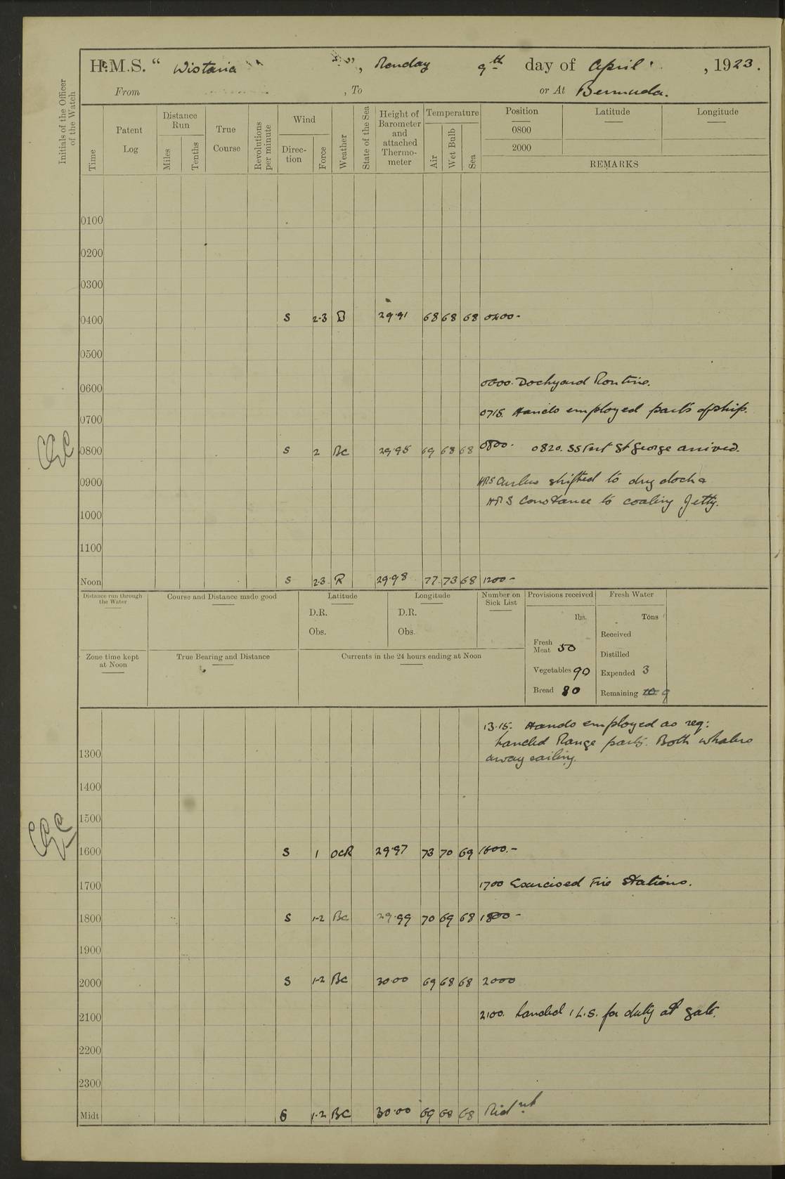 LOGS FOR JANUARY 1922 4f73ca8aa2fc8ea903000b1b: (https://s3.amazonaws.com:443/oldweather/ADM53-93265/0003_1.jpg) 1 January 1922 At Bermuda Lat 32.32, Long -64.8 6.45am: Cleaned ship 10.45am: Church of England Church Party landed 4f73ca8aa2fc8ea903000b1c: (https://s3.amazonaws.com:443/oldweather/ADM53-93265/0004_0.jpg) 2 January 1922 At Bermuda Lat 32.32, Long -64.8 8.45am: Hands employed in seamen’s mess deck & parts of ship 1.15pm: Hands employed as forenoon 4f73ca8aa2fc8ea903000b1d: (https://s3.amazonaws.com:443/oldweather/ADM53-93265/0004_1.jpg) 3 January 1922 At Bermuda Lat 32.32, Long -64.8 8.45am: Hands employed on ship’s side, seamen's mess deck, gunner party & parts of ship 1.15pm: Hands employed as forenoon pm: One Ldg Stoker discharged to RN Hospital 5.0pm: Read Warrant No 6 4f73ca8ba2fc8ea903000b1e: (https://s3.amazonaws.com:443/oldweather/ADM53-93265/0005_0.jpg) 4 January 1922 At Bermuda Lat 32.32, Long -64.8 8.45am: Hands employed painting mess deck & drawing provisions 1.15pm: Hands employed painting seamen's mess deck; on ship’s side; gunner party & parts of ship 4f73ca8ba2fc8ea903000b1f: (https://s3.amazonaws.com:443/oldweather/ADM53-93265/0005_1.jpg) 5 January 1922 At Bermuda Lat 32.32, Long -64.8 8.0am: Hands employed on ship’s side; painting mess decks; refitting boats falls am: 1 Ldg Stoker returned from hospital 4f73ca8ba2fc8ea903000b20: (https://s3.amazonaws.com:443/oldweather/ADM53-93265/0006_0.jpg) 6 January 1922 At Bermuda Lat 32.32, Long -64.8 8.0am: Hands employed painting mess decks, chipping and redleading ship’s side, refitting boats falls 9.0am: Range party landed 1.30pm: Hands employed as forenoon 4f73ca8ca2fc8ea903000b21: (https://s3.amazonaws.com:443/oldweather/ADM53-93265/0006_1.jpg) 7 January 1922 At Bermuda Lat 32.32, Long -64.8 8.0am: Hands employed painting mess decks; side party & parts of ship 8.50am: Ord Sea, boys and stokers training class landed for field training exercises 10.30am: Shifted ship to coaling jetty 11.40am: Secured alongside 4f73ca8ca2fc8ea903000b22: (https://s3.amazonaws.com:443/oldweather/ADM53-93265/0007_0.jpg) 8 January 1922 At Bermuda Lat 32.32, Long -64.8 9.45am: Hands mustered by open list 10.15am: Church of England Church Party landed 4f73ca8da2fc8ea903000b23: (https://s3.amazonaws.com:443/oldweather/ADM53-93265/0007_1.jpg) 9 January 1922 At Bermuda Lat 32.32, Long -64.8 8.0am: Prepared for docking ship 8.25am: Docking party landed. Tug “St Abbs” secured alongside 9.30am: Proceeded into dock 9.55am: Secured in dock 10.30am: Hands employed scrubbing ship’s bottom 1.15pm: Hands employed scrubbing ship’s bottom and painting mess decks pm: 1 Stoker and 1 A.B. discharged to hospital 4f73ca8da2fc8ea903000b24: (https://s3.amazonaws.com:443/oldweather/ADM53-93265/0008_0.jpg) 10 January 1922 At Bermuda Lat 32.32, Long -64.8 8.0am: Hands employed on ship’s side, painting mess decks and about 4” gun for’d 1.15pm: Hands employed as forenoon 4f73ca8da2fc8ea903000b25: (https://s3.amazonaws.com:443/oldweather/ADM53-93265/0008_1.jpg) 11 January 1922 At Bermuda Lat 32.32, Long -64.8 8.0am: Hands employed painting mess decks, chipping side and refitting falls & life belts am: One A.B. discharged to hospital 1.15pm: Hands employed lowering anchors and cables into dock & ranging cable pm: One A.B. joined ship from hospital 4f73ca8ea2fc8ea903000b26: (https://s3.amazonaws.com:443/oldweather/ADM53-93265/0009_0.jpg) 12 January 1922 At Bermuda Lat 32.32, Long -64.8 8.0am: Hands employed chipping ship’s side, painting mess deck & part of ship 5.0pm: Fire Quarters 4f73ca8ea2fc8ea903000b27: (https://s3.amazonaws.com:443/oldweather/ADM53-93265/0009_1.jpg) 13 January 1922 At Bermuda Lat 32.32, Long -64.8 8.0am: Hands employed painting mess deck, chipping ship’s side and parts of ship 1.15pm: Hands employed painting down aloft and chipping ship’s side 4f73ca8ea2fc8ea903000b28: (https://s3.amazonaws.com:443/oldweather/ADM53-93265/0010_0.jpg) 14 January 1922 At Bermuda Lat 32.32, Long -64.8 8.0am: Hands employed on ship’s side, painting down aloft; and on foremost 4” gun 4f73ca8fa2fc8ea903000b29: (https://s3.amazonaws.com:443/oldweather/ADM53-93265/0010_1.jpg) 15 January 1922 At Bermuda Lat 32.32, Long -64.8 10.20am: Church of England church party landed 4f73ca8fa2fc8ea903000b2a: (https://s3.amazonaws.com:443/oldweather/ADM53-93265/0011_0.jpg) 16 January 1922 At Bermuda Lat 32.32, Long -64.8 8.0am: Hands employed painting ship’s bottom 1.15pm: Hands employed painting ship’s bottom 5.0pm: Exercised Fire Quarters 4f73ca8fa2fc8ea903000b2b: (https://s3.amazonaws.com:443/oldweather/ADM53-93265/0011_1.jpg) 17 January 1922 At Bermuda Lat 32.32, Long -64.8 8.0am: Hands employed stowing cable in cable lockers from dock and painting ship’s bottom 1.15pm: Hands employed as forenoon 4f73ca90a2fc8ea903000b2c: (https://s3.amazonaws.com:443/oldweather/ADM53-93265/0012_0.jpg) 18 January 1922 At Bermuda Lat 32.32, Long -64.8 8.0am: Hands prepared to shift ship 9.45am: Left floating dock & secured alongside coaling wharf 10.30am: Hands employed washing down funnels & parts of ship 1.15pm: Hands employed washing funnels, shipping motor boats davits and parts of ship 4f73ca90a2fc8ea903000b2d: (https://s3.amazonaws.com:443/oldweather/ADM53-93265/0012_1.jpg) 19 January 1922 At Bermuda Lat 32.32, Long -64.8 8.0am: Hands employed chipping & painting ship’s side, stripping & cleaning 4” guns and parts of ship 8.15am: RFA “Plumleaf” left basin 9.15am: CH 14 left basin 10.35: Shifted from coaling wharf to 40 ft fender in North Basin 4f73ca91a2fc8ea903000b2e: (https://s3.amazonaws.com:443/oldweather/ADM53-93265/0013_0.jpg) 20 January 1922 At Bermuda Lat 32.32, Long -64.8 8.0am: Hands employed chipping and scraping ship’s side, about aft 4” gun and parts of ship 10.20am: Replace 2nd whaler davits. Lowered 1st whaler davits into deck 1 hand scrubber lost by accident 1.15pm: Hands employed chipping & painting ship’s side. Dismountin