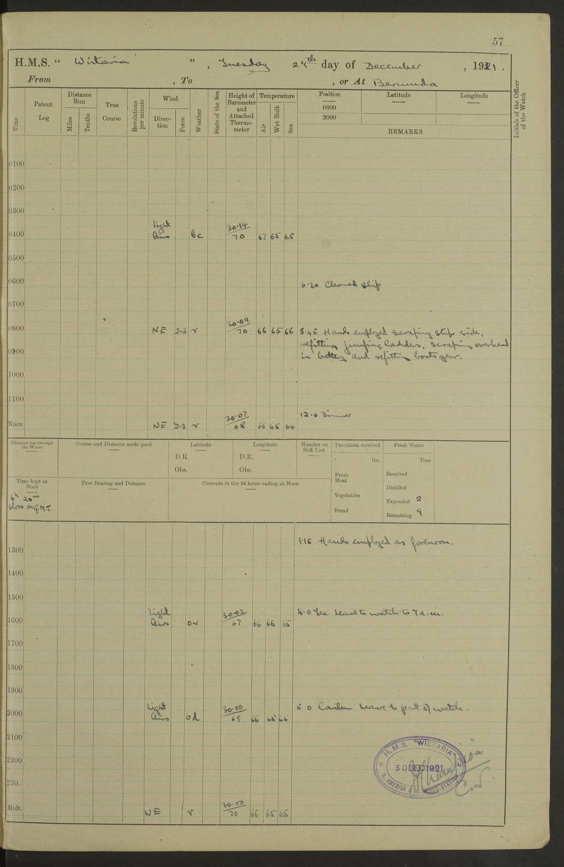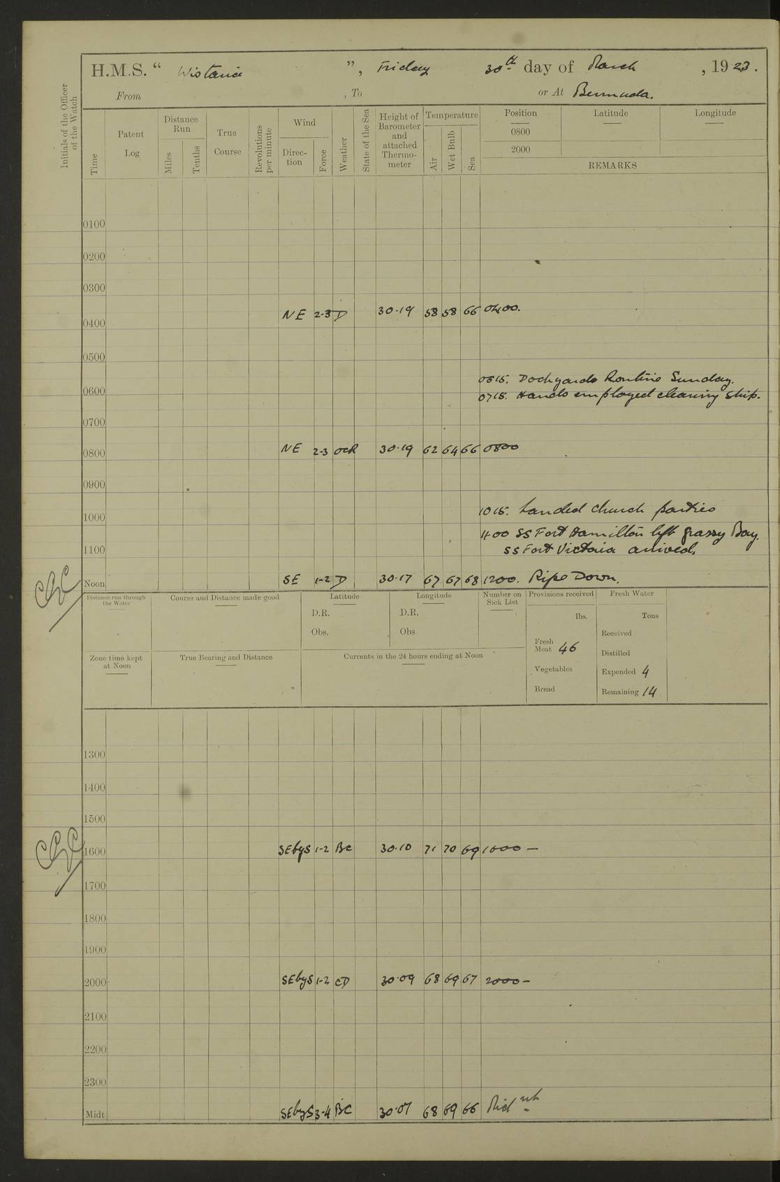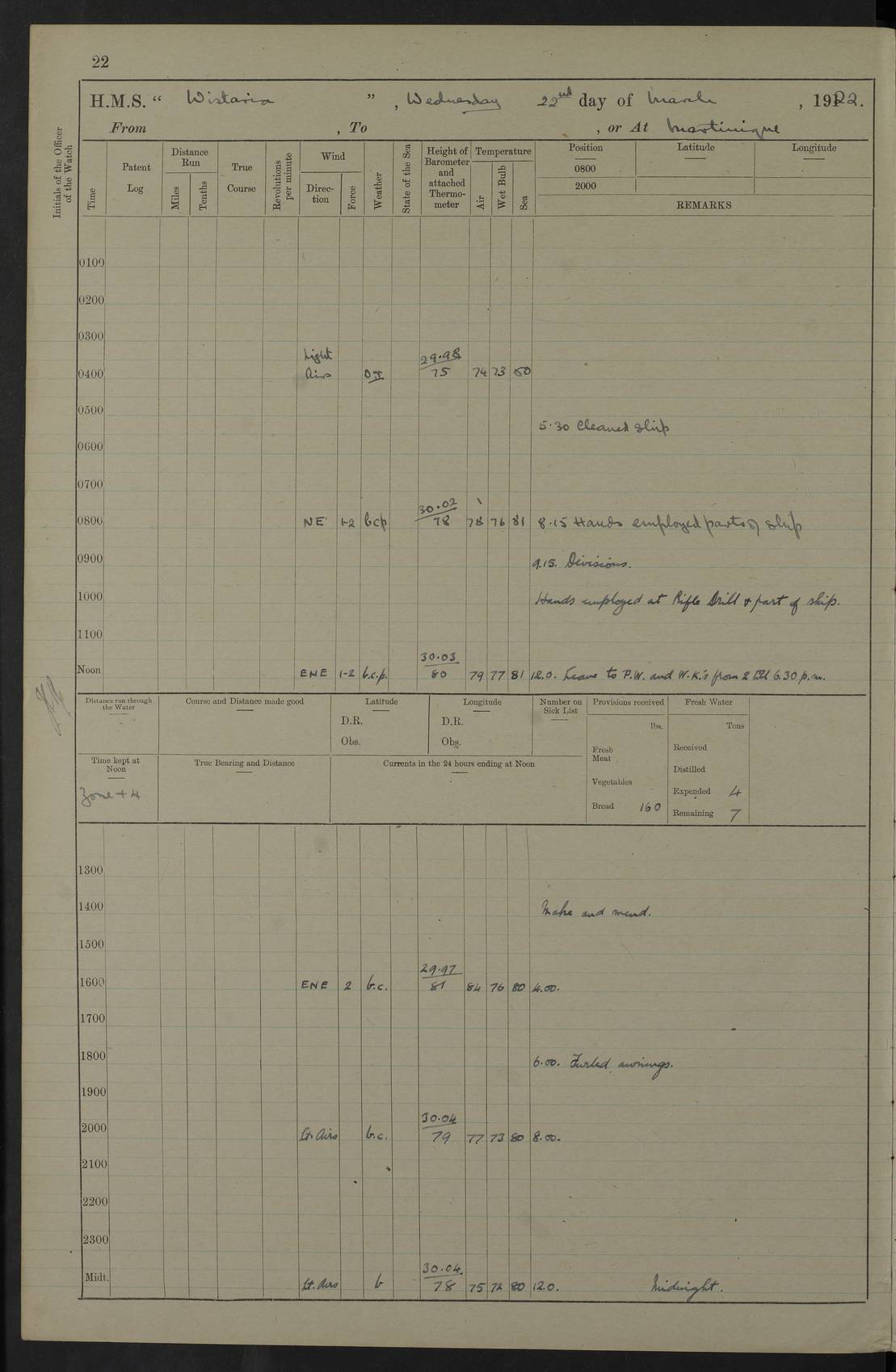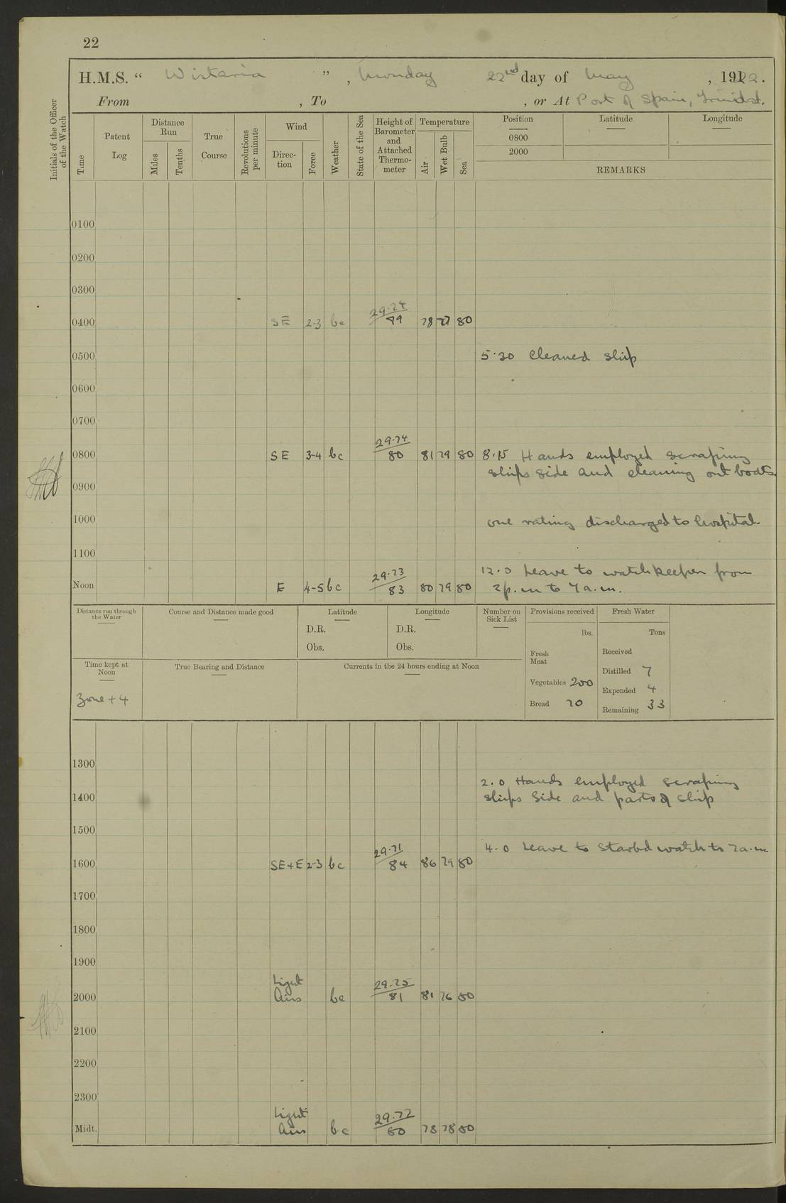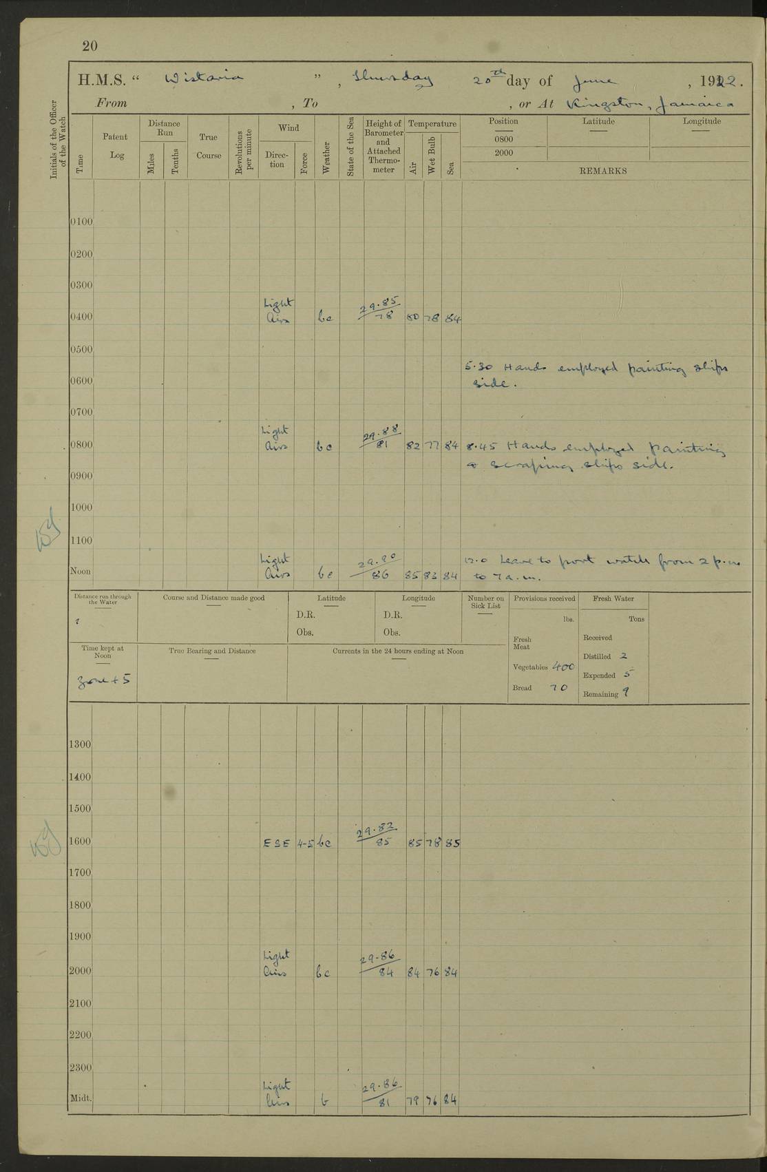 LOGS FOR JANUARY 1922 4f73ca8aa2fc8ea903000b1b: (https://s3.amazonaws.com:443/oldweather/ADM53-93265/0003_1.jpg) 1 January 1922 At Bermuda Lat 32.32, Long -64.8 6.45am: Cleaned ship 10.45am: Church of England Church Party landed 4f73ca8aa2fc8ea903000b1c: (https://s3.amazonaws.com:443/oldweather/ADM53-93265/0004_0.jpg) 2 January 1922 At Bermuda Lat 32.32, Long -64.8 8.45am: Hands employed in seamen’s mess deck & parts of ship 1.15pm: Hands employed as forenoon 4f73ca8aa2fc8ea903000b1d: (https://s3.amazonaws.com:443/oldweather/ADM53-93265/0004_1.jpg) 3 January 1922 At Bermuda Lat 32.32, Long -64.8 8.45am: Hands employed on ship’s side, seamen's mess deck, gunner party & parts of ship 1.15pm: Hands employed as forenoon pm: One Ldg Stoker discharged to RN Hospital 5.0pm: Read Warrant No 6 4f73ca8ba2fc8ea903000b1e: (https://s3.amazonaws.com:443/oldweather/ADM53-93265/0005_0.jpg) 4 January 1922 At Bermuda Lat 32.32, Long -64.8 8.45am: Hands employed painting mess deck & drawing provisions 1.15pm: Hands employed painting seamen's mess deck; on ship’s side; gunner party & parts of ship 4f73ca8ba2fc8ea903000b1f: (https://s3.amazonaws.com:443/oldweather/ADM53-93265/0005_1.jpg) 5 January 1922 At Bermuda Lat 32.32, Long -64.8 8.0am: Hands employed on ship’s side; painting mess decks; refitting boats falls am: 1 Ldg Stoker returned from hospital 4f73ca8ba2fc8ea903000b20: (https://s3.amazonaws.com:443/oldweather/ADM53-93265/0006_0.jpg) 6 January 1922 At Bermuda Lat 32.32, Long -64.8 8.0am: Hands employed painting mess decks, chipping and redleading ship’s side, refitting boats falls 9.0am: Range party landed 1.30pm: Hands employed as forenoon 4f73ca8ca2fc8ea903000b21: (https://s3.amazonaws.com:443/oldweather/ADM53-93265/0006_1.jpg) 7 January 1922 At Bermuda Lat 32.32, Long -64.8 8.0am: Hands employed painting mess decks; side party & parts of ship 8.50am: Ord Sea, boys and stokers training class landed for field training exercises 10.30am: Shifted ship to coaling jetty 11.40am: Secured alongside 4f73ca8ca2fc8ea903000b22: (https://s3.amazonaws.com:443/oldweather/ADM53-93265/0007_0.jpg) 8 January 1922 At Bermuda Lat 32.32, Long -64.8 9.45am: Hands mustered by open list 10.15am: Church of England Church Party landed 4f73ca8da2fc8ea903000b23: (https://s3.amazonaws.com:443/oldweather/ADM53-93265/0007_1.jpg) 9 January 1922 At Bermuda Lat 32.32, Long -64.8 8.0am: Prepared for docking ship 8.25am: Docking party landed. Tug “St Abbs” secured alongside 9.30am: Proceeded into dock 9.55am: Secured in dock 10.30am: Hands employed scrubbing ship’s bottom 1.15pm: Hands employed scrubbing ship’s bottom and painting mess decks pm: 1 Stoker and 1 A.B. discharged to hospital 4f73ca8da2fc8ea903000b24: (https://s3.amazonaws.com:443/oldweather/ADM53-93265/0008_0.jpg) 10 January 1922 At Bermuda Lat 32.32, Long -64.8 8.0am: Hands employed on ship’s side, painting mess decks and about 4” gun for’d 1.15pm: Hands employed as forenoon 4f73ca8da2fc8ea903000b25: (https://s3.amazonaws.com:443/oldweather/ADM53-93265/0008_1.jpg) 11 January 1922 At Bermuda Lat 32.32, Long -64.8 8.0am: Hands employed painting mess decks, chipping side and refitting falls & life belts am: One A.B. discharged to hospital 1.15pm: Hands employed lowering anchors and cables into dock & ranging cable pm: One A.B. joined ship from hospital 4f73ca8ea2fc8ea903000b26: (https://s3.amazonaws.com:443/oldweather/ADM53-93265/0009_0.jpg) 12 January 1922 At Bermuda Lat 32.32, Long -64.8 8.0am: Hands employed chipping ship’s side, painting mess deck & part of ship 5.0pm: Fire Quarters 4f73ca8ea2fc8ea903000b27: (https://s3.amazonaws.com:443/oldweather/ADM53-93265/0009_1.jpg) 13 January 1922 At Bermuda Lat 32.32, Long -64.8 8.0am: Hands employed painting mess deck, chipping ship’s side and parts of ship 1.15pm: Hands employed painting down aloft and chipping ship’s side 4f73ca8ea2fc8ea903000b28: (https://s3.amazonaws.com:443/oldweather/ADM53-93265/0010_0.jpg) 14 January 1922 At Bermuda Lat 32.32, Long -64.8 8.0am: Hands employed on ship’s side, painting down aloft; and on foremost 4” gun 4f73ca8fa2fc8ea903000b29: (https://s3.amazonaws.com:443/oldweather/ADM53-93265/0010_1.jpg) 15 January 1922 At Bermuda Lat 32.32, Long -64.8 10.20am: Church of England church party landed 4f73ca8fa2fc8ea903000b2a: (https://s3.amazonaws.com:443/oldweather/ADM53-93265/0011_0.jpg) 16 January 1922 At Bermuda Lat 32.32, Long -64.8 8.0am: Hands employed painting ship’s bottom 1.15pm: Hands employed painting ship’s bottom 5.0pm: Exercised Fire Quarters 4f73ca8fa2fc8ea903000b2b: (https://s3.amazonaws.com:443/oldweather/ADM53-93265/0011_1.jpg) 17 January 1922 At Bermuda Lat 32.32, Long -64.8 8.0am: Hands employed stowing cable in cable lockers from dock and painting ship’s bottom 1.15pm: Hands employed as forenoon 4f73ca90a2fc8ea903000b2c: (https://s3.amazonaws.com:443/oldweather/ADM53-93265/0012_0.jpg) 18 January 1922 At Bermuda Lat 32.32, Long -64.8 8.0am: Hands prepared to shift ship 9.45am: Left floating dock & secured alongside coaling wharf 10.30am: Hands employed washing down funnels & parts of ship 1.15pm: Hands employed washing funnels, shipping motor boats davits and parts of ship 4f73ca90a2fc8ea903000b2d: (https://s3.amazonaws.com:443/oldweather/ADM53-93265/0012_1.jpg) 19 January 1922 At Bermuda Lat 32.32, Long -64.8 8.0am: Hands employed chipping & painting ship’s side, stripping & cleaning 4” guns and parts of ship 8.15am: RFA “Plumleaf” left basin 9.15am: CH 14 left basin 10.35: Shifted from coaling wharf to 40 ft fender in North Basin 4f73ca91a2fc8ea903000b2e: (https://s3.amazonaws.com:443/oldweather/ADM53-93265/0013_0.jpg) 20 January 1922 At Bermuda Lat 32.32, Long -64.8 8.0am: Hands employed chipping and scraping ship’s side, about aft 4” gun and parts of ship 10.20am: Replace 2nd whaler davits. Lowered 1st whaler davits into deck 1 hand scrubber lost by accident 1.15pm: Hands employed chipping & painting ship’s side. Dismountin