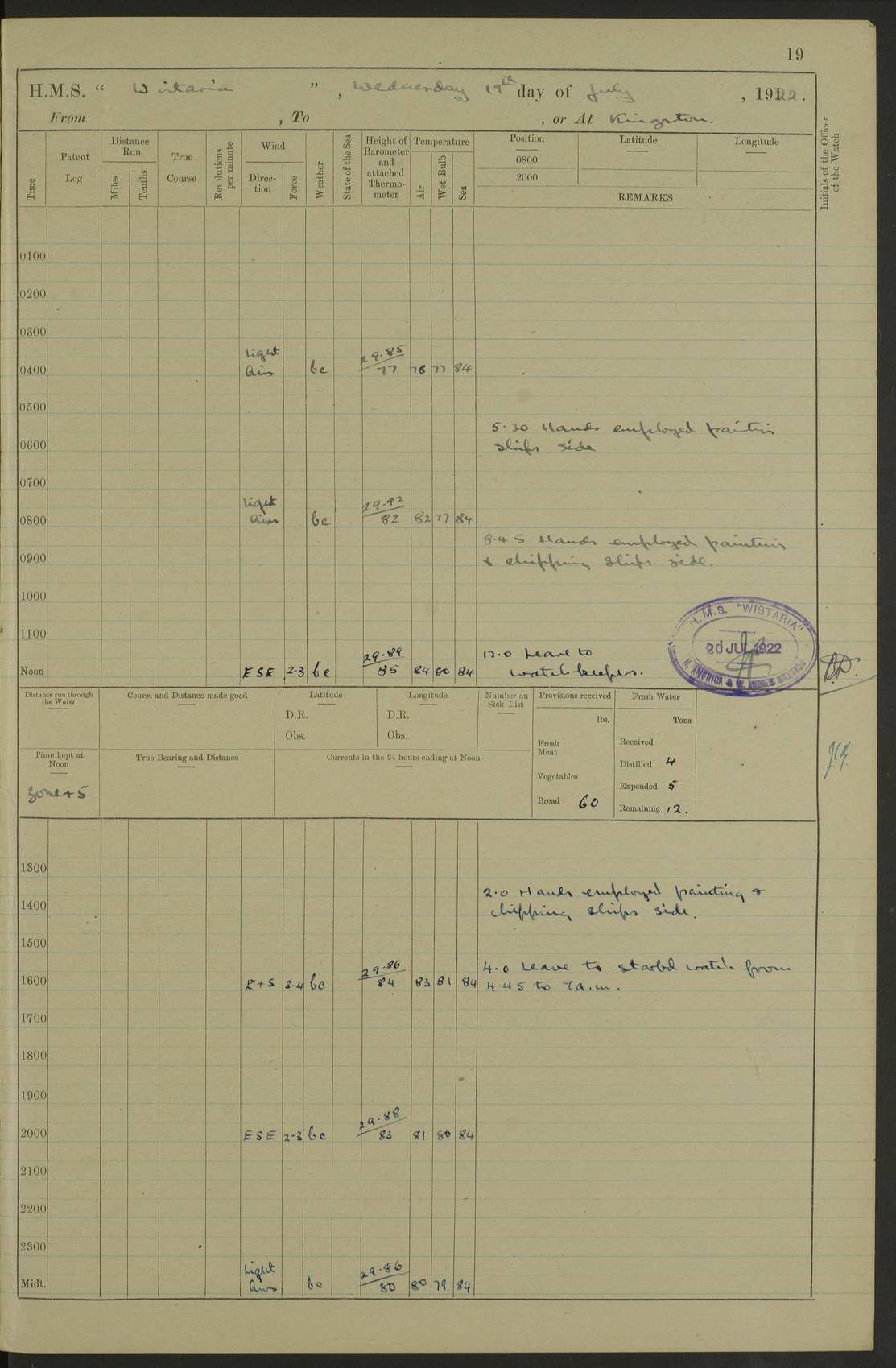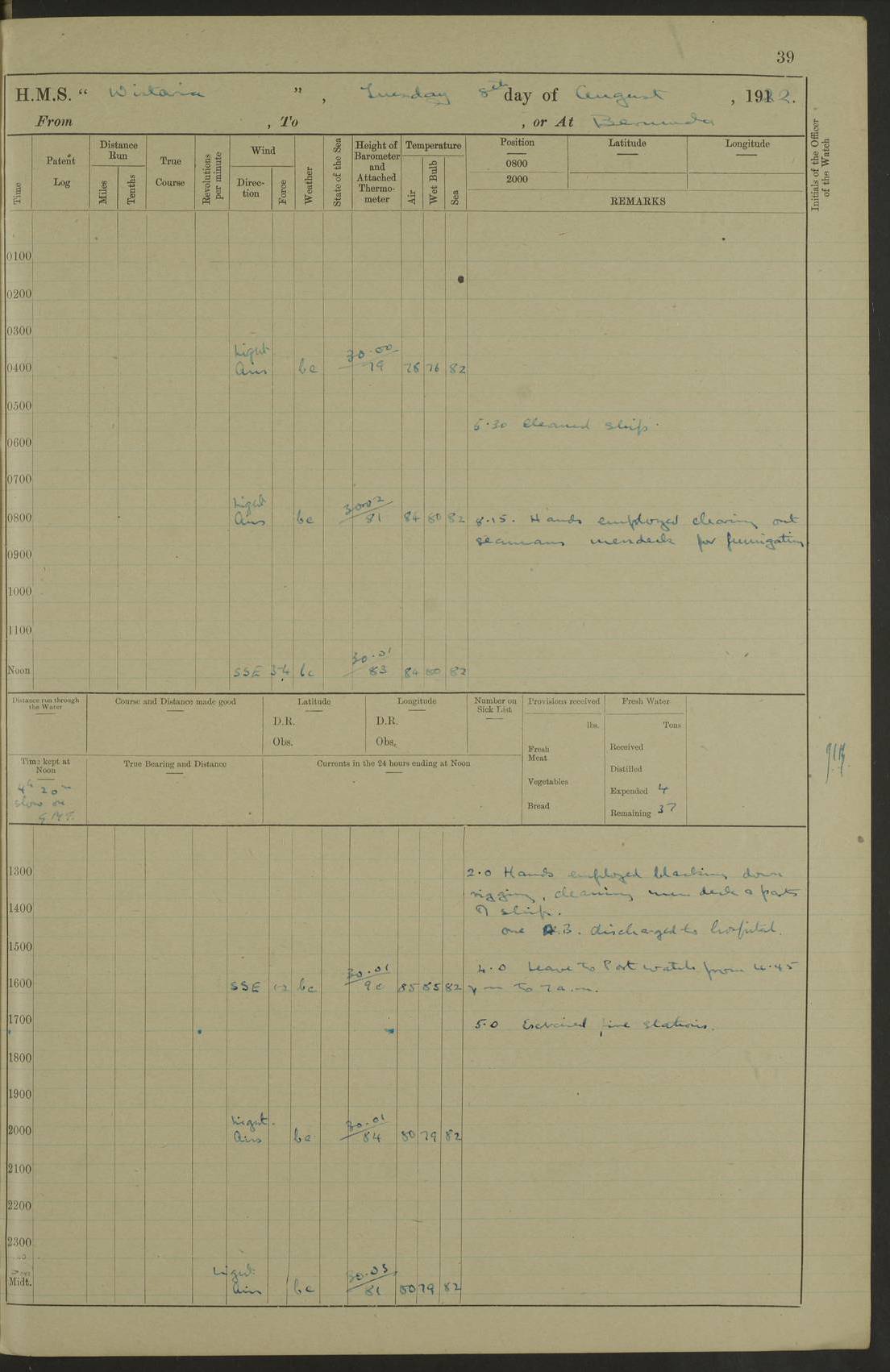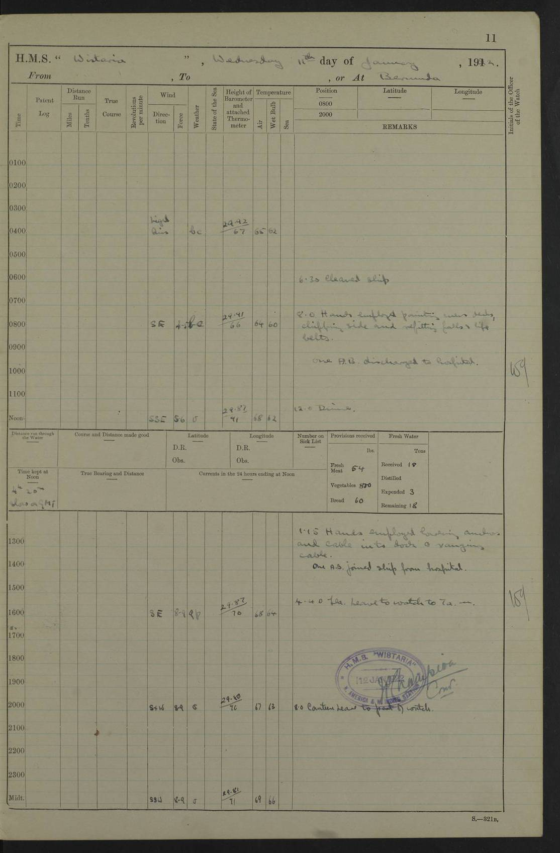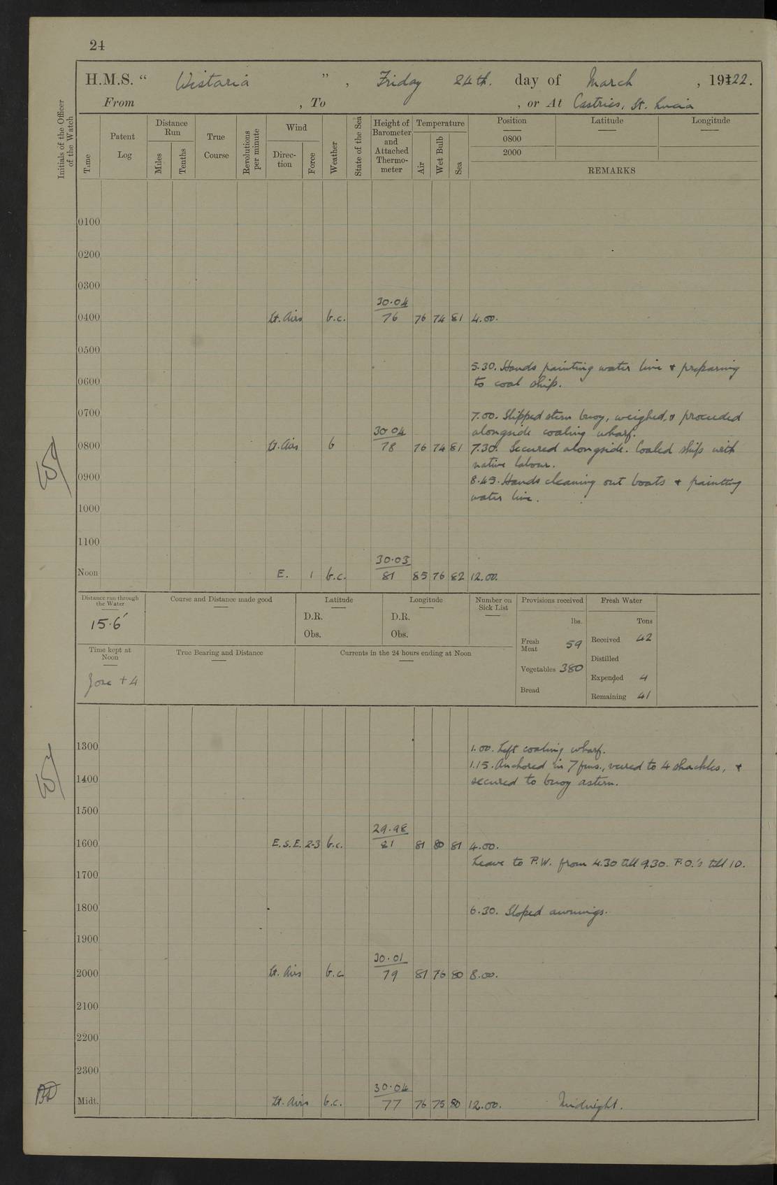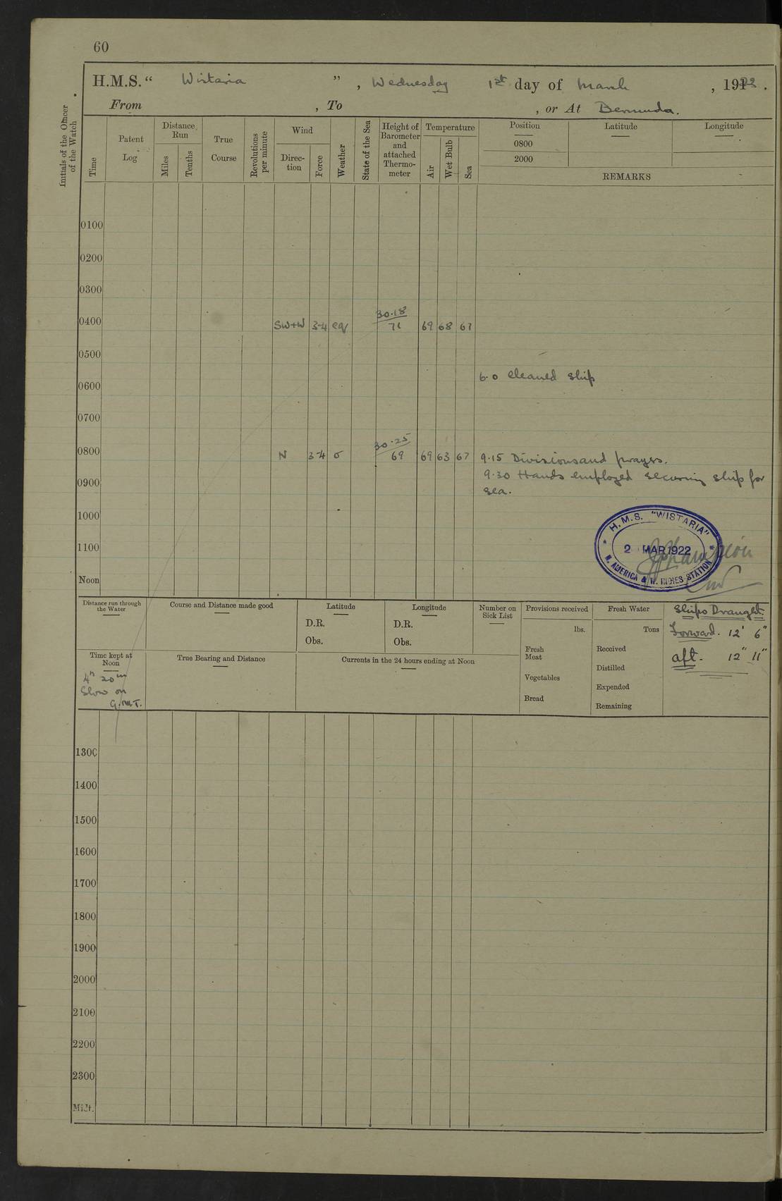 LOGS FOR JANUARY 1922 4f73ca8aa2fc8ea903000b1b: (https://s3.amazonaws.com:443/oldweather/ADM53-93265/0003_1.jpg) 1 January 1922 At Bermuda Lat 32.32, Long -64.8 6.45am: Cleaned ship 10.45am: Church of England Church Party landed 4f73ca8aa2fc8ea903000b1c: (https://s3.amazonaws.com:443/oldweather/ADM53-93265/0004_0.jpg) 2 January 1922 At Bermuda Lat 32.32, Long -64.8 8.45am: Hands employed in seamen’s mess deck & parts of ship 1.15pm: Hands employed as forenoon 4f73ca8aa2fc8ea903000b1d: (https://s3.amazonaws.com:443/oldweather/ADM53-93265/0004_1.jpg) 3 January 1922 At Bermuda Lat 32.32, Long -64.8 8.45am: Hands employed on ship’s side, seamen's mess deck, gunner party & parts of ship 1.15pm: Hands employed as forenoon pm: One Ldg Stoker discharged to RN Hospital 5.0pm: Read Warrant No 6 4f73ca8ba2fc8ea903000b1e: (https://s3.amazonaws.com:443/oldweather/ADM53-93265/0005_0.jpg) 4 January 1922 At Bermuda Lat 32.32, Long -64.8 8.45am: Hands employed painting mess deck & drawing provisions 1.15pm: Hands employed painting seamen's mess deck; on ship’s side; gunner party & parts of ship 4f73ca8ba2fc8ea903000b1f: (https://s3.amazonaws.com:443/oldweather/ADM53-93265/0005_1.jpg) 5 January 1922 At Bermuda Lat 32.32, Long -64.8 8.0am: Hands employed on ship’s side; painting mess decks; refitting boats falls am: 1 Ldg Stoker returned from hospital 4f73ca8ba2fc8ea903000b20: (https://s3.amazonaws.com:443/oldweather/ADM53-93265/0006_0.jpg) 6 January 1922 At Bermuda Lat 32.32, Long -64.8 8.0am: Hands employed painting mess decks, chipping and redleading ship’s side, refitting boats falls 9.0am: Range party landed 1.30pm: Hands employed as forenoon 4f73ca8ca2fc8ea903000b21: (https://s3.amazonaws.com:443/oldweather/ADM53-93265/0006_1.jpg) 7 January 1922 At Bermuda Lat 32.32, Long -64.8 8.0am: Hands employed painting mess decks; side party & parts of ship 8.50am: Ord Sea, boys and stokers training class landed for field training exercises 10.30am: Shifted ship to coaling jetty 11.40am: Secured alongside 4f73ca8ca2fc8ea903000b22: (https://s3.amazonaws.com:443/oldweather/ADM53-93265/0007_0.jpg) 8 January 1922 At Bermuda Lat 32.32, Long -64.8 9.45am: Hands mustered by open list 10.15am: Church of England Church Party landed 4f73ca8da2fc8ea903000b23: (https://s3.amazonaws.com:443/oldweather/ADM53-93265/0007_1.jpg) 9 January 1922 At Bermuda Lat 32.32, Long -64.8 8.0am: Prepared for docking ship 8.25am: Docking party landed. Tug “St Abbs” secured alongside 9.30am: Proceeded into dock 9.55am: Secured in dock 10.30am: Hands employed scrubbing ship’s bottom 1.15pm: Hands employed scrubbing ship’s bottom and painting mess decks pm: 1 Stoker and 1 A.B. discharged to hospital 4f73ca8da2fc8ea903000b24: (https://s3.amazonaws.com:443/oldweather/ADM53-93265/0008_0.jpg) 10 January 1922 At Bermuda Lat 32.32, Long -64.8 8.0am: Hands employed on ship’s side, painting mess decks and about 4” gun for’d 1.15pm: Hands employed as forenoon 4f73ca8da2fc8ea903000b25: (https://s3.amazonaws.com:443/oldweather/ADM53-93265/0008_1.jpg) 11 January 1922 At Bermuda Lat 32.32, Long -64.8 8.0am: Hands employed painting mess decks, chipping side and refitting falls & life belts am: One A.B. discharged to hospital 1.15pm: Hands employed lowering anchors and cables into dock & ranging cable pm: One A.B. joined ship from hospital 4f73ca8ea2fc8ea903000b26: (https://s3.amazonaws.com:443/oldweather/ADM53-93265/0009_0.jpg) 12 January 1922 At Bermuda Lat 32.32, Long -64.8 8.0am: Hands employed chipping ship’s side, painting mess deck & part of ship 5.0pm: Fire Quarters 4f73ca8ea2fc8ea903000b27: (https://s3.amazonaws.com:443/oldweather/ADM53-93265/0009_1.jpg) 13 January 1922 At Bermuda Lat 32.32, Long -64.8 8.0am: Hands employed painting mess deck, chipping ship’s side and parts of ship 1.15pm: Hands employed painting down aloft and chipping ship’s side 4f73ca8ea2fc8ea903000b28: (https://s3.amazonaws.com:443/oldweather/ADM53-93265/0010_0.jpg) 14 January 1922 At Bermuda Lat 32.32, Long -64.8 8.0am: Hands employed on ship’s side, painting down aloft; and on foremost 4” gun 4f73ca8fa2fc8ea903000b29: (https://s3.amazonaws.com:443/oldweather/ADM53-93265/0010_1.jpg) 15 January 1922 At Bermuda Lat 32.32, Long -64.8 10.20am: Church of England church party landed 4f73ca8fa2fc8ea903000b2a: (https://s3.amazonaws.com:443/oldweather/ADM53-93265/0011_0.jpg) 16 January 1922 At Bermuda Lat 32.32, Long -64.8 8.0am: Hands employed painting ship’s bottom 1.15pm: Hands employed painting ship’s bottom 5.0pm: Exercised Fire Quarters 4f73ca8fa2fc8ea903000b2b: (https://s3.amazonaws.com:443/oldweather/ADM53-93265/0011_1.jpg) 17 January 1922 At Bermuda Lat 32.32, Long -64.8 8.0am: Hands employed stowing cable in cable lockers from dock and painting ship’s bottom 1.15pm: Hands employed as forenoon 4f73ca90a2fc8ea903000b2c: (https://s3.amazonaws.com:443/oldweather/ADM53-93265/0012_0.jpg) 18 January 1922 At Bermuda Lat 32.32, Long -64.8 8.0am: Hands prepared to shift ship 9.45am: Left floating dock & secured alongside coaling wharf 10.30am: Hands employed washing down funnels & parts of ship 1.15pm: Hands employed washing funnels, shipping motor boats davits and parts of ship 4f73ca90a2fc8ea903000b2d: (https://s3.amazonaws.com:443/oldweather/ADM53-93265/0012_1.jpg) 19 January 1922 At Bermuda Lat 32.32, Long -64.8 8.0am: Hands employed chipping & painting ship’s side, stripping & cleaning 4” guns and parts of ship 8.15am: RFA “Plumleaf” left basin 9.15am: CH 14 left basin 10.35: Shifted from coaling wharf to 40 ft fender in North Basin 4f73ca91a2fc8ea903000b2e: (https://s3.amazonaws.com:443/oldweather/ADM53-93265/0013_0.jpg) 20 January 1922 At Bermuda Lat 32.32, Long -64.8 8.0am: Hands employed chipping and scraping ship’s side, about aft 4” gun and parts of ship 10.20am: Replace 2nd whaler davits. Lowered 1st whaler davits into deck 1 hand scrubber lost by accident 1.15pm: Hands employed chipping & painting ship’s side. Dismountin