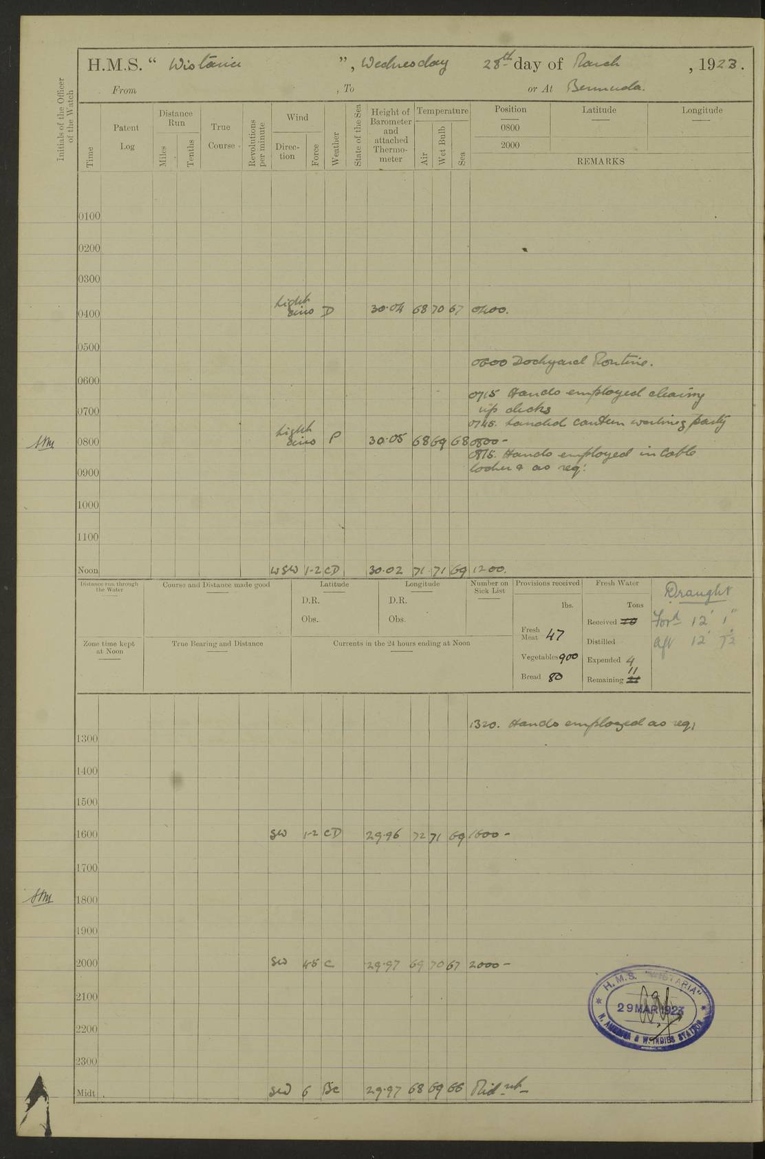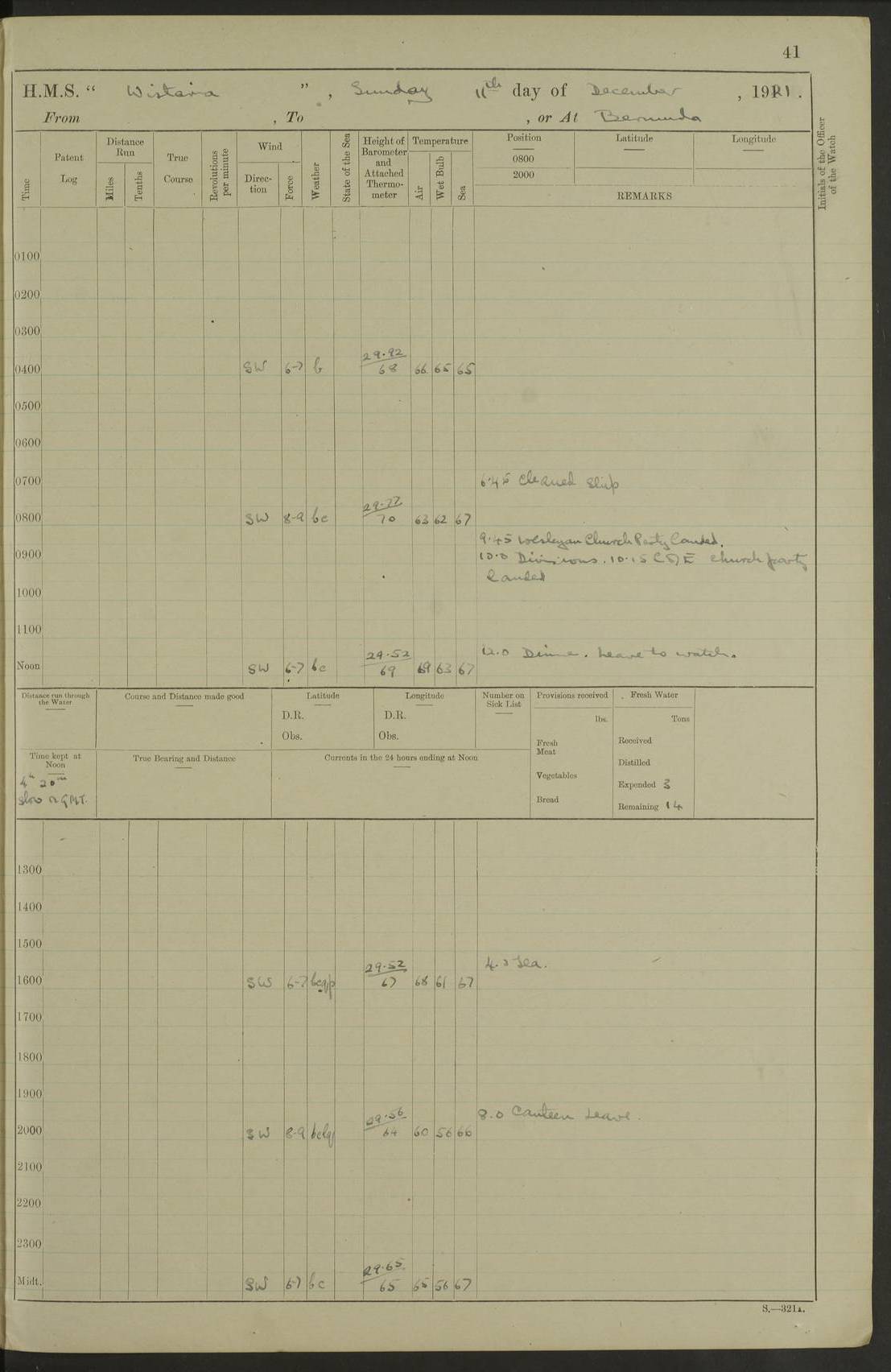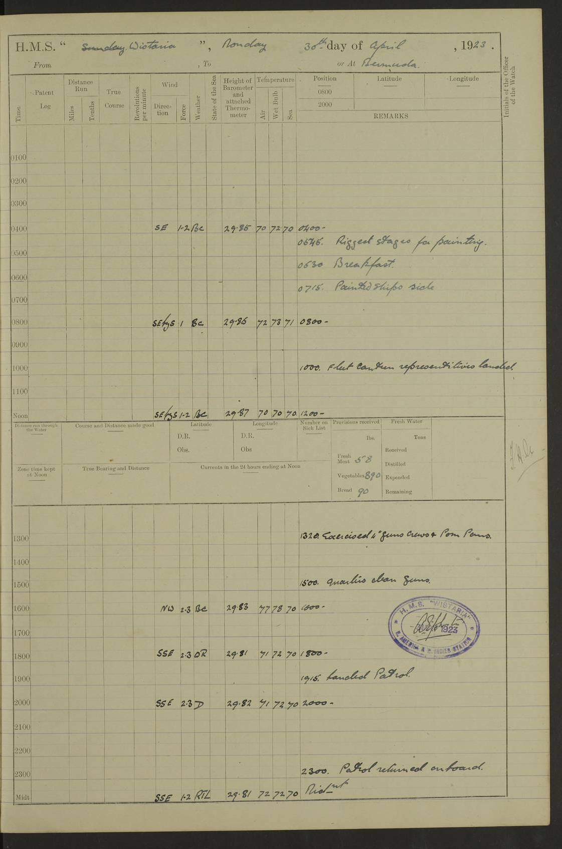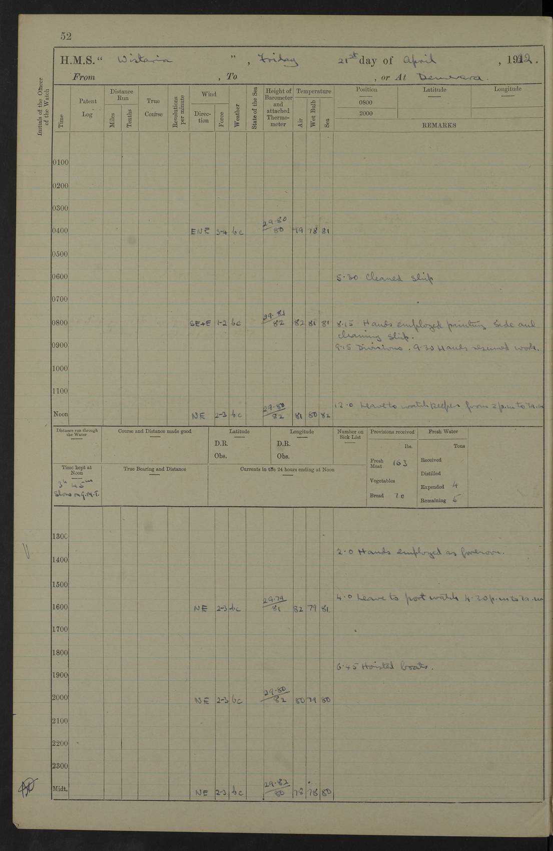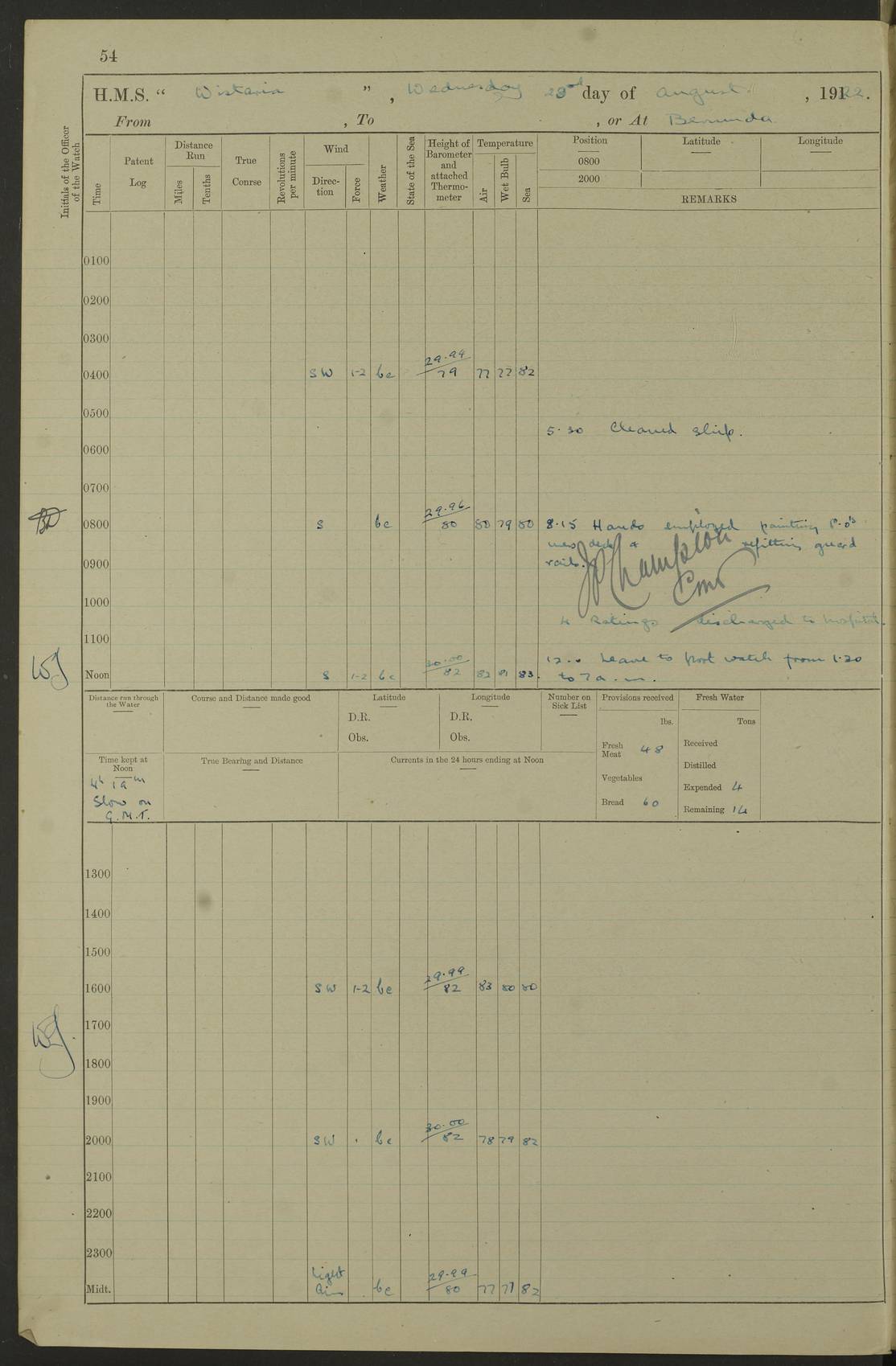 LOGS FOR JANUARY 1922 4f73ca8aa2fc8ea903000b1b: (https://s3.amazonaws.com:443/oldweather/ADM53-93265/0003_1.jpg) 1 January 1922 At Bermuda Lat 32.32, Long -64.8 6.45am: Cleaned ship 10.45am: Church of England Church Party landed 4f73ca8aa2fc8ea903000b1c: (https://s3.amazonaws.com:443/oldweather/ADM53-93265/0004_0.jpg) 2 January 1922 At Bermuda Lat 32.32, Long -64.8 8.45am: Hands employed in seamen’s mess deck & parts of ship 1.15pm: Hands employed as forenoon 4f73ca8aa2fc8ea903000b1d: (https://s3.amazonaws.com:443/oldweather/ADM53-93265/0004_1.jpg) 3 January 1922 At Bermuda Lat 32.32, Long -64.8 8.45am: Hands employed on ship’s side, seamen's mess deck, gunner party & parts of ship 1.15pm: Hands employed as forenoon pm: One Ldg Stoker discharged to RN Hospital 5.0pm: Read Warrant No 6 4f73ca8ba2fc8ea903000b1e: (https://s3.amazonaws.com:443/oldweather/ADM53-93265/0005_0.jpg) 4 January 1922 At Bermuda Lat 32.32, Long -64.8 8.45am: Hands employed painting mess deck & drawing provisions 1.15pm: Hands employed painting seamen's mess deck; on ship’s side; gunner party & parts of ship 4f73ca8ba2fc8ea903000b1f: (https://s3.amazonaws.com:443/oldweather/ADM53-93265/0005_1.jpg) 5 January 1922 At Bermuda Lat 32.32, Long -64.8 8.0am: Hands employed on ship’s side; painting mess decks; refitting boats falls am: 1 Ldg Stoker returned from hospital 4f73ca8ba2fc8ea903000b20: (https://s3.amazonaws.com:443/oldweather/ADM53-93265/0006_0.jpg) 6 January 1922 At Bermuda Lat 32.32, Long -64.8 8.0am: Hands employed painting mess decks, chipping and redleading ship’s side, refitting boats falls 9.0am: Range party landed 1.30pm: Hands employed as forenoon 4f73ca8ca2fc8ea903000b21: (https://s3.amazonaws.com:443/oldweather/ADM53-93265/0006_1.jpg) 7 January 1922 At Bermuda Lat 32.32, Long -64.8 8.0am: Hands employed painting mess decks; side party & parts of ship 8.50am: Ord Sea, boys and stokers training class landed for field training exercises 10.30am: Shifted ship to coaling jetty 11.40am: Secured alongside 4f73ca8ca2fc8ea903000b22: (https://s3.amazonaws.com:443/oldweather/ADM53-93265/0007_0.jpg) 8 January 1922 At Bermuda Lat 32.32, Long -64.8 9.45am: Hands mustered by open list 10.15am: Church of England Church Party landed 4f73ca8da2fc8ea903000b23: (https://s3.amazonaws.com:443/oldweather/ADM53-93265/0007_1.jpg) 9 January 1922 At Bermuda Lat 32.32, Long -64.8 8.0am: Prepared for docking ship 8.25am: Docking party landed. Tug “St Abbs” secured alongside 9.30am: Proceeded into dock 9.55am: Secured in dock 10.30am: Hands employed scrubbing ship’s bottom 1.15pm: Hands employed scrubbing ship’s bottom and painting mess decks pm: 1 Stoker and 1 A.B. discharged to hospital 4f73ca8da2fc8ea903000b24: (https://s3.amazonaws.com:443/oldweather/ADM53-93265/0008_0.jpg) 10 January 1922 At Bermuda Lat 32.32, Long -64.8 8.0am: Hands employed on ship’s side, painting mess decks and about 4” gun for’d 1.15pm: Hands employed as forenoon 4f73ca8da2fc8ea903000b25: (https://s3.amazonaws.com:443/oldweather/ADM53-93265/0008_1.jpg) 11 January 1922 At Bermuda Lat 32.32, Long -64.8 8.0am: Hands employed painting mess decks, chipping side and refitting falls & life belts am: One A.B. discharged to hospital 1.15pm: Hands employed lowering anchors and cables into dock & ranging cable pm: One A.B. joined ship from hospital 4f73ca8ea2fc8ea903000b26: (https://s3.amazonaws.com:443/oldweather/ADM53-93265/0009_0.jpg) 12 January 1922 At Bermuda Lat 32.32, Long -64.8 8.0am: Hands employed chipping ship’s side, painting mess deck & part of ship 5.0pm: Fire Quarters 4f73ca8ea2fc8ea903000b27: (https://s3.amazonaws.com:443/oldweather/ADM53-93265/0009_1.jpg) 13 January 1922 At Bermuda Lat 32.32, Long -64.8 8.0am: Hands employed painting mess deck, chipping ship’s side and parts of ship 1.15pm: Hands employed painting down aloft and chipping ship’s side 4f73ca8ea2fc8ea903000b28: (https://s3.amazonaws.com:443/oldweather/ADM53-93265/0010_0.jpg) 14 January 1922 At Bermuda Lat 32.32, Long -64.8 8.0am: Hands employed on ship’s side, painting down aloft; and on foremost 4” gun 4f73ca8fa2fc8ea903000b29: (https://s3.amazonaws.com:443/oldweather/ADM53-93265/0010_1.jpg) 15 January 1922 At Bermuda Lat 32.32, Long -64.8 10.20am: Church of England church party landed 4f73ca8fa2fc8ea903000b2a: (https://s3.amazonaws.com:443/oldweather/ADM53-93265/0011_0.jpg) 16 January 1922 At Bermuda Lat 32.32, Long -64.8 8.0am: Hands employed painting ship’s bottom 1.15pm: Hands employed painting ship’s bottom 5.0pm: Exercised Fire Quarters 4f73ca8fa2fc8ea903000b2b: (https://s3.amazonaws.com:443/oldweather/ADM53-93265/0011_1.jpg) 17 January 1922 At Bermuda Lat 32.32, Long -64.8 8.0am: Hands employed stowing cable in cable lockers from dock and painting ship’s bottom 1.15pm: Hands employed as forenoon 4f73ca90a2fc8ea903000b2c: (https://s3.amazonaws.com:443/oldweather/ADM53-93265/0012_0.jpg) 18 January 1922 At Bermuda Lat 32.32, Long -64.8 8.0am: Hands prepared to shift ship 9.45am: Left floating dock & secured alongside coaling wharf 10.30am: Hands employed washing down funnels & parts of ship 1.15pm: Hands employed washing funnels, shipping motor boats davits and parts of ship 4f73ca90a2fc8ea903000b2d: (https://s3.amazonaws.com:443/oldweather/ADM53-93265/0012_1.jpg) 19 January 1922 At Bermuda Lat 32.32, Long -64.8 8.0am: Hands employed chipping & painting ship’s side, stripping & cleaning 4” guns and parts of ship 8.15am: RFA “Plumleaf” left basin 9.15am: CH 14 left basin 10.35: Shifted from coaling wharf to 40 ft fender in North Basin 4f73ca91a2fc8ea903000b2e: (https://s3.amazonaws.com:443/oldweather/ADM53-93265/0013_0.jpg) 20 January 1922 At Bermuda Lat 32.32, Long -64.8 8.0am: Hands employed chipping and scraping ship’s side, about aft 4” gun and parts of ship 10.20am: Replace 2nd whaler davits. Lowered 1st whaler davits into deck 1 hand scrubber lost by accident 1.15pm: Hands employed chipping & painting ship’s side. Dismountin