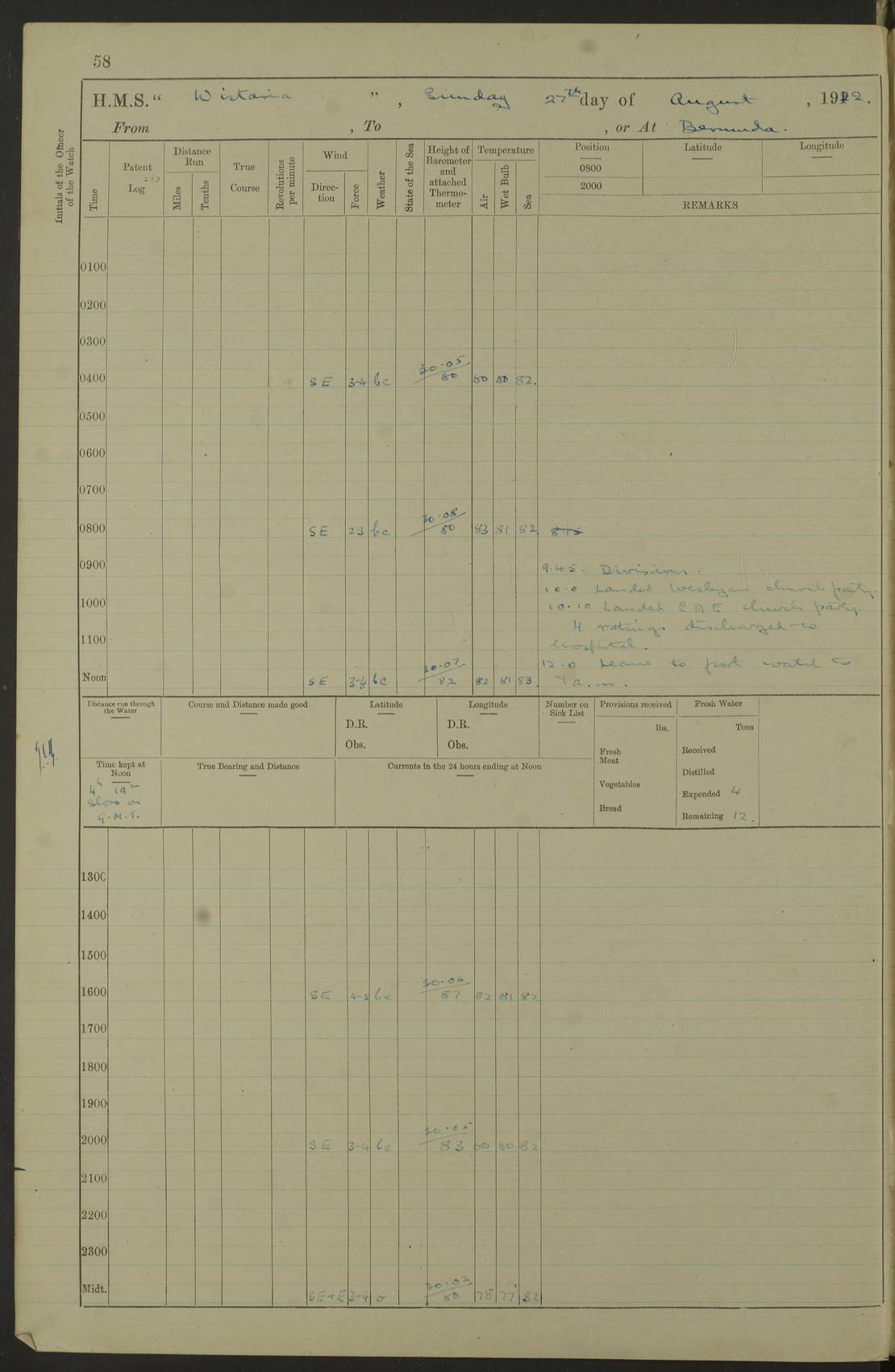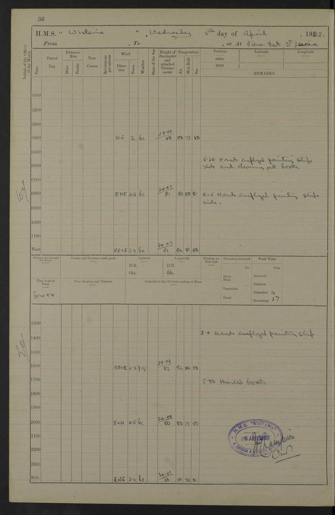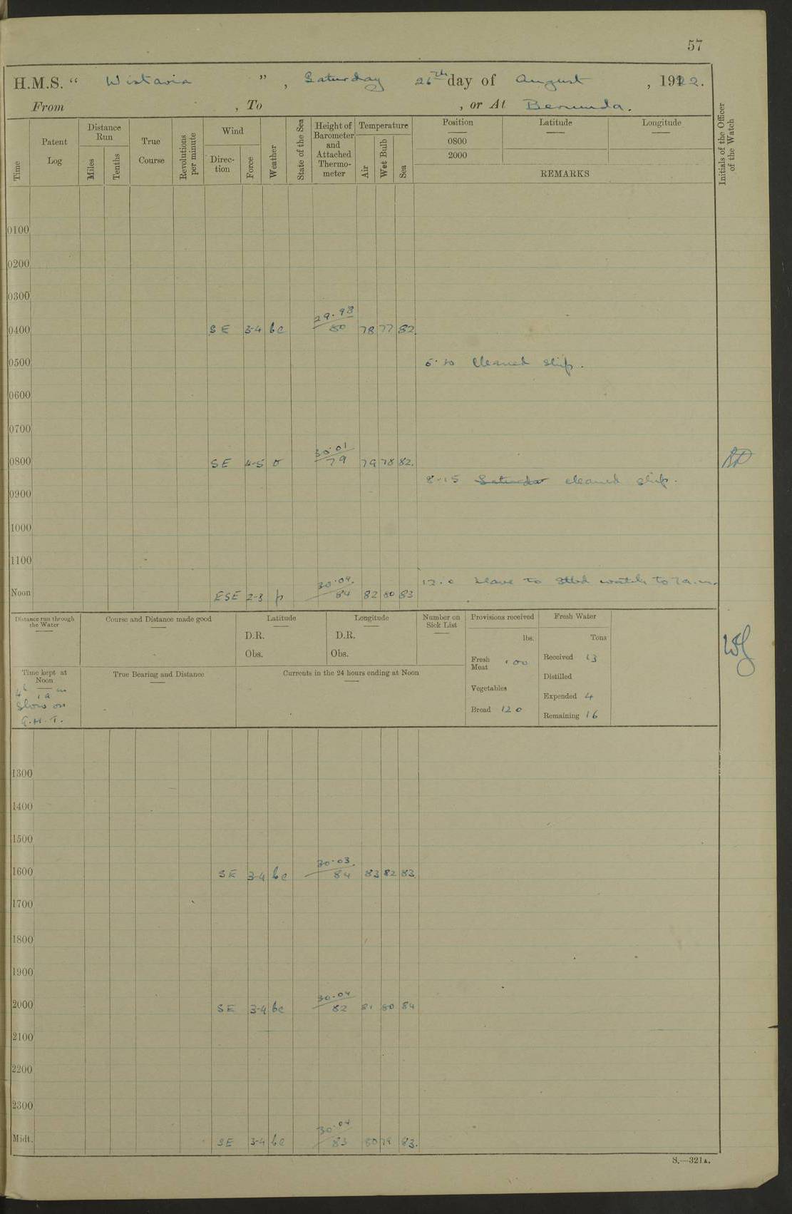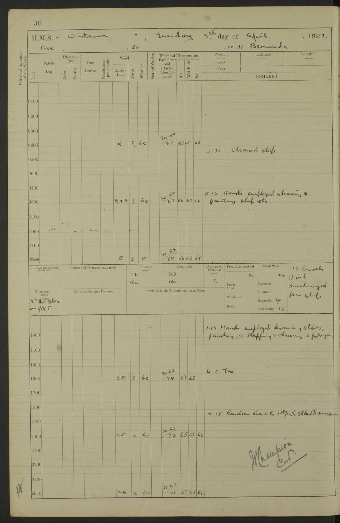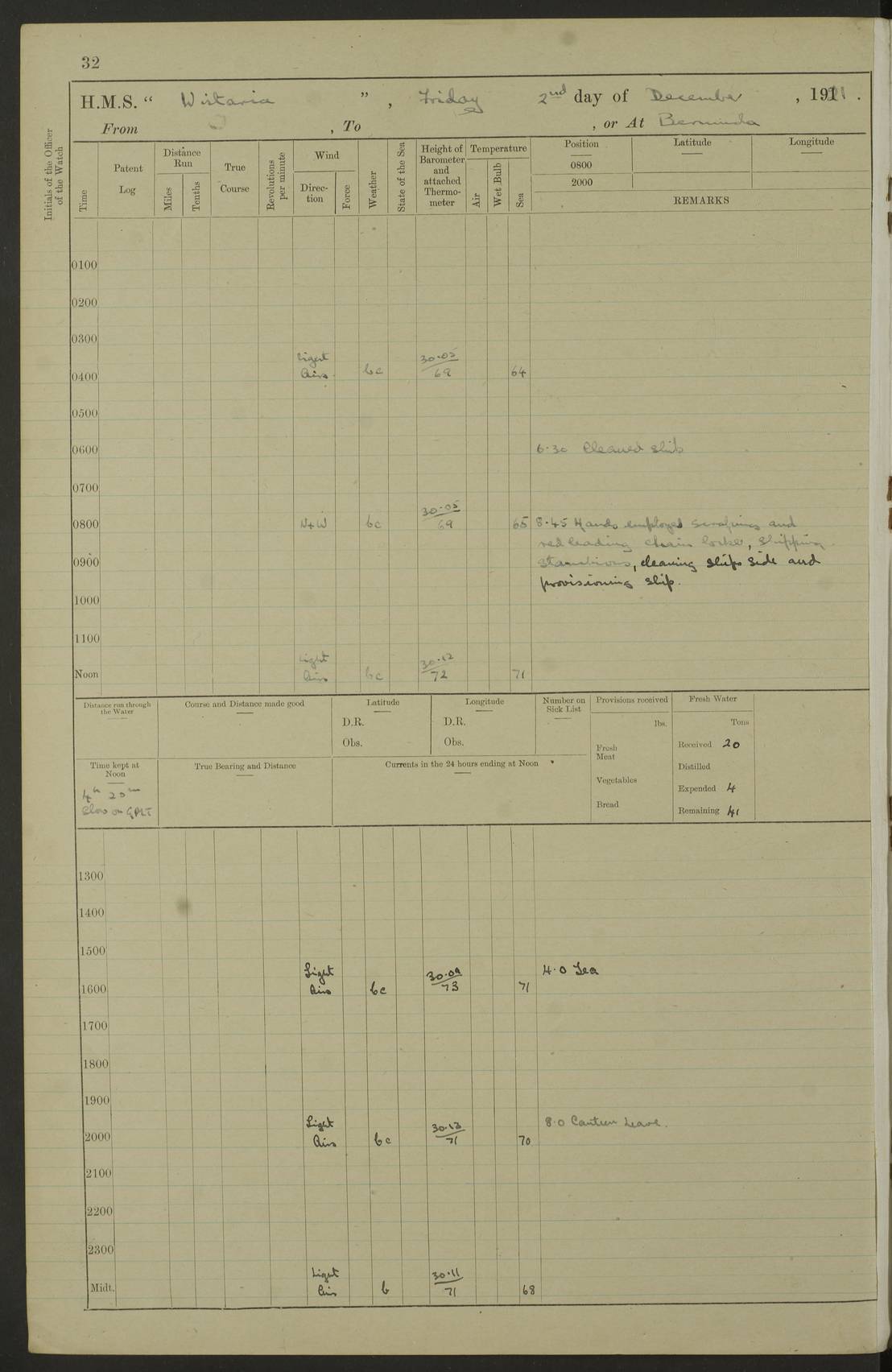 LOGS FOR JANUARY 1922 4f73ca8aa2fc8ea903000b1b: (https://s3.amazonaws.com:443/oldweather/ADM53-93265/0003_1.jpg) 1 January 1922 At Bermuda Lat 32.32, Long -64.8 6.45am: Cleaned ship 10.45am: Church of England Church Party landed 4f73ca8aa2fc8ea903000b1c: (https://s3.amazonaws.com:443/oldweather/ADM53-93265/0004_0.jpg) 2 January 1922 At Bermuda Lat 32.32, Long -64.8 8.45am: Hands employed in seamen’s mess deck & parts of ship 1.15pm: Hands employed as forenoon 4f73ca8aa2fc8ea903000b1d: (https://s3.amazonaws.com:443/oldweather/ADM53-93265/0004_1.jpg) 3 January 1922 At Bermuda Lat 32.32, Long -64.8 8.45am: Hands employed on ship’s side, seamen's mess deck, gunner party & parts of ship 1.15pm: Hands employed as forenoon pm: One Ldg Stoker discharged to RN Hospital 5.0pm: Read Warrant No 6 4f73ca8ba2fc8ea903000b1e: (https://s3.amazonaws.com:443/oldweather/ADM53-93265/0005_0.jpg) 4 January 1922 At Bermuda Lat 32.32, Long -64.8 8.45am: Hands employed painting mess deck & drawing provisions 1.15pm: Hands employed painting seamen's mess deck; on ship’s side; gunner party & parts of ship 4f73ca8ba2fc8ea903000b1f: (https://s3.amazonaws.com:443/oldweather/ADM53-93265/0005_1.jpg) 5 January 1922 At Bermuda Lat 32.32, Long -64.8 8.0am: Hands employed on ship’s side; painting mess decks; refitting boats falls am: 1 Ldg Stoker returned from hospital 4f73ca8ba2fc8ea903000b20: (https://s3.amazonaws.com:443/oldweather/ADM53-93265/0006_0.jpg) 6 January 1922 At Bermuda Lat 32.32, Long -64.8 8.0am: Hands employed painting mess decks, chipping and redleading ship’s side, refitting boats falls 9.0am: Range party landed 1.30pm: Hands employed as forenoon 4f73ca8ca2fc8ea903000b21: (https://s3.amazonaws.com:443/oldweather/ADM53-93265/0006_1.jpg) 7 January 1922 At Bermuda Lat 32.32, Long -64.8 8.0am: Hands employed painting mess decks; side party & parts of ship 8.50am: Ord Sea, boys and stokers training class landed for field training exercises 10.30am: Shifted ship to coaling jetty 11.40am: Secured alongside 4f73ca8ca2fc8ea903000b22: (https://s3.amazonaws.com:443/oldweather/ADM53-93265/0007_0.jpg) 8 January 1922 At Bermuda Lat 32.32, Long -64.8 9.45am: Hands mustered by open list 10.15am: Church of England Church Party landed 4f73ca8da2fc8ea903000b23: (https://s3.amazonaws.com:443/oldweather/ADM53-93265/0007_1.jpg) 9 January 1922 At Bermuda Lat 32.32, Long -64.8 8.0am: Prepared for docking ship 8.25am: Docking party landed. Tug “St Abbs” secured alongside 9.30am: Proceeded into dock 9.55am: Secured in dock 10.30am: Hands employed scrubbing ship’s bottom 1.15pm: Hands employed scrubbing ship’s bottom and painting mess decks pm: 1 Stoker and 1 A.B. discharged to hospital 4f73ca8da2fc8ea903000b24: (https://s3.amazonaws.com:443/oldweather/ADM53-93265/0008_0.jpg) 10 January 1922 At Bermuda Lat 32.32, Long -64.8 8.0am: Hands employed on ship’s side, painting mess decks and about 4” gun for’d 1.15pm: Hands employed as forenoon 4f73ca8da2fc8ea903000b25: (https://s3.amazonaws.com:443/oldweather/ADM53-93265/0008_1.jpg) 11 January 1922 At Bermuda Lat 32.32, Long -64.8 8.0am: Hands employed painting mess decks, chipping side and refitting falls & life belts am: One A.B. discharged to hospital 1.15pm: Hands employed lowering anchors and cables into dock & ranging cable pm: One A.B. joined ship from hospital 4f73ca8ea2fc8ea903000b26: (https://s3.amazonaws.com:443/oldweather/ADM53-93265/0009_0.jpg) 12 January 1922 At Bermuda Lat 32.32, Long -64.8 8.0am: Hands employed chipping ship’s side, painting mess deck & part of ship 5.0pm: Fire Quarters 4f73ca8ea2fc8ea903000b27: (https://s3.amazonaws.com:443/oldweather/ADM53-93265/0009_1.jpg) 13 January 1922 At Bermuda Lat 32.32, Long -64.8 8.0am: Hands employed painting mess deck, chipping ship’s side and parts of ship 1.15pm: Hands employed painting down aloft and chipping ship’s side 4f73ca8ea2fc8ea903000b28: (https://s3.amazonaws.com:443/oldweather/ADM53-93265/0010_0.jpg) 14 January 1922 At Bermuda Lat 32.32, Long -64.8 8.0am: Hands employed on ship’s side, painting down aloft; and on foremost 4” gun 4f73ca8fa2fc8ea903000b29: (https://s3.amazonaws.com:443/oldweather/ADM53-93265/0010_1.jpg) 15 January 1922 At Bermuda Lat 32.32, Long -64.8 10.20am: Church of England church party landed 4f73ca8fa2fc8ea903000b2a: (https://s3.amazonaws.com:443/oldweather/ADM53-93265/0011_0.jpg) 16 January 1922 At Bermuda Lat 32.32, Long -64.8 8.0am: Hands employed painting ship’s bottom 1.15pm: Hands employed painting ship’s bottom 5.0pm: Exercised Fire Quarters 4f73ca8fa2fc8ea903000b2b: (https://s3.amazonaws.com:443/oldweather/ADM53-93265/0011_1.jpg) 17 January 1922 At Bermuda Lat 32.32, Long -64.8 8.0am: Hands employed stowing cable in cable lockers from dock and painting ship’s bottom 1.15pm: Hands employed as forenoon 4f73ca90a2fc8ea903000b2c: (https://s3.amazonaws.com:443/oldweather/ADM53-93265/0012_0.jpg) 18 January 1922 At Bermuda Lat 32.32, Long -64.8 8.0am: Hands prepared to shift ship 9.45am: Left floating dock & secured alongside coaling wharf 10.30am: Hands employed washing down funnels & parts of ship 1.15pm: Hands employed washing funnels, shipping motor boats davits and parts of ship 4f73ca90a2fc8ea903000b2d: (https://s3.amazonaws.com:443/oldweather/ADM53-93265/0012_1.jpg) 19 January 1922 At Bermuda Lat 32.32, Long -64.8 8.0am: Hands employed chipping & painting ship’s side, stripping & cleaning 4” guns and parts of ship 8.15am: RFA “Plumleaf” left basin 9.15am: CH 14 left basin 10.35: Shifted from coaling wharf to 40 ft fender in North Basin 4f73ca91a2fc8ea903000b2e: (https://s3.amazonaws.com:443/oldweather/ADM53-93265/0013_0.jpg) 20 January 1922 At Bermuda Lat 32.32, Long -64.8 8.0am: Hands employed chipping and scraping ship’s side, about aft 4” gun and parts of ship 10.20am: Replace 2nd whaler davits. Lowered 1st whaler davits into deck 1 hand scrubber lost by accident 1.15pm: Hands employed chipping & painting ship’s side. Dismountin