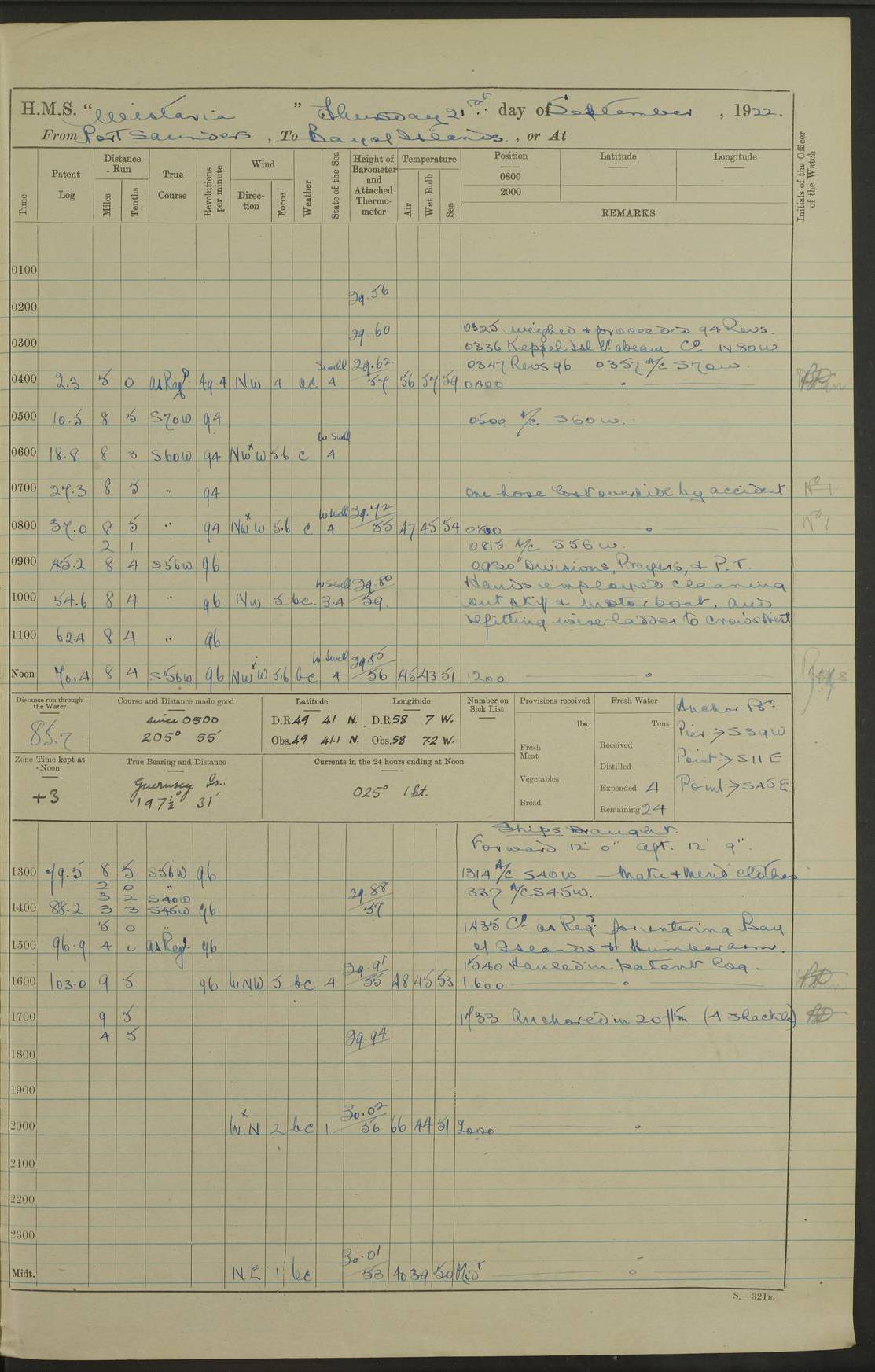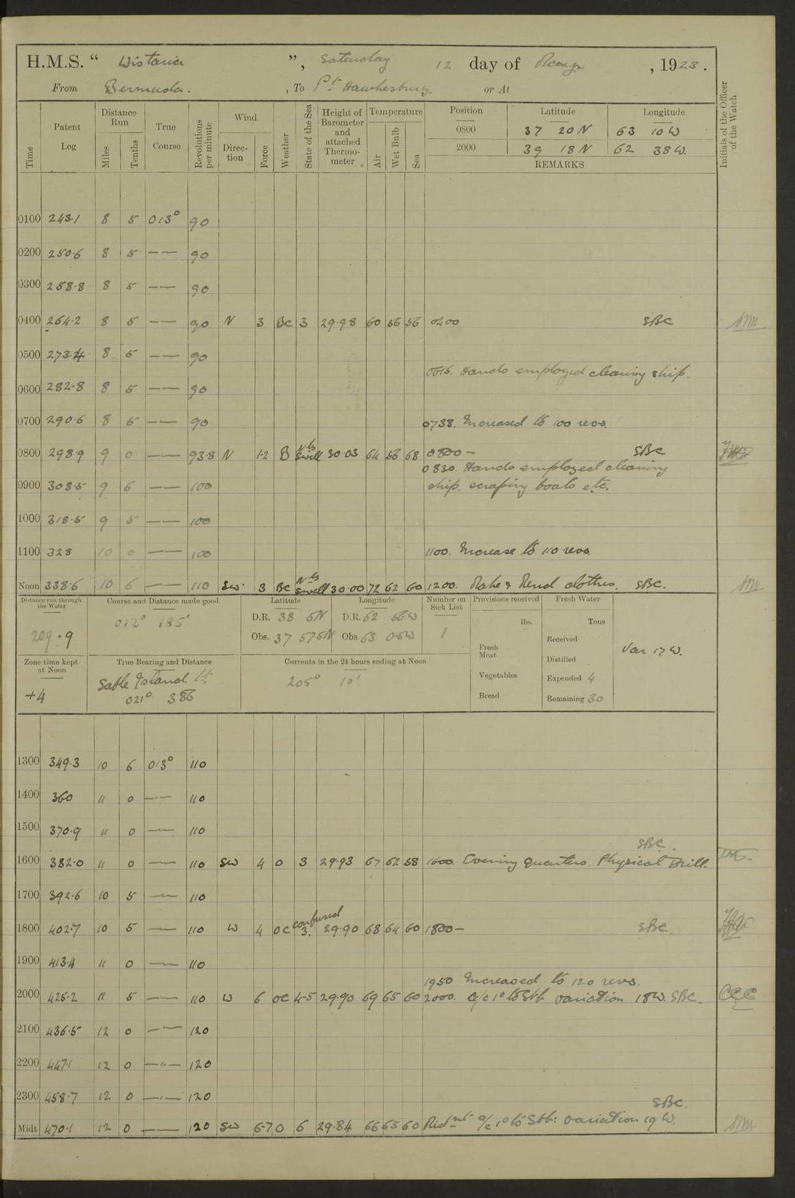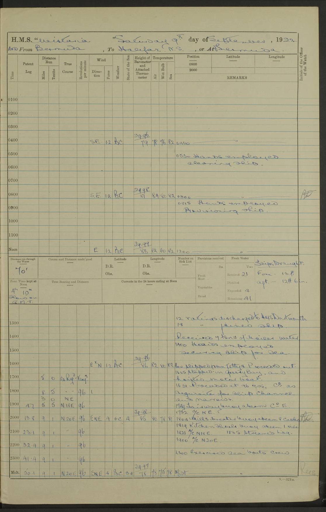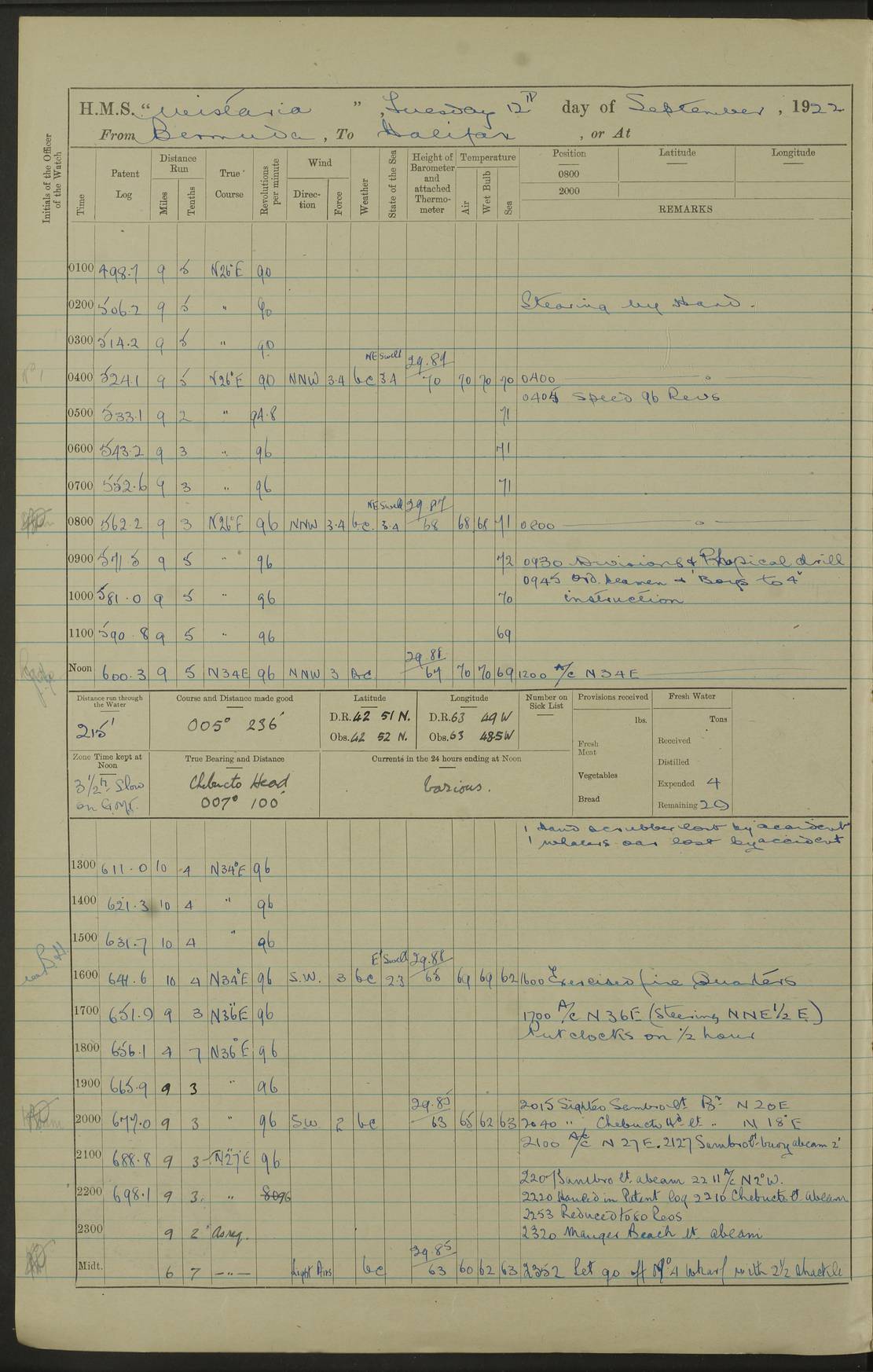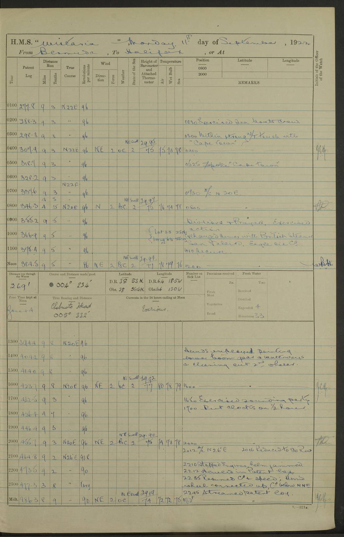 4f73caf5a2fc8ea903000c3b: (https://s3.amazonaws.com:443/oldweather/ADM53-93269/0003_1.jpg) 1 September 1922 At Bermuda Lat 32.32, Long -64.8 5.30am: Hands employed cleaning ship 8.15am: Hands employed ranging cable for survey Sunset 6.30 2.0pm: Hands employed scraping ship's bottom, and cleaning out cable lockers 4f73caf5a2fc8ea903000c3c: (https://s3.amazonaws.com:443/oldweather/ADM53-93269/0004_0.jpg) 2 September 1922 At Bermuda Lat 32.32, Long -64.8 5.30am: Hands employed cleaning ship 8.15am: Hands employed cleaning ship’s side pm: Commissioned Engineer discharged to hospital pm: 2 ratings joined ship from hospital 5.0pm: Exercised fires stations 4f73caf6a2fc8ea903000c3d: (https://s3.amazonaws.com:443/oldweather/ADM53-93269/0004_1.jpg) 3 September 1922 At Bermuda Lat 32.32, Long -64.8 6.0am: Hands employed cleaning ship (usual Sunday Routine) 8.0-8.45am: Hands clean up decks for Divisions 10.15am: Church of England Church party landed 6.0pm: Tested fire arrangements 4f73caf6a2fc8ea903000c3e: (https://s3.amazonaws.com:443/oldweather/ADM53-93269/0005_0.jpg) 4 September 1922 At Bermuda Lat 32.32, Long -64.8 5.30am: Hands employed scraping ship's bottom 8.15am: Hands employed painting ship's bottom 2.0pm: Hands employed as in the forenoon 4f73caf7a2fc8ea903000c3f: (https://s3.amazonaws.com:443/oldweather/ADM53-93269/0005_1.jpg) 5 September 1922 At Bermuda Lat 32.32, Long -64.8 5.30am: Hands employed painting ship's bottom 8.15am: Hands employed painting ship's bottom am: HMS “Valerian” came alongside in the South Basin am: 1 rating discharged to hospital 1.30pm: Hands employed as in forenoon 4f73caf7a2fc8ea903000c40: (https://s3.amazonaws.com:443/oldweather/ADM53-93269/0006_0.jpg) 6 September 1922 At Bermuda Lat 32.32, Long -64.8 5.40am: Hands employed painting ship's bottom am: 1 PO & 6 Hands employed stowing cable after survey 8.15am: Hands employed restowing cable and painting ship's bottom am: Leave to Engine room branch from 13.30-07.00 Port Watch 1 boatswains pipe lost by accident pm: Received 20 tons of boiled water 2.0pm: Hands employed restowing cable and painting ship's bottom 4f73caf7a2fc8ea903000c41: (https://s3.amazonaws.com:443/oldweather/ADM53-93269/0006_1.jpg) 7 September 1922 At Bermuda Lat 32.32, Long -64.8 6.30am: Hands employed cleaning ship 8.15am: Hands preparing for undocking ship 9.30am: Secured alongside by the sheerlegs am: Hands restowed ammunition 3.45pm: Exercised collision stations 4f73caf8a2fc8ea903000c42: (https://s3.amazonaws.com:443/oldweather/ADM53-93269/0007_0.jpg) 8 September 1922 At Bermuda Lat 32.32, Long -64.8 8.15am: Hands employed cleaning ship 9.30am: Divisions. Inspection of the ship by Captain the Hon. A. E. Strutt 10.10am: Hands muster by the ledger 11.0am: Cleared ship for action pm: 6 ratings joined ship from Hospital 1.30pm: Resumed inspection of the ship by Captain the Hon A. E. Strutt 2.45pm: Secured, replace gear [Captain the Honourable Arthur Charles Strutt] 4f73caf8a2fc8ea903000c43: (https://s3.amazonaws.com:443/oldweather/ADM53-93269/0007_1.jpg) 9 September 1922 From Bermuda to Halifax N.S., and at Bermuda Lat 32.32, Long -64.8 8.15am: Hands employed provisioning ship pm: 12 ratings discharged to HMS “Dartmouth” pm: 18 ratings joined ship pm: Received 7 tons of boiler water 2.0pm: Hands employed securing ship for sea 4.0pm: Slipped from Jetty & proceeded out 4.15pm: Stopped in Grassy Bay, and hoisted motor boat 4.30pm: Proceeded at 96 revs. Co as requisite for Ship Channel and Narrows 5.49pm: Fairway buoy abeam. Course East 6.04pm: Mills Breaker buoy abeam, 8 cables 6.19pm: Kitchen Shoals buoy abeam, 1 mile 6.35pm: Streamed log [Mills Breaker buoy coordinates: Lat 32 23.9N, Long 64 36.9W] [Kitchen Shoal beacon coordinates: Lat 32 26.1N, Long 64 37.6W] 4f73caf8a2fc8ea903000c44: (https://s3.amazonaws.com:443/oldweather/ADM53-93269/0008_0.jpg) 10 September 1922 From Bermuda to Halifax Lat 35.06, Long -64.5 9.45am: Divisions & Prayers pm: Usual Sunday Routine 4.05pm: Hauled in, cleaned & streamed patent log 5.0pm: Put clocks on 20 minutes 5.30pm: Exercised sounding party True Bearing and Distance: Chebucto Head 004°½, 566 miles 4f73caf9a2fc8ea903000c45: (https://s3.amazonaws.com:443/oldweather/ADM53-93269/0008_1.jpg) 11 September 1922 From Bermuda to Halifax Lat 38.88, Long -64.3 3.0am: Within strong W/T touch with “Cape Town” 5.25am: Spoke “Cape Town” am: Divisions & Prayers, Exercised action am: Exchanged names with British Steamer “San Valerio”, Eagle Oil Co. Lat 38 35N, Long 63 55W 10.10am: Secure pm: Hands employed painting lower boom gear & waterways & cleaning out 2nd whaler 4.50pm: Exercised sounding party 5.0pm: Put clocks on ½ hour 10.10pm: Stopped engines, helm jammed 10.12pm: Hauled in patent log 10.35pm: Resumed Co & speed; hand wheel connected up. Course below NNE 10.45pm: Streamed patent log True Bearing and Distance: Chebucto Head 005°, 332 miles 4f73caf9a2fc8ea903000c46: (https://s3.amazonaws.com:443/oldweather/ADM53-93269/0009_0.jpg) 12 September 1922 From Bermuda to Halifax Lat 42.85, Long -63.81 am: Steering by hand 9.45am: Ord Seamen & Boys to 4” instruction pm: 1 hand scrubber lost by accident pm: 1 whalers oar lost by accident 5.0pm: Altered course N36E (steering NNE½E). Put clocks on 1/2 hour 8.15pm: Sighted Sambro Lt bearing N20E 8.40pm: Sighted Chebucto Head Lt bearing N18E 9.27pm: Sambro Lt buoy abeam, 2 miles 10.07pm: Sambro Lt abeam 10.10pm: Chebucto Lt abeam 10.20pm: Hauled in Patent log 11.20pm: Mauger Beach Lt abeam 11.52pm: Let go off No 4 wharf with 2½ shackles True Bearing and Distance: Chebucto Head 007, 100 miles 4f73cafaa2fc8ea903000c47: (https://s3.amazonaws.com:443/oldweather/ADM53-93269/0009_1.jpg) 13 September 1922 At Halifax Lat 44.69, Long -63.64 7.0am: Ship wharped alongside No 4 pier 8.0am: Hands prepare for coaling 8.45am: Hands coal ship 9.0am: Clocks put back 1 hour 12.30pm: Hands coal ship pm: 26 tons boiler water received 2.25pm: Finished coaling 4f73cafaa2fc