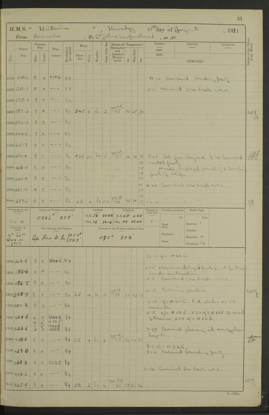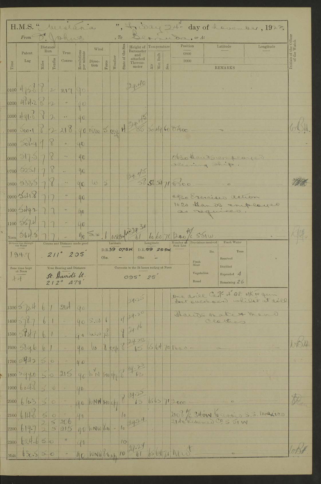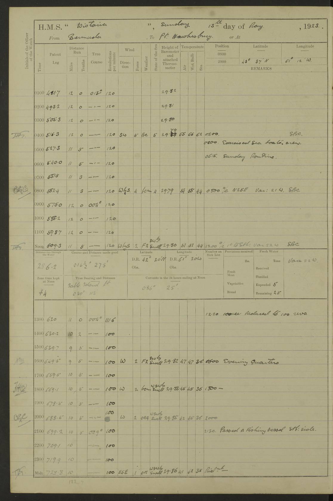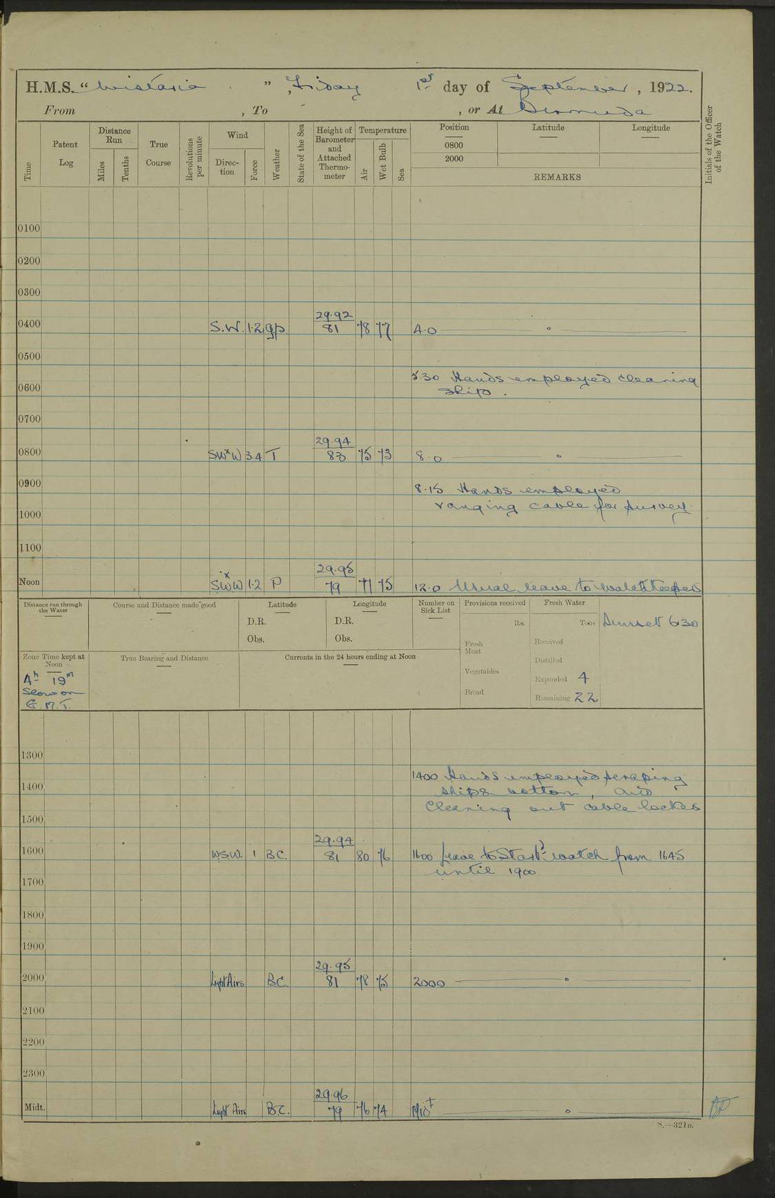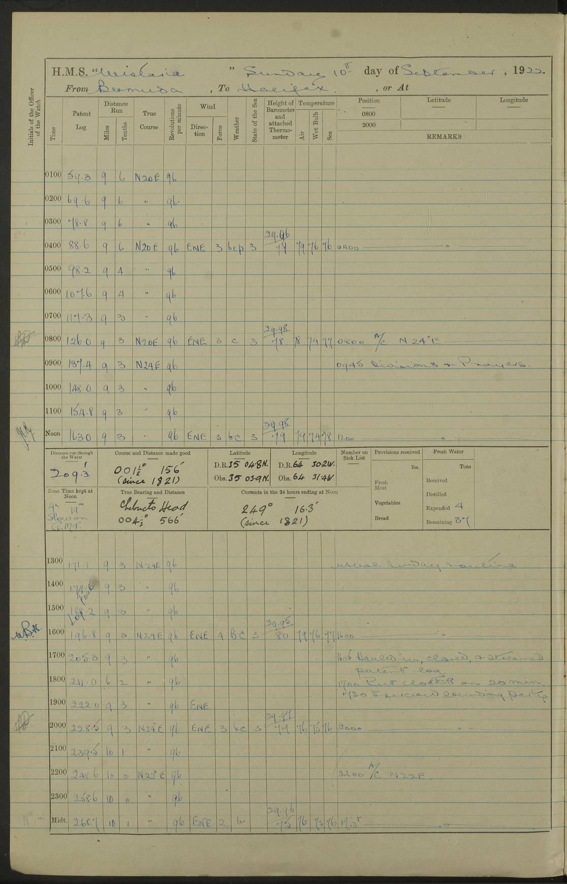4f73caf5a2fc8ea903000c3b: (https://s3.amazonaws.com:443/oldweather/ADM53-93269/0003_1.jpg) 1 September 1922 At Bermuda Lat 32.32, Long -64.8 5.30am: Hands employed cleaning ship 8.15am: Hands employed ranging cable for survey Sunset 6.30 2.0pm: Hands employed scraping ship's bottom, and cleaning out cable lockers 4f73caf5a2fc8ea903000c3c: (https://s3.amazonaws.com:443/oldweather/ADM53-93269/0004_0.jpg) 2 September 1922 At Bermuda Lat 32.32, Long -64.8 5.30am: Hands employed cleaning ship 8.15am: Hands employed cleaning ship’s side pm: Commissioned Engineer discharged to hospital pm: 2 ratings joined ship from hospital 5.0pm: Exercised fires stations 4f73caf6a2fc8ea903000c3d: (https://s3.amazonaws.com:443/oldweather/ADM53-93269/0004_1.jpg) 3 September 1922 At Bermuda Lat 32.32, Long -64.8 6.0am: Hands employed cleaning ship (usual Sunday Routine) 8.0-8.45am: Hands clean up decks for Divisions 10.15am: Church of England Church party landed 6.0pm: Tested fire arrangements 4f73caf6a2fc8ea903000c3e: (https://s3.amazonaws.com:443/oldweather/ADM53-93269/0005_0.jpg) 4 September 1922 At Bermuda Lat 32.32, Long -64.8 5.30am: Hands employed scraping ship's bottom 8.15am: Hands employed painting ship's bottom 2.0pm: Hands employed as in the forenoon 4f73caf7a2fc8ea903000c3f: (https://s3.amazonaws.com:443/oldweather/ADM53-93269/0005_1.jpg) 5 September 1922 At Bermuda Lat 32.32, Long -64.8 5.30am: Hands employed painting ship's bottom 8.15am: Hands employed painting ship's bottom am: HMS “Valerian” came alongside in the South Basin am: 1 rating discharged to hospital 1.30pm: Hands employed as in forenoon 4f73caf7a2fc8ea903000c40: (https://s3.amazonaws.com:443/oldweather/ADM53-93269/0006_0.jpg) 6 September 1922 At Bermuda Lat 32.32, Long -64.8 5.40am: Hands employed painting ship's bottom am: 1 PO & 6 Hands employed stowing cable after survey 8.15am: Hands employed restowing cable and painting ship's bottom am: Leave to Engine room branch from 13.30-07.00 Port Watch 1 boatswains pipe lost by accident pm: Received 20 tons of boiled water 2.0pm: Hands employed restowing cable and painting ship's bottom 4f73caf7a2fc8ea903000c41: (https://s3.amazonaws.com:443/oldweather/ADM53-93269/0006_1.jpg) 7 September 1922 At Bermuda Lat 32.32, Long -64.8 6.30am: Hands employed cleaning ship 8.15am: Hands preparing for undocking ship 9.30am: Secured alongside by the sheerlegs am: Hands restowed ammunition 3.45pm: Exercised collision stations 4f73caf8a2fc8ea903000c42: (https://s3.amazonaws.com:443/oldweather/ADM53-93269/0007_0.jpg) 8 September 1922 At Bermuda Lat 32.32, Long -64.8 8.15am: Hands employed cleaning ship 9.30am: Divisions. Inspection of the ship by Captain the Hon. A. E. Strutt 10.10am: Hands muster by the ledger 11.0am: Cleared ship for action pm: 6 ratings joined ship from Hospital 1.30pm: Resumed inspection of the ship by Captain the Hon A. E. Strutt 2.45pm: Secured, replace gear [Captain the Honourable Arthur Charles Strutt] 4f73caf8a2fc8ea903000c43: (https://s3.amazonaws.com:443/oldweather/ADM53-93269/0007_1.jpg) 9 September 1922 From Bermuda to Halifax N.S., and at Bermuda Lat 32.32, Long -64.8 8.15am: Hands employed provisioning ship pm: 12 ratings discharged to HMS “Dartmouth” pm: 18 ratings joined ship pm: Received 7 tons of boiler water 2.0pm: Hands employed securing ship for sea 4.0pm: Slipped from Jetty & proceeded out 4.15pm: Stopped in Grassy Bay, and hoisted motor boat 4.30pm: Proceeded at 96 revs. Co as requisite for Ship Channel and Narrows 5.49pm: Fairway buoy abeam. Course East 6.04pm: Mills Breaker buoy abeam, 8 cables 6.19pm: Kitchen Shoals buoy abeam, 1 mile 6.35pm: Streamed log [Mills Breaker buoy coordinates: Lat 32 23.9N, Long 64 36.9W] [Kitchen Shoal beacon coordinates: Lat 32 26.1N, Long 64 37.6W] 4f73caf8a2fc8ea903000c44: (https://s3.amazonaws.com:443/oldweather/ADM53-93269/0008_0.jpg) 10 September 1922 From Bermuda to Halifax Lat 35.06, Long -64.5 9.45am: Divisions & Prayers pm: Usual Sunday Routine 4.05pm: Hauled in, cleaned & streamed patent log 5.0pm: Put clocks on 20 minutes 5.30pm: Exercised sounding party True Bearing and Distance: Chebucto Head 004°½, 566 miles 4f73caf9a2fc8ea903000c45: (https://s3.amazonaws.com:443/oldweather/ADM53-93269/0008_1.jpg) 11 September 1922 From Bermuda to Halifax Lat 38.88, Long -64.3 3.0am: Within strong W/T touch with “Cape Town” 5.25am: Spoke “Cape Town” am: Divisions & Prayers, Exercised action am: Exchanged names with British Steamer “San Valerio”, Eagle Oil Co. Lat 38 35N, Long 63 55W 10.10am: Secure pm: Hands employed painting lower boom gear & waterways & cleaning out 2nd whaler 4.50pm: Exercised sounding party 5.0pm: Put clocks on ½ hour 10.10pm: Stopped engines, helm jammed 10.12pm: Hauled in patent log 10.35pm: Resumed Co & speed; hand wheel connected up. Course below NNE 10.45pm: Streamed patent log True Bearing and Distance: Chebucto Head 005°, 332 miles 4f73caf9a2fc8ea903000c46: (https://s3.amazonaws.com:443/oldweather/ADM53-93269/0009_0.jpg) 12 September 1922 From Bermuda to Halifax Lat 42.85, Long -63.81 am: Steering by hand 9.45am: Ord Seamen & Boys to 4” instruction pm: 1 hand scrubber lost by accident pm: 1 whalers oar lost by accident 5.0pm: Altered course N36E (steering NNE½E). Put clocks on 1/2 hour 8.15pm: Sighted Sambro Lt bearing N20E 8.40pm: Sighted Chebucto Head Lt bearing N18E 9.27pm: Sambro Lt buoy abeam, 2 miles 10.07pm: Sambro Lt abeam 10.10pm: Chebucto Lt abeam 10.20pm: Hauled in Patent log 11.20pm: Mauger Beach Lt abeam 11.52pm: Let go off No 4 wharf with 2½ shackles True Bearing and Distance: Chebucto Head 007, 100 miles 4f73cafaa2fc8ea903000c47: (https://s3.amazonaws.com:443/oldweather/ADM53-93269/0009_1.jpg) 13 September 1922 At Halifax Lat 44.69, Long -63.64 7.0am: Ship wharped alongside No 4 pier 8.0am: Hands prepare for coaling 8.45am: Hands coal ship 9.0am: Clocks put back 1 hour 12.30pm: Hands coal ship pm: 26 tons boiler water received 2.25pm: Finished coaling 4f73cafaa2fc