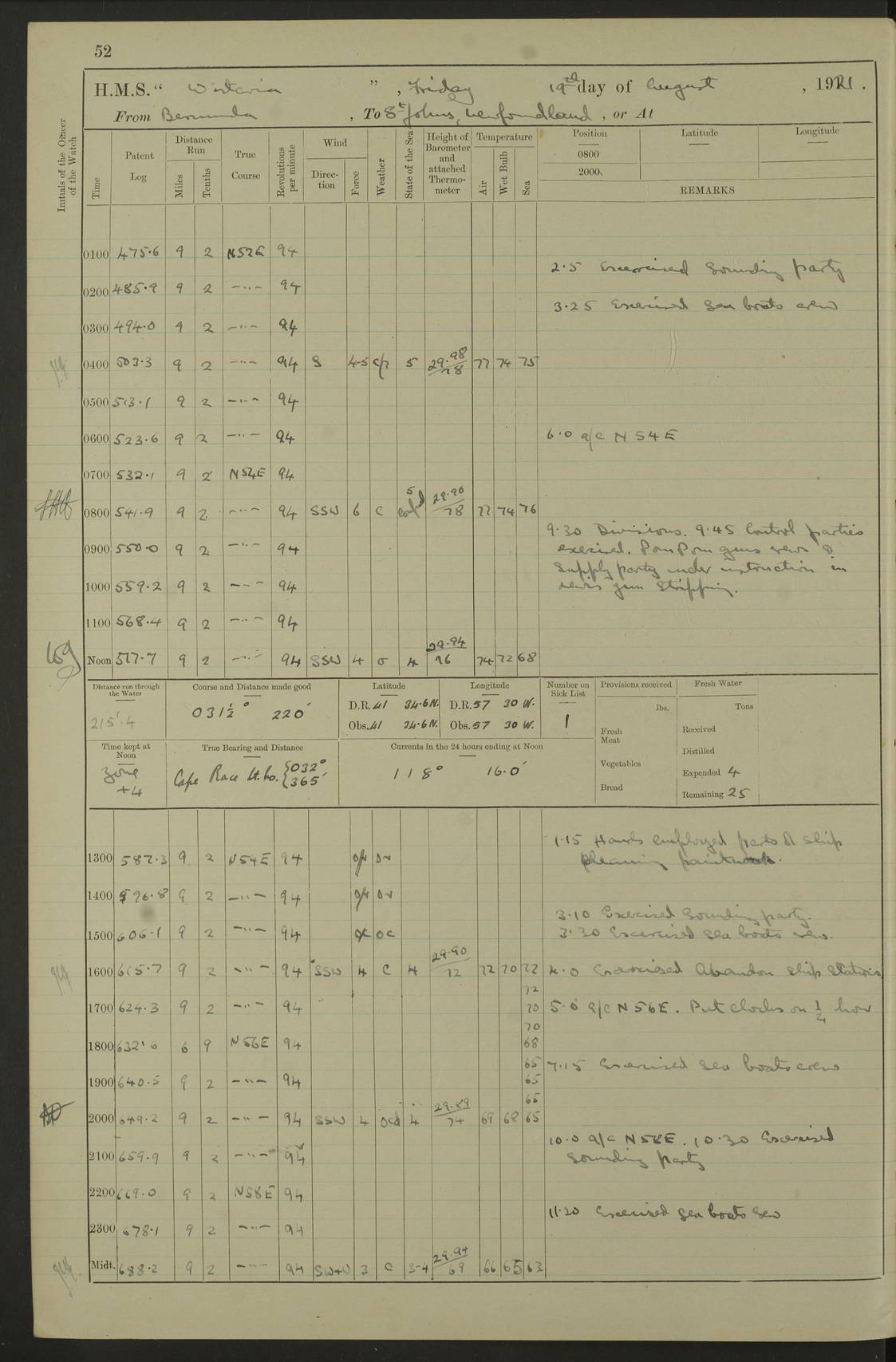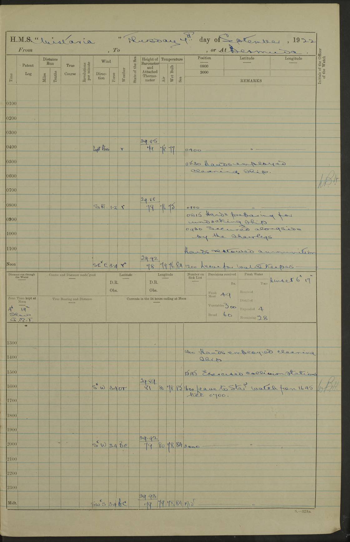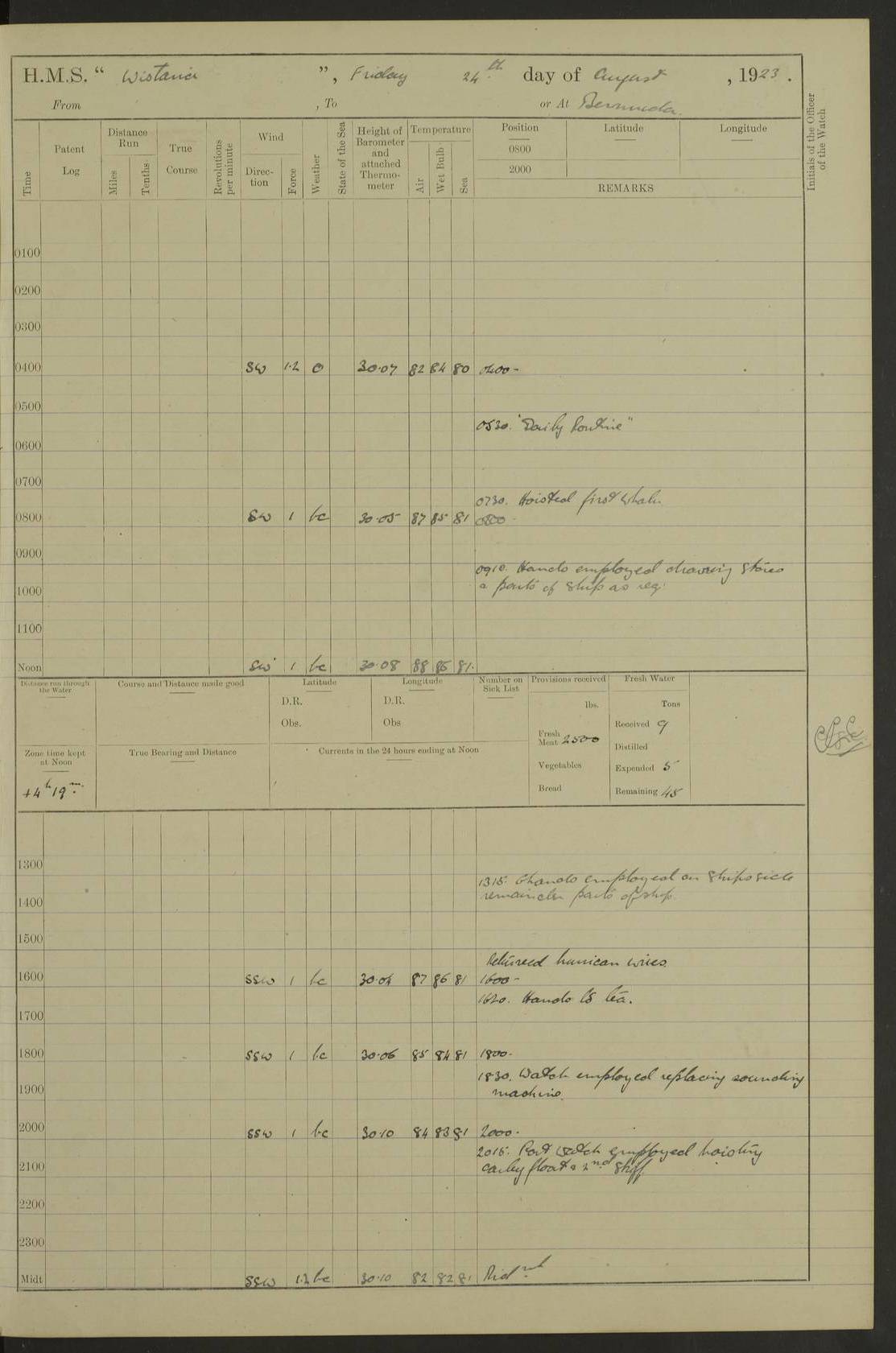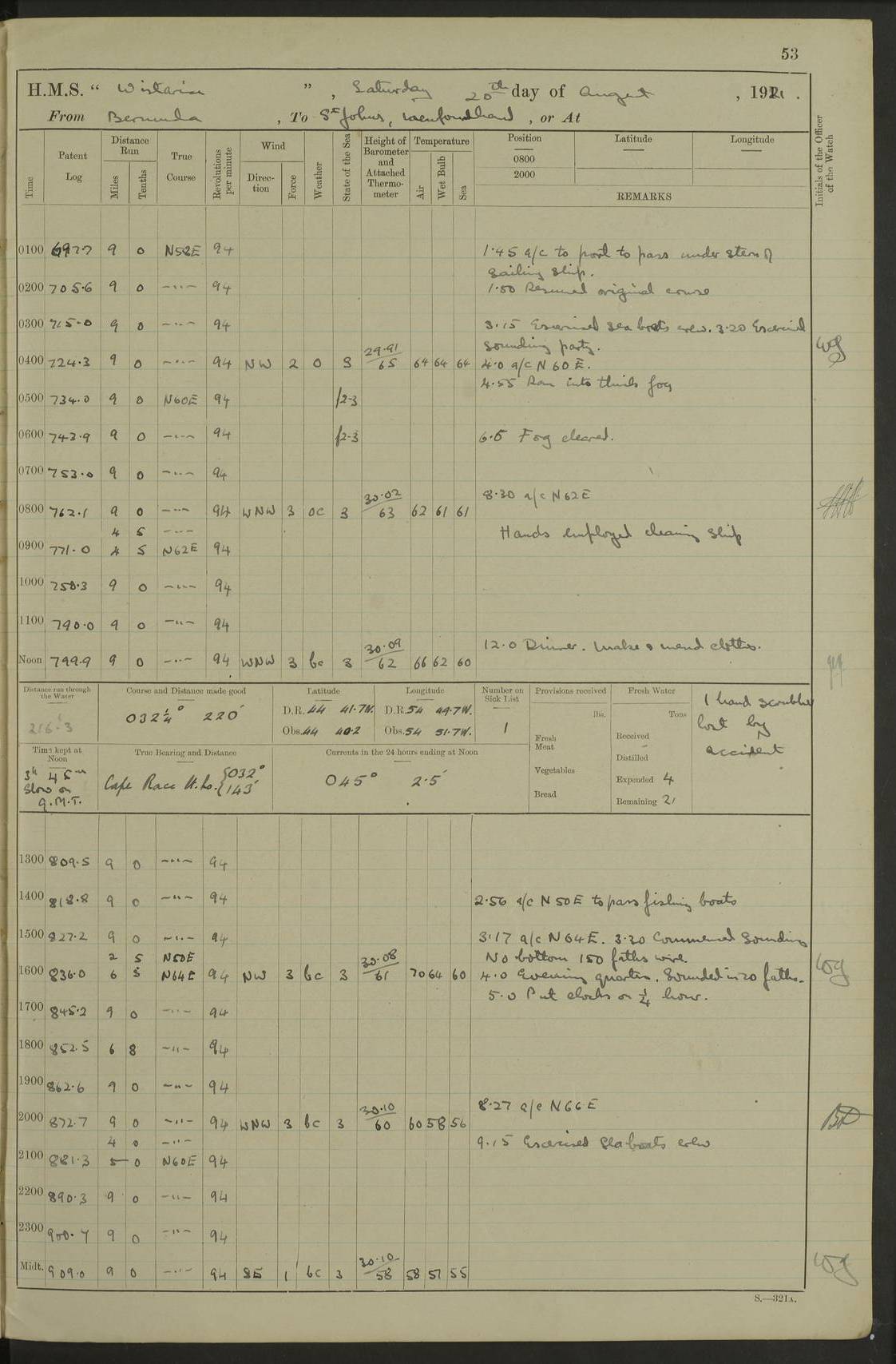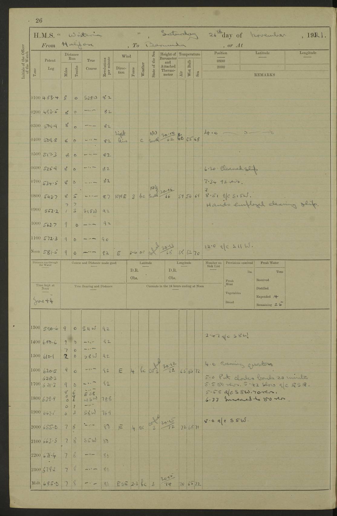 4f73caf5a2fc8ea903000c3b: (https://s3.amazonaws.com:443/oldweather/ADM53-93269/0003_1.jpg) 1 September 1922 At Bermuda Lat 32.32, Long -64.8 5.30am: Hands employed cleaning ship 8.15am: Hands employed ranging cable for survey Sunset 6.30 2.0pm: Hands employed scraping ship's bottom, and cleaning out cable lockers 4f73caf5a2fc8ea903000c3c: (https://s3.amazonaws.com:443/oldweather/ADM53-93269/0004_0.jpg) 2 September 1922 At Bermuda Lat 32.32, Long -64.8 5.30am: Hands employed cleaning ship 8.15am: Hands employed cleaning ship’s side pm: Commissioned Engineer discharged to hospital pm: 2 ratings joined ship from hospital 5.0pm: Exercised fires stations 4f73caf6a2fc8ea903000c3d: (https://s3.amazonaws.com:443/oldweather/ADM53-93269/0004_1.jpg) 3 September 1922 At Bermuda Lat 32.32, Long -64.8 6.0am: Hands employed cleaning ship (usual Sunday Routine) 8.0-8.45am: Hands clean up decks for Divisions 10.15am: Church of England Church party landed 6.0pm: Tested fire arrangements 4f73caf6a2fc8ea903000c3e: (https://s3.amazonaws.com:443/oldweather/ADM53-93269/0005_0.jpg) 4 September 1922 At Bermuda Lat 32.32, Long -64.8 5.30am: Hands employed scraping ship's bottom 8.15am: Hands employed painting ship's bottom 2.0pm: Hands employed as in the forenoon 4f73caf7a2fc8ea903000c3f: (https://s3.amazonaws.com:443/oldweather/ADM53-93269/0005_1.jpg) 5 September 1922 At Bermuda Lat 32.32, Long -64.8 5.30am: Hands employed painting ship's bottom 8.15am: Hands employed painting ship's bottom am: HMS “Valerian” came alongside in the South Basin am: 1 rating discharged to hospital 1.30pm: Hands employed as in forenoon 4f73caf7a2fc8ea903000c40: (https://s3.amazonaws.com:443/oldweather/ADM53-93269/0006_0.jpg) 6 September 1922 At Bermuda Lat 32.32, Long -64.8 5.40am: Hands employed painting ship's bottom am: 1 PO & 6 Hands employed stowing cable after survey 8.15am: Hands employed restowing cable and painting ship's bottom am: Leave to Engine room branch from 13.30-07.00 Port Watch 1 boatswains pipe lost by accident pm: Received 20 tons of boiled water 2.0pm: Hands employed restowing cable and painting ship's bottom 4f73caf7a2fc8ea903000c41: (https://s3.amazonaws.com:443/oldweather/ADM53-93269/0006_1.jpg) 7 September 1922 At Bermuda Lat 32.32, Long -64.8 6.30am: Hands employed cleaning ship 8.15am: Hands preparing for undocking ship 9.30am: Secured alongside by the sheerlegs am: Hands restowed ammunition 3.45pm: Exercised collision stations 4f73caf8a2fc8ea903000c42: (https://s3.amazonaws.com:443/oldweather/ADM53-93269/0007_0.jpg) 8 September 1922 At Bermuda Lat 32.32, Long -64.8 8.15am: Hands employed cleaning ship 9.30am: Divisions. Inspection of the ship by Captain the Hon. A. E. Strutt 10.10am: Hands muster by the ledger 11.0am: Cleared ship for action pm: 6 ratings joined ship from Hospital 1.30pm: Resumed inspection of the ship by Captain the Hon A. E. Strutt 2.45pm: Secured, replace gear [Captain the Honourable Arthur Charles Strutt] 4f73caf8a2fc8ea903000c43: (https://s3.amazonaws.com:443/oldweather/ADM53-93269/0007_1.jpg) 9 September 1922 From Bermuda to Halifax N.S., and at Bermuda Lat 32.32, Long -64.8 8.15am: Hands employed provisioning ship pm: 12 ratings discharged to HMS “Dartmouth” pm: 18 ratings joined ship pm: Received 7 tons of boiler water 2.0pm: Hands employed securing ship for sea 4.0pm: Slipped from Jetty & proceeded out 4.15pm: Stopped in Grassy Bay, and hoisted motor boat 4.30pm: Proceeded at 96 revs. Co as requisite for Ship Channel and Narrows 5.49pm: Fairway buoy abeam. Course East 6.04pm: Mills Breaker buoy abeam, 8 cables 6.19pm: Kitchen Shoals buoy abeam, 1 mile 6.35pm: Streamed log [Mills Breaker buoy coordinates: Lat 32 23.9N, Long 64 36.9W] [Kitchen Shoal beacon coordinates: Lat 32 26.1N, Long 64 37.6W] 4f73caf8a2fc8ea903000c44: (https://s3.amazonaws.com:443/oldweather/ADM53-93269/0008_0.jpg) 10 September 1922 From Bermuda to Halifax Lat 35.06, Long -64.5 9.45am: Divisions & Prayers pm: Usual Sunday Routine 4.05pm: Hauled in, cleaned & streamed patent log 5.0pm: Put clocks on 20 minutes 5.30pm: Exercised sounding party True Bearing and Distance: Chebucto Head 004°½, 566 miles 4f73caf9a2fc8ea903000c45: (https://s3.amazonaws.com:443/oldweather/ADM53-93269/0008_1.jpg) 11 September 1922 From Bermuda to Halifax Lat 38.88, Long -64.3 3.0am: Within strong W/T touch with “Cape Town” 5.25am: Spoke “Cape Town” am: Divisions & Prayers, Exercised action am: Exchanged names with British Steamer “San Valerio”, Eagle Oil Co. Lat 38 35N, Long 63 55W 10.10am: Secure pm: Hands employed painting lower boom gear & waterways & cleaning out 2nd whaler 4.50pm: Exercised sounding party 5.0pm: Put clocks on ½ hour 10.10pm: Stopped engines, helm jammed 10.12pm: Hauled in patent log 10.35pm: Resumed Co & speed; hand wheel connected up. Course below NNE 10.45pm: Streamed patent log True Bearing and Distance: Chebucto Head 005°, 332 miles 4f73caf9a2fc8ea903000c46: (https://s3.amazonaws.com:443/oldweather/ADM53-93269/0009_0.jpg) 12 September 1922 From Bermuda to Halifax Lat 42.85, Long -63.81 am: Steering by hand 9.45am: Ord Seamen & Boys to 4” instruction pm: 1 hand scrubber lost by accident pm: 1 whalers oar lost by accident 5.0pm: Altered course N36E (steering NNE½E). Put clocks on 1/2 hour 8.15pm: Sighted Sambro Lt bearing N20E 8.40pm: Sighted Chebucto Head Lt bearing N18E 9.27pm: Sambro Lt buoy abeam, 2 miles 10.07pm: Sambro Lt abeam 10.10pm: Chebucto Lt abeam 10.20pm: Hauled in Patent log 11.20pm: Mauger Beach Lt abeam 11.52pm: Let go off No 4 wharf with 2½ shackles True Bearing and Distance: Chebucto Head 007, 100 miles 4f73cafaa2fc8ea903000c47: (https://s3.amazonaws.com:443/oldweather/ADM53-93269/0009_1.jpg) 13 September 1922 At Halifax Lat 44.69, Long -63.64 7.0am: Ship wharped alongside No 4 pier 8.0am: Hands prepare for coaling 8.45am: Hands coal ship 9.0am: Clocks put back 1 hour 12.30pm: Hands coal ship pm: 26 tons boiler water received 2.25pm: Finished coaling 4f73cafaa2fc